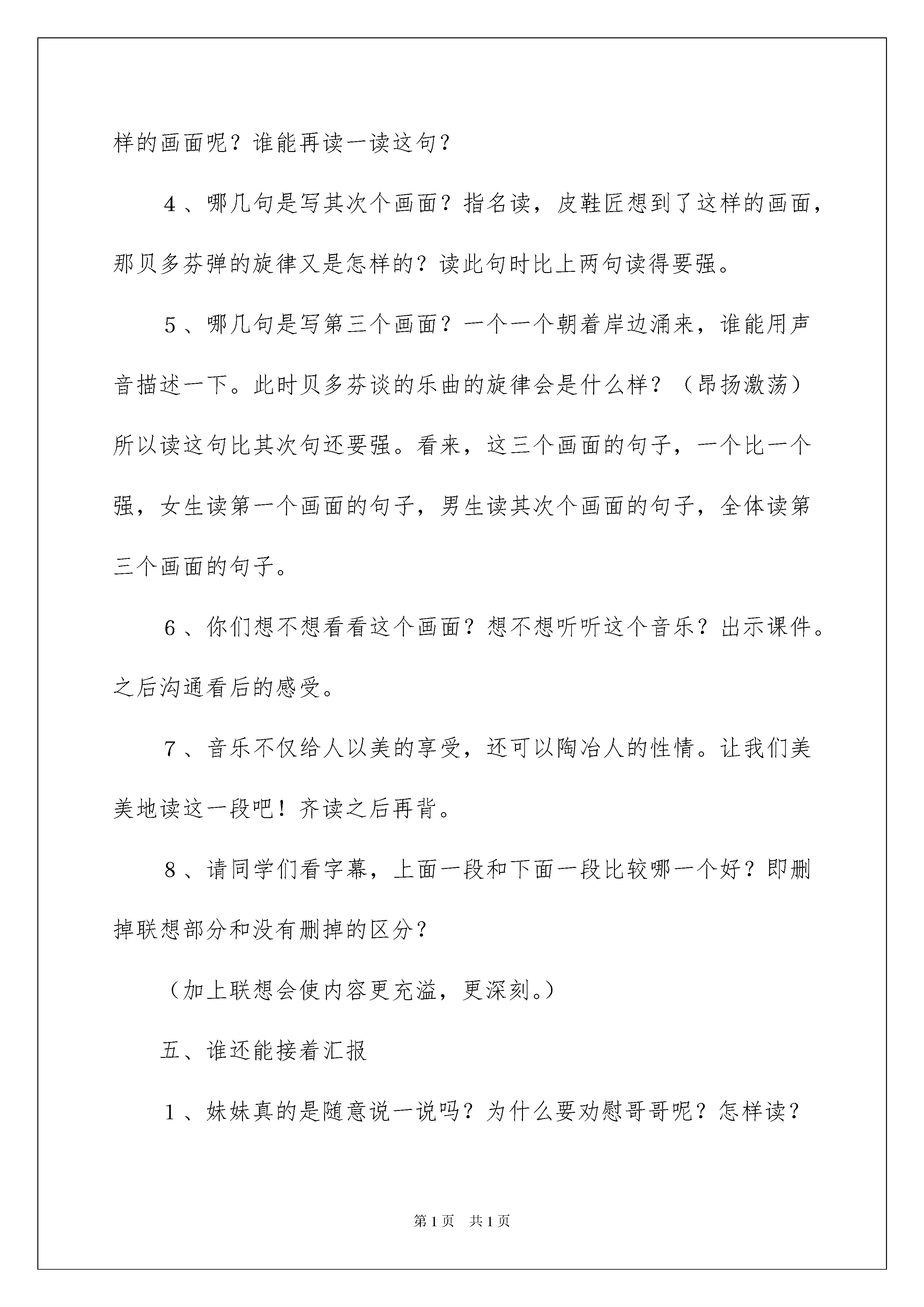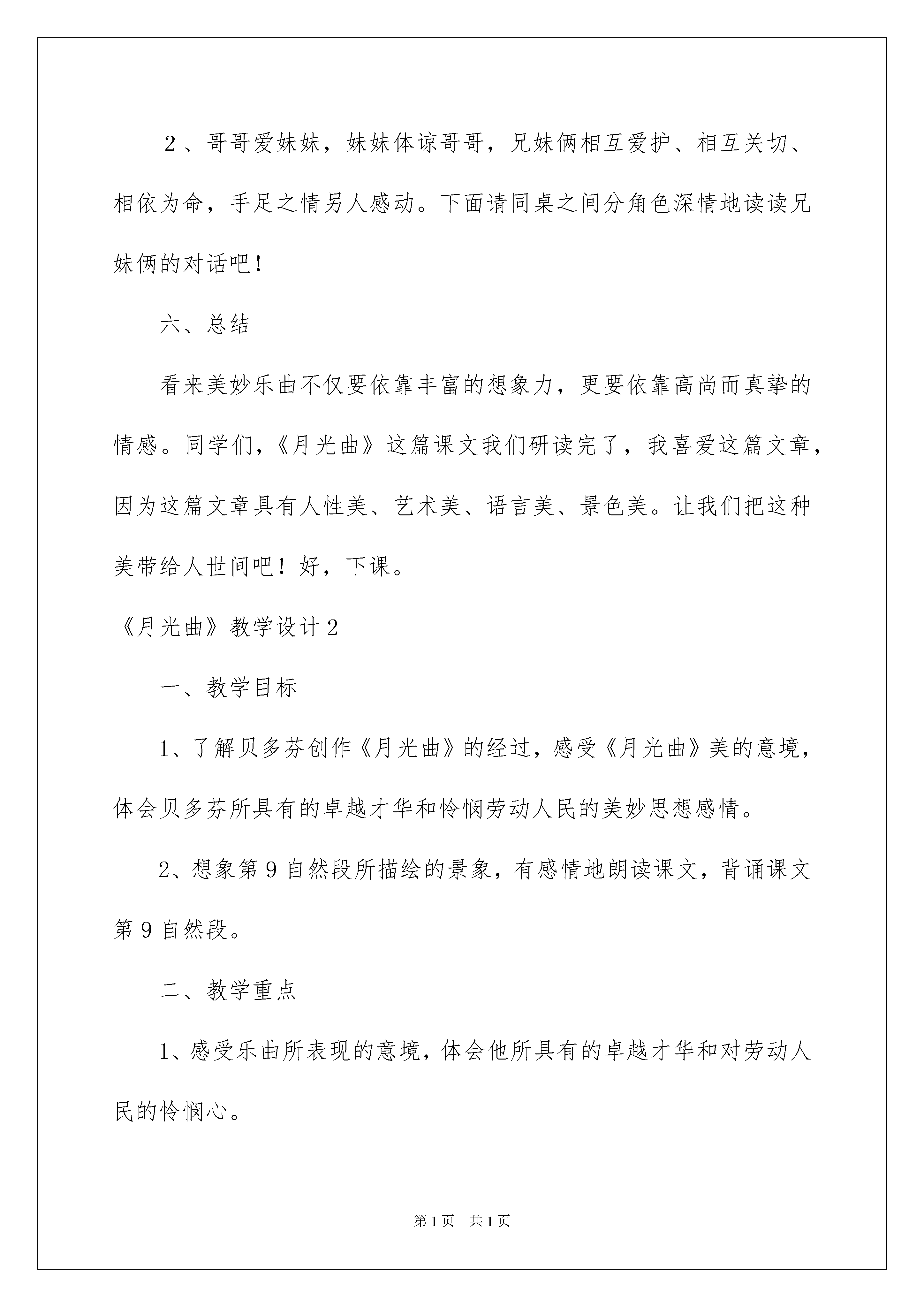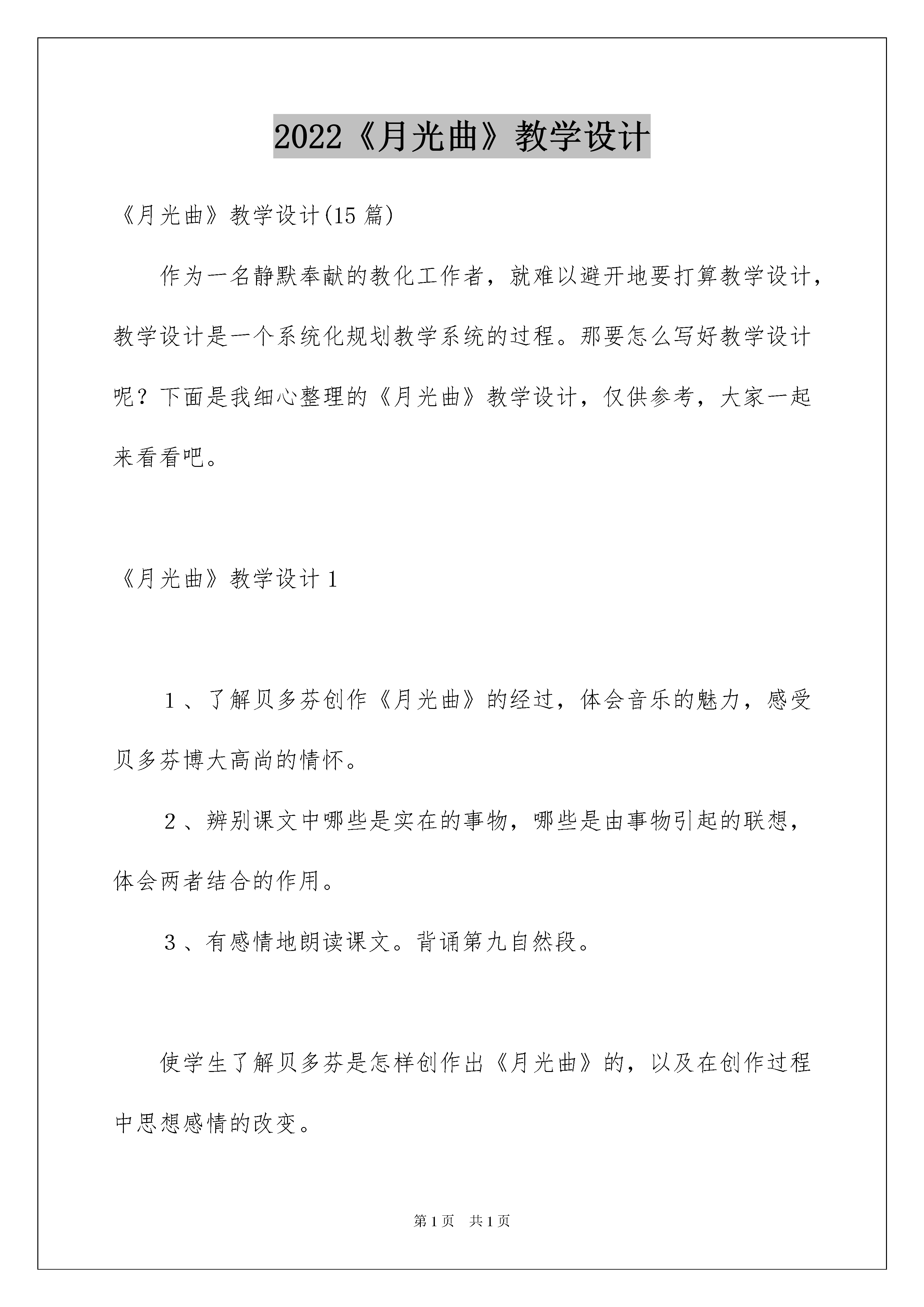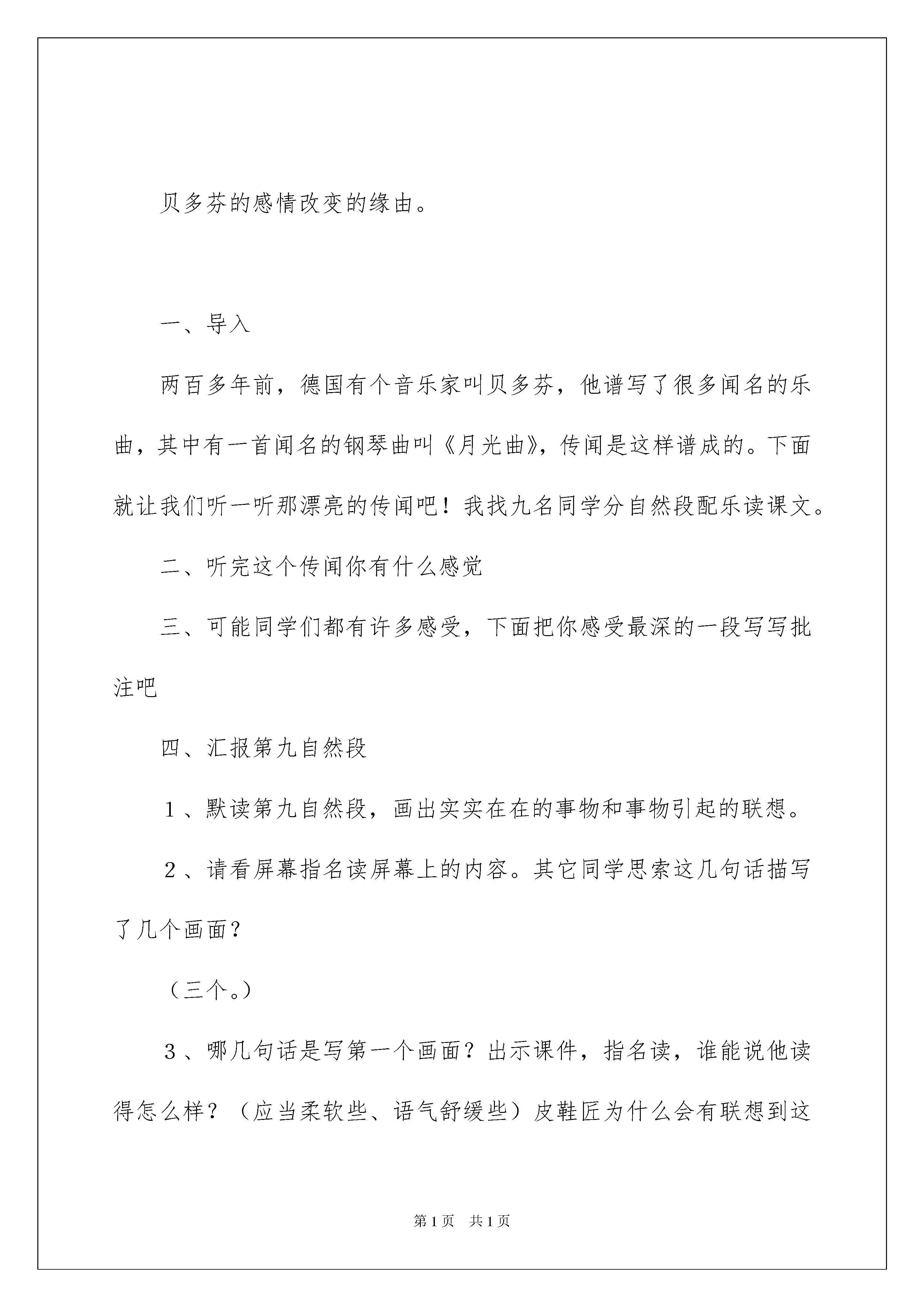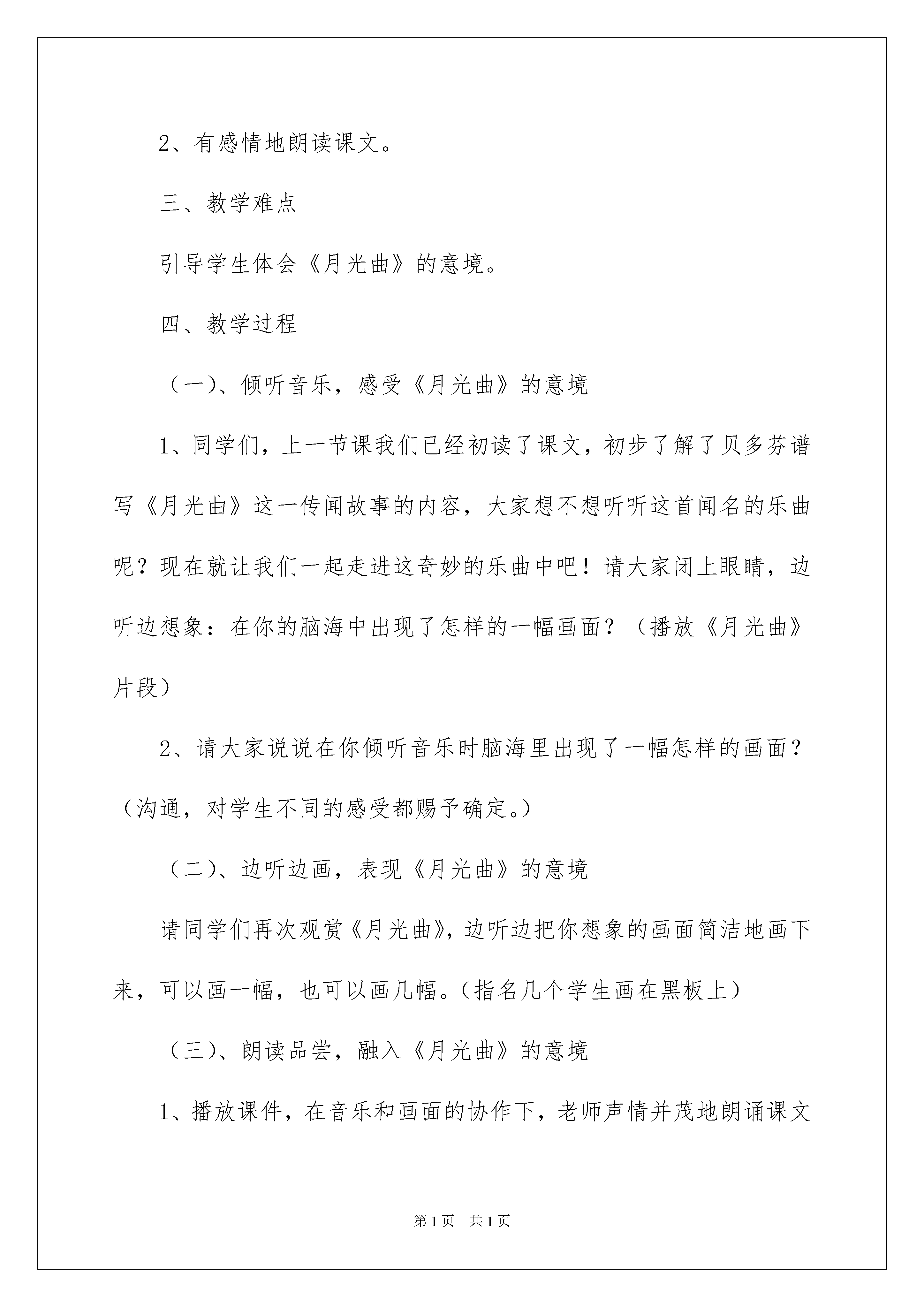 2022《月光曲》教学设计《月光曲》教学设计(15篇)作为一名静默奉献的教化工作者,就难以避开地要打算教学设计,教学设计是一个系统化规划教学系统的过程。那要怎么写好教学设计呢?下面是我细心整理的《月光曲》教学设计,仅供参考,大家一起来看看吧。《月光曲》教学设计11、了解贝多芬创作《月光曲》的经过,体会音乐的魅力,感受贝多芬博大高尚的情怀。2、辨别课文中哪些是实在的事物,哪些是由事物引起的联想,体会两者结合的作用。3、有感情地朗读课文。背诵第九自然段。使学生了解贝多芬是怎样创作出《月光曲》的,以及在创作过程中思想感情的改变。贝多芬的感情改变的缘由。一、导入两百多年前,德国有个音乐家叫贝多芬,他谱写了很多闻名的乐曲,其中有一首闻名的钢琴曲叫《月光曲》,传闻是这样谱成的。下面就让我们听一听那漂亮的传闻吧!我找九名同学分自然段配乐读课文。二、听完这个传闻你有什么感觉三、可能同学们都有许多感受,下面把你感受最深的一段写写批注吧四、汇报第九自然段1、默读第九自然段,画出实实在在的事物和事物引起的联想。2、请看屏幕指名读屏幕上的内容。其它同学思索这几句话描写了几个画面?(三个。)3、哪几句话是写第一个画面?出示课件,指名读,谁能说他读得怎么样?(应当柔软些、语气舒缓些)皮鞋匠为什么会有联想到这样的画面呢?谁能再读一读这句?4、哪几句是写其次个画面?指名读,皮鞋匠想到了这样的画面,那贝多芬弹的旋律又是怎样的?读此句时比上两句读得要强。5、哪几句是写第三个画面?一个一个朝着岸边涌来,谁能用声音描述一下。此时贝多芬谈的乐曲的旋律会是什么样?(昂扬激荡)所以读这句比其次句还要强。看来,这三个画面的句子,一个比一个强,女生读第一个画面的句子,男生读其次个画面的句子,全体读第三个画面的句子。6、你们想不想看看这个画面?想不想听听这个音乐?出示课件。之后沟通看后的感受。7、音乐不仅给人以美的享受,还可以陶冶人的性情。让我们美美地读这一段吧!齐读之后再背。8、请同学们看字幕,上面一段和下面一段比较哪一个好?即删掉联想部分和没有删掉的区分?(加上联想会使内容更充溢,更深刻。)五、谁还能接着汇报1、妹妹真的是随意说一说吗?为什么要劝慰哥哥呢?怎样读?2、哥哥爱妹妹,妹妹体谅哥哥,兄妹俩相互爱护、相互关切、相依为命,手足之情另人感动。下面请同桌之间分角色深情地读读兄妹俩的对话吧!六、总结看来美妙乐曲不仅要依靠丰富的想象力,更要依靠高尚而真挚的情感。同学们,《月光曲》这篇课文我们研读完了,我喜爱这篇文章,因为这篇文章具有人性美、艺术美、语言美、景色美。让我们把这种美带给人世间吧!好,下课。《月光曲》教学设计2一、教学目标1、了解贝多芬创作《月光曲》的经过,感受《月光曲》美的意境,体会贝多芬所具有的卓越才华和怜悯劳动人民的美妙思想感情。2、想象第9自然段所描绘的景象,有感情地朗读课文,背诵课文第9自然段。二、教学重点1、感受乐曲所表现的意境,体会他所具有的卓越才华和对劳动人民的怜悯心。2、有感情地朗读课文。三、教学难点引导学生体会《月光曲》的意境。四、教学过程(一)、倾听音乐,感受《月光曲》的意境1、同学们,上一节课我们已经初读了课文,初步了解了贝多芬谱写《月光曲》这一传闻故事的内容,大家想不想听听这首闻名的乐曲呢?现在就让我们一起走进这奇妙的乐曲中吧!请大家闭上眼睛,边听边想象:在你的脑海中出现了怎样的一幅画面?(播放《月光曲》片段)2、请大家说说在你倾听音乐时脑海里出现了一幅怎样的画面?(沟通,对学生不同的感受都赐予确定。)(二)、边听边画,表现《月光曲》的意境请同学们再次观赏《月光曲》,边听边把你想象的画面简洁地画下来,可以画一幅,也可以画几幅。(指名几个学生画在黑板上)(三)、朗读品尝,融入《月光曲》的意境1、播放课件,在音乐和画面的协作下,老师声情并茂地朗诵课文第9节。把学生带入诗一般的意境之中。2、画面和音乐美吗?其实书本里描绘的更美,请同学们自由地朗读课文第9节,找出写得美的词句,并想想美在哪里?3、全班沟通4、这么美的景色,全是皮鞋匠亲眼看到的吗?从哪个词看出是他想象的?画出联想的句子5、指导感情朗读,读出大海的美,读出它的改变。(当月亮初升时,要轻而舒缓;当读到“刮起大风,卷起巨浪”时,要加快速度和力度;当读到“皮鞋匠看看她妹妹”时,语气要转为安静。)自由读——配乐指名读——齐读——朗诵(四)、回读全文,探究贝多芬的创作过程。1、这么美的月光曲是怎么谱写成的呢?课文哪几节是写月光曲怎么谱写的呢?(2—10节)2、请大家自由读一读课文2—10节,并想一想有什么不懂的问题提出来。3、学生提问,老师