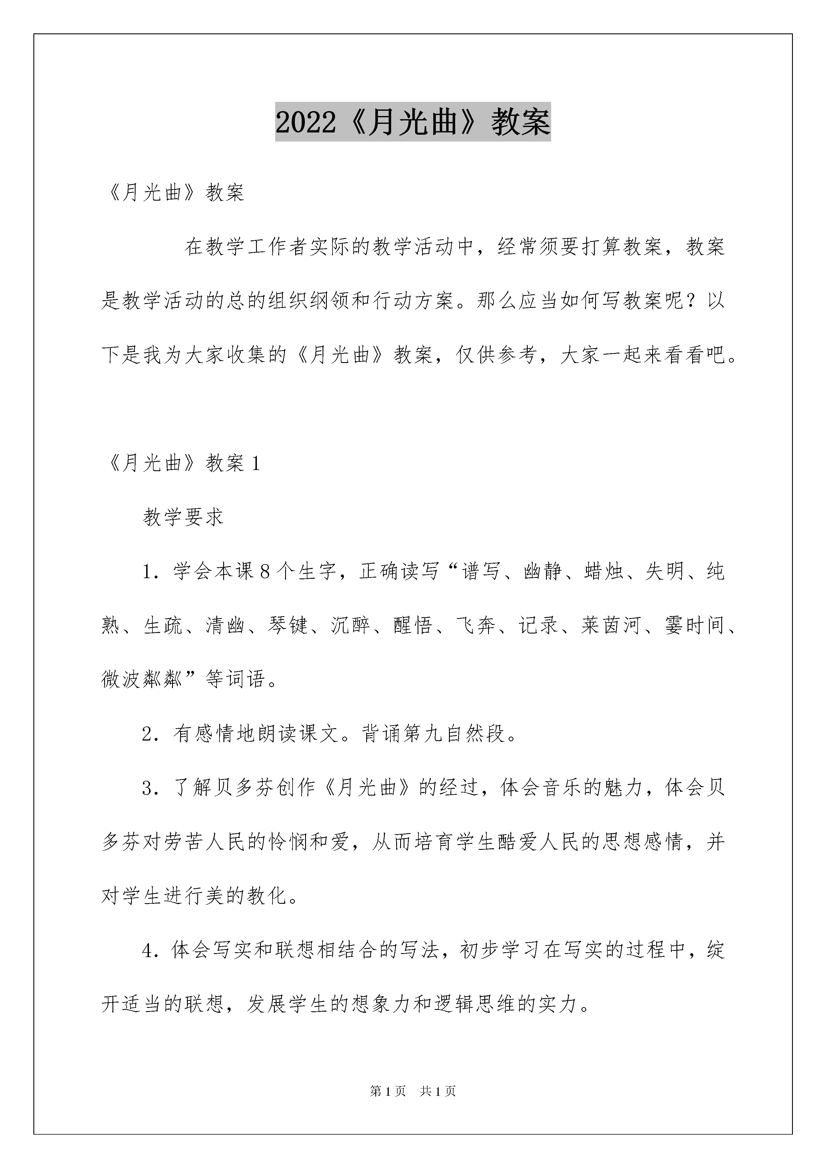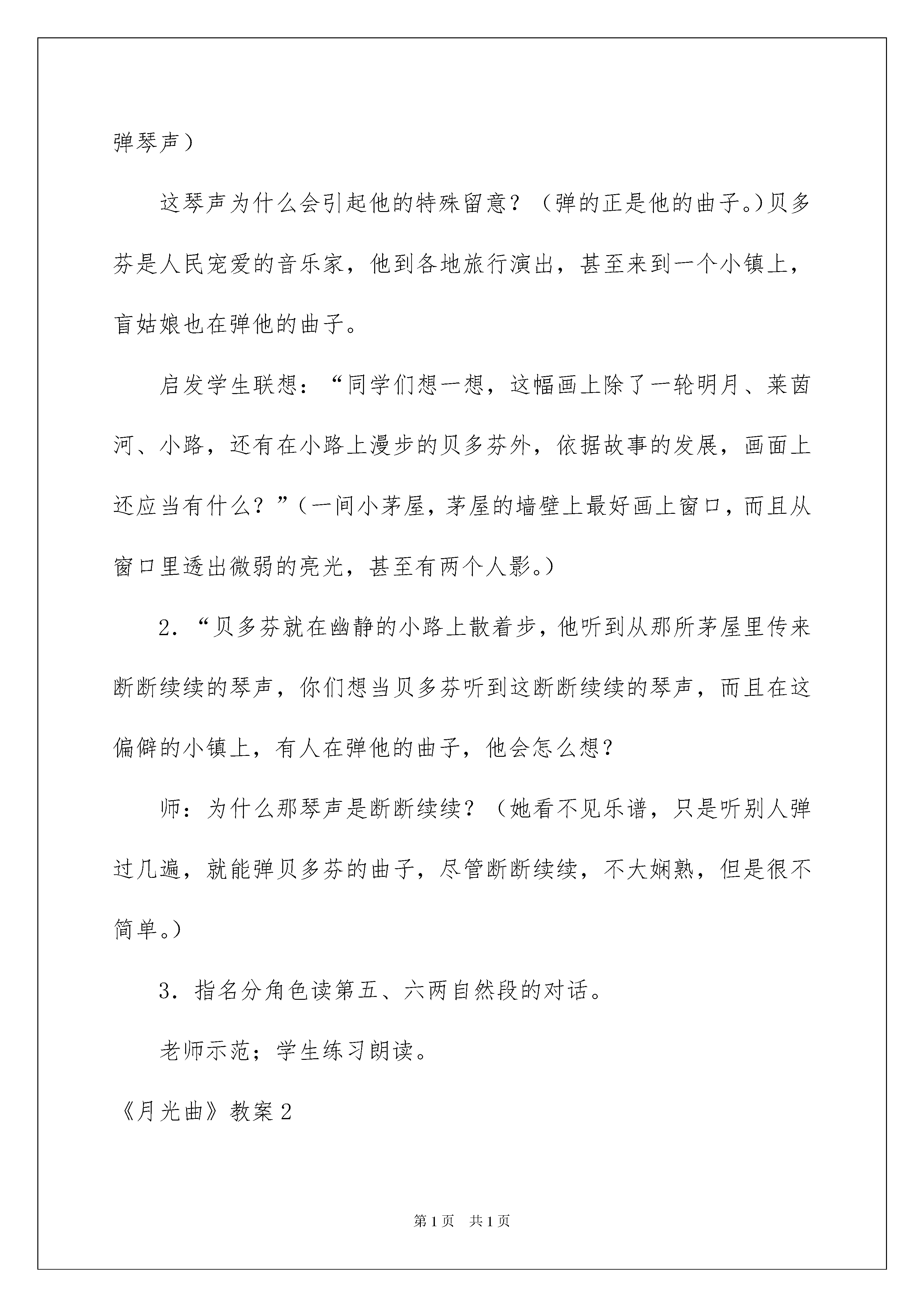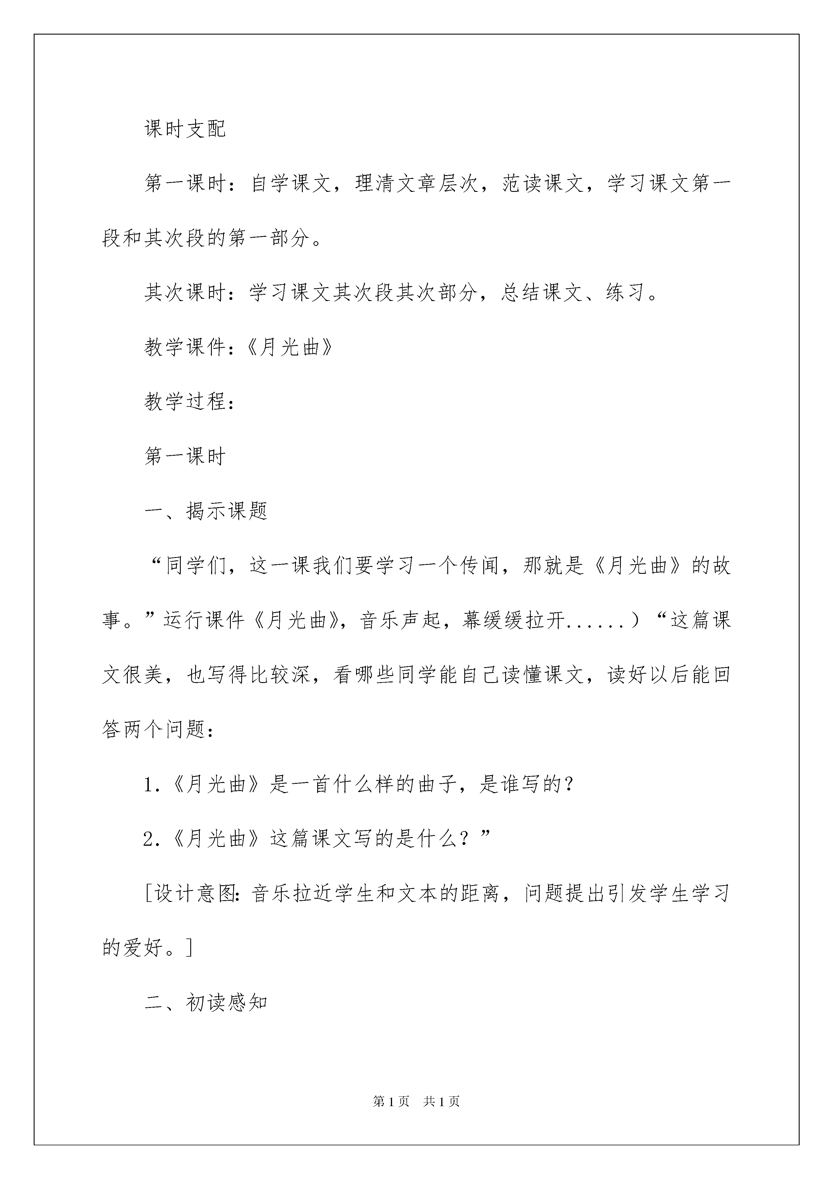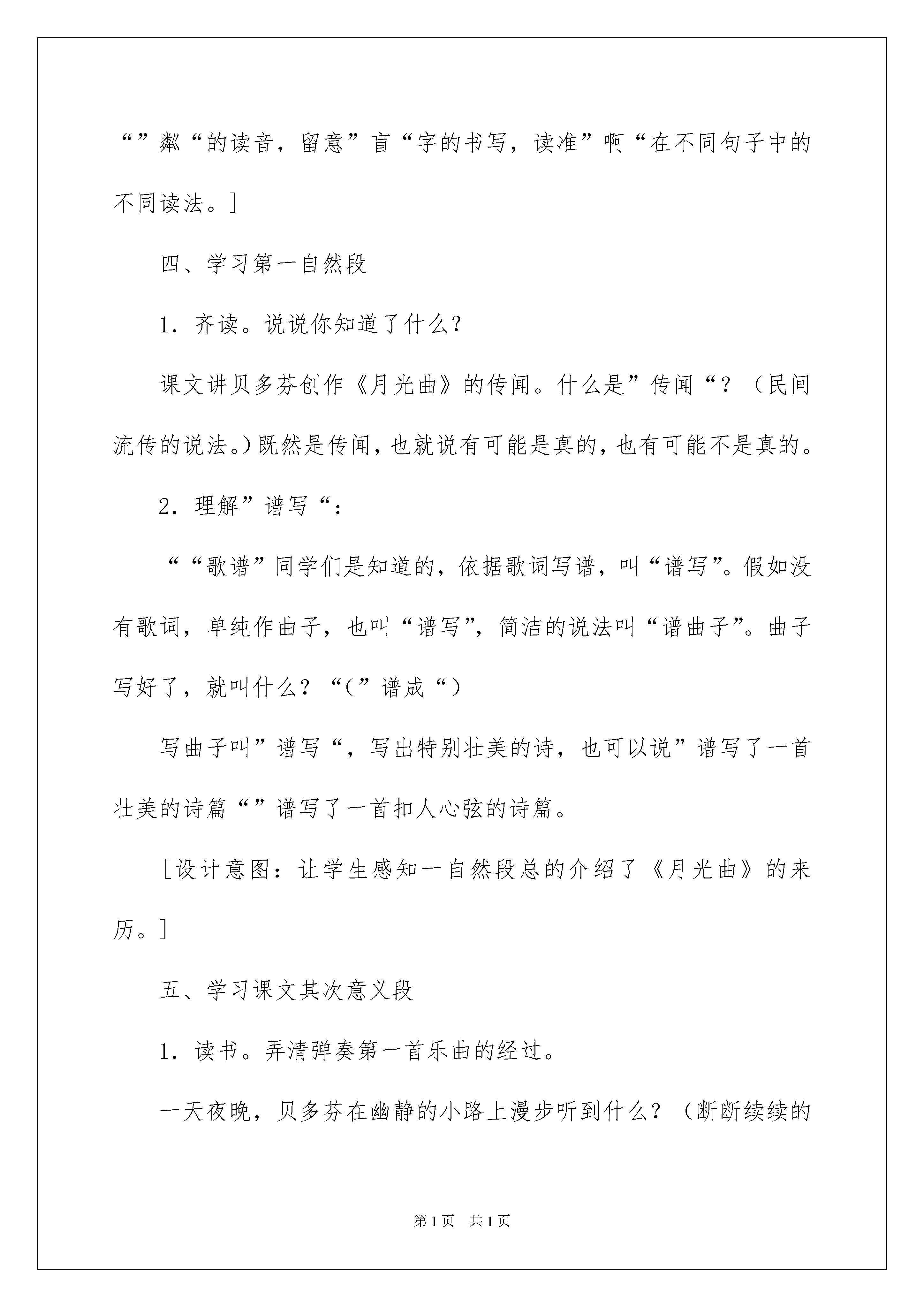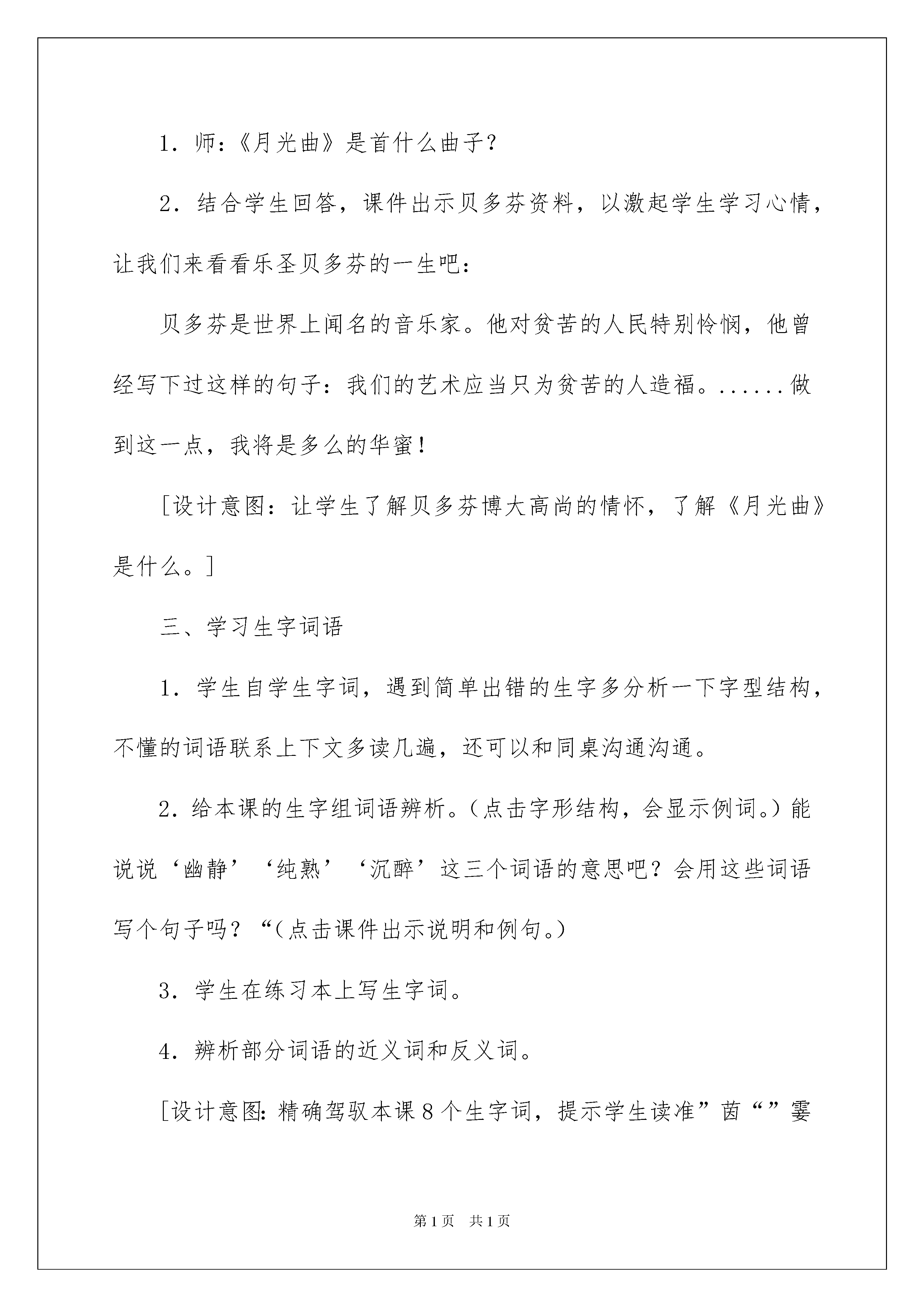 2022《月光曲》教案《月光曲》教案在教学工作者实际的教学活动中,经常须要打算教案,教案是教学活动的总的组织纲领和行动方案。那么应当如何写教案呢?以下是我为大家收集的《月光曲》教案,仅供参考,大家一起来看看吧。《月光曲》教案1教学要求1.学会本课8个生字,正确读写“谱写、幽静、蜡烛、失明、纯熟、生疏、清幽、琴键、沉醉、醒悟、飞奔、记录、莱茵河、霎时间、微波粼粼”等词语。2.有感情地朗读课文。背诵第九自然段。3.了解贝多芬创作《月光曲》的经过,体会音乐的魅力,体会贝多芬对劳苦人民的怜悯和爱,从而培育学生酷爱人民的思想感情,并对学生进行美的教化。4.体会写实和联想相结合的写法,初步学习在写实的过程中,绽开适当的联想,发展学生的想象力和逻辑思维的实力。课时支配第一课时:自学课文,理清文章层次,范读课文,学习课文第一段和其次段的第一部分。其次课时:学习课文其次段其次部分,总结课文、练习。教学课件:《月光曲》教学过程:第一课时一、揭示课题“同学们,这一课我们要学习一个传闻,那就是《月光曲》的故事。”运行课件《月光曲》,音乐声起,幕缓缓拉开......)“这篇课文很美,也写得比较深,看哪些同学能自己读懂课文,读好以后能回答两个问题:1.《月光曲》是一首什么样的曲子,是谁写的?2.《月光曲》这篇课文写的是什么?”[设计意图:音乐拉近学生和文本的距离,问题提出引发学生学习的爱好。]二、初读感知1.师:《月光曲》是首什么曲子?2.结合学生回答,课件出示贝多芬资料,以激起学生学习心情,让我们来看看乐圣贝多芬的一生吧:贝多芬是世界上闻名的音乐家。他对贫苦的人民特别怜悯,他曾经写下过这样的句子:我们的艺术应当只为贫苦的人造福。......做到这一点,我将是多么的华蜜![设计意图:让学生了解贝多芬博大高尚的情怀,了解《月光曲》是什么。]三、学习生字词语1.学生自学生字词,遇到简单出错的生字多分析一下字型结构,不懂的词语联系上下文多读几遍,还可以和同桌沟通沟通。2.给本课的生字组词语辨析。(点击字形结构,会显示例词。)能说说‘幽静’‘纯熟’‘沉醉’这三个词语的意思吧?会用这些词语写个句子吗?“(点击课件出示说明和例句。)3.学生在练习本上写生字词。4.辨析部分词语的近义词和反义词。[设计意图:精确驾驭本课8个生字词,提示学生读准”茵“”霎“”粼“的读音,留意”盲“字的书写,读准”啊“在不同句子中的不同读法。]四、学习第一自然段1.齐读。说说你知道了什么?课文讲贝多芬创作《月光曲》的传闻。什么是”传闻“?(民间流传的说法。)既然是传闻,也就说有可能是真的,也有可能不是真的。2.理解”谱写“:““歌谱”同学们是知道的,依据歌词写谱,叫“谱写”。假如没有歌词,单纯作曲子,也叫“谱写”,简洁的说法叫“谱曲子”。曲子写好了,就叫什么?“(”谱成“)写曲子叫”谱写“,写出特别壮美的诗,也可以说”谱写了一首壮美的诗篇“”谱写了一首扣人心弦的诗篇。[设计意图:让学生感知一自然段总的介绍了《月光曲》的来历。]五、学习课文其次意义段1.读书。弄清弹奏第一首乐曲的经过。一天夜晚,贝多芬在幽静的小路上漫步听到什么?(断断续续的弹琴声)这琴声为什么会引起他的特殊留意?(弹的正是他的曲子。)贝多芬是人民宠爱的音乐家,他到各地旅行演出,甚至来到一个小镇上,盲姑娘也在弹他的曲子。启发学生联想:“同学们想一想,这幅画上除了一轮明月、莱茵河、小路,还有在小路上漫步的贝多芬外,依据故事的发展,画面上还应当有什么?”(一间小茅屋,茅屋的墙壁上最好画上窗口,而且从窗口里透出微弱的亮光,甚至有两个人影。)2.“贝多芬就在幽静的小路上散着步,他听到从那所茅屋里传来断断续续的琴声,你们想当贝多芬听到这断断续续的琴声,而且在这偏僻的小镇上,有人在弹他的曲子,他会怎么想?师:为什么那琴声是断断续续?(她看不见乐谱,只是听别人弹过几遍,就能弹贝多芬的曲子,尽管断断续续,不大娴熟,但是很不简单。)3.指名分角色读第五、六两自然段的对话。老师示范;学生练习朗读。《月光曲》教案2一、谈话导入师:同学们,你们听说过贝多芬吗?你对贝多芬有哪些了解?(生自由谈)小结:贝多芬是德国闻名的大音乐家。他的传世作品有很多。其中有一首特别闻名的曲子叫《月光曲》(板书课题),传闻中,关于这首曲子的谱成有一个动人的故事。今日,就让我们一起走进这个故事,看看这首曲子是怎样创作出来的。二、沟通预习,以学定教1、沟通收获:(1)同学们已经读了这个故事,那么谁能简洁地说一说这个故事主要讲了一件什么事?(2)在这个故事中,贝多芬为盲姑娘弹了几首曲子?(若学生答上一个问题时已说出,这里就敏