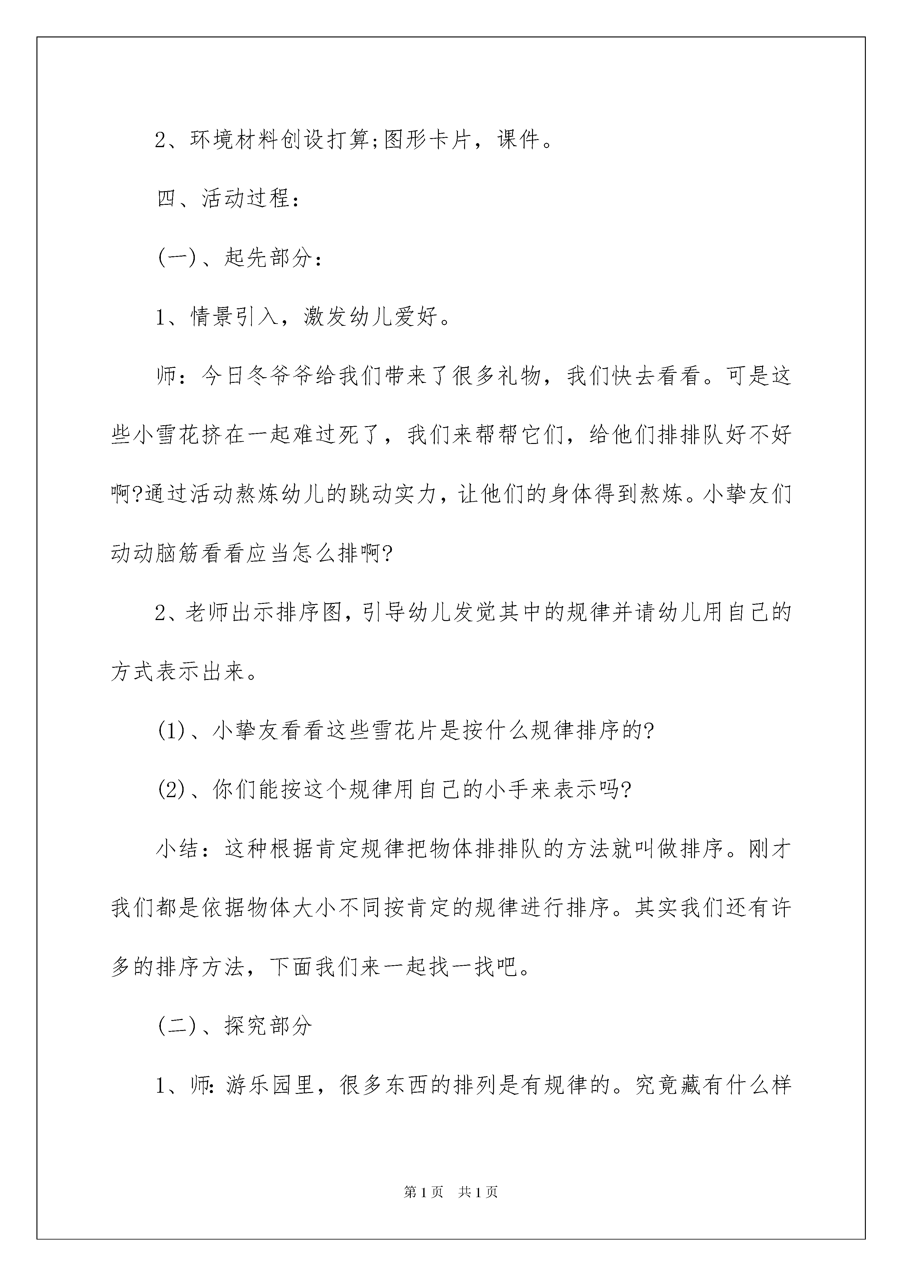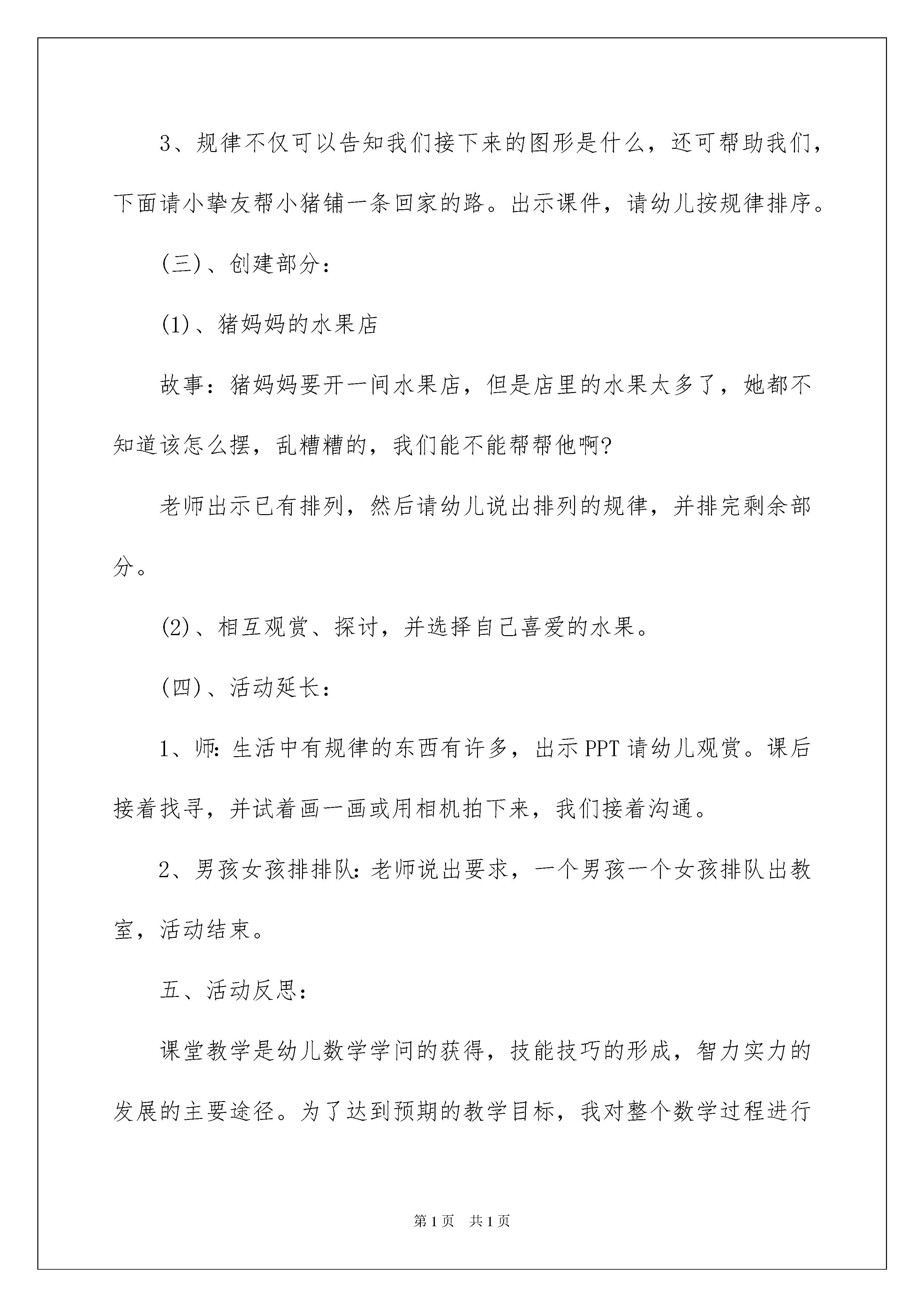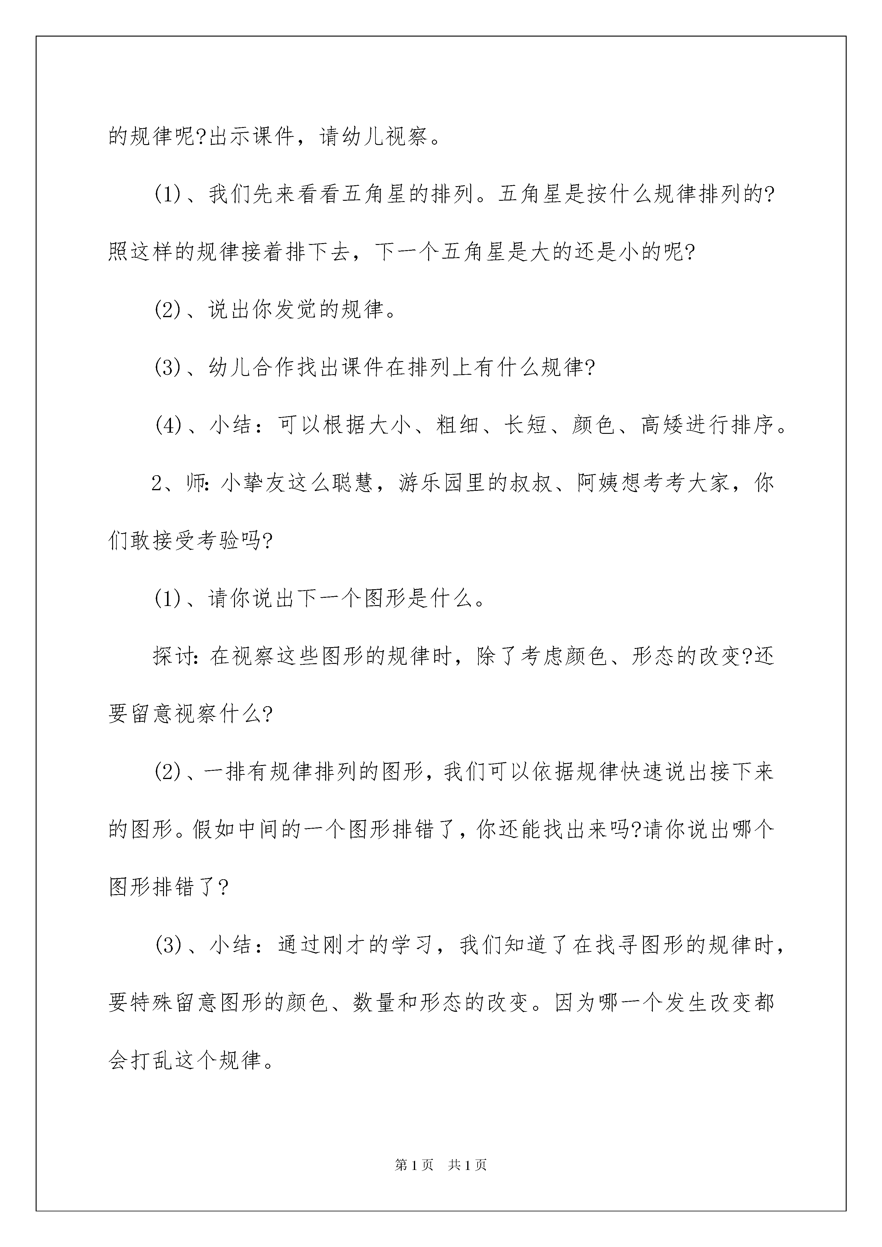 2022《有趣的图形》中班教案《好玩的图形》中班教案作为一位无私奉献的人民老师,经常须要打算教案,教案有助于顺当而有效地开展教学活动。那么写教案须要留意哪些问题呢?以下是我细心整理的《好玩的图形》中班教案,仅供参考,希望能够帮助到大家。《好玩的图形》中班教案1一、设计意图:在我们的生活中到处充溢了排序;服装花纹上的排序,环境装饰上的排序,物品包装上的排序,公园中花等草种植的排序等,这些有规律的排序带给我们生活中的美。孩子们在生活中有意或无意识地会发觉生活中存在一些排序的现象,如:吃饭的碗和盘子周边的美丽花纹,裙子袖口和裙边的花纹等。而我们老师正是孩子发觉、运用和创建这种有规律的美的引导者。幼儿学习排序可以为幼儿建立粗浅的数学概念做好打算,《纲要》提出“在幼儿的生活中进行数学的学习”,让幼儿在生活里学数学、玩数学、用数学,老师引导幼儿在嬉戏和玩乐中初步接受和学习有规律的排序,并激励幼儿将之应用于生活。本次活动我尝试把抽象的数学内容变为好玩的嬉戏活动。二、活动目标:1、引导幼儿感知“ABAB,ABAB”,这样简洁序列的规律2、通过操作,让幼儿在已排列的物体中找出ABAB的排列规律,并运用推理接着排。3、让幼儿在自由的探究活动中,体验排序活动的乐趣。4、通过各种感官训练培育幼儿对计算的兴致及思维的精确性、灵敏性。5、发展视察、辨别、归案的实力。教学难点:找出较困难的图形排列规律。其中包含三层:既含形态规律,又含颜色规律,以及数量规律的多层次规律。三、活动打算:1、幼儿阅历打算:幼儿已经有根据物体某一特征规律进行排序的阅历:如根据物体的大小规律、长短规律、高矮规律、颜色规律的排序等。2、环境材料创设打算;图形卡片,课件。四、活动过程:(一)、起先部分:1、情景引入,激发幼儿爱好。师:今日冬爷爷给我们带来了很多礼物,我们快去看看。可是这些小雪花挤在一起难过死了,我们来帮帮它们,给他们排排队好不好啊?通过活动熬炼幼儿的跳动实力,让他们的身体得到熬炼。小挚友们动动脑筋看看应当怎么排啊?2、老师出示排序图,引导幼儿发觉其中的规律并请幼儿用自己的方式表示出来。(1)、小挚友看看这些雪花片是按什么规律排序的?(2)、你们能按这个规律用自己的小手来表示吗?小结:这种根据肯定规律把物体排排队的方法就叫做排序。刚才我们都是依据物体大小不同按肯定的规律进行排序。其实我们还有许多的排序方法,下面我们来一起找一找吧。(二)、探究部分1、师:游乐园里,很多东西的排列是有规律的。究竟藏有什么样的规律呢?出示课件,请幼儿视察。(1)、我们先来看看五角星的排列。五角星是按什么规律排列的?照这样的规律接着排下去,下一个五角星是大的还是小的呢?(2)、说出你发觉的规律。(3)、幼儿合作找出课件在排列上有什么规律?(4)、小结:可以根据大小、粗细、长短、颜色、高矮进行排序。2、师:小挚友这么聪慧,游乐园里的叔叔、阿姨想考考大家,你们敢接受考验吗?(1)、请你说出下一个图形是什么。探讨:在视察这些图形的规律时,除了考虑颜色、形态的改变?还要留意视察什么?(2)、一排有规律排列的图形,我们可以依据规律快速说出接下来的图形。假如中间的一个图形排错了,你还能找出来吗?请你说出哪个图形排错了?(3)、小结:通过刚才的学习,我们知道了在找寻图形的规律时,要特殊留意图形的颜色、数量和形态的改变。因为哪一个发生改变都会打乱这个规律。3、规律不仅可以告知我们接下来的图形是什么,还可帮助我们,下面请小挚友帮小猪铺一条回家的路。出示课件,请幼儿按规律排序。(三)、创建部分:(1)、猪妈妈的水果店故事:猪妈妈要开一间水果店,但是店里的水果太多了,她都不知道该怎么摆,乱糟糟的,我们能不能帮帮他啊?老师出示已有排列,然后请幼儿说出排列的规律,并排完剩余部分。(2)、相互观赏、探讨,并选择自己喜爱的水果。(四)、活动延长:1、师:生活中有规律的东西有许多,出示PPT请幼儿观赏。课后接着找寻,并试着画一画或用相机拍下来,我们接着沟通。2、男孩女孩排排队:老师说出要求,一个男孩一个女孩排队出教室,活动结束。五、活动反思:课堂教学是幼儿数学学问的获得,技能技巧的形成,智力实力的发展的主要途径。为了达到预期的教学目标,我对整个数学过程进行了系统的规划、遵循目标性、整体性、启发性、主体性等一系列原则进行了数学设计。首先我为幼儿供应他们熟识的情境,以去游乐园玩为引题,提高幼儿的学习爱好,产生探究新知的欲望。接下来我结合了多媒体课件,又为幼儿供应了丰富的操作材料,让幼儿进行动手操作,体验和探究按颜色、形态等规律特征进行排序的过程。幼儿与材料之间的互动,老师与幼