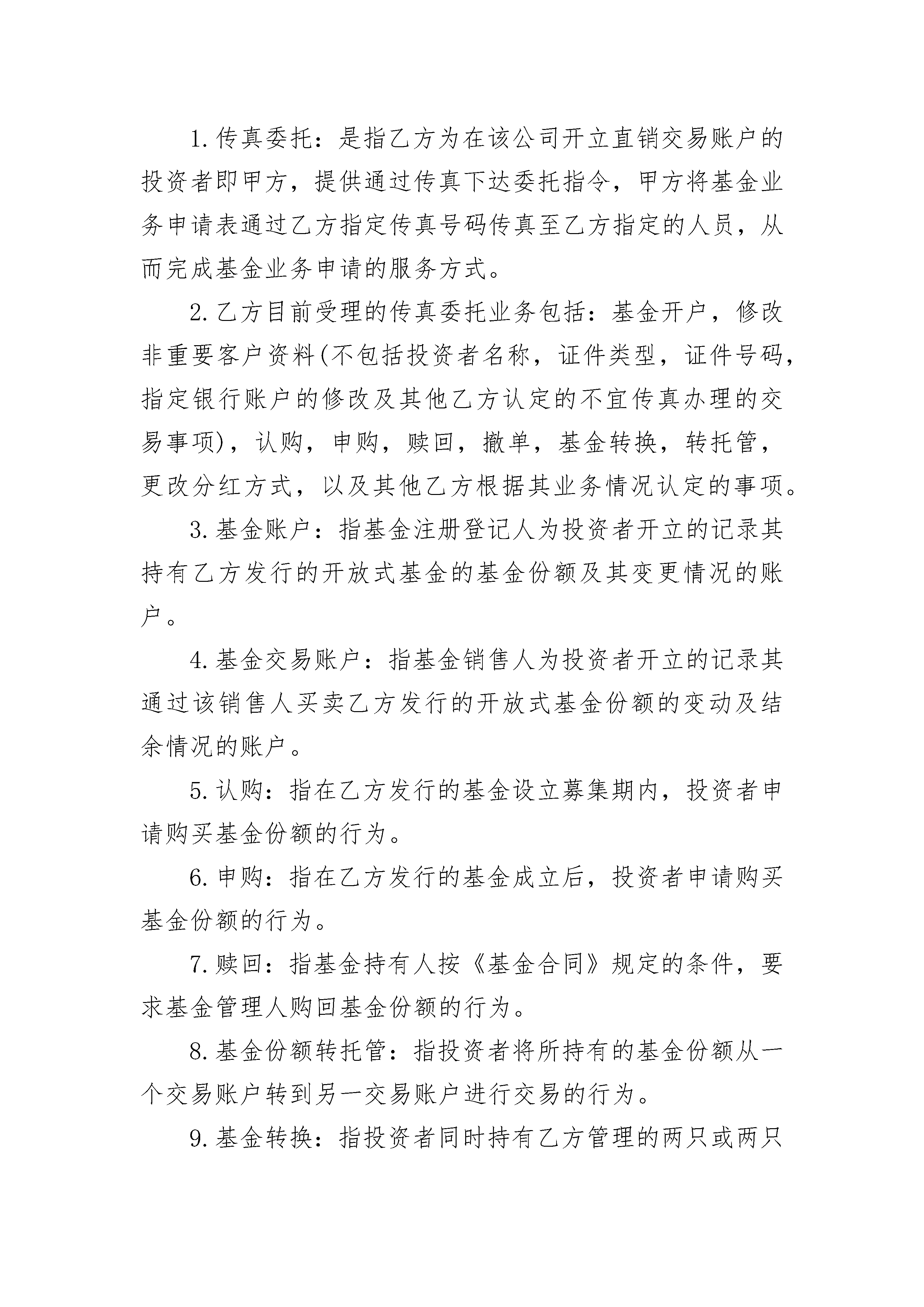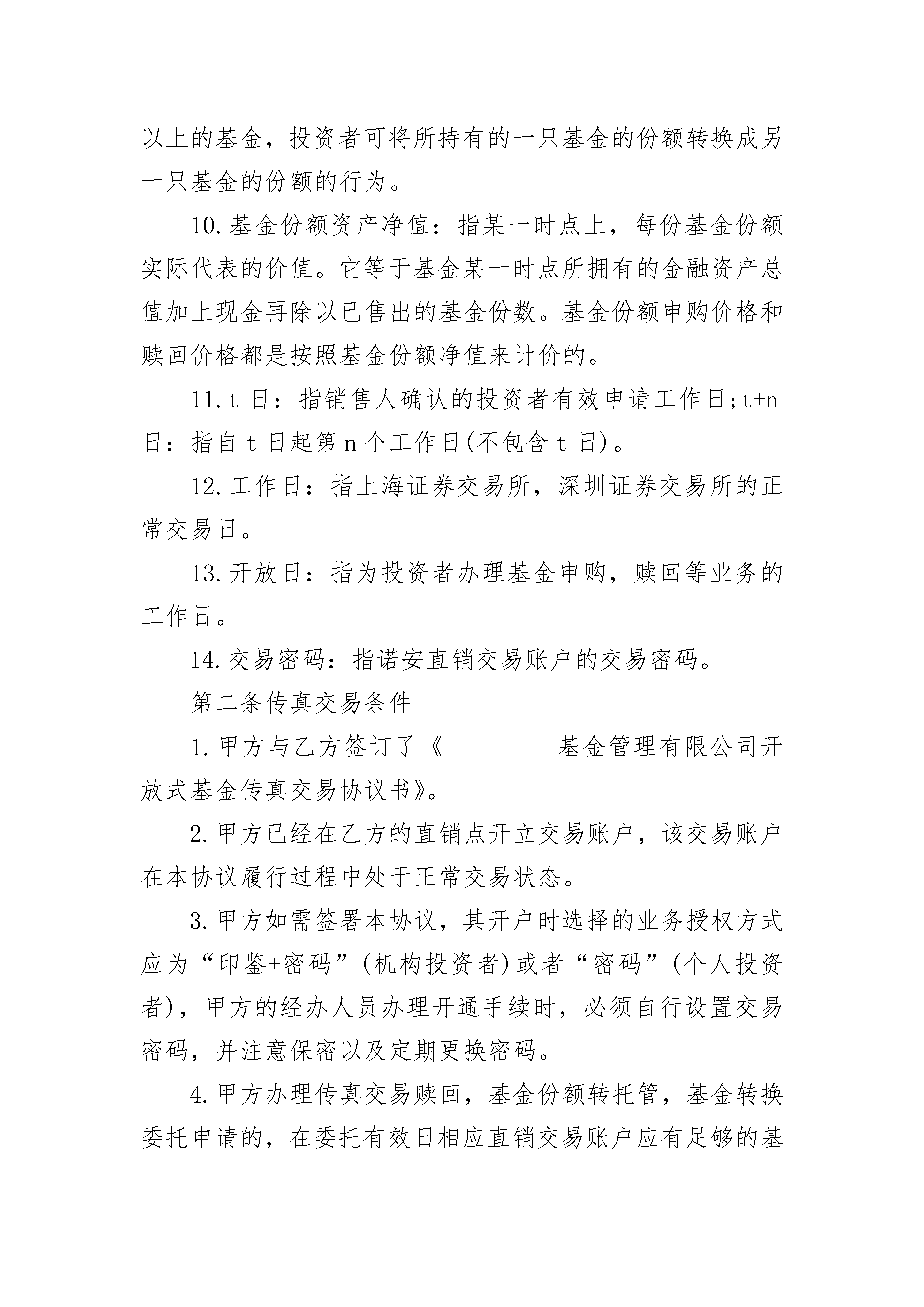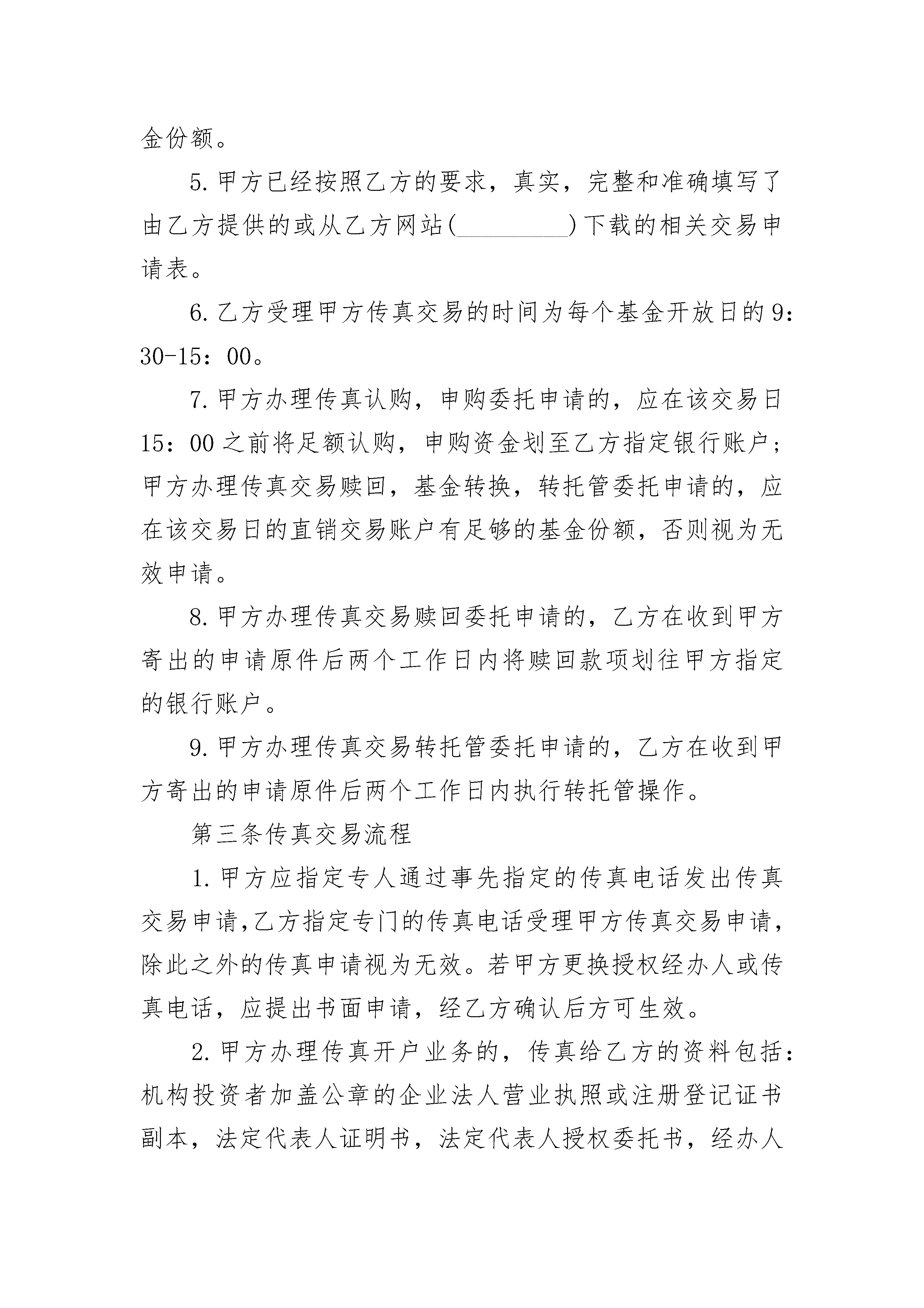 开放式基金传真交易协议书开放式基金传真交易协议书(精选3篇)开放式基金传真交易协议书篇1甲方:_________证件类型:_________证件号码:_________基金帐号:_________业务经办人:_________传真电话:_________联系电话:_________地址:_________乙方:_________地址:_________电话:_________联系人:_________委托服务传真电话:_________传真确认专线:_________为便于甲方在乙方的直销机构办理基金业务,依照国家有关法律,法规及乙方有关规章制度,甲乙双方本着平等,自愿的原则,经过友好协商,就甲方采用传真委托的方式办理基金业务申请达成如下协议:第一条释义除非本协议文意另有所指,下列词语具有如下含义:1.传真委托:是指乙方为在该公司开立直销交易账户的投资者即甲方,提供通过传真下达委托指令,甲方将基金业务申请表通过乙方指定传真号码传真至乙方指定的人员,从而完成基金业务申请的服务方式。2.乙方目前受理的传真委托业务包括:基金开户,修改非重要客户资料(不包括投资者名称,证件类型,证件号码,指定银行账户的修改及其他乙方认定的不宜传真办理的交易事项),认购,申购,赎回,撤单,基金转换,转托管,更改分红方式,以及其他乙方根据其业务情况认定的事项。3.基金账户:指基金注册登记人为投资者开立的记录其持有乙方发行的开放式基金的基金份额及其变更情况的账户。4.基金交易账户:指基金销售人为投资者开立的记录其通过该销售人买卖乙方发行的开放式基金份额的变动及结余情况的账户。5.认购:指在乙方发行的基金设立募集期内,投资者申请购买基金份额的行为。6.申购:指在乙方发行的基金成立后,投资者申请购买基金份额的行为。7.赎回:指基金持有人按《基金合同》规定的条件,要求基金管理人购回基金份额的行为。8.基金份额转托管:指投资者将所持有的基金份额从一个交易账户转到另一交易账户进行交易的行为。9.基金转换:指投资者同时持有乙方管理的两只或两只以上的基金,投资者可将所持有的一只基金的份额转换成另一只基金的份额的行为。10.基金份额资产净值:指某一时点上,每份基金份额实际代表的价值。它等于基金某一时点所拥有的金融资产总值加上现金再除以已售出的基金份数。基金份额申购价格和赎回价格都是按照基金份额净值来计价的。11.t日:指销售人确认的投资者有效申请工作日;t+n日:指自t日起第n个工作日(不包含t日)。12.工作日:指上海证券交易所,深圳证券交易所的正常交易日。13.开放日:指为投资者办理基金申购,赎回等业务的工作日。14.交易密码:指诺安直销交易账户的交易密码。第二条传真交易条件1.甲方与乙方签订了《_________基金管理有限公司开放式基金传真交易协议书》。2.甲方已经在乙方的直销点开立交易账户,该交易账户在本协议履行过程中处于正常交易状态。3.甲方如需签署本协议,其开户时选择的业务授权方式应为“印鉴+密码”(机构投资者)或者“密码”(个人投资者),甲方的经办人员办理开通手续时,必须自行设置交易密码,并注意保密以及定期更换密码。4.甲方办理传真交易赎回,基金份额转托管,基金转换委托申请的,在委托有效日相应直销交易账户应有足够的基金份额。5.甲方已经按照乙方的要求,真实,完整和准确填写了由乙方提供的或从乙方网站(_________)下载的相关交易申请表。6.乙方受理甲方传真交易的时间为每个基金开放日的9:30-15:00。7.甲方办理传真认购,申购委托申请的,应在该交易日15:00之前将足额认购,申购资金划至乙方指定银行账户;甲方办理传真交易赎回,基金转换,转托管委托申请的,应在该交易日的直销交易账户有足够的基金份额,否则视为无效申请。8.甲方办理传真交易赎回委托申请的,乙方在收到甲方寄出的申请原件后两个工作日内将赎回款项划往甲方指定的银行账户。9.甲方办理传真交易转托管委托申请的,乙方在收到甲方寄出的申请原件后两个工作日内执行转托管操作。第三条传真交易流程1.甲方应指定专人通过事先指定的传真电话发出传真交易申请,乙方指定专门的传真电话受理甲方传真交易申请,除此之外的传真申请视为无效。若甲方更换授权经办人或传真电话,应提出书面申请,经乙方确认后方可生效。2.甲方办理传真开户业务的,传真给乙方的资料包括:机构投资者加盖公章的企业法人营业执照或注册登记证书副本,法定代表人证明书,法定代表人授权委托书,经办人有效身份证件,预留印鉴卡,指定银行账户的《开户许可证》或《开立银行账户申请表》,填妥并加盖公章的申请表;个人投资者本人有效身份证件,指定银行账户的银行存折或银行卡,代办人有效身份证件,授权委托书,填妥的申请表。(1)甲方办理传真资料变更业务的,传真给乙方的资料包括:机