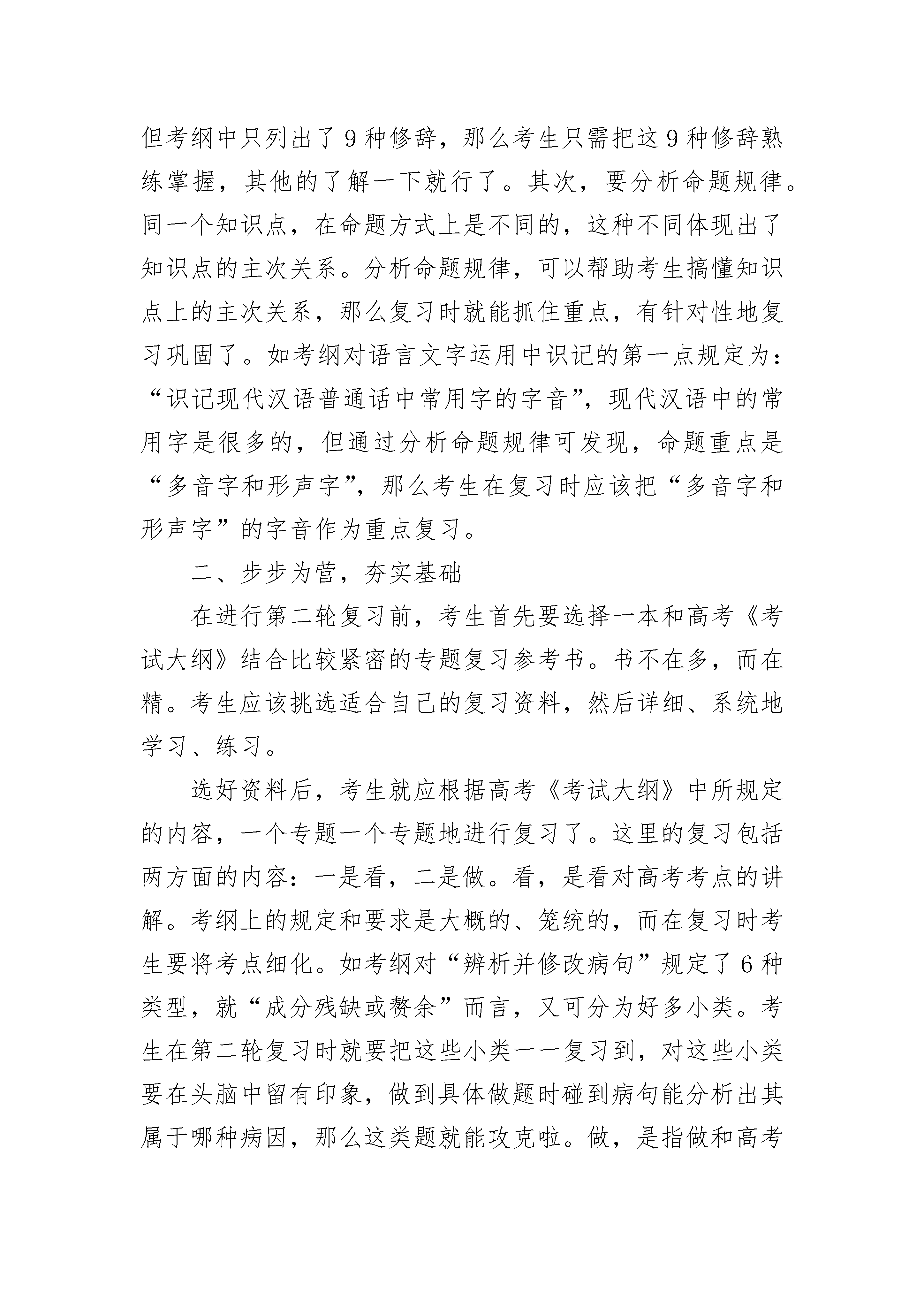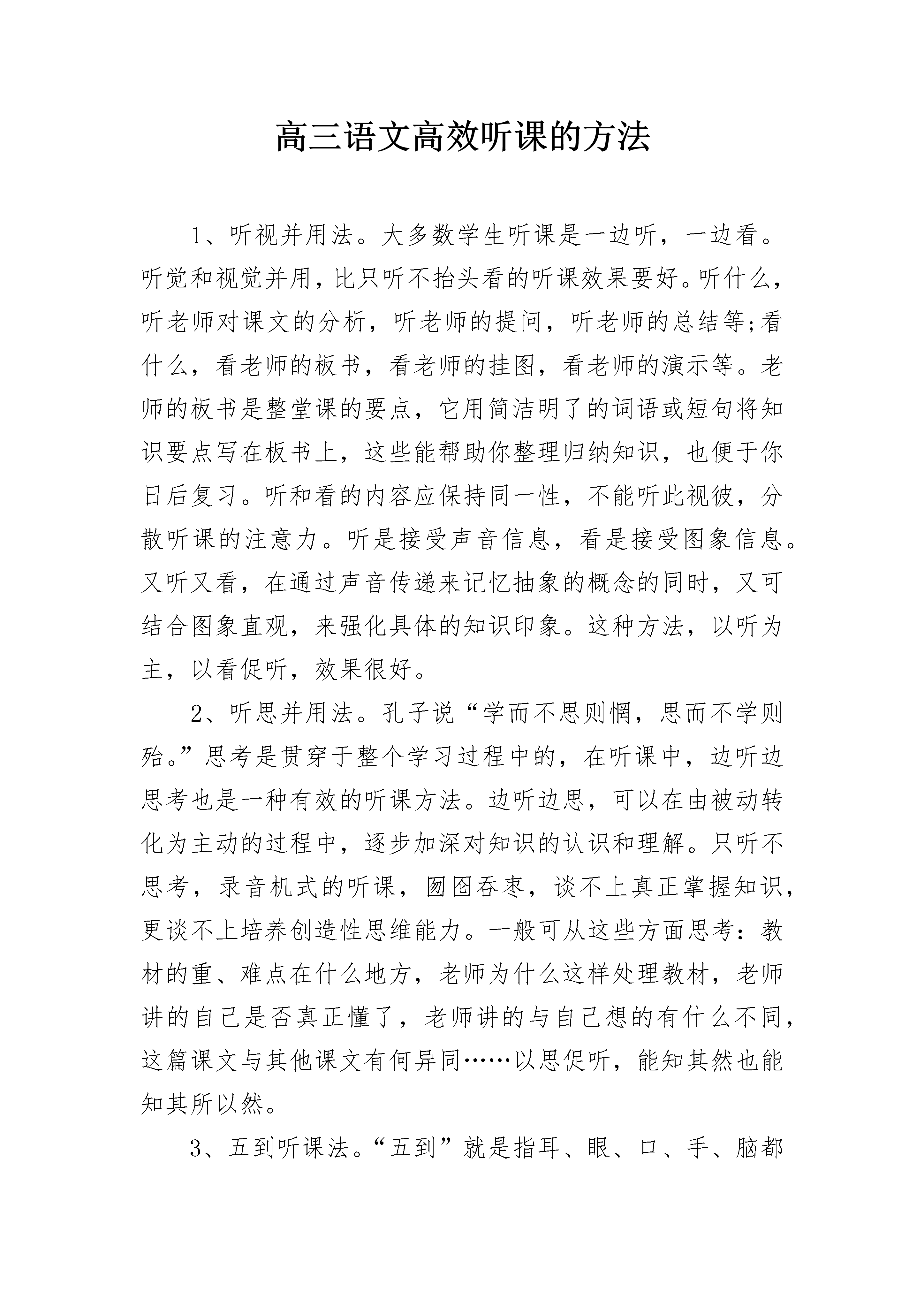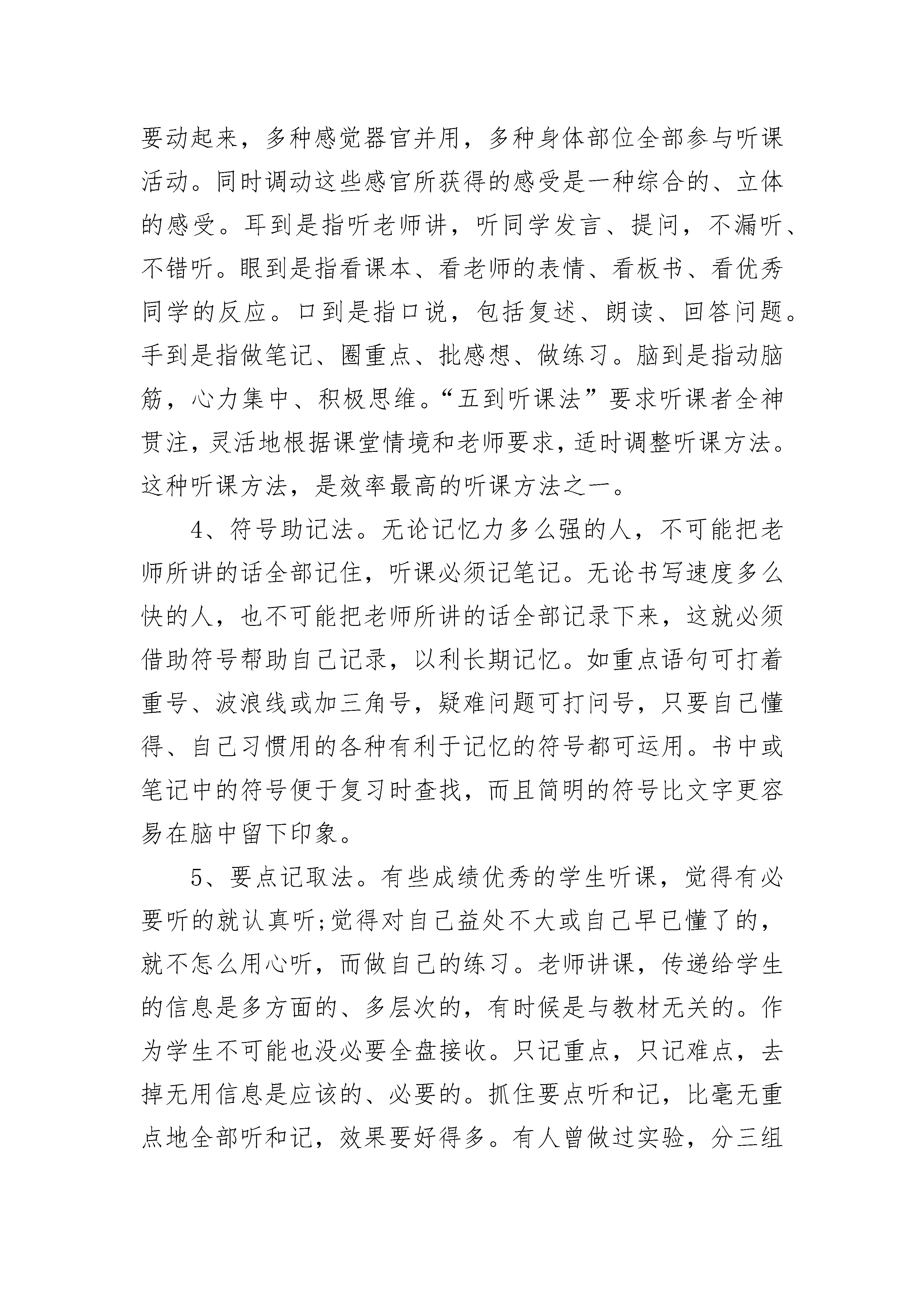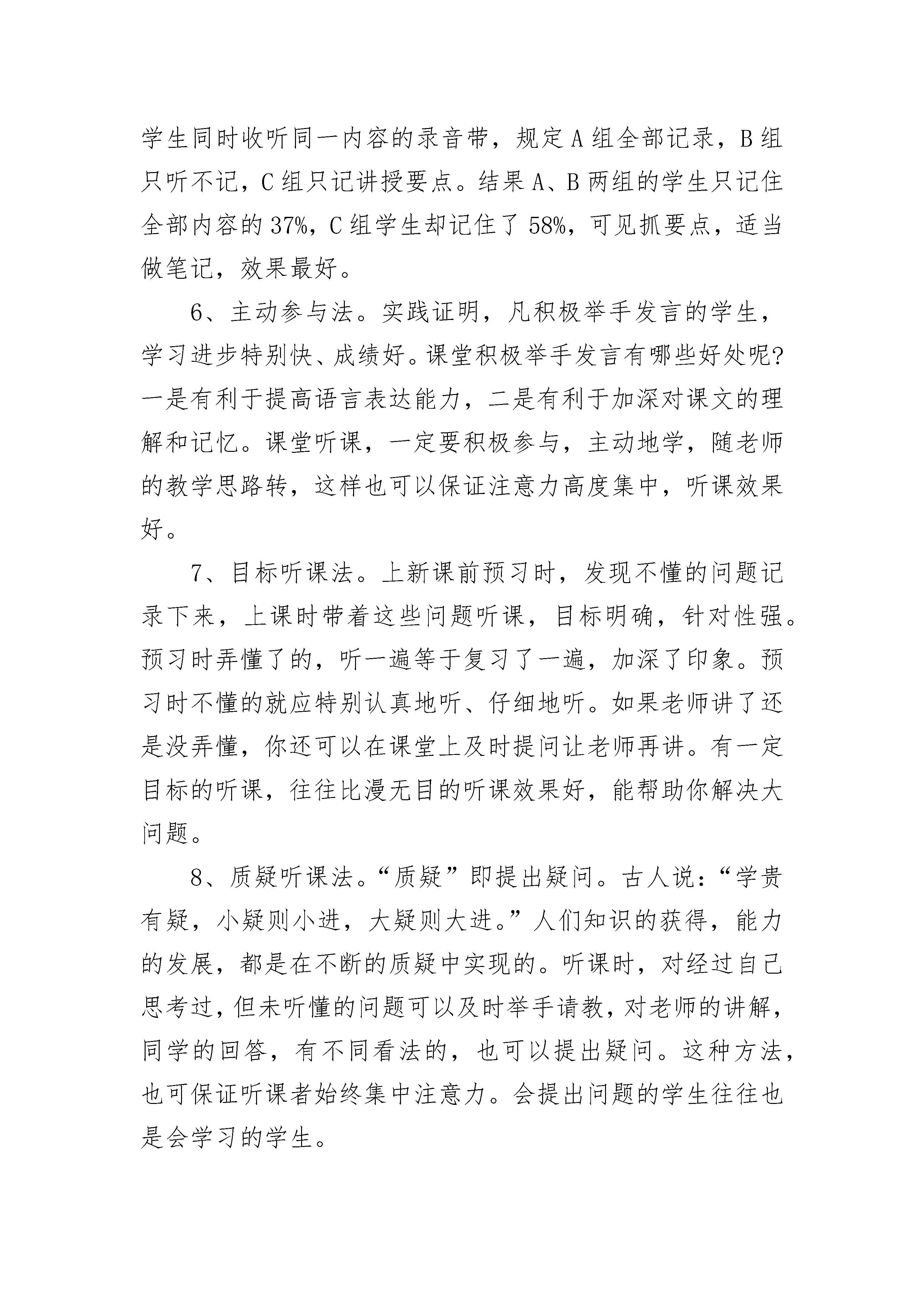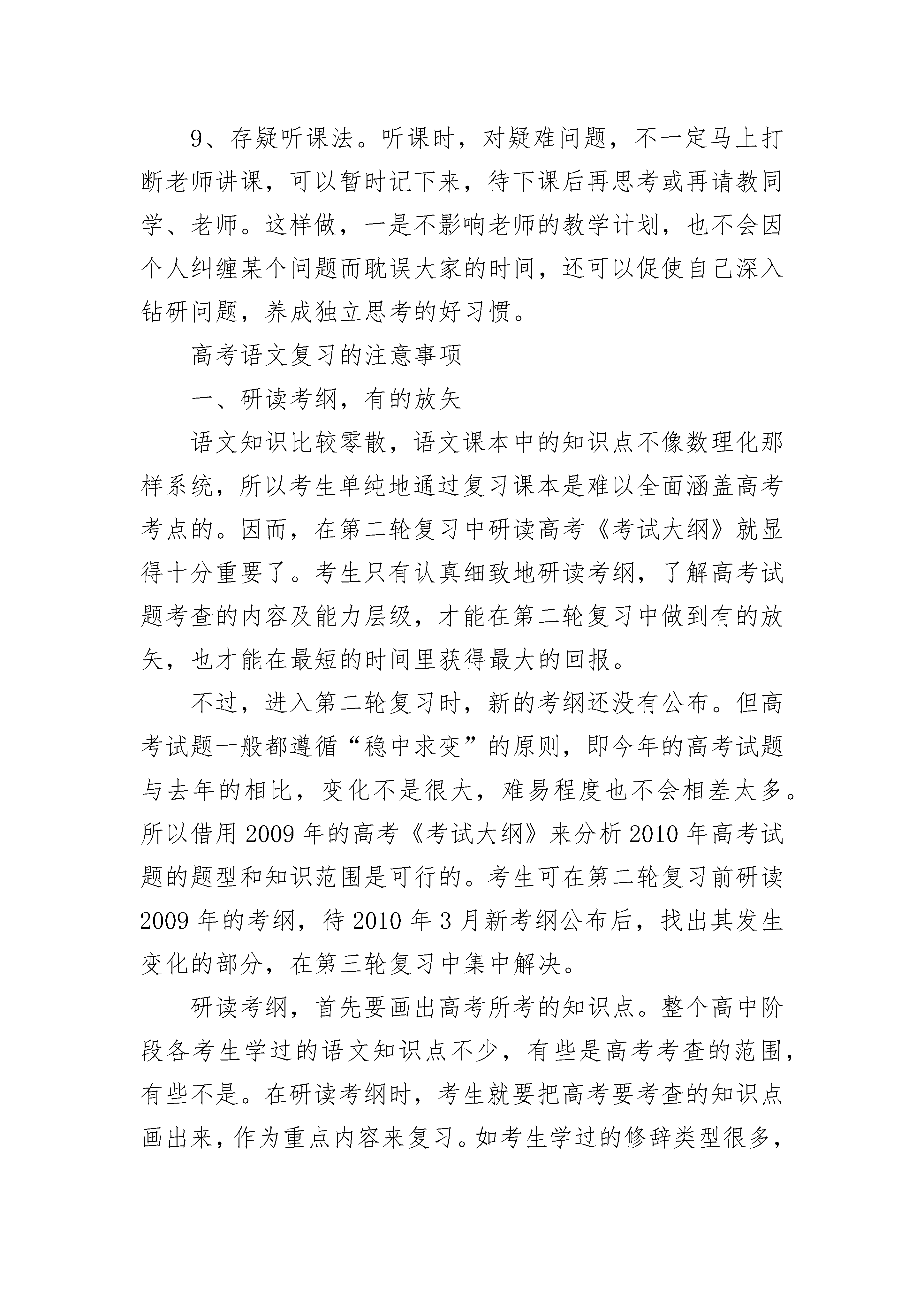 高三语文高效听课的方法1、听视并用法。大多数学生听课是一边听,一边看。听觉和视觉并用,比只听不抬头看的听课效果要好。听什么,听老师对课文的分析,听老师的提问,听老师的总结等;看什么,看老师的板书,看老师的挂图,看老师的演示等。老师的板书是整堂课的要点,它用简洁明了的词语或短句将知识要点写在板书上,这些能帮助你整理归纳知识,也便于你日后复习。听和看的内容应保持同一性,不能听此视彼,分散听课的注意力。听是接受声音信息,看是接受图象信息。又听又看,在通过声音传递来记忆抽象的概念的同时,又可结合图象直观,来强化具体的知识印象。这种方法,以听为主,以看促听,效果很好。2、听思并用法。孔子说“学而不思则惘,思而不学则殆。”思考是贯穿于整个学习过程中的,在听课中,边听边思考也是一种有效的听课方法。边听边思,可以在由被动转化为主动的过程中,逐步加深对知识的认识和理解。只听不思考,录音机式的听课,囫囵吞枣,谈不上真正掌握知识,更谈不上培养创造性思维能力。一般可从这些方面思考:教材的重、难点在什么地方,老师为什么这样处理教材,老师讲的自己是否真正懂了,老师讲的与自己想的有什么不同,这篇课文与其他课文有何异同……以思促听,能知其然也能知其所以然。3、五到听课法。“五到”就是指耳、眼、口、手、脑都要动起来,多种感觉器官并用,多种身体部位全部参与听课活动。同时调动这些感官所获得的感受是一种综合的、立体的感受。耳到是指听老师讲,听同学发言、提问,不漏听、不错听。眼到是指看课本、看老师的表情、看板书、看优秀同学的反应。口到是指口说,包括复述、朗读、回答问题。手到是指做笔记、圈重点、批感想、做练习。脑到是指动脑筋,心力集中、积极思维。“五到听课法”要求听课者全神贯注,灵活地根据课堂情境和老师要求,适时调整听课方法。这种听课方法,是效率最高的听课方法之一。4、符号助记法。无论记忆力多么强的人,不可能把老师所讲的话全部记住,听课必须记笔记。无论书写速度多么快的人,也不可能把老师所讲的话全部记录下来,这就必须借助符号帮助自己记录,以利长期记忆。如重点语句可打着重号、波浪线或加三角号,疑难问题可打问号,只要自己懂得、自己习惯用的各种有利于记忆的符号都可运用。书中或笔记中的符号便于复习时查找,而且简明的符号比文字更容易在脑中留下印象。5、要点记取法。有些成绩优秀的学生听课,觉得有必要听的就认真听;觉得对自己益处不大或自己早已懂了的,就不怎么用心听,而做自己的练习。老师讲课,传递给学生的信息是多方面的、多层次的,有时候是与教材无关的。作为学生不可能也没必要全盘接收。只记重点,只记难点,去掉无用信息是应该的、必要的。抓住要点听和记,比毫无重点地全部听和记,效果要好得多。有人曾做过实验,分三组学生同时收听同一内容的录音带,规定A组全部记录,B组只听不记,C组只记讲授要点。结果A、B两组的学生只记住全部内容的37%,C组学生却记住了58%,可见抓要点,适当做笔记,效果最好。6、主动参与法。实践证明,凡积极举手发言的学生,学习进步特别快、成绩好。课堂积极举手发言有哪些好处呢?一是有利于提高语言表达能力,二是有利于加深对课文的理解和记忆。课堂听课,一定要积极参与,主动地学,随老师的教学思路转,这样也可以保证注意力高度集中,听课效果好。7、目标听课法。上新课前预习时,发现不懂的问题记录下来,上课时带着这些问题听课,目标明确,针对性强。预习时弄懂了的,听一遍等于复习了一遍,加深了印象。预习时不懂的就应特别认真地听、仔细地听。如果老师讲了还是没弄懂,你还可以在课堂上及时提问让老师再讲。有一定目标的听课,往往比漫无目的听课效果好,能帮助你解决大问题。8、质疑听课法。“质疑”即提出疑问。古人说:“学贵有疑,小疑则小进,大疑则大进。”人们知识的获得,能力的发展,都是在不断的质疑中实现的。听课时,对经过自己思考过,但未听懂的问题可以及时举手请教,对老师的讲解,同学的回答,有不同看法的,也可以提出疑问。这种方法,也可保证听课者始终集中注意力。会提出问题的学生往往也是会学习的学生。9、存疑听课法。听课时,对疑难问题,不一定马上打断老师讲课,可以暂时记下来,待下课后再思考或再请教同学、老师。这样做,一是不影响老师的教学计划,也不会因个人纠缠某个问题而耽误大家的时间,还可以促使自己深入钻研问题,养成独立思考的好习惯。高考语文复习的注意事项一、研读考纲,有的放矢语文知识比较零散,语文课本中的知识点不像数理化那样系统,所以考生单纯地通过复习课本是难以全面涵盖高考考点的。因而,在第二轮复习中研读高考《考试大纲》就显得十分重要了。考生只有认真细致地研读考纲,了解高考试题考查的内容及能力层级,才能在第二轮复习中做到有的放矢,也才能在最短的时间里获得最大的回报。不过,进入第二轮复习时,新的考纲还没有公布。但高