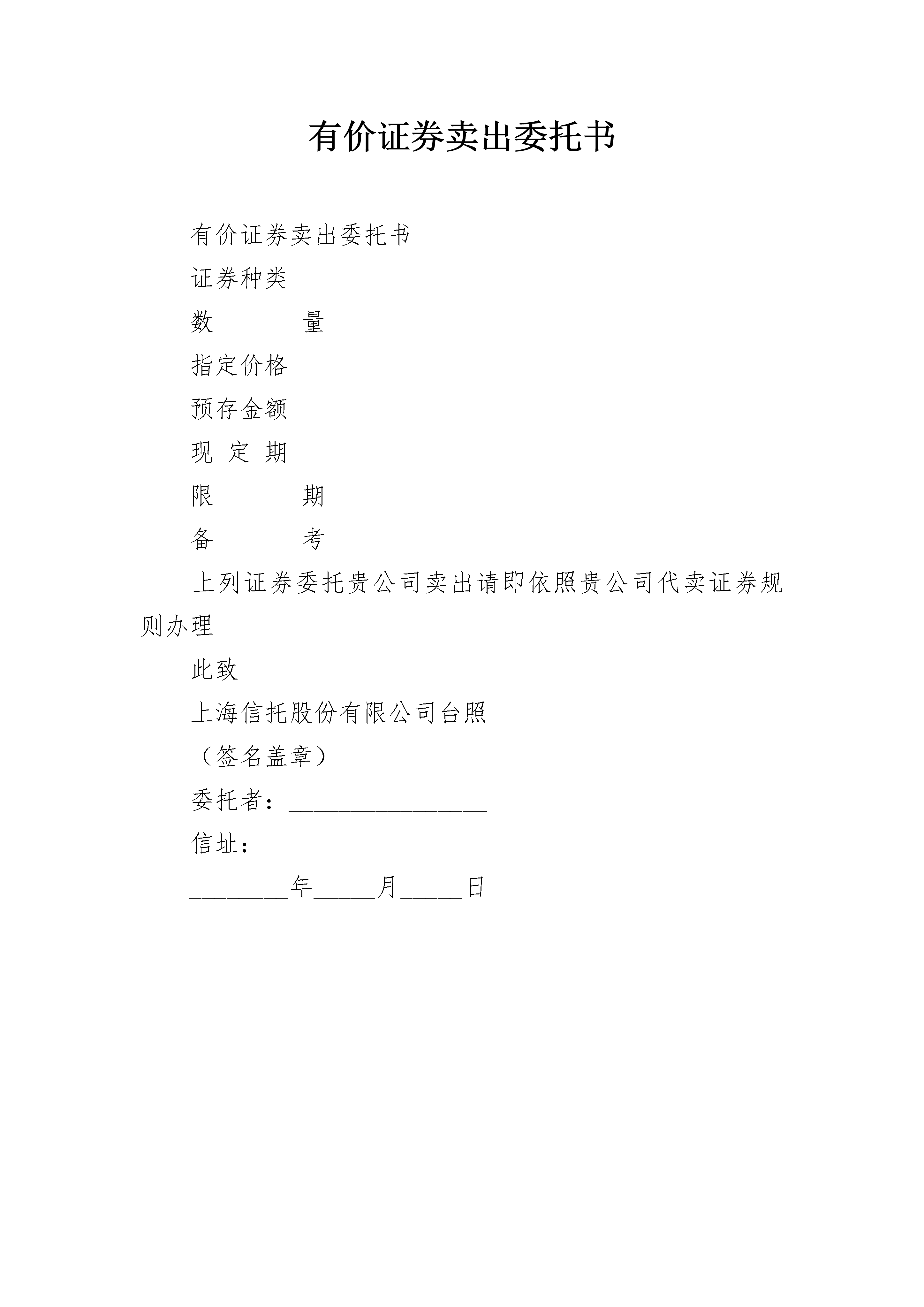 有价证券卖出委托书有价证券卖出委托书证券种类数量指定价格预存金额现定期限期备考上列证券委托贵公司卖出请即依照贵公司代卖证券规则办理此致上海信托股份有限公司台照(签名盖章)____________委托者:________________信址:__________________________年_____月_____日