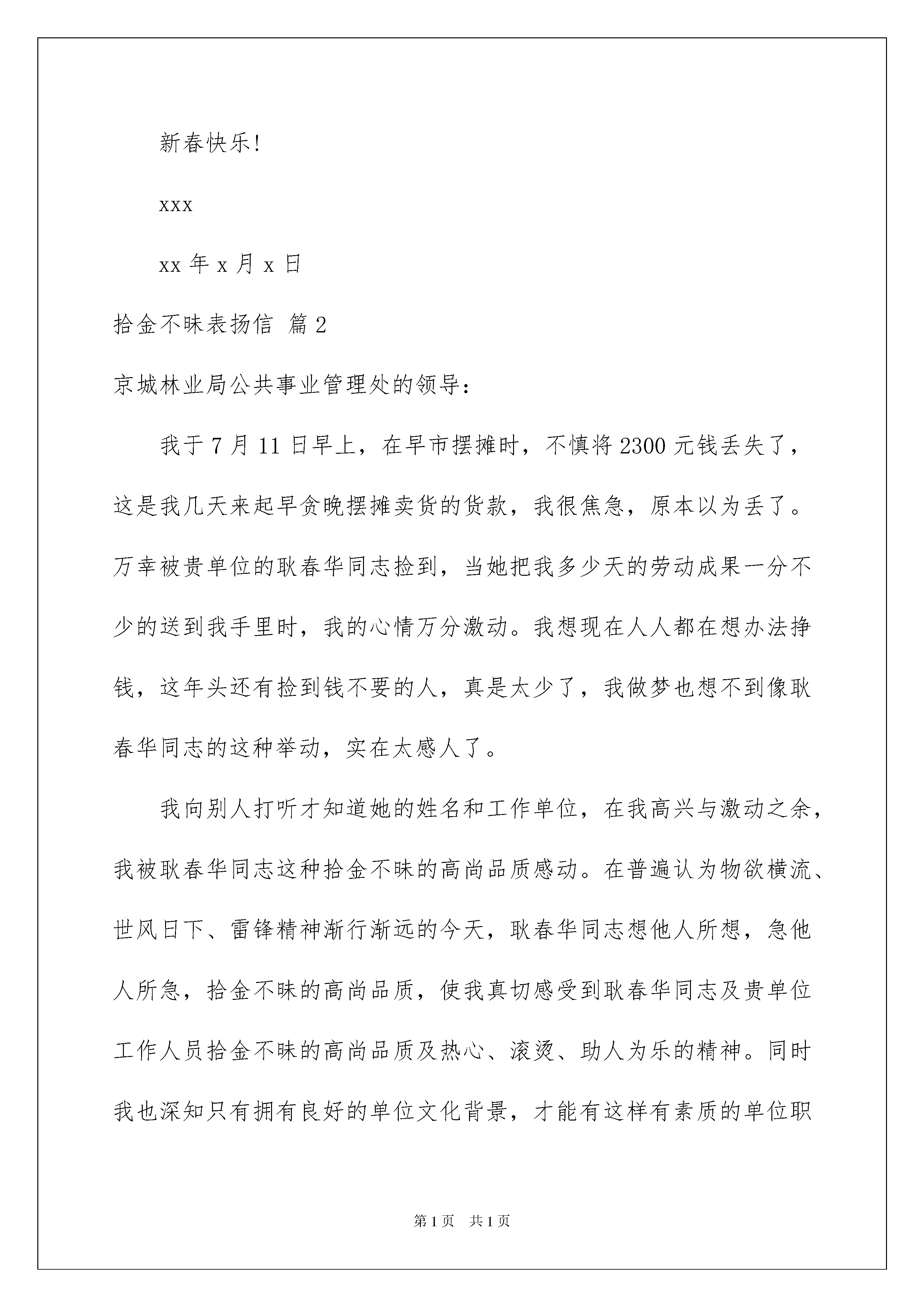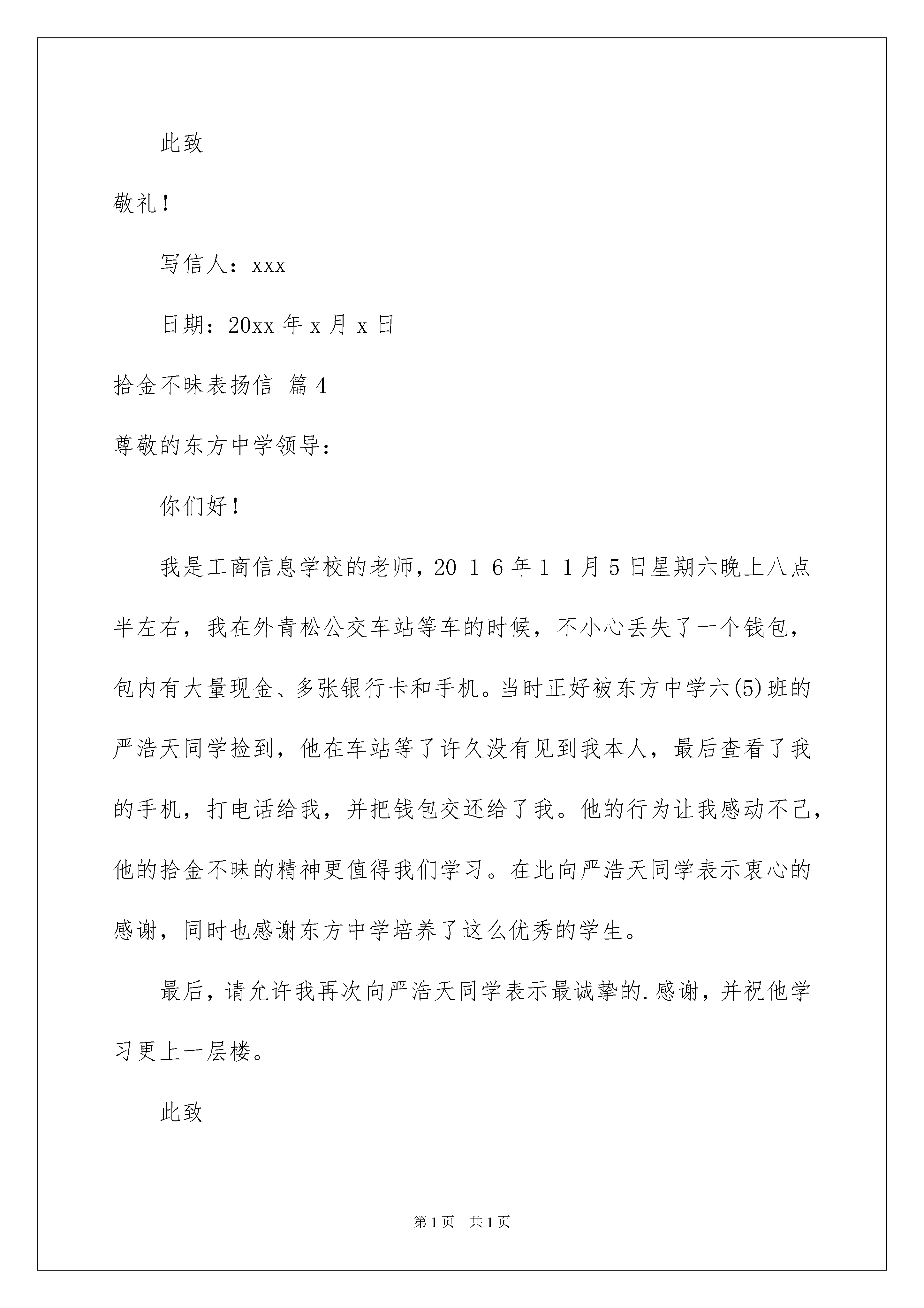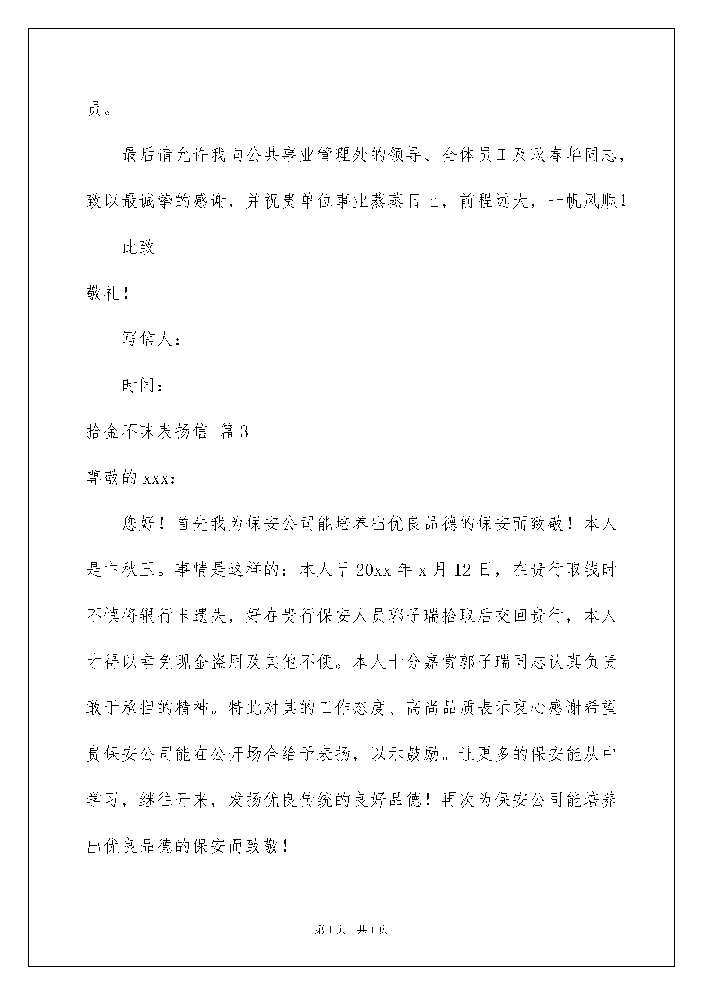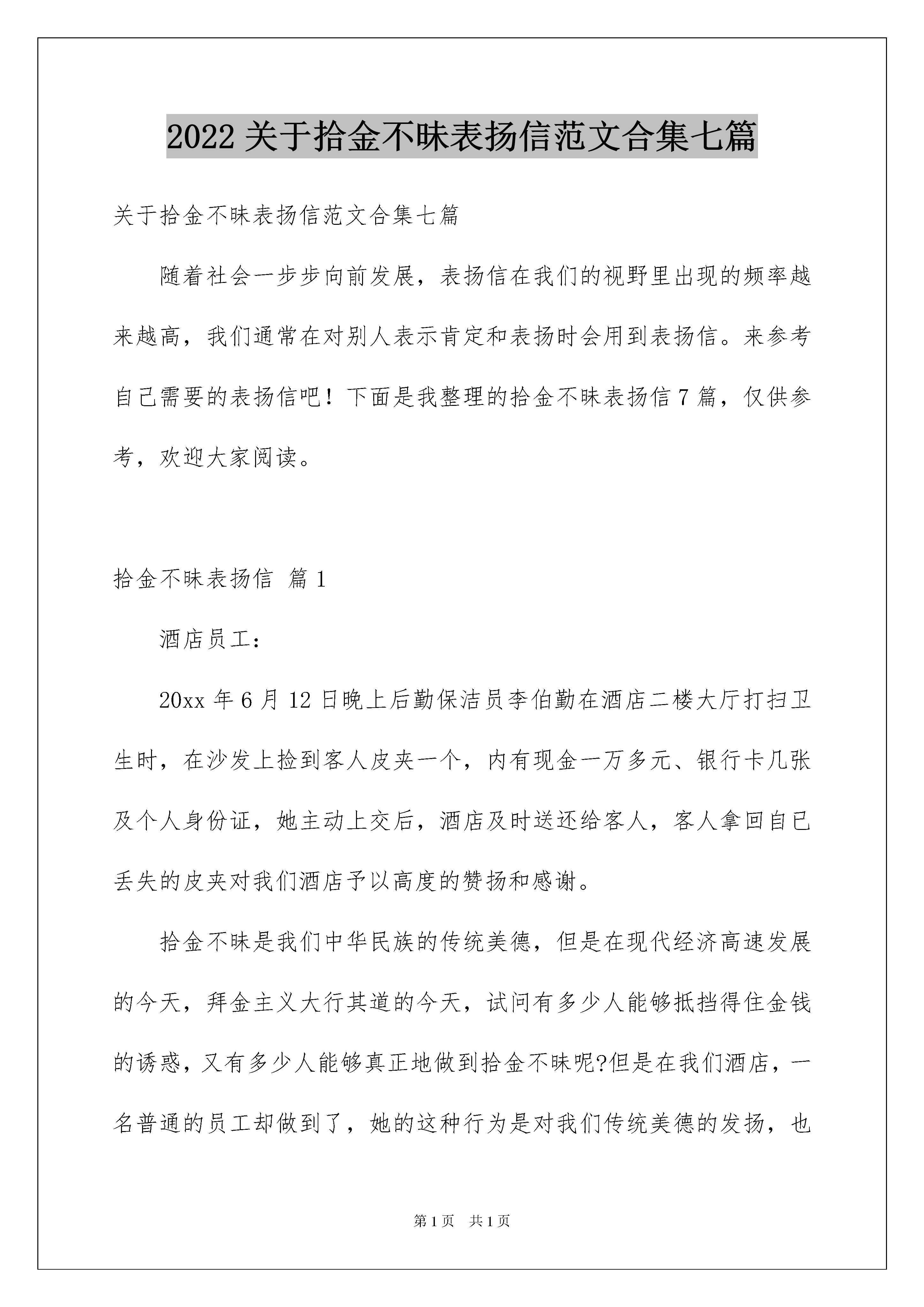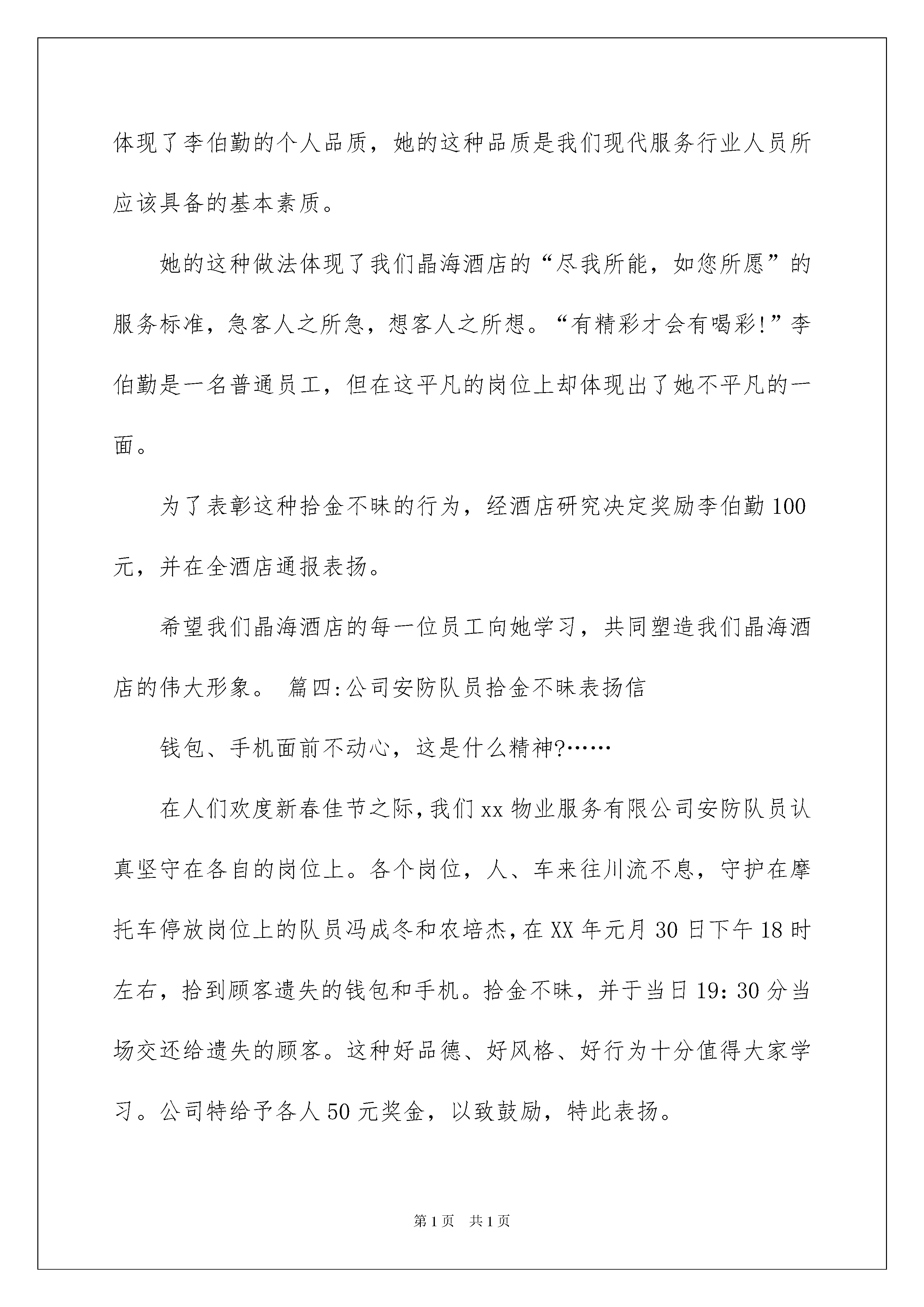 2022关于拾金不昧表扬信范文合集七篇关于拾金不昧表扬信范文合集七篇随着社会一步步向前发展,表扬信在我们的视野里出现的频率越来越高,我们通常在对别人表示肯定和表扬时会用到表扬信。来参考自己需要的表扬信吧!下面是我整理的拾金不昧表扬信7篇,仅供参考,欢迎大家阅读。拾金不昧表扬信篇1酒店员工:20xx年6月12日晚上后勤保洁员李伯勤在酒店二楼大厅打扫卫生时,在沙发上捡到客人皮夹一个,内有现金一万多元、银行卡几张及个人身份证,她主动上交后,酒店及时送还给客人,客人拿回自已丢失的皮夹对我们酒店予以高度的赞扬和感谢。拾金不昧是我们中华民族的传统美德,但是在现代经济高速发展的今天,拜金主义大行其道的今天,试问有多少人能够抵挡得住金钱的诱惑,又有多少人能够真正地做到拾金不昧呢?但是在我们酒店,一名普通的员工却做到了,她的这种行为是对我们传统美德的发扬,也体现了李伯勤的个人品质,她的这种品质是我们现代服务行业人员所应该具备的基本素质。她的这种做法体现了我们晶海酒店的“尽我所能,如您所愿”的服务标准,急客人之所急,想客人之所想。“有精彩才会有喝彩!”李伯勤是一名普通员工,但在这平凡的岗位上却体现出了她不平凡的一面。为了表彰这种拾金不昧的行为,经酒店研究决定奖励李伯勤100元,并在全酒店通报表扬。希望我们晶海酒店的每一位员工向她学习,共同塑造我们晶海酒店的伟大形象。篇四:公司安防队员拾金不昧表扬信钱包、手机面前不动心,这是什么精神?……在人们欢度新春佳节之际,我们xx物业服务有限公司安防队员认真坚守在各自的岗位上。各个岗位,人、车来往川流不息,守护在摩托车停放岗位上的队员冯成冬和农培杰,在XX年元月30日下午18时左右,拾到顾客遗失的钱包和手机。拾金不昧,并于当日19:30分当场交还给遗失的顾客。这种好品德、好风格、好行为十分值得大家学习。公司特给予各人50元奖金,以致鼓励,特此表扬。新春快乐!xxxxx年x月x日拾金不昧表扬信篇2京城林业局公共事业管理处的领导:我于7月11日早上,在早市摆摊时,不慎将2300元钱丢失了,这是我几天来起早贪晚摆摊卖货的货款,我很焦急,原本以为丢了。万幸被贵单位的耿春华同志捡到,当她把我多少天的劳动成果一分不少的送到我手里时,我的心情万分激动。我想现在人人都在想办法挣钱,这年头还有捡到钱不要的人,真是太少了,我做梦也想不到像耿春华同志的这种举动,实在太感人了。我向别人打听才知道她的姓名和工作单位,在我高兴与激动之余,我被耿春华同志这种拾金不昧的高尚品质感动。在普遍认为物欲横流、世风日下、雷锋精神渐行渐远的今天,耿春华同志想他人所想,急他人所急,拾金不昧的高尚品质,使我真切感受到耿春华同志及贵单位工作人员拾金不昧的高尚品质及热心、滚烫、助人为乐的精神。同时我也深知只有拥有良好的单位文化背景,才能有这样有素质的单位职员。最后请允许我向公共事业管理处的领导、全体员工及耿春华同志,致以最诚挚的感谢,并祝贵单位事业蒸蒸日上,前程远大,一帆风顺!此致敬礼!写信人:时间:拾金不昧表扬信篇3尊敬的xxx:您好!首先我为保安公司能培养出优良品德的保安而致敬!本人是卞秋玉。事情是这样的:本人于20xx年x月12日,在贵行取钱时不慎将银行卡遗失,好在贵行保安人员郭子瑞拾取后交回贵行,本人才得以幸免现金盗用及其他不便。本人十分嘉赏郭子瑞同志认真负责敢于承担的精神。特此对其的工作态度、高尚品质表示衷心感谢希望贵保安公司能在公开场合给予表扬,以示鼓励。让更多的保安能从中学习,继往开来,发扬优良传统的良好品德!再次为保安公司能培养出优良品德的保安而致敬!此致敬礼!写信人:xxx日期:20xx年x月x日拾金不昧表扬信篇4尊敬的东方中学领导:你们好!我是工商信息学校的老师,2016年11月5日星期六晚上八点半左右,我在外青松公交车站等车的时候,不小心丢失了一个钱包,包内有大量现金、多张银行卡和手机。当时正好被东方中学六(5)班的严浩天同学捡到,他在车站等了许久没有见到我本人,最后查看了我的手机,打电话给我,并把钱包交还给了我。他的行为让我感动不己,他的拾金不昧的精神更值得我们学习。在此向严浩天同学表示衷心的感谢,同时也感谢东方中学培养了这么优秀的学生。最后,请允许我再次向严浩天同学表示最诚挚的.感谢,并祝他学习更上一层楼。此致敬礼失主:朱老师20XX年11月7日拾金不昧表扬信篇5尊敬的xxx:20xx年x月xx日晚上8点左右,我院轻化112班徐晓凌同学在梁林校区一号楼门口捡到钱包一只,内有近千元现金和卡。面对如此大额的现金诱惑,徐晓凌同学却没有动心,最后将钱包交给梁林校区大门口的值班保卫人员,