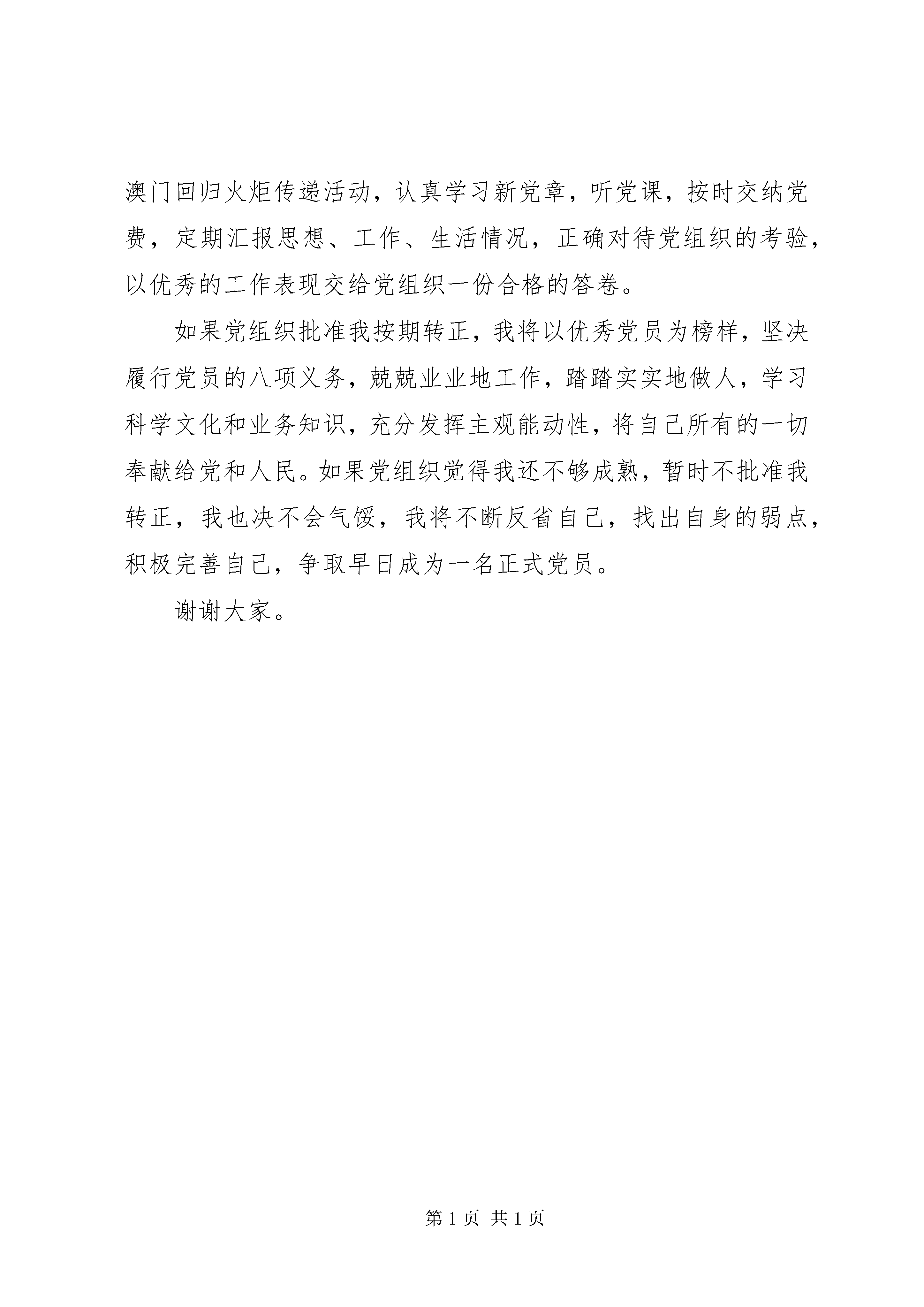 在党小组会议上的发言稿在党小组会议上的发言稿敬爱的党组织:首先我衷心地感谢各位领导、各位党员同志给我的教育和帮助。多年来是你们教我党的知识,让我认识了党、热爱上了党,并决心做一名坚定的共产主义者,也使我找到了人生目标和为之奋斗终身的伟大事业。从我97年8月交了第一封入党申请书以来,至今已有7个年头了。这七年来,我从一个社会青年变为一名光荣的中共预备党员,这是我人生中的一个重要转折,同时,也是我政治生命的开端。作为一名预备党员,我在政治上积极要求上进,自觉学习马列主义、毛泽东思想、邓小平理论,坚持四项基本原则,坚持改革开放,增强贯彻执行党的基本路线的自觉性和坚定性,学习党的基本知识,正确对待客观问题,在重大政治事件中始终与党中央保持一致,特别是去年发生了三场重大的政治斗争,作为一名预备党员,我每天关注新闻,关心事态发展,虽然我当时在休产假,但我及时把自己的认识、想法以书面形式向党组织作了汇报,表明了一个预备党员应有的政治立场。从去年10月中旬上班以来,我在较短的时间里熟悉了业务。工作上认真仔细,保持谦虚谨慎的态度,尽管有时需加班加点,但我乐此不疲。业务上坚持实事求是和一丝不句的工作作风,不折不扣地完成领导交给的各项任务。积极参加希望工程捐款和庆澳门回归火炬传递活动,认真学习新党章,听党课,按时交纳党费,定期汇报思想、工作、生活情况,正确对待党组织的考验,以优秀的工作表现交给党组织一份合格的答卷。如果党组织批准我按期转正,我将以优秀党员为榜样,坚决履行党员的八项义务,兢兢业业地工作,踏踏实实地做人,学习科学文化和业务知识,充分发挥主观能动性,将自己所有的一切奉献给党和人民。如果党组织觉得我还不够成熟,暂时不批准我转正,我也决不会气馁,我将不断反省自己,找出自身的弱点,积极完善自己,争取早日成为一名正式党员。谢谢大家。