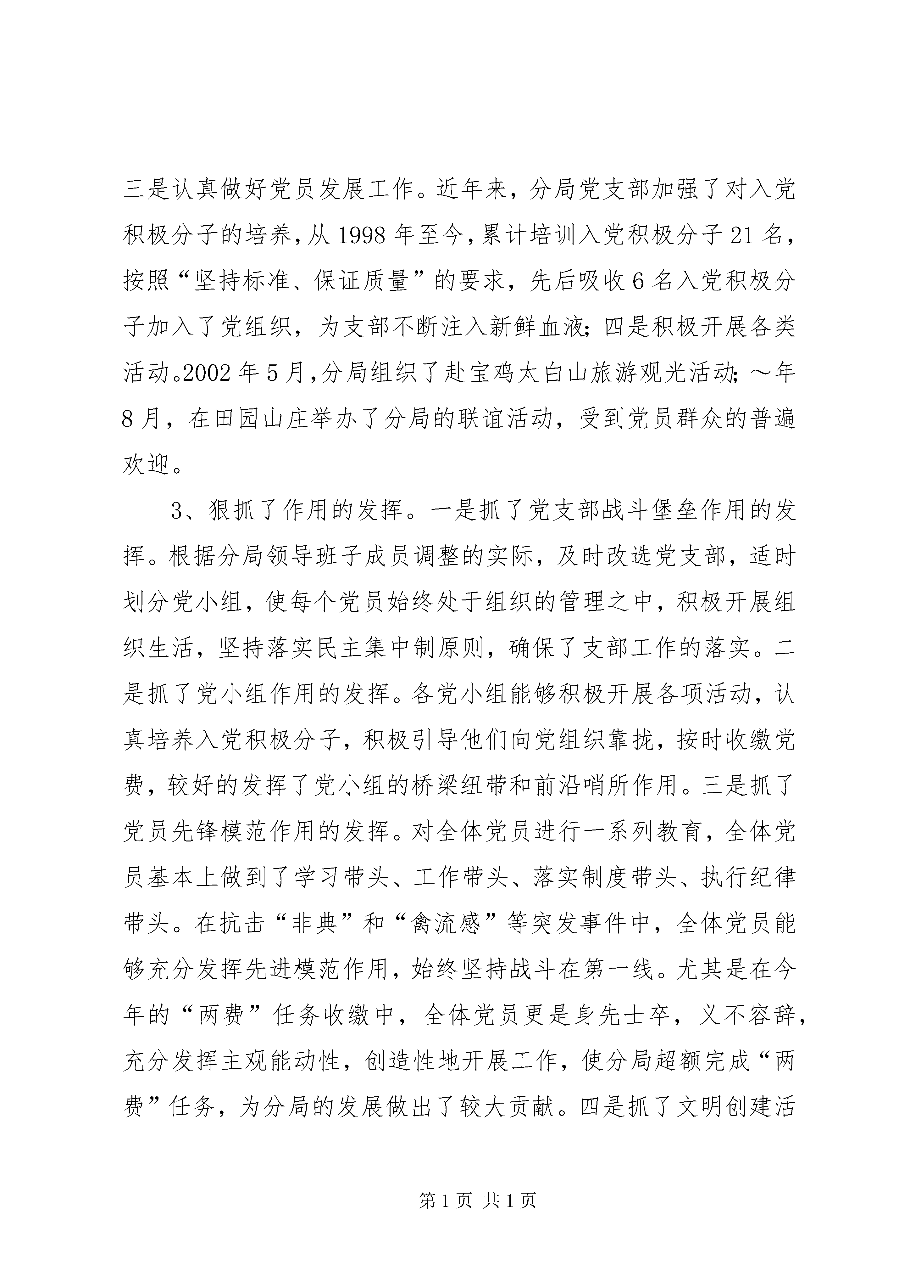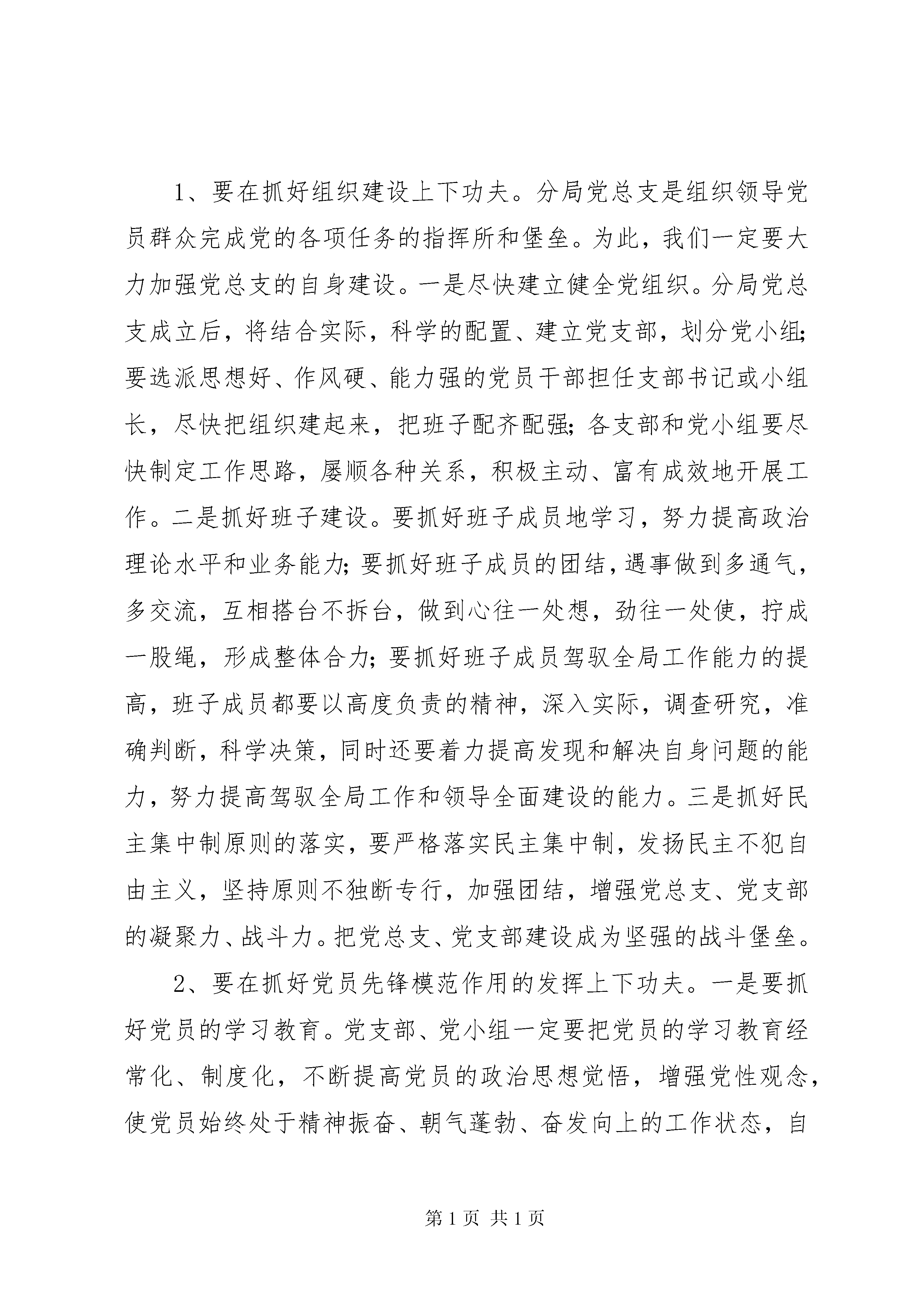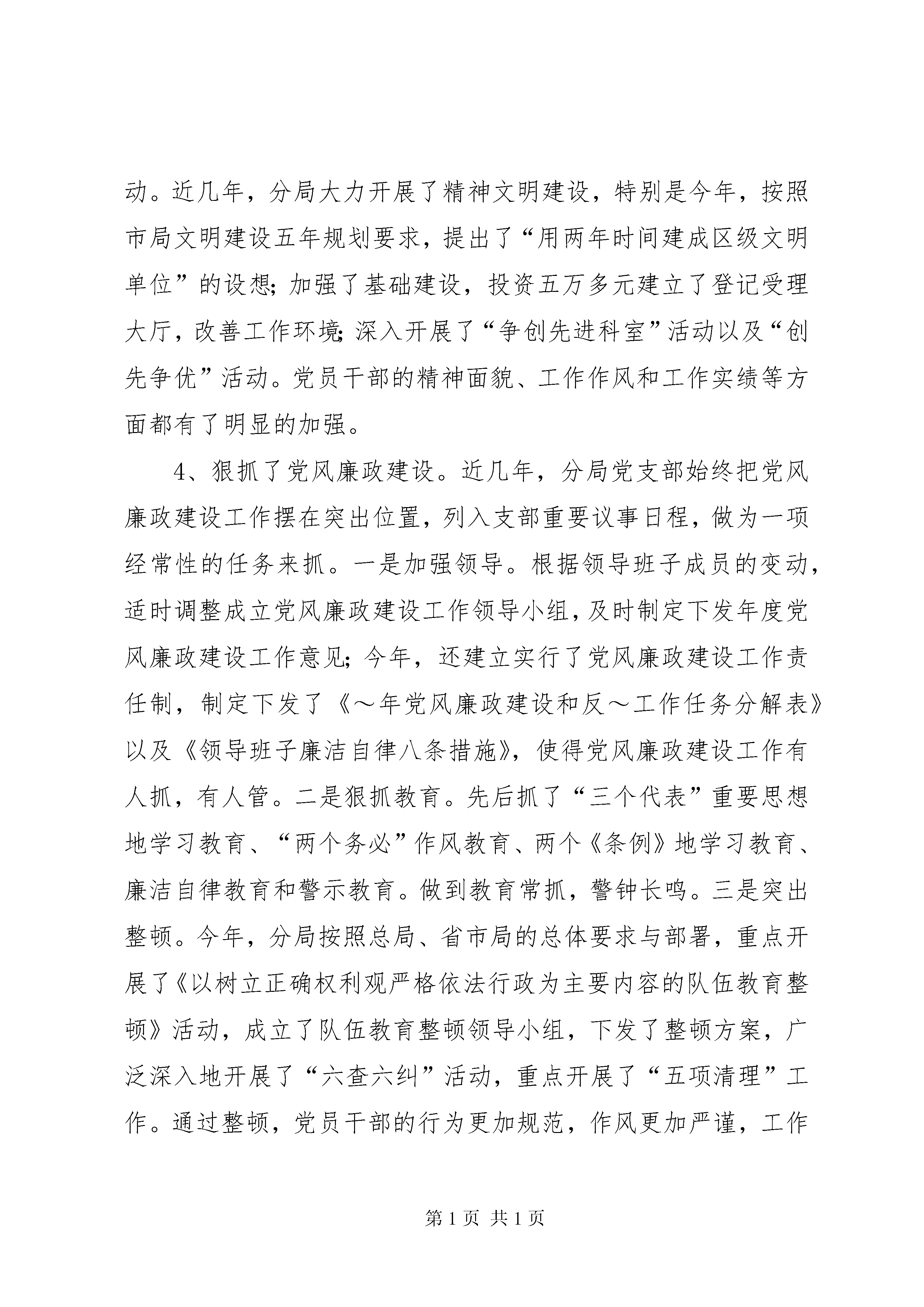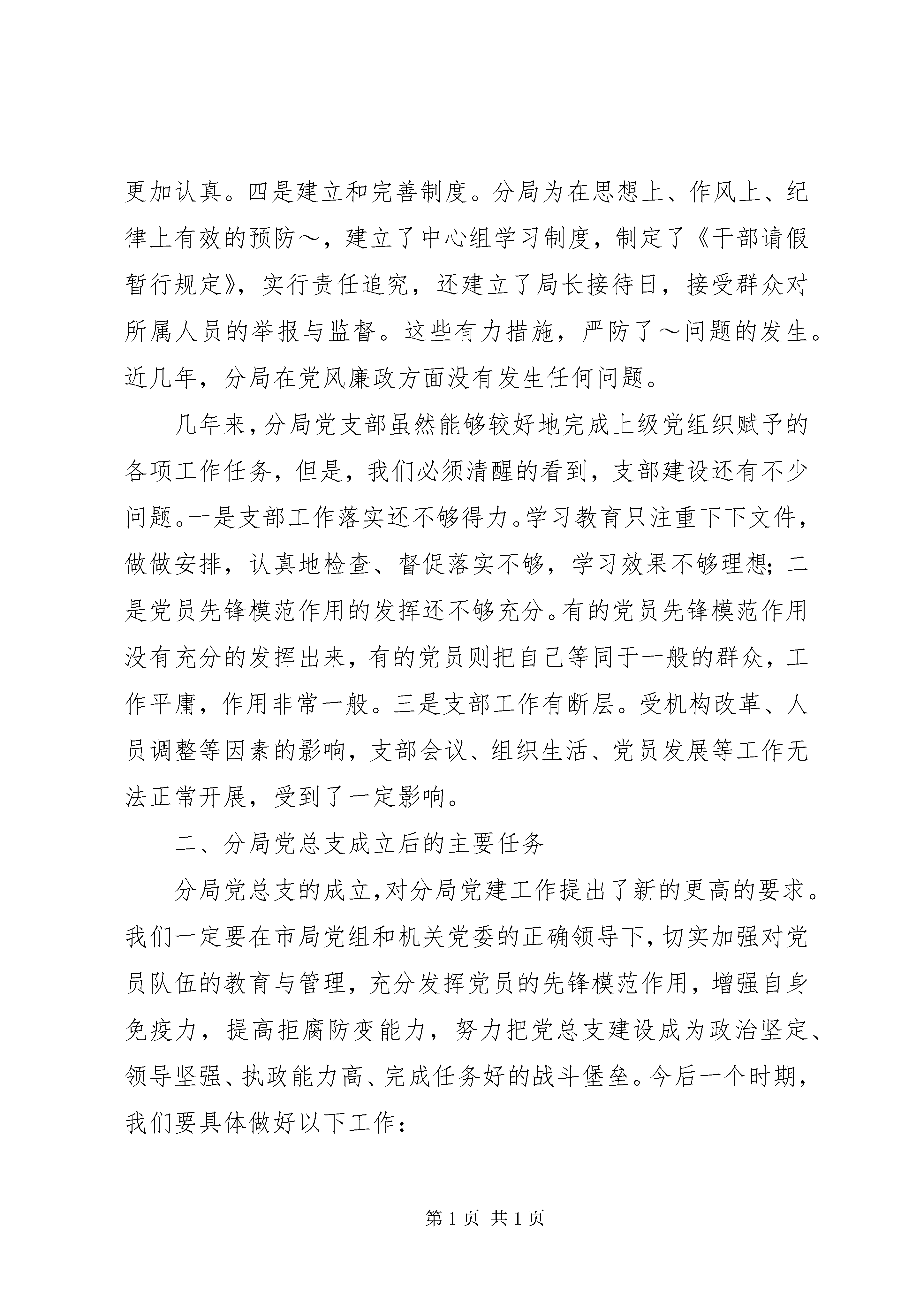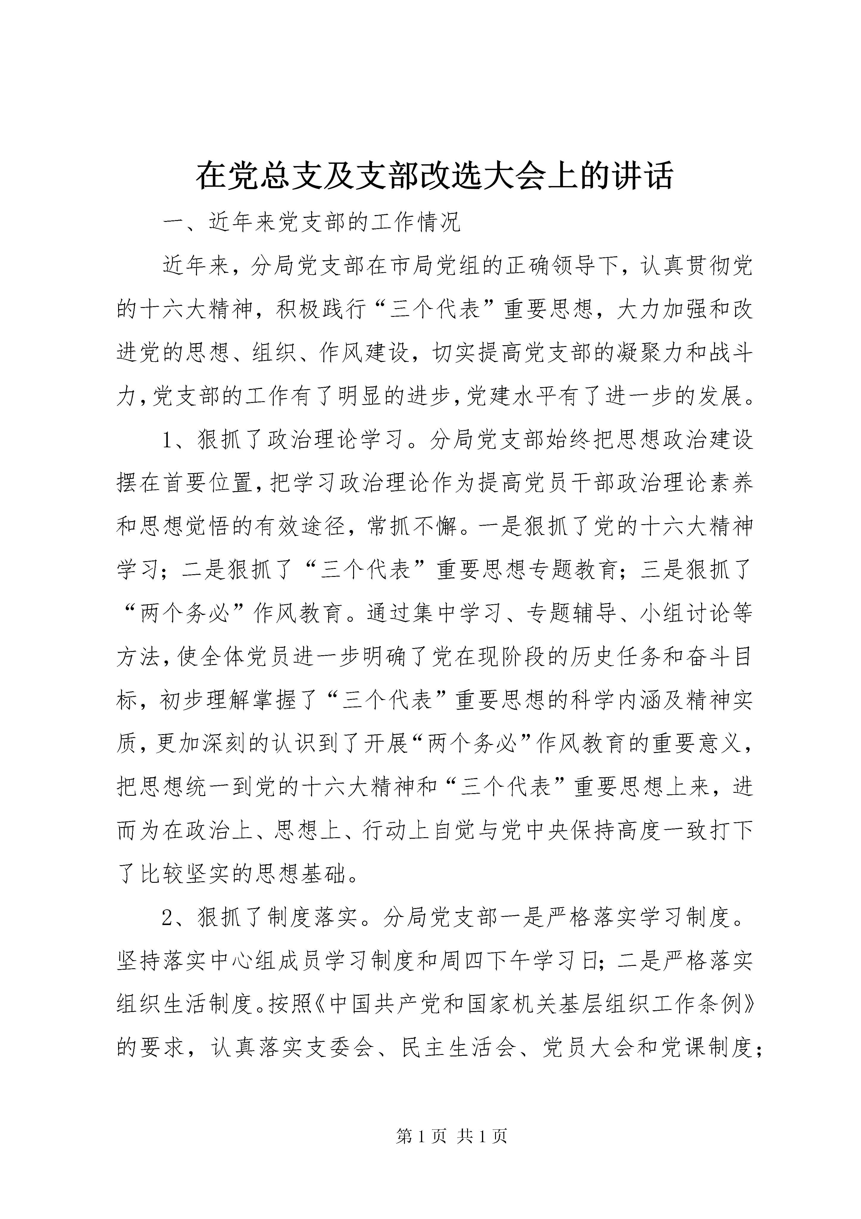 在党总支及支部改选大会上的讲话一、近年来党支部的工作情况近年来,分局党支部在市局党组的正确领导下,认真贯彻党的十六大精神,积极践行“三个代表”重要思想,大力加强和改进党的思想、组织、作风建设,切实提高党支部的凝聚力和战斗力,党支部的工作有了明显的进步,党建水平有了进一步的发展。1、狠抓了政治理论学习。分局党支部始终把思想政治建设摆在首要位置,把学习政治理论作为提高党员干部政治理论素养和思想觉悟的有效途径,常抓不懈。一是狠抓了党的十六大精神学习;二是狠抓了“三个代表”重要思想专题教育;三是狠抓了“两个务必”作风教育。通过集中学习、专题辅导、小组讨论等方法,使全体党员进一步明确了党在现阶段的历史任务和奋斗目标,初步理解掌握了“三个代表”重要思想的科学内涵及精神实质,更加深刻的认识到了开展“两个务必”作风教育的重要意义,把思想统一到党的十六大精神和“三个代表”重要思想上来,进而为在政治上、思想上、行动上自觉与党中央保持高度一致打下了比较坚实的思想基础。2、狠抓了制度落实。分局党支部一是严格落实学习制度。坚持落实中心组成员学习制度和周四下午学习日;二是严格落实组织生活制度。按照《中国共产党和国家机关基层组织工作条例》的要求,认真落实支委会、民主生活会、党员大会和党课制度;三是认真做好党员发展工作。近年来,分局党支部加强了对入党积极分子的培养,从1998年至今,累计培训入党积极分子21名,按照“坚持标准、保证质量”的要求,先后吸收6名入党积极分子加入了党组织,为支部不断注入新鲜血液;四是积极开展各类活动。2002年5月,分局组织了赴宝鸡太白山旅游观光活动;~年8月,在田园山庄举办了分局的联谊活动,受到党员群众的普遍欢迎。3、狠抓了作用的发挥。一是抓了党支部战斗堡垒作用的发挥。根据分局领导班子成员调整的实际,及时改选党支部,适时划分党小组,使每个党员始终处于组织的管理之中,积极开展组织生活,坚持落实民主集中制原则,确保了支部工作的落实。二是抓了党小组作用的发挥。各党小组能够积极开展各项活动,认真培养入党积极分子,积极引导他们向党组织靠拢,按时收缴党费,较好的发挥了党小组的桥梁纽带和前沿哨所作用。三是抓了党员先锋模范作用的发挥。对全体党员进行一系列教育,全体党员基本上做到了学习带头、工作带头、落实制度带头、执行纪律带头。在抗击“非典”和“禽流感”等突发事件中,全体党员能够充分发挥先进模范作用,始终坚持战斗在第一线。尤其是在今年的“两费”任务收缴中,全体党员更是身先士卒,义不容辞,充分发挥主观能动性,创造性地开展工作,使分局超额完成“两费”任务,为分局的发展做出了较大贡献。四是抓了文明创建活动。近几年,分局大力开展了精神文明建设,特别是今年,按照市局文明建设五年规划要求,提出了“用两年时间建成区级文明单位”的设想;加强了基础建设,投资五万多元建立了登记受理大厅,改善工作环境;深入开展了“争创先进科室”活动以及“创先争优”活动。党员干部的精神面貌、工作作风和工作实绩等方面都有了明显的加强。4、狠抓了党风廉政建设。近几年,分局党支部始终把党风廉政建设工作摆在突出位置,列入支部重要议事日程,做为一项经常性的任务来抓。一是加强领导。根据领导班子成员的变动,适时调整成立党风廉政建设工作领导小组,及时制定下发年度党风廉政建设工作意见;今年,还建立实行了党风廉政建设工作责任制,制定下发了《~年党风廉政建设和反~工作任务分解表》以及《领导班子廉洁自律八条措施》,使得党风廉政建设工作有人抓,有人管。二是狠抓教育。先后抓了“三个代表”重要思想地学习教育、“两个务必”作风教育、两个《条例》地学习教育、廉洁自律教育和警示教育。做到教育常抓,警钟长鸣。三是突出整顿。今年,分局按照总局、省市局的总体要求与部署,重点开展了《以树立正确权利观严格依法行政为主要内容的队伍教育整顿》活动,成立了队伍教育整顿领导小组,下发了整顿方案,广泛深入地开展了“六查六纠”活动,重点开展了“五项清理”工作。通过整顿,党员干部的行为更加规范,作风更加严谨,工作更加认真。四是建立和完善制度。分局为在思想上、作风上、纪律上有效的预防~,建立了中心组学习制度,制定了《干部请假暂行规定》,实行责任追究,还建立了局长接待日,接受群众对所属人员的举报与监督。这些有力措施,严防了~问题的发生。近几年,分局在党风廉政方面没有发生任何问题。几年来,分局党支部虽然能够较好地完成上级党组织赋予的各项工作任务,但是,我们必须清醒的看到,支部建设还有不少问题。一是支部工作落实还不够得力。学习教育只注重下下文件,做做安排,认真地检查、督促落实不够,学习效果不够理想;二是党员先锋模范作用的发挥还不够充分。有的党员先锋模范作用没有充分的发挥出来,有的党员则把自己等同于一般的群众,工作平庸,作用非常一