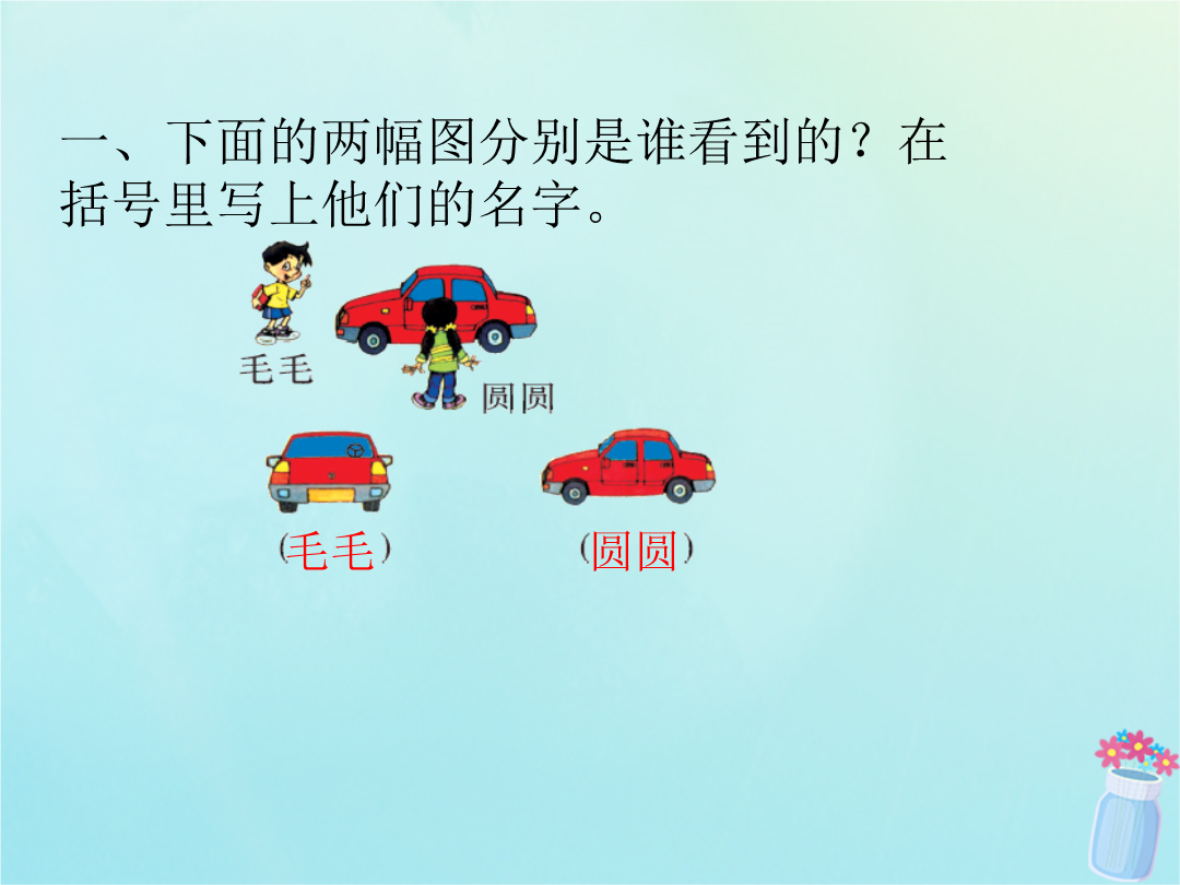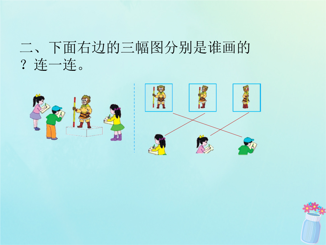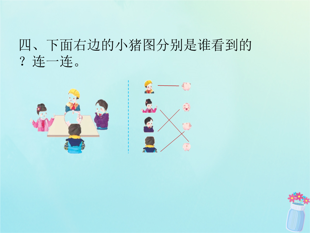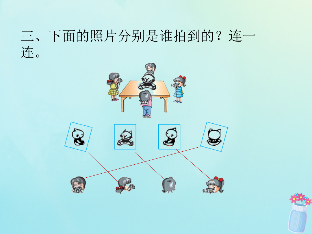 一、下面的两幅图分别是谁看到的?在括号里写上他们的名字。二、下面右边的三幅图分别是谁画的?连一连。三、下面的照片分别是谁拍到的?连一连。四、下面右边的小猪图分别是谁看到的?连一连。