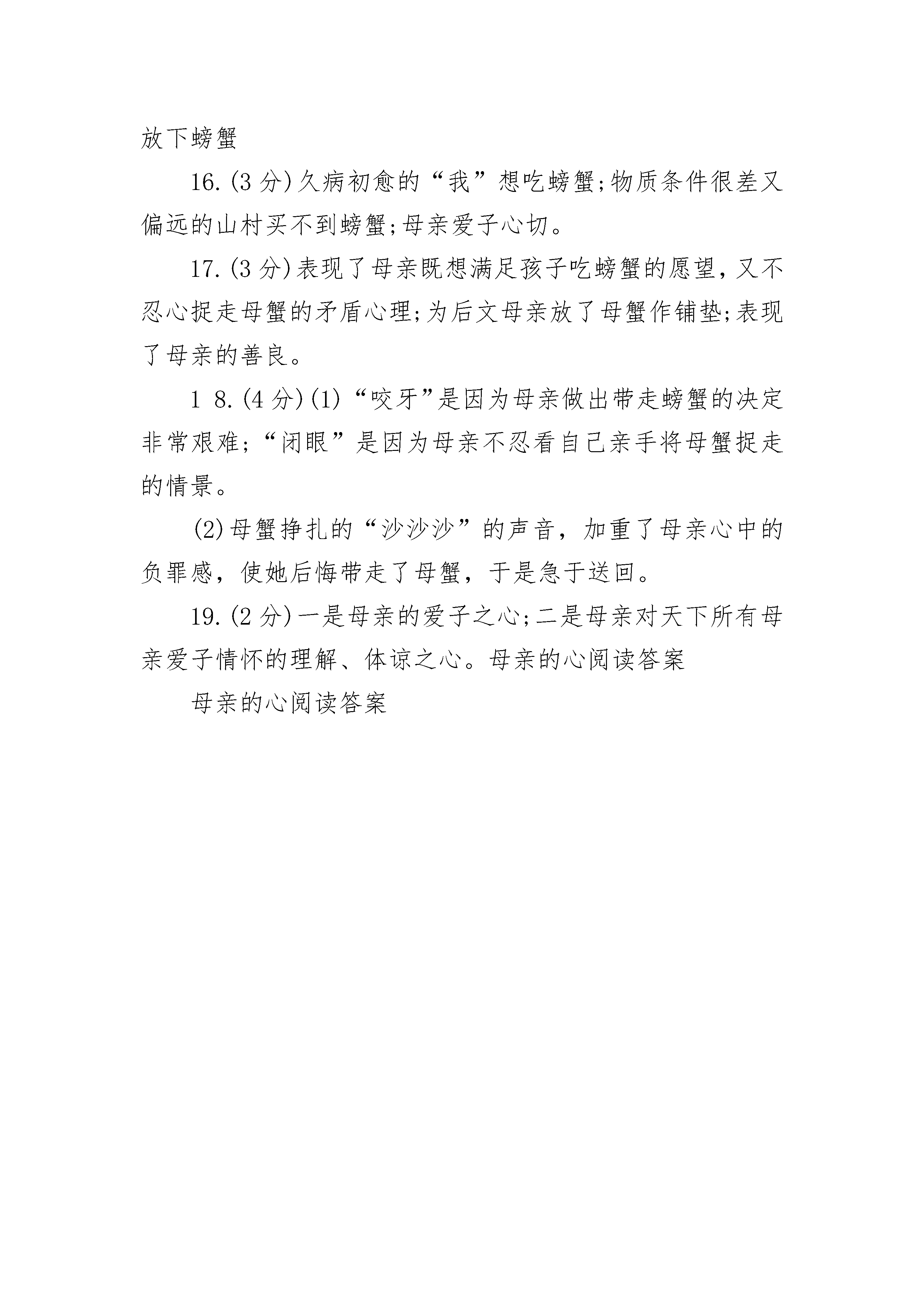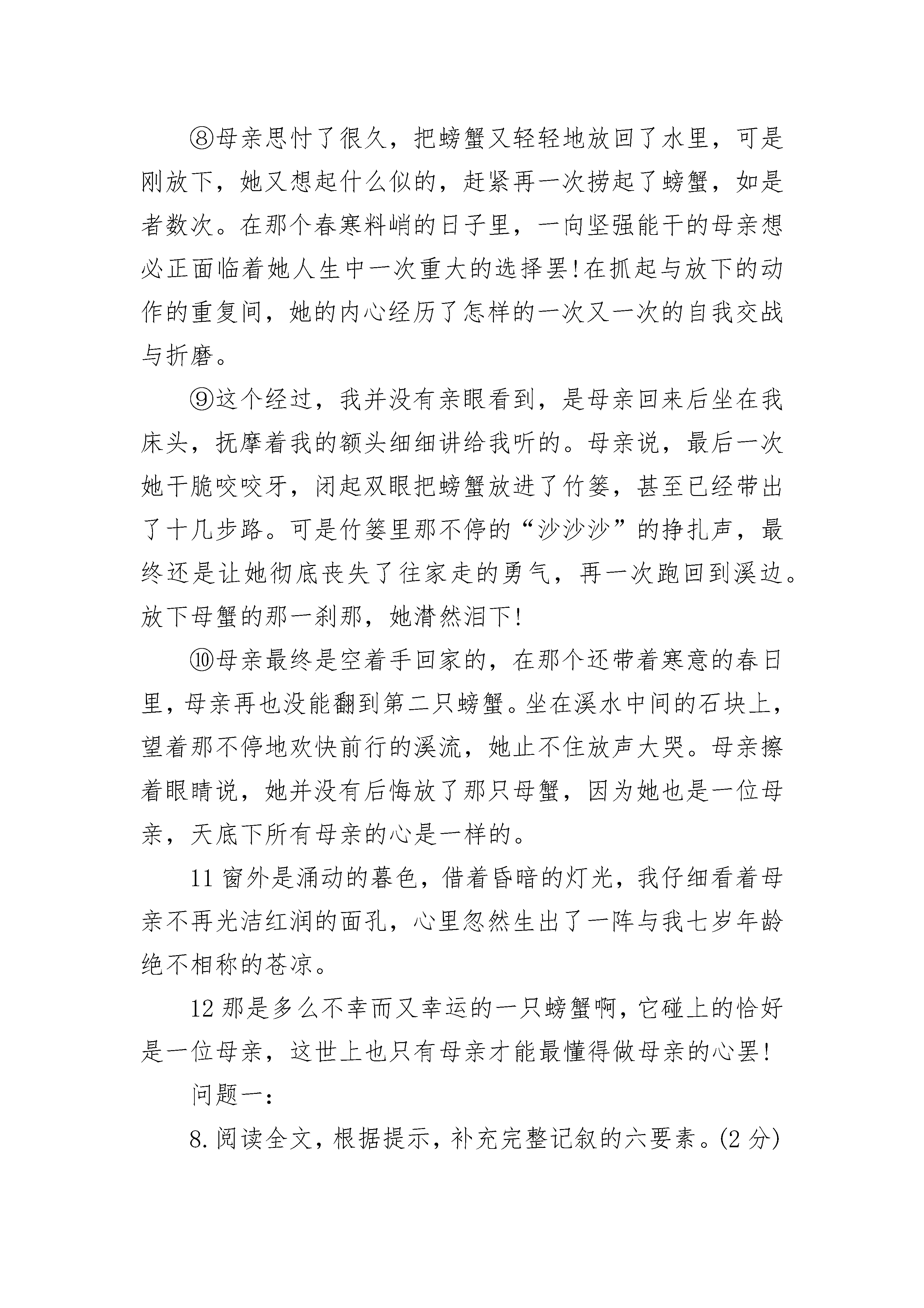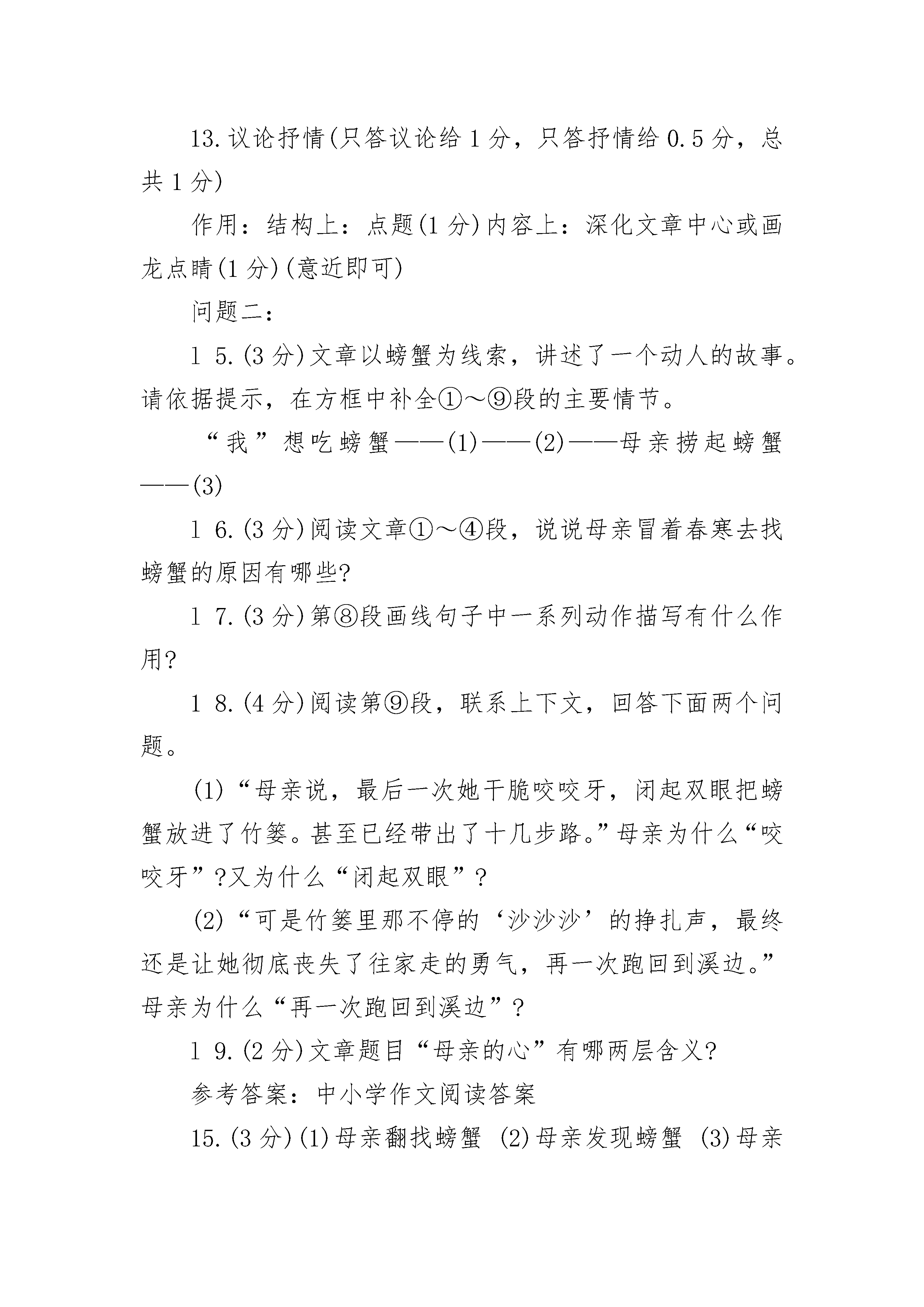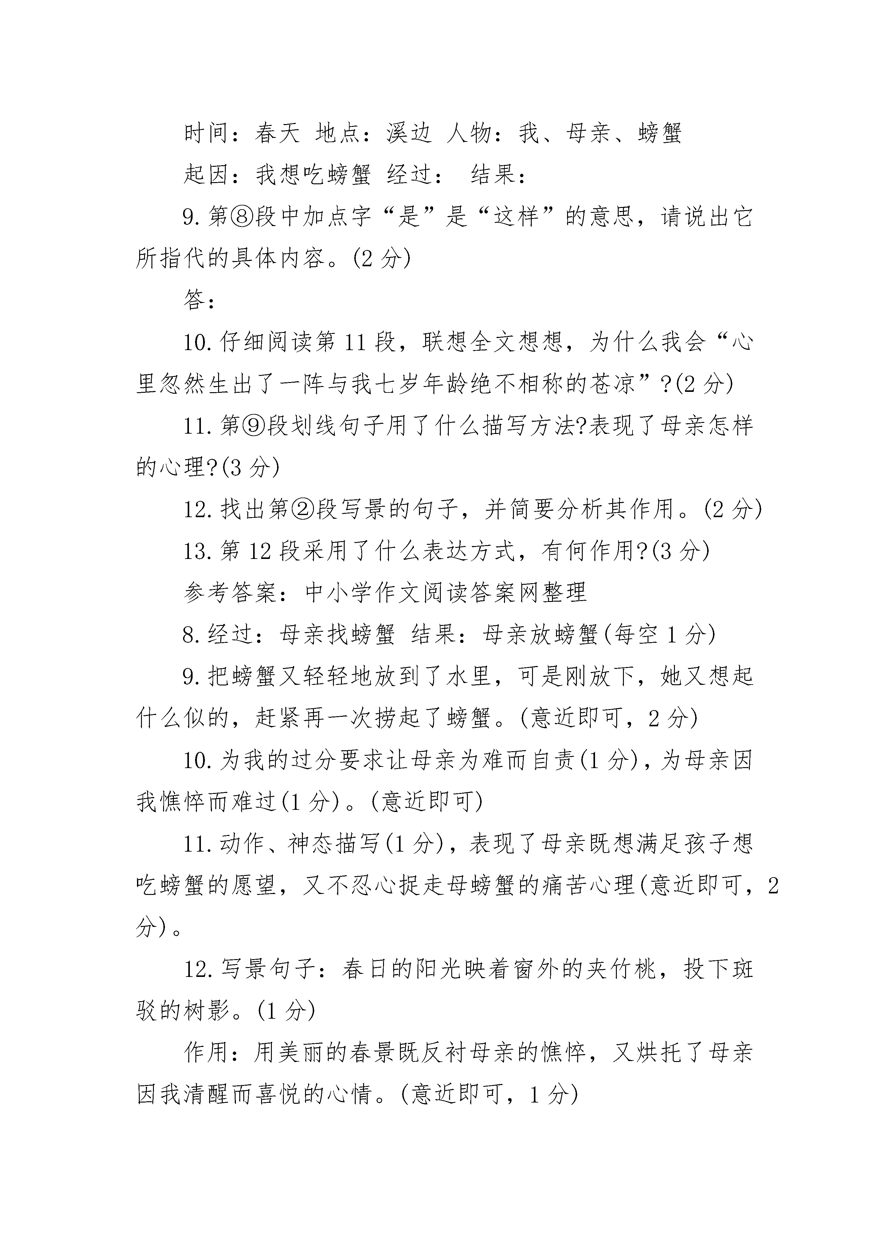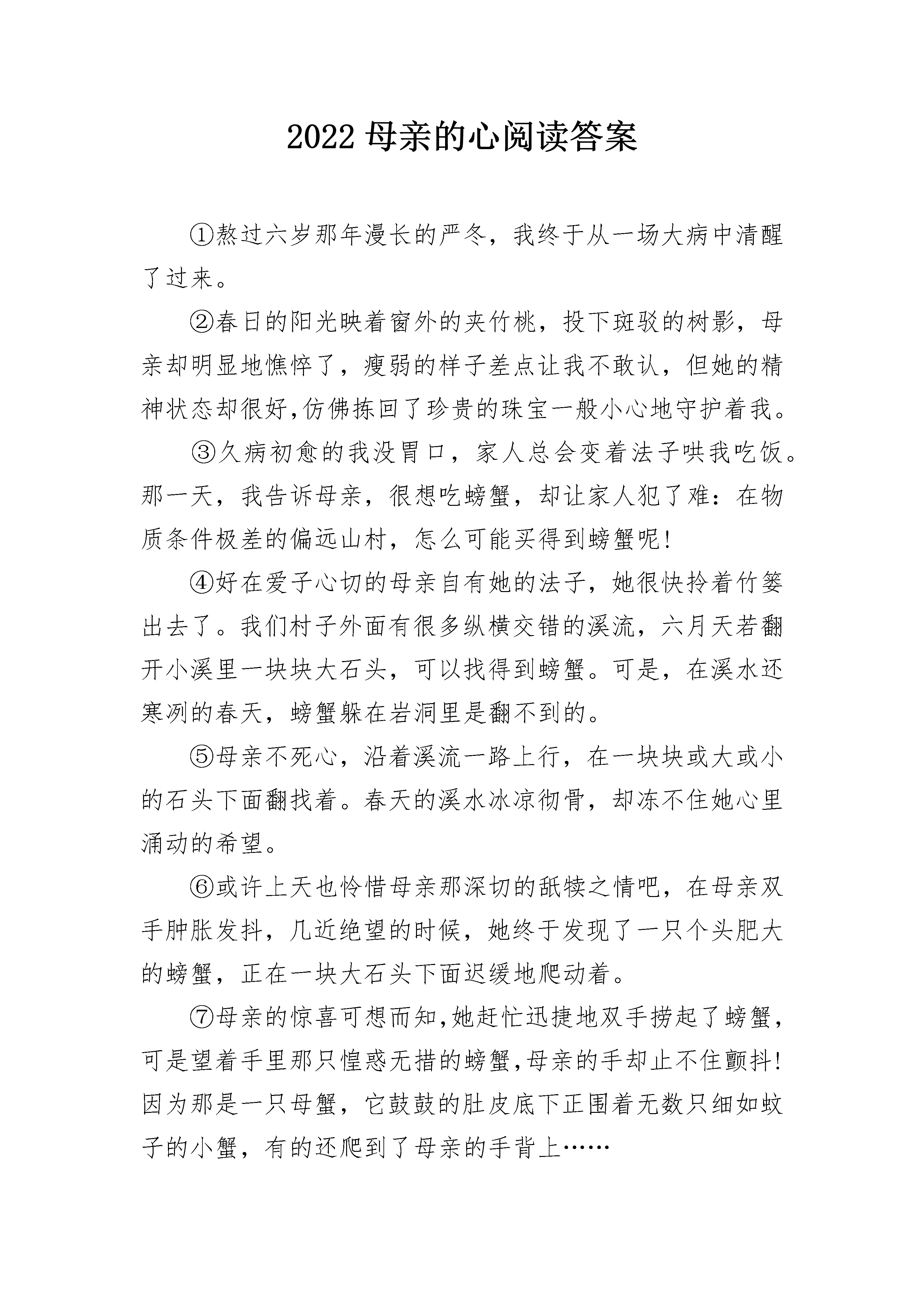 2022母亲的心阅读答案①熬过六岁那年漫长的严冬,我终于从一场大病中清醒了过来。②春日的阳光映着窗外的夹竹桃,投下斑驳的树影,母亲却明显地憔悴了,瘦弱的样子差点让我不敢认,但她的精神状态却很好,仿佛拣回了珍贵的珠宝一般小心地守护着我。③久病初愈的我没胃口,家人总会变着法子哄我吃饭。那一天,我告诉母亲,很想吃螃蟹,却让家人犯了难:在物质条件极差的偏远山村,怎么可能买得到螃蟹呢!④好在爱子心切的母亲自有她的法子,她很快拎着竹篓出去了。我们村子外面有很多纵横交错的溪流,六月天若翻开小溪里一块块大石头,可以找得到螃蟹。可是,在溪水还寒冽的春天,螃蟹躲在岩洞里是翻不到的。⑤母亲不死心,沿着溪流一路上行,在一块块或大或小的石头下面翻找着。春天的溪水冰凉彻骨,却冻不住她心里涌动的希望。⑥或许上天也怜惜母亲那深切的舐犊之情吧,在母亲双手肿胀发抖,几近绝望的时候,她终于发现了一只个头肥大的螃蟹,正在一块大石头下面迟缓地爬动着。⑦母亲的惊喜可想而知,她赶忙迅捷地双手捞起了螃蟹,可是望着手里那只惶惑无措的螃蟹,母亲的手却止不住颤抖!因为那是一只母蟹,它鼓鼓的肚皮底下正围着无数只细如蚊子的小蟹,有的还爬到了母亲的手背上……⑧母亲思忖了很久,把螃蟹又轻轻地放回了水里,可是刚放下,她又想起什么似的,赶紧再一次捞起了螃蟹,如是者数次。在那个春寒料峭的日子里,一向坚强能干的母亲想必正面临着她人生中一次重大的选择罢!在抓起与放下的动作的重复间,她的内心经历了怎样的一次又一次的自我交战与折磨。⑨这个经过,我并没有亲眼看到,是母亲回来后坐在我床头,抚摩着我的额头细细讲给我听的。母亲说,最后一次她干脆咬咬牙,闭起双眼把螃蟹放进了竹篓,甚至已经带出了十几步路。可是竹篓里那不停的“沙沙沙”的挣扎声,最终还是让她彻底丧失了往家走的勇气,再一次跑回到溪边。放下母蟹的那一刹那,她潸然泪下!⑩母亲最终是空着手回家的,在那个还带着寒意的春日里,母亲再也没能翻到第二只螃蟹。坐在溪水中间的石块上,望着那不停地欢快前行的溪流,她止不住放声大哭。母亲擦着眼睛说,她并没有后悔放了那只母蟹,因为她也是一位母亲,天底下所有母亲的心是一样的。11窗外是涌动的暮色,借着昏暗的灯光,我仔细看着母亲不再光洁红润的面孔,心里忽然生出了一阵与我七岁年龄绝不相称的苍凉。12那是多么不幸而又幸运的一只螃蟹啊,它碰上的恰好是一位母亲,这世上也只有母亲才能最懂得做母亲的心罢!问题一:8.阅读全文,根据提示,补充完整记叙的六要素。(2分)时间:春天地点:溪边人物:我、母亲、螃蟹起因:我想吃螃蟹经过:结果:9.第⑧段中加点字“是”是“这样”的意思,请说出它所指代的具体内容。(2分)答:10.仔细阅读第11段,联想全文想想,为什么我会“心里忽然生出了一阵与我七岁年龄绝不相称的苍凉”?(2分)11.第⑨段划线句子用了什么描写方法?表现了母亲怎样的心理?(3分)12.找出第②段写景的句子,并简要分析其作用。(2分)13.第12段采用了什么表达方式,有何作用?(3分)参考答案:中小学作文阅读答案网整理8.经过:母亲找螃蟹结果:母亲放螃蟹(每空1分)9.把螃蟹又轻轻地放到了水里,可是刚放下,她又想起什么似的,赶紧再一次捞起了螃蟹。(意近即可,2分)10.为我的过分要求让母亲为难而自责(1分),为母亲因我憔悴而难过(1分)。(意近即可)11.动作、神态描写(1分),表现了母亲既想满足孩子想吃螃蟹的愿望,又不忍心捉走母螃蟹的痛苦心理(意近即可,2分)。12.写景句子:春日的阳光映着窗外的夹竹桃,投下斑驳的树影。(1分)作用:用美丽的春景既反衬母亲的憔悴,又烘托了母亲因我清醒而喜悦的心情。(意近即可,1分)13.议论抒情(只答议论给1分,只答抒情给0.5分,总共1分)作用:结构上:点题(1分)内容上:深化文章中心或画龙点睛(1分)(意近即可)问题二:l5.(3分)文章以螃蟹为线索,讲述了一个动人的故事。请依据提示,在方框中补全①~⑨段的主要情节。“我”想吃螃蟹——(1)——(2)——母亲捞起螃蟹——(3)l6.(3分)阅读文章①~④段,说说母亲冒着春寒去找螃蟹的原因有哪些?l7.(3分)第⑧段画线句子中一系列动作描写有什么作用?18.(4分)阅读第⑨段,联系上下文,回答下面两个问题。(1)“母亲说,最后一次她干脆咬咬牙,闭起双眼把螃蟹放进了竹篓。甚至已经带出了十几步路。”母亲为什么“咬咬牙”?又为什么“闭起双眼”?(2)“可是竹篓里那不停的‘沙沙沙’的挣扎声,最终还是让她彻底丧失了往家走的勇气,再一次跑回到溪边。”母亲为什么“再一次跑回到溪边”?l9.(2分)文章题目“母亲的心”有哪两层含义?参考答案:中小学作文阅读答案15.(3分)(1)母亲翻找螃蟹(2)母亲发现螃蟹(3)母亲放下螃蟹16.(3分)久病初愈的“我”想吃螃蟹;物
