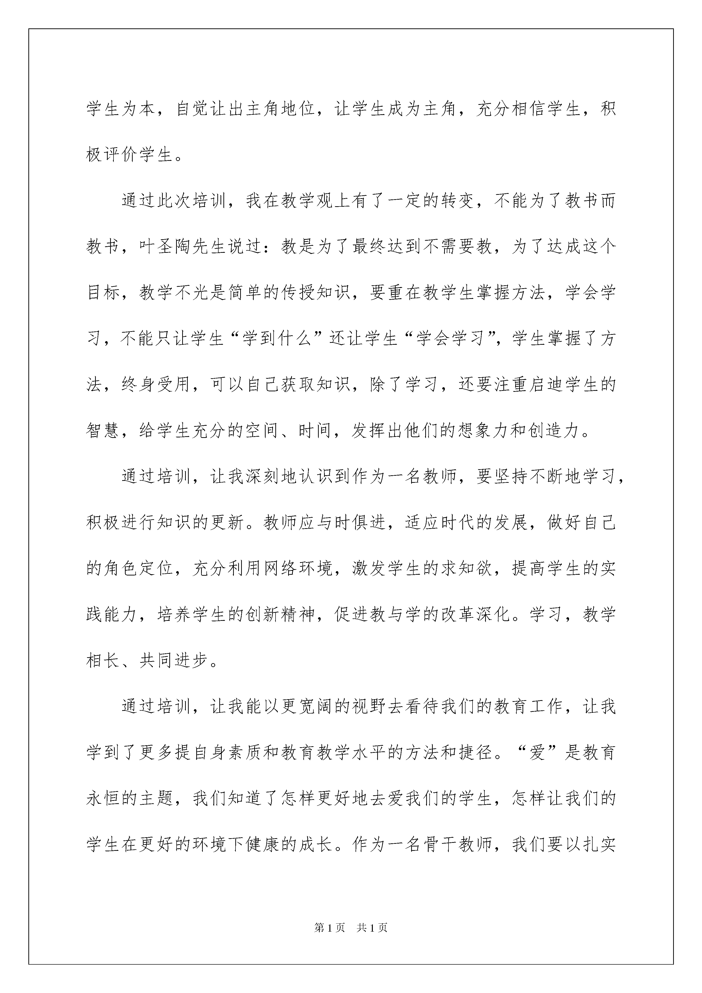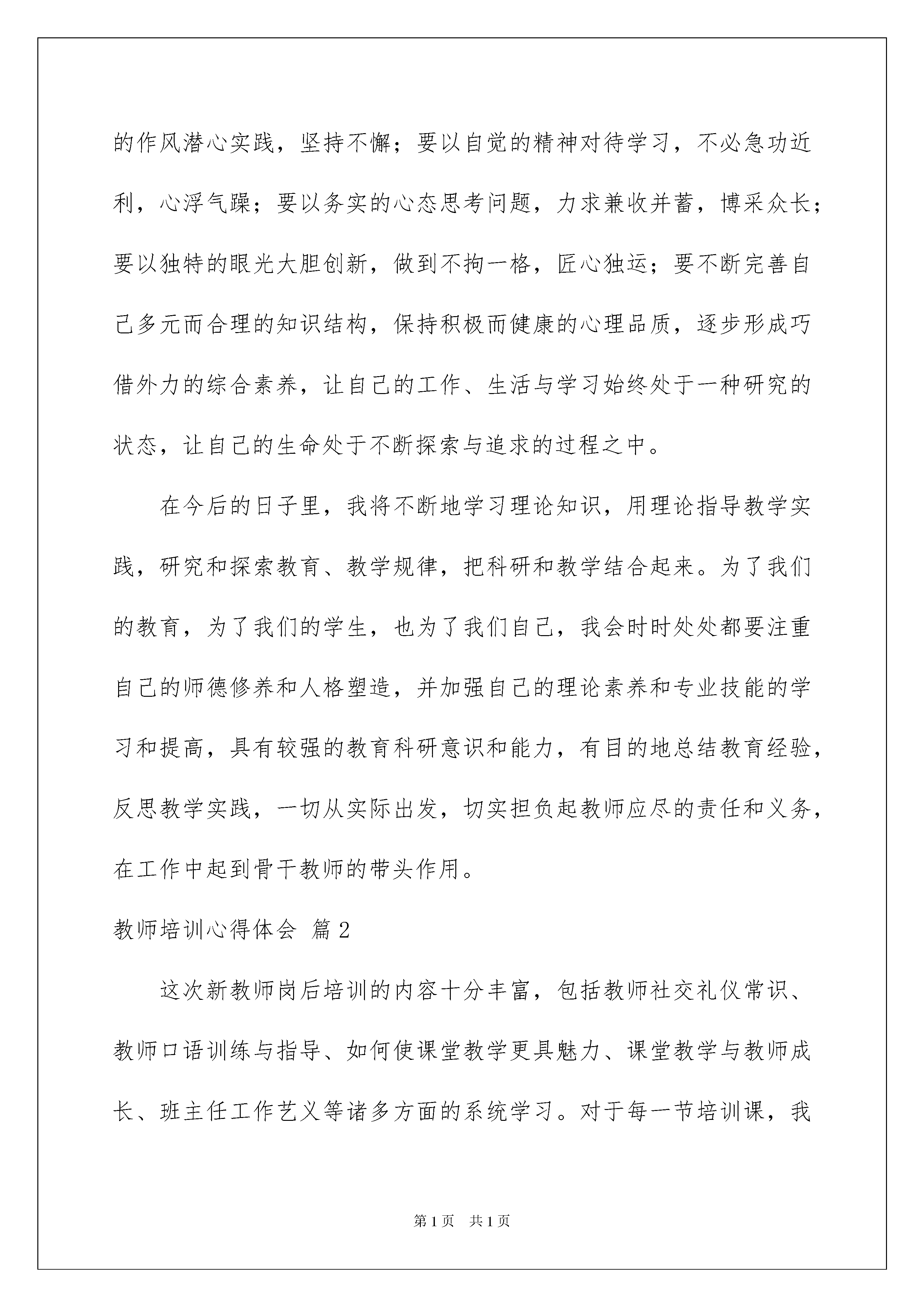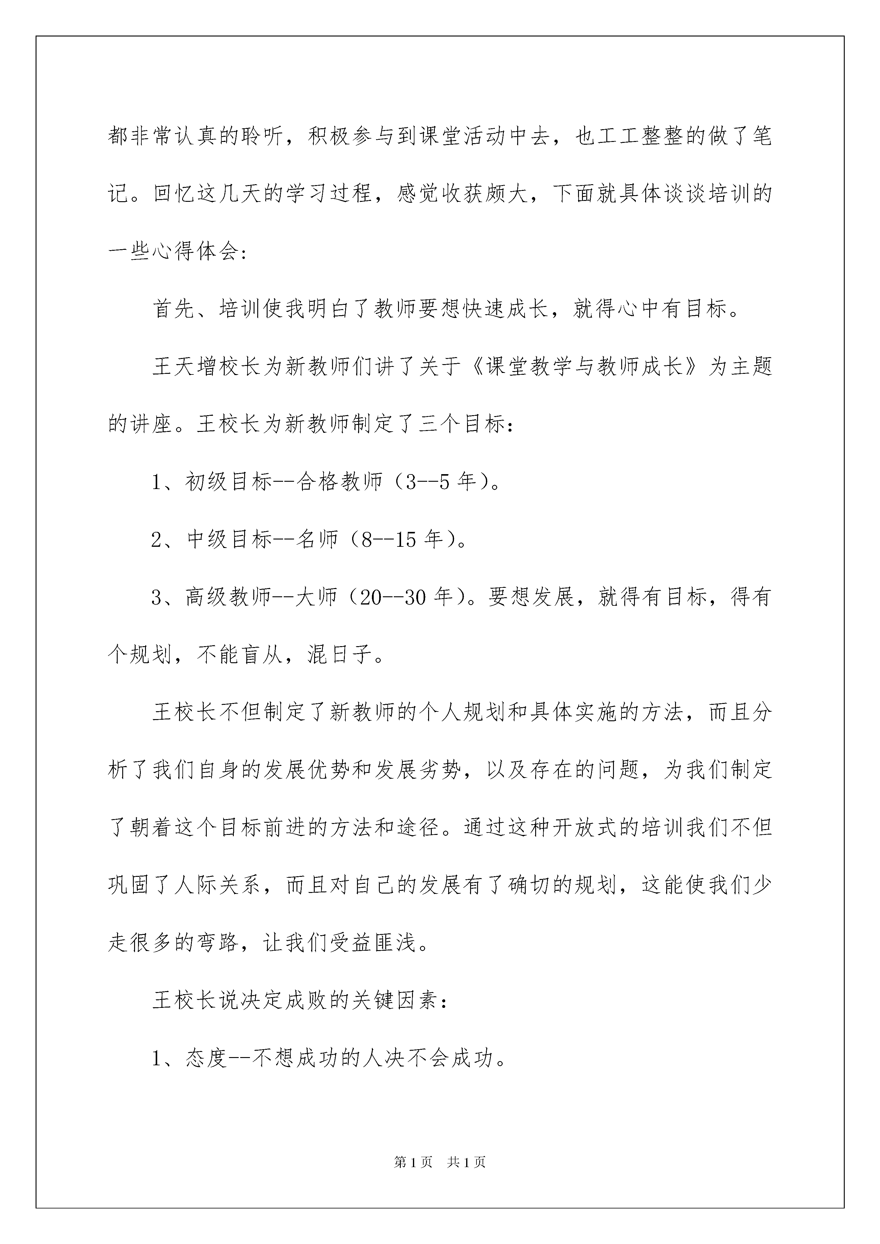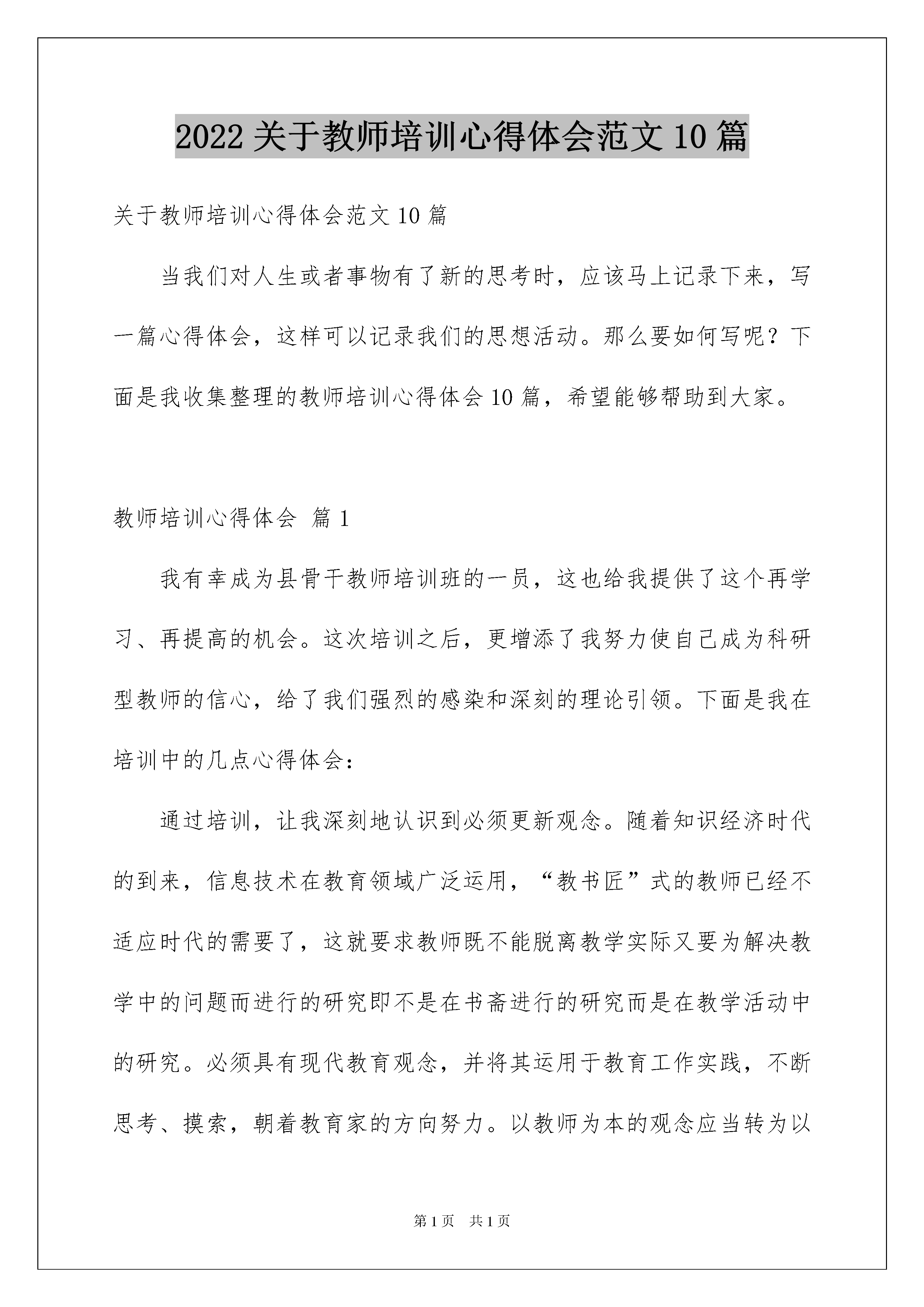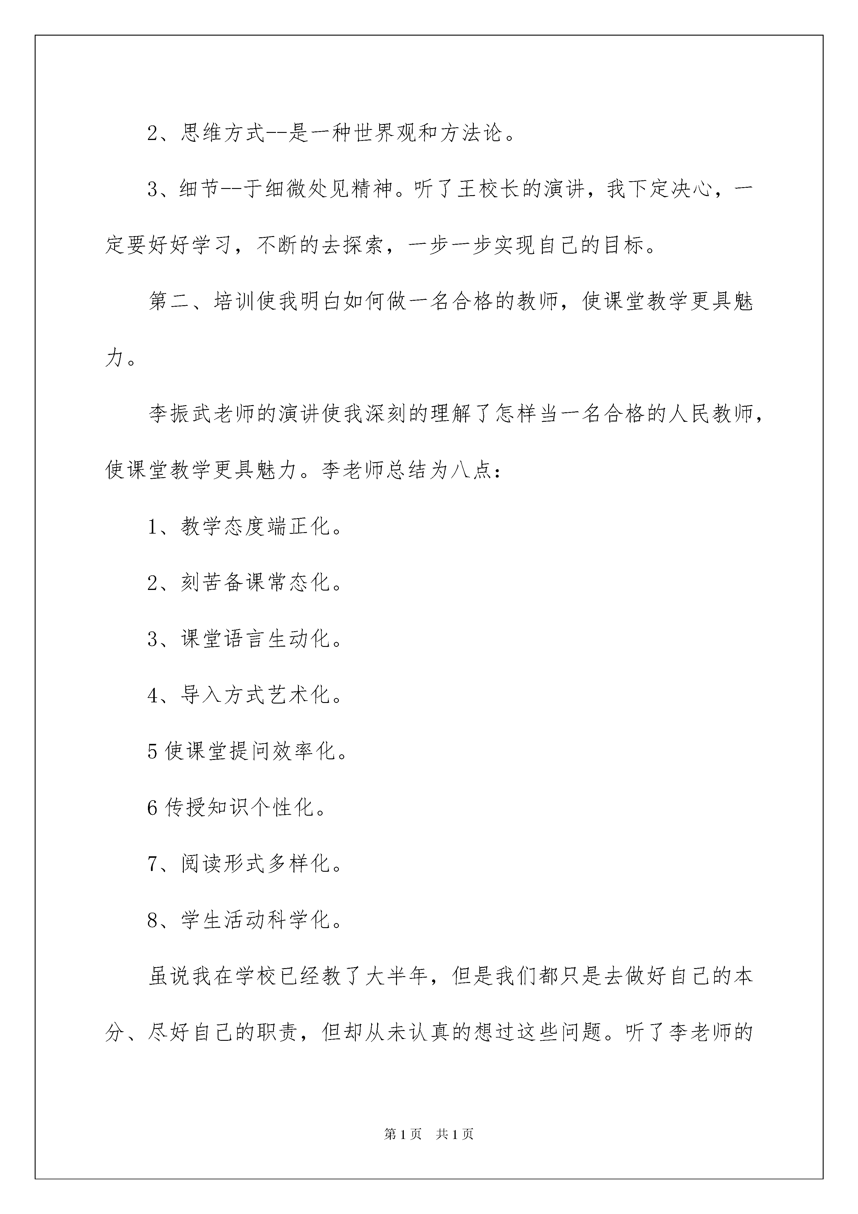 2022关于教师培训心得体会范文10篇关于教师培训心得体会范文10篇当我们对人生或者事物有了新的思考时,应该马上记录下来,写一篇心得体会,这样可以记录我们的思想活动。那么要如何写呢?下面是我收集整理的教师培训心得体会10篇,希望能够帮助到大家。教师培训心得体会篇1我有幸成为县骨干教师培训班的一员,这也给我提供了这个再学习、再提高的机会。这次培训之后,更增添了我努力使自己成为科研型教师的信心,给了我们强烈的感染和深刻的理论引领。下面是我在培训中的几点心得体会:通过培训,让我深刻地认识到必须更新观念。随着知识经济时代的到来,信息技术在教育领域广泛运用,“教书匠”式的教师已经不适应时代的需要了,这就要求教师既不能脱离教学实际又要为解决教学中的问题而进行的研究即不是在书斋进行的研究而是在教学活动中的研究。必须具有现代教育观念,并将其运用于教育工作实践,不断思考、摸索,朝着教育家的方向努力。以教师为本的观念应当转为以学生为本,自觉让出主角地位,让学生成为主角,充分相信学生,积极评价学生。通过此次培训,我在教学观上有了一定的转变,不能为了教书而教书,叶圣陶先生说过:教是为了最终达到不需要教,为了达成这个目标,教学不光是简单的传授知识,要重在教学生掌握方法,学会学习,不能只让学生“学到什么”还让学生“学会学习”,学生掌握了方法,终身受用,可以自己获取知识,除了学习,还要注重启迪学生的智慧,给学生充分的空间、时间,发挥出他们的想象力和创造力。通过培训,让我深刻地认识到作为一名教师,要坚持不断地学习,积极进行知识的更新。教师应与时俱进,适应时代的发展,做好自己的角色定位,充分利用网络环境,激发学生的求知欲,提高学生的实践能力,培养学生的创新精神,促进教与学的改革深化。学习,教学相长、共同进步。通过培训,让我能以更宽阔的视野去看待我们的教育工作,让我学到了更多提自身素质和教育教学水平的方法和捷径。“爱”是教育永恒的主题,我们知道了怎样更好地去爱我们的学生,怎样让我们的学生在更好的环境下健康的成长。作为一名骨干教师,我们要以扎实的作风潜心实践,坚持不懈;要以自觉的精神对待学习,不必急功近利,心浮气躁;要以务实的心态思考问题,力求兼收并蓄,博采众长;要以独特的眼光大胆创新,做到不拘一格,匠心独运;要不断完善自己多元而合理的知识结构,保持积极而健康的心理品质,逐步形成巧借外力的综合素养,让自己的工作、生活与学习始终处于一种研究的状态,让自己的生命处于不断探索与追求的过程之中。在今后的日子里,我将不断地学习理论知识,用理论指导教学实践,研究和探索教育、教学规律,把科研和教学结合起来。为了我们的教育,为了我们的学生,也为了我们自己,我会时时处处都要注重自己的师德修养和人格塑造,并加强自己的理论素养和专业技能的学习和提高,具有较强的教育科研意识和能力,有目的地总结教育经验,反思教学实践,一切从实际出发,切实担负起教师应尽的责任和义务,在工作中起到骨干教师的带头作用。教师培训心得体会篇2这次新教师岗后培训的内容十分丰富,包括教师社交礼仪常识、教师口语训练与指导、如何使课堂教学更具魅力、课堂教学与教师成长、班主任工作艺义等诸多方面的系统学习。对于每一节培训课,我都非常认真的聆听,积极参与到课堂活动中去,也工工整整的做了笔记。回忆这几天的学习过程,感觉收获颇大,下面就具体谈谈培训的一些心得体会:首先、培训使我明白了教师要想快速成长,就得心中有目标。王天增校长为新教师们讲了关于《课堂教学与教师成长》为主题的讲座。王校长为新教师制定了三个目标:1、初级目标--合格教师(3--5年)。2、中级目标--名师(8--15年)。3、高级教师--大师(20--30年)。要想发展,就得有目标,得有个规划,不能盲从,混日子。王校长不但制定了新教师的个人规划和具体实施的方法,而且分析了我们自身的发展优势和发展劣势,以及存在的问题,为我们制定了朝着这个目标前进的方法和途径。通过这种开放式的培训我们不但巩固了人际关系,而且对自己的发展有了确切的规划,这能使我们少走很多的弯路,让我们受益匪浅。王校长说决定成败的关键因素:1、态度--不想成功的人决不会成功。2、思维方式--是一种世界观和方法论。3、细节--于细微处见精神。听了王校长的演讲,我下定决心,一定要好好学习,不断的去探索,一步一步实现自己的目标。第二、培训使我明白如何做一名合格的教师,使课堂教学更具魅力。李振武老师的演讲使我深刻的理解了怎样当一名合格的人民教师,使课堂教学更具魅力。李老师总结为八点:1、教学态度端正化。2、刻苦备课常态化。3、课堂语言生动化。4、导入方式艺术化。