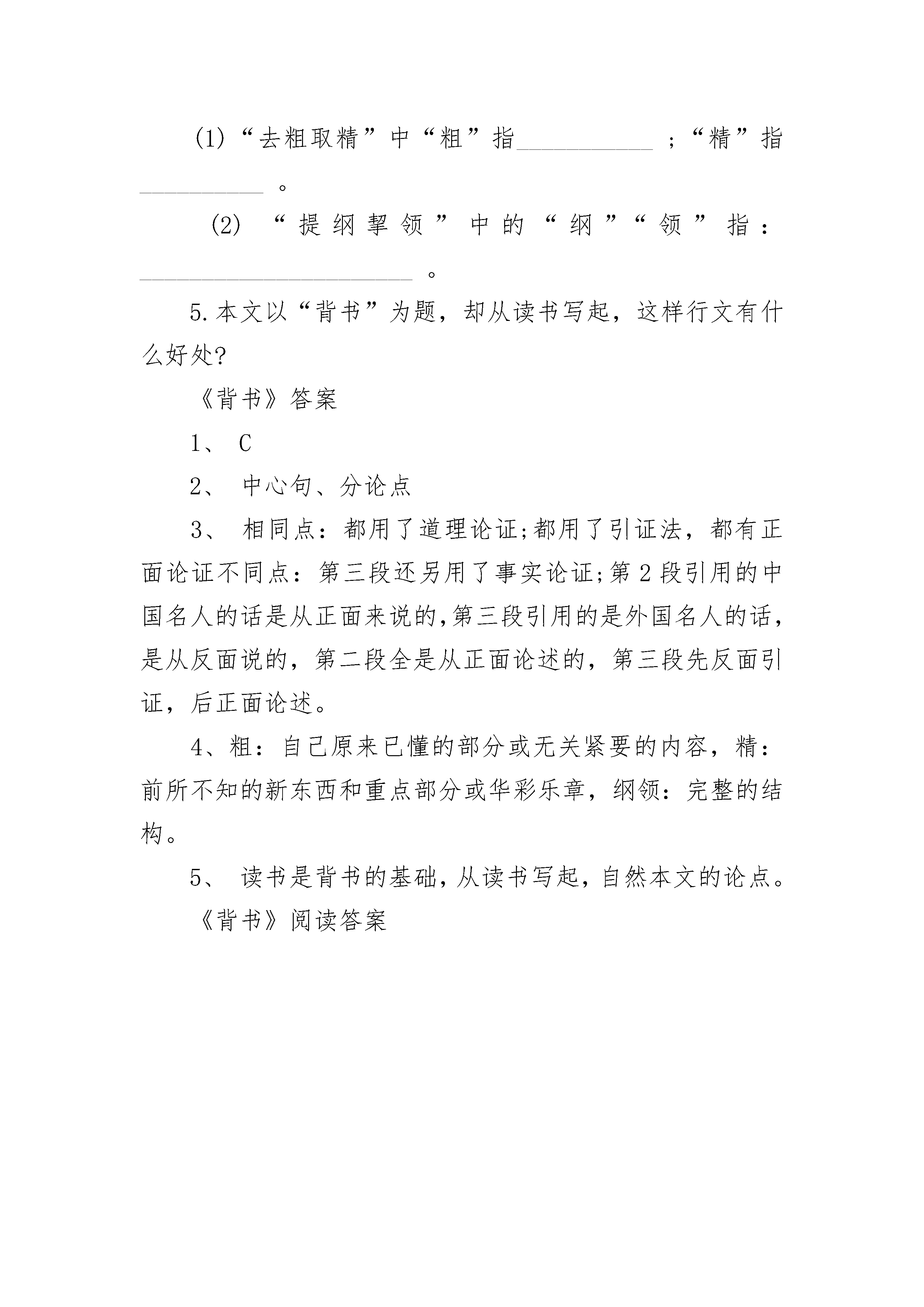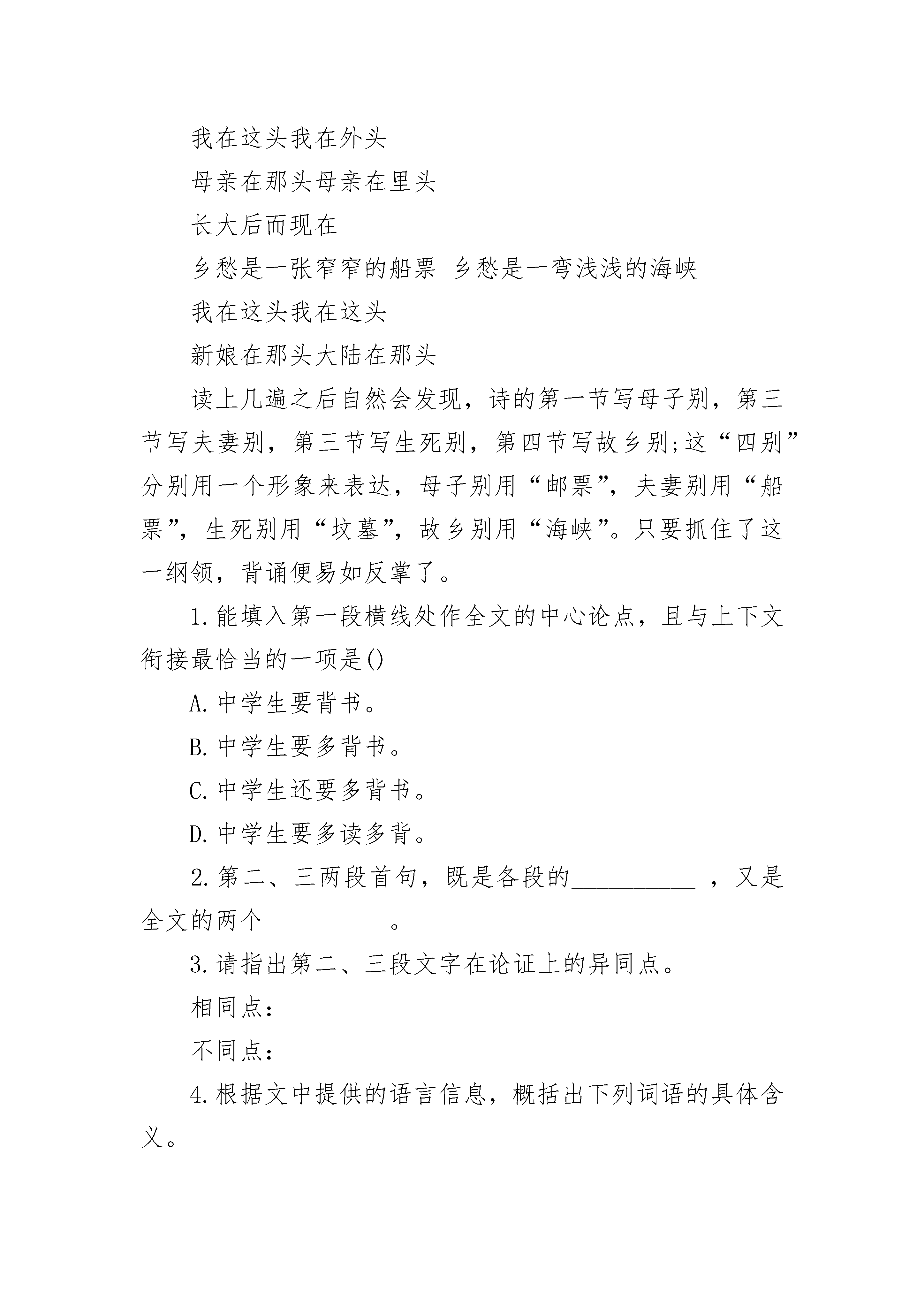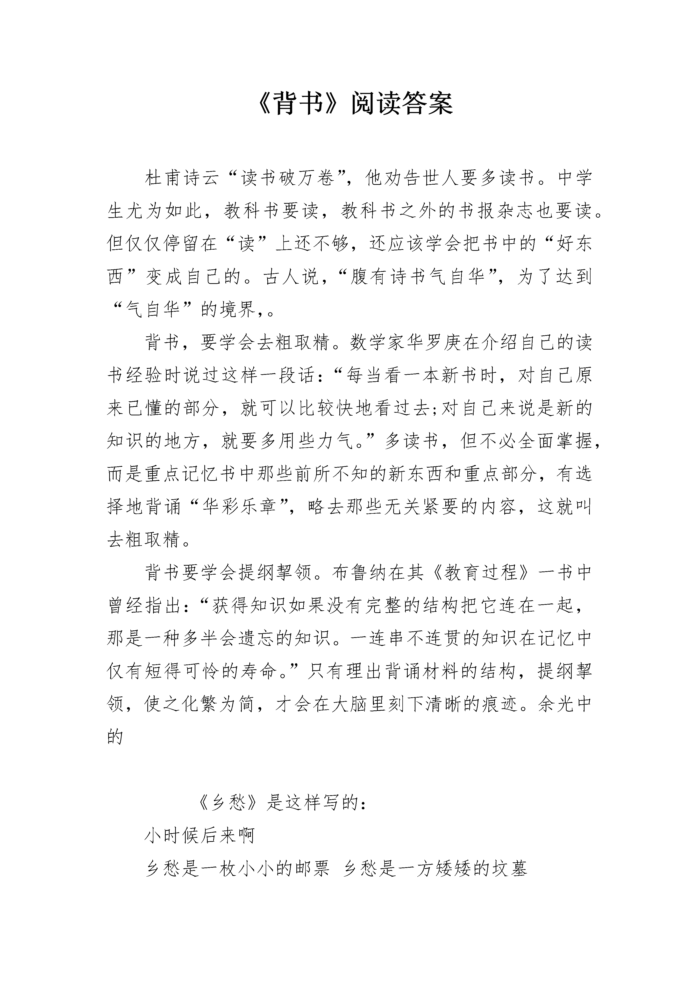 《背书》阅读答案杜甫诗云“读书破万卷”,他劝告世人要多读书。中学生尤为如此,教科书要读,教科书之外的书报杂志也要读。但仅仅停留在“读”上还不够,还应该学会把书中的“好东西”变成自己的。古人说,“腹有诗书气自华”,为了达到“气自华”的境界,。背书,要学会去粗取精。数学家华罗庚在介绍自己的读书经验时说过这样一段话:“每当看一本新书时,对自己原来已懂的部分,就可以比较快地看过去;对自己来说是新的知识的地方,就要多用些力气。”多读书,但不必全面掌握,而是重点记忆书中那些前所不知的新东西和重点部分,有选择地背诵“华彩乐章”,略去那些无关紧要的内容,这就叫去粗取精。背书要学会提纲挈领。布鲁纳在其《教育过程》一书中曾经指出:“获得知识如果没有完整的结构把它连在一起,那是一种多半会遗忘的知识。一连串不连贯的知识在记忆中仅有短得可怜的寿命。”只有理出背诵材料的结构,提纲挈领,使之化繁为简,才会在大脑里刻下清晰的痕迹。余光中的《乡愁》是这样写的:小时候后来啊乡愁是一枚小小的邮票乡愁是一方矮矮的坟墓我在这头我在外头母亲在那头母亲在里头长大后而现在乡愁是一张窄窄的船票乡愁是一弯浅浅的海峡我在这头我在这头新娘在那头大陆在那头读上几遍之后自然会发现,诗的第一节写母子别,第三节写夫妻别,第三节写生死别,第四节写故乡别;这“四别”分别用一个形象来表达,母子别用“邮票”,夫妻别用“船票”,生死别用“坟墓”,故乡别用“海峡”。只要抓住了这一纲领,背诵便易如反掌了。1.能填入第一段横线处作全文的中心论点,且与上下文衔接最恰当的一项是()A.中学生要背书。B.中学生要多背书。C.中学生还要多背书。D.中学生要多读多背。2.第二、三两段首句,既是各段的__________,又是全文的两个_________。3.请指出第二、三段文字在论证上的异同点。相同点:不同点:4.根据文中提供的语言信息,概括出下列词语的具体含义。(1)“去粗取精”中“粗”指___________;“精”指__________。(2)“提纲挈领”中的“纲”“领”指:______________________。5.本文以“背书”为题,却从读书写起,这样行文有什么好处?《背书》答案1、C2、中心句、分论点3、相同点:都用了道理论证;都用了引证法,都有正面论证不同点:第三段还另用了事实论证;第2段引用的中国名人的话是从正面来说的,第三段引用的是外国名人的话,是从反面说的,第二段全是从正面论述的,第三段先反面引证,后正面论述。4、粗:自己原来已懂的部分或无关紧要的内容,精:前所不知的新东西和重点部分或华彩乐章,纲领:完整的结构。5、读书是背书的基础,从读书写起,自然本文的论点。《背书》阅读答案