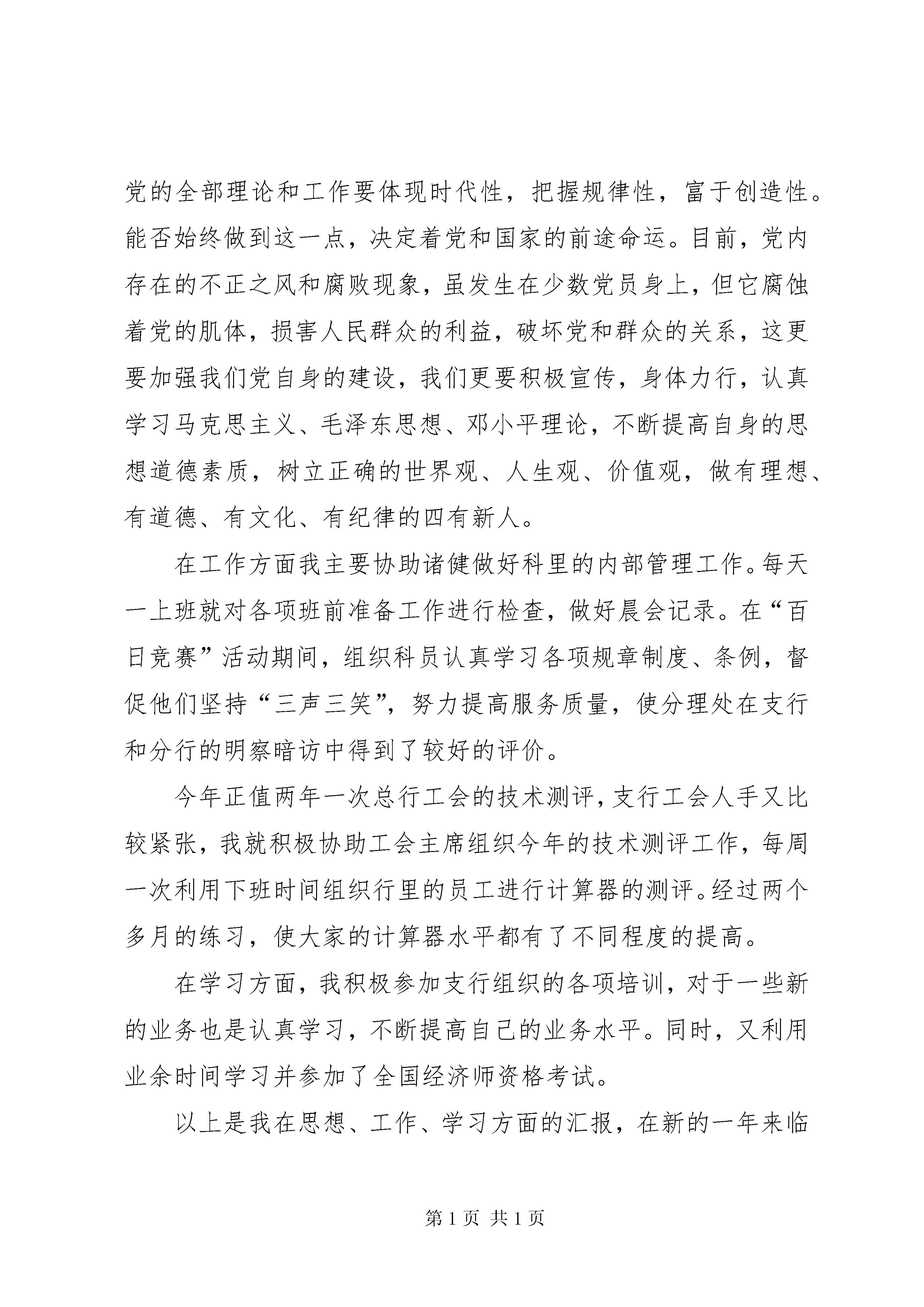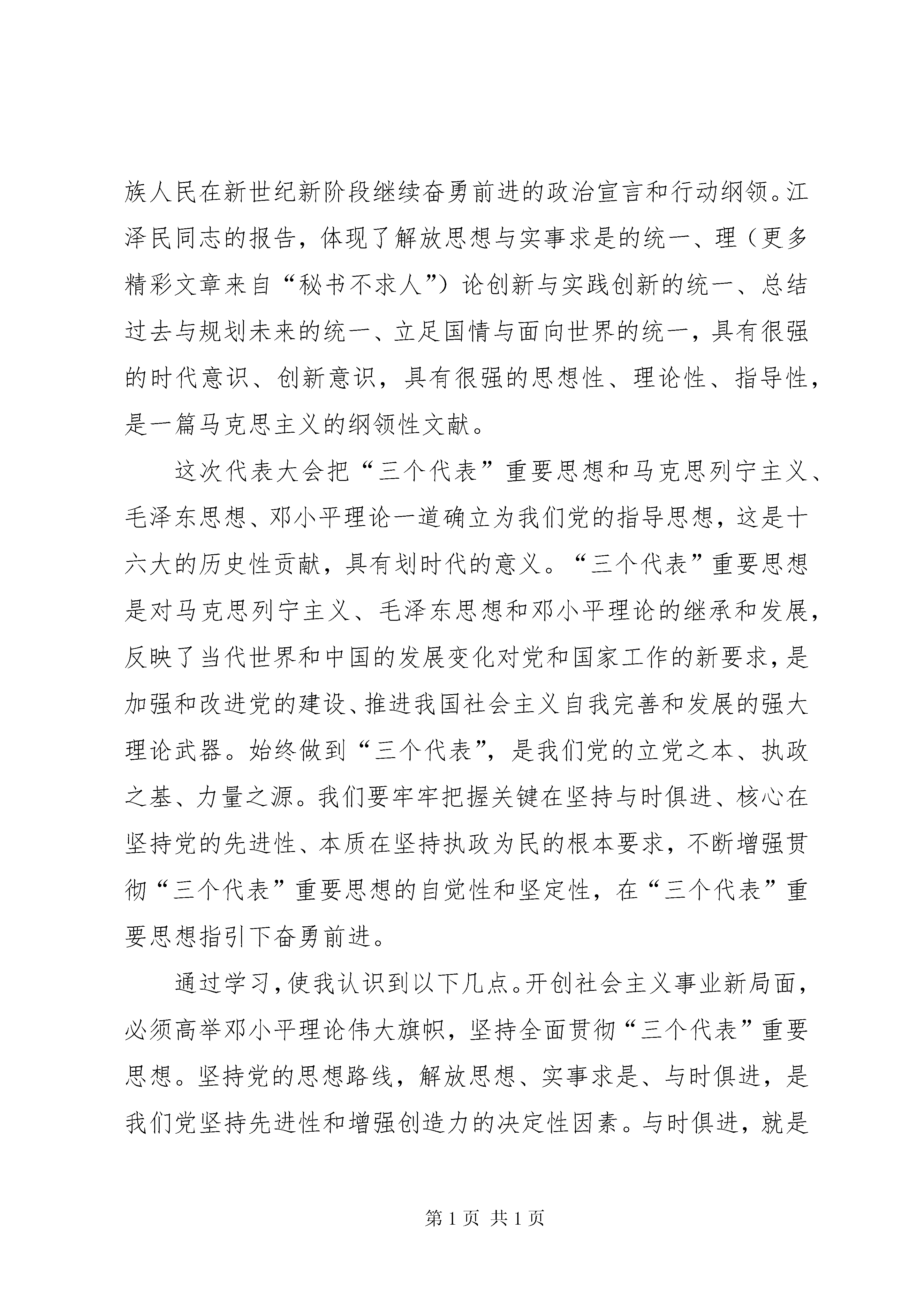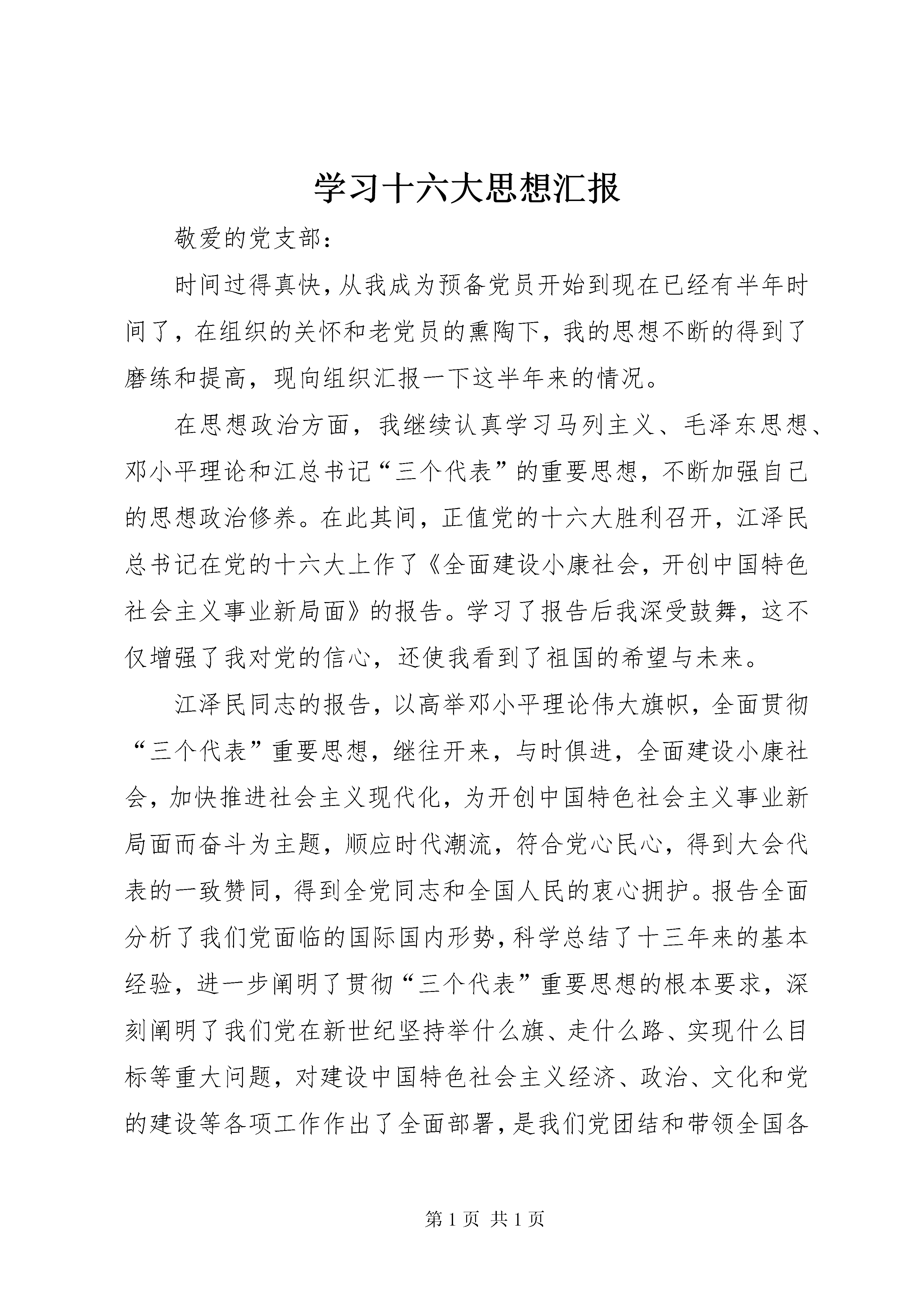 学习十六大思想汇报敬爱的党支部:时间过得真快,从我成为预备党员开始到现在已经有半年时间了,在组织的关怀和老党员的熏陶下,我的思想不断的得到了磨练和提高,现向组织汇报一下这半年来的情况。在思想政治方面,我继续认真学习马列主义、毛泽东思想、邓小平理论和江总书记“三个代表”的重要思想,不断加强自己的思想政治修养。在此其间,正值党的十六大胜利召开,江泽民总书记在党的十六大上作了《全面建设小康社会,开创中国特色社会主义事业新局面》的报告。学习了报告后我深受鼓舞,这不仅增强了我对党的信心,还使我看到了祖国的希望与未来。江泽民同志的报告,以高举邓小平理论伟大旗帜,全面贯彻“三个代表”重要思想,继往开来,与时俱进,全面建设小康社会,加快推进社会主义现代化,为开创中国特色社会主义事业新局面而奋斗为主题,顺应时代潮流,符合党心民心,得到大会代表的一致赞同,得到全党同志和全国人民的衷心拥护。报告全面分析了我们党面临的国际国内形势,科学总结了十三年来的基本经验,进一步阐明了贯彻“三个代表”重要思想的根本要求,深刻阐明了我们党在新世纪坚持举什么旗、走什么路、实现什么目标等重大问题,对建设中国特色社会主义经济、政治、文化和党的建设等各项工作作出了全面部署,是我们党团结和带领全国各族人民在新世纪新阶段继续奋勇前进的政治宣言和行动纲领。江泽民同志的报告,体现了解放思想与实事求是的统一、理(更多精彩文章来自“秘书不求人”)论创新与实践创新的统一、总结过去与规划未来的统一、立足国情与面向世界的统一,具有很强的时代意识、创新意识,具有很强的思想性、理论性、指导性,是一篇马克思主义的纲领性文献。这次代表大会把“三个代表”重要思想和马克思列宁主义、毛泽东思想、邓小平理论一道确立为我们党的指导思想,这是十六大的历史性贡献,具有划时代的意义。“三个代表”重要思想是对马克思列宁主义、毛泽东思想和邓小平理论的继承和发展,反映了当代世界和中国的发展变化对党和国家工作的新要求,是加强和改进党的建设、推进我国社会主义自我完善和发展的强大理论武器。始终做到“三个代表”,是我们党的立党之本、执政之基、力量之源。我们要牢牢把握关键在坚持与时俱进、核心在坚持党的先进性、本质在坚持执政为民的根本要求,不断增强贯彻“三个代表”重要思想的自觉性和坚定性,在“三个代表”重要思想指引下奋勇前进。通过学习,使我认识到以下几点。开创社会主义事业新局面,必须高举邓小平理论伟大旗帜,坚持全面贯彻“三个代表”重要思想。坚持党的思想路线,解放思想、实事求是、与时俱进,是我们党坚持先进性和增强创造力的决定性因素。与时俱进,就是党的全部理论和工作要体现时代性,把握规律性,富于创造性。能否始终做到这一点,决定着党和国家的前途命运。目前,党内存在的不正之风和腐败现象,虽发生在少数党员身上,但它腐蚀着党的肌体,损害人民群众的利益,破坏党和群众的关系,这更要加强我们党自身的建设,我们更要积极宣传,身体力行,认真学习马克思主义、毛泽东思想、邓小平理论,不断提高自身的思想道德素质,树立正确的世界观、人生观、价值观,做有理想、有道德、有文化、有纪律的四有新人。在工作方面我主要协助诸健做好科里的内部管理工作。每天一上班就对各项班前准备工作进行检查,做好晨会记录。在“百日竞赛”活动期间,组织科员认真学习各项规章制度、条例,督促他们坚持“三声三笑”,努力提高服务质量,使分理处在支行和分行的明察暗访中得到了较好的评价。今年正值两年一次总行工会的技术测评,支行工会人手又比较紧张,我就积极协助工会主席组织今年的技术测评工作,每周一次利用下班时间组织行里的员工进行计算器的测评。经过两个多月的练习,使大家的计算器水平都有了不同程度的提高。在学习方面,我积极参加支行组织的各项培训,对于一些新的业务也是认真学习,不断提高自己的业务水平。同时,又利用业余时间学习并参加了全国经济师资格考试。以上是我在思想、工作、学习方面的汇报,在新的一年来临之际,我要总结工作和生活中的经验和教训,认真履行党章上所要求的一切,严格要求自己,接受党组织和同志们的监督,严于律己、勤奋进取,努力作一名合格的共产党员。
