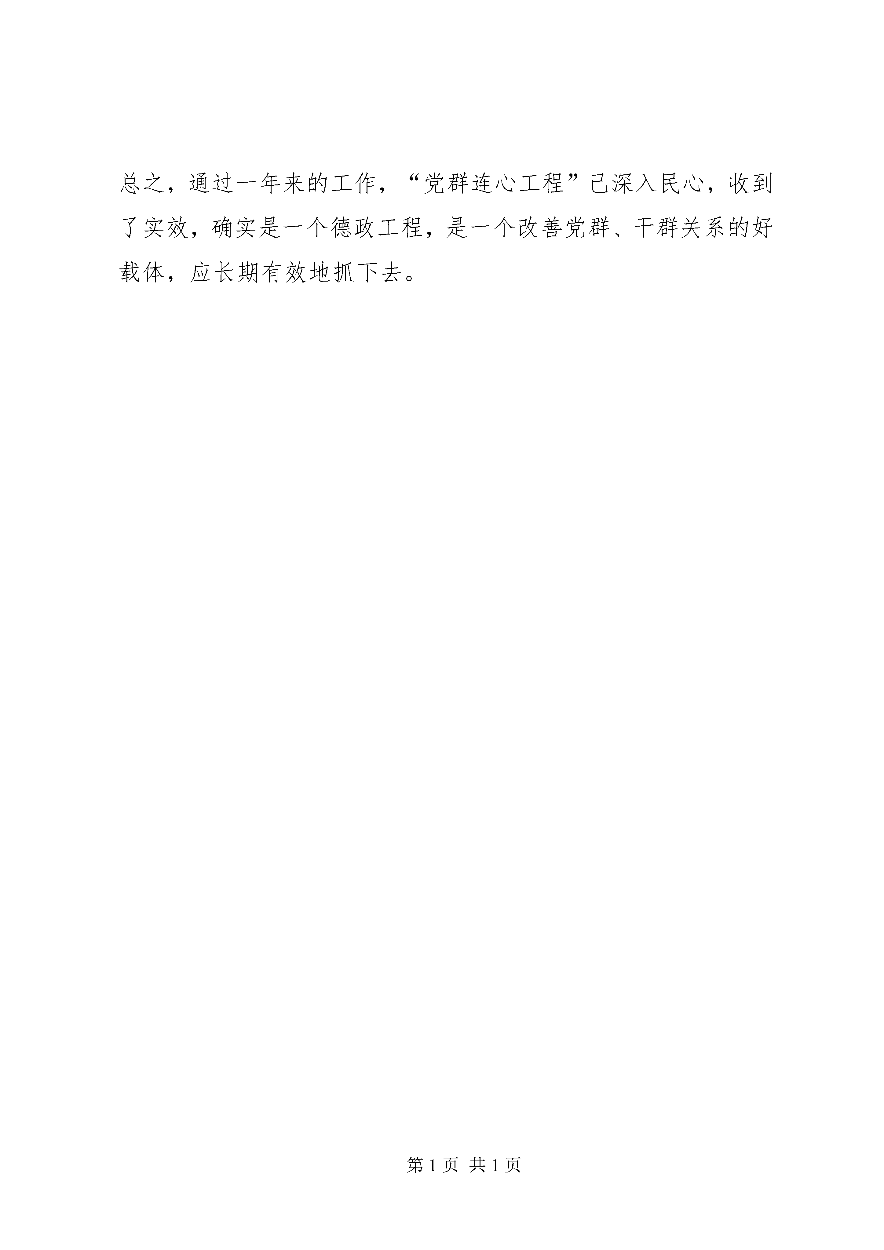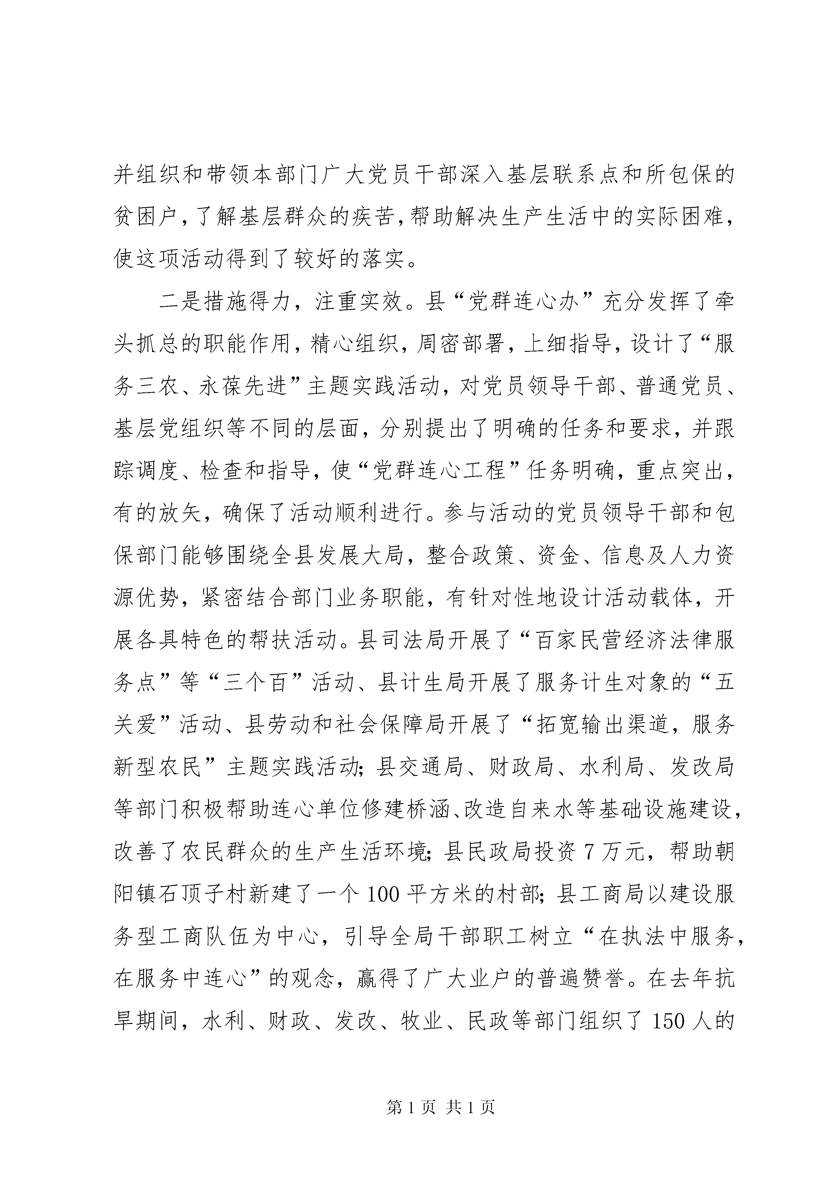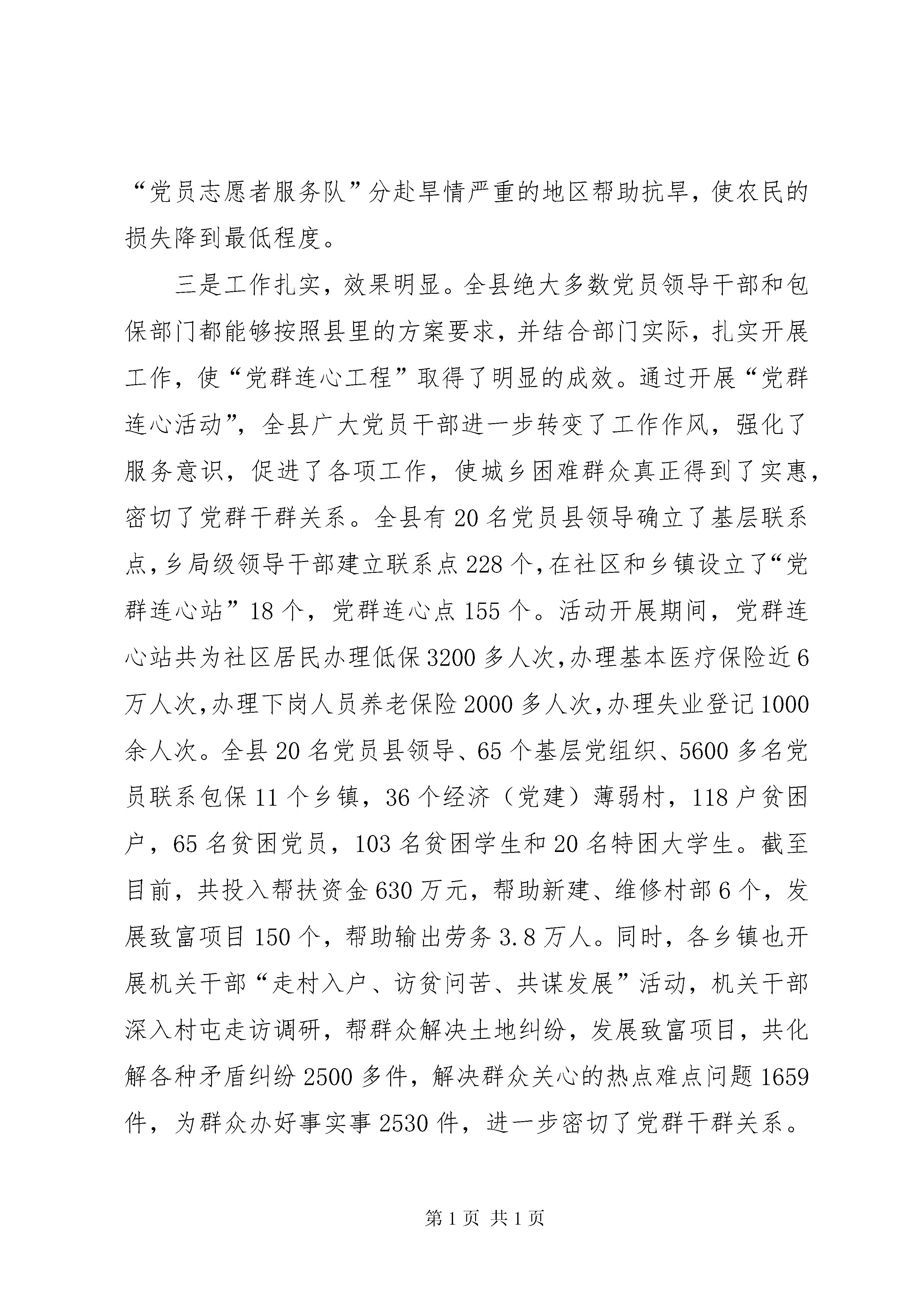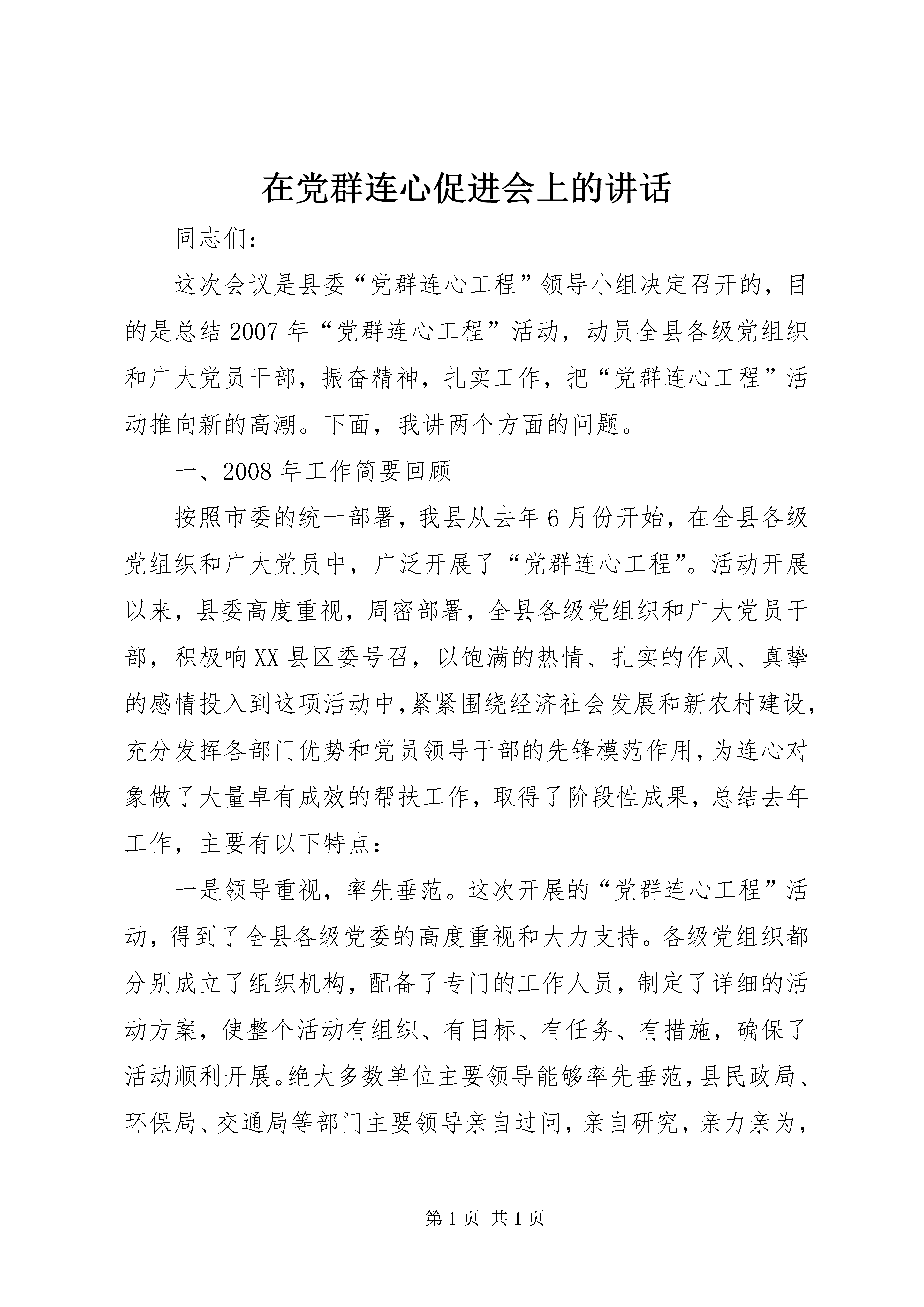 在党群连心促进会上的讲话同志们:这次会议是县委“党群连心工程”领导小组决定召开的,目的是总结2007年“党群连心工程”活动,动员全县各级党组织和广大党员干部,振奋精神,扎实工作,把“党群连心工程”活动推向新的高潮。下面,我讲两个方面的问题。一、2008年工作简要回顾按照市委的统一部署,我县从去年6月份开始,在全县各级党组织和广大党员中,广泛开展了“党群连心工程”。活动开展以来,县委高度重视,周密部署,全县各级党组织和广大党员干部,积极响XX县区委号召,以饱满的热情、扎实的作风、真挚的感情投入到这项活动中,紧紧围绕经济社会发展和新农村建设,充分发挥各部门优势和党员领导干部的先锋模范作用,为连心对象做了大量卓有成效的帮扶工作,取得了阶段性成果,总结去年工作,主要有以下特点:一是领导重视,率先垂范。这次开展的“党群连心工程”活动,得到了全县各级党委的高度重视和大力支持。各级党组织都分别成立了组织机构,配备了专门的工作人员,制定了详细的活动方案,使整个活动有组织、有目标、有任务、有措施,确保了活动顺利开展。绝大多数单位主要领导能够率先垂范,县民政局、环保局、交通局等部门主要领导亲自过问,亲自研究,亲力亲为,并组织和带领本部门广大党员干部深入基层联系点和所包保的贫困户,了解基层群众的疾苦,帮助解决生产生活中的实际困难,使这项活动得到了较好的落实。二是措施得力,注重实效。县“党群连心办”充分发挥了牵头抓总的职能作用,精心组织,周密部署,上细指导,设计了“服务三农、永葆先进”主题实践活动,对党员领导干部、普通党员、基层党组织等不同的层面,分别提出了明确的任务和要求,并跟踪调度、检查和指导,使“党群连心工程”任务明确,重点突出,有的放矢,确保了活动顺利进行。参与活动的党员领导干部和包保部门能够围绕全县发展大局,整合政策、资金、信息及人力资源优势,紧密结合部门业务职能,有针对性地设计活动载体,开展各具特色的帮扶活动。县司法局开展了“百家民营经济法律服务点”等“三个百”活动、县计生局开展了服务计生对象的“五关爱”活动、县劳动和社会保障局开展了“拓宽输出渠道,服务新型农民”主题实践活动;县交通局、财政局、水利局、发改局等部门积极帮助连心单位修建桥涵、改造自来水等基础设施建设,改善了农民群众的生产生活环境;县民政局投资7万元,帮助朝阳镇石顶子村新建了一个100平方米的村部;县工商局以建设服务型工商队伍为中心,引导全局干部职工树立“在执法中服务,在服务中连心”的观念,赢得了广大业户的普遍赞誉。在去年抗旱期间,水利、财政、发改、牧业、民政等部门组织了150人的“党员志愿者服务队”分赴旱情严重的地区帮助抗旱,使农民的损失降到最低程度。三是工作扎实,效果明显。全县绝大多数党员领导干部和包保部门都能够按照县里的方案要求,并结合部门实际,扎实开展工作,使“党群连心工程”取得了明显的成效。通过开展“党群连心活动”,全县广大党员干部进一步转变了工作作风,强化了服务意识,促进了各项工作,使城乡困难群众真正得到了实惠,密切了党群干群关系。全县有20名党员县领导确立了基层联系点,乡局级领导干部建立联系点228个,在社区和乡镇设立了“党群连心站”18个,党群连心点155个。活动开展期间,党群连心站共为社区居民办理低保3200多人次,办理基本医疗保险近6万人次,办理下岗人员养老保险2000多人次,办理失业登记1000余人次。全县20名党员县领导、65个基层党组织、5600多名党员联系包保11个乡镇,36个经济(党建)薄弱村,118户贫困户,65名贫困党员,103名贫困学生和20名特困大学生。截至目前,共投入帮扶资金630万元,帮助新建、维修村部6个,发展致富项目150个,帮助输出劳务3.8万人。同时,各乡镇也开展机关干部“走村入户、访贫问苦、共谋发展”活动,机关干部深入村屯走访调研,帮群众解决土地纠纷,发展致富项目,共化解各种矛盾纠纷2500多件,解决群众关心的热点难点问题1659件,为群众办好事实事2530件,进一步密切了党群干群关系。总之,通过一年来的工作,“党群连心工程”己深入民心,收到了实效,确实是一个德政工程,是一个改善党群、干群关系的好载体,应长期有效地抓下去。