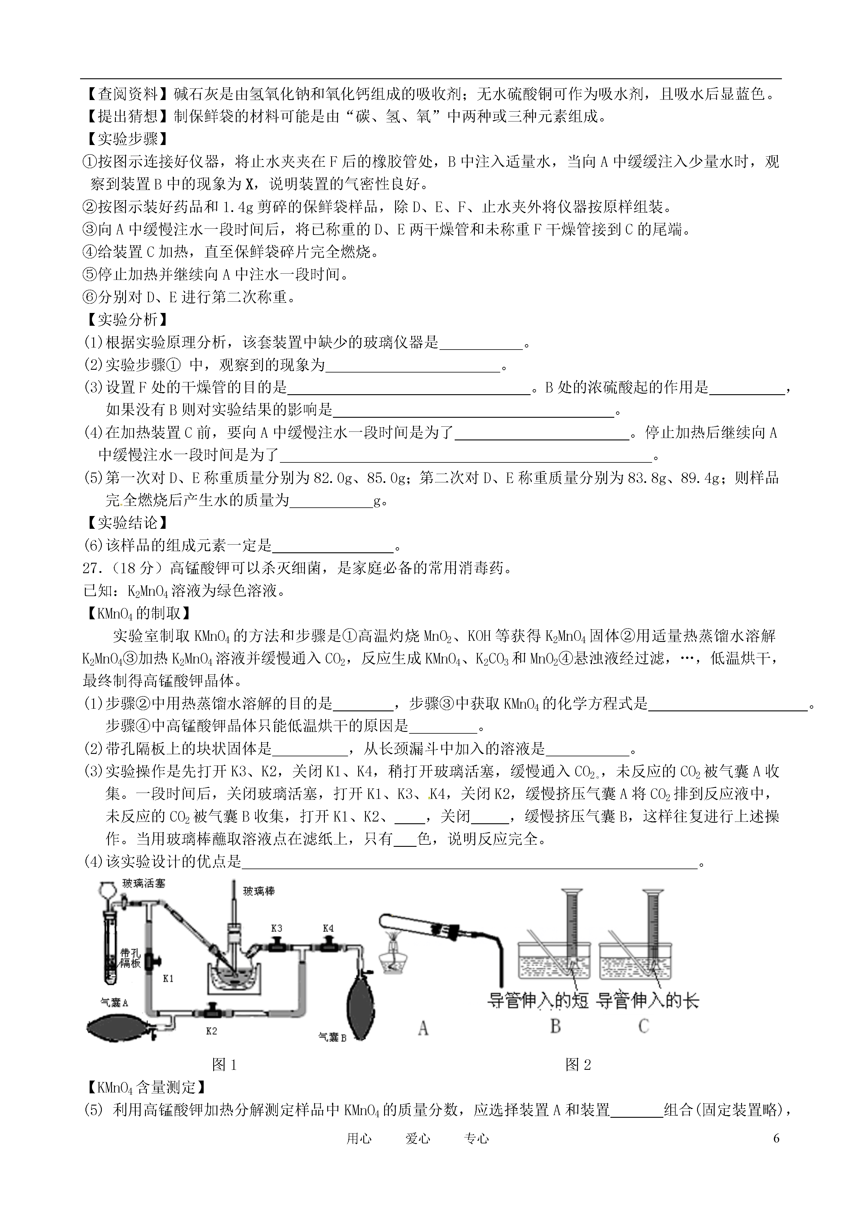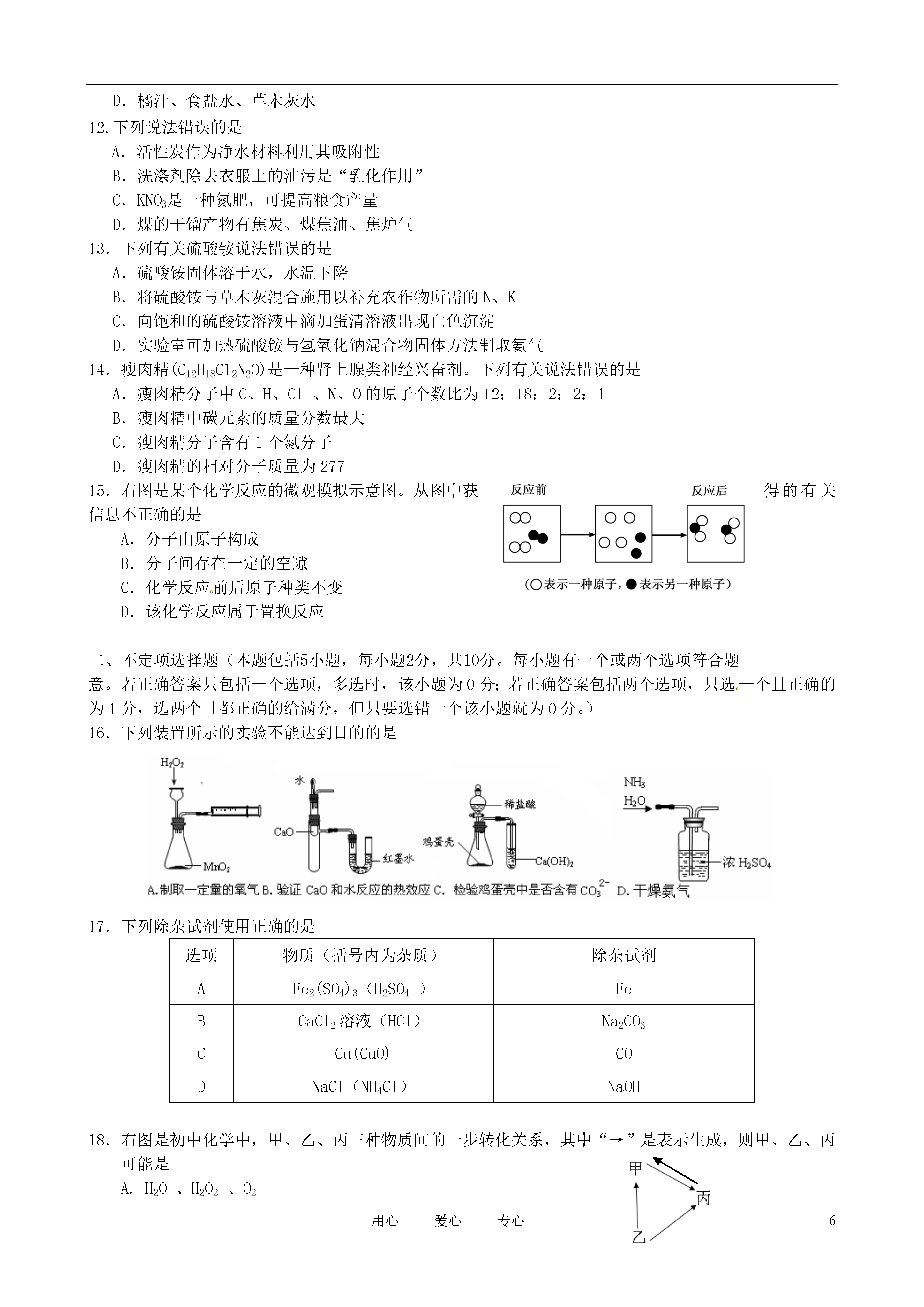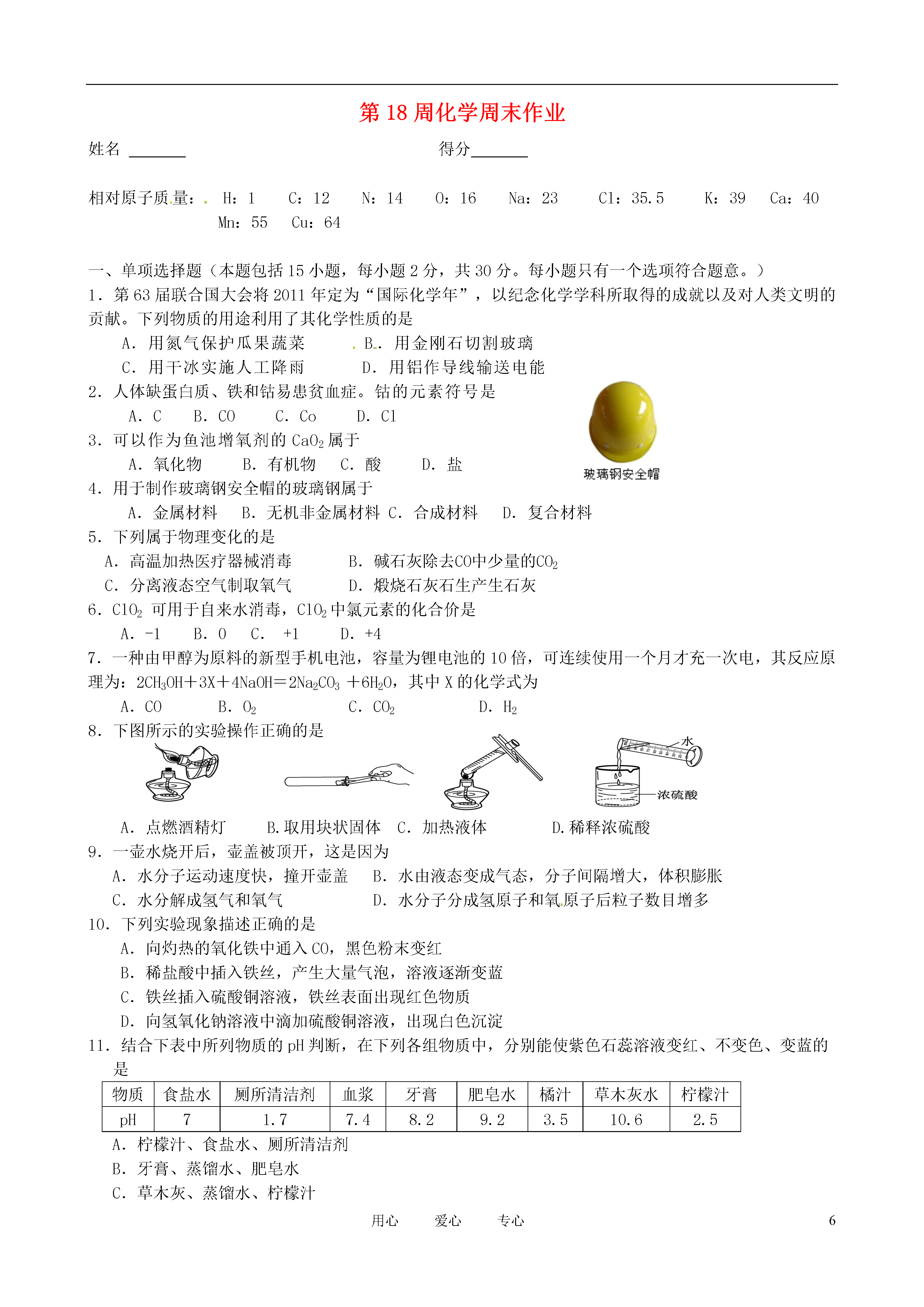 6用心爱心专心第18周化学周末作业姓名得分相对原子质量:H:1C:12N:14O:16Na:23Cl:35.5K:39Ca:40Mn:55Cu:64一、单项选择题(本题包括15小题,每小题2分,共30分。每小题只有一个选项符合题意。)1.第63届联合国大会将2011年定为“国际化学年”,以纪念化学学科所取得的成就以及对人类文明的贡献。下列物质的用途利用了其化学性质的是A.用氮气保护瓜果蔬菜B.用金刚石切割玻璃C.用干冰实施人工降雨D.用铝作导线输送电能2.人体缺蛋白质、铁和钴易患贫血症。钴的元素符号是A.CB.COC.CoD.Cl3.可以作为鱼池增氧剂的CaO2属于A.氧化物B.有机物C.酸D.盐4.用于制作玻璃钢安全帽的玻璃钢属于A.金属材料B.无机非金属材料C.合成材料D.复合材料5.下列属于物理变化的是A.高温加热医疗器械消毒B.碱石灰除去CO中少量的CO2C.分离液态空气制取氧气D.煅烧石灰石生产生石灰6.ClO2可用于自来水消毒,ClO2中氯元素的化合价是A.-1B.0C.+1D.+47.一种由甲醇为原料的新型手机电池,容量为锂电池的10倍,可连续使用一个月才充一次电,其反应原理为:2CH3OH+3X+4NaOH=2Na2CO3+6H2O,其中X的化学式为A.COB.O2C.CO2D.H28.下图所示的实验操作正确的是A.点燃酒精灯B.取用块状固体C.加热液体D.稀释浓硫酸9.一壶水烧开后,壶盖被顶开,这是因为A.水分子运动速度快,撞开壶盖B.水由液态变成气态,分子间隔增大,体积膨胀C.水分解成氢气和氧气D.水分子分成氢原子和氧原子后粒子数目增多10.下列实验现象描述正确的是A.向灼热的氧化铁中通入CO,黑色粉末变红B.稀盐酸中插入铁丝,产生大量气泡,溶液逐渐变蓝C.铁丝插入硫酸铜溶液,铁丝表面出现红色物质D.向氢氧化钠溶液中滴加硫酸铜溶液,出现白色沉淀11.结合下表中所列物质的pH判断,在下列各组物质中,分别能使紫色石蕊溶液变红、不变色、变蓝的是物质食盐水厕所清洁剂血浆牙膏肥皂水橘汁草木灰水柠檬汁pH71.77.48.29.23.510.62.5A.柠檬汁、食盐水、厕所清洁剂B.牙膏、蒸馏水、肥皂水C.草木灰、蒸馏水、柠檬汁D.橘汁、食盐水、草木灰水12.下列说法错误的是A.活性炭作为净水材料利用其吸附性B.洗涤剂除去衣服上的油污是“乳化作用”C.KNO3是一种氮肥,可提高粮食产量D.煤的干馏产物有焦炭、煤焦油、焦炉气13.下列有关硫酸铵说法错误的是A.硫酸铵固体溶于水,水温下降B.将硫酸铵与草木灰混合施用以补充农作物所需的N、KC.向饱和的硫酸铵溶液中滴加蛋清溶液出现白色沉淀D.实验室可加热硫酸铵与氢氧化钠混合物固体方法制取氨气14.瘦肉精(C12H18Cl2N2O)是一种肾上腺类神经兴奋剂。下列有关说法错误的是A.瘦肉精分子中C、H、Cl、N、O的原子个数比为12:18:2:2:1B.瘦肉精中碳元素的质量分数最大C.瘦肉精分子含有1个氮分子D.瘦肉精的相对分子质量为27715.右图是某个化学反应的微观模拟示意图。从图中获得的有关信息不正确的是A.分子由原子构成B.分子间存在一定的空隙C.化学反应前后原子种类不变D.该化学反应属于置换反应二、不定项选择题(本题包括5小题,每小题2分,共10分。每小题有一个或两个选项符合题意。若正确答案只包括一个选项,多选时,该小题为0分;若正确答案包括两个选项,只选一个且正确的为1分,选两个且都正确的给满分,但只要选错一个该小题就为0分。)16.下列装置所示的实验不能达到目的的是17.下列除杂试剂使用正确的是选项物质(括号内为杂质)除杂试剂AFe2(SO4)3(H2SO4)FeBCaCl2溶液(HCl)Na2CO3CCu(CuO)CODNaCl(NH4Cl)NaOH18.右图是初中化学中,甲、乙、丙三种物质间的一步转化关系,其中“→”是表示生成,则甲、乙、丙可能是A.H2O、H2O2、O2B.CO、C、CO2C.CuO、Cu、CuSO4D.CaCO3、Ca(OH)2、CaO19.右图是a、b、c三种物质的溶解度曲线。下列说法正确的是A.t1℃时,a、b的溶解度都是20B.t2℃时,将100ga物质加入到100g水中并充分搅拌,形成溶液的溶质质量分数为50%;C.t2℃时,将a、b、c三种物质的饱和溶液降低温度到t1℃时,这三种溶液中溶质质量分数的大小关系是b>a=cD.t2℃时,质量相等的a、b、c三种物质的饱和溶液中水的质量大小关系是c>b>a20.向10gHCl、CaCl2的混合溶液中逐滴滴加溶质质