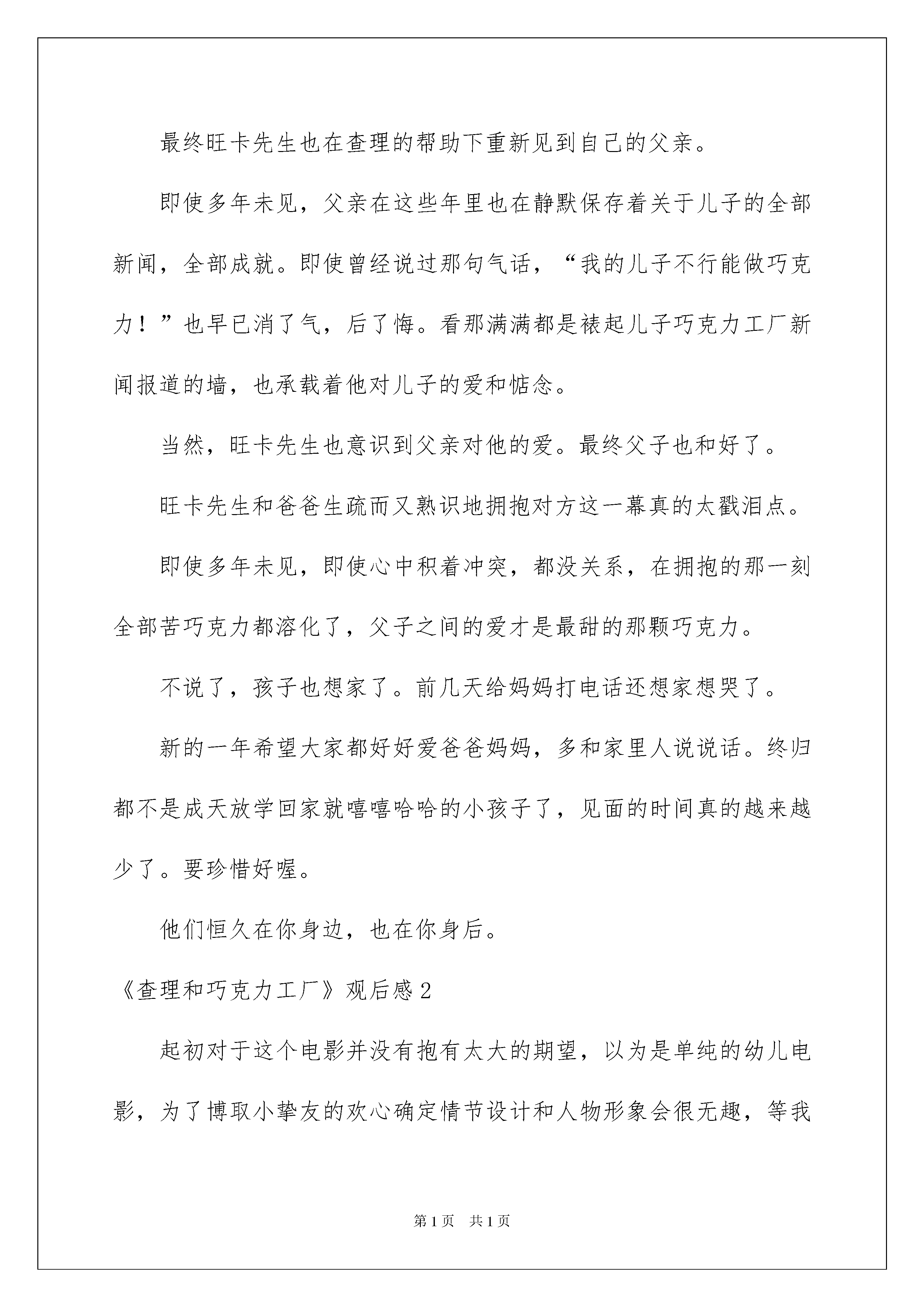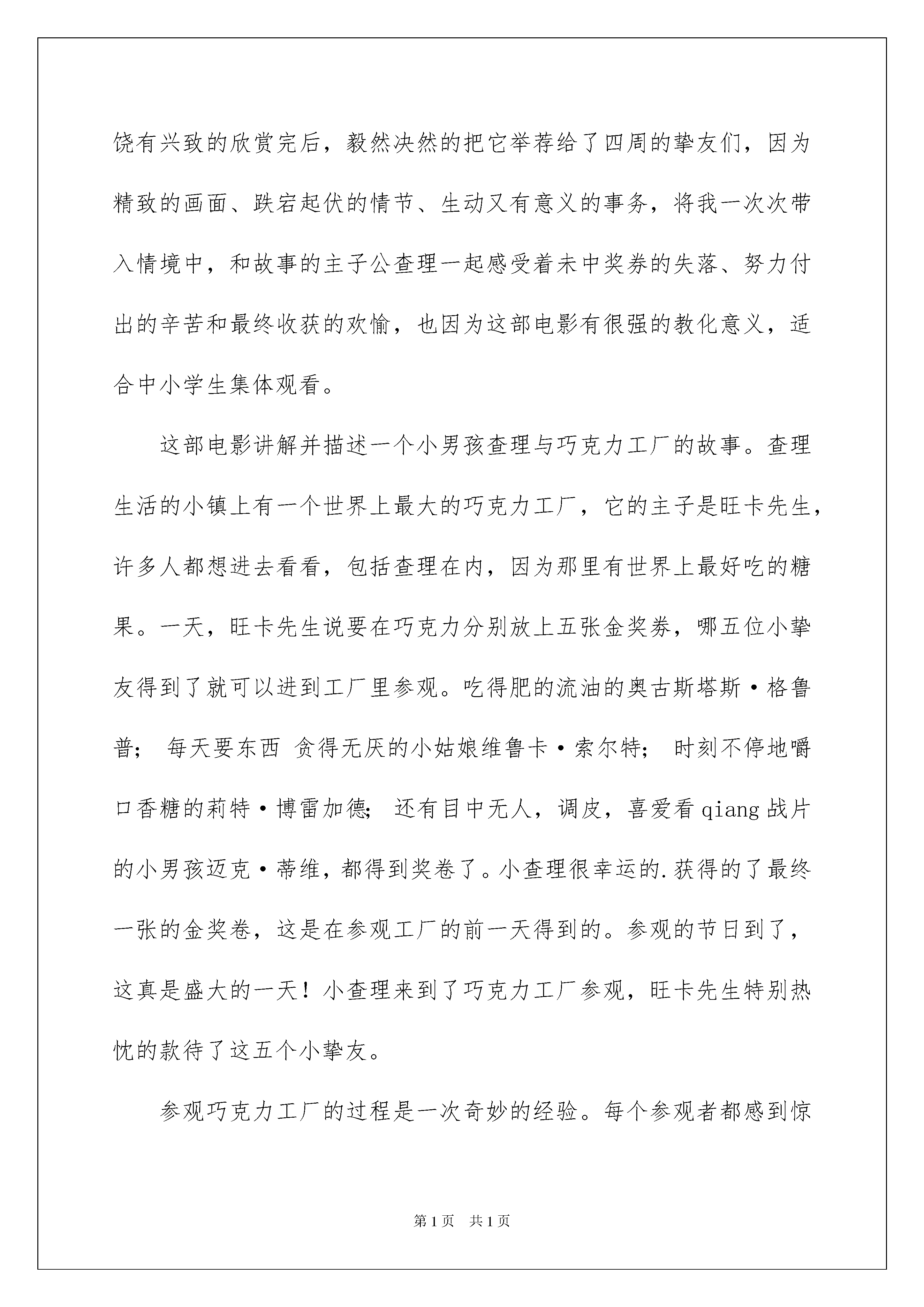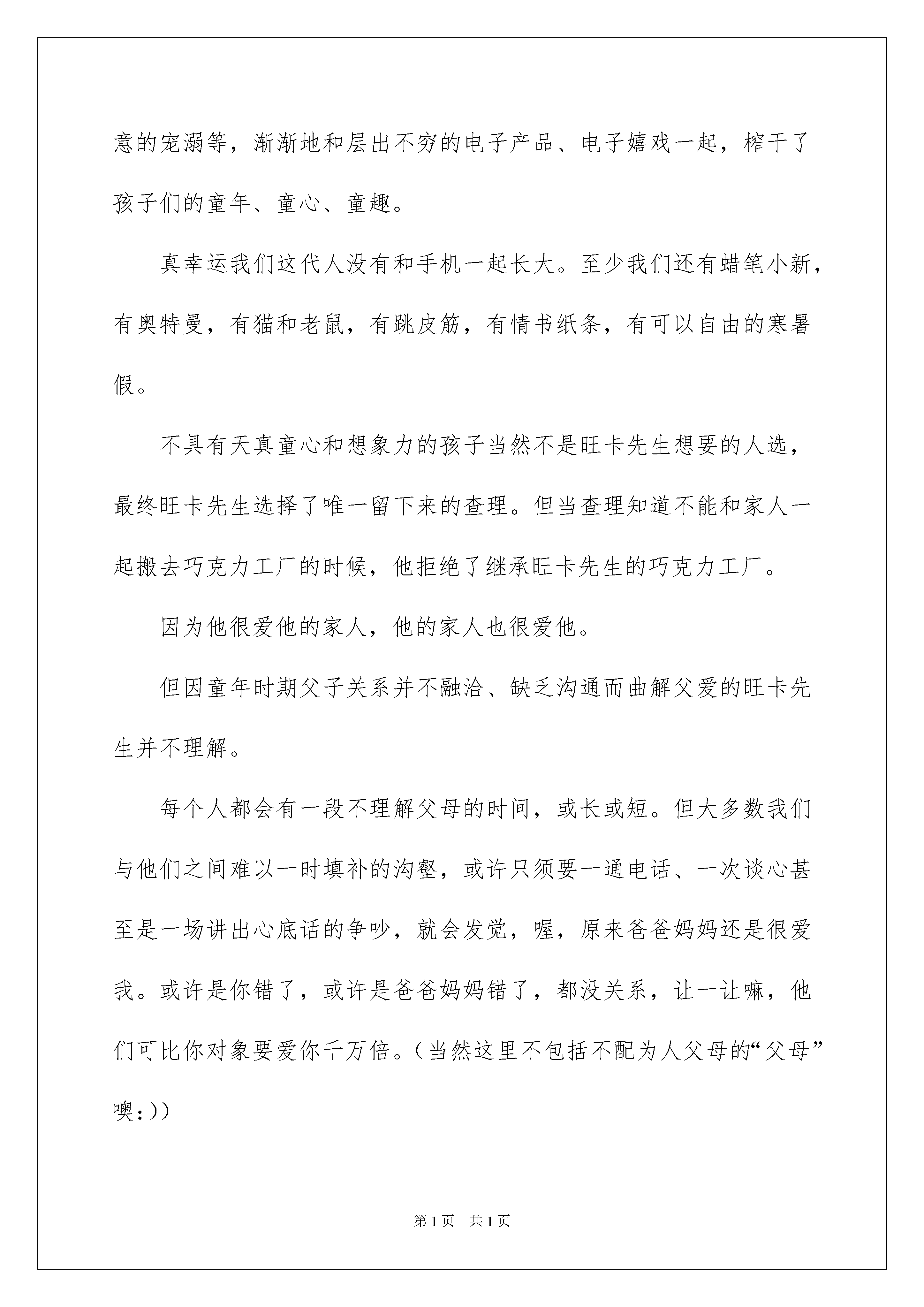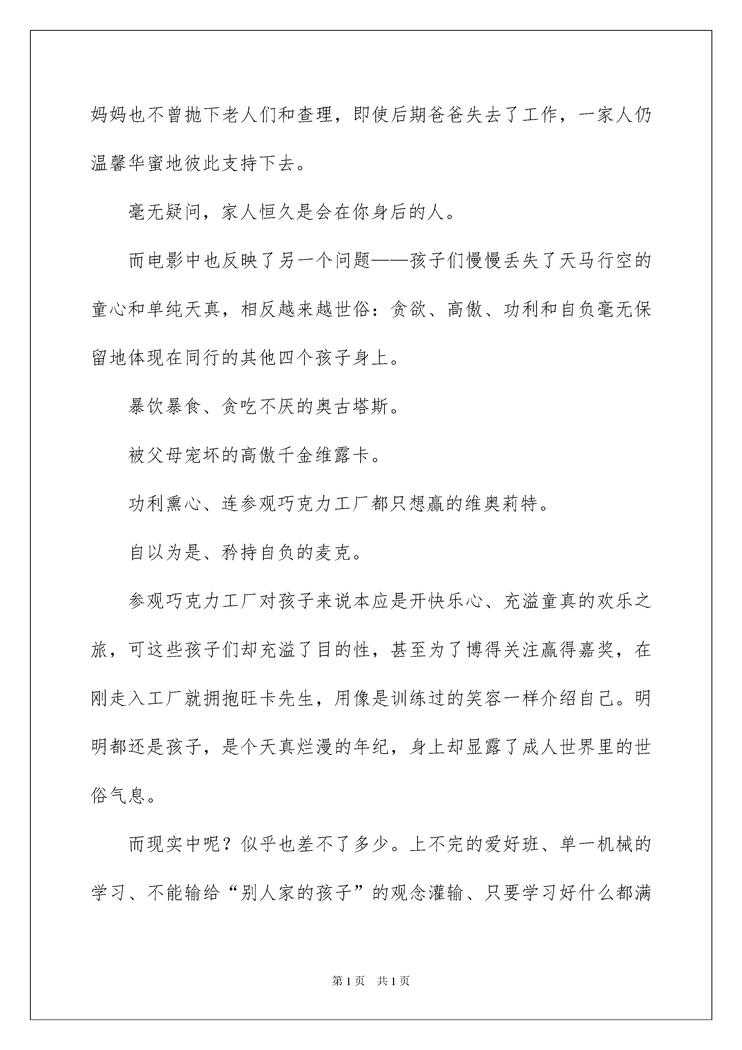 2022《查理和巧克力工厂》观后感《查理和巧克力工厂》观后感当观看完一部影视作品后,对人生或者事物肯定产生了很多感想吧,这时候非常有必需要写一篇观后感了!可能你现在毫无头绪吧,下面是我帮大家整理的《查理和巧克力工厂》观后感,仅供参考,大家一起来看看吧。《查理和巧克力工厂》观后感1《查理和巧克力工厂》这部电影讲解并描述了一个童话类型的故事,故事的小主角查理家境贫寒但是一家人和谐融洽,也让年少的他懂得家人的陪伴与爱。一次偶然的机会,查理得到了金奖券得以参观大名鼎鼎的旺卡巧克力工厂,而年少时被严加管束连糖也不能吃一颗的旺卡先生则在查理的帮助和影响下懂得了家人的意义,懂得了家的爱。这部电影的“家人”主题着实戳到了我这个第一次离家出远门的小崽子的泪点。电影中查理家里那一幕,乔治爷爷就让我想起了外公外婆。查理一家七口人挤在一间小木屋里,即使三餐都成问题,爸爸妈妈也不曾抛下老人们和查理,即使后期爸爸失去了工作,一家人仍温馨华蜜地彼此支持下去。毫无疑问,家人恒久是会在你身后的人。而电影中也反映了另一个问题——孩子们慢慢丢失了天马行空的童心和单纯天真,相反越来越世俗:贪欲、高傲、功利和自负毫无保留地体现在同行的其他四个孩子身上。暴饮暴食、贪吃不厌的奥古塔斯。被父母宠坏的高傲千金维露卡。功利熏心、连参观巧克力工厂都只想赢的维奥莉特。自以为是、矜持自负的麦克。参观巧克力工厂对孩子来说本应是开快乐心、充溢童真的欢乐之旅,可这些孩子们却充溢了目的性,甚至为了博得关注赢得嘉奖,在刚走入工厂就拥抱旺卡先生,用像是训练过的笑容一样介绍自己。明明都还是孩子,是个天真烂漫的年纪,身上却显露了成人世界里的世俗气息。而现实中呢?似乎也差不了多少。上不完的爱好班、单一机械的学习、不能输给“别人家的孩子”的观念灌输、只要学习好什么都满意的宠溺等,渐渐地和层出不穷的电子产品、电子嬉戏一起,榨干了孩子们的童年、童心、童趣。真幸运我们这代人没有和手机一起长大。至少我们还有蜡笔小新,有奥特曼,有猫和老鼠,有跳皮筋,有情书纸条,有可以自由的寒暑假。不具有天真童心和想象力的孩子当然不是旺卡先生想要的人选,最终旺卡先生选择了唯一留下来的查理。但当查理知道不能和家人一起搬去巧克力工厂的时候,他拒绝了继承旺卡先生的巧克力工厂。因为他很爱他的家人,他的家人也很爱他。但因童年时期父子关系并不融洽、缺乏沟通而曲解父爱的旺卡先生并不理解。每个人都会有一段不理解父母的时间,或长或短。但大多数我们与他们之间难以一时填补的沟壑,或许只须要一通电话、一次谈心甚至是一场讲出心底话的争吵,就会发觉,喔,原来爸爸妈妈还是很爱我。或许是你错了,或许是爸爸妈妈错了,都没关系,让一让嘛,他们可比你对象要爱你千万倍。(当然这里不包括不配为人父母的“父母”噢:))最终旺卡先生也在查理的帮助下重新见到自己的父亲。即使多年未见,父亲在这些年里也在静默保存着关于儿子的全部新闻,全部成就。即使曾经说过那句气话,“我的儿子不行能做巧克力!”也早已消了气,后了悔。看那满满都是裱起儿子巧克力工厂新闻报道的墙,也承载着他对儿子的爱和惦念。当然,旺卡先生也意识到父亲对他的爱。最终父子也和好了。旺卡先生和爸爸生疏而又熟识地拥抱对方这一幕真的太戳泪点。即使多年未见,即使心中积着冲突,都没关系,在拥抱的那一刻全部苦巧克力都溶化了,父子之间的爱才是最甜的那颗巧克力。不说了,孩子也想家了。前几天给妈妈打电话还想家想哭了。新的一年希望大家都好好爱爸爸妈妈,多和家里人说说话。终归都不是成天放学回家就嘻嘻哈哈的小孩子了,见面的时间真的越来越少了。要珍惜好喔。他们恒久在你身边,也在你身后。《查理和巧克力工厂》观后感2起初对于这个电影并没有抱有太大的期望,以为是单纯的幼儿电影,为了博取小挚友的欢心确定情节设计和人物形象会很无趣,等我饶有兴致的欣赏完后,毅然决然的把它举荐给了四周的挚友们,因为精致的画面、跌宕起伏的情节、生动又有意义的事务,将我一次次带入情境中,和故事的主子公查理一起感受着未中奖券的失落、努力付出的辛苦和最终收获的欢愉,也因为这部电影有很强的教化意义,适合中小学生集体观看。这部电影讲解并描述一个小男孩查理与巧克力工厂的故事。查理生活的小镇上有一个世界上最大的巧克力工厂,它的主子是旺卡先生,许多人都想进去看看,包括查理在内,因为那里有世界上最好吃的糖果。一天,旺卡先生说要在巧克力分别放上五张金奖劵,哪五位小挚友得到了就可以进到工厂里参观。吃得肥的流油的奥古斯塔斯·格鲁普;每天要东西贪得无厌的小姑娘维鲁卡·索尔特;时刻不停地嚼口香糖的莉特·博雷加德;还有目中无人,调皮,喜爱看qiang战片的