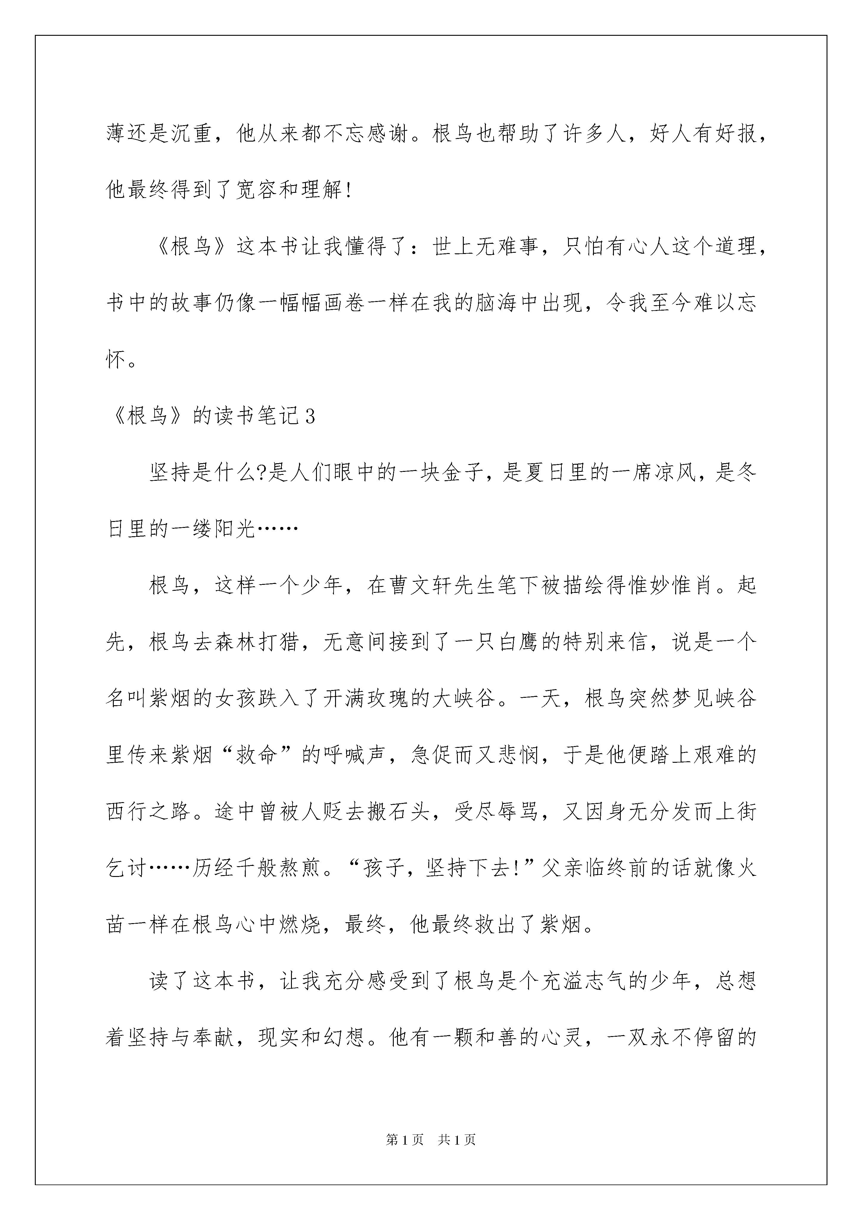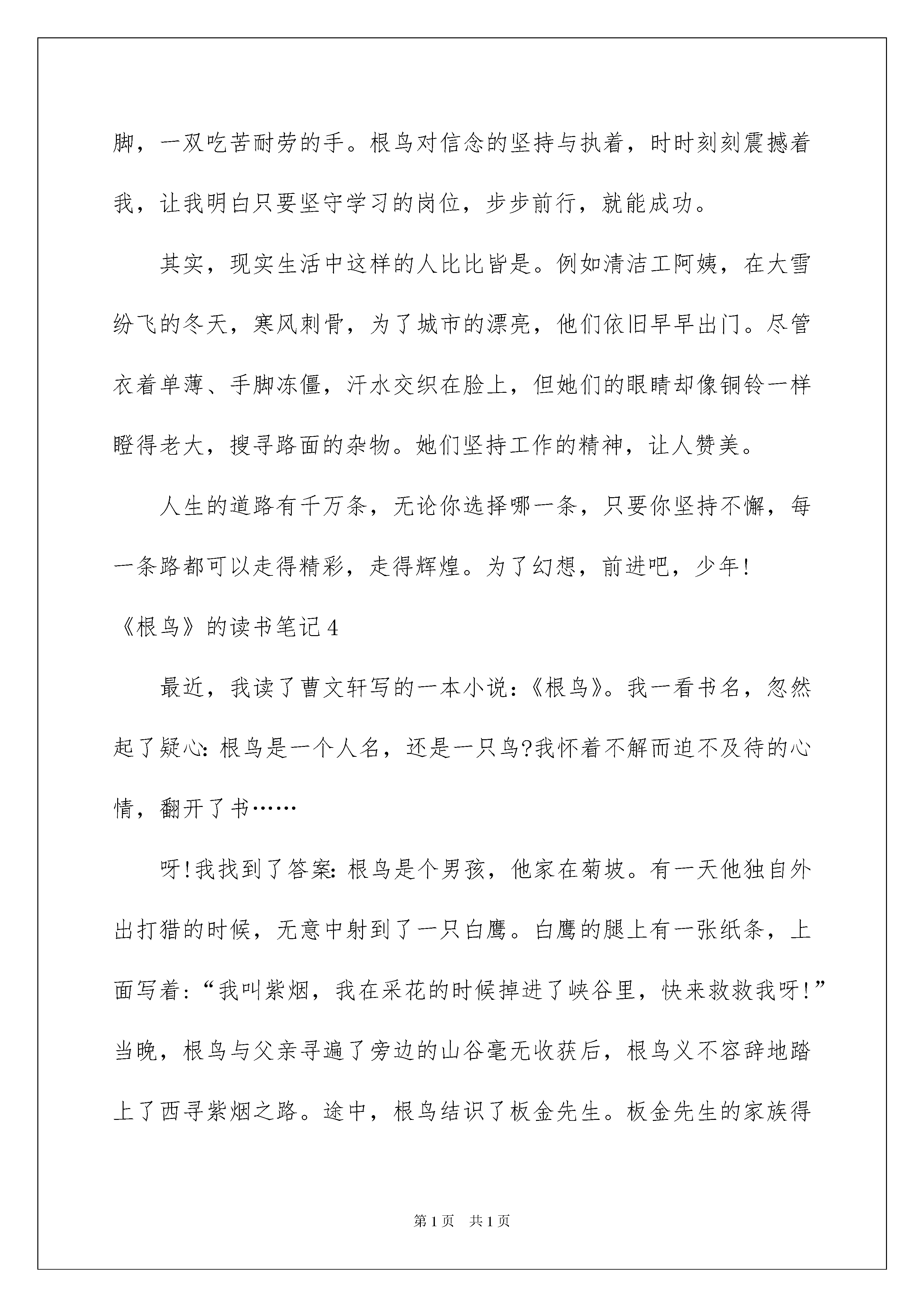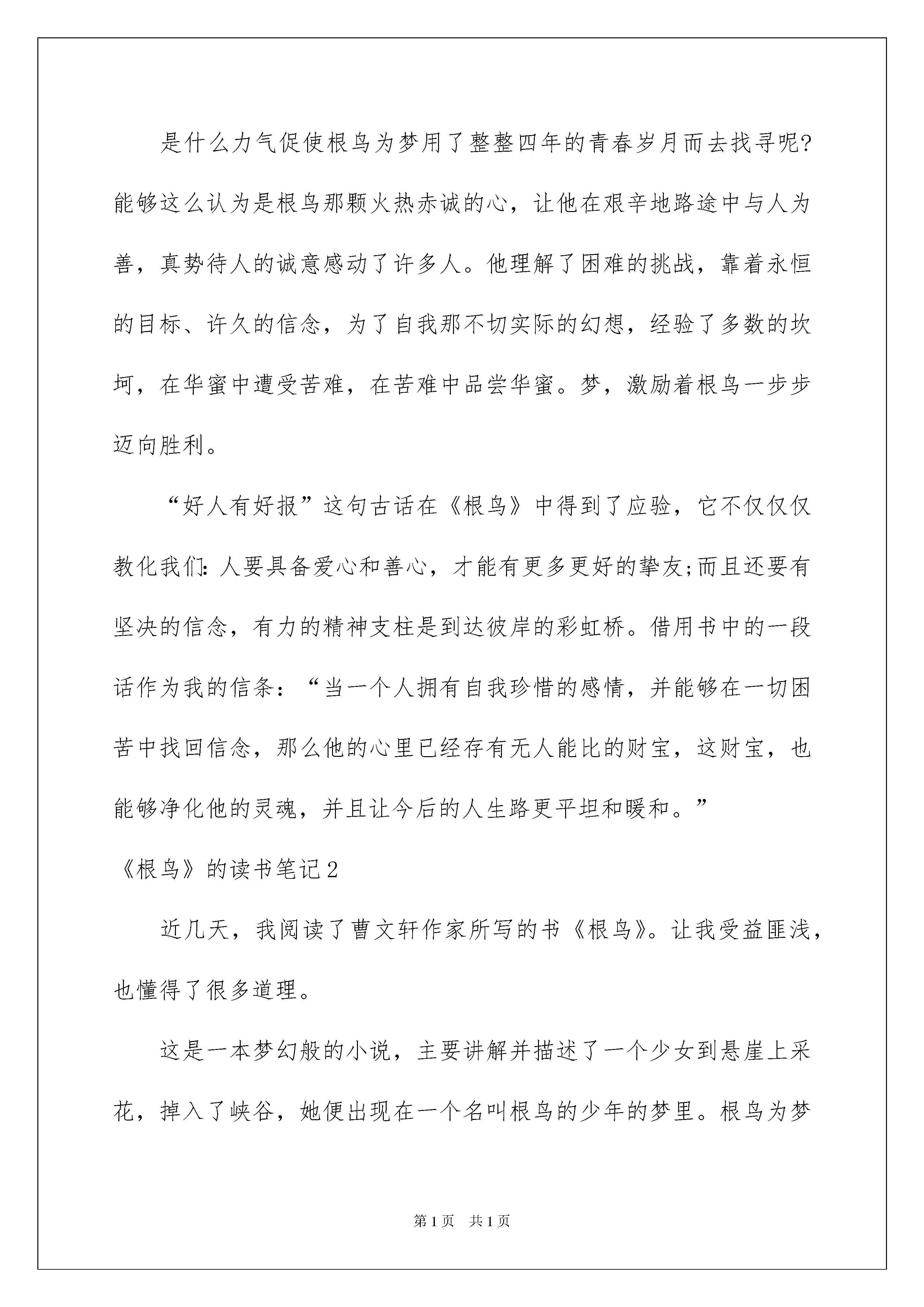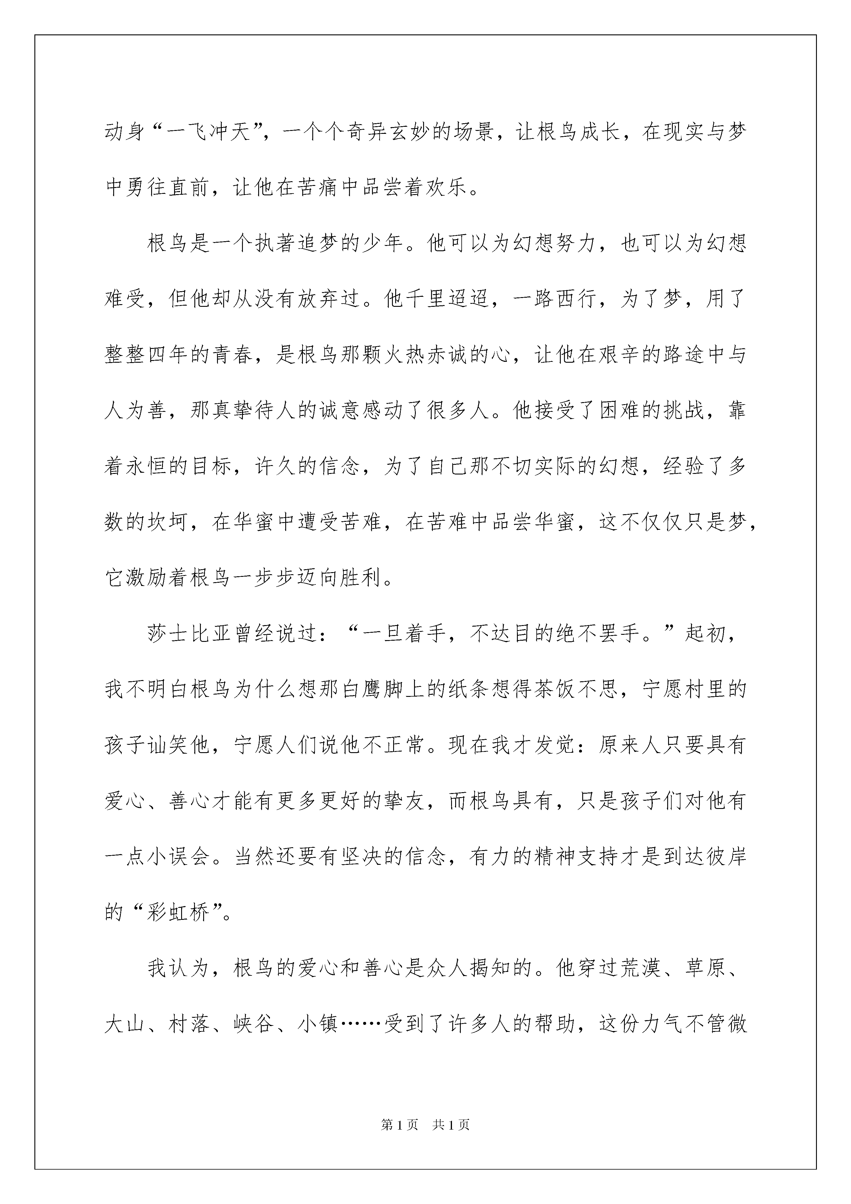 2022《根鸟》的读书笔记《根鸟》的读书笔记当细细地品读完一本名著后,你心中有什么感想呢?写一份读书笔记,记录收获与付出吧。那么如何写读书笔记才能更有感染力呢?下面是我帮大家整理的《根鸟》的读书笔记,希望对大家有所帮助。《根鸟》的读书笔记1我读了一本书,它给我留下了非常深刻的印象,书名是《根鸟》。《根鸟》主要描述了主子翁根鸟为了追求别人都认为是不切实际的白日梦,经验了诸多磨难最终找到幻想。从小就不明白母亲在哪里的根鸟,与父亲生活在一齐。有一天,他进森林捕猎,射死一只极为罕见的白鹰,它发觉鹰腿上有一张求救布,他朝思夜想,想救出那个女孩,他去了县城,没找到满是百合花的大峡谷,回家的那天晚上,他在梦中找到了答案。第三天,他就背上旅行包,将一切安排好,踏上了西征的旅途,途中他遇到了很多人,有好人,也有坏人。但经过曲折坎坷的找寻,根鸟最之后到了幻想中的大峡谷——个充溢百合花的大峡谷。是什么力气促使根鸟为梦用了整整四年的青春岁月而去找寻呢?能够这么认为是根鸟那颗火热赤诚的心,让他在艰辛地路途中与人为善,真势待人的诚意感动了许多人。他理解了困难的挑战,靠着永恒的目标、许久的信念,为了自我那不切实际的幻想,经验了多数的坎坷,在华蜜中遭受苦难,在苦难中品尝华蜜。梦,激励着根鸟一步步迈向胜利。“好人有好报”这句古话在《根鸟》中得到了应验,它不仅仅仅教化我们:人要具备爱心和善心,才能有更多更好的挚友;而且还要有坚决的信念,有力的精神支柱是到达彼岸的彩虹桥。借用书中的一段话作为我的信条:“当一个人拥有自我珍惜的感情,并能够在一切困苦中找回信念,那么他的心里已经存有无人能比的财宝,这财宝,也能够净化他的灵魂,并且让今后的人生路更平坦和暖和。”《根鸟》的读书笔记2近几天,我阅读了曹文轩作家所写的书《根鸟》。让我受益匪浅,也懂得了很多道理。这是一本梦幻般的小说,主要讲解并描述了一个少女到悬崖上采花,掉入了峡谷,她便出现在一个名叫根鸟的少年的梦里。根鸟为梦动身“一飞冲天”,一个个奇异玄妙的场景,让根鸟成长,在现实与梦中勇往直前,让他在苦痛中品尝着欢乐。根鸟是一个执著追梦的少年。他可以为幻想努力,也可以为幻想难受,但他却从没有放弃过。他千里迢迢,一路西行,为了梦,用了整整四年的青春,是根鸟那颗火热赤诚的心,让他在艰辛的路途中与人为善,那真挚待人的诚意感动了很多人。他接受了困难的挑战,靠着永恒的目标,许久的信念,为了自己那不切实际的幻想,经验了多数的坎坷,在华蜜中遭受苦难,在苦难中品尝华蜜,这不仅仅只是梦,它激励着根鸟一步步迈向胜利。莎士比亚曾经说过:“一旦着手,不达目的绝不罢手。”起初,我不明白根鸟为什么想那白鹰脚上的纸条想得茶饭不思,宁愿村里的孩子讪笑他,宁愿人们说他不正常。现在我才发觉:原来人只要具有爱心、善心才能有更多更好的挚友,而根鸟具有,只是孩子们对他有一点小误会。当然还要有坚决的信念,有力的精神支持才是到达彼岸的“彩虹桥”。我认为,根鸟的爱心和善心是众人揭知的。他穿过荒漠、草原、大山、村落、峡谷、小镇……受到了许多人的帮助,这份力气不管微薄还是沉重,他从来都不忘感谢。根鸟也帮助了许多人,好人有好报,他最终得到了宽容和理解!《根鸟》这本书让我懂得了:世上无难事,只怕有心人这个道理,书中的故事仍像一幅幅画卷一样在我的脑海中出现,令我至今难以忘怀。《根鸟》的读书笔记3坚持是什么?是人们眼中的一块金子,是夏日里的一席凉风,是冬日里的一缕阳光……根鸟,这样一个少年,在曹文轩先生笔下被描绘得惟妙惟肖。起先,根鸟去森林打猎,无意间接到了一只白鹰的特别来信,说是一个名叫紫烟的女孩跌入了开满玫瑰的大峡谷。一天,根鸟突然梦见峡谷里传来紫烟“救命”的呼喊声,急促而又悲悯,于是他便踏上艰难的西行之路。途中曾被人贬去搬石头,受尽辱骂,又因身无分发而上街乞讨……历经千般熬煎。“孩子,坚持下去!”父亲临终前的话就像火苗一样在根鸟心中燃烧,最终,他最终救出了紫烟。读了这本书,让我充分感受到了根鸟是个充溢志气的少年,总想着坚持与奉献,现实和幻想。他有一颗和善的心灵,一双永不停留的脚,一双吃苦耐劳的手。根鸟对信念的坚持与执着,时时刻刻震撼着我,让我明白只要坚守学习的岗位,步步前行,就能成功。其实,现实生活中这样的人比比皆是。例如清洁工阿姨,在大雪纷飞的冬天,寒风刺骨,为了城市的漂亮,他们依旧早早出门。尽管衣着单薄、手脚冻僵,汗水交织在脸上,但她们的眼睛却像铜铃一样瞪得老大,搜寻路面的杂物。她们坚持工作的精神,让人赞美。人生的道路有千万条,无论你选择哪一条,只要你坚持不懈,每一条路都可以走得精彩,走得辉煌。为了幻想,前进吧,少年!