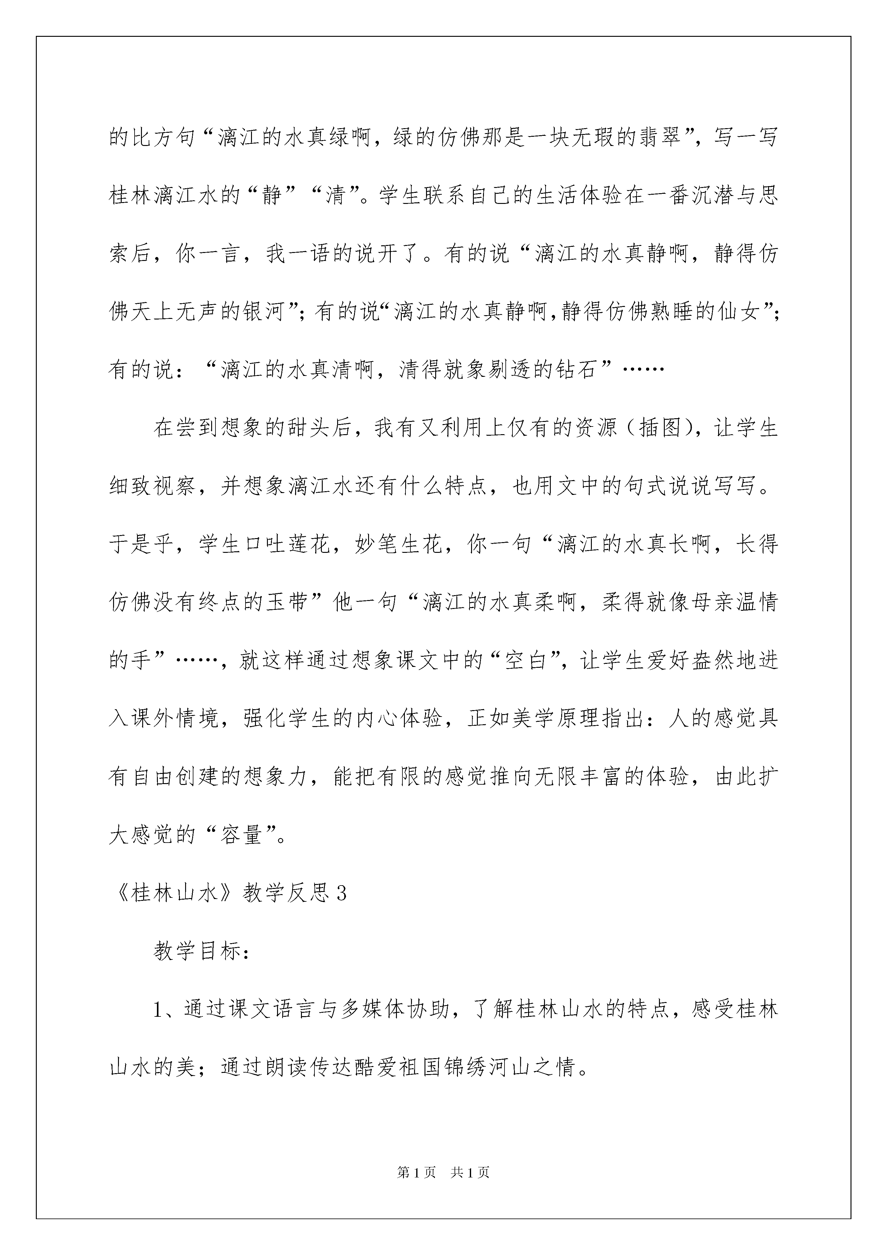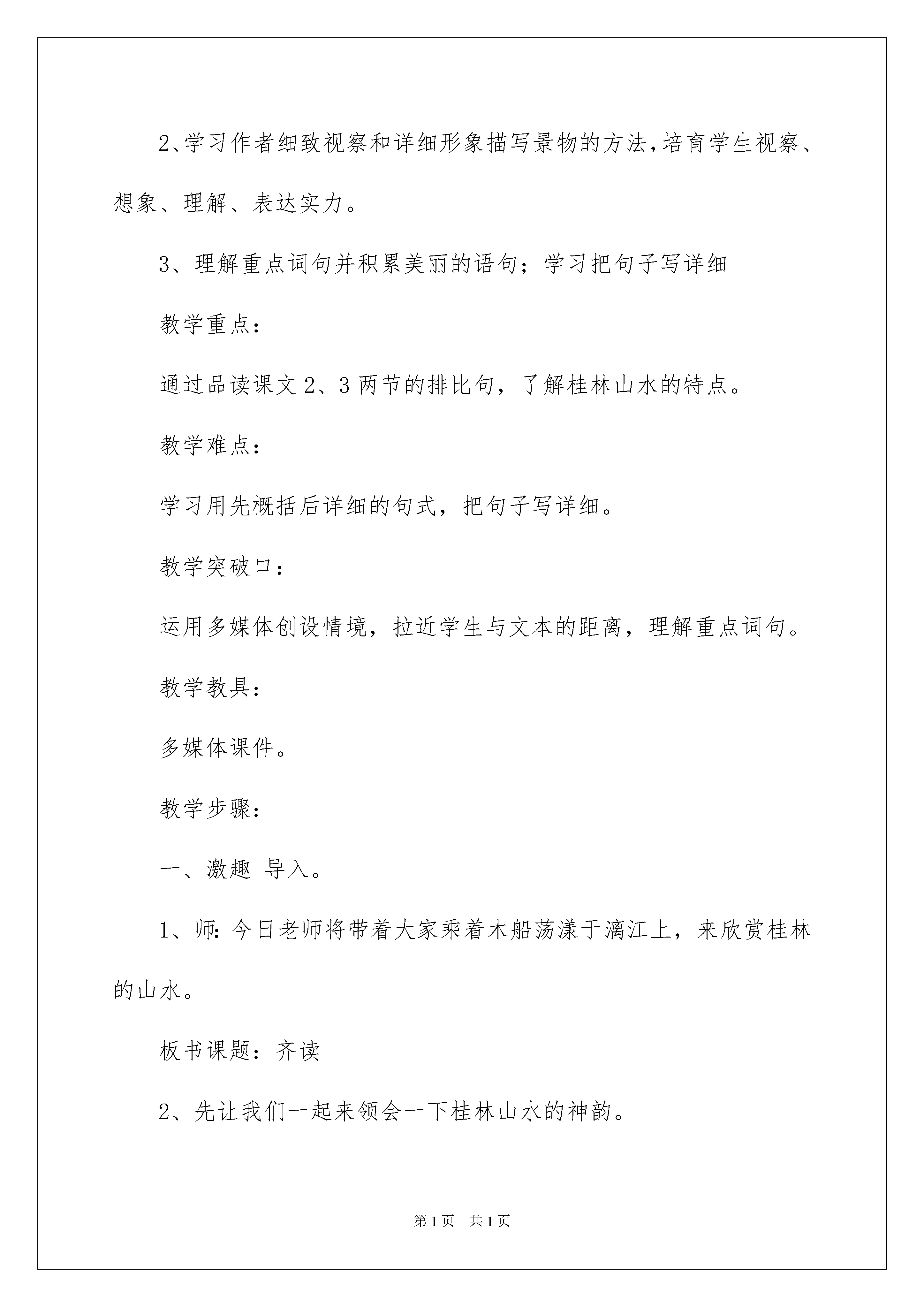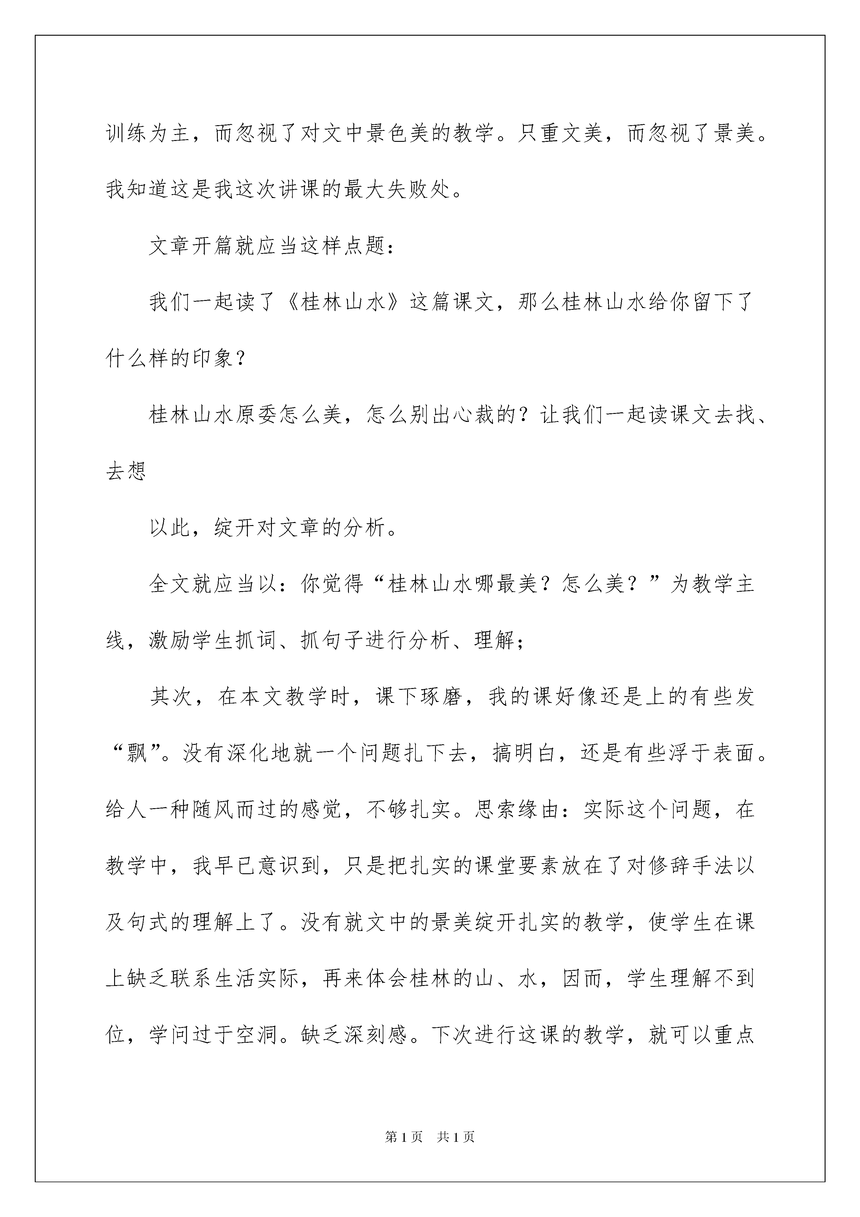 2022《桂林山水》教学反思《桂林山水》教学反思身为一名刚到岗的人民老师,教学是我们的工作之一,教学反思能很好的记录下我们的课堂阅历,那么应当如何写教学反思呢?下面是我为大家整理的《桂林山水》教学反思,欢迎大家共享。《桂林山水》教学反思1一堂课下来,自我感觉还是能够把课前设计的各个环节,各个学问点如一渗透给学生,还算基本完成了教学任务,而我课前所担忧的与学生的协作,也由于我多年的教学生活而“造就”的“厚脸皮”下,迎刃而解了。还是要感谢前几任老师的细心培育,这班孩子思维很活跃,课上甚是主动思索,主动回答问题。我知道,假如这堂课,讲不胜利,那责任只能在我自己课下,与主任交换看法后,还是发觉了自己教学中的大问题,即:原来应当是以抓文章中的“景美、文美”为主线;在此基础上,再顺势进行修辞手法、写作方法等的训练,包括字词句的比较及应用;而我这堂课的教学,正好相反,全文的教学重点落在了文章的结构、段落的层次以及修辞手法、写作方法的理解与训练为主,而忽视了对文中景色美的教学。只重文美,而忽视了景美。我知道这是我这次讲课的最大失败处。文章开篇就应当这样点题:我们一起读了《桂林山水》这篇课文,那么桂林山水给你留下了什么样的印象?桂林山水原委怎么美,怎么别出心裁的?让我们一起读课文去找、去想以此,绽开对文章的分析。全文就应当以:你觉得“桂林山水哪最美?怎么美?”为教学主线,激励学生抓词、抓句子进行分析、理解;其次,在本文教学时,课下琢磨,我的课好像还是上的有些发“飘”。没有深化地就一个问题扎下去,搞明白,还是有些浮于表面。给人一种随风而过的感觉,不够扎实。思索缘由:实际这个问题,在教学中,我早已意识到,只是把扎实的课堂要素放在了对修辞手法以及句式的理解上了。没有就文中的景美绽开扎实的教学,使学生在课上缺乏联系生活实际,再来体会桂林的山、水,因而,学生理解不到位,学问过于空洞。缺乏深刻感。下次进行这课的教学,就可以重点抓住文章的其次、三段,在理解比较、典型句式的同时,挖掘学生的实际生活,激励学生联系自己的生活实际,谈对山、水特点的理解,深刻体会景色的美。这样,在此基础上的朗读,就水到渠成了。看来,虽然多年的教学,脑子里的糊涂帐还是有的,好在还有一些精力,还有一份热忱,有待在高人的指引下,渐渐前进,渐渐提高吧!《桂林山水》教学反思2《桂林山水》描写漓江水的片段,不仅让人感到色调艳丽,清爽;而且音韵和谐,句式整齐;读起来琅琅上口,回味无穷。教学这一段时,我按课前预设的方案,引导学生反复朗读,希望学生在被文中语言生成的感性形式的韵律美打动的同时,也能体验到漓江水“静”“清”“绿”的秀美。可一起先,课堂上的生成却不如我所愿,一方面由于学校教学条件的限制,无法让学生通过多媒体或是VCD等方式,在视觉上去领会实实在在的美,只能照本宣科的说,甚至矫柔造作的读;另一方面“读课文,说说漓江水有什么特点”这个问题过于浅显,不具有挑战性,课堂就显得枯燥乏味了。为了激情,我临时添进这样的补白:仿文中的比方句“漓江的水真绿啊,绿的仿佛那是一块无瑕的翡翠”,写一写桂林漓江水的“静”“清”。学生联系自己的生活体验在一番沉潜与思索后,你一言,我一语的说开了。有的说“漓江的水真静啊,静得仿佛天上无声的银河”;有的说“漓江的水真静啊,静得仿佛熟睡的仙女”;有的说:“漓江的水真清啊,清得就象剔透的钻石”……在尝到想象的甜头后,我有又利用上仅有的资源(插图),让学生细致视察,并想象漓江水还有什么特点,也用文中的句式说说写写。于是乎,学生口吐莲花,妙笔生花,你一句“漓江的水真长啊,长得仿佛没有终点的玉带”他一句“漓江的水真柔啊,柔得就像母亲温情的手”……,就这样通过想象课文中的“空白”,让学生爱好盎然地进入课外情境,强化学生的内心体验,正如美学原理指出:人的感觉具有自由创建的想象力,能把有限的感觉推向无限丰富的体验,由此扩大感觉的“容量”。《桂林山水》教学反思3教学目标:1、通过课文语言与多媒体协助,了解桂林山水的特点,感受桂林山水的美;通过朗读传达酷爱祖国锦绣河山之情。2、学习作者细致视察和详细形象描写景物的方法,培育学生视察、想象、理解、表达实力。3、理解重点词句并积累美丽的语句;学习把句子写详细教学重点:通过品读课文2、3两节的排比句,了解桂林山水的特点。教学难点:学习用先概括后详细的句式,把句子写详细。教学突破口:运用多媒体创设情境,拉近学生与文本的距离,理解重点词句。教学教具:多媒体课件。教学步骤:一、激趣导入。1、师:今日老师将带着大家乘着木船荡漾于漓江上,来欣赏桂林的山水。板书课题:齐读2、先让我们一起来领会一下桂林山水