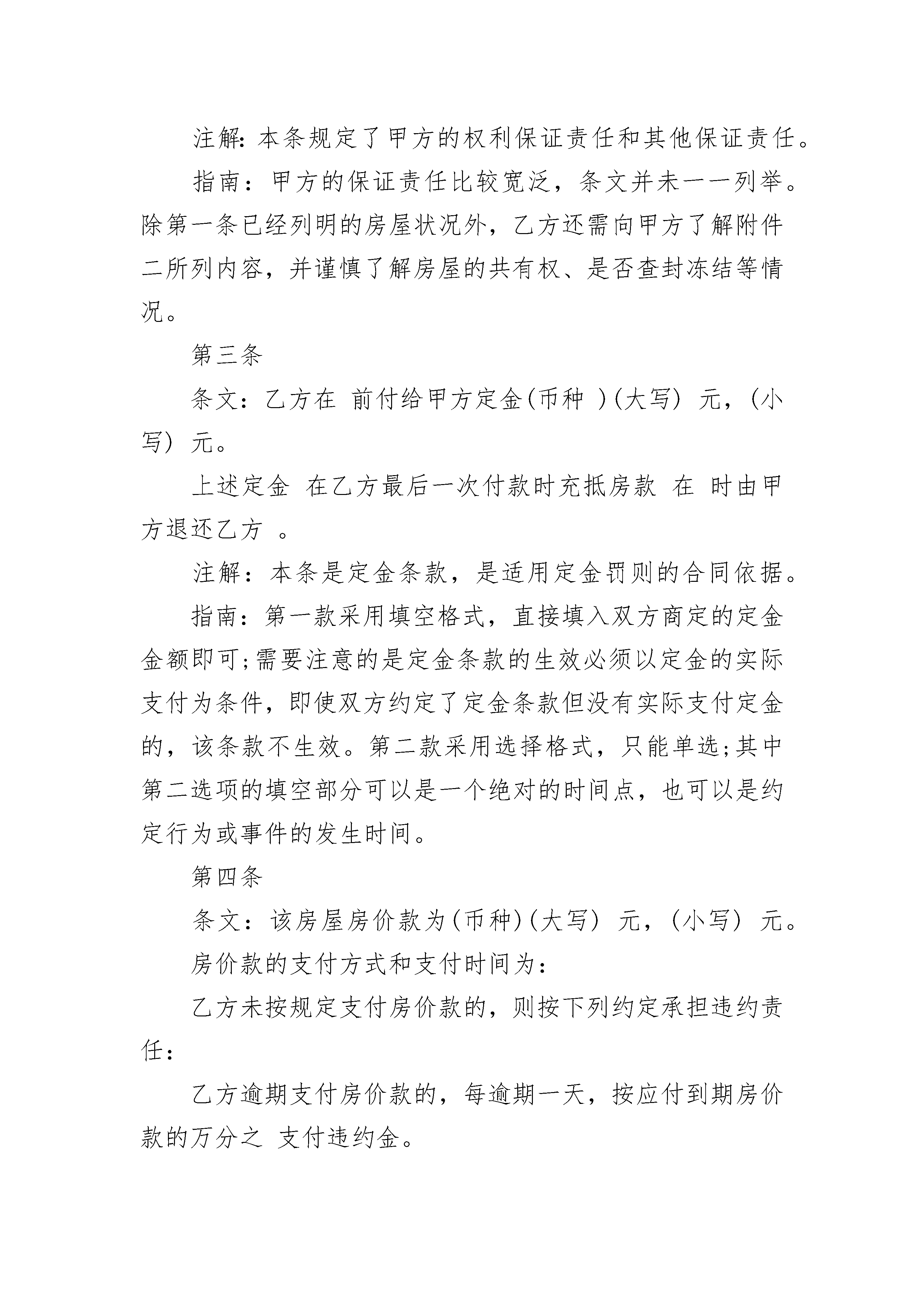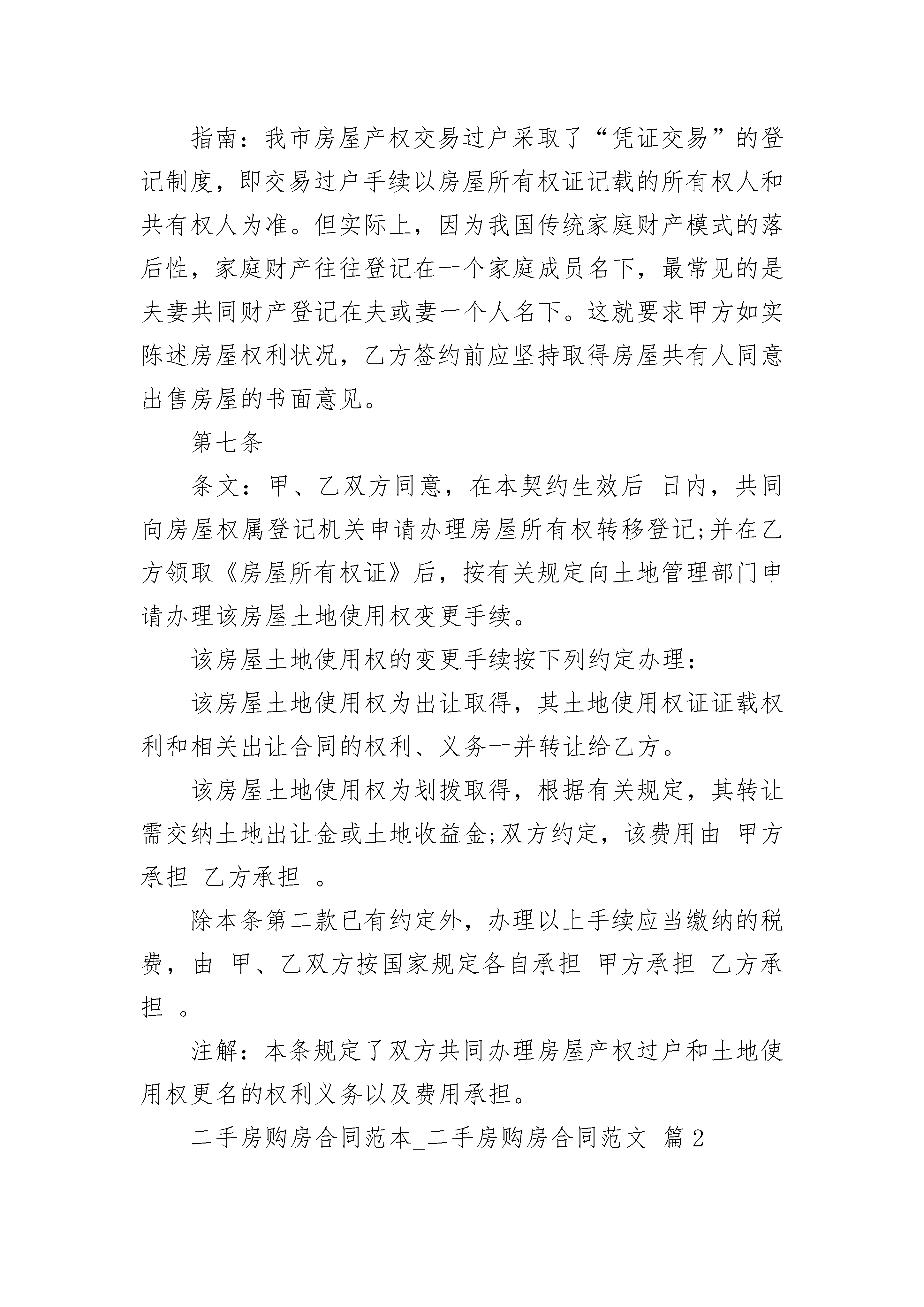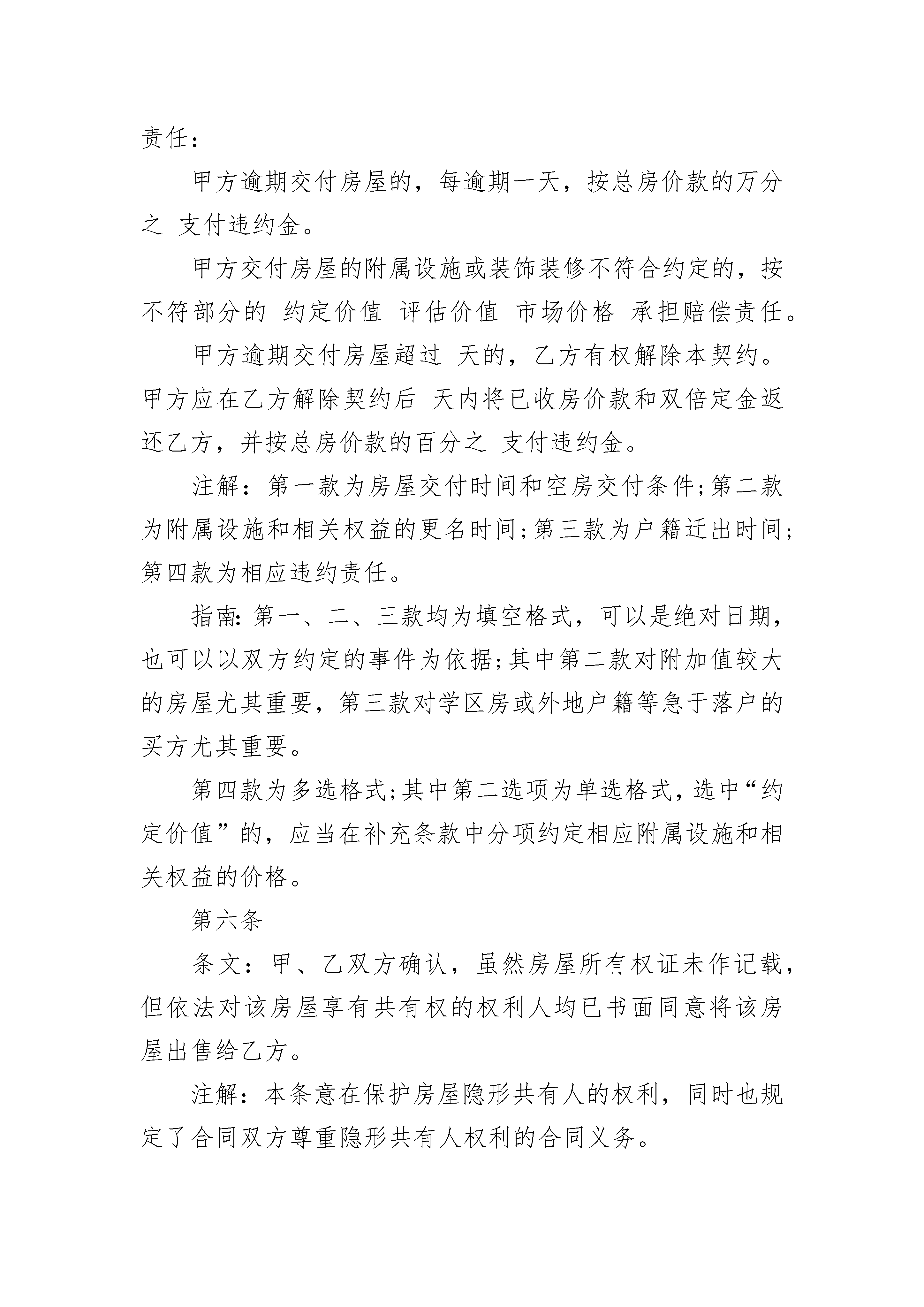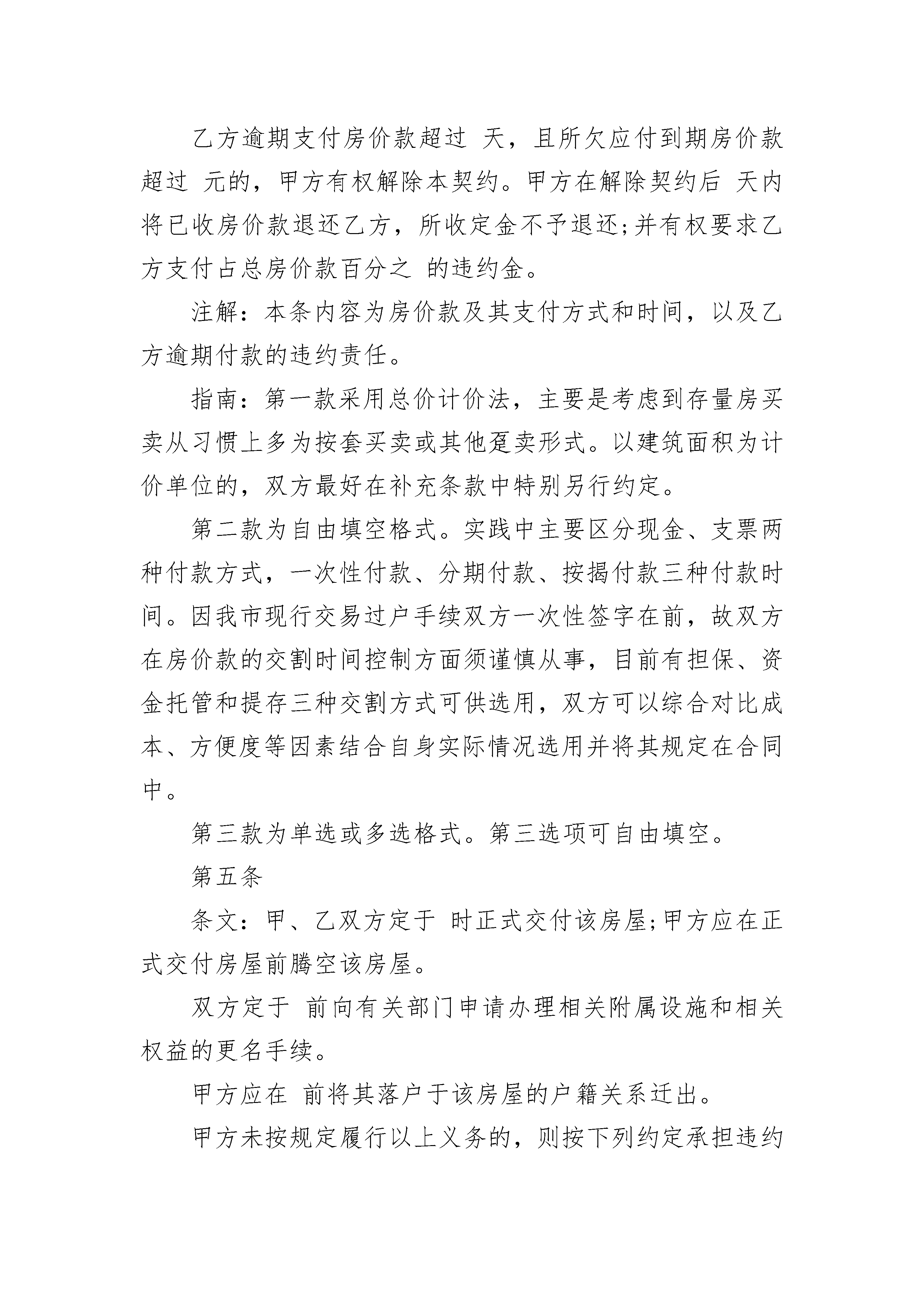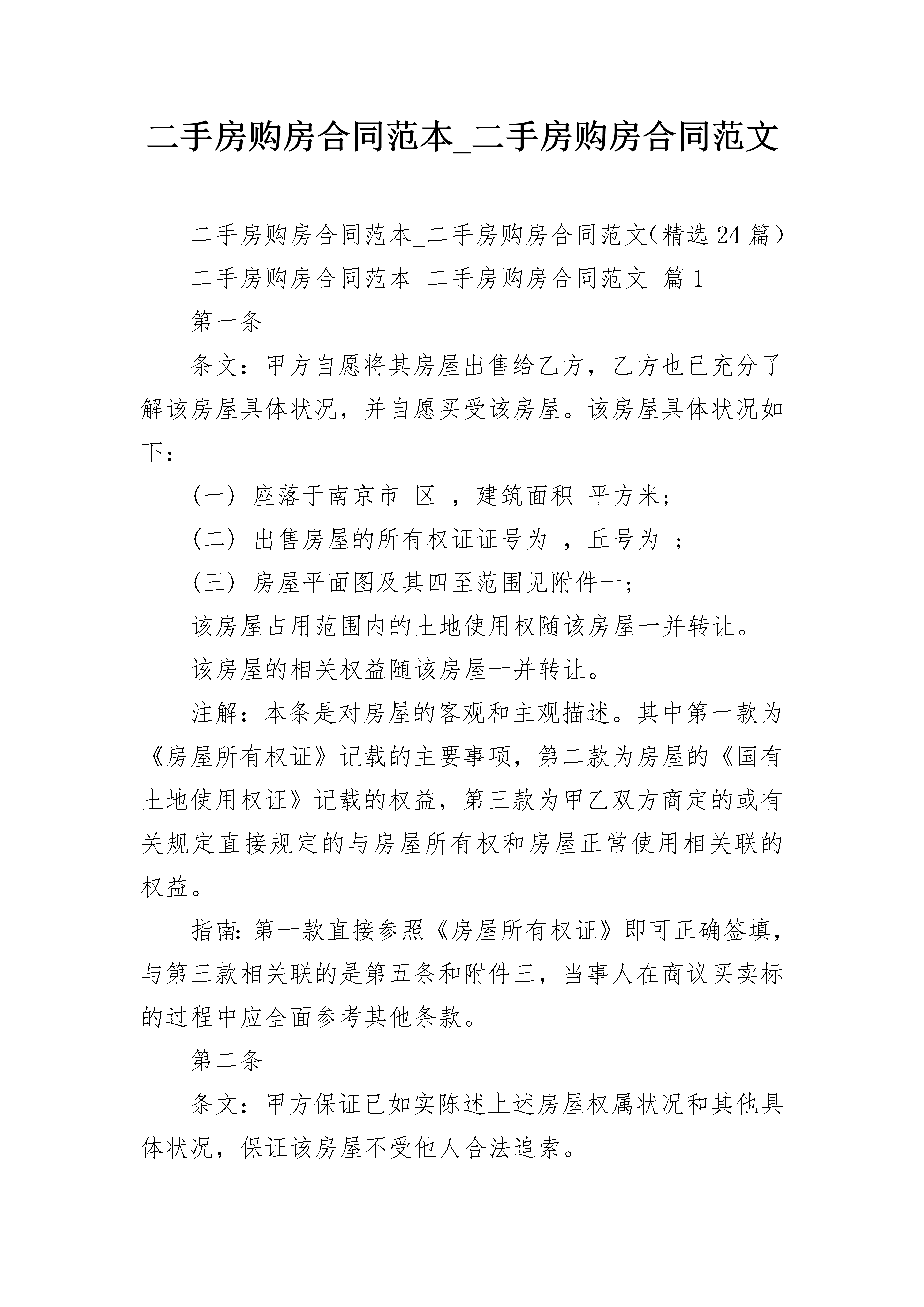 二手房购房合同范本_二手房购房合同范文二手房购房合同范本_二手房购房合同范文(精选24篇)二手房购房合同范本_二手房购房合同范文篇1第一条条文:甲方自愿将其房屋出售给乙方,乙方也已充分了解该房屋具体状况,并自愿买受该房屋。该房屋具体状况如下:(一)座落于南京市区,建筑面积平方米;(二)出售房屋的所有权证证号为,丘号为;(三)房屋平面图及其四至范围见附件一;该房屋占用范围内的土地使用权随该房屋一并转让。该房屋的相关权益随该房屋一并转让。注解:本条是对房屋的客观和主观描述。其中第一款为《房屋所有权证》记载的主要事项,第二款为房屋的《国有土地使用权证》记载的权益,第三款为甲乙双方商定的或有关规定直接规定的与房屋所有权和房屋正常使用相关联的权益。指南:第一款直接参照《房屋所有权证》即可正确签填,与第三款相关联的是第五条和附件三,当事人在商议买卖标的过程中应全面参考其他条款。第二条条文:甲方保证已如实陈述上述房屋权属状况和其他具体状况,保证该房屋不受他人合法追索。注解:本条规定了甲方的权利保证责任和其他保证责任。指南:甲方的保证责任比较宽泛,条文并未一一列举。除第一条已经列明的房屋状况外,乙方还需向甲方了解附件二所列内容,并谨慎了解房屋的共有权、是否查封冻结等情况。第三条条文:乙方在前付给甲方定金(币种)(大写)元,(小写)元。上述定金在乙方最后一次付款时充抵房款在时由甲方退还乙方。注解:本条是定金条款,是适用定金罚则的合同依据。指南:第一款采用填空格式,直接填入双方商定的定金金额即可;需要注意的是定金条款的生效必须以定金的实际支付为条件,即使双方约定了定金条款但没有实际支付定金的,该条款不生效。第二款采用选择格式,只能单选;其中第二选项的填空部分可以是一个绝对的时间点,也可以是约定行为或事件的发生时间。第四条条文:该房屋房价款为(币种)(大写)元,(小写)元。房价款的支付方式和支付时间为:乙方未按规定支付房价款的,则按下列约定承担违约责任:乙方逾期支付房价款的,每逾期一天,按应付到期房价款的万分之支付违约金。乙方逾期支付房价款超过天,且所欠应付到期房价款超过元的,甲方有权解除本契约。甲方在解除契约后天内将已收房价款退还乙方,所收定金不予退还;并有权要求乙方支付占总房价款百分之的违约金。注解:本条内容为房价款及其支付方式和时间,以及乙方逾期付款的违约责任。指南:第一款采用总价计价法,主要是考虑到存量房买卖从习惯上多为按套买卖或其他趸卖形式。以建筑面积为计价单位的,双方最好在补充条款中特别另行约定。第二款为自由填空格式。实践中主要区分现金、支票两种付款方式,一次性付款、分期付款、按揭付款三种付款时间。因我市现行交易过户手续双方一次性签字在前,故双方在房价款的交割时间控制方面须谨慎从事,目前有担保、资金托管和提存三种交割方式可供选用,双方可以综合对比成本、方便度等因素结合自身实际情况选用并将其规定在合同中。第三款为单选或多选格式。第三选项可自由填空。第五条条文:甲、乙双方定于时正式交付该房屋;甲方应在正式交付房屋前腾空该房屋。双方定于前向有关部门申请办理相关附属设施和相关权益的更名手续。甲方应在前将其落户于该房屋的户籍关系迁出。甲方未按规定履行以上义务的,则按下列约定承担违约责任:甲方逾期交付房屋的,每逾期一天,按总房价款的万分之支付违约金。甲方交付房屋的附属设施或装饰装修不符合约定的,按不符部分的约定价值评估价值市场价格承担赔偿责任。甲方逾期交付房屋超过天的,乙方有权解除本契约。甲方应在乙方解除契约后天内将已收房价款和双倍定金返还乙方,并按总房价款的百分之支付违约金。注解:第一款为房屋交付时间和空房交付条件;第二款为附属设施和相关权益的更名时间;第三款为户籍迁出时间;第四款为相应违约责任。指南:第一、二、三款均为填空格式,可以是绝对日期,也可以以双方约定的事件为依据;其中第二款对附加值较大的房屋尤其重要,第三款对学区房或外地户籍等急于落户的买方尤其重要。第四款为多选格式;其中第二选项为单选格式,选中“约定价值”的,应当在补充条款中分项约定相应附属设施和相关权益的价格。第六条条文:甲、乙双方确认,虽然房屋所有权证未作记载,但依法对该房屋享有共有权的权利人均已书面同意将该房屋出售给乙方。注解:本条意在保护房屋隐形共有人的权利,同时也规定了合同双方尊重隐形共有人权利的合同义务。指南:我市房屋产权交易过户采取了“凭证交易”的登记制度,即交易过户手续以房屋所有权证记载的所有权人和共有权人为准。但实际上,因为我国传统家庭财产模式的落后性,家庭财产往往登记在一个家庭成员名下,最常见的是夫妻共同财产登记在夫或妻一个人名下。这就要求甲方如实陈述房屋权利状况,乙方签约前应坚持取得房屋共有人同意出售房屋的书面意见。第七条条文:甲、乙双方同意,在本契约生效后
