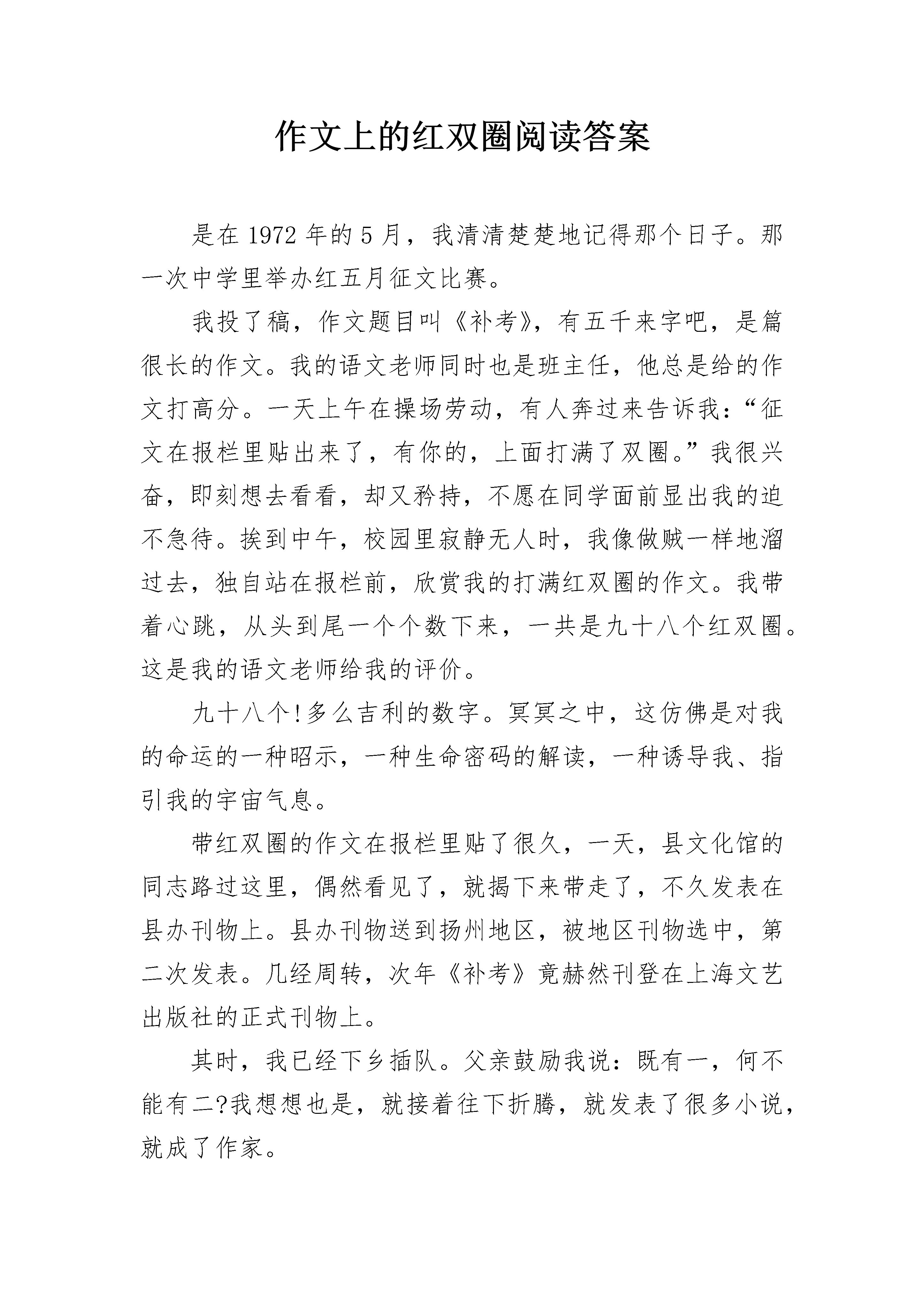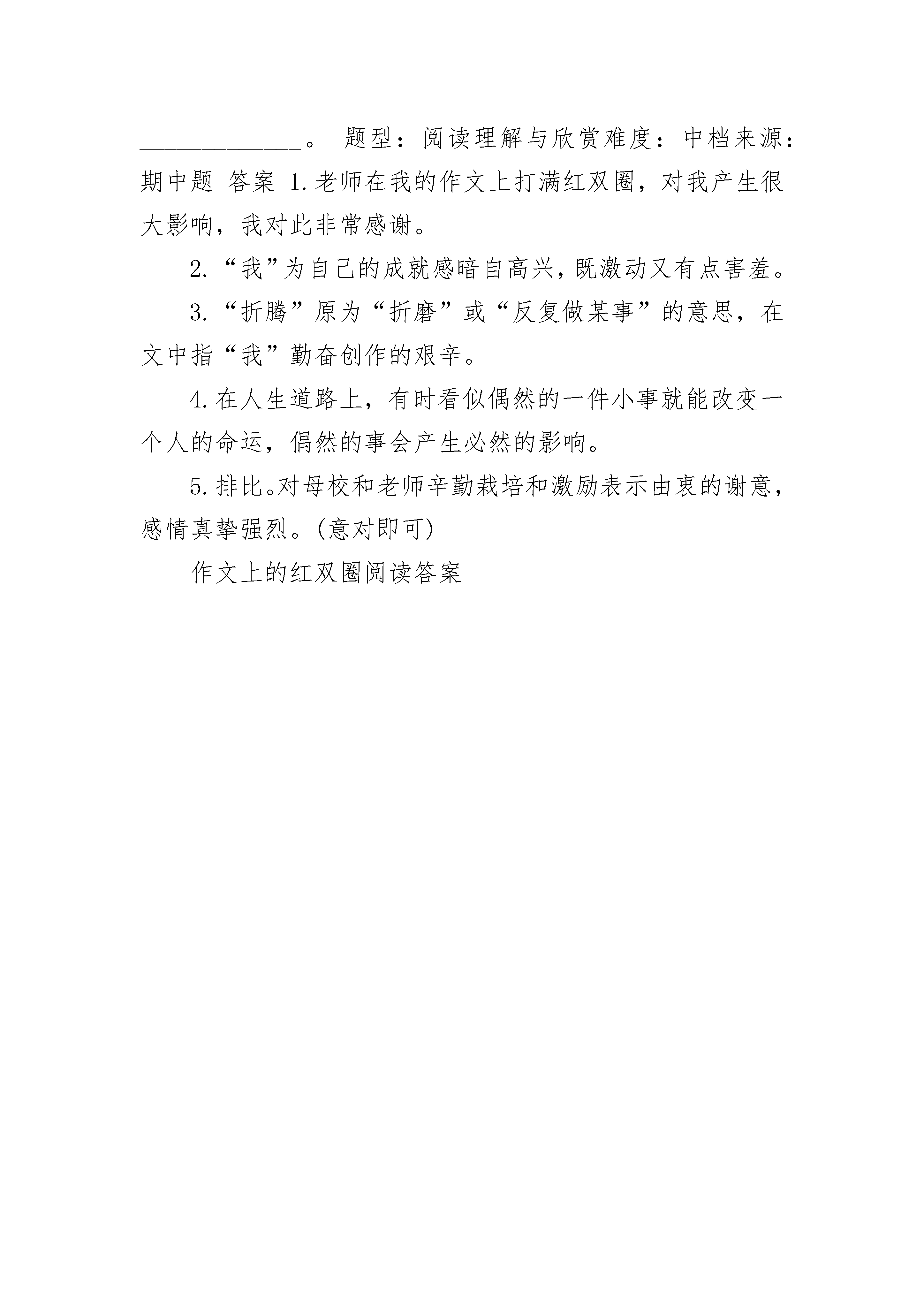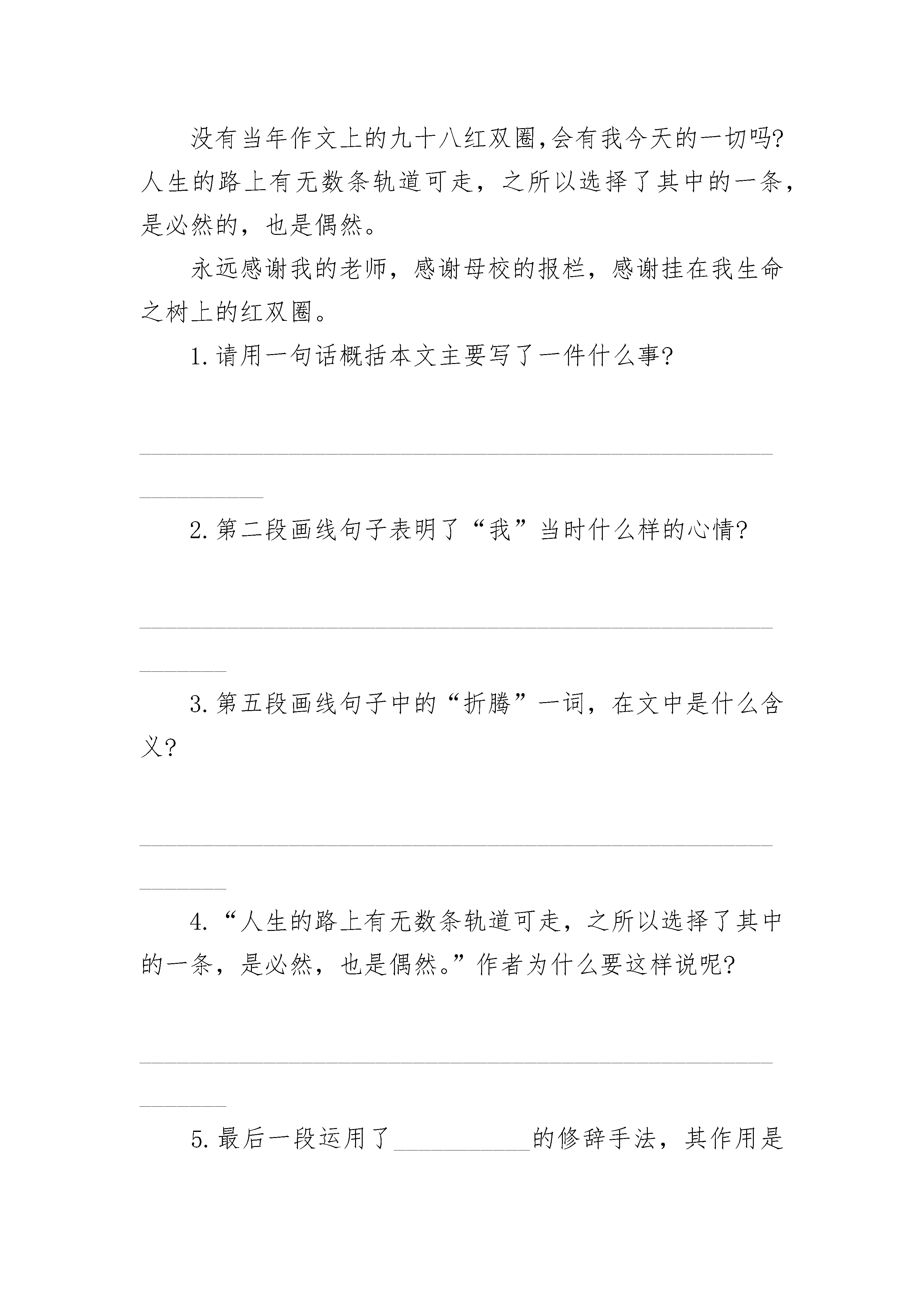 作文上的红双圈阅读答案是在1972年的5月,我清清楚楚地记得那个日子。那一次中学里举办红五月征文比赛。我投了稿,作文题目叫《补考》,有五千来字吧,是篇很长的作文。我的语文老师同时也是班主任,他总是给的作文打高分。一天上午在操场劳动,有人奔过来告诉我:“征文在报栏里贴出来了,有你的,上面打满了双圈。”我很兴奋,即刻想去看看,却又矜持,不愿在同学面前显出我的迫不急待。挨到中午,校园里寂静无人时,我像做贼一样地溜过去,独自站在报栏前,欣赏我的打满红双圈的作文。我带着心跳,从头到尾一个个数下来,一共是九十八个红双圈。这是我的语文老师给我的评价。九十八个!多么吉利的数字。冥冥之中,这仿佛是对我的命运的一种昭示,一种生命密码的解读,一种诱导我、指引我的宇宙气息。带红双圈的作文在报栏里贴了很久,一天,县文化馆的同志路过这里,偶然看见了,就揭下来带走了,不久发表在县办刊物上。县办刊物送到扬州地区,被地区刊物选中,第二次发表。几经周转,次年《补考》竟赫然刊登在上海文艺出版社的正式刊物上。其时,我已经下乡插队。父亲鼓励我说:既有一,何不能有二?我想想也是,就接着往下折腾,就发表了很多小说,就成了作家。没有当年作文上的九十八红双圈,会有我今天的一切吗?人生的路上有无数条轨道可走,之所以选择了其中的一条,是必然的,也是偶然。永远感谢我的老师,感谢母校的报栏,感谢挂在我生命之树上的红双圈。1.请用一句话概括本文主要写了一件什么事?_____________________________________________________________2.第二段画线句子表明了“我”当时什么样的心情?__________________________________________________________3.第五段画线句子中的“折腾”一词,在文中是什么含义?__________________________________________________________4.“人生的路上有无数条轨道可走,之所以选择了其中的一条,是必然,也是偶然。”作者为什么要这样说呢?__________________________________________________________5.最后一段运用了___________的修辞手法,其作用是_____________。题型:阅读理解与欣赏难度:中档来源:期中题答案1.老师在我的作文上打满红双圈,对我产生很大影响,我对此非常感谢。2.“我”为自己的成就感暗自高兴,既激动又有点害羞。3.“折腾”原为“折磨”或“反复做某事”的意思,在文中指“我”勤奋创作的艰辛。4.在人生道路上,有时看似偶然的一件小事就能改变一个人的命运,偶然的事会产生必然的影响。5.排比。对母校和老师辛勤栽培和激励表示由衷的谢意,感情真挚强烈。(意对即可)作文上的红双圈阅读答案