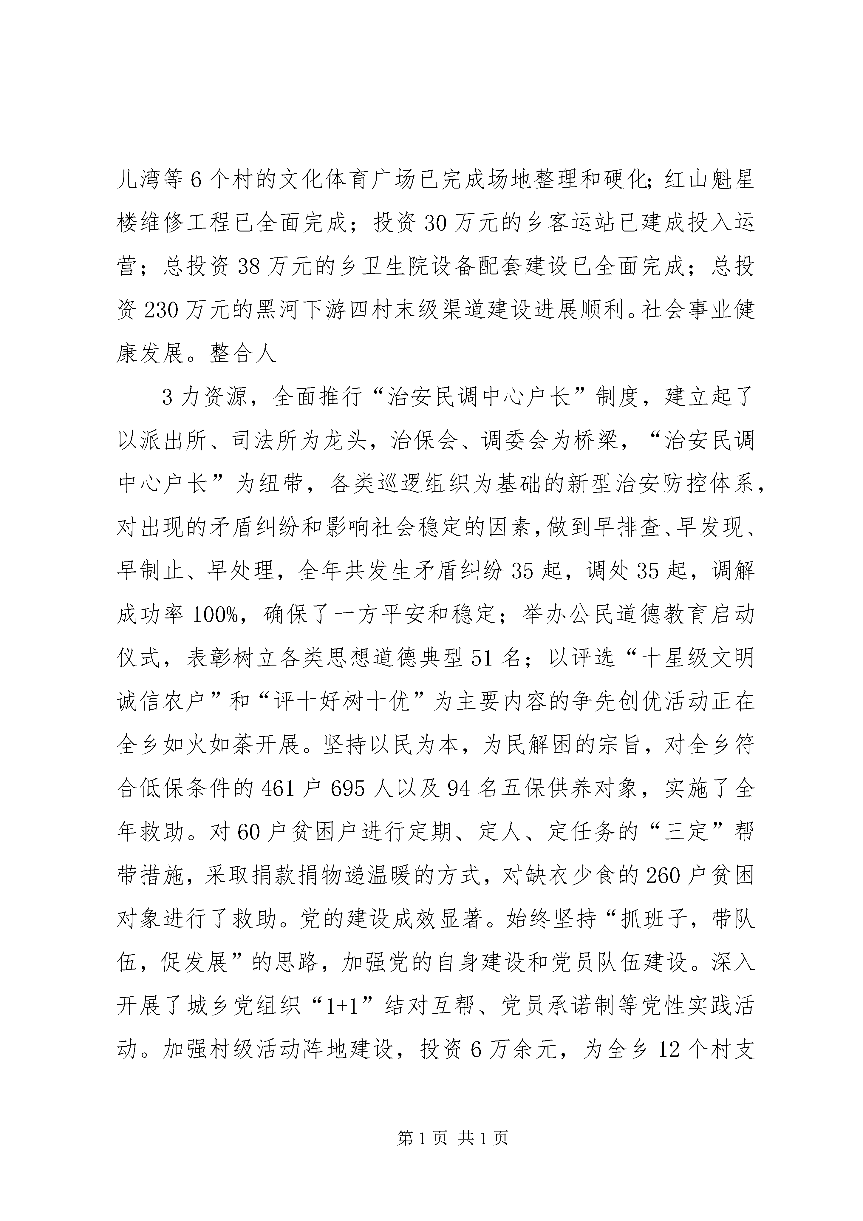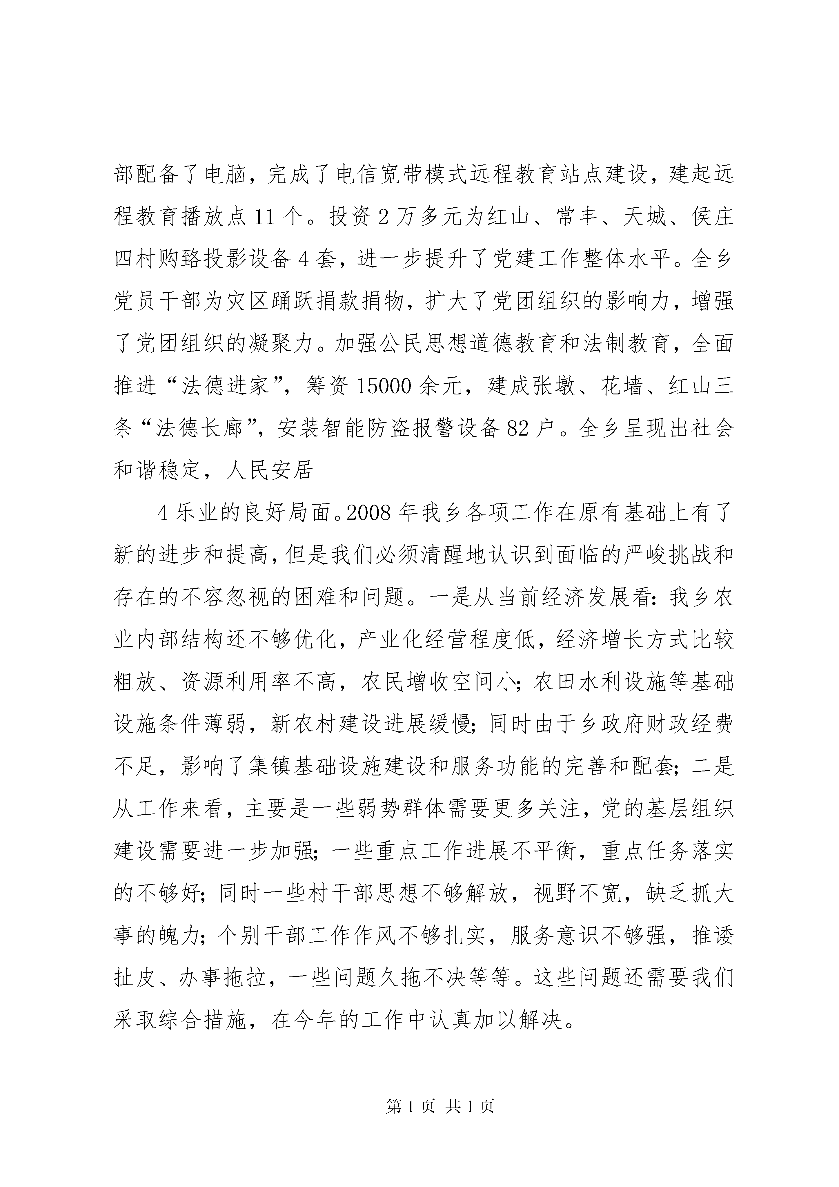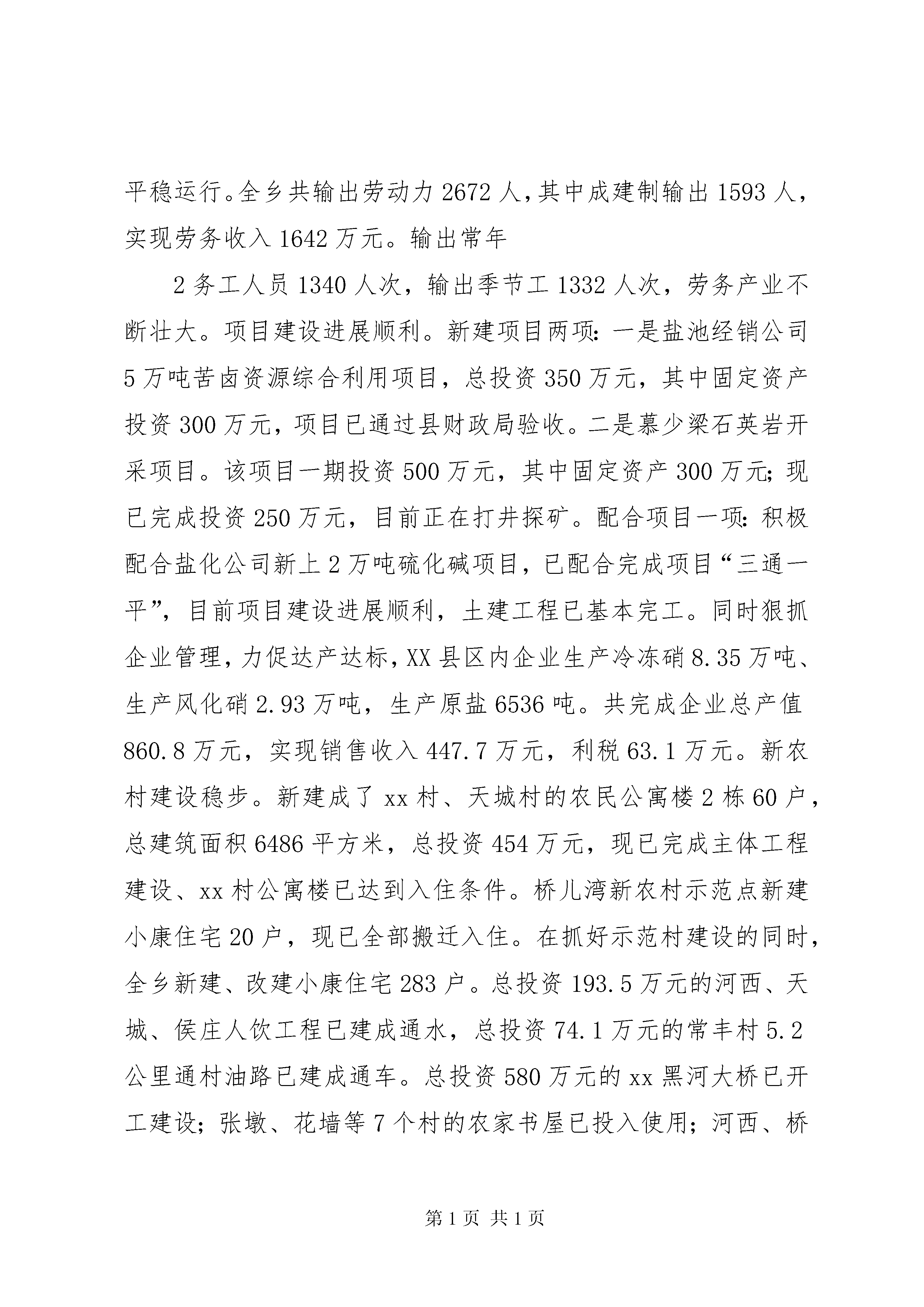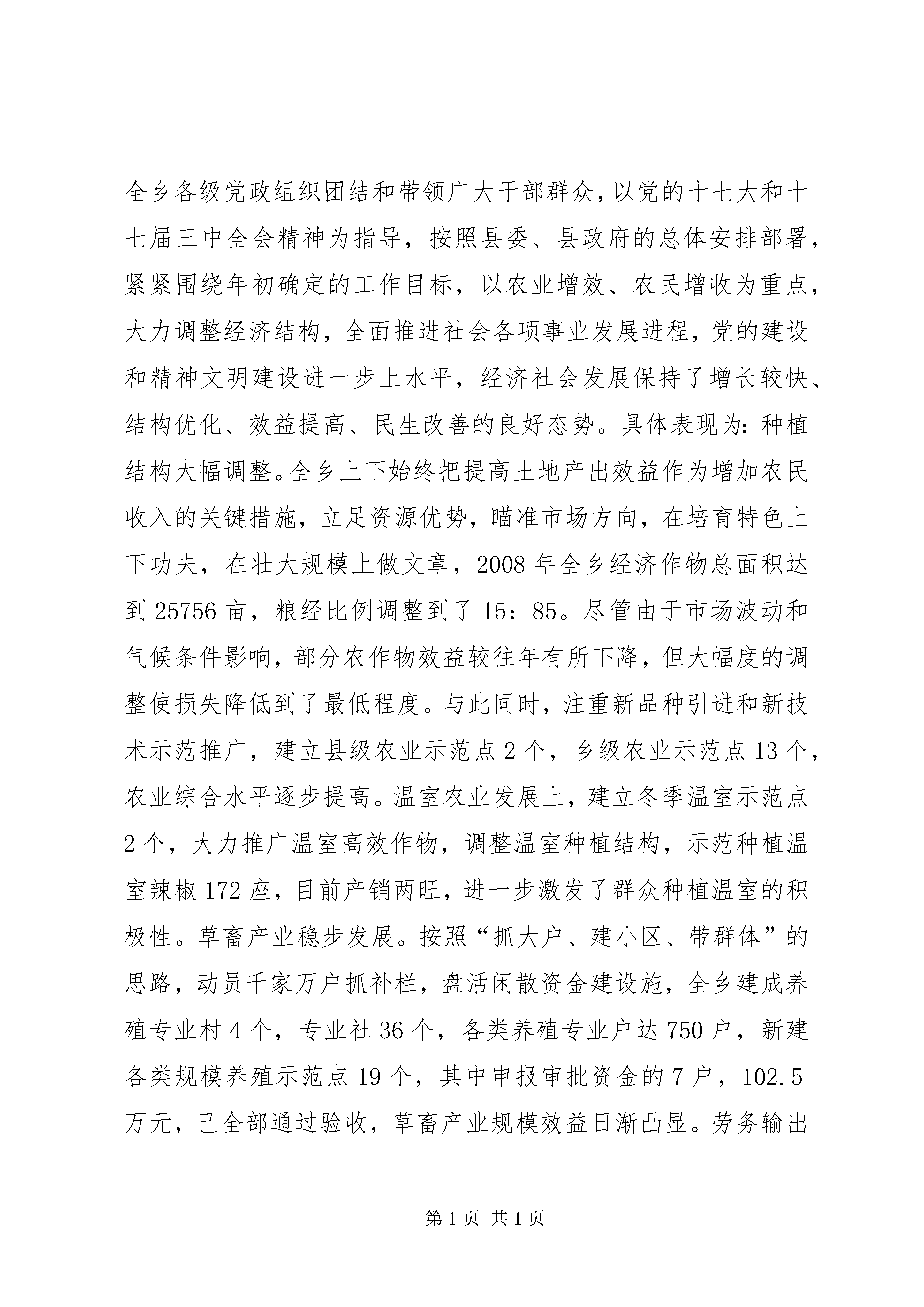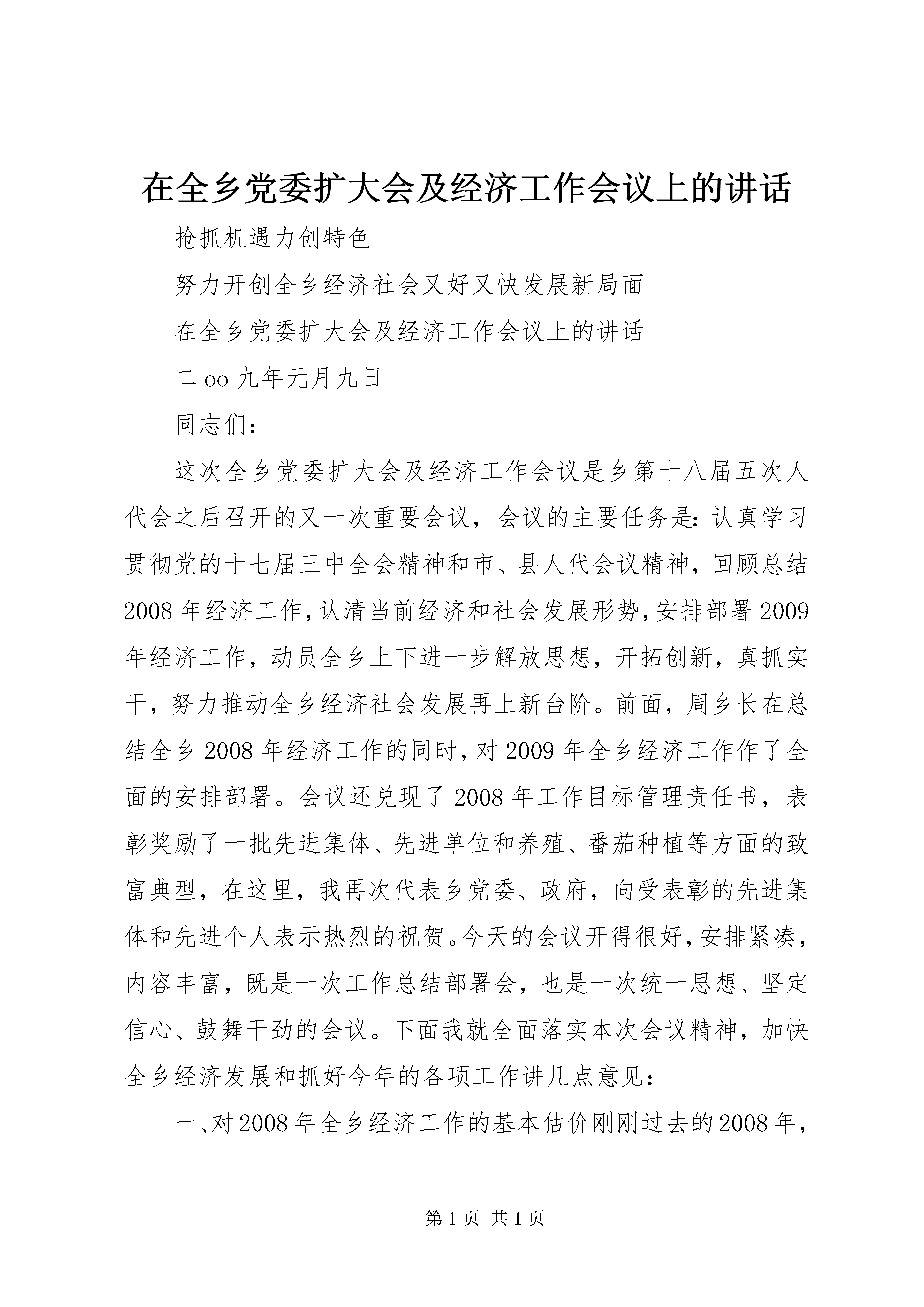 在全乡党委扩大会及经济工作会议上的讲话抢抓机遇力创特色努力开创全乡经济社会又好又快发展新局面在全乡党委扩大会及经济工作会议上的讲话二oo九年元月九日同志们:这次全乡党委扩大会及经济工作会议是乡第十八届五次人代会之后召开的又一次重要会议,会议的主要任务是:认真学习贯彻党的十七届三中全会精神和市、县人代会议精神,回顾总结2008年经济工作,认清当前经济和社会发展形势,安排部署2009年经济工作,动员全乡上下进一步解放思想,开拓创新,真抓实干,努力推动全乡经济社会发展再上新台阶。前面,周乡长在总结全乡2008年经济工作的同时,对2009年全乡经济工作作了全面的安排部署。会议还兑现了2008年工作目标管理责任书,表彰奖励了一批先进集体、先进单位和养殖、番茄种植等方面的致富典型,在这里,我再次代表乡党委、政府,向受表彰的先进集体和先进个人表示热烈的祝贺。今天的会议开得很好,安排紧凑,内容丰富,既是一次工作总结部署会,也是一次统一思想、坚定信心、鼓舞干劲的会议。下面我就全面落实本次会议精神,加快全乡经济发展和抓好今年的各项工作讲几点意见:一、对2008年全乡经济工作的基本估价刚刚过去的2008年,全乡各级党政组织团结和带领广大干部群众,以党的十七大和十七届三中全会精神为指导,按照县委、县政府的总体安排部署,紧紧围绕年初确定的工作目标,以农业增效、农民增收为重点,大力调整经济结构,全面推进社会各项事业发展进程,党的建设和精神文明建设进一步上水平,经济社会发展保持了增长较快、结构优化、效益提高、民生改善的良好态势。具体表现为:种植结构大幅调整。全乡上下始终把提高土地产出效益作为增加农民收入的关键措施,立足资源优势,瞄准市场方向,在培育特色上下功夫,在壮大规模上做文章,2008年全乡经济作物总面积达到25756亩,粮经比例调整到了15:85。尽管由于市场波动和气候条件影响,部分农作物效益较往年有所下降,但大幅度的调整使损失降低到了最低程度。与此同时,注重新品种引进和新技术示范推广,建立县级农业示范点2个,乡级农业示范点13个,农业综合水平逐步提高。温室农业发展上,建立冬季温室示范点2个,大力推广温室高效作物,调整温室种植结构,示范种植温室辣椒172座,目前产销两旺,进一步激发了群众种植温室的积极性。草畜产业稳步发展。按照“抓大户、建小区、带群体”的思路,动员千家万户抓补栏,盘活闲散资金建设施,全乡建成养殖专业村4个,专业社36个,各类养殖专业户达750户,新建各类规模养殖示范点19个,其中申报审批资金的7户,102.5万元,已全部通过验收,草畜产业规模效益日渐凸显。劳务输出平稳运行。全乡共输出劳动力2672人,其中成建制输出1593人,实现劳务收入1642万元。输出常年2务工人员1340人次,输出季节工1332人次,劳务产业不断壮大。项目建设进展顺利。新建项目两项:一是盐池经销公司5万吨苦卤资源综合利用项目,总投资350万元,其中固定资产投资300万元,项目已通过县财政局验收。二是慕少梁石英岩开采项目。该项目一期投资500万元,其中固定资产300万元;现已完成投资250万元,目前正在打井探矿。配合项目一项:积极配合盐化公司新上2万吨硫化碱项目,已配合完成项目“三通一平”,目前项目建设进展顺利,土建工程已基本完工。同时狠抓企业管理,力促达产达标,XX县区内企业生产冷冻硝8.35万吨、生产风化硝2.93万吨,生产原盐6536吨。共完成企业总产值860.8万元,实现销售收入447.7万元,利税63.1万元。新农村建设稳步。新建成了xx村、天城村的农民公寓楼2栋60户,总建筑面积6486平方米,总投资454万元,现已完成主体工程建设、xx村公寓楼已达到入住条件。桥儿湾新农村示范点新建小康住宅20户,现已全部搬迁入住。在抓好示范村建设的同时,全乡新建、改建小康住宅283户。总投资193.5万元的河西、天城、侯庄人饮工程已建成通水,总投资74.1万元的常丰村5.2公里通村油路已建成通车。总投资580万元的xx黑河大桥已开工建设;张墩、花墙等7个村的农家书屋已投入使用;河西、桥儿湾等6个村的文化体育广场已完成场地整理和硬化;红山魁星楼维修工程已全面完成;投资30万元的乡客运站已建成投入运营;总投资38万元的乡卫生院设备配套建设已全面完成;总投资230万元的黑河下游四村末级渠道建设进展顺利。社会事业健康发展。整合人3力资源,全面推行“治安民调中心户长”制度,建立起了以派出所、司法所为龙头,治保会、调委会为桥梁,“治安民调中心户长”为纽带,各类巡逻组织为基础的新型治安防控体系,对出现的矛盾纠纷和影响社会稳定的因素,做到早排查、早发现、早制止、早处理,全年共发生矛盾纠纷35起,调处35起,调解成功率100%,确保了一方平安和稳定;举办公民