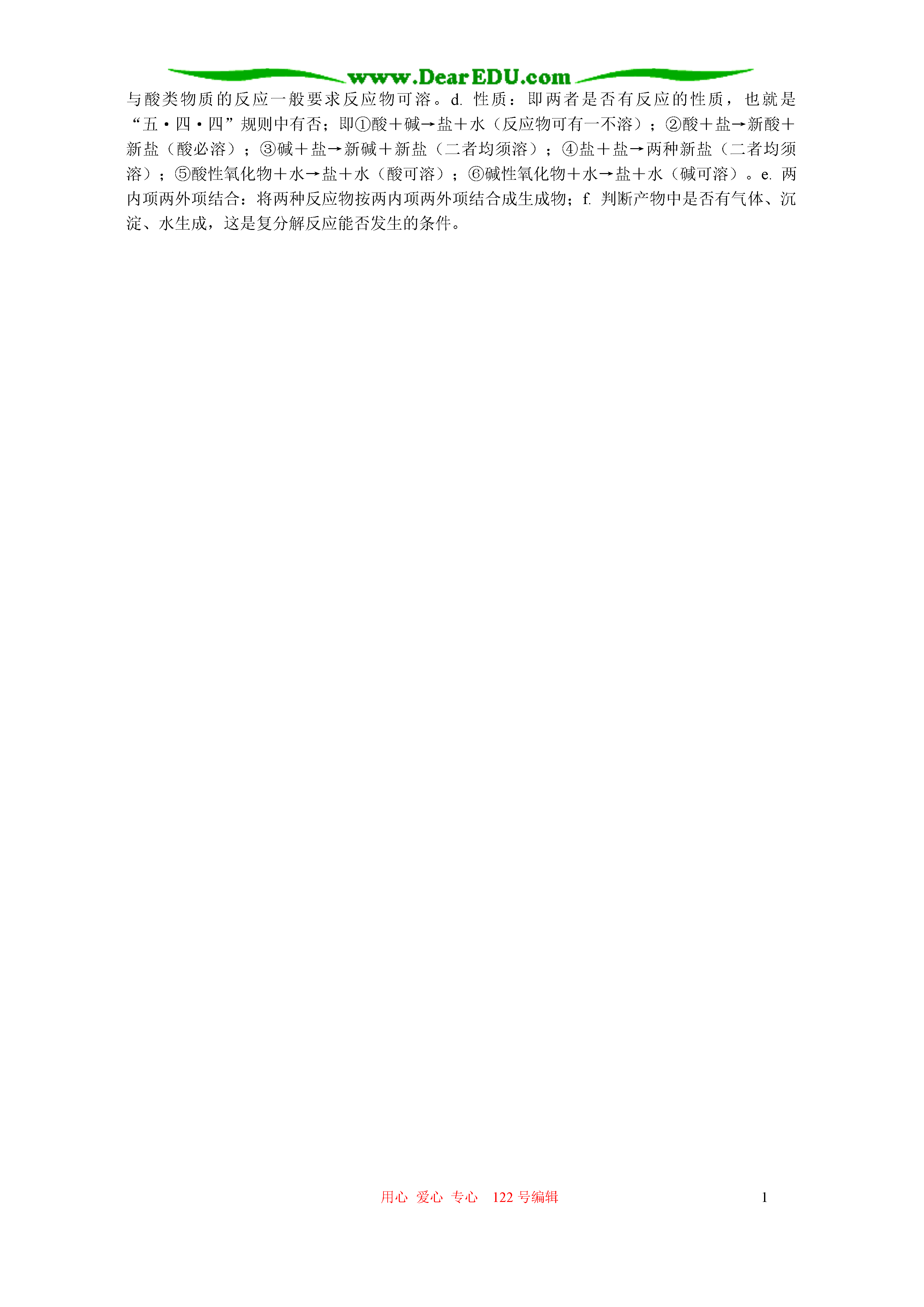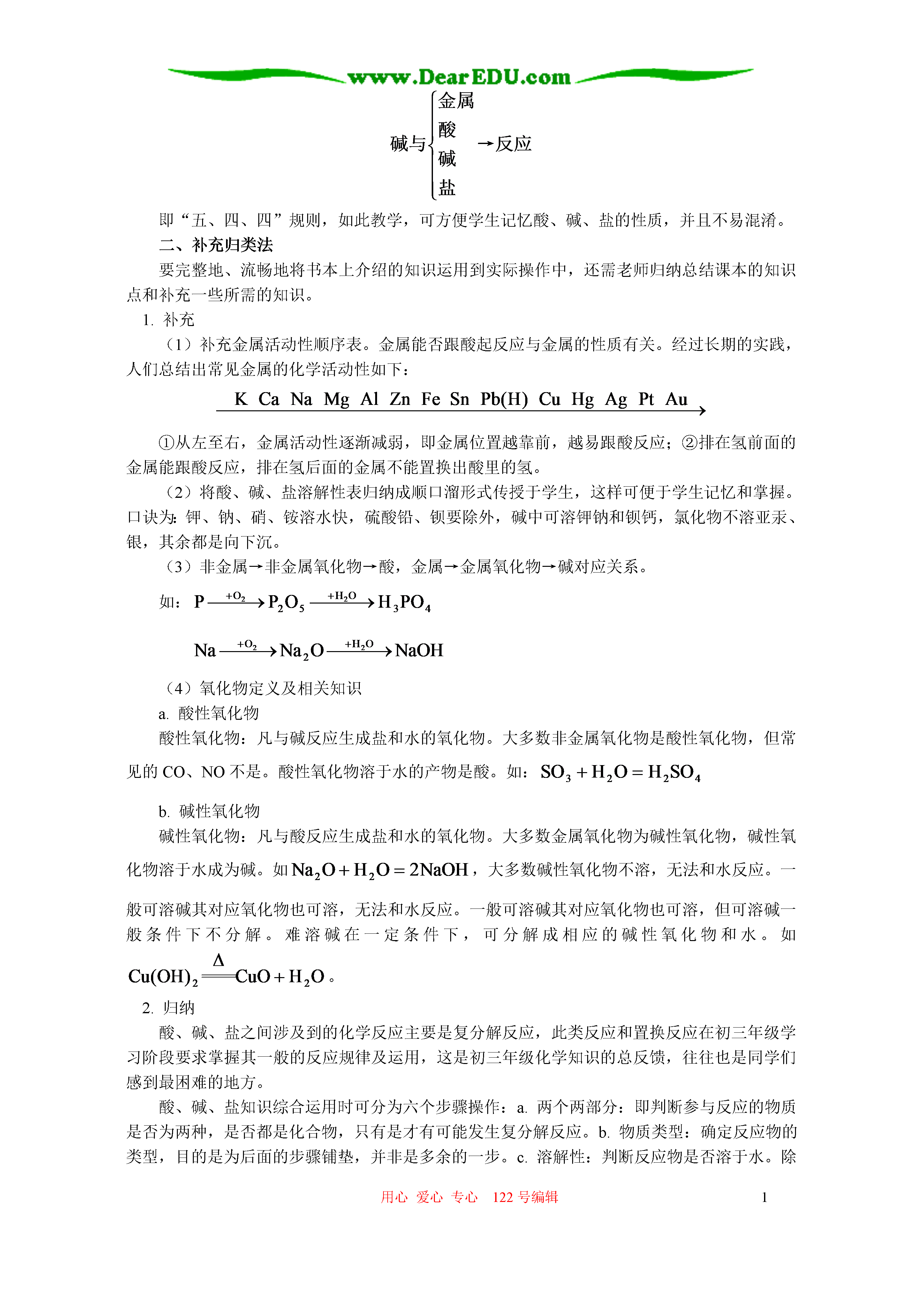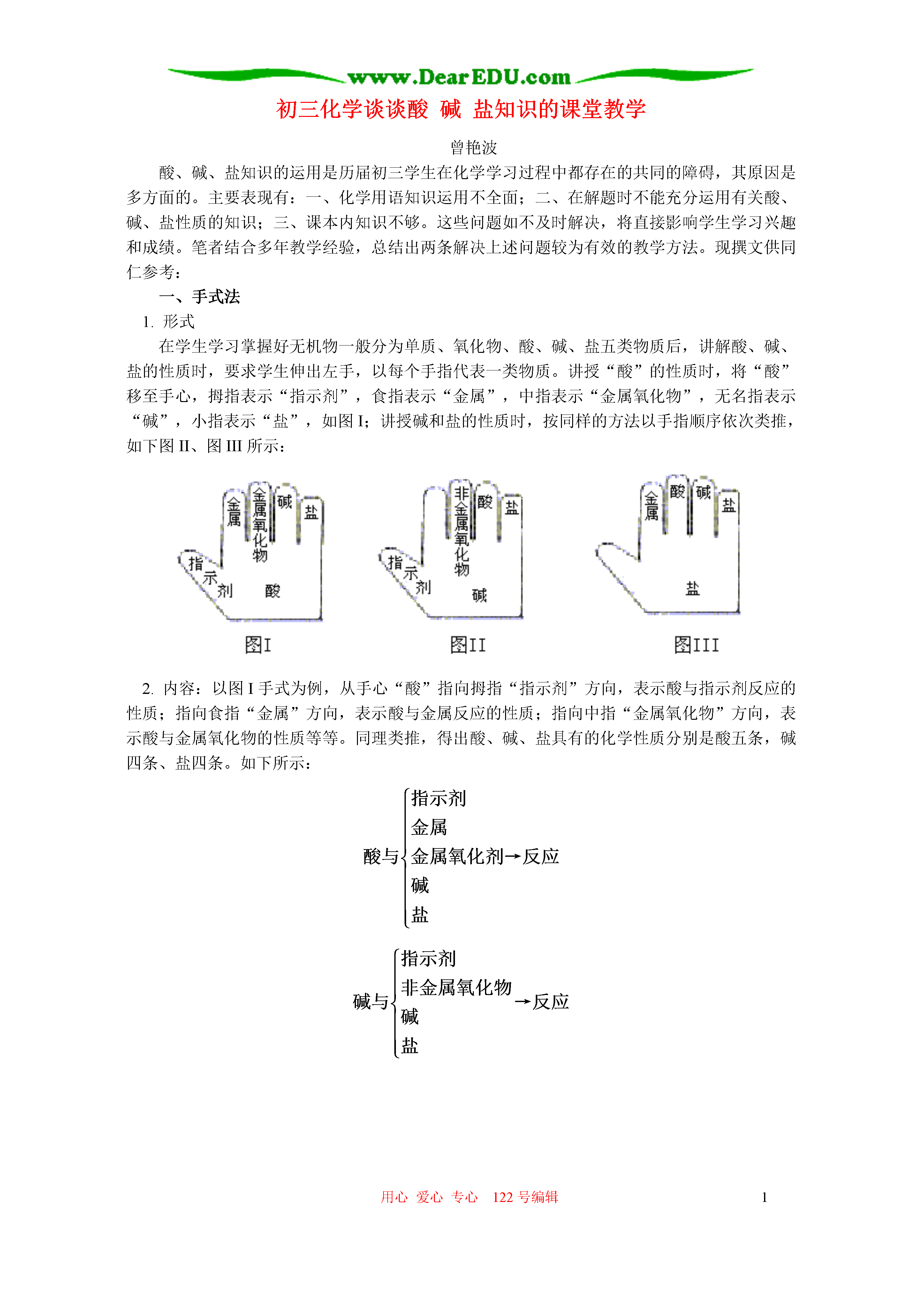 用心爱心专心122号编辑1初三化学谈谈酸碱盐知识的课堂教学曾艳波酸、碱、盐知识的运用是历届初三学生在化学学习过程中都存在的共同的障碍,其原因是多方面的。主要表现有:一、化学用语知识运用不全面;二、在解题时不能充分运用有关酸、碱、盐性质的知识;三、课本内知识不够。这些问题如不及时解决,将直接影响学生学习兴趣和成绩。笔者结合多年教学经验,总结出两条解决上述问题较为有效的教学方法。现撰文供同仁参考:一、手式法1.形式在学生学习掌握好无机物一般分为单质、氧化物、酸、碱、盐五类物质后,讲解酸、碱、盐的性质时,要求学生伸出左手,以每个手指代表一类物质。讲授“酸”的性质时,将“酸”移至手心,拇指表示“指示剂”,食指表示“金属”,中指表示“金属氧化物”,无名指表示“碱”,小指表示“盐”,如图I;讲授碱和盐的性质时,按同样的方法以手指顺序依次类推,如下图II、图III所示:2.内容:以图I手式为例,从手心“酸”指向拇指“指示剂”方向,表示酸与指示剂反应的性质;指向食指“金属”方向,表示酸与金属反应的性质;指向中指“金属氧化物”方向,表示酸与金属氧化物的性质等等。同理类推,得出酸、碱、盐具有的化学性质分别是酸五条,碱四条、盐四条。如下所示:即“五、四、四”规则,如此教学,可方便学生记忆酸、碱、盐的性质,并且不易混淆。二、补充归类法要完整地、流畅地将书本上介绍的知识运用到实际操作中,还需老师归纳总结课本的知识点和补充一些所需的知识。1.补充(1)补充金属活动性顺序表。金属能否跟酸起反应与金属的性质有关。经过长期的实践,人们总结出常见金属的化学活动性如下:①从左至右,金属活动性逐渐减弱,即金属位置越靠前,越易跟酸反应;②排在氢前面的金属能跟酸反应,排在氢后面的金属不能置换出酸里的氢。(2)将酸、碱、盐溶解性表归纳成顺口溜形式传授于学生,这样可便于学生记忆和掌握。口诀为:钾、钠、硝、铵溶水快,硫酸铅、钡要除外,碱中可溶钾钠和钡钙,氯化物不溶亚汞、银,其余都是向下沉。(3)非金属→非金属氧化物→酸,金属→金属氧化物→碱对应关系。如:(4)氧化物定义及相关知识a.酸性氧化物酸性氧化物:凡与碱反应生成盐和水的氧化物。大多数非金属氧化物是酸性氧化物,但常见的CO、NO不是。酸性氧化物溶于水的产物是酸。如:b.碱性氧化物碱性氧化物:凡与酸反应生成盐和水的氧化物。大多数金属氧化物为碱性氧化物,碱性氧化物溶于水成为碱。如,大多数碱性氧化物不溶,无法和水反应。一般可溶碱其对应氧化物也可溶,无法和水反应。一般可溶碱其对应氧化物也可溶,但可溶碱一般条件下不分解。难溶碱在一定条件下,可分解成相应的碱性氧化物和水。如。2.归纳酸、碱、盐之间涉及到的化学反应主要是复分解反应,此类反应和置换反应在初三年级学习阶段要求掌握其一般的反应规律及运用,这是初三年级化学知识的总反馈,往往也是同学们感到最困难的地方。酸、碱、盐知识综合运用时可分为六个步骤操作:a.两个两部分:即判断参与反应的物质是否为两种,是否都是化合物,只有是才有可能发生复分解反应。b.物质类型:确定反应物的类型,目的是为后面的步骤铺垫,并非是多余的一步。c.溶解性:判断反应物是否溶于水。除与酸类物质的反应一般要求反应物可溶。d.性质:即两者是否有反应的性质,也就是“五·四·四”规则中有否;即①酸+碱→盐+水(反应物可有一不溶);②酸+盐→新酸+新盐(酸必溶);③碱+盐→新碱+新盐(二者均须溶);④盐+盐→两种新盐(二者均须溶);⑤酸性氧化物+水→盐+水(酸可溶);⑥碱性氧化物+水→盐+水(碱可溶)。e.两内项两外项结合:将两种反应物按两内项两外项结合成生成物;f.判断产物中是否有气体、沉淀、水生成,这是复分解反应能否发生的条件。