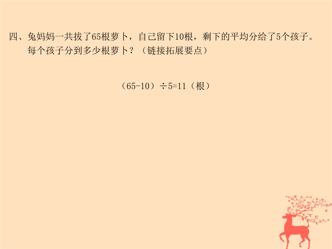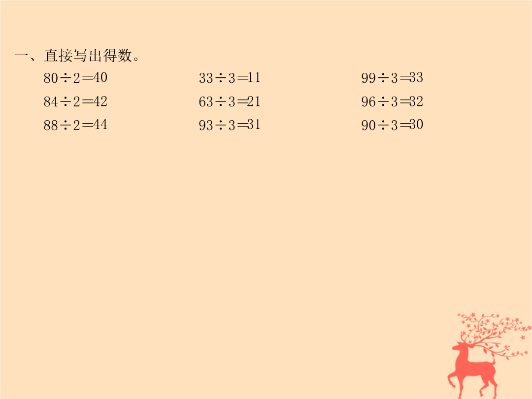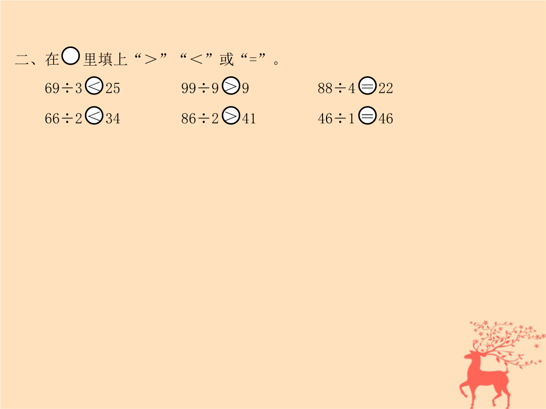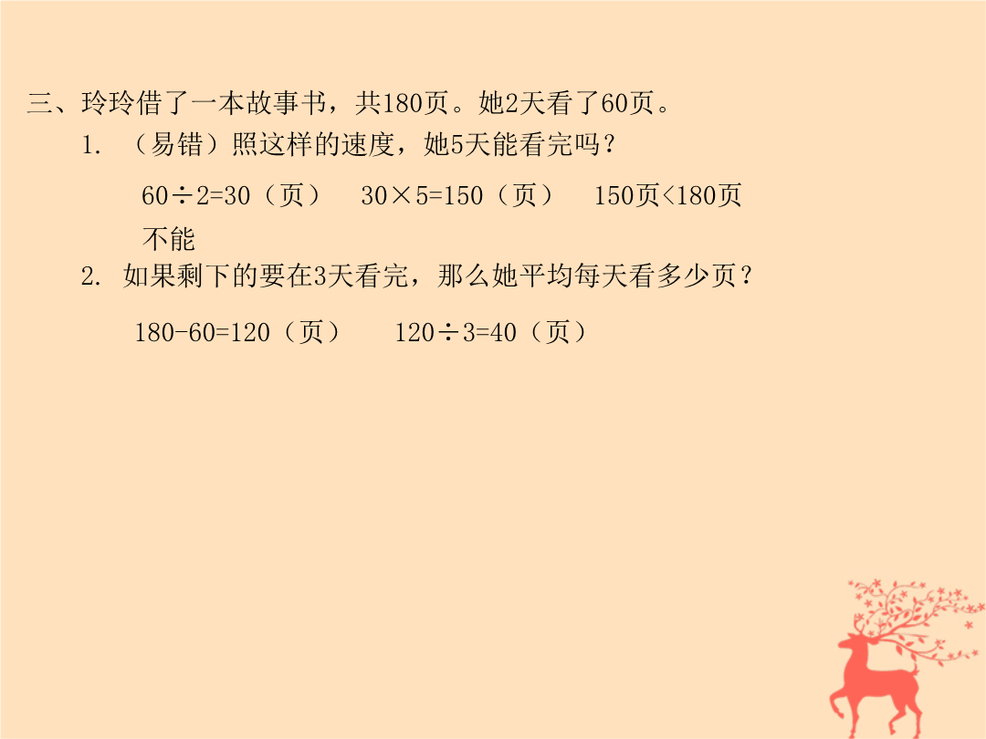 第四单元乘与除一、直接写出得数。80÷2=33÷3=99÷3=84÷2=63÷3=96÷3=88÷2=93÷3=90÷3=二、在里填上“>”“<”或“=”。69÷32599÷9988÷42266÷23486÷24146÷146三、玲玲借了一本故事书,。她2天看了60页。1.(易错)照这样的速度,她5天能看完吗?2.如果剩下的要在3天看完,那么她平均每天看多少页?四、兔妈妈一共拔了65根萝卜,自己留下10根,剩下的平均分给了5个孩子。每个孩子分到多少根萝卜?(链接拓展要点)五、天天、乐乐、欢欢、佳佳、明明的年龄分别是9岁、11岁、13岁、15岁、17岁。这5人的平均年龄是多少岁?