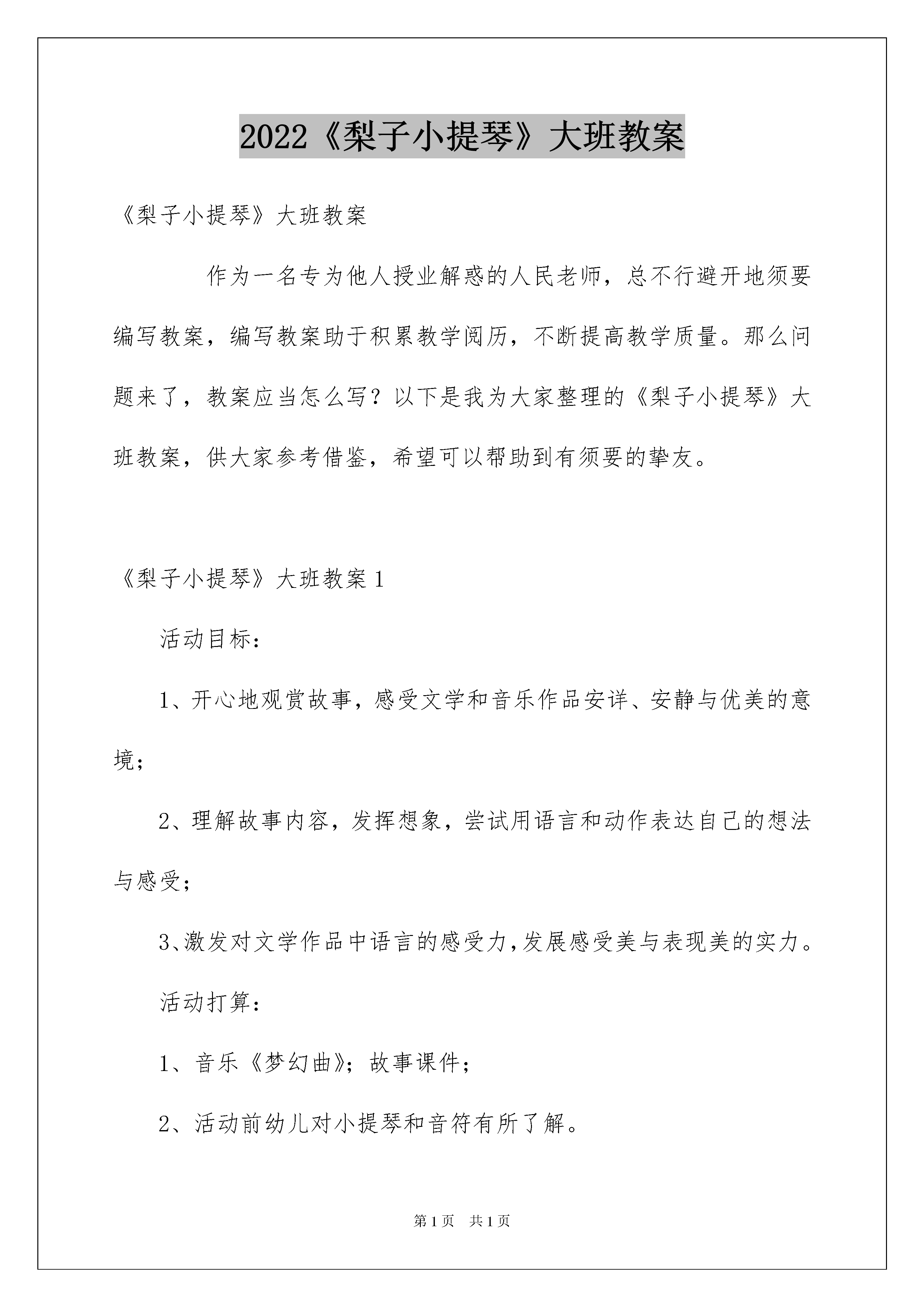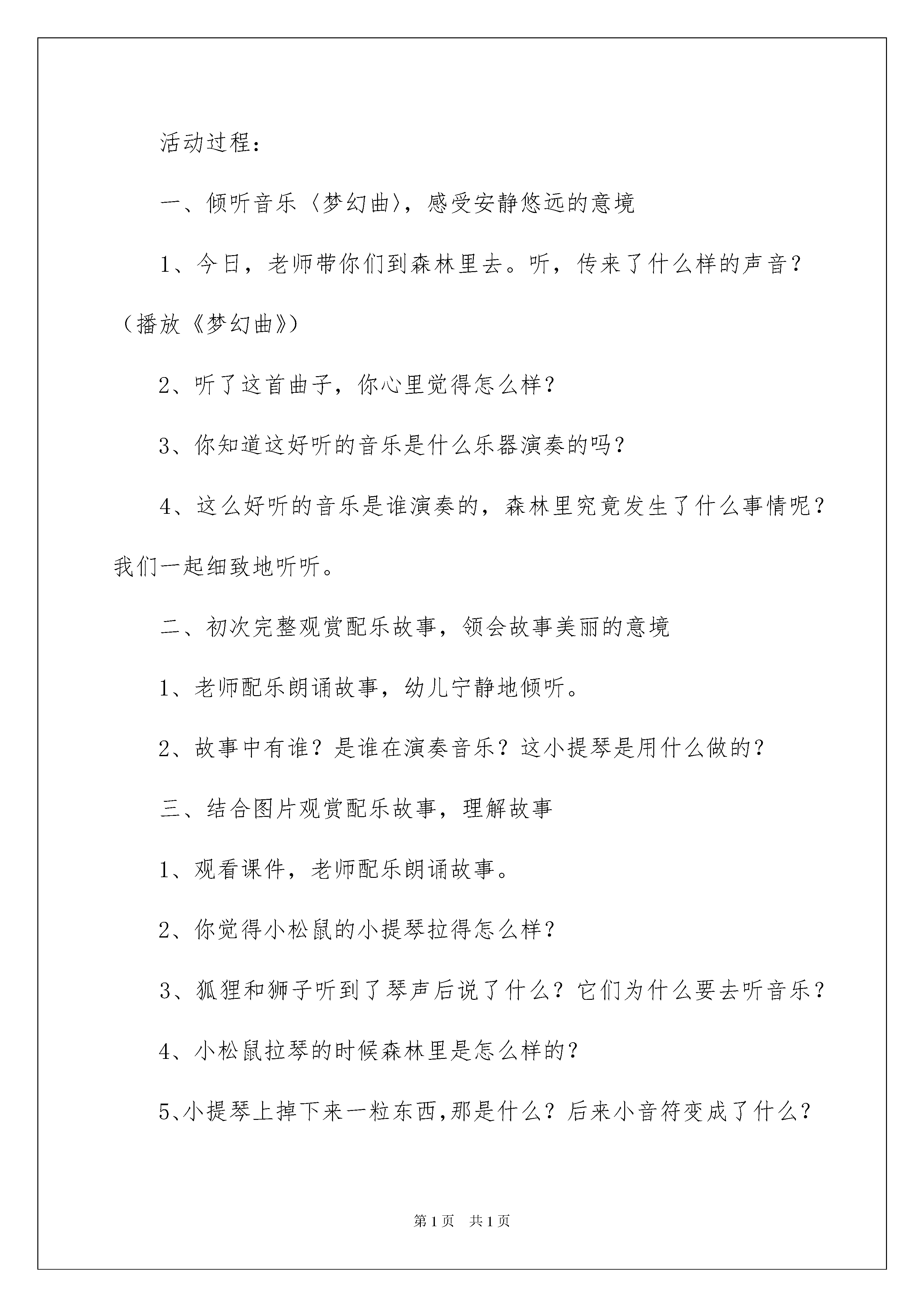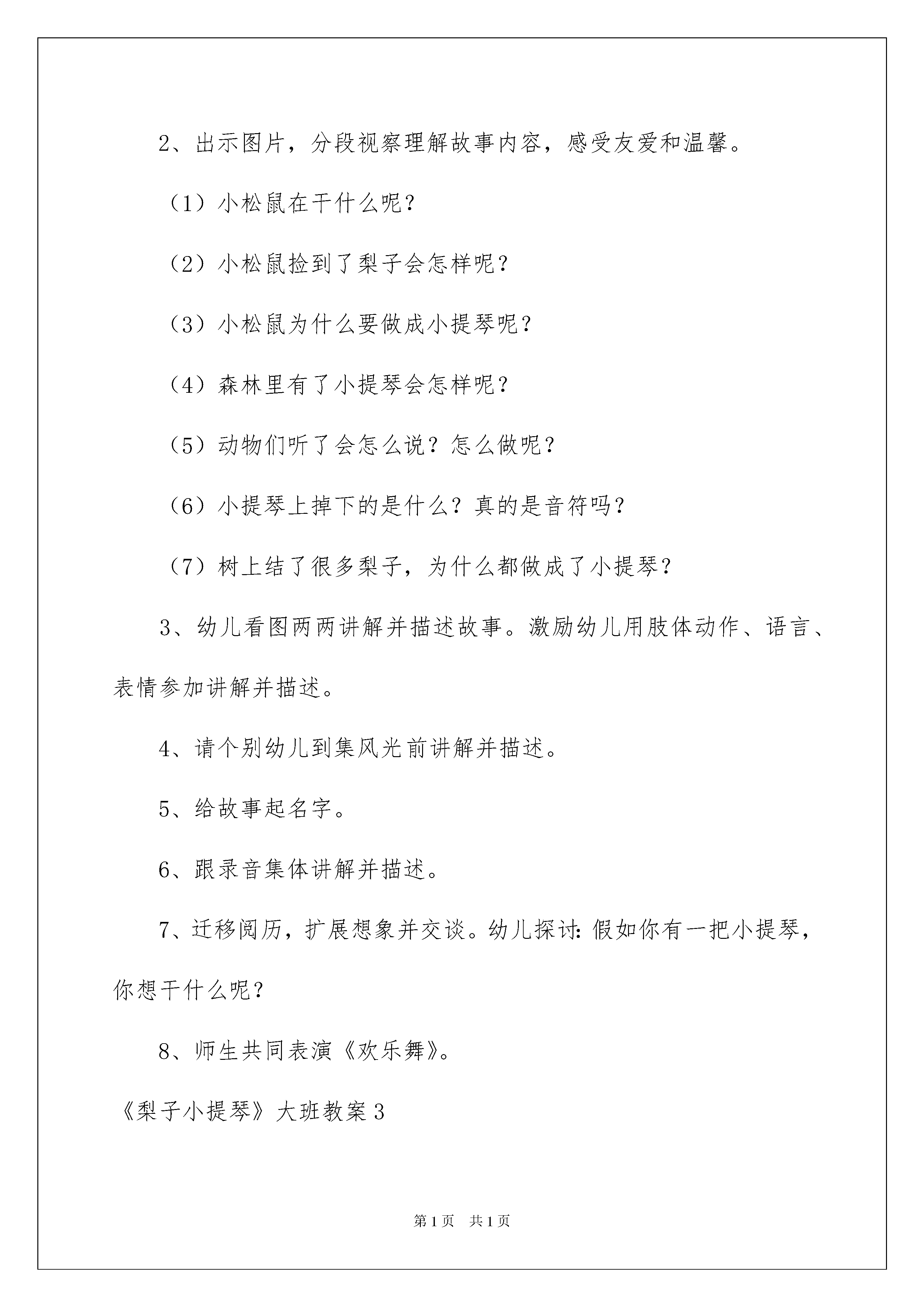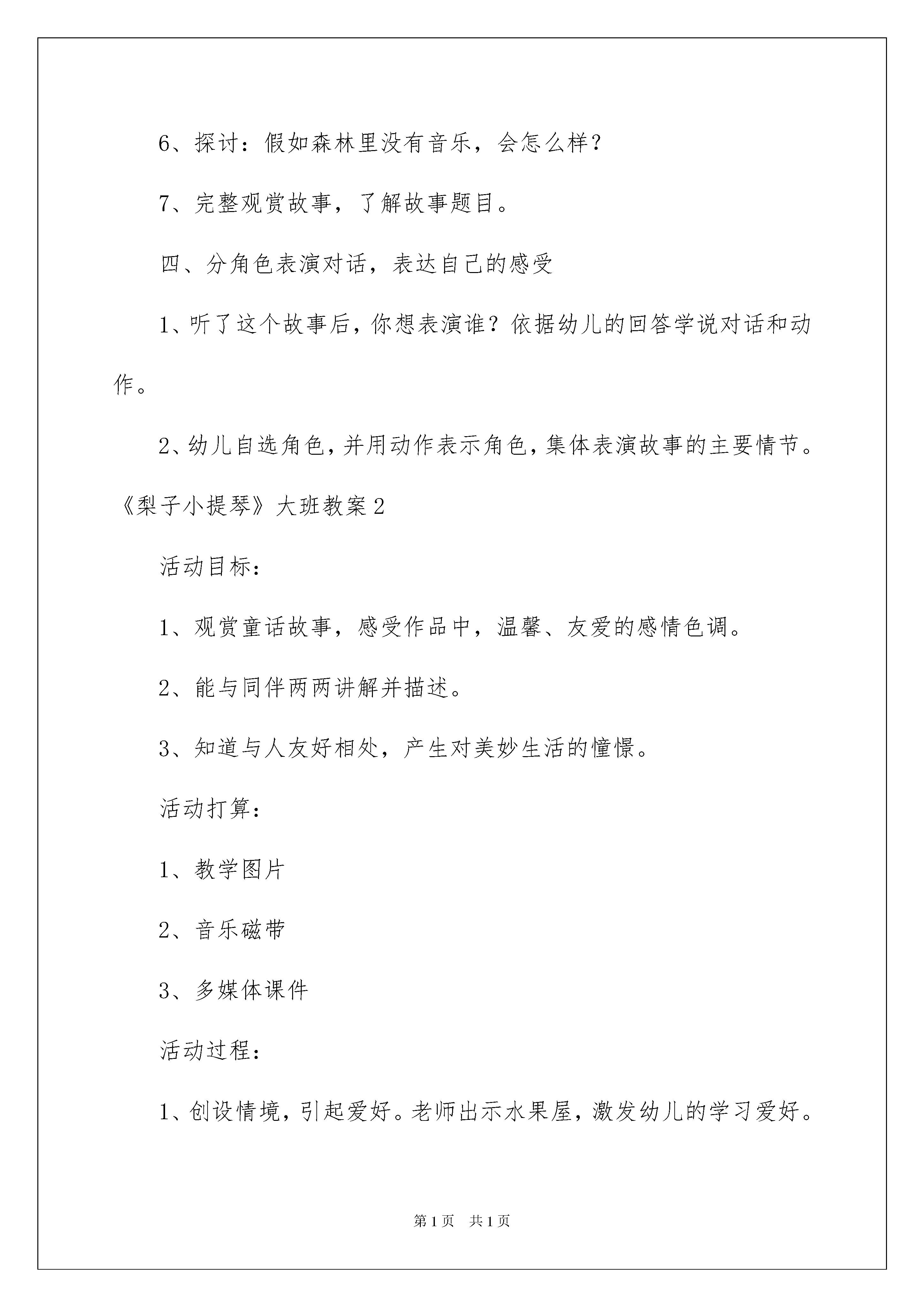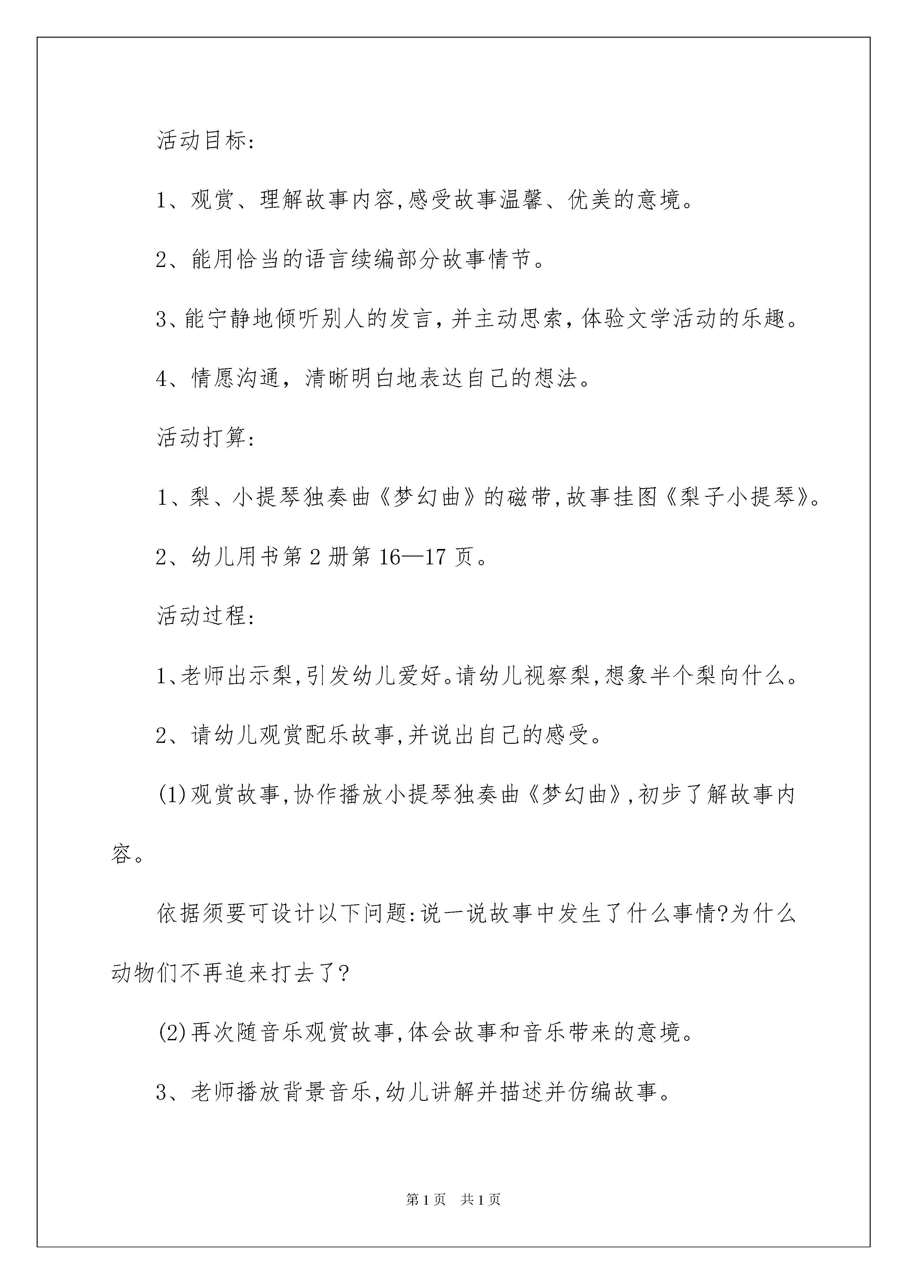 2022《梨子小提琴》大班教案《梨子小提琴》大班教案作为一名专为他人授业解惑的人民老师,总不行避开地须要编写教案,编写教案助于积累教学阅历,不断提高教学质量。那么问题来了,教案应当怎么写?以下是我为大家整理的《梨子小提琴》大班教案,供大家参考借鉴,希望可以帮助到有须要的挚友。《梨子小提琴》大班教案1活动目标:1、开心地观赏故事,感受文学和音乐作品安详、安静与优美的意境;2、理解故事内容,发挥想象,尝试用语言和动作表达自己的想法与感受;3、激发对文学作品中语言的感受力,发展感受美与表现美的实力。活动打算:1、音乐《梦幻曲》;故事课件;2、活动前幼儿对小提琴和音符有所了解。活动过程:一、倾听音乐〈梦幻曲〉,感受安静悠远的意境1、今日,老师带你们到森林里去。听,传来了什么样的声音?(播放《梦幻曲》)2、听了这首曲子,你心里觉得怎么样?3、你知道这好听的音乐是什么乐器演奏的吗?4、这么好听的音乐是谁演奏的,森林里究竟发生了什么事情呢?我们一起细致地听听。二、初次完整观赏配乐故事,领会故事美丽的意境1、老师配乐朗诵故事,幼儿宁静地倾听。2、故事中有谁?是谁在演奏音乐?这小提琴是用什么做的?三、结合图片观赏配乐故事,理解故事1、观看课件,老师配乐朗诵故事。2、你觉得小松鼠的小提琴拉得怎么样?3、狐狸和狮子听到了琴声后说了什么?它们为什么要去听音乐?4、小松鼠拉琴的时候森林里是怎么样的?5、小提琴上掉下来一粒东西,那是什么?后来小音符变成了什么?6、探讨:假如森林里没有音乐,会怎么样?7、完整观赏故事,了解故事题目。四、分角色表演对话,表达自己的感受1、听了这个故事后,你想表演谁?依据幼儿的回答学说对话和动作。2、幼儿自选角色,并用动作表示角色,集体表演故事的主要情节。《梨子小提琴》大班教案2活动目标:1、观赏童话故事,感受作品中,温馨、友爱的感情色调。2、能与同伴两两讲解并描述。3、知道与人友好相处,产生对美妙生活的憧憬。活动打算:1、教学图片2、音乐磁带3、多媒体课件活动过程:1、创设情境,引起爱好。老师出示水果屋,激发幼儿的学习爱好。2、出示图片,分段视察理解故事内容,感受友爱和温馨。(1)小松鼠在干什么呢?(2)小松鼠捡到了梨子会怎样呢?(3)小松鼠为什么要做成小提琴呢?(4)森林里有了小提琴会怎样呢?(5)动物们听了会怎么说?怎么做呢?(6)小提琴上掉下的是什么?真的是音符吗?(7)树上结了很多梨子,为什么都做成了小提琴?3、幼儿看图两两讲解并描述故事。激励幼儿用肢体动作、语言、表情参加讲解并描述。4、请个别幼儿到集风光前讲解并描述。5、给故事起名字。6、跟录音集体讲解并描述。7、迁移阅历,扩展想象并交谈。幼儿探讨:假如你有一把小提琴,你想干什么呢?8、师生共同表演《欢乐舞》。《梨子小提琴》大班教案3活动目标:1、观赏、理解故事内容,感受故事温馨、优美的意境。2、能用恰当的语言续编部分故事情节。3、能宁静地倾听别人的发言,并主动思索,体验文学活动的乐趣。4、情愿沟通,清晰明白地表达自己的想法。活动打算:1、梨、小提琴独奏曲《梦幻曲》的磁带,故事挂图《梨子小提琴》。2、幼儿用书第2册第16—17页。活动过程:1、老师出示梨,引发幼儿爱好。请幼儿视察梨,想象半个梨向什么。2、请幼儿观赏配乐故事,并说出自己的感受。(1)观赏故事,协作播放小提琴独奏曲《梦幻曲》,初步了解故事内容。依据须要可设计以下问题:说一说故事中发生了什么事情?为什么动物们不再追来打去了?(2)再次随音乐观赏故事,体会故事和音乐带来的意境。3、老师播放背景音乐,幼儿讲解并描述并仿编故事。(1)请幼儿两人一组,分别讲解并描述故事。(2)请幼儿仿编其他动物听到音乐后的表现等情节,讲给同伴听活动反思:这是一堂选自《建构式幼儿园课程》中的一堂以语言为主的整合课程。《梨子小提琴》是赵冰波先生的一篇优秀的美文,我们的课堂设计没按原来语言课的基本程序,而是加进了音乐律动的环节,让幼儿在课堂上能够与老师充分的互动起来。本堂课的主要内容是感受舒缓、温馨、优美的意境,整个课堂气氛上下来觉得很轻松,比较活泼,与孩子们的互动较好!原本为了活跃课堂气氛以及加深幼儿对小提琴演奏的印象,我们设计了课堂中真人表演的环节,但由于表演者受伤而取消。《梨子小提琴》大班教案4活动目标:1.培育幼儿酷爱和平,与同伴之间友好相处和共同共享美妙事物的情感。2.发展幼儿的视察力、想象力和语言表达实力。3.理解故事内容,学说故事中的对话,感受音乐的美。4.通过多种阅读手段理解图画书内容,了解故事,感受故事诙谐幽默的情节。5.通过视察图片,引导幼儿讲解并描述图片内