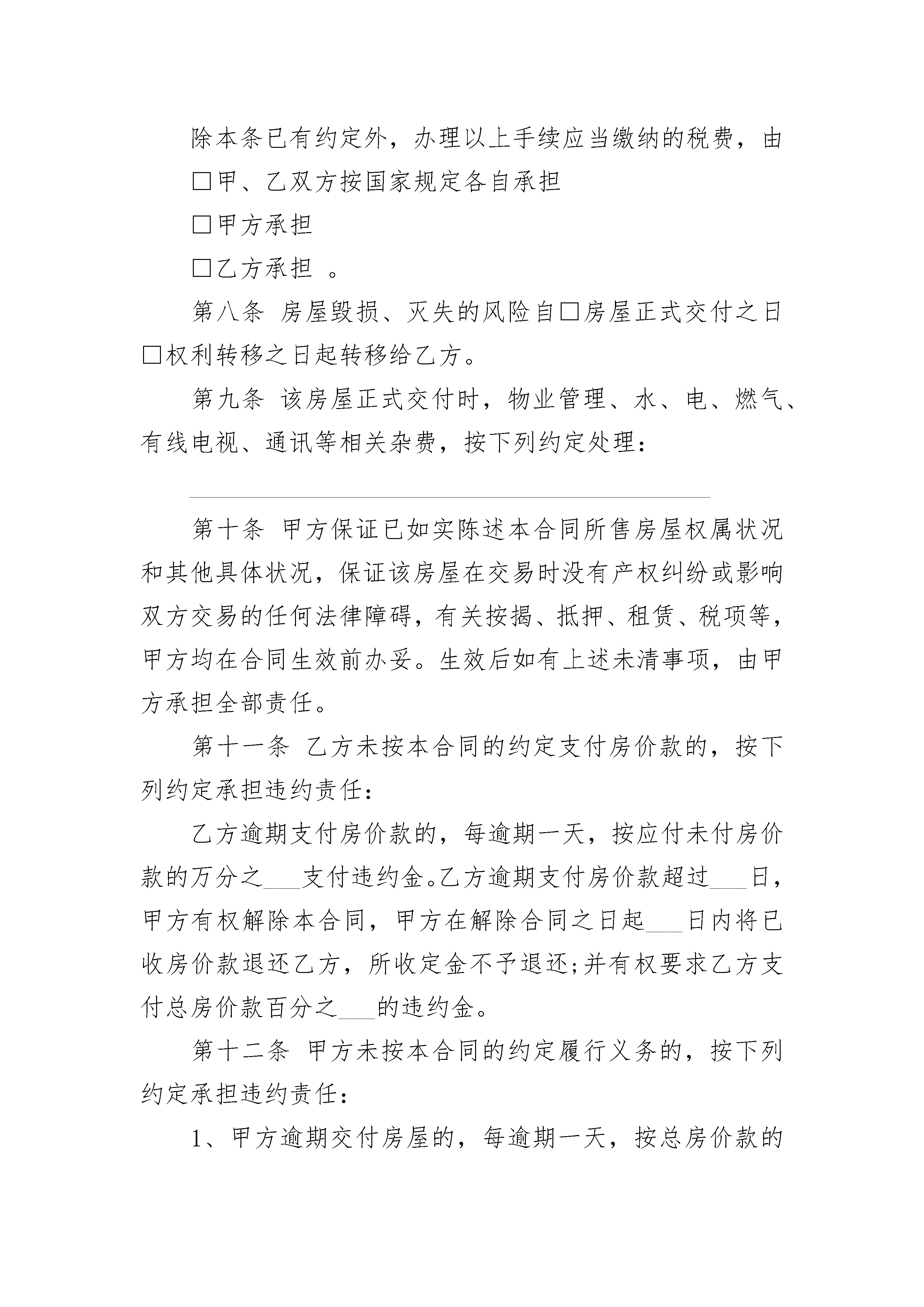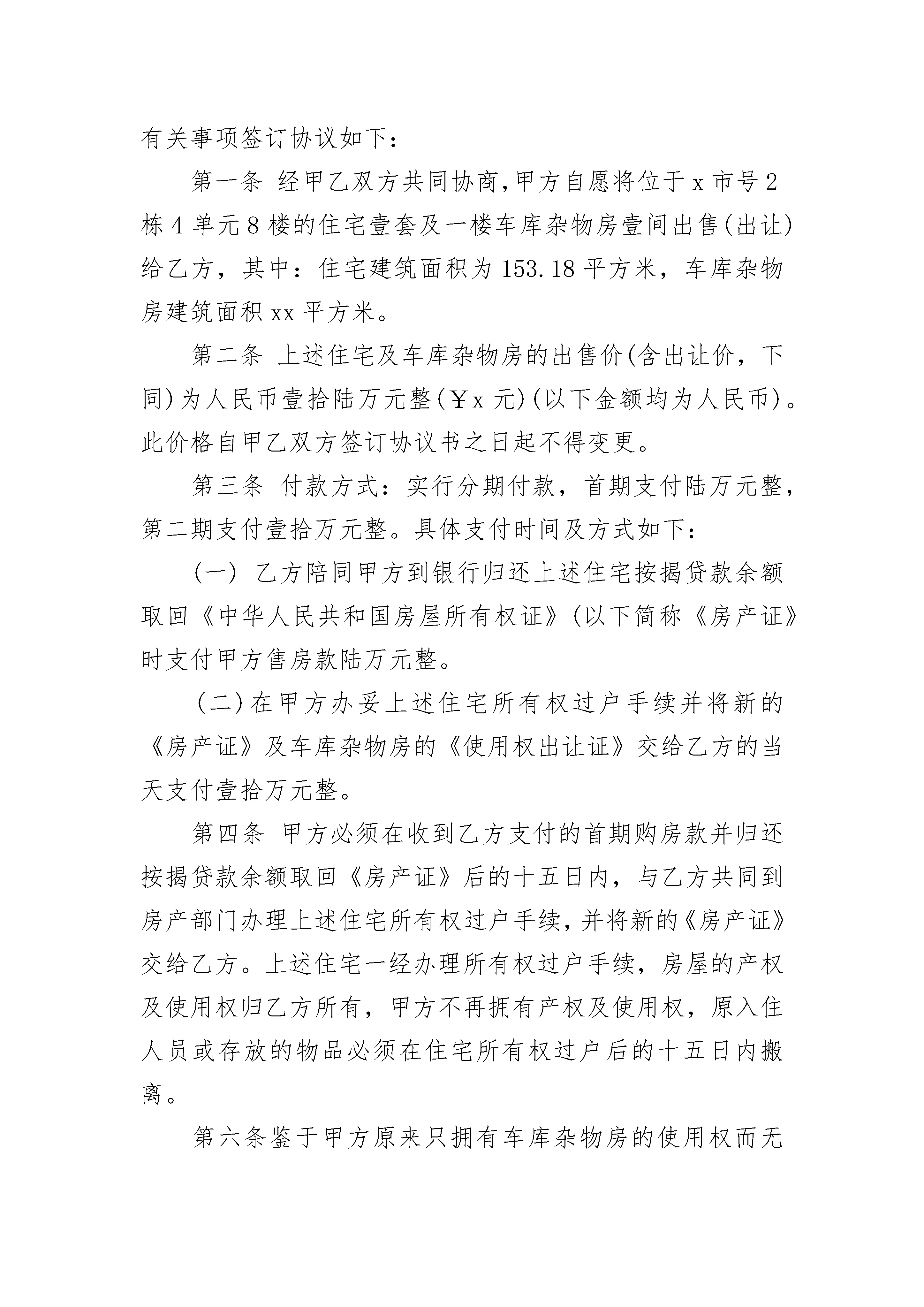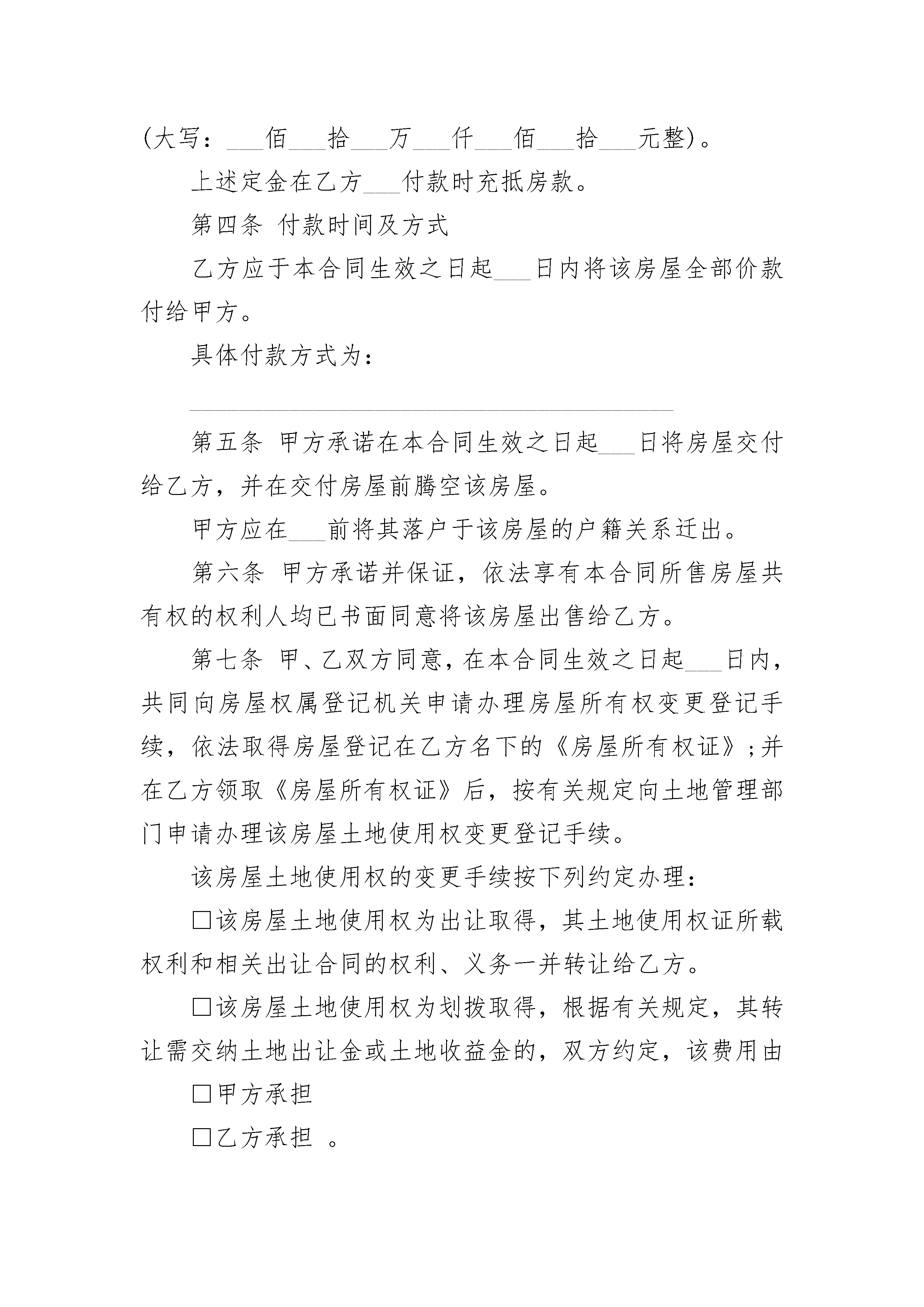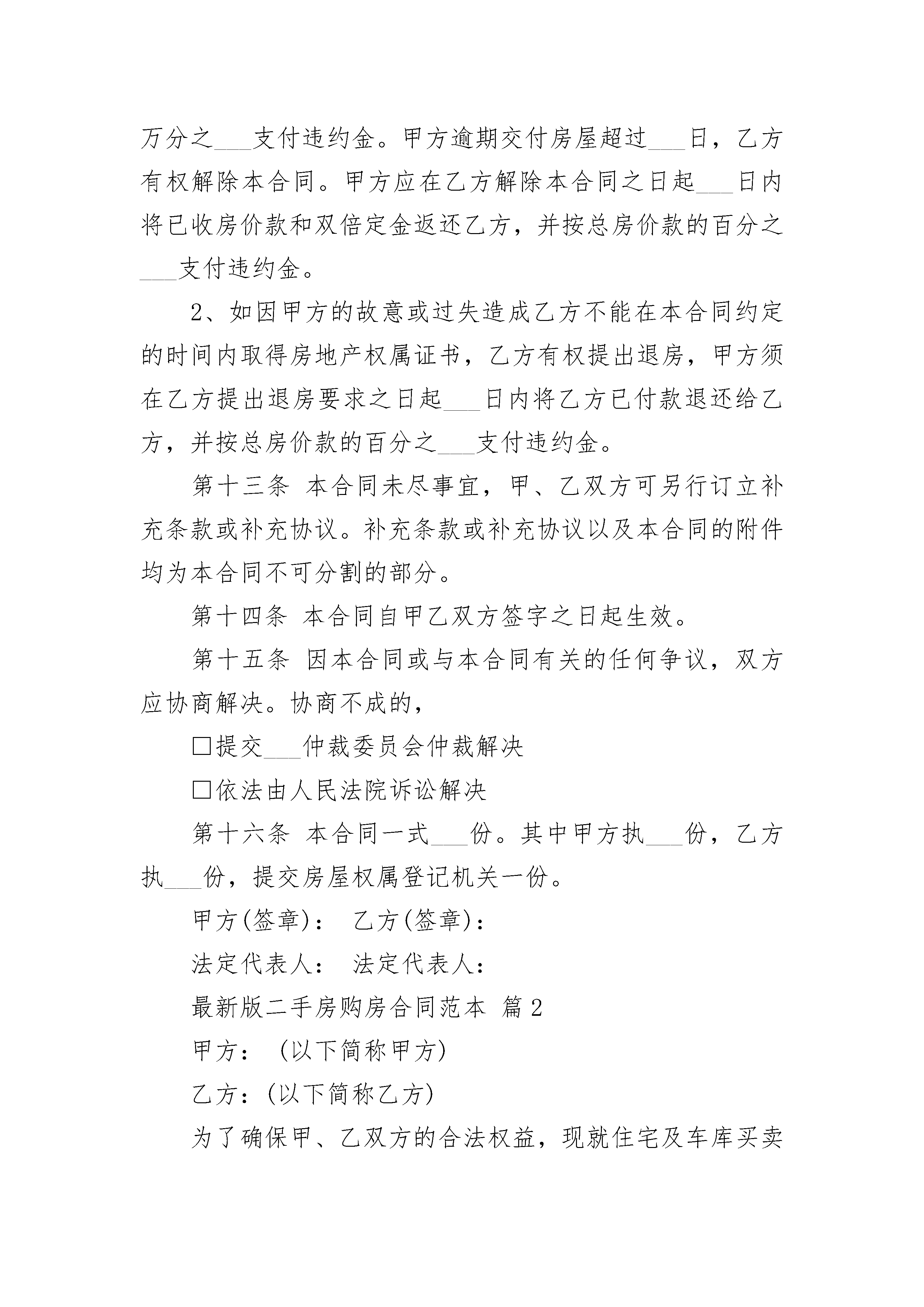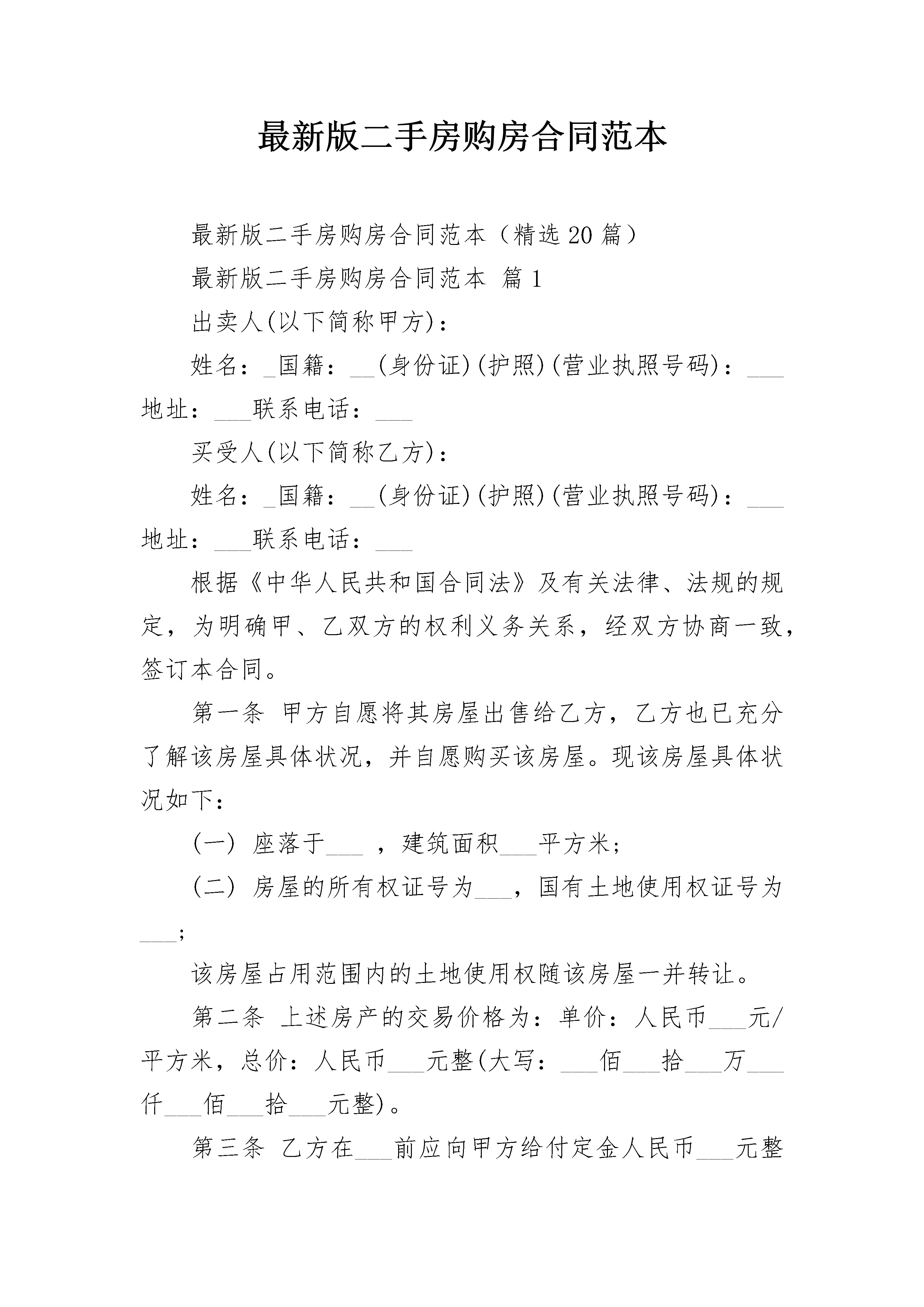 最新版二手房购房合同范本最新版二手房购房合同范本(精选20篇)最新版二手房购房合同范本篇1出卖人(以下简称甲方):姓名:_国籍:__(身份证)(护照)(营业执照号码):___地址:___联系电话:___买受人(以下简称乙方):姓名:_国籍:__(身份证)(护照)(营业执照号码):___地址:___联系电话:___根据《中华人民共和国合同法》及有关法律、法规的规定,为明确甲、乙双方的权利义务关系,经双方协商一致,签订本合同。第一条甲方自愿将其房屋出售给乙方,乙方也已充分了解该房屋具体状况,并自愿购买该房屋。现该房屋具体状况如下:(一)座落于___,建筑面积___平方米;(二)房屋的所有权证号为___,国有土地使用权证号为___;该房屋占用范围内的土地使用权随该房屋一并转让。第二条上述房产的交易价格为:单价:人民币___元/平方米,总价:人民币___元整(大写:___佰___拾___万___仟___佰___拾___元整)。第三条乙方在___前应向甲方给付定金人民币___元整(大写:___佰___拾___万___仟___佰___拾___元整)。上述定金在乙方___付款时充抵房款。第四条付款时间及方式乙方应于本合同生效之日起___日内将该房屋全部价款付给甲方。具体付款方式为:_______________________________________第五条甲方承诺在本合同生效之日起___日将房屋交付给乙方,并在交付房屋前腾空该房屋。甲方应在___前将其落户于该房屋的户籍关系迁出。第六条甲方承诺并保证,依法享有本合同所售房屋共有权的权利人均已书面同意将该房屋出售给乙方。第七条甲、乙双方同意,在本合同生效之日起___日内,共同向房屋权属登记机关申请办理房屋所有权变更登记手续,依法取得房屋登记在乙方名下的《房屋所有权证》;并在乙方领取《房屋所有权证》后,按有关规定向土地管理部门申请办理该房屋土地使用权变更登记手续。该房屋土地使用权的变更手续按下列约定办理:□该房屋土地使用权为出让取得,其土地使用权证所载权利和相关出让合同的权利、义务一并转让给乙方。□该房屋土地使用权为划拨取得,根据有关规定,其转让需交纳土地出让金或土地收益金的,双方约定,该费用由□甲方承担□乙方承担。除本条已有约定外,办理以上手续应当缴纳的税费,由□甲、乙双方按国家规定各自承担□甲方承担□乙方承担。第八条房屋毁损、灭失的风险自□房屋正式交付之日□权利转移之日起转移给乙方。第九条该房屋正式交付时,物业管理、水、电、燃气、有线电视、通讯等相关杂费,按下列约定处理:__________________________________________第十条甲方保证已如实陈述本合同所售房屋权属状况和其他具体状况,保证该房屋在交易时没有产权纠纷或影响双方交易的任何法律障碍,有关按揭、抵押、租赁、税项等,甲方均在合同生效前办妥。生效后如有上述未清事项,由甲方承担全部责任。第十一条乙方未按本合同的约定支付房价款的,按下列约定承担违约责任:乙方逾期支付房价款的,每逾期一天,按应付未付房价款的万分之___支付违约金。乙方逾期支付房价款超过___日,甲方有权解除本合同,甲方在解除合同之日起___日内将已收房价款退还乙方,所收定金不予退还;并有权要求乙方支付总房价款百分之___的违约金。第十二条甲方未按本合同的约定履行义务的,按下列约定承担违约责任:1、甲方逾期交付房屋的,每逾期一天,按总房价款的万分之___支付违约金。甲方逾期交付房屋超过___日,乙方有权解除本合同。甲方应在乙方解除本合同之日起___日内将已收房价款和双倍定金返还乙方,并按总房价款的百分之___支付违约金。2、如因甲方的故意或过失造成乙方不能在本合同约定的时间内取得房地产权属证书,乙方有权提出退房,甲方须在乙方提出退房要求之日起___日内将乙方已付款退还给乙方,并按总房价款的百分之___支付违约金。第十三条本合同未尽事宜,甲、乙双方可另行订立补充条款或补充协议。补充条款或补充协议以及本合同的附件均为本合同不可分割的部分。第十四条本合同自甲乙双方签字之日起生效。第十五条因本合同或与本合同有关的任何争议,双方应协商解决。协商不成的,□提交___仲裁委员会仲裁解决□依法由人民法院诉讼解决第十六条本合同一式___份。其中甲方执___份,乙方执___份,提交房屋权属登记机关一份。甲方(签章):乙方(签章):法定代表人:法定代表人:最新版二手房购房合同范本篇2甲方:(以下简称甲方)乙方:(以下简称乙方)为了确保甲、乙双方的合法权益,现就住宅及车库买卖有关事项签订协议如下:第一条经甲乙双方共同协商,甲方自愿将位于x市号2栋4单元8楼的住宅壹套及一楼车库杂物房壹间出售(出让)给乙方,其中:住宅建筑面积为153.18平方米,车库杂物房建筑面