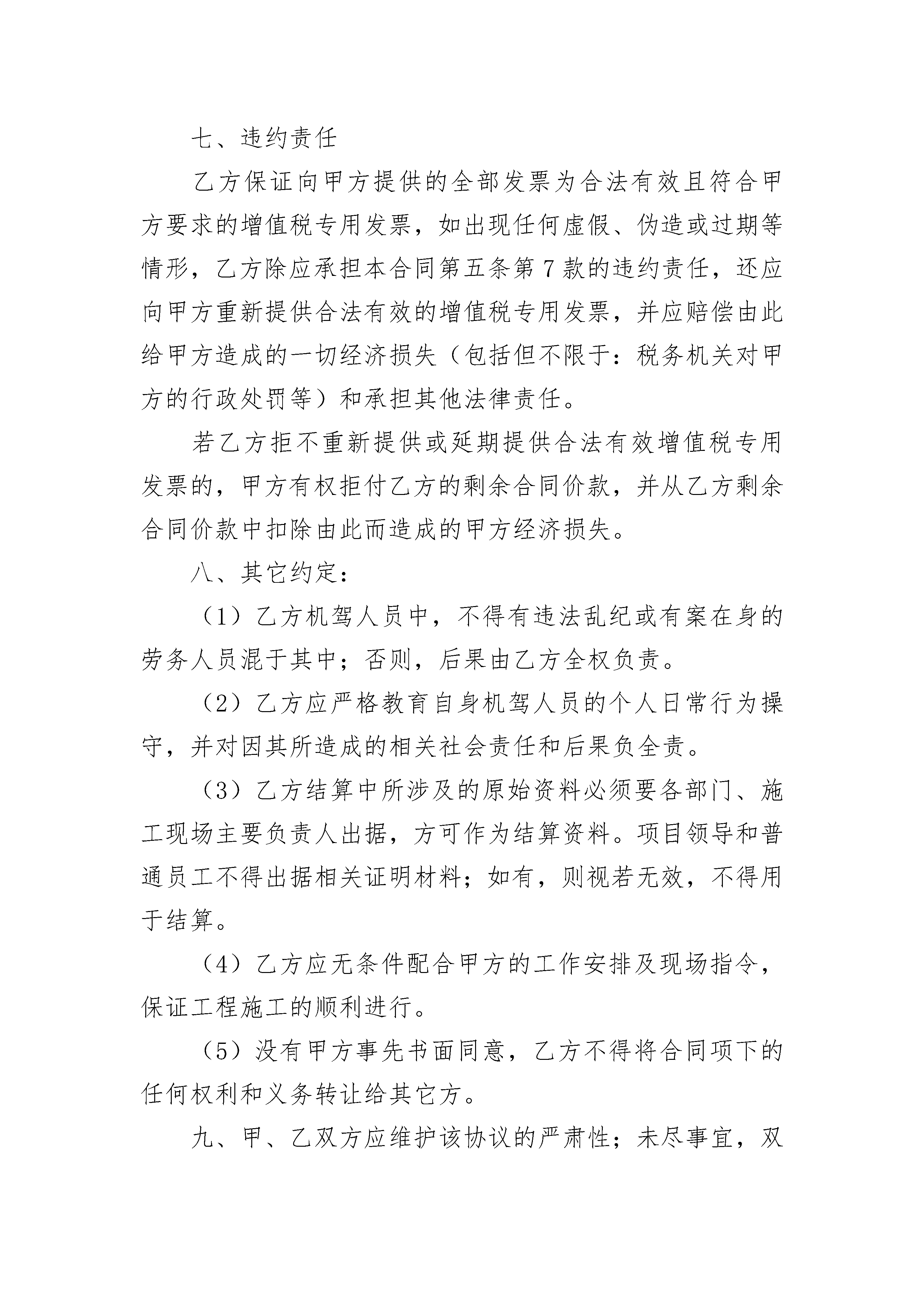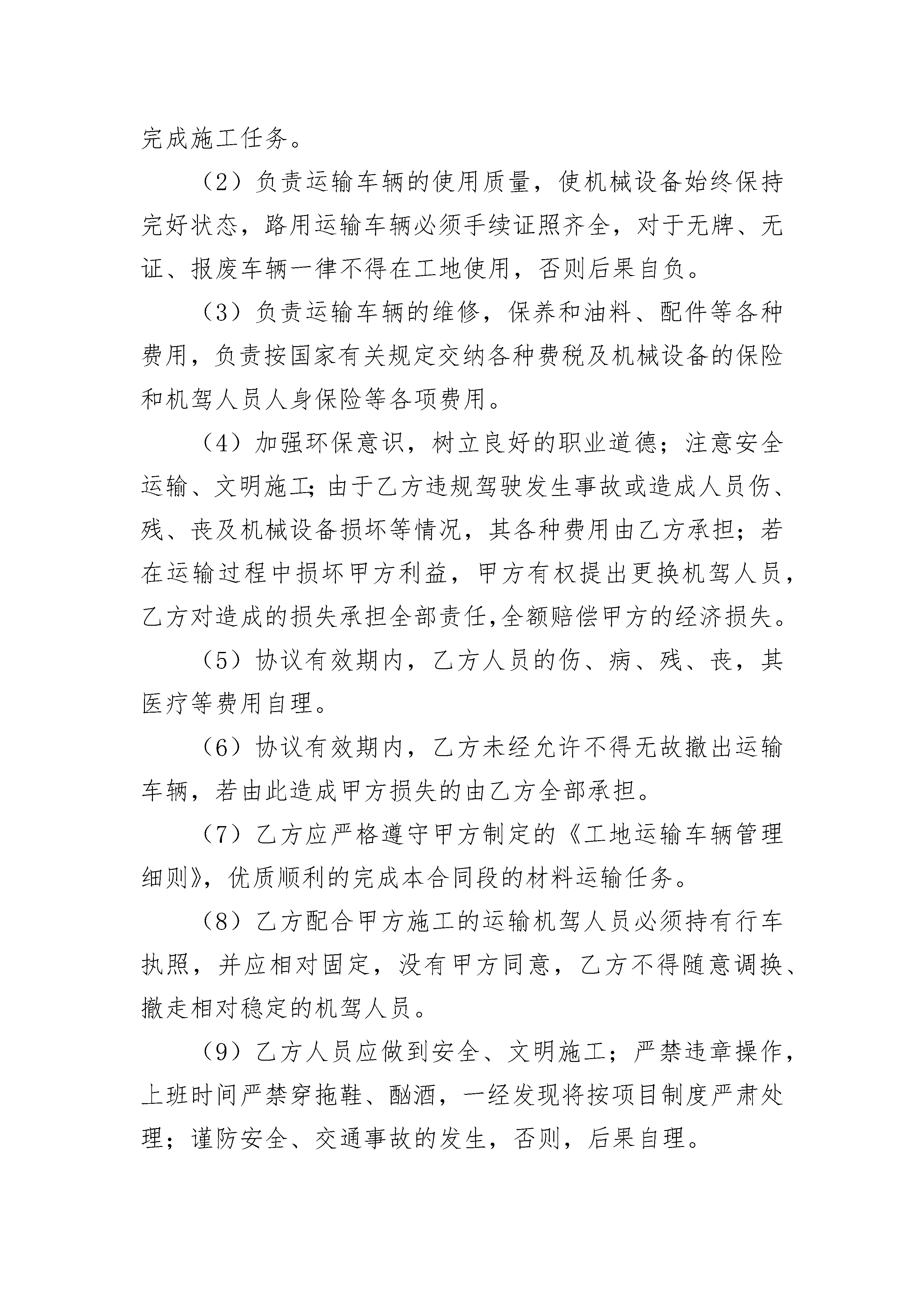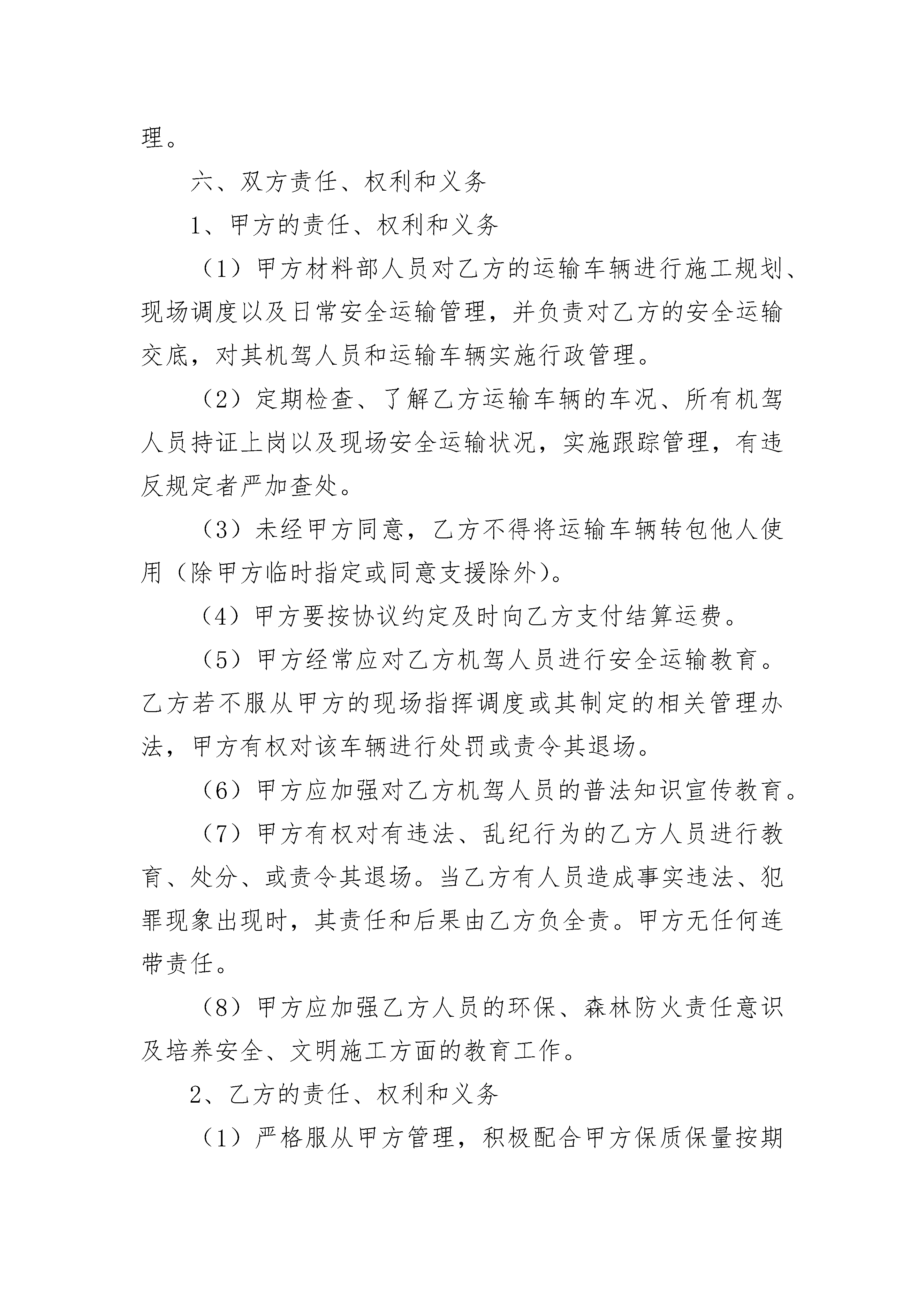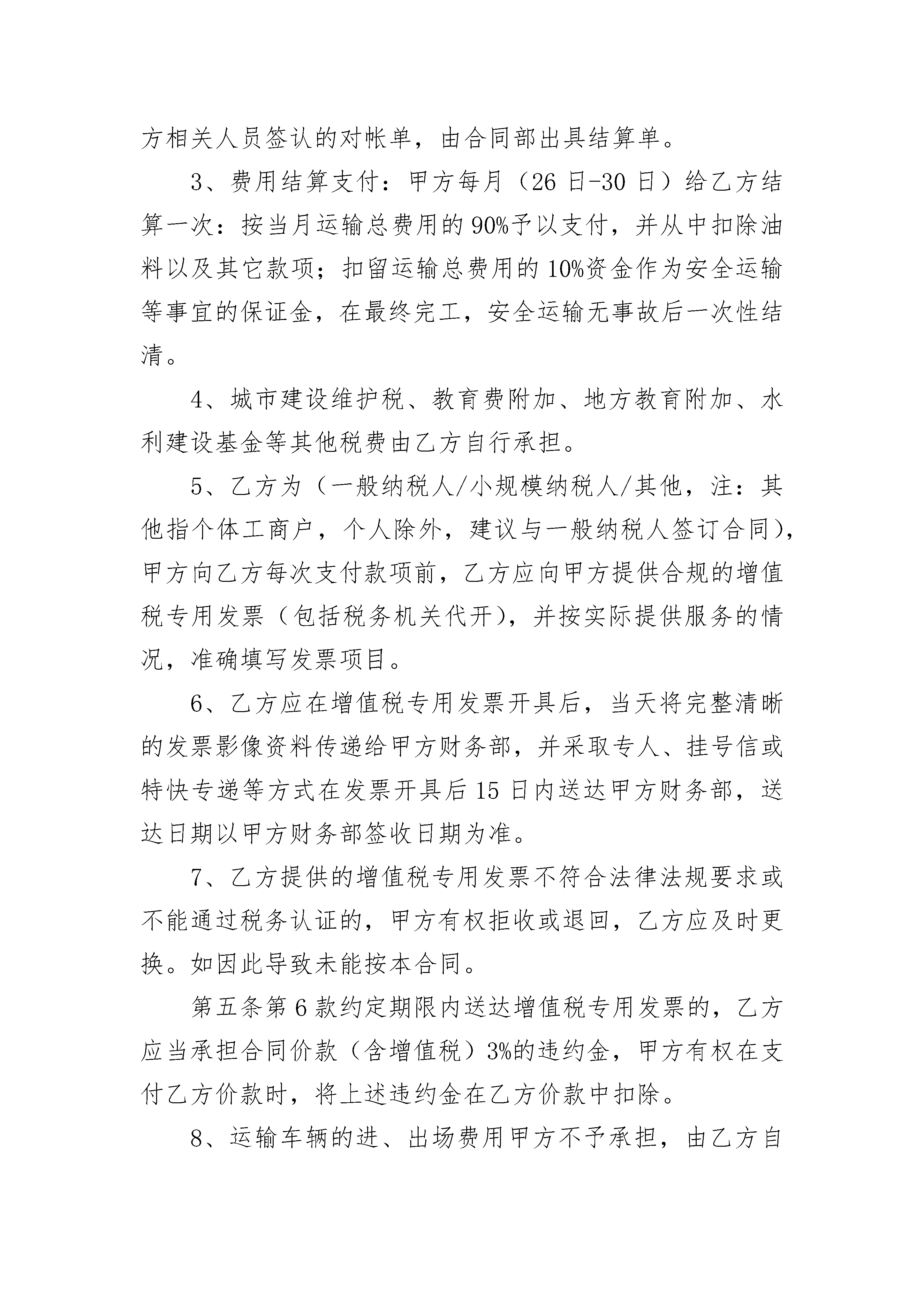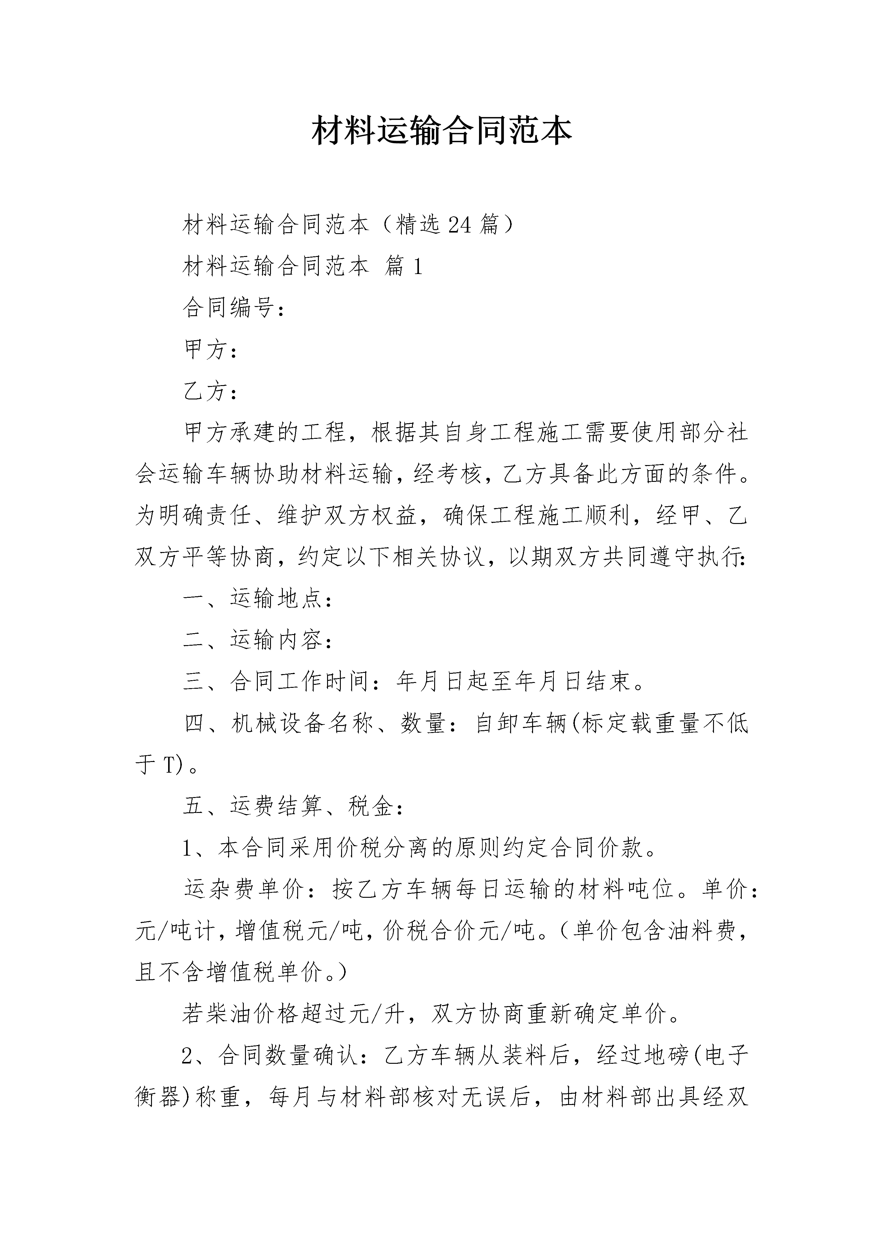 材料运输合同范本材料运输合同范本(精选24篇)材料运输合同范本篇1合同编号:甲方:乙方:甲方承建的工程,根据其自身工程施工需要使用部分社会运输车辆协助材料运输,经考核,乙方具备此方面的条件。为明确责任、维护双方权益,确保工程施工顺利,经甲、乙双方平等协商,约定以下相关协议,以期双方共同遵守执行:一、运输地点:二、运输内容:三、合同工作时间:年月日起至年月日结束。四、机械设备名称、数量:自卸车辆(标定载重量不低于T)。五、运费结算、税金:1、本合同采用价税分离的原则约定合同价款。运杂费单价:按乙方车辆每日运输的材料吨位。单价:元/吨计,增值税元/吨,价税合价元/吨。(单价包含油料费,且不含增值税单价。)若柴油价格超过元/升,双方协商重新确定单价。2、合同数量确认:乙方车辆从装料后,经过地磅(电子衡器)称重,每月与材料部核对无误后,由材料部出具经双方相关人员签认的对帐单,由合同部出具结算单。3、费用结算支付:甲方每月(26日-30日)给乙方结算一次:按当月运输总费用的90%予以支付,并从中扣除油料以及其它款项;扣留运输总费用的10%资金作为安全运输等事宜的保证金,在最终完工,安全运输无事故后一次性结清。4、城市建设维护税、教育费附加、地方教育附加、水利建设基金等其他税费由乙方自行承担。5、乙方为(一般纳税人/小规模纳税人/其他,注:其他指个体工商户,个人除外,建议与一般纳税人签订合同),甲方向乙方每次支付款项前,乙方应向甲方提供合规的增值税专用发票(包括税务机关代开),并按实际提供服务的情况,准确填写发票项目。6、乙方应在增值税专用发票开具后,当天将完整清晰的发票影像资料传递给甲方财务部,并采取专人、挂号信或特快专递等方式在发票开具后15日内送达甲方财务部,送达日期以甲方财务部签收日期为准。7、乙方提供的增值税专用发票不符合法律法规要求或不能通过税务认证的,甲方有权拒收或退回,乙方应及时更换。如因此导致未能按本合同。第五条第6款约定期限内送达增值税专用发票的,乙方应当承担合同价款(含增值税)3%的违约金,甲方有权在支付乙方价款时,将上述违约金在乙方价款中扣除。8、运输车辆的进、出场费用甲方不予承担,由乙方自理。六、双方责任、权利和义务1、甲方的责任、权利和义务(1)甲方材料部人员对乙方的运输车辆进行施工规划、现场调度以及日常安全运输管理,并负责对乙方的安全运输交底,对其机驾人员和运输车辆实施行政管理。(2)定期检查、了解乙方运输车辆的车况、所有机驾人员持证上岗以及现场安全运输状况,实施跟踪管理,有违反规定者严加查处。(3)未经甲方同意,乙方不得将运输车辆转包他人使用(除甲方临时指定或同意支援除外)。(4)甲方要按协议约定及时向乙方支付结算运费。(5)甲方经常应对乙方机驾人员进行安全运输教育。乙方若不服从甲方的现场指挥调度或其制定的相关管理办法,甲方有权对该车辆进行处罚或责令其退场。(6)甲方应加强对乙方机驾人员的普法知识宣传教育。(7)甲方有权对有违法、乱纪行为的乙方人员进行教育、处分、或责令其退场。当乙方有人员造成事实违法、犯罪现象出现时,其责任和后果由乙方负全责。甲方无任何连带责任。(8)甲方应加强乙方人员的环保、森林防火责任意识及培养安全、文明施工方面的教育工作。2、乙方的责任、权利和义务(1)严格服从甲方管理,积极配合甲方保质保量按期完成施工任务。(2)负责运输车辆的使用质量,使机械设备始终保持完好状态,路用运输车辆必须手续证照齐全,对于无牌、无证、报废车辆一律不得在工地使用,否则后果自负。(3)负责运输车辆的维修,保养和油料、配件等各种费用,负责按国家有关规定交纳各种费税及机械设备的保险和机驾人员人身保险等各项费用。(4)加强环保意识,树立良好的职业道德;注意安全运输、文明施工;由于乙方违规驾驶发生事故或造成人员伤、残、丧及机械设备损坏等情况,其各种费用由乙方承担;若在运输过程中损坏甲方利益,甲方有权提出更换机驾人员,乙方对造成的损失承担全部责任,全额赔偿甲方的经济损失。(5)协议有效期内,乙方人员的伤、病、残、丧,其医疗等费用自理。(6)协议有效期内,乙方未经允许不得无故撤出运输车辆,若由此造成甲方损失的由乙方全部承担。(7)乙方应严格遵守甲方制定的《工地运输车辆管理细则》,优质顺利的完成本合同段的材料运输任务。(8)乙方配合甲方施工的运输机驾人员必须持有行车执照,并应相对固定,没有甲方同意,乙方不得随意调换、撤走相对稳定的机驾人员。(9)乙方人员应做到安全、文明施工;严禁违章操作,上班时间严禁穿拖鞋、酗酒,一经发现将按项目制度严肃处理;谨防安全、交通事故的发生,否则,后果自理。七、违约责任乙方保证向甲方提供的全部发票为合法有效且符合甲方要求的增值税专用发票,如出现任何虚假、伪造或过期等情形,乙方除应承担本合同第五