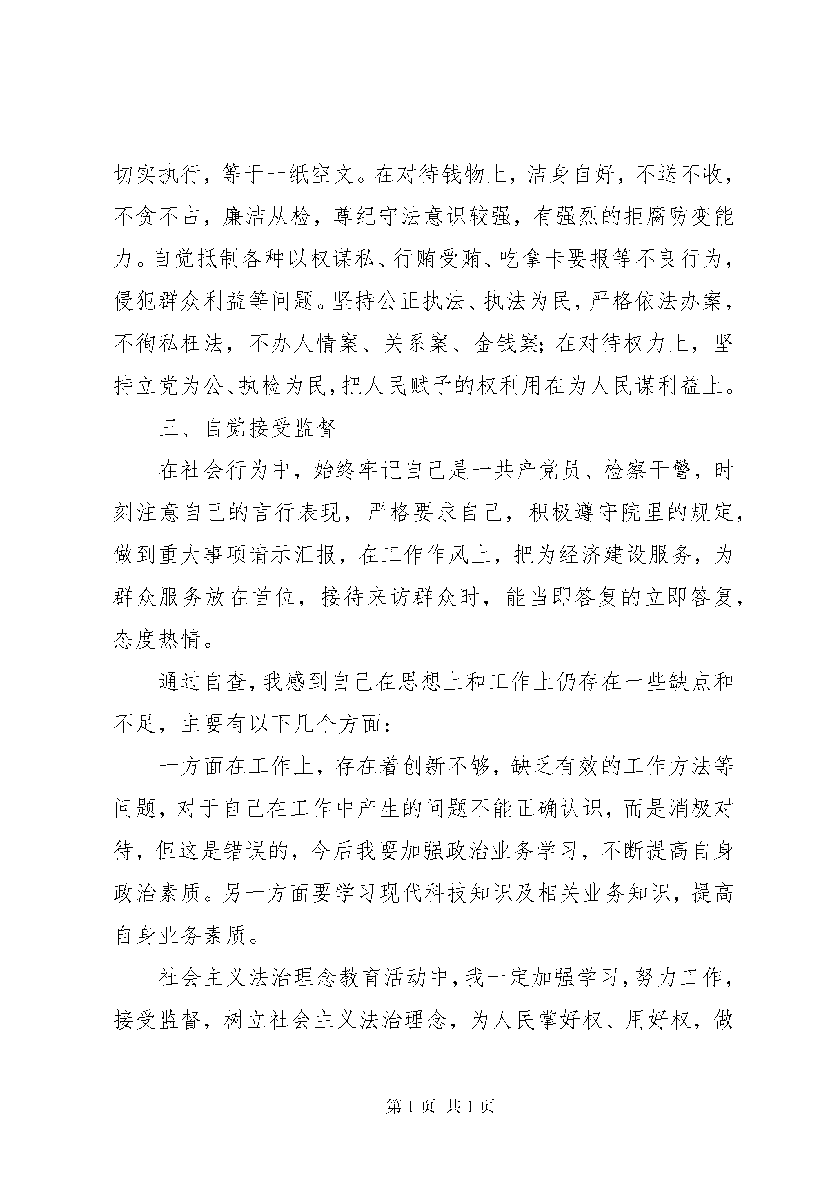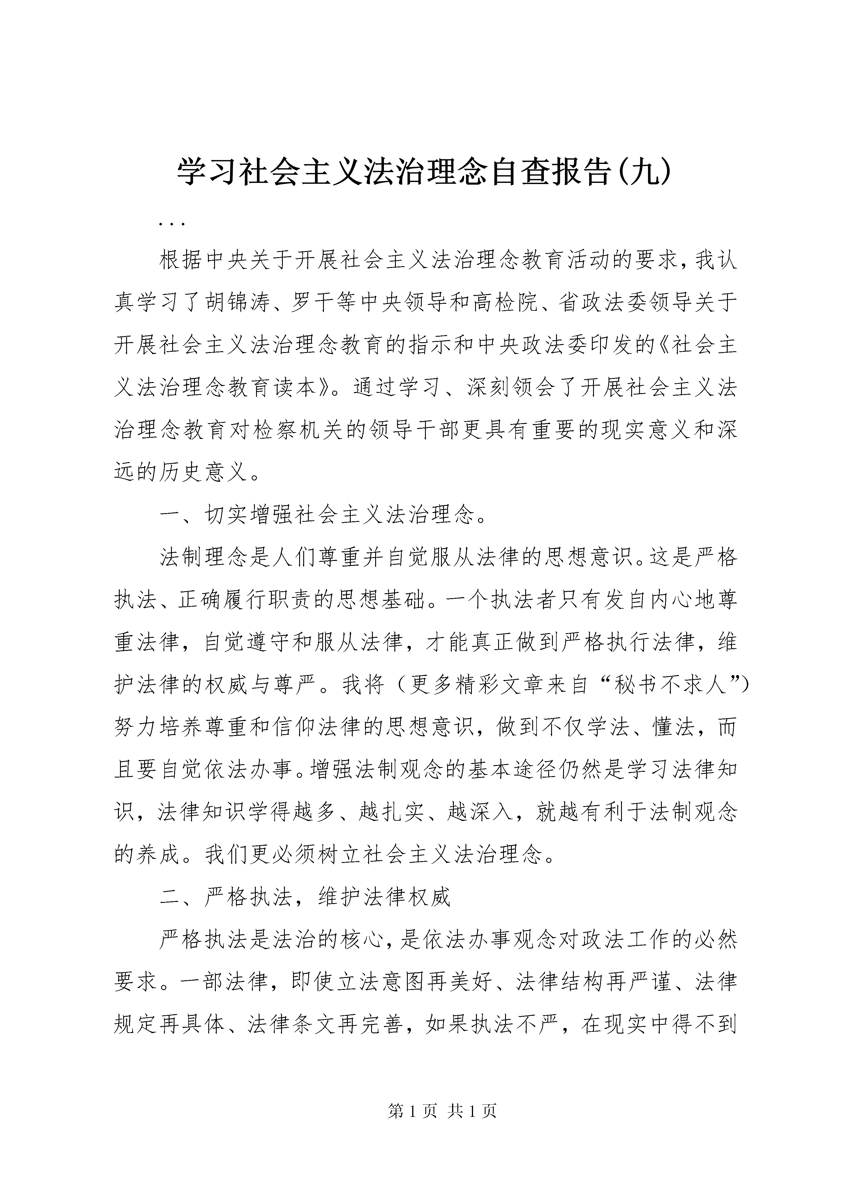 学习社会主义法治理念自查报告(九)...根据中央关于开展社会主义法治理念教育活动的要求,我认真学习了胡锦涛、罗干等中央领导和高检院、省政法委领导关于开展社会主义法治理念教育的指示和中央政法委印发的《社会主义法治理念教育读本》。通过学习、深刻领会了开展社会主义法治理念教育对检察机关的领导干部更具有重要的现实意义和深远的历史意义。一、切实增强社会主义法治理念。法制理念是人们尊重并自觉服从法律的思想意识。这是严格执法、正确履行职责的思想基础。一个执法者只有发自内心地尊重法律,自觉遵守和服从法律,才能真正做到严格执行法律,维护法律的权威与尊严。我将(更多精彩文章来自“秘书不求人”)努力培养尊重和信仰法律的思想意识,做到不仅学法、懂法,而且要自觉依法办事。增强法制观念的基本途径仍然是学习法律知识,法律知识学得越多、越扎实、越深入,就越有利于法制观念的养成。我们更必须树立社会主义法治理念。二、严格执法,维护法律权威严格执法是法治的核心,是依法办事观念对政法工作的必然要求。一部法律,即使立法意图再美好、法律结构再严谨、法律规定再具体、法律条文再完善,如果执法不严,在现实中得不到切实执行,等于一纸空文。在对待钱物上,洁身自好,不送不收,不贪不占,廉洁从检,尊纪守法意识较强,有强烈的拒腐防变能力。自觉抵制各种以权谋私、行贿受贿、吃拿卡要报等不良行为,侵犯群众利益等问题。坚持公正执法、执法为民,严格依法办案,不徇私枉法,不办人情案、关系案、金钱案;在对待权力上,坚持立党为公、执检为民,把人民赋予的权利用在为人民谋利益上。三、自觉接受监督在社会行为中,始终牢记自己是一共产党员、检察干警,时刻注意自己的言行表现,严格要求自己,积极遵守院里的规定,做到重大事项请示汇报,在工作作风上,把为经济建设服务,为群众服务放在首位,接待来访群众时,能当即答复的立即答复,态度热情。通过自查,我感到自己在思想上和工作上仍存在一些缺点和不足,主要有以下几个方面:一方面在工作上,存在着创新不够,缺乏有效的工作方法等问题,对于自己在工作中产生的问题不能正确认识,而是消极对待,但这是错误的,今后我要加强政治业务学习,不断提高自身政治素质。另一方面要学习现代科技知识及相关业务知识,提高自身业务素质。社会主义法治理念教育活动中,我一定加强学习,努力工作,接受监督,树立社会主义法治理念,为人民掌好权、用好权,做一名党和人民信任的执法者。
