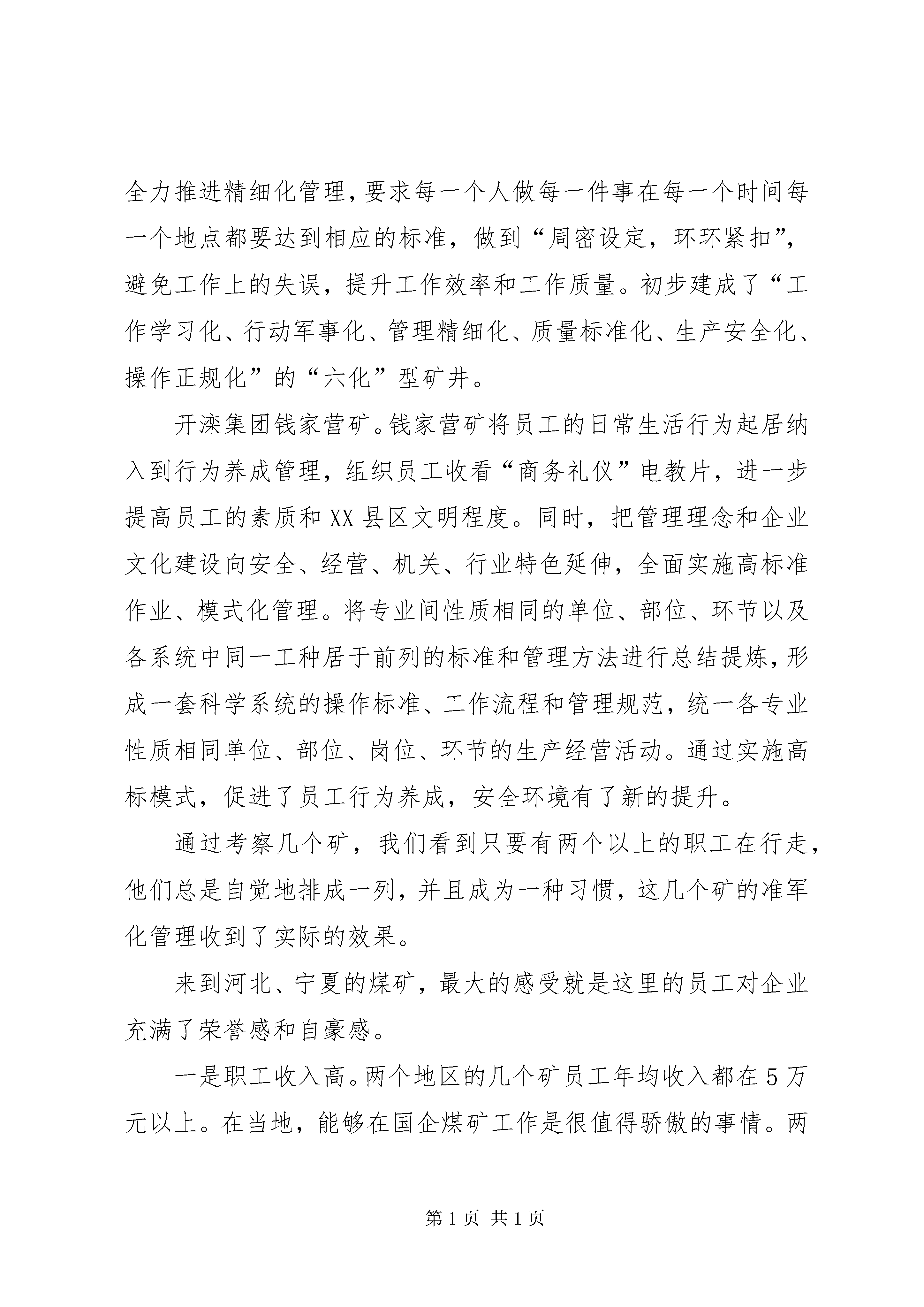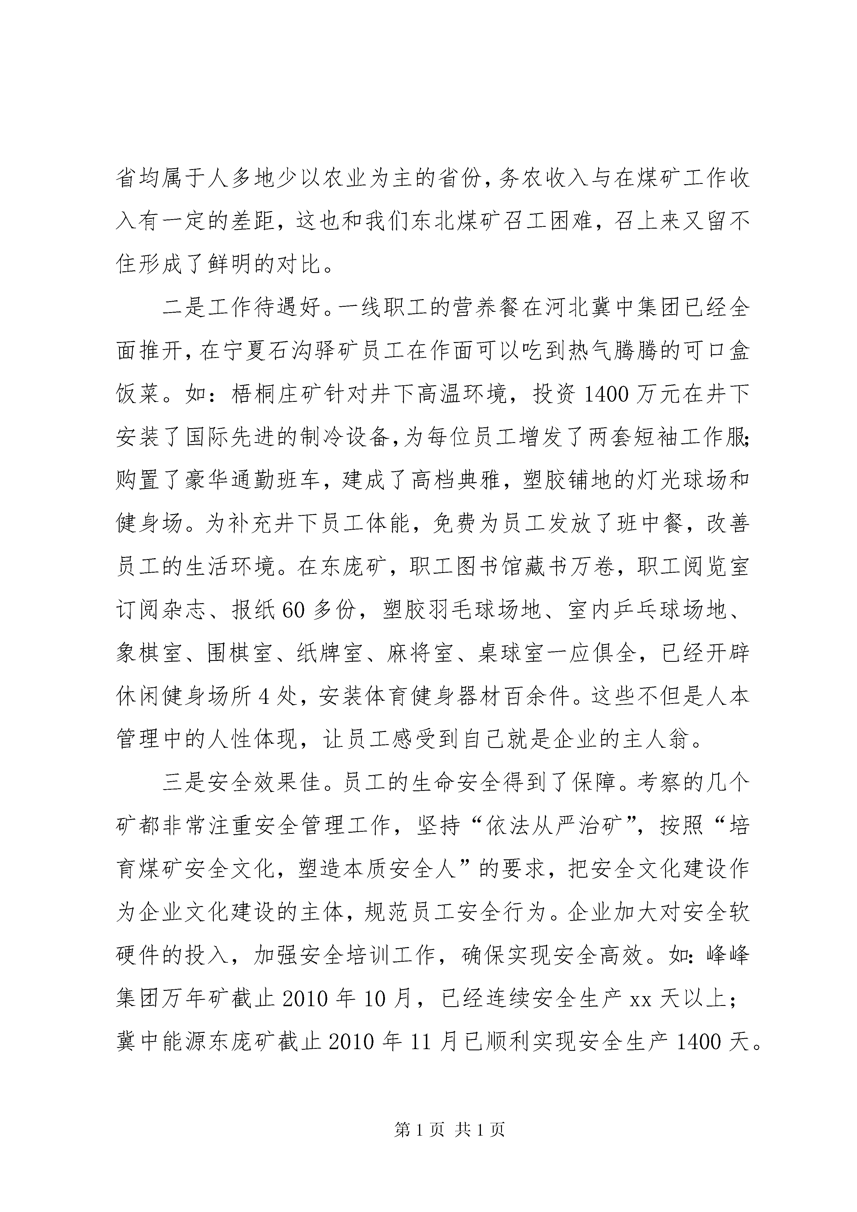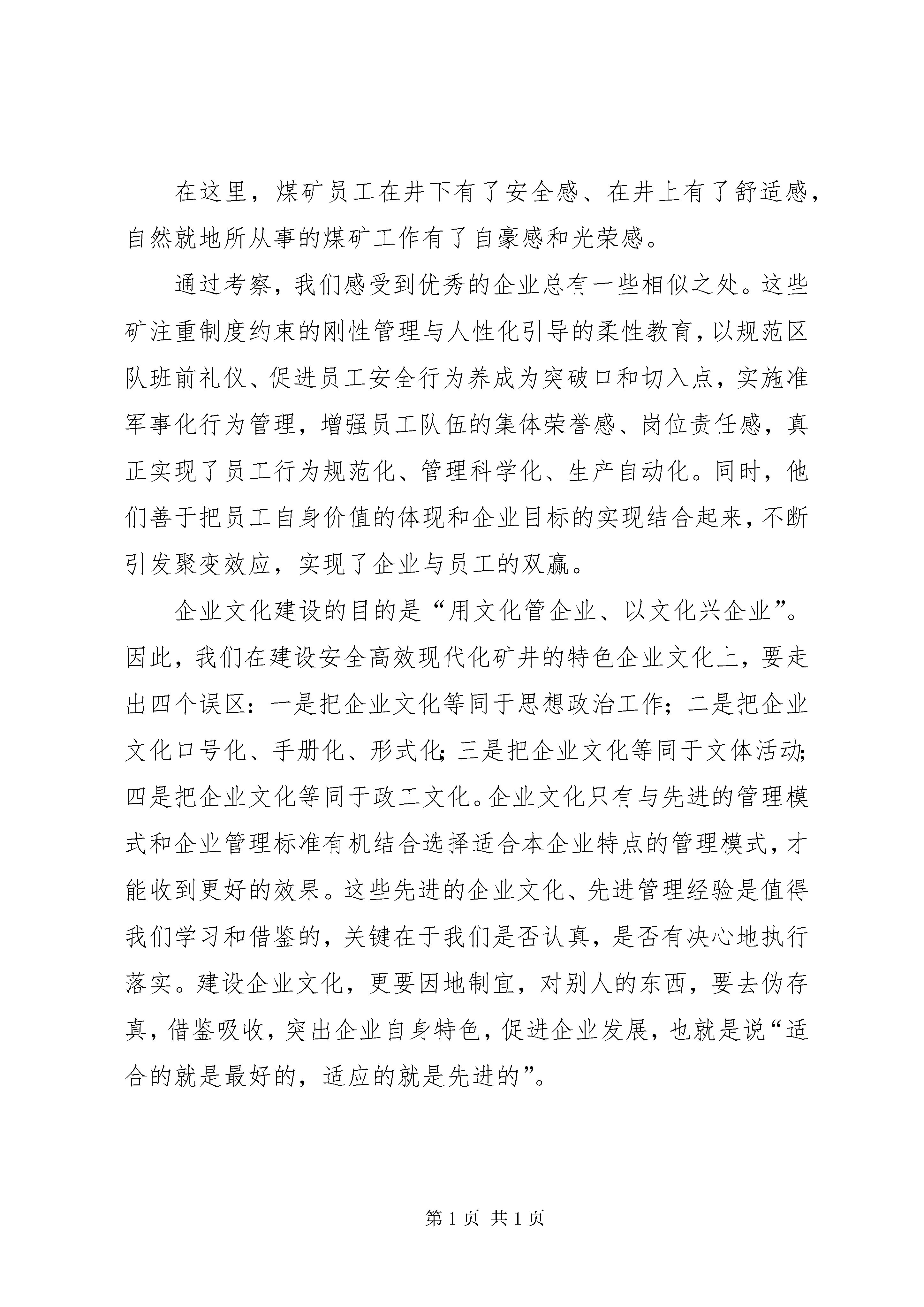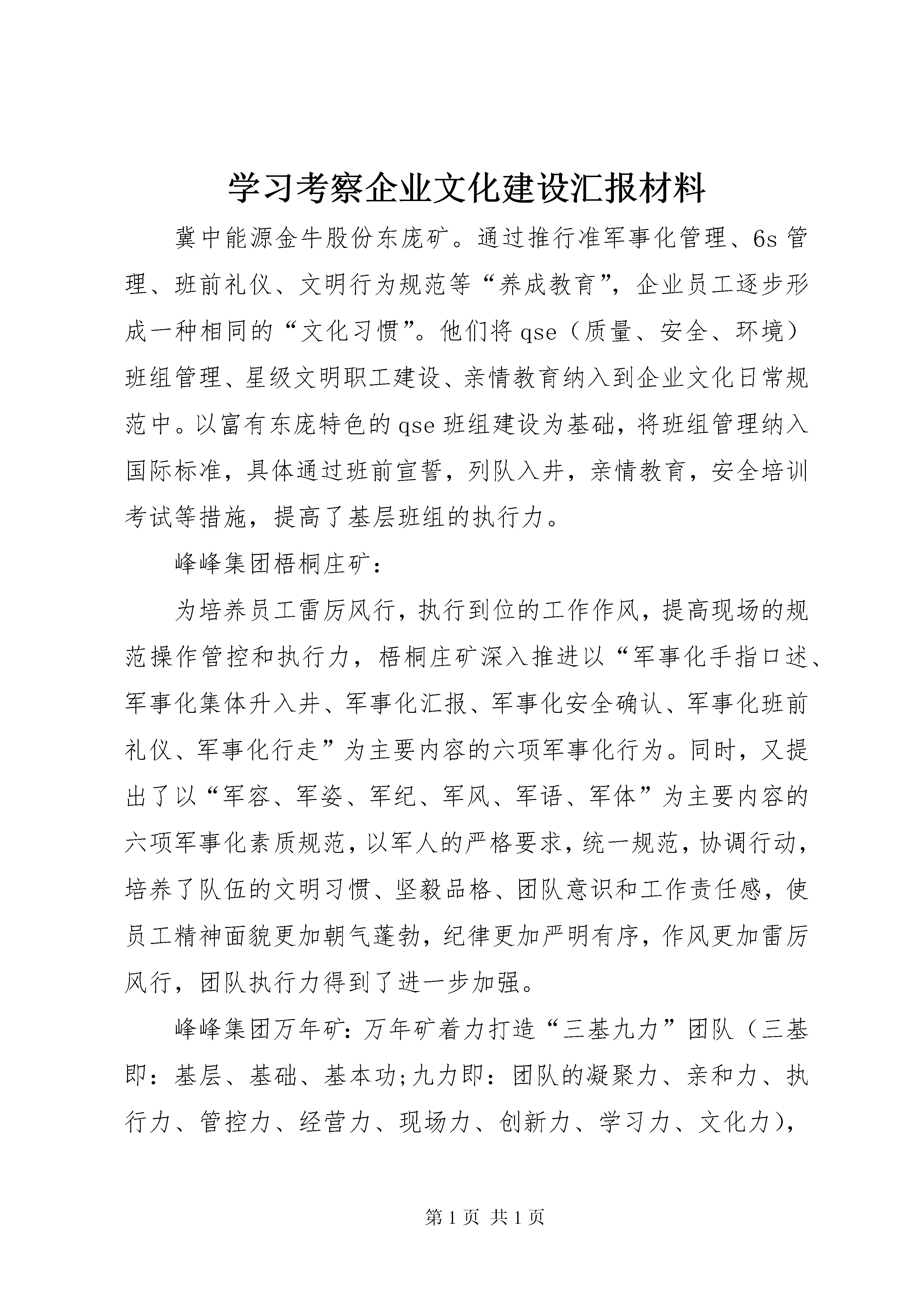 学习考察企业文化建设汇报材料冀中能源金牛股份东庞矿。通过推行准军事化管理、6s管理、班前礼仪、文明行为规范等“养成教育”,企业员工逐步形成一种相同的“文化习惯”。他们将qse(质量、安全、环境)班组管理、星级文明职工建设、亲情教育纳入到企业文化日常规范中。以富有东庞特色的qse班组建设为基础,将班组管理纳入国际标准,具体通过班前宣誓,列队入井,亲情教育,安全培训考试等措施,提高了基层班组的执行力。峰峰集团梧桐庄矿:为培养员工雷厉风行,执行到位的工作作风,提高现场的规范操作管控和执行力,梧桐庄矿深入推进以“军事化手指口述、军事化集体升入井、军事化汇报、军事化安全确认、军事化班前礼仪、军事化行走”为主要内容的六项军事化行为。同时,又提出了以“军容、军姿、军纪、军风、军语、军体”为主要内容的六项军事化素质规范,以军人的严格要求,统一规范,协调行动,培养了队伍的文明习惯、坚毅品格、团队意识和工作责任感,使员工精神面貌更加朝气蓬勃,纪律更加严明有序,作风更加雷厉风行,团队执行力得到了进一步加强。峰峰集团万年矿:万年矿着力打造“三基九力”团队(三基即:基层、基础、基本功;九力即:团队的凝聚力、亲和力、执行力、管控力、经营力、现场力、创新力、学习力、文化力),全力推进精细化管理,要求每一个人做每一件事在每一个时间每一个地点都要达到相应的标准,做到“周密设定,环环紧扣”,避免工作上的失误,提升工作效率和工作质量。初步建成了“工作学习化、行动军事化、管理精细化、质量标准化、生产安全化、操作正规化”的“六化”型矿井。开滦集团钱家营矿。钱家营矿将员工的日常生活行为起居纳入到行为养成管理,组织员工收看“商务礼仪”电教片,进一步提高员工的素质和XX县区文明程度。同时,把管理理念和企业文化建设向安全、经营、机关、行业特色延伸,全面实施高标准作业、模式化管理。将专业间性质相同的单位、部位、环节以及各系统中同一工种居于前列的标准和管理方法进行总结提炼,形成一套科学系统的操作标准、工作流程和管理规范,统一各专业性质相同单位、部位、岗位、环节的生产经营活动。通过实施高标模式,促进了员工行为养成,安全环境有了新的提升。通过考察几个矿,我们看到只要有两个以上的职工在行走,他们总是自觉地排成一列,并且成为一种习惯,这几个矿的准军化管理收到了实际的效果。来到河北、宁夏的煤矿,最大的感受就是这里的员工对企业充满了荣誉感和自豪感。一是职工收入高。两个地区的几个矿员工年均收入都在5万元以上。在当地,能够在国企煤矿工作是很值得骄傲的事情。两省均属于人多地少以农业为主的省份,务农收入与在煤矿工作收入有一定的差距,这也和我们东北煤矿召工困难,召上来又留不住形成了鲜明的对比。二是工作待遇好。一线职工的营养餐在河北冀中集团已经全面推开,在宁夏石沟驿矿员工在作面可以吃到热气腾腾的可口盒饭菜。如:梧桐庄矿针对井下高温环境,投资1400万元在井下安装了国际先进的制冷设备,为每位员工增发了两套短袖工作服;购置了豪华通勤班车,建成了高档典雅,塑胶铺地的灯光球场和健身场。为补充井下员工体能,免费为员工发放了班中餐,改善员工的生活环境。在东庞矿,职工图书馆藏书万卷,职工阅览室订阅杂志、报纸60多份,塑胶羽毛球场地、室内乒乓球场地、象棋室、围棋室、纸牌室、麻将室、桌球室一应俱全,已经开辟休闲健身场所4处,安装体育健身器材百余件。这些不但是人本管理中的人性体现,让员工感受到自己就是企业的主人翁。三是安全效果佳。员工的生命安全得到了保障。考察的几个矿都非常注重安全管理工作,坚持“依法从严治矿”,按照“培育煤矿安全文化,塑造本质安全人”的要求,把安全文化建设作为企业文化建设的主体,规范员工安全行为。企业加大对安全软硬件的投入,加强安全培训工作,确保实现安全高效。如:峰峰集团万年矿截止2010年10月,已经连续安全生产xx天以上;冀中能源东庞矿截止2010年11月已顺利实现安全生产1400天。在这里,煤矿员工在井下有了安全感、在井上有了舒适感,自然就地所从事的煤矿工作有了自豪感和光荣感。通过考察,我们感受到优秀的企业总有一些相似之处。这些矿注重制度约束的刚性管理与人性化引导的柔性教育,以规范区队班前礼仪、促进员工安全行为养成为突破口和切入点,实施准军事化行为管理,增强员工队伍的集体荣誉感、岗位责任感,真正实现了员工行为规范化、管理科学化、生产自动化。同时,他们善于把员工自身价值的体现和企业目标的实现结合起来,不断引发聚变效应,实现了企业与员工的双赢。企业文化建设的目的是“用文化管企业、以文化兴企业”。因此,我们在建设安全高效现代化矿井的特色企业文化上,要走出四个误区:一是把企业文化等同于思想政治工作;二是把企业文化口号化、手册化、形式化;三是把企业文化等同于文体活动;四是把企业文化等