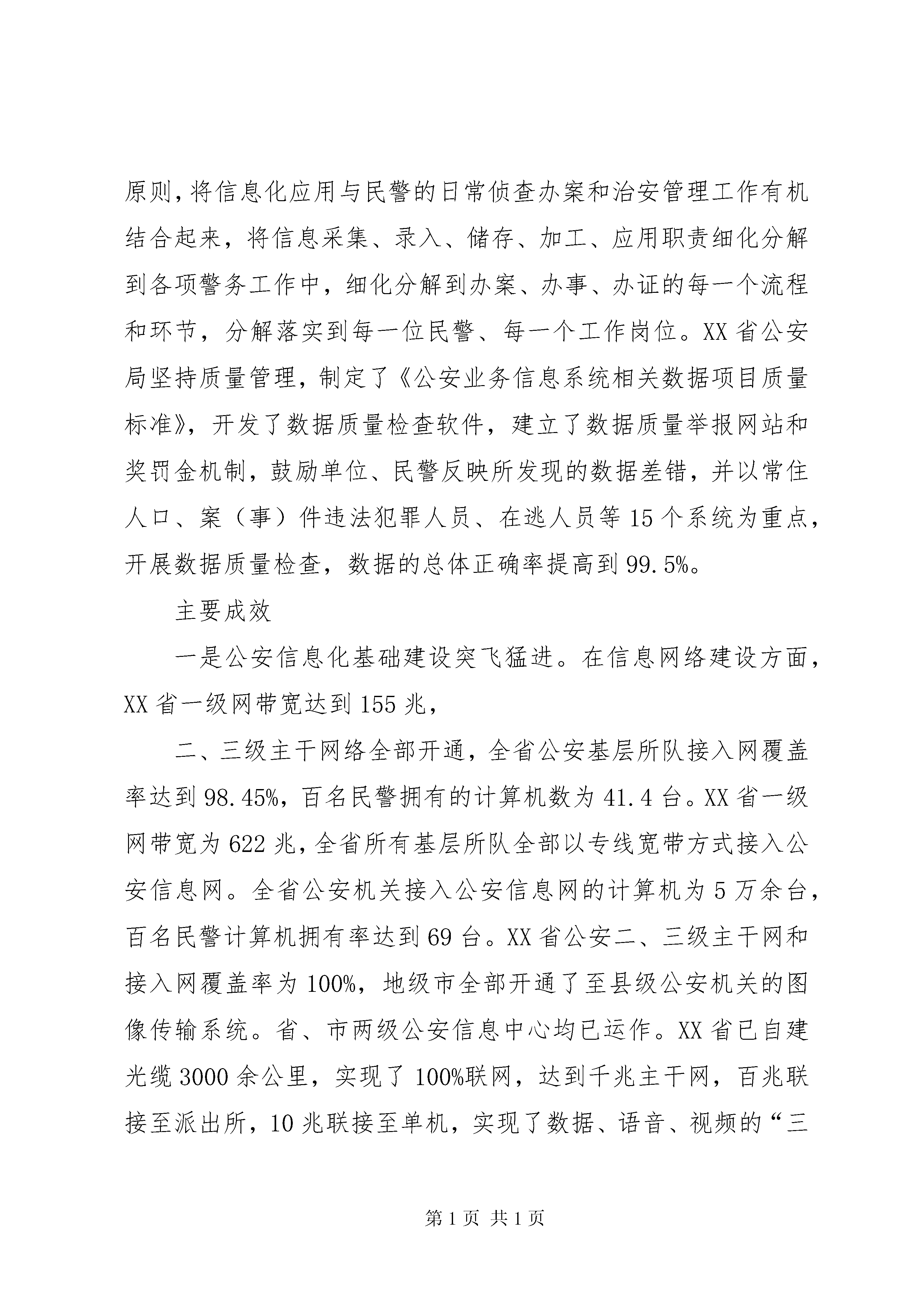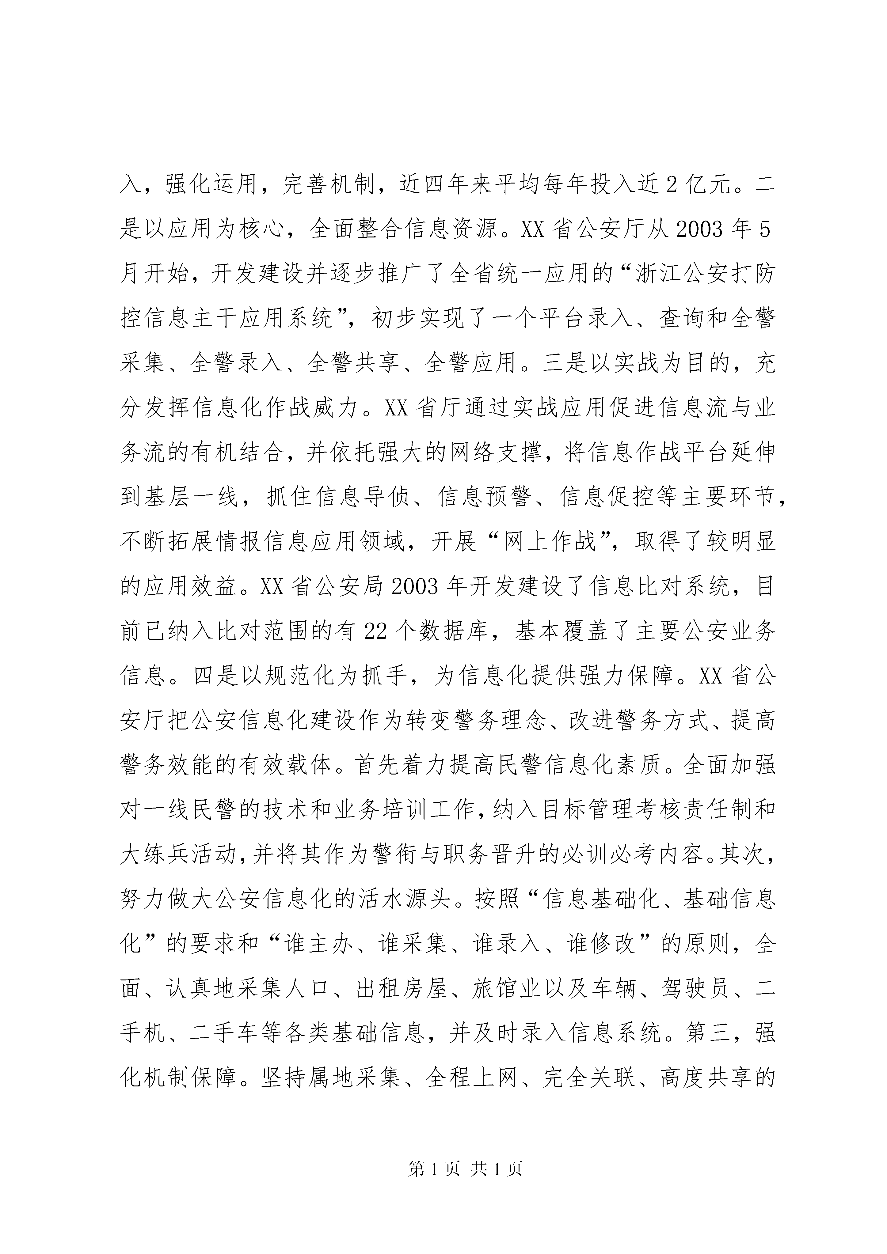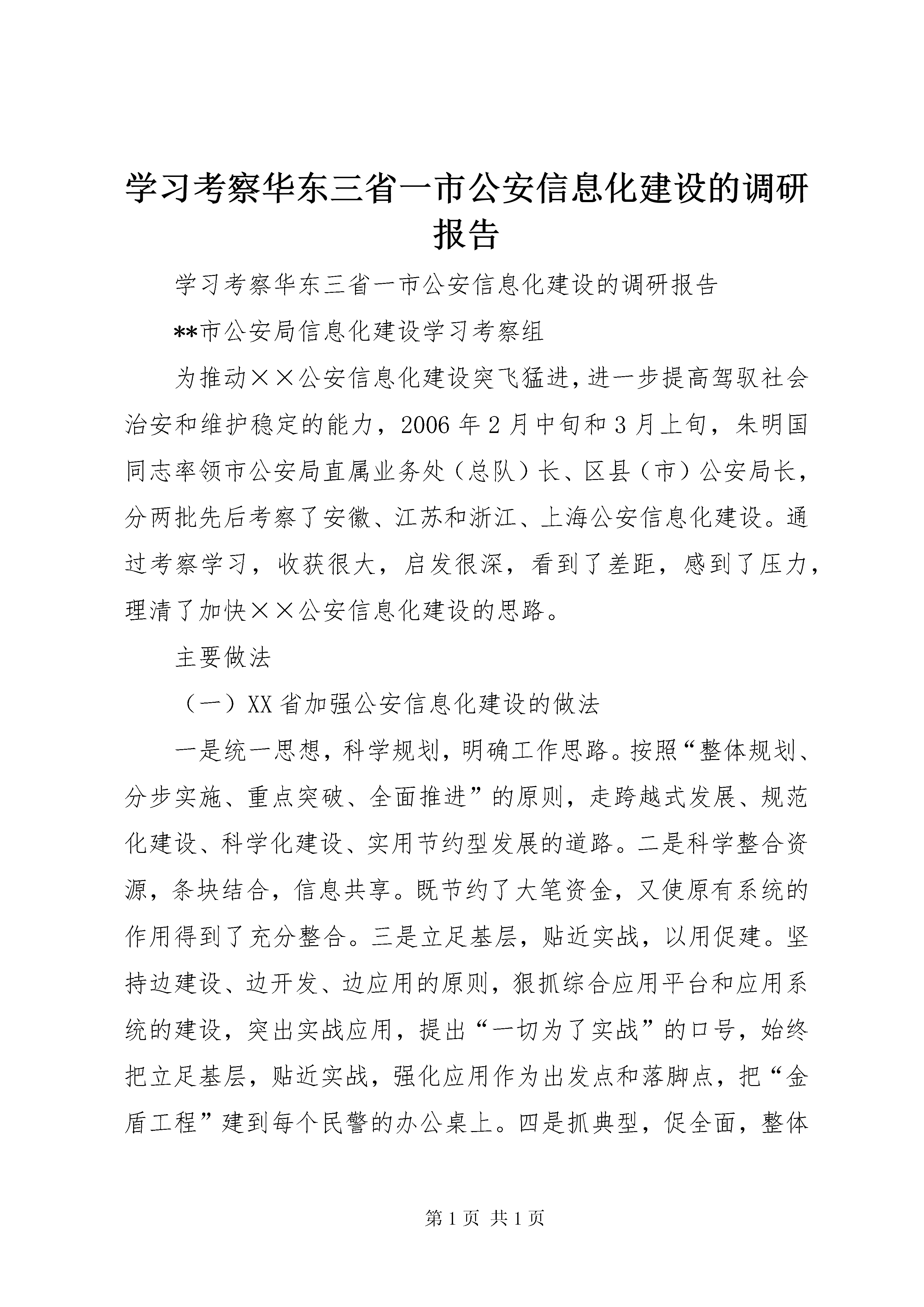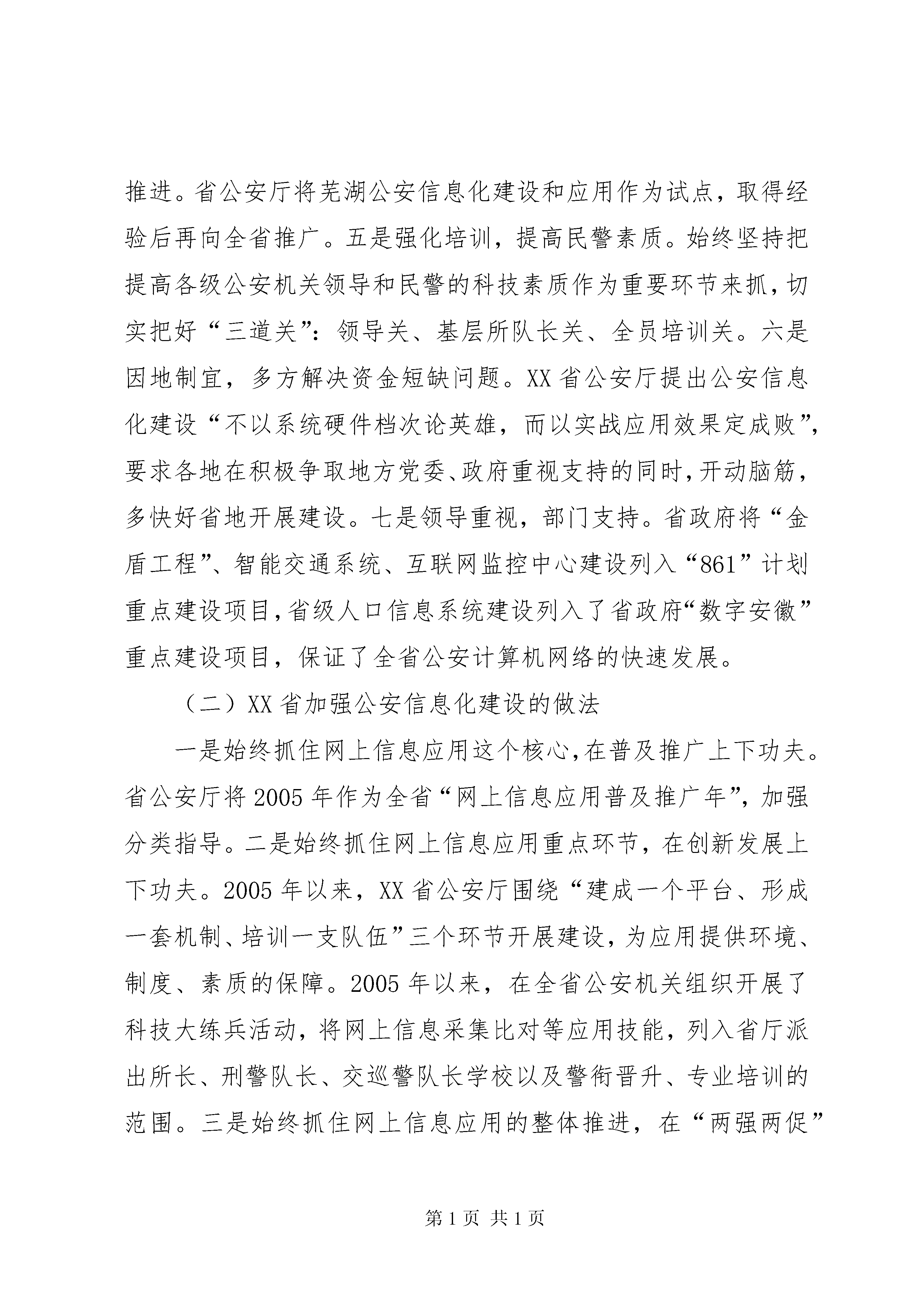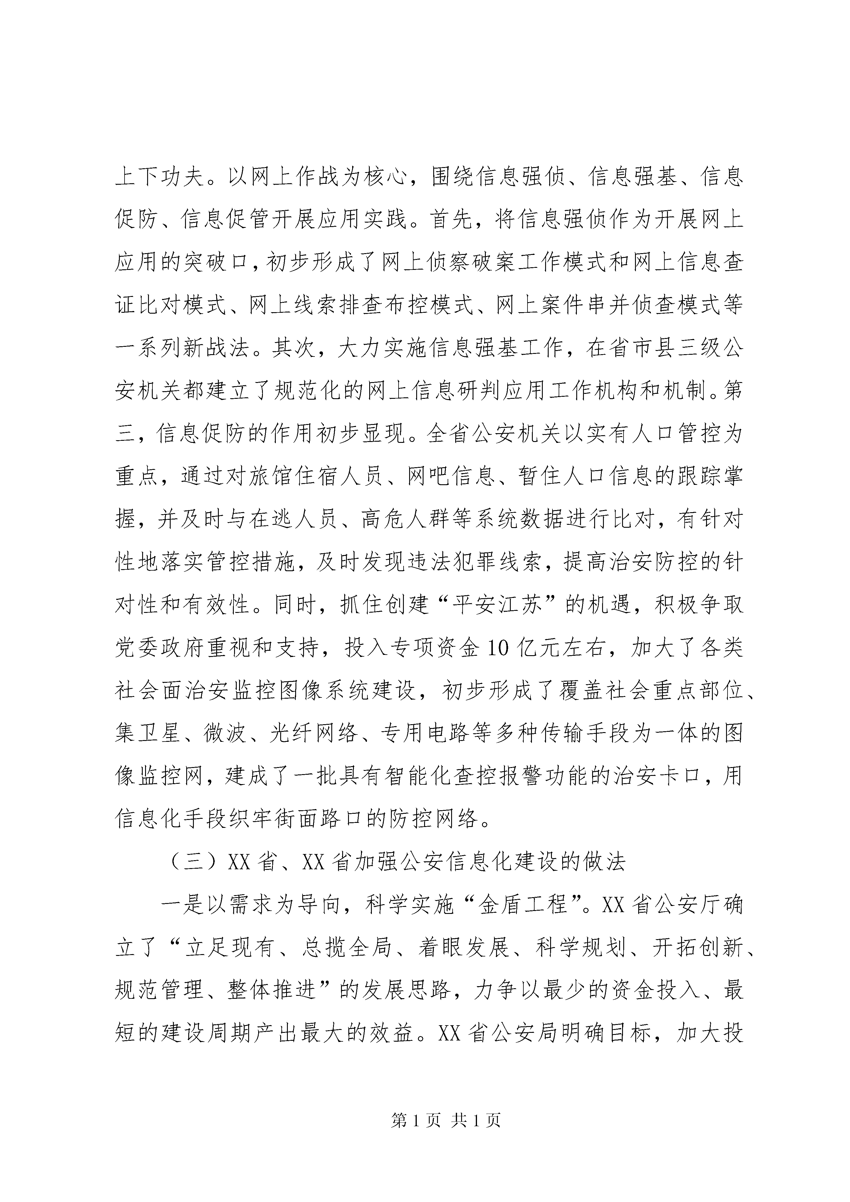 学习考察华东三省一市公安信息化建设的调研报告学习考察华东三省一市公安信息化建设的调研报告**市公安局信息化建设学习考察组为推动××公安信息化建设突飞猛进,进一步提高驾驭社会治安和维护稳定的能力,2006年2月中旬和3月上旬,朱明国同志率领市公安局直属业务处(总队)长、区县(市)公安局长,分两批先后考察了安徽、江苏和浙江、上海公安信息化建设。通过考察学习,收获很大,启发很深,看到了差距,感到了压力,理清了加快××公安信息化建设的思路。主要做法(一)XX省加强公安信息化建设的做法一是统一思想,科学规划,明确工作思路。按照“整体规划、分步实施、重点突破、全面推进”的原则,走跨越式发展、规范化建设、科学化建设、实用节约型发展的道路。二是科学整合资源,条块结合,信息共享。既节约了大笔资金,又使原有系统的作用得到了充分整合。三是立足基层,贴近实战,以用促建。坚持边建设、边开发、边应用的原则,狠抓综合应用平台和应用系统的建设,突出实战应用,提出“一切为了实战”的口号,始终把立足基层,贴近实战,强化应用作为出发点和落脚点,把“金盾工程”建到每个民警的办公桌上。四是抓典型,促全面,整体推进。省公安厅将芜湖公安信息化建设和应用作为试点,取得经验后再向全省推广。五是强化培训,提高民警素质。始终坚持把提高各级公安机关领导和民警的科技素质作为重要环节来抓,切实把好“三道关”:领导关、基层所队长关、全员培训关。六是因地制宜,多方解决资金短缺问题。XX省公安厅提出公安信息化建设“不以系统硬件档次论英雄,而以实战应用效果定成败”,要求各地在积极争取地方党委、政府重视支持的同时,开动脑筋,多快好省地开展建设。七是领导重视,部门支持。省政府将“金盾工程”、智能交通系统、互联网监控中心建设列入“861”计划重点建设项目,省级人口信息系统建设列入了省政府“数字安徽”重点建设项目,保证了全省公安计算机网络的快速发展。(二)XX省加强公安信息化建设的做法一是始终抓住网上信息应用这个核心,在普及推广上下功夫。省公安厅将2005年作为全省“网上信息应用普及推广年”,加强分类指导。二是始终抓住网上信息应用重点环节,在创新发展上下功夫。2005年以来,XX省公安厅围绕“建成一个平台、形成一套机制、培训一支队伍”三个环节开展建设,为应用提供环境、制度、素质的保障。2005年以来,在全省公安机关组织开展了科技大练兵活动,将网上信息采集比对等应用技能,列入省厅派出所长、刑警队长、交巡警队长学校以及警衔晋升、专业培训的范围。三是始终抓住网上信息应用的整体推进,在“两强两促”上下功夫。以网上作战为核心,围绕信息强侦、信息强基、信息促防、信息促管开展应用实践。首先,将信息强侦作为开展网上应用的突破口,初步形成了网上侦察破案工作模式和网上信息查证比对模式、网上线索排查布控模式、网上案件串并侦查模式等一系列新战法。其次,大力实施信息强基工作,在省市县三级公安机关都建立了规范化的网上信息研判应用工作机构和机制。第三,信息促防的作用初步显现。全省公安机关以实有人口管控为重点,通过对旅馆住宿人员、网吧信息、暂住人口信息的跟踪掌握,并及时与在逃人员、高危人群等系统数据进行比对,有针对性地落实管控措施,及时发现违法犯罪线索,提高治安防控的针对性和有效性。同时,抓住创建“平安江苏”的机遇,积极争取党委政府重视和支持,投入专项资金10亿元左右,加大了各类社会面治安监控图像系统建设,初步形成了覆盖社会重点部位、集卫星、微波、光纤网络、专用电路等多种传输手段为一体的图像监控网,建成了一批具有智能化查控报警功能的治安卡口,用信息化手段织牢街面路口的防控网络。(三)XX省、XX省加强公安信息化建设的做法一是以需求为导向,科学实施“金盾工程”。XX省公安厅确立了“立足现有、总揽全局、着眼发展、科学规划、开拓创新、规范管理、整体推进”的发展思路,力争以最少的资金投入、最短的建设周期产出最大的效益。XX省公安局明确目标,加大投入,强化运用,完善机制,近四年来平均每年投入近2亿元。二是以应用为核心,全面整合信息资源。XX省公安厅从2003年5月开始,开发建设并逐步推广了全省统一应用的“浙江公安打防控信息主干应用系统”,初步实现了一个平台录入、查询和全警采集、全警录入、全警共享、全警应用。三是以实战为目的,充分发挥信息化作战威力。XX省厅通过实战应用促进信息流与业务流的有机结合,并依托强大的网络支撑,将信息作战平台延伸到基层一线,抓住信息导侦、信息预警、信息促控等主要环节,不断拓展情报信息应用领域,开展“网上作战”,取得了较明显的应用效益。XX省公安局2003年开发建设了信息比对系统,目前已纳入比对范围的有22个数据库,基本覆盖了主要公安业务信息。四是以规范化为抓手,为信息化提供强力保障。XX省公安
