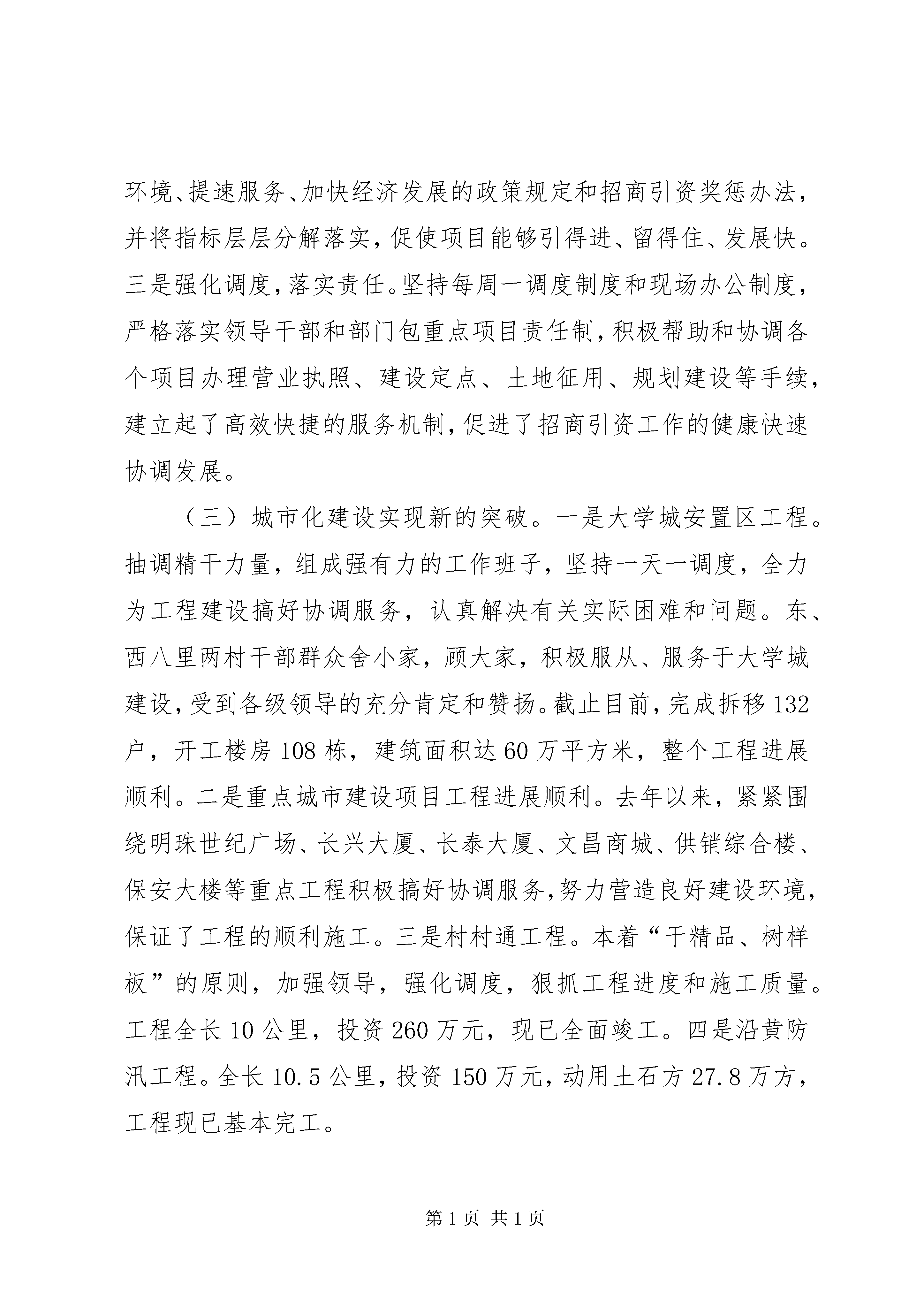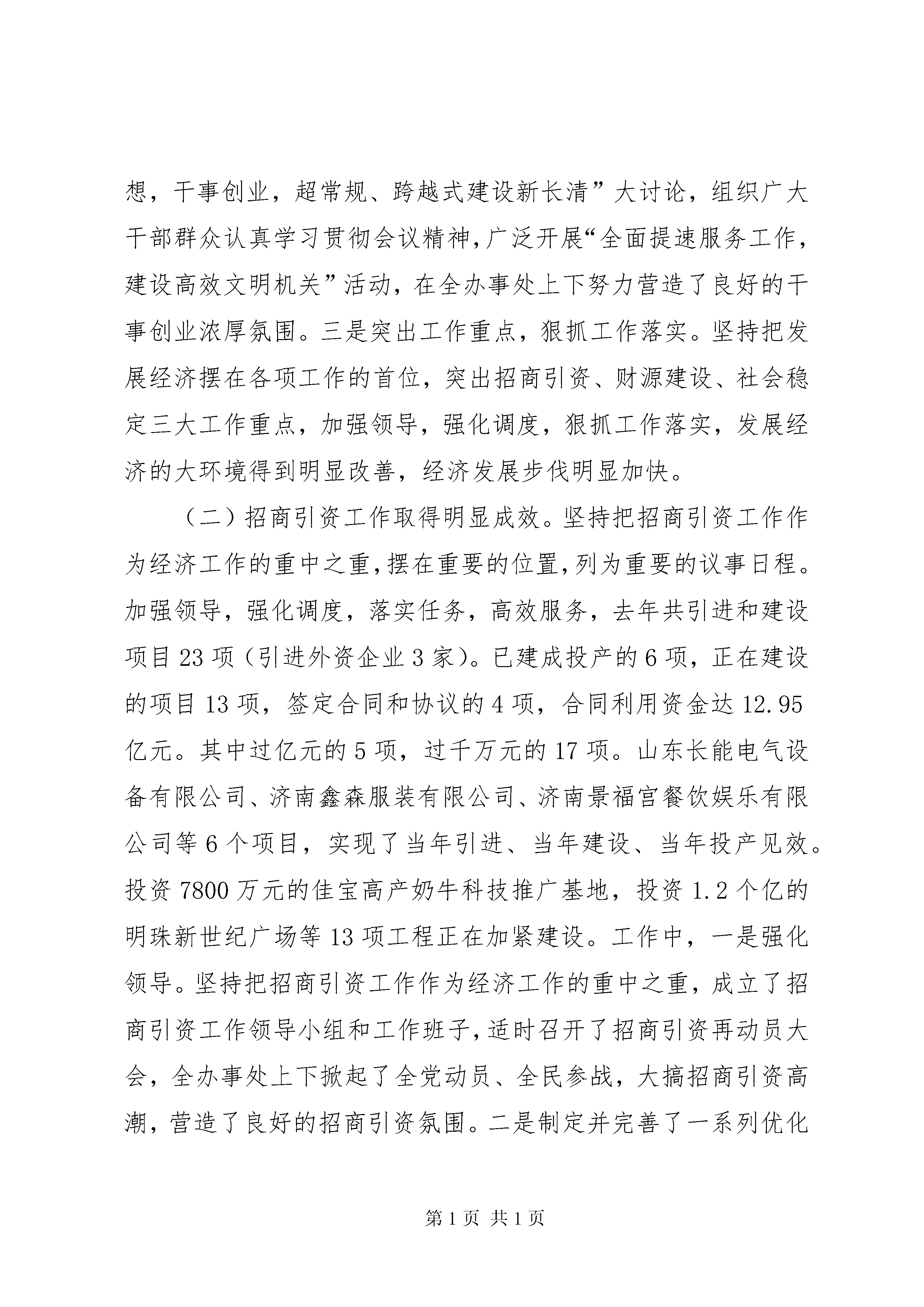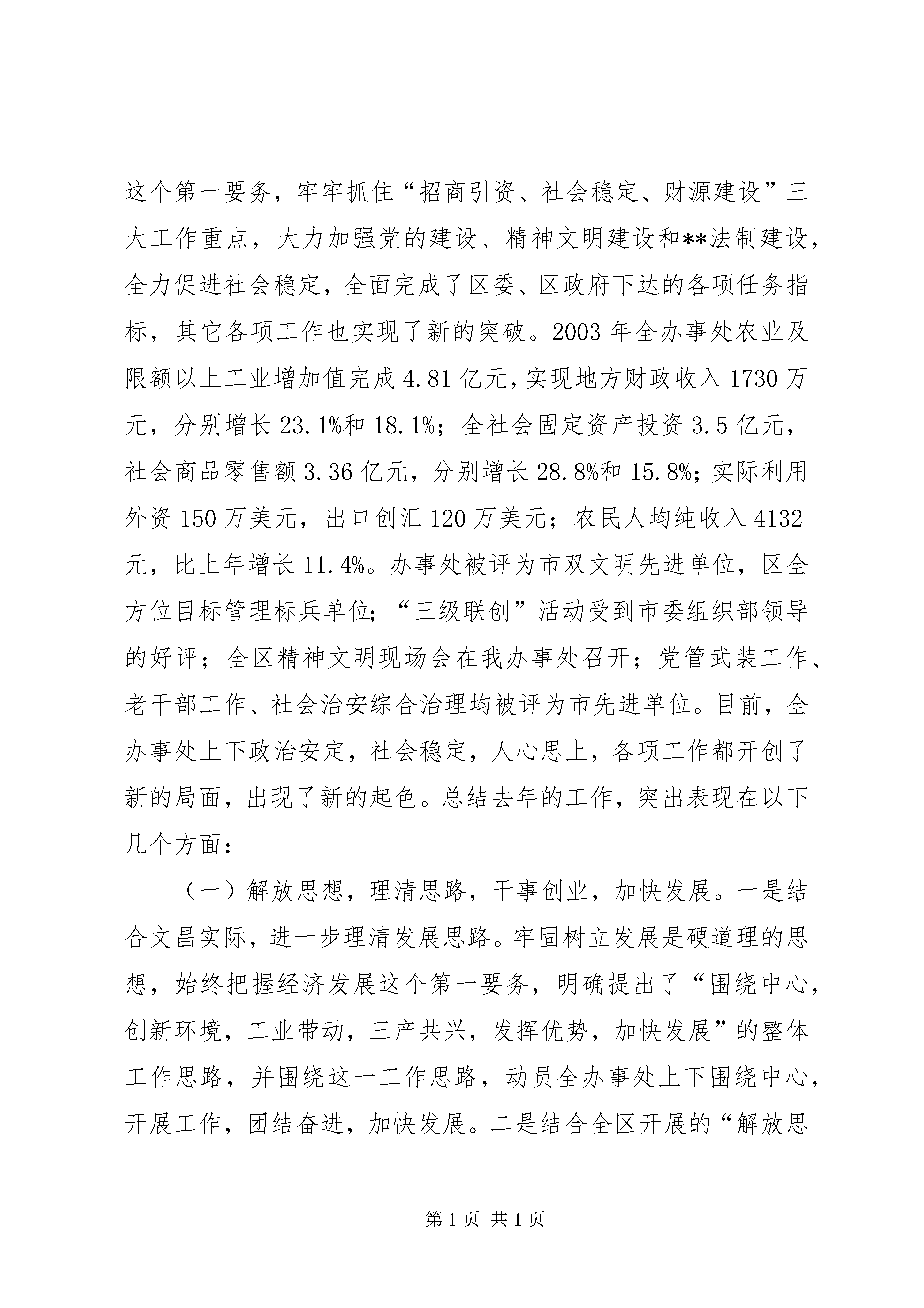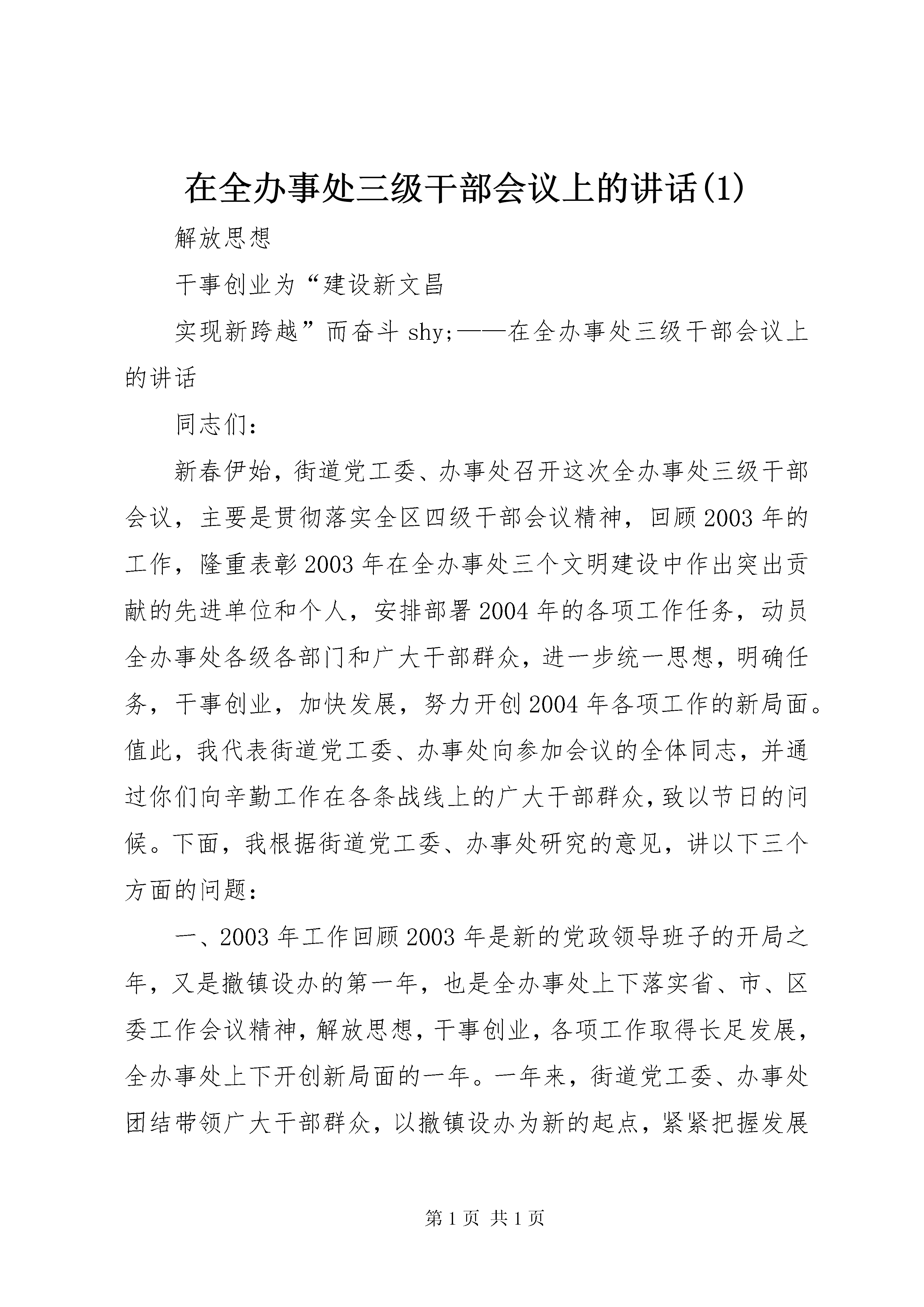 在全办事处三级干部会议上的讲话(1)解放思想干事创业为“建设新文昌实现新跨越”而奋斗shy;——在全办事处三级干部会议上的讲话同志们:新春伊始,街道党工委、办事处召开这次全办事处三级干部会议,主要是贯彻落实全区四级干部会议精神,回顾2003年的工作,隆重表彰2003年在全办事处三个文明建设中作出突出贡献的先进单位和个人,安排部署2004年的各项工作任务,动员全办事处各级各部门和广大干部群众,进一步统一思想,明确任务,干事创业,加快发展,努力开创2004年各项工作的新局面。值此,我代表街道党工委、办事处向参加会议的全体同志,并通过你们向辛勤工作在各条战线上的广大干部群众,致以节日的问候。下面,我根据街道党工委、办事处研究的意见,讲以下三个方面的问题:一、2003年工作回顾2003年是新的党政领导班子的开局之年,又是撤镇设办的第一年,也是全办事处上下落实省、市、区委工作会议精神,解放思想,干事创业,各项工作取得长足发展,全办事处上下开创新局面的一年。一年来,街道党工委、办事处团结带领广大干部群众,以撤镇设办为新的起点,紧紧把握发展这个第一要务,牢牢抓住“招商引资、社会稳定、财源建设”三大工作重点,大力加强党的建设、精神文明建设和**法制建设,全力促进社会稳定,全面完成了区委、区政府下达的各项任务指标,其它各项工作也实现了新的突破。2003年全办事处农业及限额以上工业增加值完成4.81亿元,实现地方财政收入1730万元,分别增长23.1%和18.1%;全社会固定资产投资3.5亿元,社会商品零售额3.36亿元,分别增长28.8%和15.8%;实际利用外资150万美元,出口创汇120万美元;农民人均纯收入4132元,比上年增长11.4%。办事处被评为市双文明先进单位,区全方位目标管理标兵单位;“三级联创”活动受到市委组织部领导的好评;全区精神文明现场会在我办事处召开;党管武装工作、老干部工作、社会治安综合治理均被评为市先进单位。目前,全办事处上下政治安定,社会稳定,人心思上,各项工作都开创了新的局面,出现了新的起色。总结去年的工作,突出表现在以下几个方面:(一)解放思想,理清思路,干事创业,加快发展。一是结合文昌实际,进一步理清发展思路。牢固树立发展是硬道理的思想,始终把握经济发展这个第一要务,明确提出了“围绕中心,创新环境,工业带动,三产共兴,发挥优势,加快发展”的整体工作思路,并围绕这一工作思路,动员全办事处上下围绕中心,开展工作,团结奋进,加快发展。二是结合全区开展的“解放思想,干事创业,超常规、跨越式建设新长清”大讨论,组织广大干部群众认真学习贯彻会议精神,广泛开展“全面提速服务工作,建设高效文明机关”活动,在全办事处上下努力营造了良好的干事创业浓厚氛围。三是突出工作重点,狠抓工作落实。坚持把发展经济摆在各项工作的首位,突出招商引资、财源建设、社会稳定三大工作重点,加强领导,强化调度,狠抓工作落实,发展经济的大环境得到明显改善,经济发展步伐明显加快。(二)招商引资工作取得明显成效。坚持把招商引资工作作为经济工作的重中之重,摆在重要的位置,列为重要的议事日程。加强领导,强化调度,落实任务,高效服务,去年共引进和建设项目23项(引进外资企业3家)。已建成投产的6项,正在建设的项目13项,签定合同和协议的4项,合同利用资金达12.95亿元。其中过亿元的5项,过千万元的17项。山东长能电气设备有限公司、济南鑫森服装有限公司、济南景福宫餐饮娱乐有限公司等6个项目,实现了当年引进、当年建设、当年投产见效。投资7800万元的佳宝高产奶牛科技推广基地,投资1.2个亿的明珠新世纪广场等13项工程正在加紧建设。工作中,一是强化领导。坚持把招商引资工作作为经济工作的重中之重,成立了招商引资工作领导小组和工作班子,适时召开了招商引资再动员大会,全办事处上下掀起了全党动员、全民参战,大搞招商引资高潮,营造了良好的招商引资氛围。二是制定并完善了一系列优化环境、提速服务、加快经济发展的政策规定和招商引资奖惩办法,并将指标层层分解落实,促使项目能够引得进、留得住、发展快。三是强化调度,落实责任。坚持每周一调度制度和现场办公制度,严格落实领导干部和部门包重点项目责任制,积极帮助和协调各个项目办理营业执照、建设定点、土地征用、规划建设等手续,建立起了高效快捷的服务机制,促进了招商引资工作的健康快速协调发展。(三)城市化建设实现新的突破。一是大学城安置区工程。抽调精干力量,组成强有力的工作班子,坚持一天一调度,全力为工程建设搞好协调服务,认真解决有关实际困难和问题。东、西八里两村干部群众舍小家,顾大家,积极服从、服务于大学城建设,受到各级领导的充分肯定和赞扬。截止目前,完成拆移132户,开工楼房108栋,建筑面积达60万平方米,整个工程进展