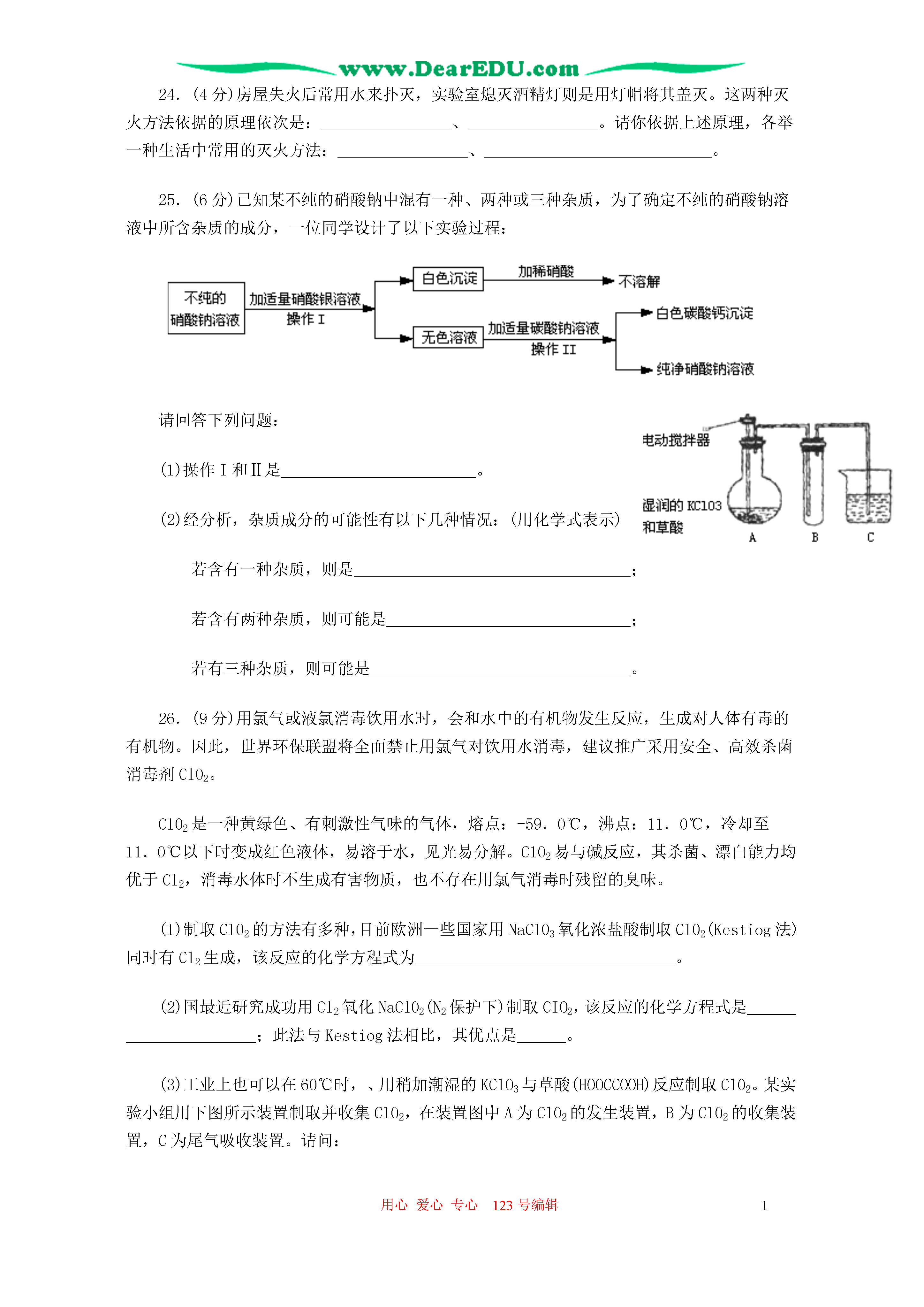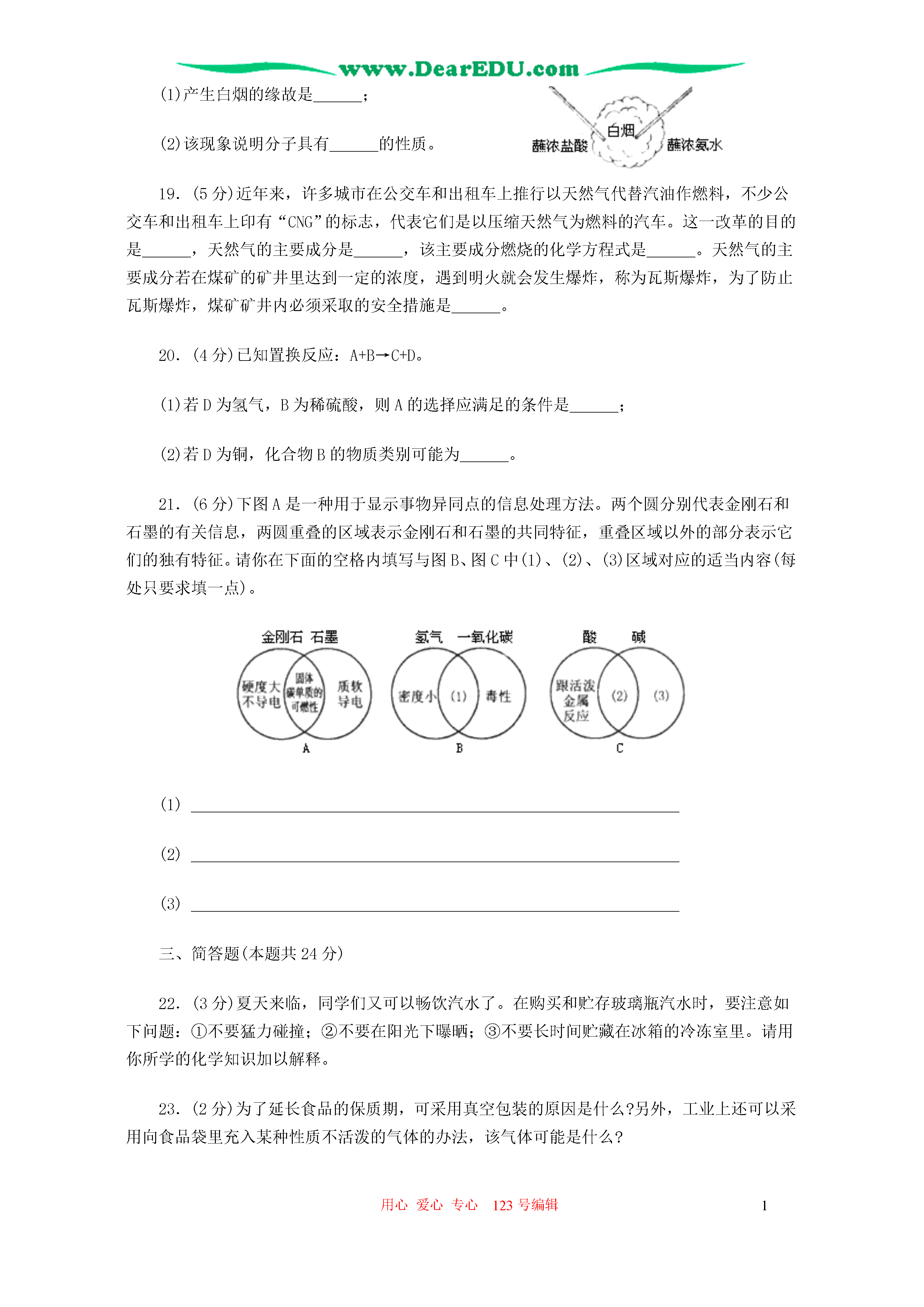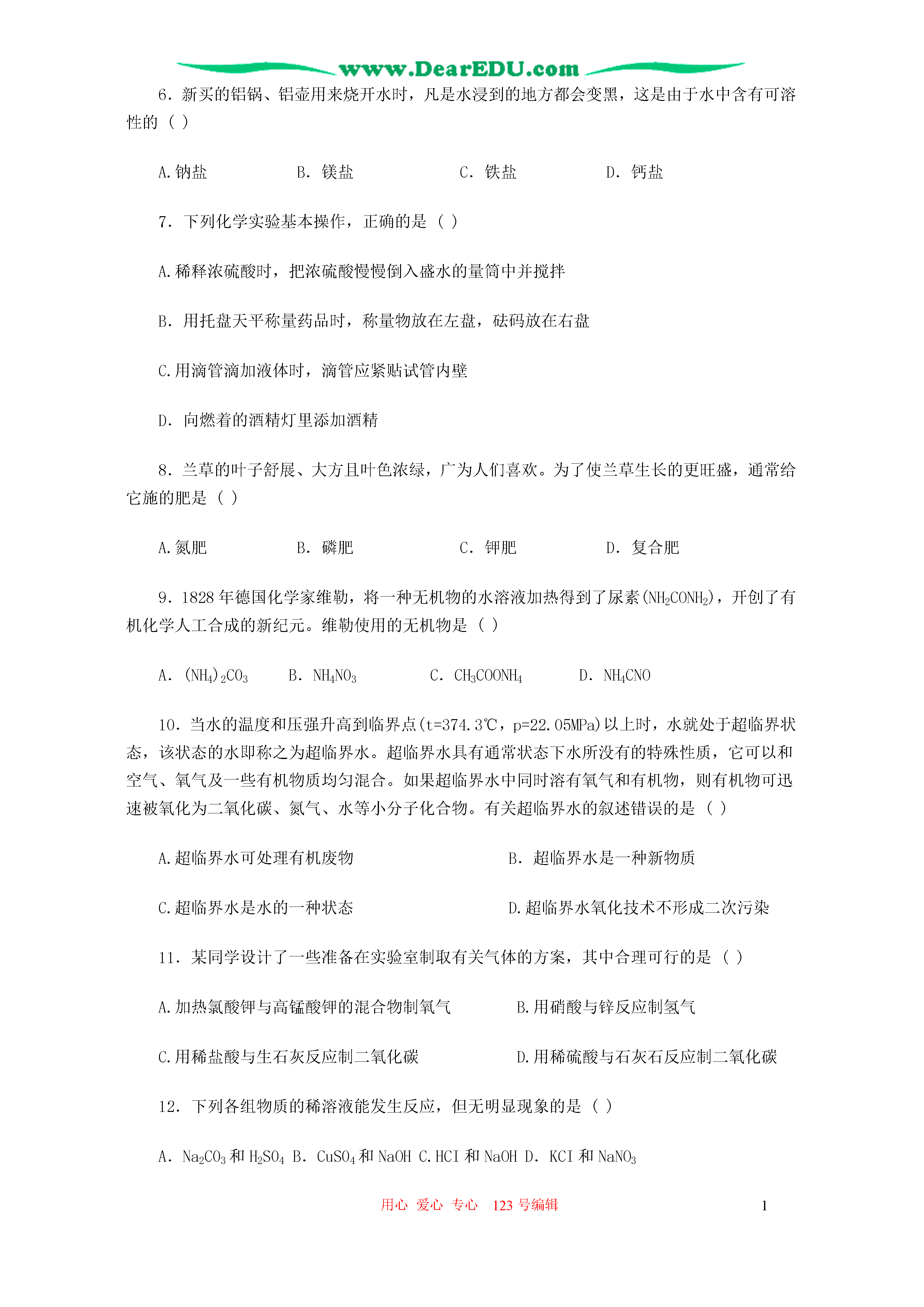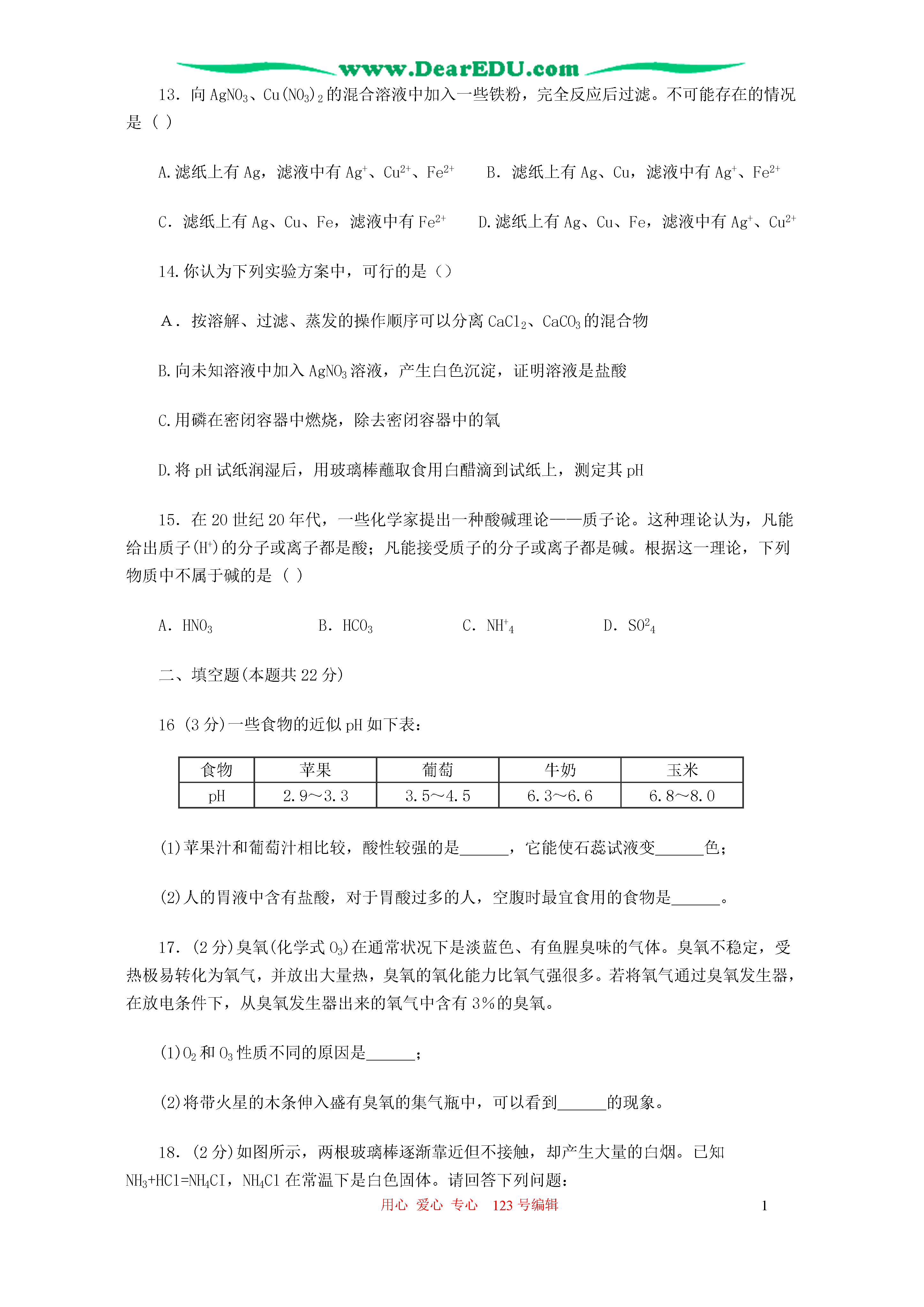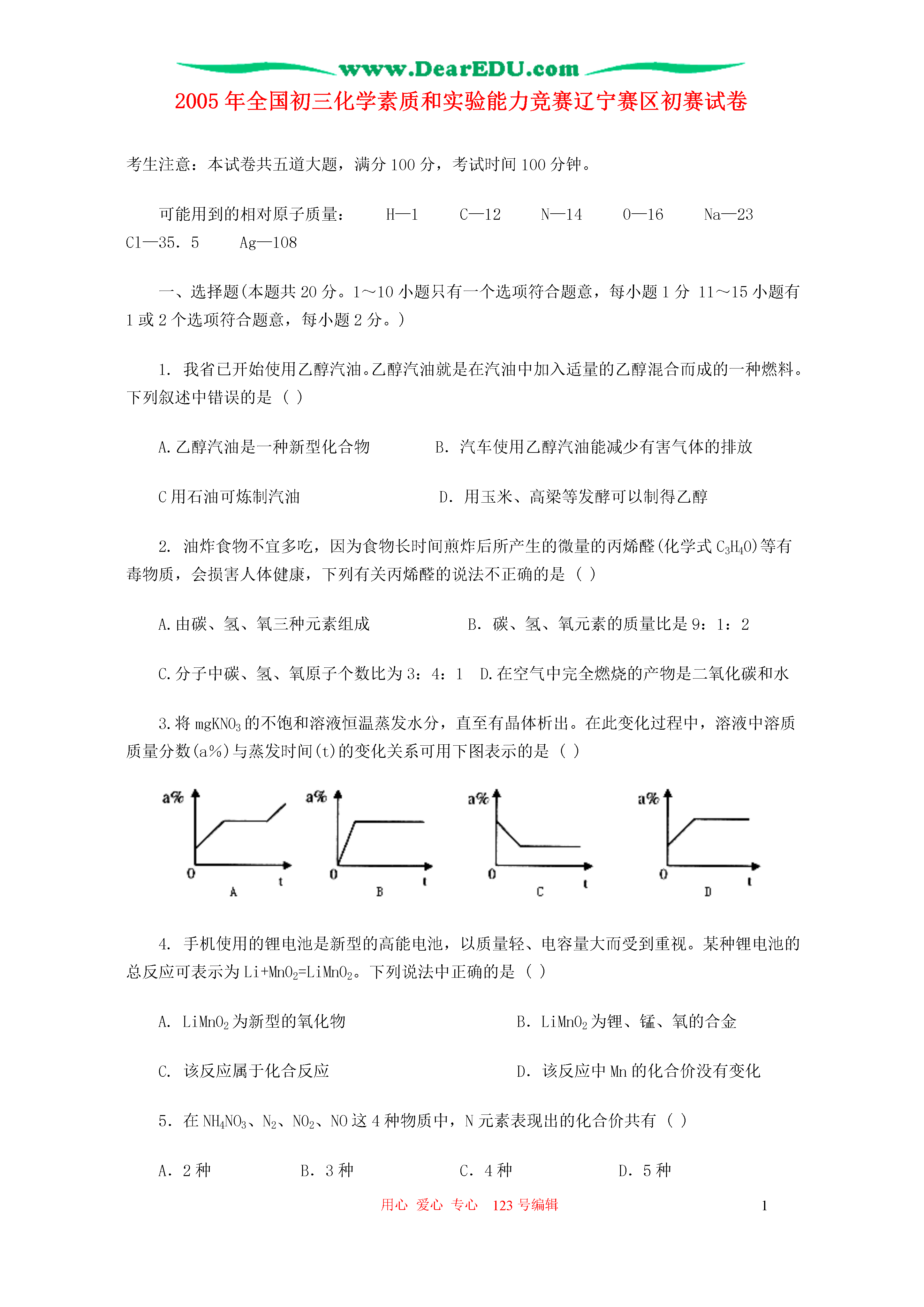 用心爱心专心123号编辑12005年全国初三化学素质和实验能力竞赛辽宁赛区初赛试卷考生注意:本试卷共五道大题,满分100分,考试时间100分钟。可能用到的相对原子质量:H—1C—12N—140—16Na—23Cl—35.5Ag—108一、选择题(本题共20分。1~10小题只有一个选项符合题意,每小题1分11~15小题有1或2个选项符合题意,每小题2分。)1.我省已开始使用乙醇汽油。乙醇汽油就是在汽油中加入适量的乙醇混合而成的一种燃料。下列叙述中错误的是()A.乙醇汽油是一种新型化合物B.汽车使用乙醇汽油能减少有害气体的排放C用石油可炼制汽油D.用玉米、高梁等发酵可以制得乙醇2.油炸食物不宜多吃,因为食物长时间煎炸后所产生的微量的丙烯醛(化学式C3H40)等有毒物质,会损害人体健康,下列有关丙烯醛的说法不正确的是()A.由碳、氢、氧三种元素组成B.碳、氢、氧元素的质量比是9:1:2C.分子中碳、氢、氧原子个数比为3:4:1D.在空气中完全燃烧的产物是二氧化碳和水3.将mgKN03的不饱和溶液恒温蒸发水分,直至有晶体析出。在此变化过程中,溶液中溶质质量分数(a%)与蒸发时间(t)的变化关系可用下图表示的是()4.手机使用的锂电池是新型的高能电池,以质量轻、电容量大而受到重视。某种锂电池的总反应可表示为Li+Mn02=LiMn02。下列说法中正确的是()A.LiMn02为新型的氧化物B.LiMn02为锂、锰、氧的合金C.该反应属于化合反应D.该反应中Mn的化合价没有变化5.在NH4NO3、N2、N02、NO这4种物质中,N元素表现出的化合价共有()A.2种B.3种C.4种D.5种6.新买的铝锅、铝壶用来烧开水时,凡是水浸到的地方都会变黑,这是由于水中含有可溶性的()A.钠盐B.镁盐C.铁盐D.钙盐7.下列化学实验基本操作,正确的是()A.稀释浓硫酸时,把浓硫酸慢慢倒入盛水的量筒中并搅拌B.用托盘天平称量药品时,称量物放在左盘,砝码放在右盘C.用滴管滴加液体时,滴管应紧贴试管内壁D.向燃着的酒精灯里添加酒精8.兰草的叶子舒展、大方且叶色浓绿,广为人们喜欢。为了使兰草生长的更旺盛,通常给它施的肥是()A.氮肥B.磷肥C.钾肥D.复合肥9.1828年德国化学家维勒,将一种无机物的水溶液加热得到了尿素(NH2CONH2),开创了有机化学人工合成的新纪元。维勒使用的无机物是()A.(NH4)2C03B.NH4N03C.CH3COONH4D.NH4CNO10.当水的温度和压强升高到临界点(t=374.3℃,p=22.05MPa)以上时,水就处于超临界状态,该状态的水即称之为超临界水。超临界水具有通常状态下水所没有的特殊性质,它可以和空气、氧气及一些有机物质均匀混合。如果超临界水中同时溶有氧气和有机物,则有机物可迅速被氧化为二氧化碳、氮气、水等小分子化合物。有关超临界水的叙述错误的是()A.超临界水可处理有机废物B.超临界水是一种新物质C.超临界水是水的一种状态D.超临界水氧化技术不形成二次污染11.某同学设计了一些准备在实验室制取有关气体的方案,其中合理可行的是()A.加热氯酸钾与高锰酸钾的混合物制氧气B.用硝酸与锌反应制氢气C.用稀盐酸与生石灰反应制二氧化碳D.用稀硫酸与石灰石反应制二氧化碳12.下列各组物质的稀溶液能发生反应,但无明显现象的是()A.Na2C03和H2S04B.CuS04和NaOHC.HCI和NaOHD.KCI和NaNO313.向AgN03、Cu(N03)2的混合溶液中加入一些铁粉,完全反应后过滤。不可能存在的情况是()A.滤纸上有Ag,滤液中有Ag+、Cu2+、Fe2+B.滤纸上有Ag、Cu,滤液中有Ag+、Fe2+C.滤纸上有Ag、Cu、Fe,滤液中有Fe2+D.滤纸上有Ag、Cu、Fe,滤液中有Ag+、Cu2+14.你认为下列实验方案中,可行的是()A.按溶解、过滤、蒸发的操作顺序可以分离CaCl2、CaCO3的混合物B.向未知溶液中加入AgNO3溶液,产生白色沉淀,证明溶液是盐酸C.用磷在密闭容器中燃烧,除去密闭容器中的氧D.将pH试纸润湿后,用玻璃棒蘸取食用白醋滴到试纸上,测定其pH15.在20世纪20年代,一些化学家提出一种酸碱理论——质子论。这种理论认为,凡能给出质子(H+)的分子或离子都是酸;凡能接受质子的分子或离子都是碱。根据这一理论,下列物质中不属于碱的是()A.HN03B.HC03C.NH+4D.S024二、填空题(本题共22分)16(3分)一些食物的近似pH如下表:食物苹果葡萄牛奶玉米pH2.9~3.33.5~4.56.3~6.66.8~8.0(1)苹果汁和葡萄汁相比较,酸性较强的是___,它能使石蕊