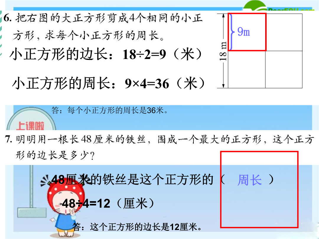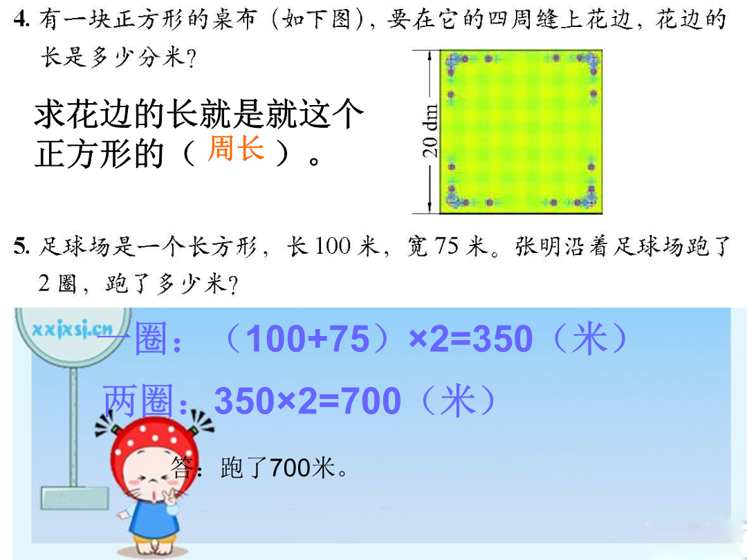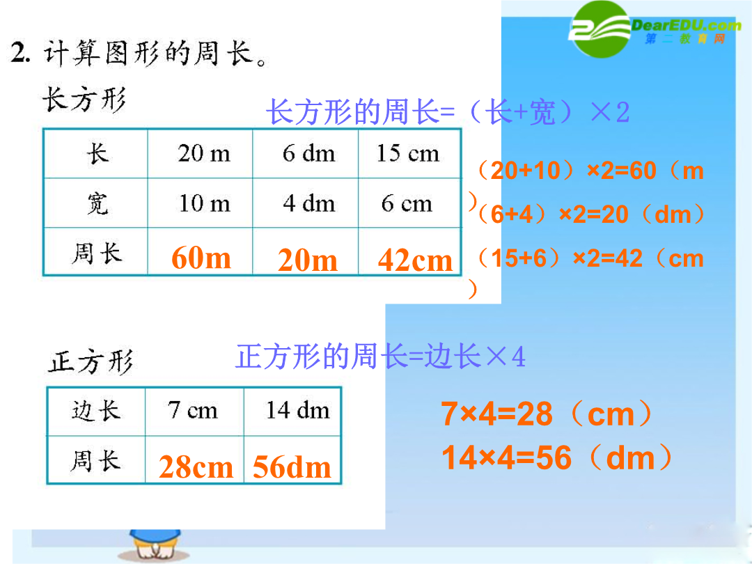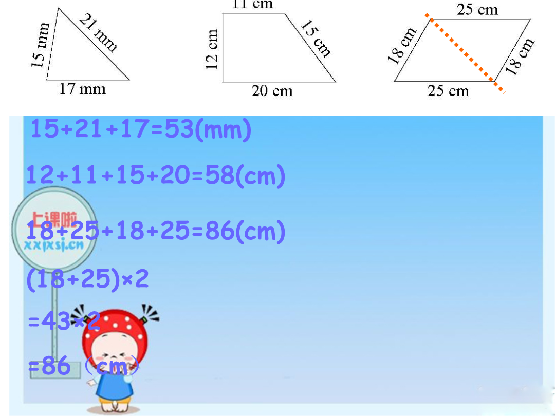 练习六15+21+17=53(mm)长方形的周长=(长+宽)×2求花边的长就是就这个正方形的()。9m(长+宽)×2=168厘米4个图形的周长相等。
