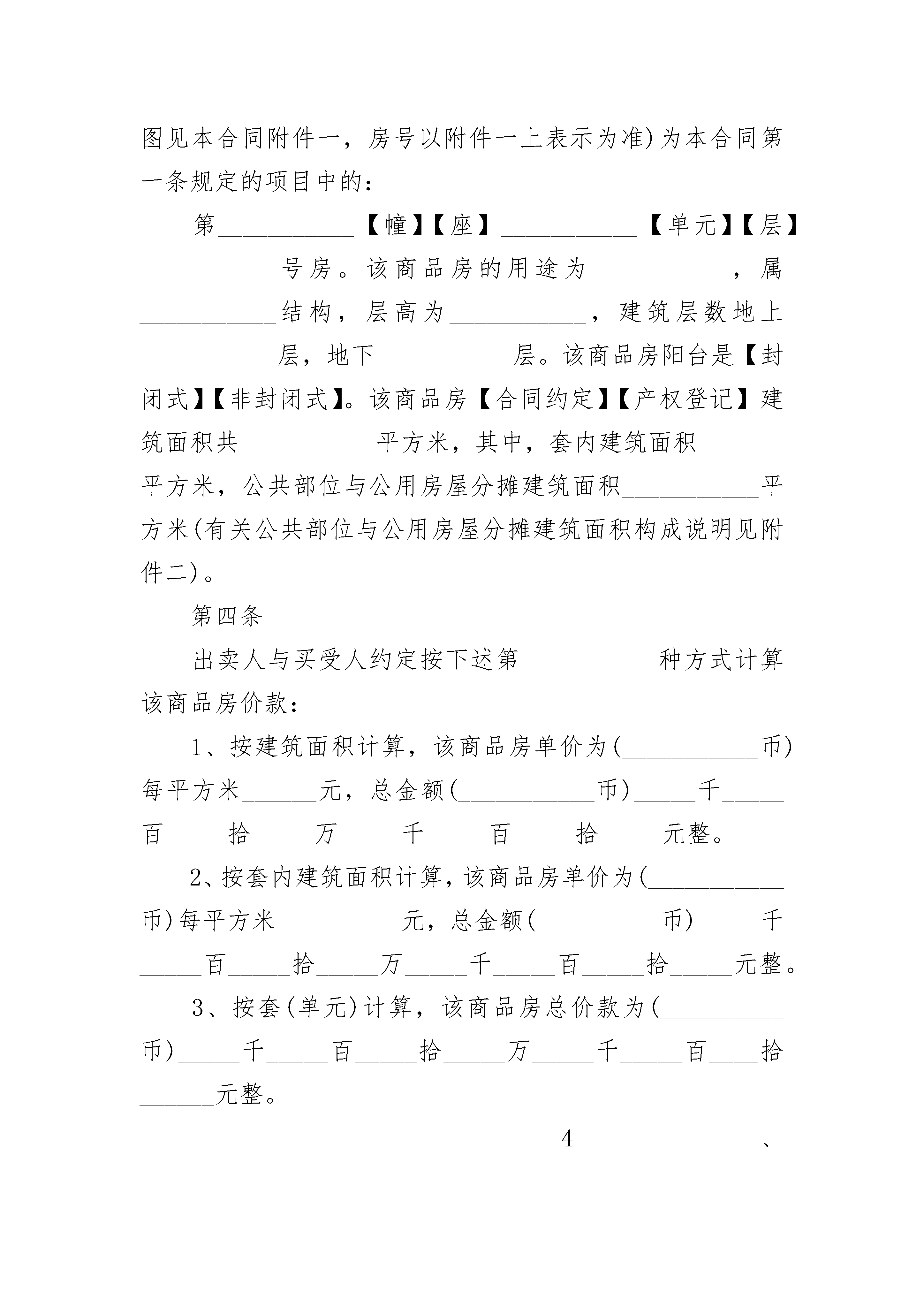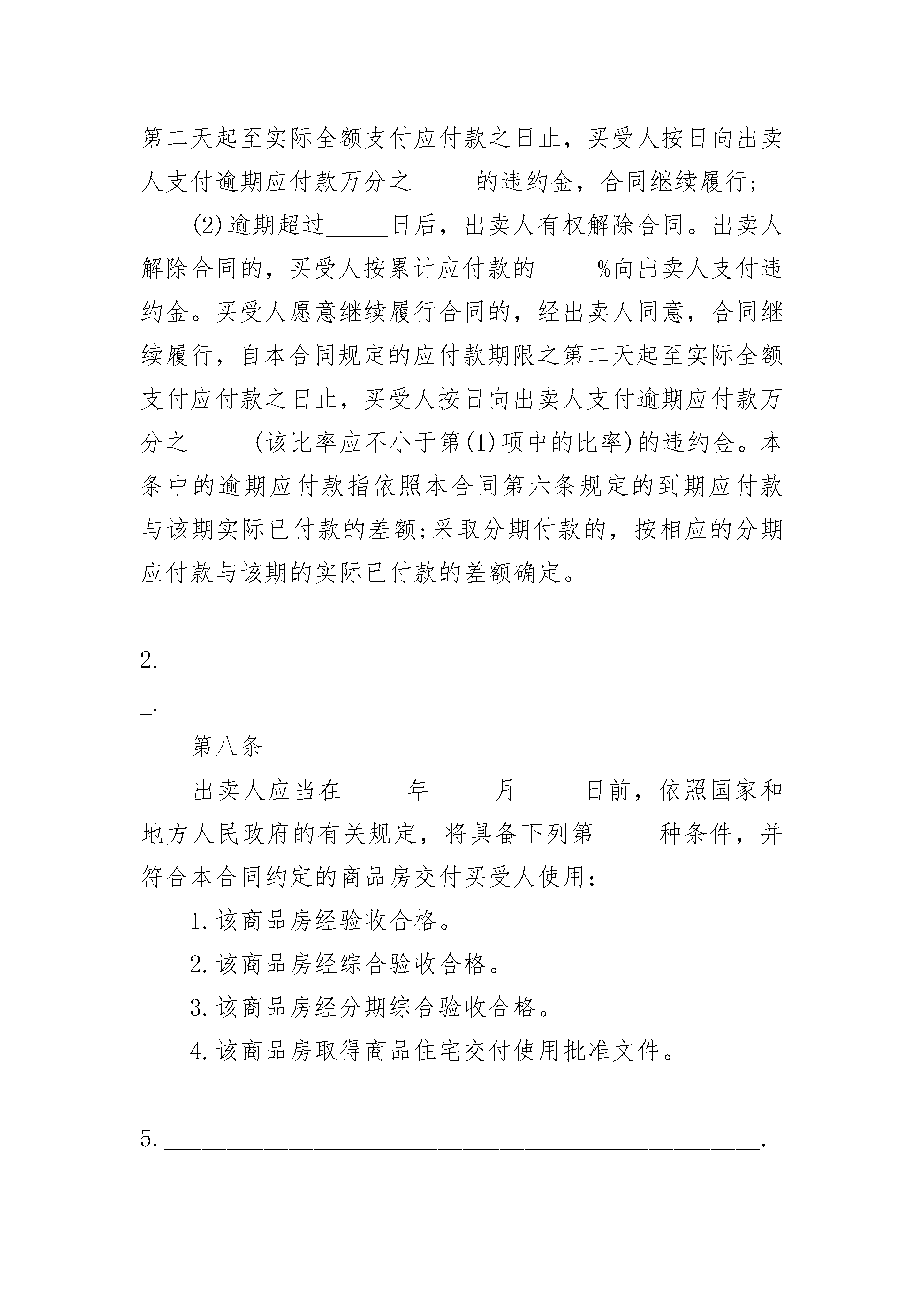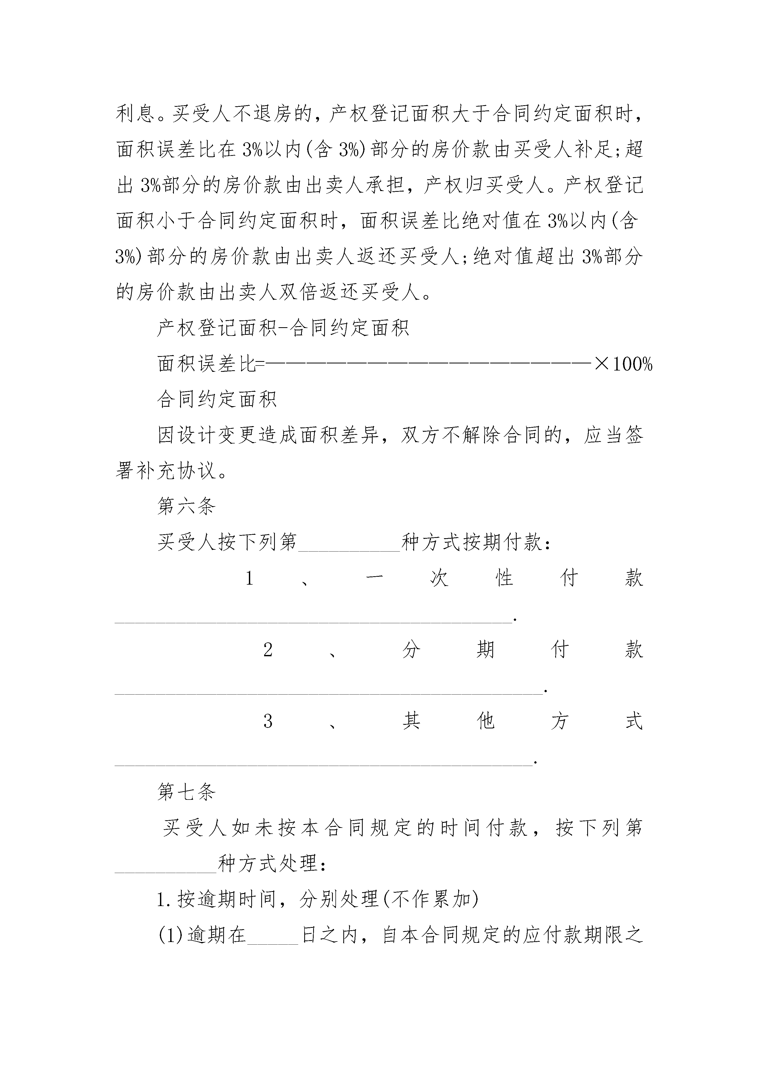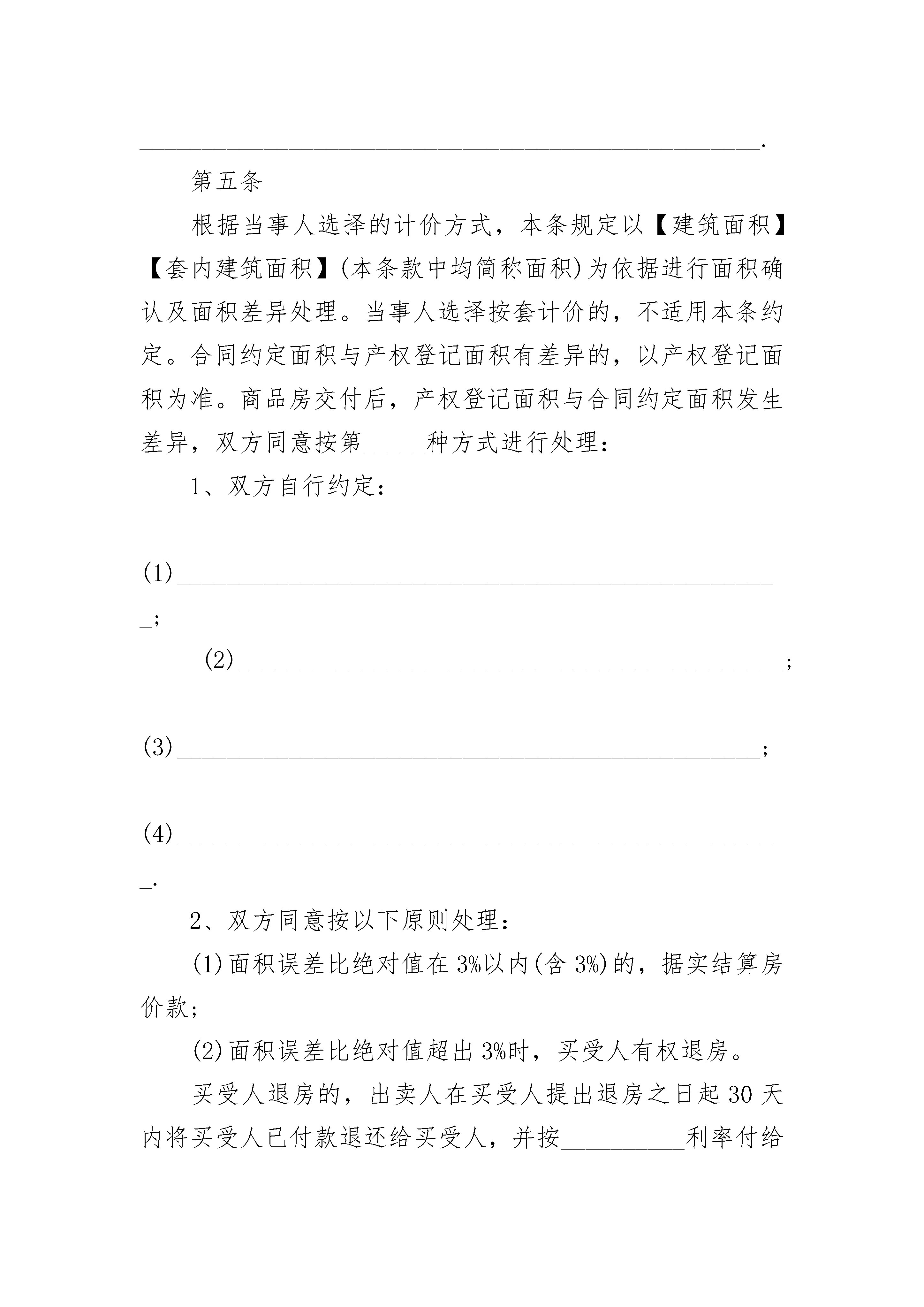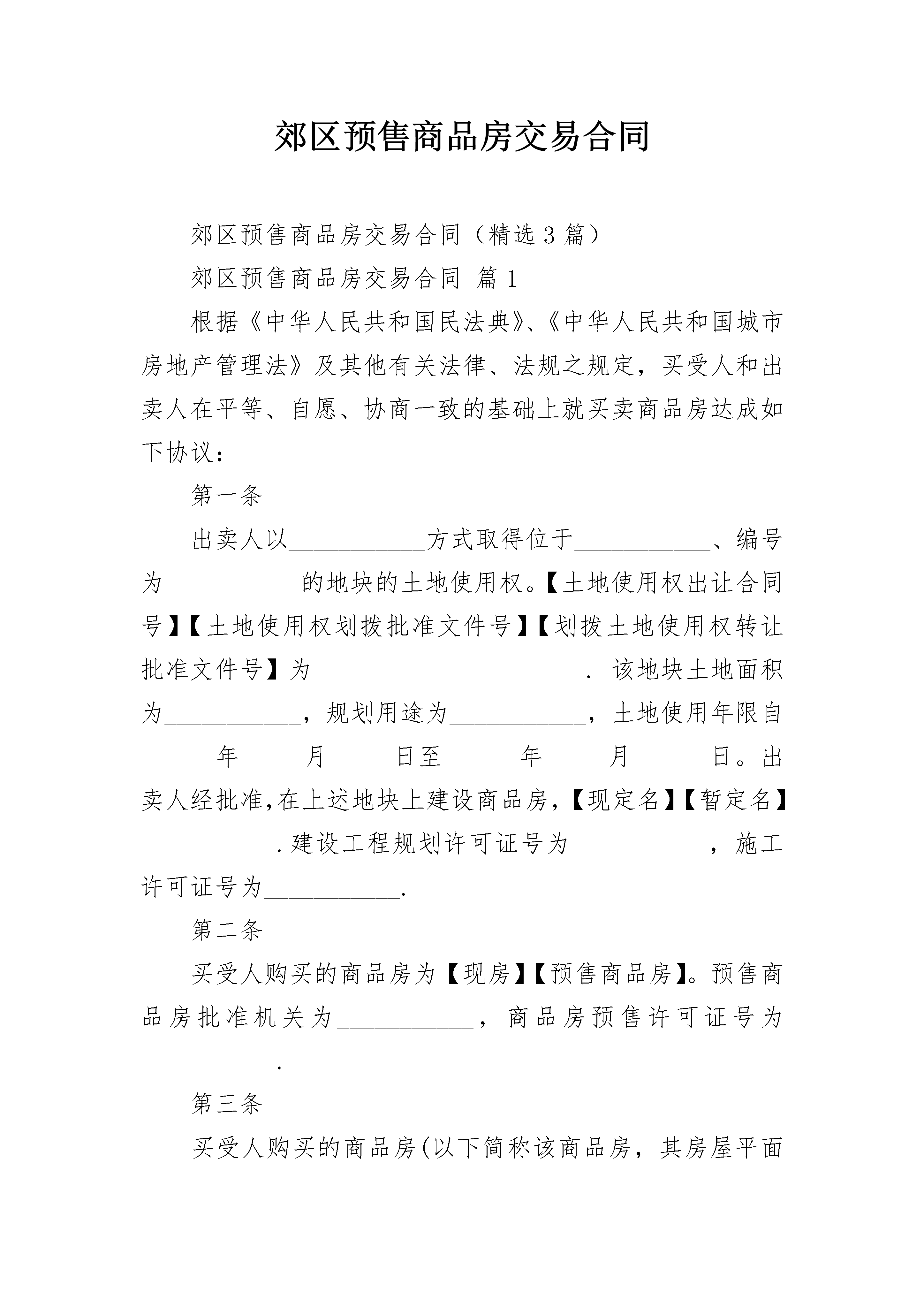 郊区预售商品房交易合同郊区预售商品房交易合同(精选3篇)郊区预售商品房交易合同篇1根据《中华人民共和国民法典》、《中华人民共和国城市房地产管理法》及其他有关法律、法规之规定,买受人和出卖人在平等、自愿、协商一致的基础上就买卖商品房达成如下协议:第一条出卖人以___________方式取得位于___________、编号为___________的地块的土地使用权。【土地使用权出让合同号】【土地使用权划拨批准文件号】【划拨土地使用权转让批准文件号】为______________________.该地块土地面积为___________,规划用途为___________,土地使用年限自______年_____月_____日至______年_____月______日。出卖人经批准,在上述地块上建设商品房,【现定名】【暂定名】___________.建设工程规划许可证号为___________,施工许可证号为___________.第二条买受人购买的商品房为【现房】【预售商品房】。预售商品房批准机关为___________,商品房预售许可证号为___________.第三条买受人购买的商品房(以下简称该商品房,其房屋平面图见本合同附件一,房号以附件一上表示为准)为本合同第一条规定的项目中的:第___________【幢】【座】___________【单元】【层】___________号房。该商品房的用途为___________,属___________结构,层高为___________,建筑层数地上___________层,地下___________层。该商品房阳台是【封闭式】【非封闭式】。该商品房【合同约定】【产权登记】建筑面积共___________平方米,其中,套内建筑面积_______平方米,公共部位与公用房屋分摊建筑面积___________平方米(有关公共部位与公用房屋分摊建筑面积构成说明见附件二)。第四条出卖人与买受人约定按下述第___________种方式计算该商品房价款:1、按建筑面积计算,该商品房单价为(___________币)每平方米______元,总金额(___________币)_____千_____百_____拾_____万_____千_____百_____拾_____元整。2、按套内建筑面积计算,该商品房单价为(___________币)每平方米__________元,总金额(__________币)_____千_____百_____拾_____万_____千_____百_____拾_____元整。3、按套(单元)计算,该商品房总价款为(__________币)_____千_____百_____拾_____万_____千_____百____拾______元整。4、__________________________________________________.第五条根据当事人选择的计价方式,本条规定以【建筑面积】【套内建筑面积】(本条款中均简称面积)为依据进行面积确认及面积差异处理。当事人选择按套计价的,不适用本条约定。合同约定面积与产权登记面积有差异的,以产权登记面积为准。商品房交付后,产权登记面积与合同约定面积发生差异,双方同意按第_____种方式进行处理:1、双方自行约定:(1)_________________________________________________;(2)____________________________________________;(3)_______________________________________________;(4)_________________________________________________.2、双方同意按以下原则处理:(1)面积误差比绝对值在3%以内(含3%)的,据实结算房价款;(2)面积误差比绝对值超出3%时,买受人有权退房。买受人退房的,出卖人在买受人提出退房之日起30天内将买受人已付款退还给买受人,并按__________利率付给利息。买受人不退房的,产权登记面积大于合同约定面积时,面积误差比在3%以内(含3%)部分的房价款由买受人补足;超出3%部分的房价款由出卖人承担,产权归买受人。产权登记面积小于合同约定面积时,面积误差比绝对值在3%以内(含3%)部分的房价款由出卖人返还买受人;绝对值超出3%部分的房价款由出卖人双倍返还买受人。产权登记面积-合同约定面积面积误差比=————————————————×100%合同约定面积因设计变更造成面积差异,双方不解除合同的,应当签署补充协议。第六条买受人按下列第__________种方式按期付款:1、一次性付款___________________________