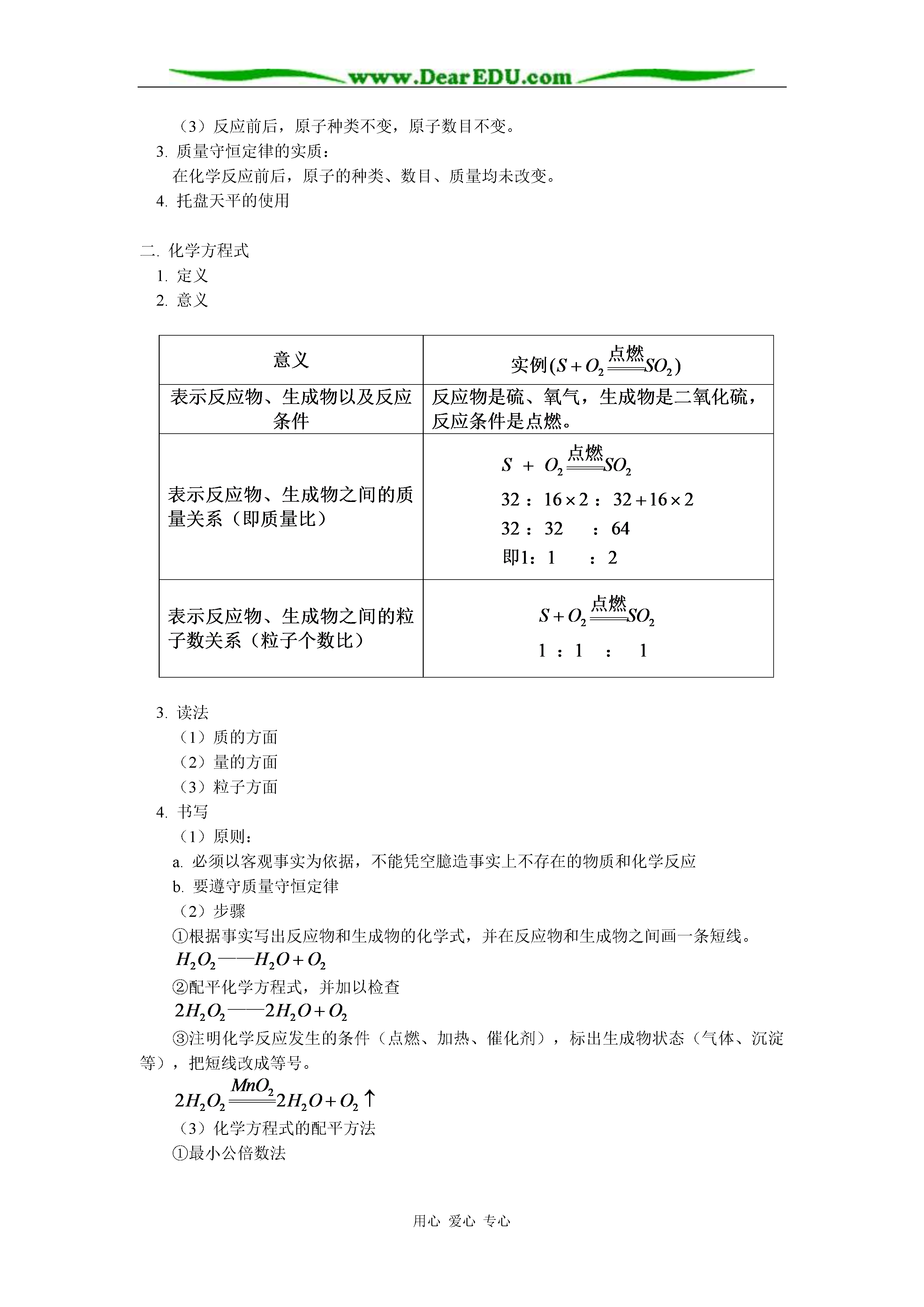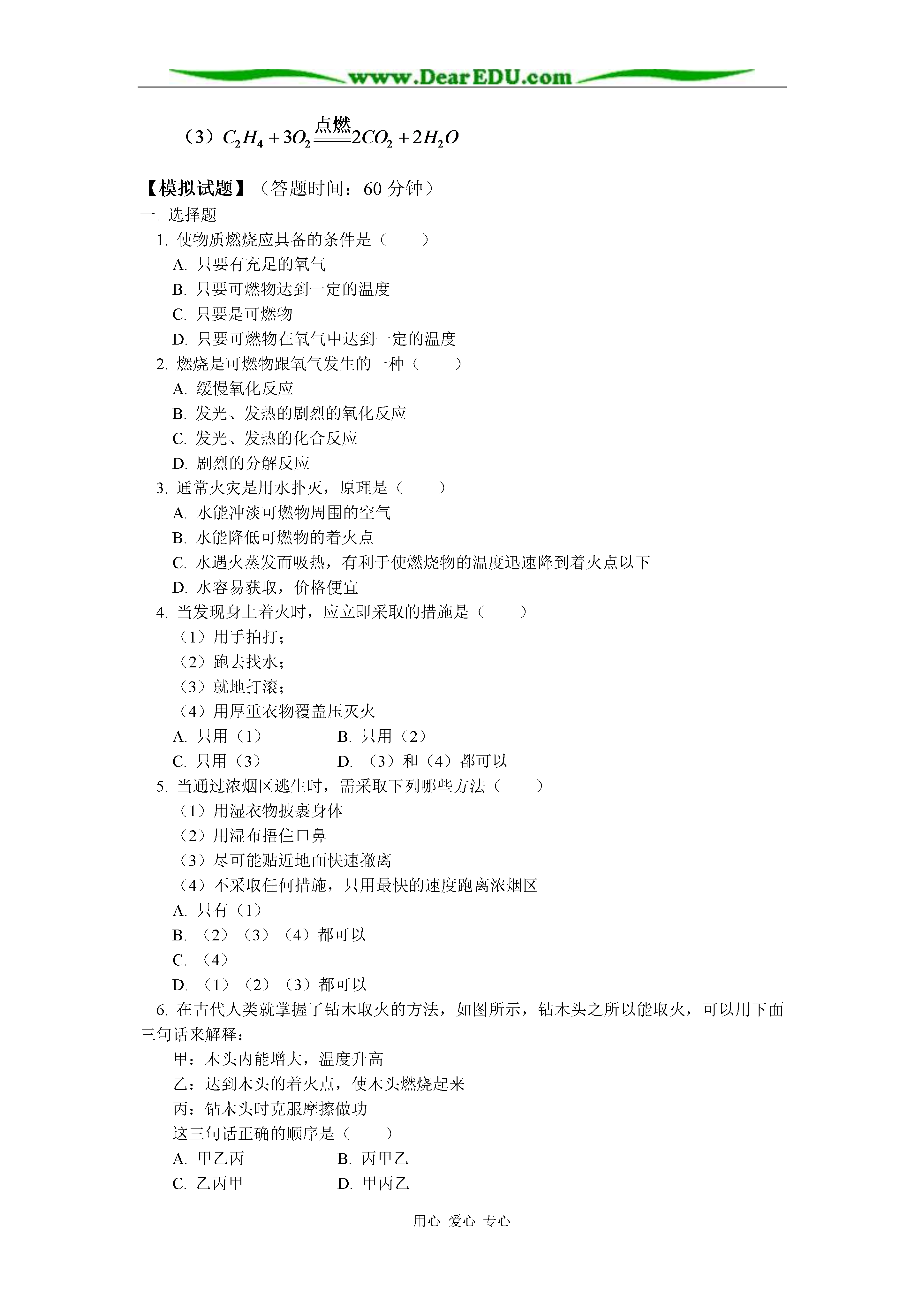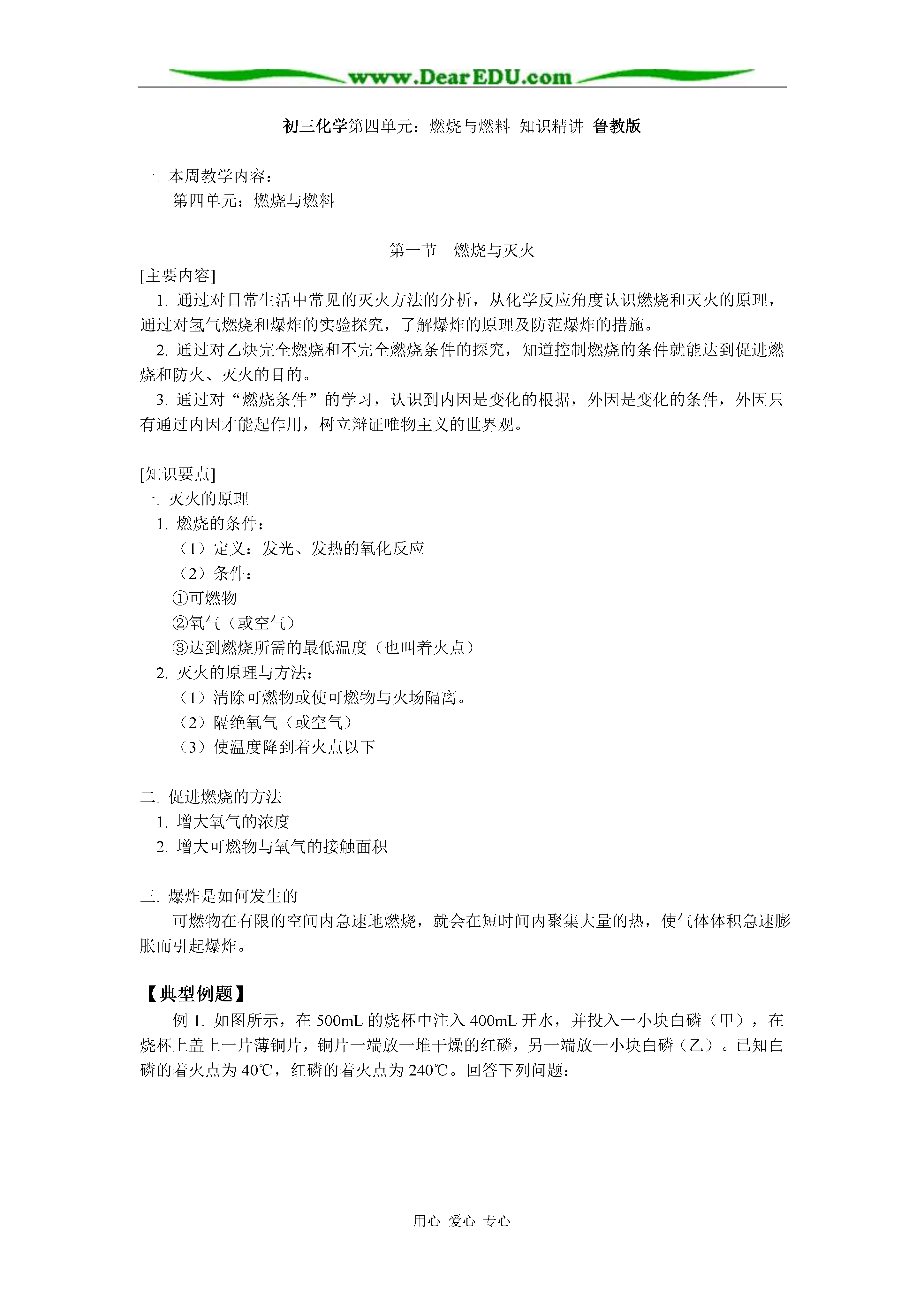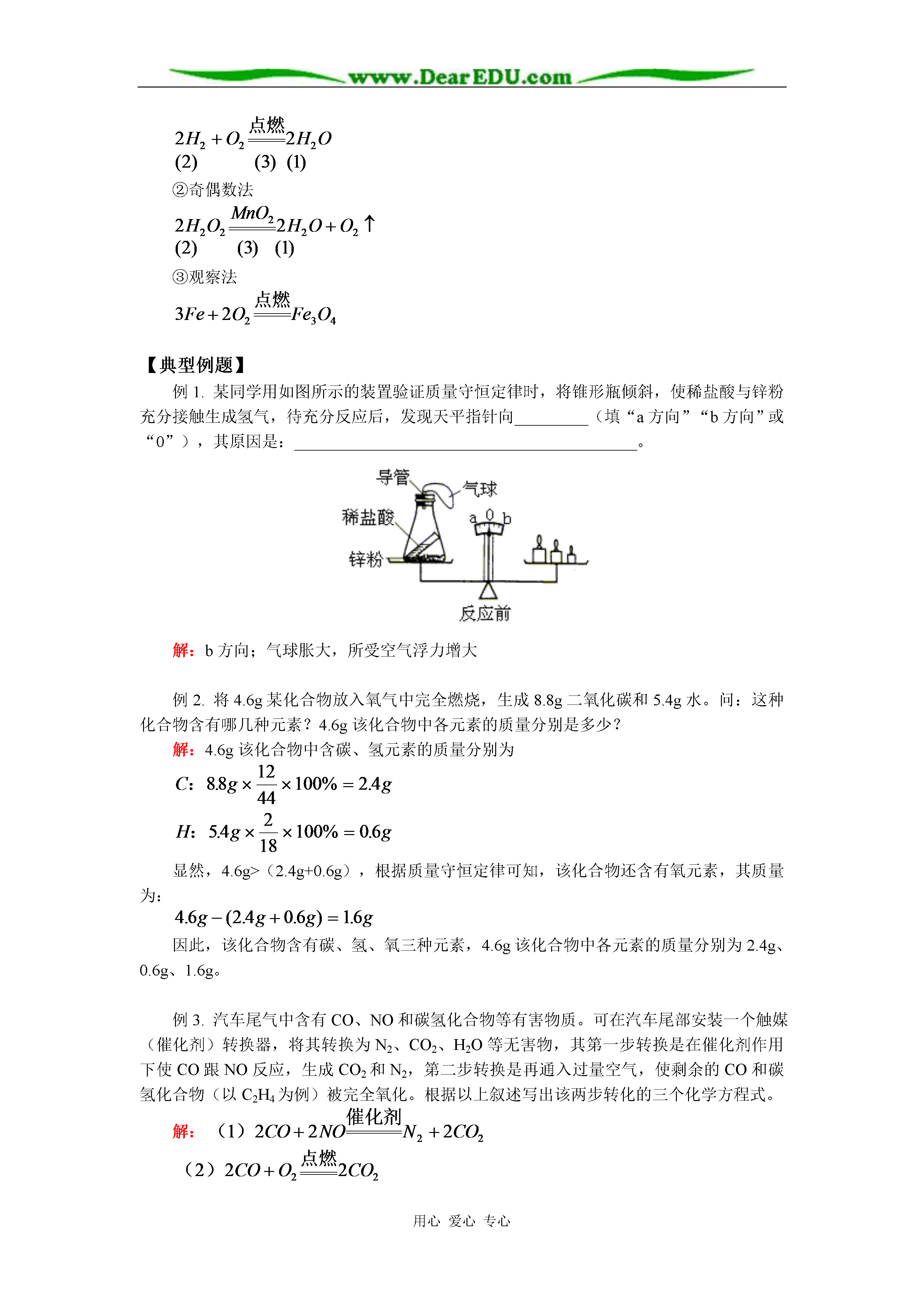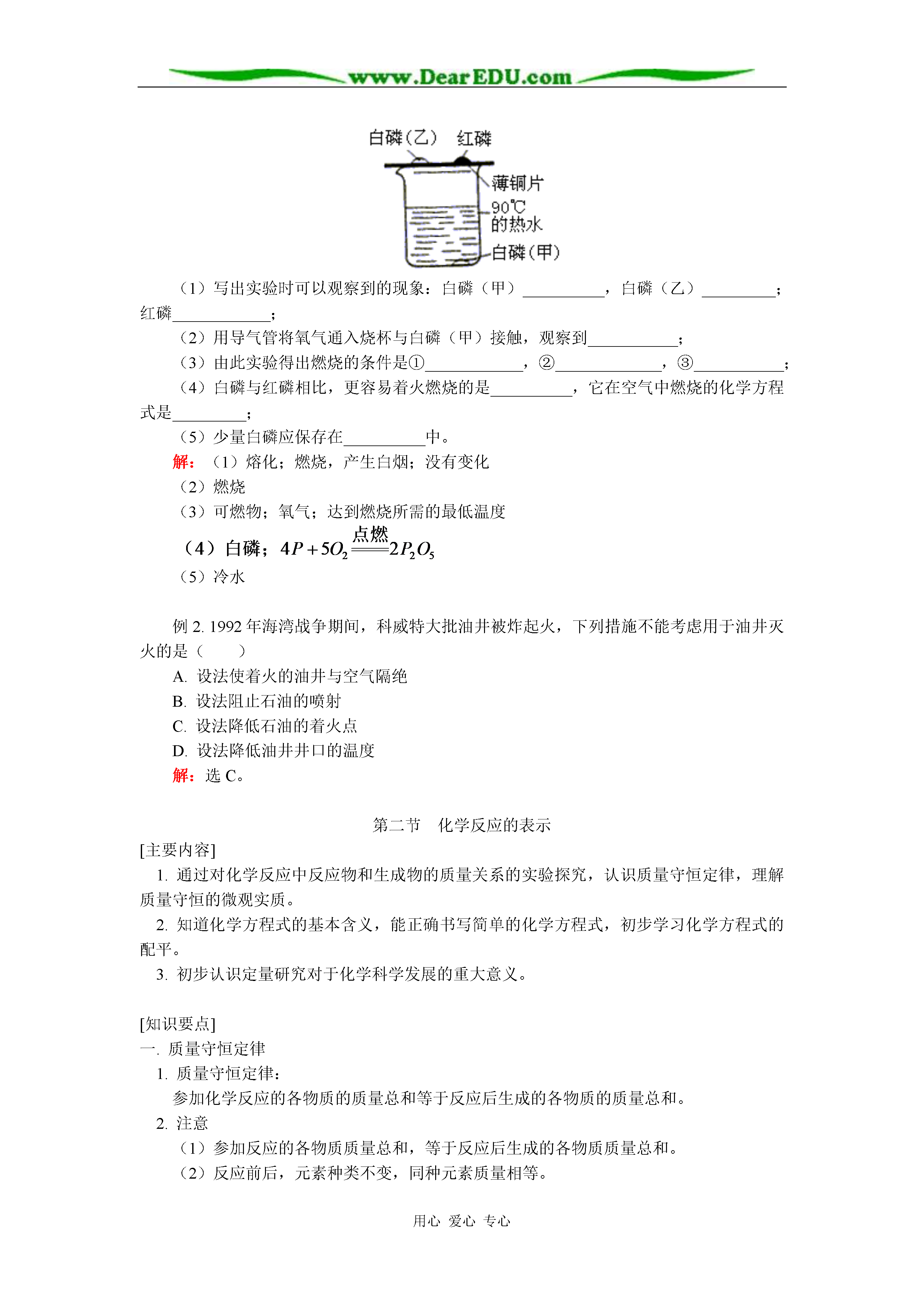 用心爱心专心初三化学第四单元:燃烧与燃料知识精讲鲁教版一.本周教学内容:第四单元:燃烧与燃料第一节燃烧与灭火[主要内容]1.通过对日常生活中常见的灭火方法的分析,从化学反应角度认识燃烧和灭火的原理,通过对氢气燃烧和爆炸的实验探究,了解爆炸的原理及防范爆炸的措施。2.通过对乙炔完全燃烧和不完全燃烧条件的探究,知道控制燃烧的条件就能达到促进燃烧和防火、灭火的目的。3.通过对“燃烧条件”的学习,认识到内因是变化的根据,外因是变化的条件,外因只有通过内因才能起作用,树立辩证唯物主义的世界观。[知识要点]一.灭火的原理1.燃烧的条件:(1)定义:发光、发热的氧化反应(2)条件:①可燃物②氧气(或空气)③达到燃烧所需的最低温度(也叫着火点)2.灭火的原理与方法:(1)清除可燃物或使可燃物与火场隔离。(2)隔绝氧气(或空气)(3)使温度降到着火点以下二.促进燃烧的方法1.增大氧气的浓度2.增大可燃物与氧气的接触面积三.爆炸是如何发生的可燃物在有限的空间内急速地燃烧,就会在短时间内聚集大量的热,使气体体积急速膨胀而引起爆炸。【典型例题】例1.如图所示,在500mL的烧杯中注入400mL开水,并投入一小块白磷(甲),在烧杯上盖上一片薄铜片,铜片一端放一堆干燥的红磷,另一端放一小块白磷(乙)。已知白磷的着火点为40℃,红磷的着火点为240℃。回答下列问题:(1)写出实验时可以观察到的现象:白磷(甲)__________,白磷(乙)_________;红磷____________;(2)用导气管将氧气通入烧杯与白磷(甲)接触,观察到___________;(3)由此实验得出燃烧的条件是①____________,②_____________,③___________;(4)白磷与红磷相比,更容易着火燃烧的是__________,它在空气中燃烧的化学方程式是_________;(5)少量白磷应保存在__________中。解:(1)熔化;燃烧,产生白烟;没有变化(2)燃烧(3)可燃物;氧气;达到燃烧所需的最低温度(5)冷水例2.1992年海湾战争期间,科威特大批油井被炸起火,下列措施不能考虑用于油井灭火的是()A.设法使着火的油井与空气隔绝B.设法阻止石油的喷射C.设法降低石油的着火点D.设法降低油井井口的温度解:选C。第二节化学反应的表示[主要内容]1.通过对化学反应中反应物和生成物的质量关系的实验探究,认识质量守恒定律,理解质量守恒的微观实质。2.知道化学方程式的基本含义,能正确书写简单的化学方程式,初步学习化学方程式的配平。3.初步认识定量研究对于化学科学发展的重大意义。[知识要点]一.质量守恒定律1.质量守恒定律:参加化学反应的各物质的质量总和等于反应后生成的各物质的质量总和。2.注意(1)参加反应的各物质质量总和,等于反应后生成的各物质质量总和。(2)反应前后,元素种类不变,同种元素质量相等。(3)反应前后,原子种类不变,原子数目不变。3.质量守恒定律的实质:在化学反应前后,原子的种类、数目、质量均未改变。4.托盘天平的使用二.化学方程式1.定义2.意义3.读法(1)质的方面(2)量的方面(3)粒子方面4.书写(1)原则:a.必须以客观事实为依据,不能凭空臆造事实上不存在的物质和化学反应b.要遵守质量守恒定律(2)步骤①根据事实写出反应物和生成物的化学式,并在反应物和生成物之间画一条短线。②配平化学方程式,并加以检查③注明化学反应发生的条件(点燃、加热、催化剂),标出生成物状态(气体、沉淀等),把短线改成等号。(3)化学方程式的配平方法①最小公倍数法②奇偶数法③观察法【典型例题】例1.某同学用如图所示的装置验证质量守恒定律时,将锥形瓶倾斜,使稀盐酸与锌粉充分接触生成氢气,待充分反应后,发现天平指针向_________(填“a方向”“b方向”或“0”),其原因是:__________________________________________。解:b方向;气球胀大,所受空气浮力增大例2.将4.6g某化合物放入氧气中完全燃烧,生成8.8g二氧化碳和5.4g水。问:这种化合物含有哪几种元素?4.6g该化合物中各元素的质量分别是多少?解:4.6g该化合物中含碳、氢元素的质量分别为显然,4.6g>(2.4g+0.6g),根据质量守恒定律可知,该化合物还含有氧元素,其质量为:因此,该化合物含有碳、氢、氧三种元素,4.6g该化合物中各元素的质量分别为2.4g、0.6g、1.6g。例3.汽车尾气中含有CO、NO和碳氢化合物