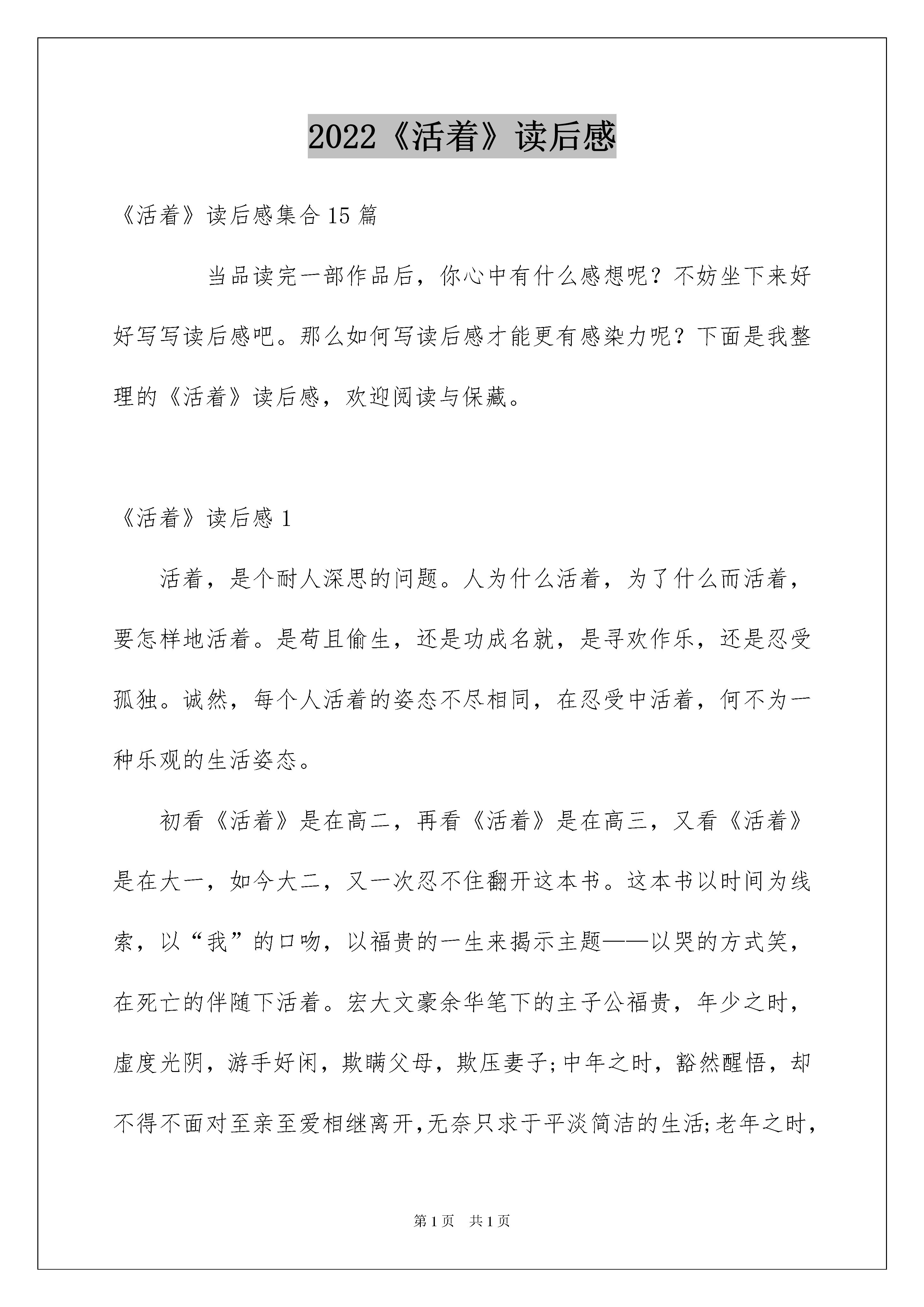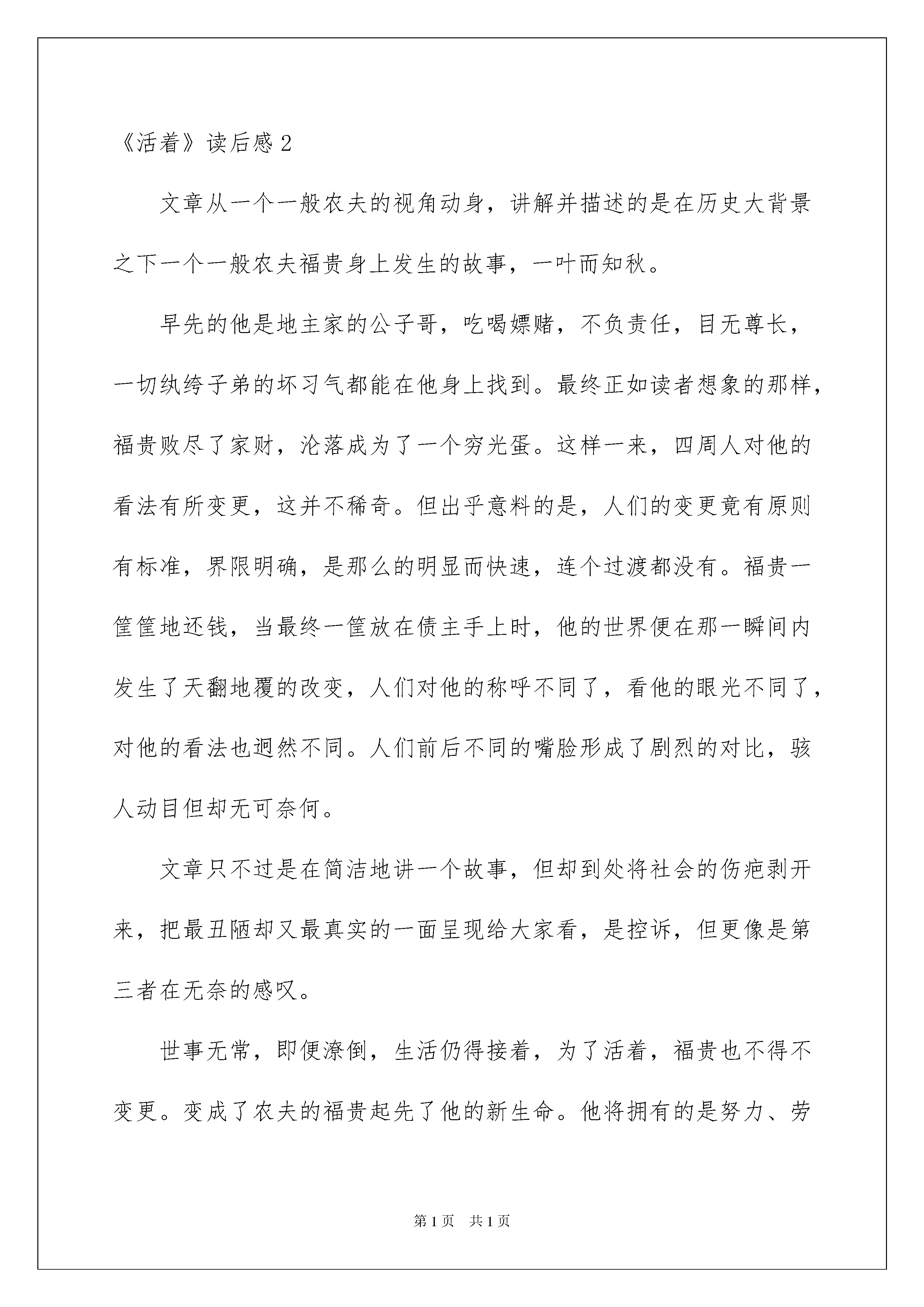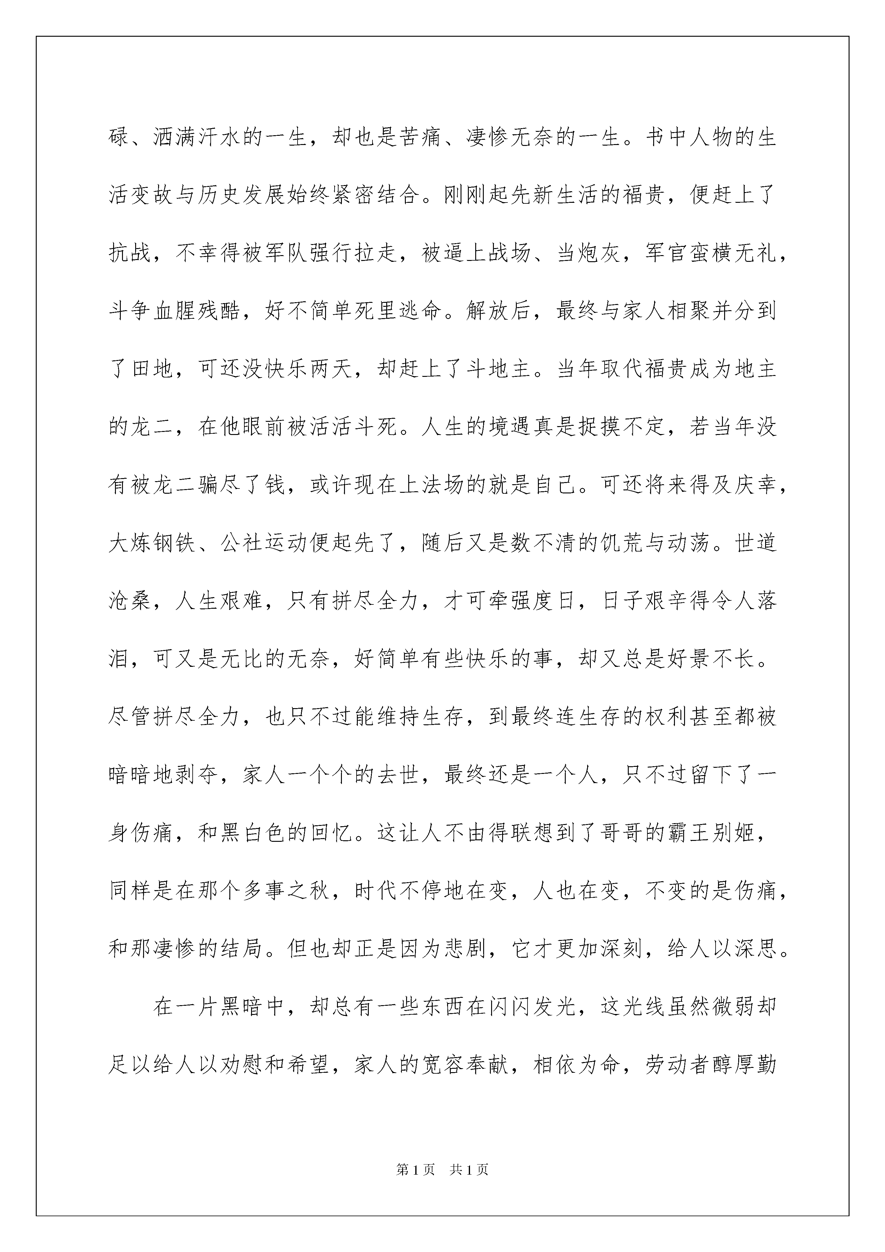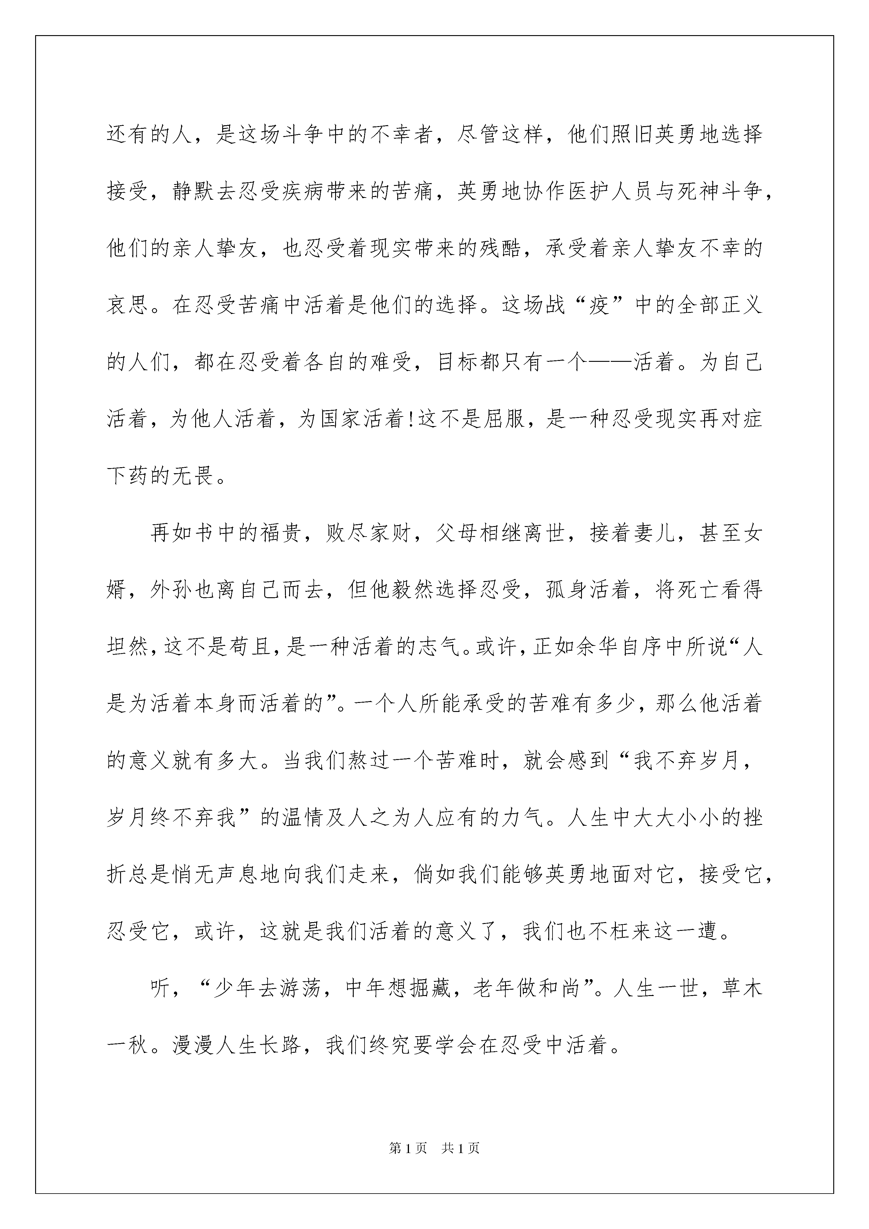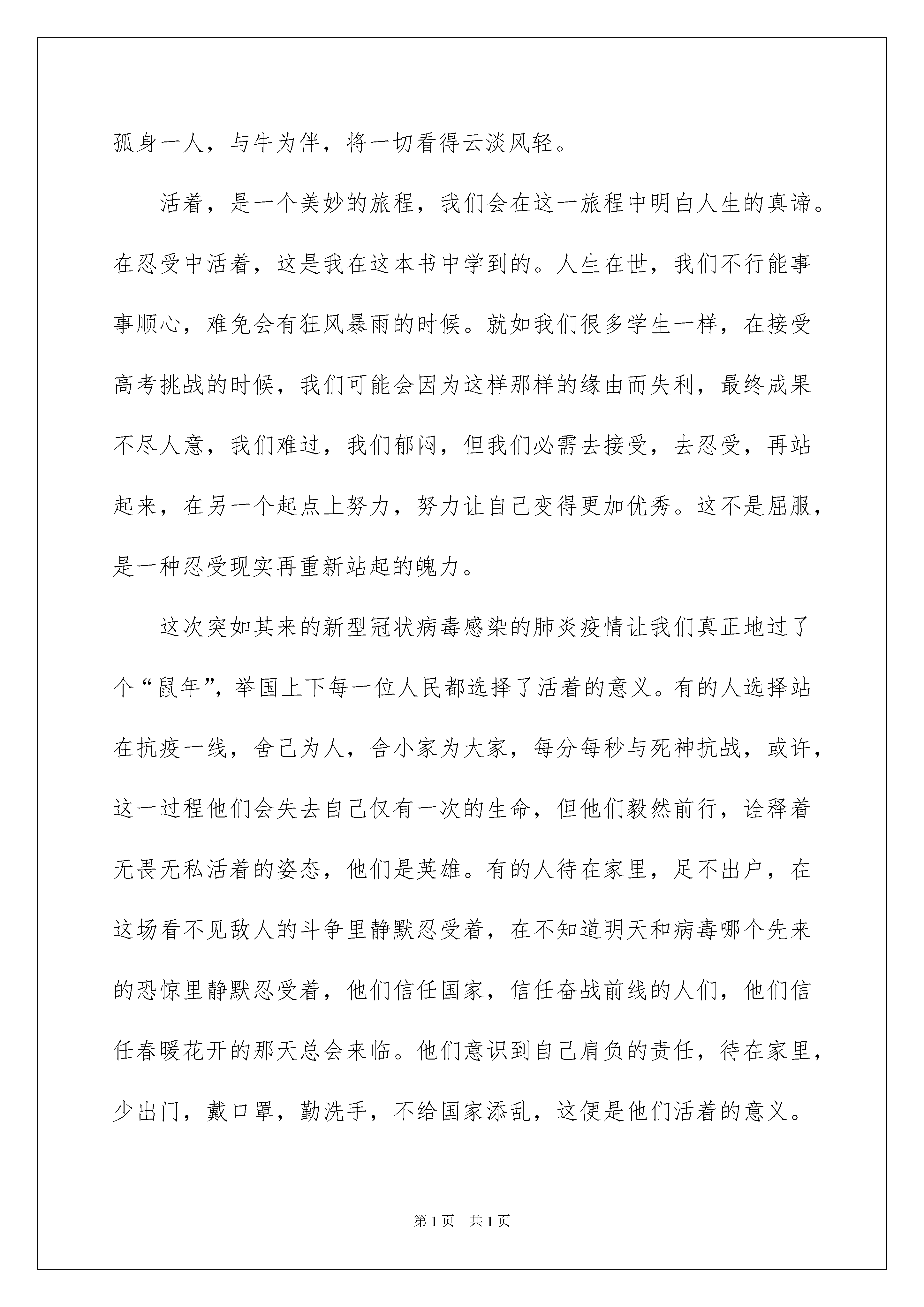 2022《活着》读后感《活着》读后感集合15篇当品读完一部作品后,你心中有什么感想呢?不妨坐下来好好写写读后感吧。那么如何写读后感才能更有感染力呢?下面是我整理的《活着》读后感,欢迎阅读与保藏。《活着》读后感1活着,是个耐人深思的问题。人为什么活着,为了什么而活着,要怎样地活着。是苟且偷生,还是功成名就,是寻欢作乐,还是忍受孤独。诚然,每个人活着的姿态不尽相同,在忍受中活着,何不为一种乐观的生活姿态。初看《活着》是在高二,再看《活着》是在高三,又看《活着》是在大一,如今大二,又一次忍不住翻开这本书。这本书以时间为线索,以“我”的口吻,以福贵的一生来揭示主题——以哭的方式笑,在死亡的伴随下活着。宏大文豪余华笔下的主子公福贵,年少之时,虚度光阴,游手好闲,欺瞒父母,欺压妻子;中年之时,豁然醒悟,却不得不面对至亲至爱相继离开,无奈只求于平淡简洁的生活;老年之时,孤身一人,与牛为伴,将一切看得云淡风轻。活着,是一个美妙的旅程,我们会在这一旅程中明白人生的真谛。在忍受中活着,这是我在这本书中学到的。人生在世,我们不行能事事顺心,难免会有狂风暴雨的时候。就如我们很多学生一样,在接受高考挑战的时候,我们可能会因为这样那样的缘由而失利,最终成果不尽人意,我们难过,我们郁闷,但我们必需去接受,去忍受,再站起来,在另一个起点上努力,努力让自己变得更加优秀。这不是屈服,是一种忍受现实再重新站起的魄力。这次突如其来的新型冠状病毒感染的肺炎疫情让我们真正地过了个“鼠年”,举国上下每一位人民都选择了活着的意义。有的人选择站在抗疫一线,舍己为人,舍小家为大家,每分每秒与死神抗战,或许,这一过程他们会失去自己仅有一次的生命,但他们毅然前行,诠释着无畏无私活着的姿态,他们是英雄。有的人待在家里,足不出户,在这场看不见敌人的斗争里静默忍受着,在不知道明天和病毒哪个先来的恐惊里静默忍受着,他们信任国家,信任奋战前线的人们,他们信任春暖花开的那天总会来临。他们意识到自己肩负的责任,待在家里,少出门,戴口罩,勤洗手,不给国家添乱,这便是他们活着的意义。还有的人,是这场斗争中的不幸者,尽管这样,他们照旧英勇地选择接受,静默去忍受疾病带来的苦痛,英勇地协作医护人员与死神斗争,他们的亲人挚友,也忍受着现实带来的残酷,承受着亲人挚友不幸的哀思。在忍受苦痛中活着是他们的选择。这场战“疫”中的全部正义的人们,都在忍受着各自的难受,目标都只有一个——活着。为自己活着,为他人活着,为国家活着!这不是屈服,是一种忍受现实再对症下药的无畏。再如书中的福贵,败尽家财,父母相继离世,接着妻儿,甚至女婿,外孙也离自己而去,但他毅然选择忍受,孤身活着,将死亡看得坦然,这不是苟且,是一种活着的志气。或许,正如余华自序中所说“人是为活着本身而活着的”。一个人所能承受的苦难有多少,那么他活着的意义就有多大。当我们熬过一个苦难时,就会感到“我不弃岁月,岁月终不弃我”的温情及人之为人应有的力气。人生中大大小小的挫折总是悄无声息地向我们走来,倘如我们能够英勇地面对它,接受它,忍受它,或许,这就是我们活着的意义了,我们也不枉来这一遭。听,“少年去游荡,中年想掘藏,老年做和尚”。人生一世,草木一秋。漫漫人生长路,我们终究要学会在忍受中活着。《活着》读后感2文章从一个一般农夫的视角动身,讲解并描述的是在历史大背景之下一个一般农夫福贵身上发生的故事,一叶而知秋。早先的他是地主家的公子哥,吃喝嫖赌,不负责任,目无尊长,一切纨绔子弟的坏习气都能在他身上找到。最终正如读者想象的那样,福贵败尽了家财,沦落成为了一个穷光蛋。这样一来,四周人对他的看法有所变更,这并不稀奇。但出乎意料的是,人们的变更竟有原则有标准,界限明确,是那么的明显而快速,连个过渡都没有。福贵一筐筐地还钱,当最终一筐放在债主手上时,他的世界便在那一瞬间内发生了天翻地覆的改变,人们对他的称呼不同了,看他的眼光不同了,对他的看法也迥然不同。人们前后不同的嘴脸形成了剧烈的对比,骇人动目但却无可奈何。文章只不过是在简洁地讲一个故事,但却到处将社会的伤疤剥开来,把最丑陋却又最真实的一面呈现给大家看,是控诉,但更像是第三者在无奈的感叹。世事无常,即便潦倒,生活仍得接着,为了活着,福贵也不得不变更。变成了农夫的福贵起先了他的新生命。他将拥有的是努力、劳碌、洒满汗水的一生,却也是苦痛、凄惨无奈的一生。书中人物的生活变故与历史发展始终紧密结合。刚刚起先新生活的福贵,便赶上了抗战,不幸得被军队强行拉走,被逼上战场、当炮灰,军官蛮横无礼,斗争血腥残酷,好不简单死里逃命。解放后,最终与家人相聚并分到了田地,可还没快乐两天,却