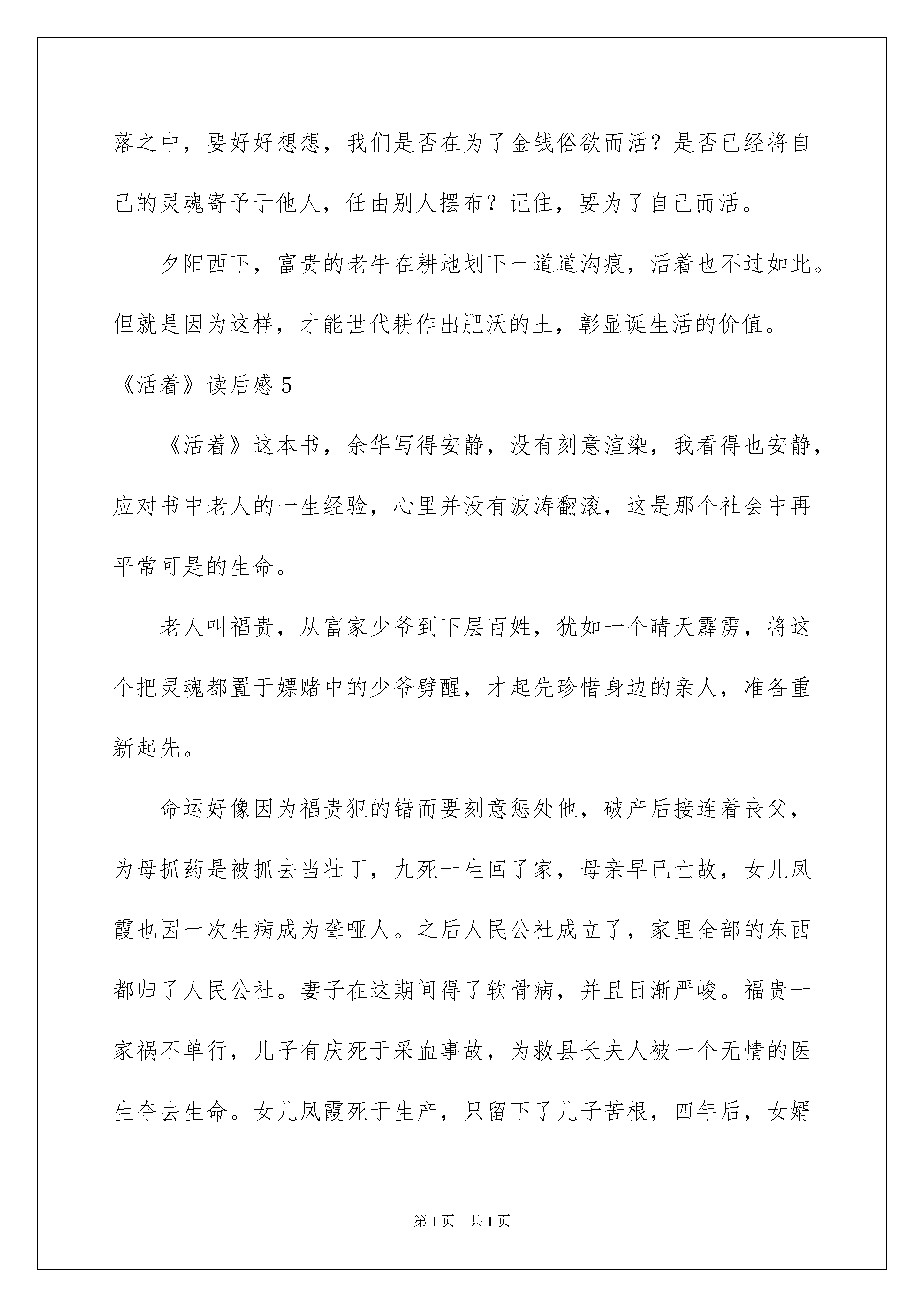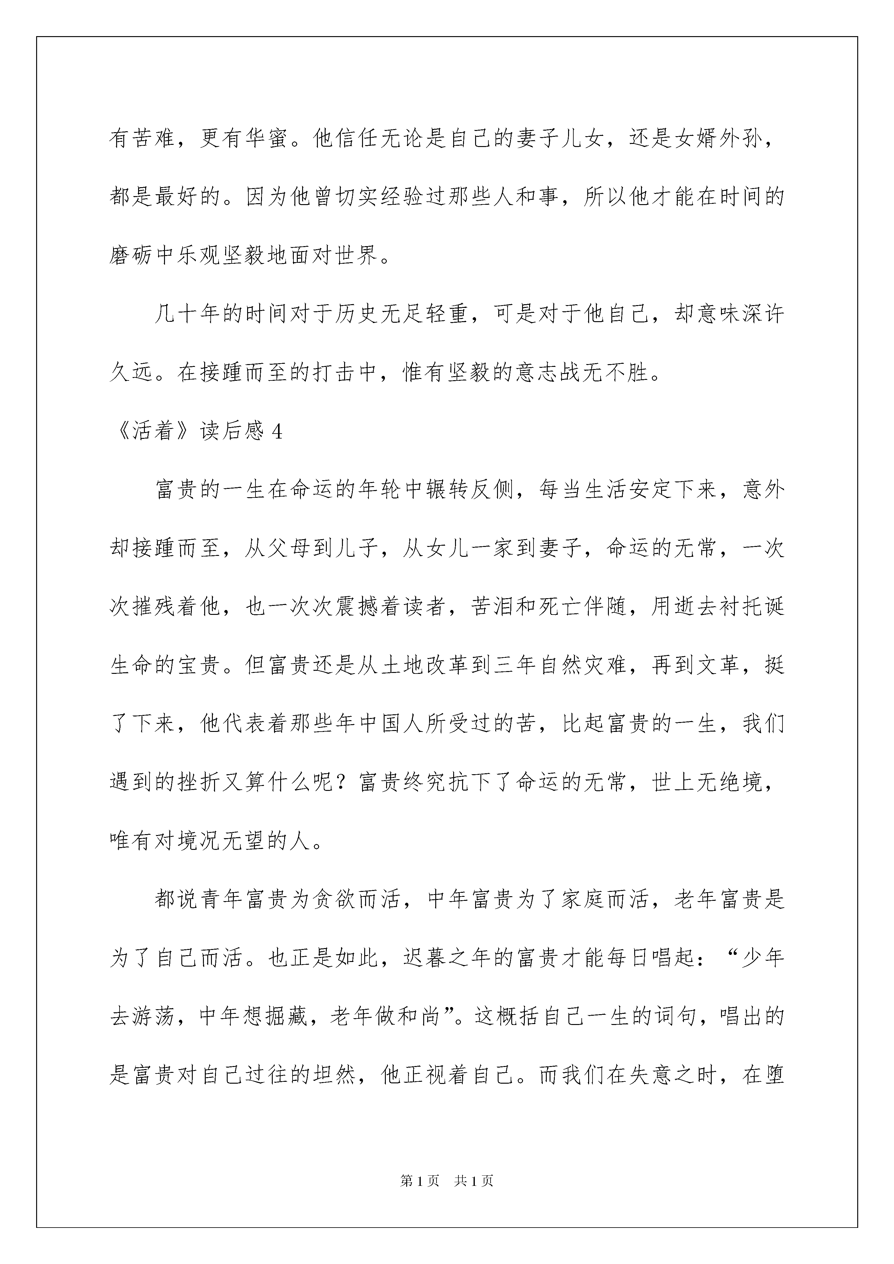 2022《活着》读后感《活着》读后感15篇当品读完一部作品后,你有什么总结呢?为此须要仔细地写一写读后感了。现在你是否对读后感一筹莫展呢?以下是我帮大家整理的《活着》读后感,欢迎阅读,希望大家能够喜爱。《活着》读后感1意义的本身就是活着。前段时间读了余华的活着。我感到一种荒芜的压力。正像小说中余华用一种苍凉的笔调,用全知者的心态,静默还原悲剧。我面对这个能够看到自己过去模样的老人,用着看似平淡的乐观回顾自己的一生。人是为活着本身而活着的,而不是为了活着以外的任何事物所活着。小说里福贵的全部亲人,母亲,儿子,女儿一个个离他去,最终只剩福贵一人以及一头老牛。在空旷的世间相依为命,一人一牛,同样的年老,同样孤独,同样活着。这部小说带给人们的不应当是生活的看法,更应当意识到文中的他不过是千万劳苦大众的一个缩影,从古至今遭遇任何磨难人坚持不懈的全部人民。好好活着,是中国人最朴实的愿望,只有好好活着,才有实现其他愿望的一切根源。希望我在重新读这本书的时候,能够以一种全新的眼光去看待这个世界,不仅仅局限于人们所相识到的事物。希望大家都能去读读这本书。《活着》读后感2古时有苏东坡,今有“福贵”。他俩同样有凄惨的人生,只是方式不同罢了!作者余华在乡下偶然见到了福贵,得知了他的凄惨:本为地主家的儿子,但因傲慢,把自己的地位挥霍成农夫。又经验了父亲,母亲,儿子,妻子,女儿,女婿,外孙这一大家子人的一一逝去,与任何人相比,他真的都特殊凄惨。北大的女学生刘媛媛曾说过“我们必需要承认,这个世界上是有一些不同等的,富有家庭的孩子,有许多的优越条件,我们都没有,他们有许多的捷径,我们也没有。”对呀,世界的确很不公允,但我们可以靠自己的努力去逆流而上,逆袭,从丑小鸭变为白天鹅。虽然命运不在我们手里,但我们有毅力,有双手,从平凡变为不平凡是个过程,虽然过程艰辛,但只要努力重点县你会超越的。要借助身边的“梯子”,一步一步登天,登上人生之巅峰。梯子,就是你现在作为学生拥有的学问,才能及多元素的结合。看,福贵即使经验再多,他照旧活着,照旧走在人生的路上,而你又有什么资格放弃呢?像《蜗牛》里唱的:“我要一步一步往上爬,在最高点乘着叶片往前飞。小小的天流过的泪和汗,总有一天我有属于我的天。”信任自己,全部的挫折,也都只能是垫脚石。《活着》读后感3逝者已矣,风烟俱净。《活着》是一个人一生的故事,人的一生看上去很漫长,可或许在不经意多年以后看来,也不过如此。会有许多阴差阳错的巧合。比如在打仗时福贵肯定没有想过,多年以后,他和春生的相见竟是因为他凄凉落魄的晚景?他的一生有几十年的漫漫岁月,可我们花一个下午便能读个也许。事实上并不长。我们望见了他的一生,除了年轻时风光的一段日子,就剩下苦难了。不过他不这么认为,他觉得在自己经验的岁月里,有苦难,更有华蜜。他信任无论是自己的妻子儿女,还是女婿外孙,都是最好的。因为他曾切实经验过那些人和事,所以他才能在时间的磨砺中乐观坚毅地面对世界。几十年的时间对于历史无足轻重,可是对于他自己,却意味深许久远。在接踵而至的打击中,惟有坚毅的意志战无不胜。《活着》读后感4富贵的一生在命运的年轮中辗转反侧,每当生活安定下来,意外却接踵而至,从父母到儿子,从女儿一家到妻子,命运的无常,一次次摧残着他,也一次次震撼着读者,苦泪和死亡伴随,用逝去衬托诞生命的宝贵。但富贵还是从土地改革到三年自然灾难,再到文革,挺了下来,他代表着那些年中国人所受过的苦,比起富贵的一生,我们遇到的挫折又算什么呢?富贵终究抗下了命运的无常,世上无绝境,唯有对境况无望的人。都说青年富贵为贪欲而活,中年富贵为了家庭而活,老年富贵是为了自己而活。也正是如此,迟暮之年的富贵才能每日唱起:“少年去游荡,中年想掘藏,老年做和尚”。这概括自己一生的词句,唱出的是富贵对自己过往的坦然,他正视着自己。而我们在失意之时,在堕落之中,要好好想想,我们是否在为了金钱俗欲而活?是否已经将自己的灵魂寄予于他人,任由别人摆布?记住,要为了自己而活。夕阳西下,富贵的老牛在耕地划下一道道沟痕,活着也不过如此。但就是因为这样,才能世代耕作出肥沃的土,彰显诞生活的价值。《活着》读后感5《活着》这本书,余华写得安静,没有刻意渲染,我看得也安静,应对书中老人的一生经验,心里并没有波涛翻滚,这是那个社会中再平常可是的生命。老人叫福贵,从富家少爷到下层百姓,犹如一个晴天霹雳,将这个把灵魂都置于嫖赌中的少爷劈醒,才起先珍惜身边的亲人,准备重新起先。命运好像因为福贵犯的错而要刻意惩处他,破产后接连着丧父,为母抓药是被抓去当壮丁,九死一生回了家,母亲早已亡故,女儿凤霞也因一次生病