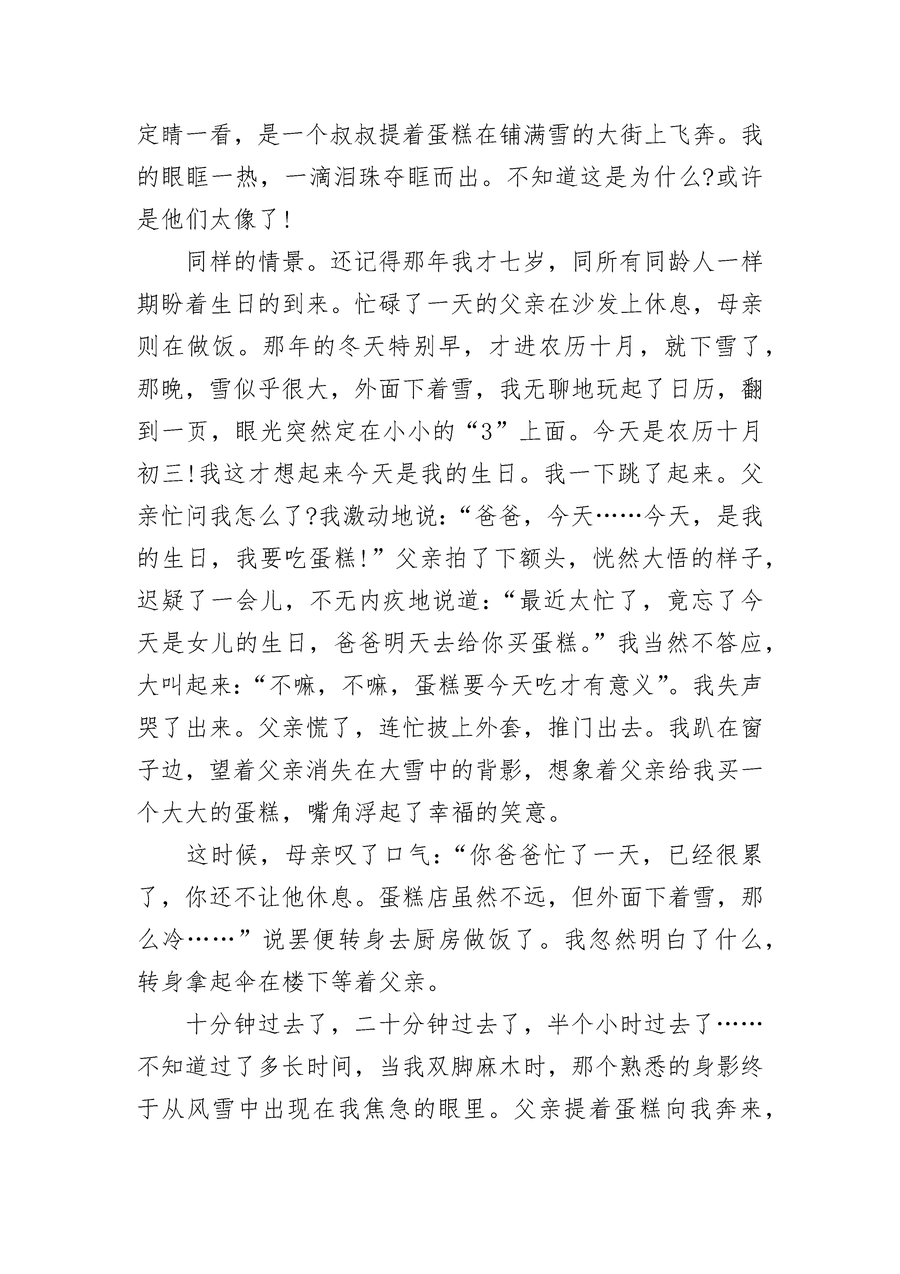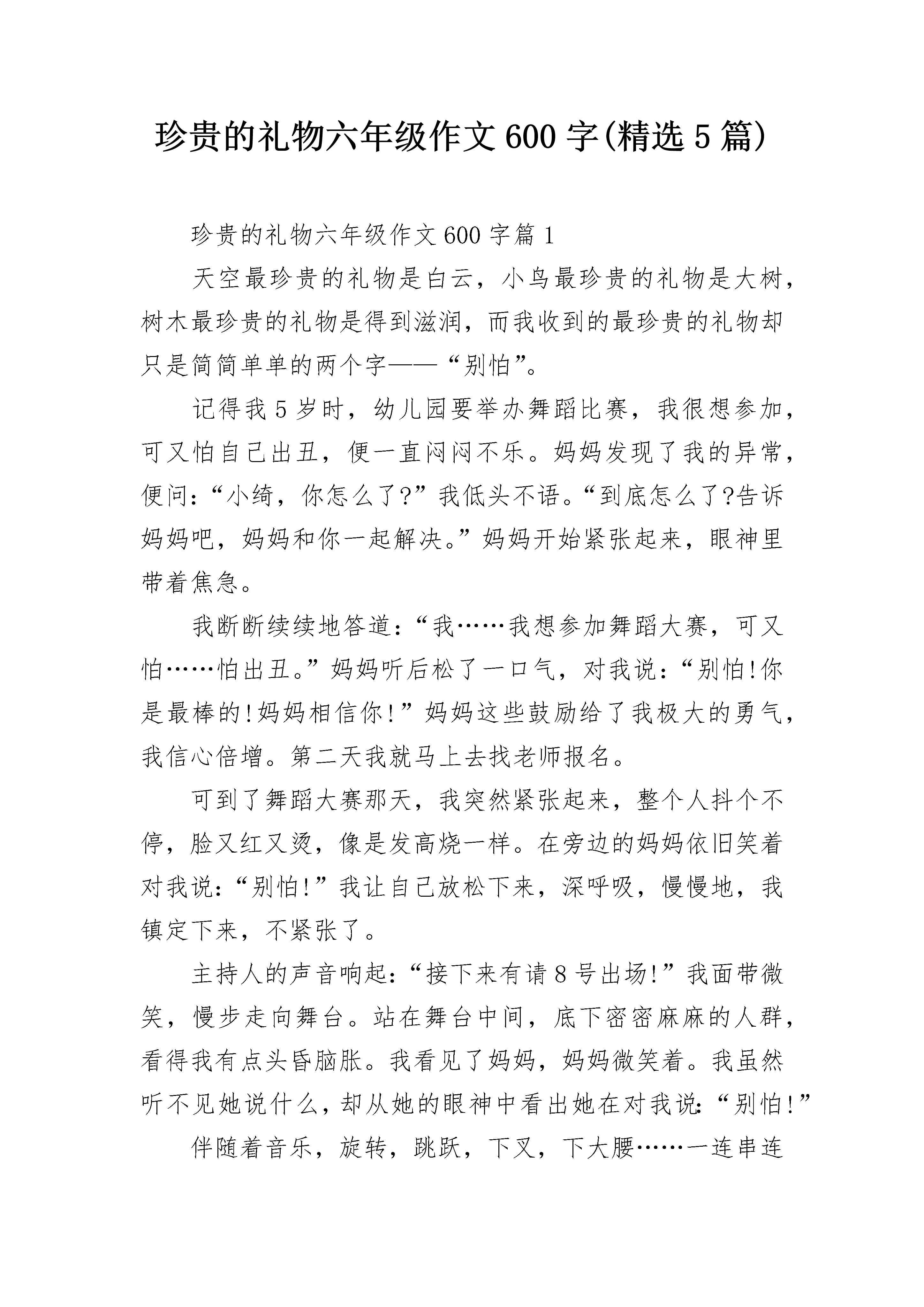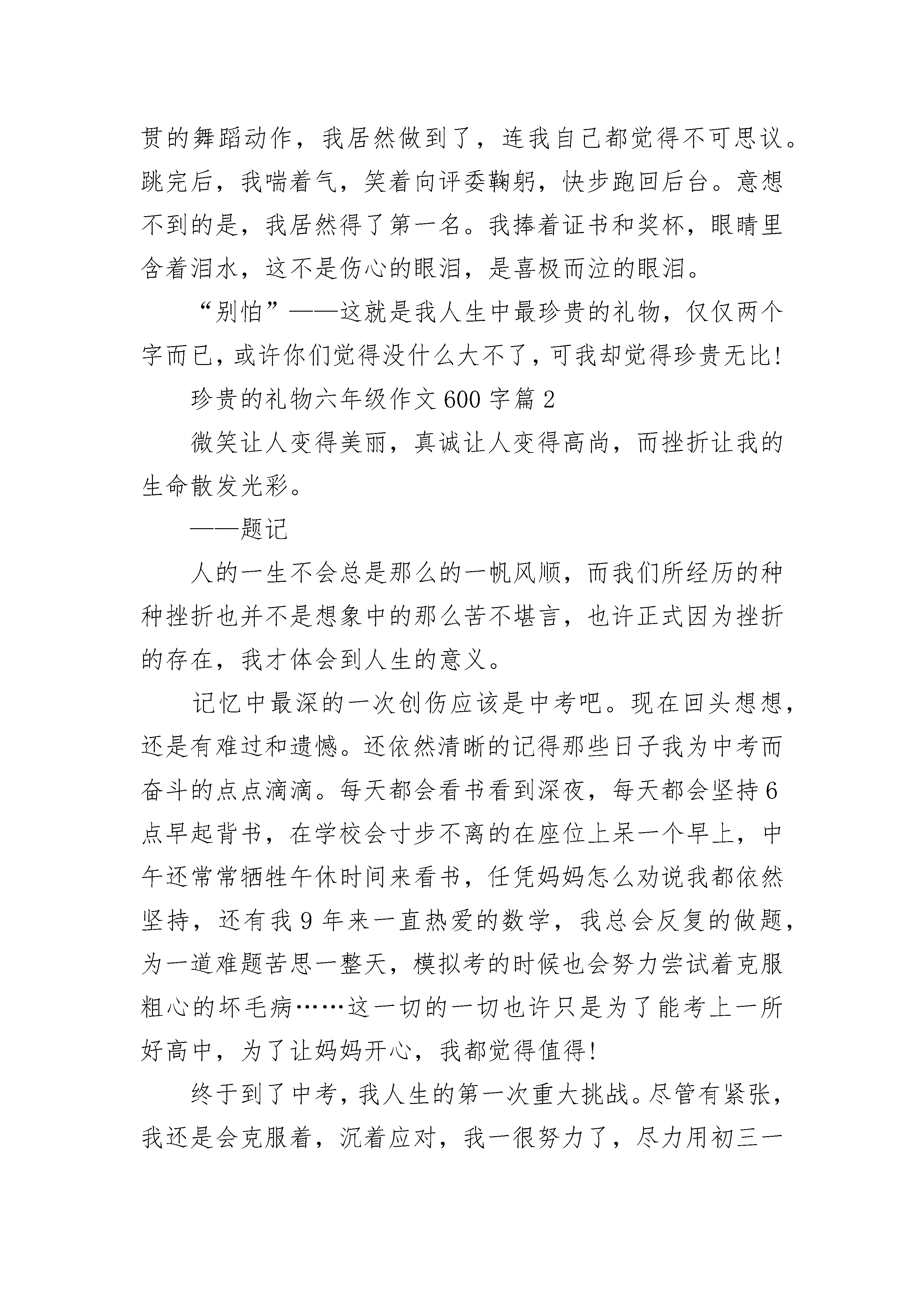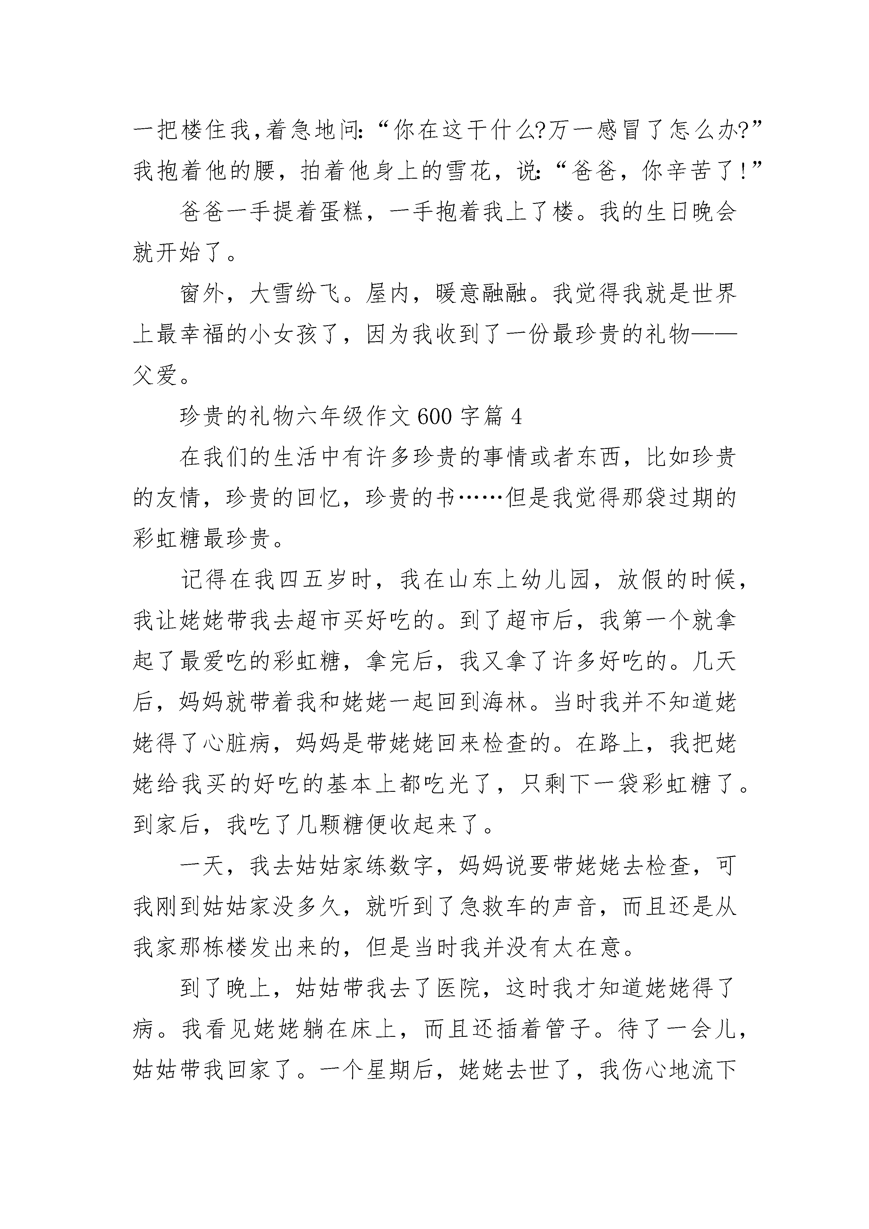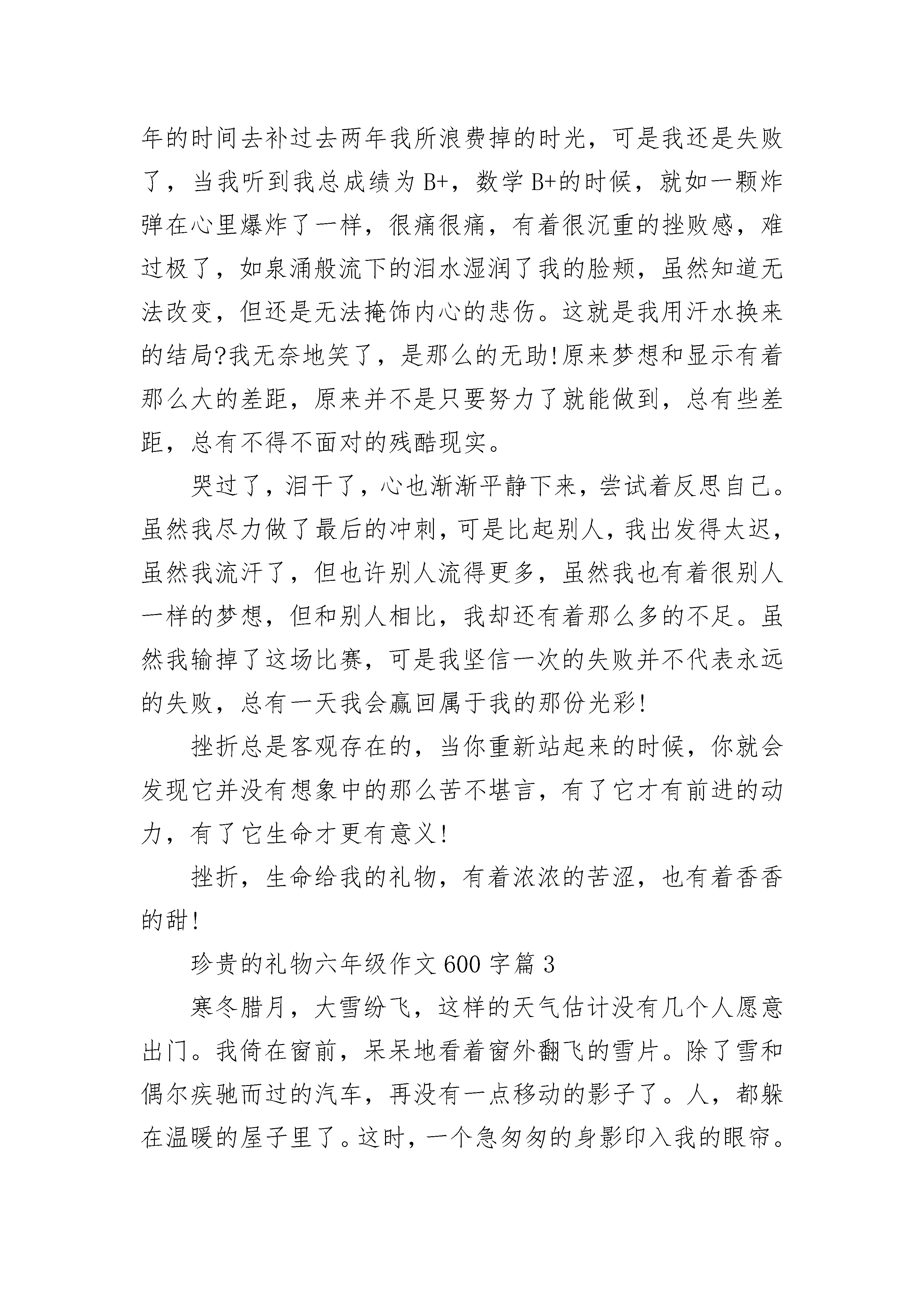 珍贵的礼物六年级作文600字(精选5篇)珍贵的礼物六年级作文600字篇1天空最珍贵的礼物是白云,小鸟最珍贵的礼物是大树,树木最珍贵的礼物是得到滋润,而我收到的最珍贵的礼物却只是简简单单的两个字——“别怕”。记得我5岁时,幼儿园要举办舞蹈比赛,我很想参加,可又怕自己出丑,便一直闷闷不乐。妈妈发现了我的异常,便问:“小绮,你怎么了?”我低头不语。“到底怎么了?告诉妈妈吧,妈妈和你一起解决。”妈妈开始紧张起来,眼神里带着焦急。我断断续续地答道:“我……我想参加舞蹈大赛,可又怕……怕出丑。”妈妈听后松了一口气,对我说:“别怕!你是最棒的!妈妈相信你!”妈妈这些鼓励给了我极大的勇气,我信心倍增。第二天我就马上去找老师报名。可到了舞蹈大赛那天,我突然紧张起来,整个人抖个不停,脸又红又烫,像是发高烧一样。在旁边的妈妈依旧笑着对我说:“别怕!”我让自己放松下来,深呼吸,慢慢地,我镇定下来,不紧张了。主持人的声音响起:“接下来有请8号出场!”我面带微笑,慢步走向舞台。站在舞台中间,底下密密麻麻的人群,看得我有点头昏脑胀。我看见了妈妈,妈妈微笑着。我虽然听不见她说什么,却从她的眼神中看出她在对我说:“别怕!”伴随着音乐,旋转,跳跃,下叉,下大腰……一连串连贯的舞蹈动作,我居然做到了,连我自己都觉得不可思议。跳完后,我喘着气,笑着向评委鞠躬,快步跑回后台。意想不到的是,我居然得了第一名。我捧着证书和奖杯,眼睛里含着泪水,这不是伤心的眼泪,是喜极而泣的眼泪。“别怕”——这就是我人生中最珍贵的礼物,仅仅两个字而已,或许你们觉得没什么大不了,可我却觉得珍贵无比!珍贵的礼物六年级作文600字篇2微笑让人变得美丽,真诚让人变得高尚,而挫折让我的生命散发光彩。——题记人的一生不会总是那么的一帆风顺,而我们所经历的种种挫折也并不是想象中的那么苦不堪言,也许正式因为挫折的存在,我才体会到人生的意义。记忆中最深的一次创伤应该是中考吧。现在回头想想,还是有难过和遗憾。还依然清晰的记得那些日子我为中考而奋斗的点点滴滴。每天都会看书看到深夜,每天都会坚持6点早起背书,在学校会寸步不离的在座位上呆一个早上,中午还常常牺牲午休时间来看书,任凭妈妈怎么劝说我都依然坚持,还有我9年来一直热爱的数学,我总会反复的做题,为一道难题苦思一整天,模拟考的时候也会努力尝试着克服粗心的坏毛病……这一切的一切也许只是为了能考上一所好高中,为了让妈妈开心,我都觉得值得!终于到了中考,我人生的第一次重大挑战。尽管有紧张,我还是会克服着,沉着应对,我一很努力了,尽力用初三一年的时间去补过去两年我所浪费掉的时光,可是我还是失败了,当我听到我总成绩为B+,数学B+的时候,就如一颗炸弹在心里爆炸了一样,很痛很痛,有着很沉重的挫败感,难过极了,如泉涌般流下的泪水湿润了我的脸颊,虽然知道无法改变,但还是无法掩饰内心的悲伤。这就是我用汗水换来的结局?我无奈地笑了,是那么的无助!原来梦想和显示有着那么大的差距,原来并不是只要努力了就能做到,总有些差距,总有不得不面对的残酷现实。哭过了,泪干了,心也渐渐平静下来,尝试着反思自己。虽然我尽力做了最后的冲刺,可是比起别人,我出发得太迟,虽然我流汗了,但也许别人流得更多,虽然我也有着很别人一样的梦想,但和别人相比,我却还有着那么多的不足。虽然我输掉了这场比赛,可是我坚信一次的失败并不代表永远的失败,总有一天我会赢回属于我的那份光彩!挫折总是客观存在的,当你重新站起来的时候,你就会发现它并没有想象中的那么苦不堪言,有了它才有前进的动力,有了它生命才更有意义!挫折,生命给我的礼物,有着浓浓的苦涩,也有着香香的甜!珍贵的礼物六年级作文600字篇3寒冬腊月,大雪纷飞,这样的天气估计没有几个人愿意出门。我倚在窗前,呆呆地看着窗外翻飞的雪片。除了雪和偶尔疾驰而过的汽车,再没有一点移动的影子了。人,都躲在温暖的屋子里了。这时,一个急匆匆的身影印入我的眼帘。定睛一看,是一个叔叔提着蛋糕在铺满雪的大街上飞奔。我的眼眶一热,一滴泪珠夺眶而出。不知道这是为什么?或许是他们太像了!同样的情景。还记得那年我才七岁,同所有同龄人一样期盼着生日的到来。忙碌了一天的父亲在沙发上休息,母亲则在做饭。那年的冬天特别早,才进农历十月,就下雪了,那晚,雪似乎很大,外面下着雪,我无聊地玩起了日历,翻到一页,眼光突然定在小小的“3”上面。今天是农历十月初三!我这才想起来今天是我的生日。我一下跳了起来。父亲忙问我怎么了?我激动地说:“爸爸,今天……今天,是我的生日,我要吃蛋糕!”父亲拍了下额头,恍然大悟的样子,迟疑了一会儿,不无内疚地说道:“最近太忙了,竟忘了今天是女儿的生日,爸爸明天去给你买蛋糕。”我当然不答应,大叫起来:“不嘛,不嘛,蛋糕要今天吃才有意义”。我失声哭了出来。父亲慌了,连忙披上外套,推门出去。我