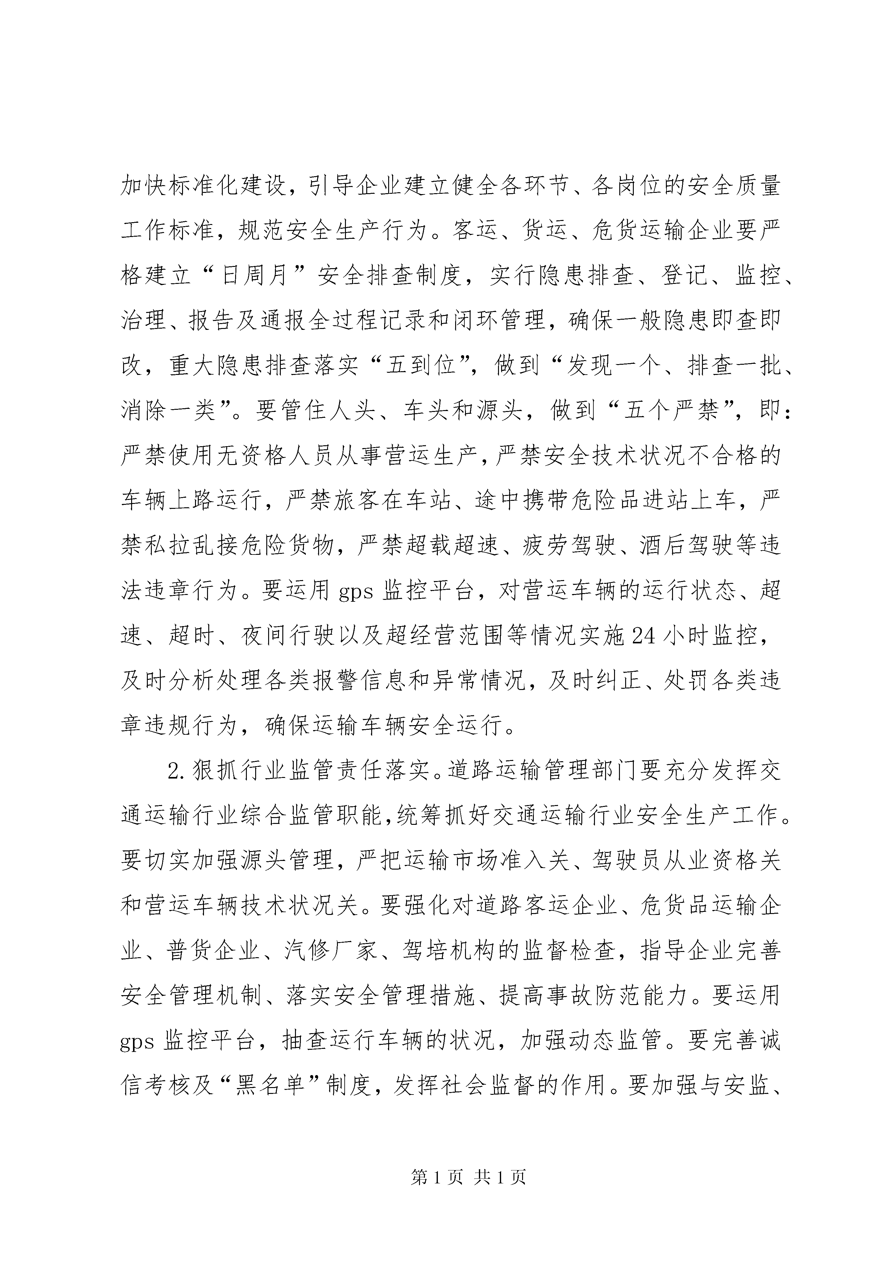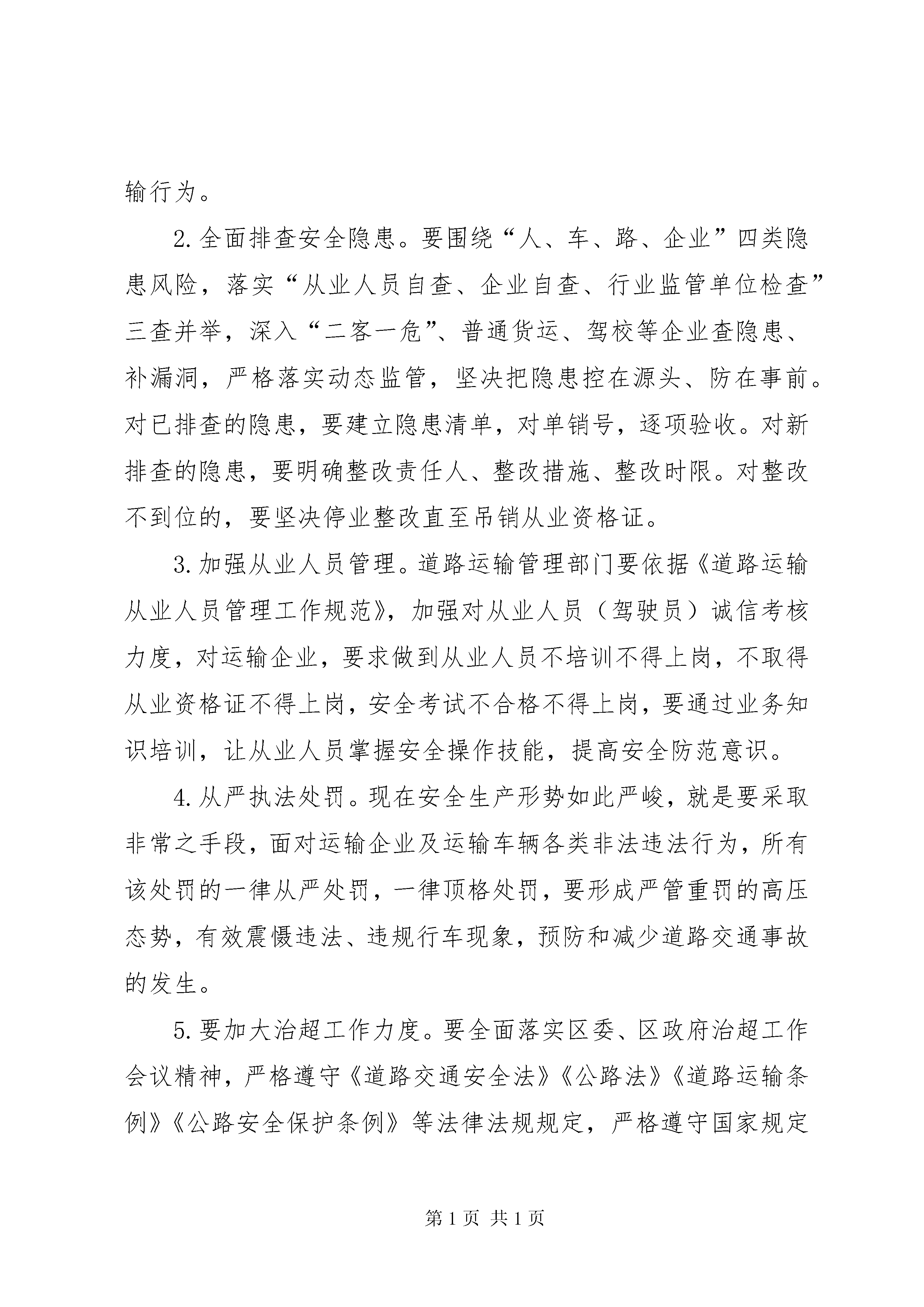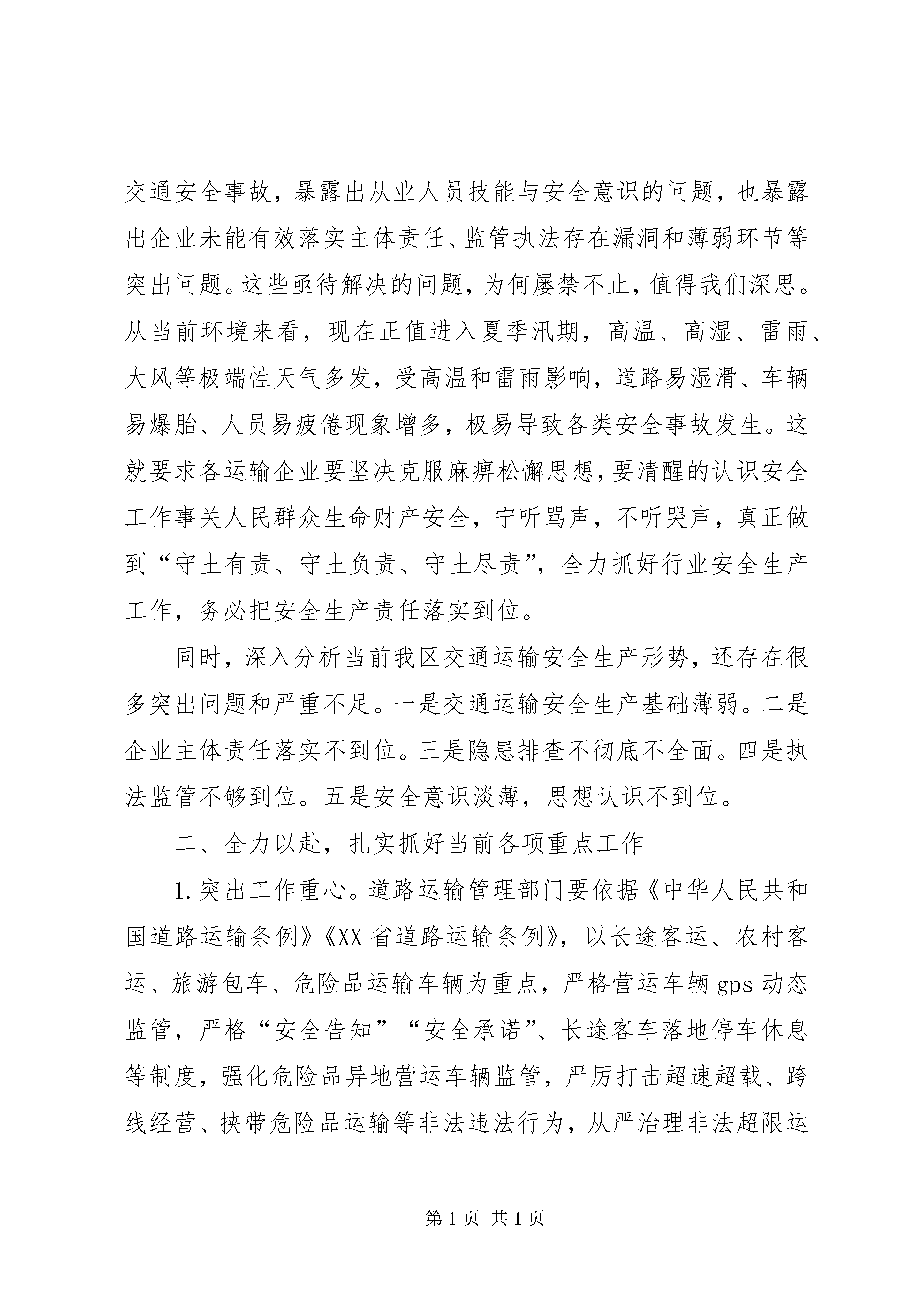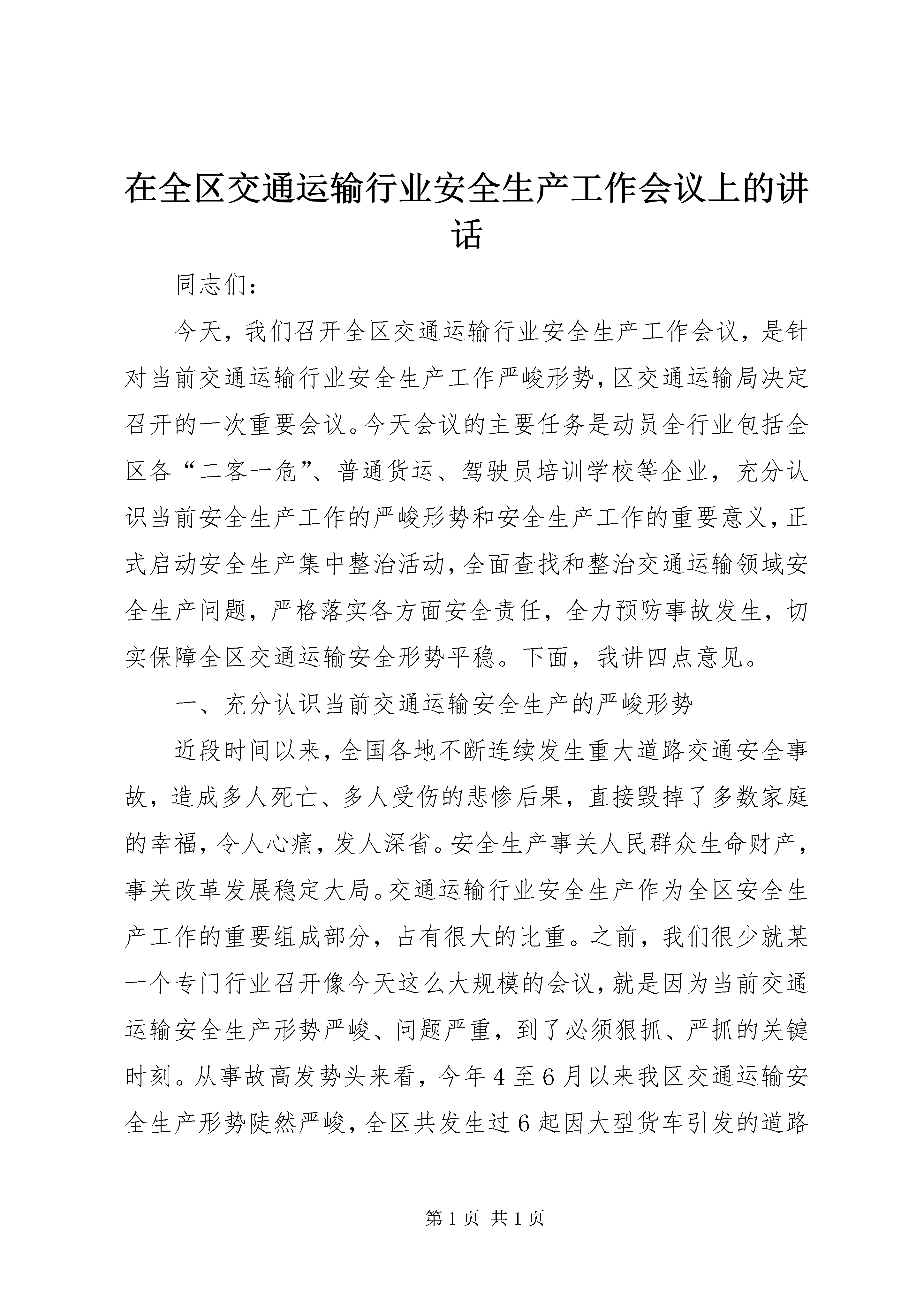 在全区交通运输行业安全生产工作会议上的讲话同志们:今天,我们召开全区交通运输行业安全生产工作会议,是针对当前交通运输行业安全生产工作严峻形势,区交通运输局决定召开的一次重要会议。今天会议的主要任务是动员全行业包括全区各“二客一危”、普通货运、驾驶员培训学校等企业,充分认识当前安全生产工作的严峻形势和安全生产工作的重要意义,正式启动安全生产集中整治活动,全面查找和整治交通运输领域安全生产问题,严格落实各方面安全责任,全力预防事故发生,切实保障全区交通运输安全形势平稳。下面,我讲四点意见。一、充分认识当前交通运输安全生产的严峻形势近段时间以来,全国各地不断连续发生重大道路交通安全事故,造成多人死亡、多人受伤的悲惨后果,直接毁掉了多数家庭的幸福,令人心痛,发人深省。安全生产事关人民群众生命财产,事关改革发展稳定大局。交通运输行业安全生产作为全区安全生产工作的重要组成部分,占有很大的比重。之前,我们很少就某一个专门行业召开像今天这么大规模的会议,就是因为当前交通运输安全生产形势严峻、问题严重,到了必须狠抓、严抓的关键时刻。从事故高发势头来看,今年4至6月以来我区交通运输安全生产形势陡然严峻,全区共发生过6起因大型货车引发的道路交通安全事故,暴露出从业人员技能与安全意识的问题,也暴露出企业未能有效落实主体责任、监管执法存在漏洞和薄弱环节等突出问题。这些亟待解决的问题,为何屡禁不止,值得我们深思。从当前环境来看,现在正值进入夏季汛期,高温、高湿、雷雨、大风等极端性天气多发,受高温和雷雨影响,道路易湿滑、车辆易爆胎、人员易疲倦现象增多,极易导致各类安全事故发生。这就要求各运输企业要坚决克服麻痹松懈思想,要清醒的认识安全工作事关人民群众生命财产安全,宁听骂声,不听哭声,真正做到“守土有责、守土负责、守土尽责”,全力抓好行业安全生产工作,务必把安全生产责任落实到位。同时,深入分析当前我区交通运输安全生产形势,还存在很多突出问题和严重不足。一是交通运输安全生产基础薄弱。二是企业主体责任落实不到位。三是隐患排查不彻底不全面。四是执法监管不够到位。五是安全意识淡薄,思想认识不到位。二、全力以赴,扎实抓好当前各项重点工作1.突出工作重心。道路运输管理部门要依据《中华人民共和国道路运输条例》《XX省道路运输条例》,以长途客运、农村客运、旅游包车、危险品运输车辆为重点,严格营运车辆gps动态监管,严格“安全告知”“安全承诺”、长途客车落地停车休息等制度,强化危险品异地营运车辆监管,严厉打击超速超载、跨线经营、挟带危险品运输等非法违法行为,从严治理非法超限运输行为。2.全面排查安全隐患。要围绕“人、车、路、企业”四类隐患风险,落实“从业人员自查、企业自查、行业监管单位检查”三查并举,深入“二客一危”、普通货运、驾校等企业查隐患、补漏洞,严格落实动态监管,坚决把隐患控在源头、防在事前。对已排查的隐患,要建立隐患清单,对单销号,逐项验收。对新排查的隐患,要明确整改责任人、整改措施、整改时限。对整改不到位的,要坚决停业整改直至吊销从业资格证。3.加强从业人员管理。道路运输管理部门要依据《道路运输从业人员管理工作规范》,加强对从业人员(驾驶员)诚信考核力度,对运输企业,要求做到从业人员不培训不得上岗,不取得从业资格证不得上岗,安全考试不合格不得上岗,要通过业务知识培训,让从业人员掌握安全操作技能,提高安全防范意识。4.从严执法处罚。现在安全生产形势如此严峻,就是要采取非常之手段,面对运输企业及运输车辆各类非法违法行为,所有该处罚的一律从严处罚,一律顶格处罚,要形成严管重罚的高压态势,有效震慑违法、违规行车现象,预防和减少道路交通事故的发生。5.要加大治超工作力度。要全面落实区委、区政府治超工作会议精神,严格遵守《道路交通安全法》《公路法》《道路运输条例》《公路安全保护条例》等法律法规规定,严格遵守国家规定的车辆装载标准,严格落实矿山主体责任,严格执行“三不进站三不出站”管理规定,督促矿山业主不得为无道路运输证、无从业资格、非法改装的货运车辆装载货物。深入开展源管控和路面治超工作,釆取有效措施,依法从严查处违法超限超载车辆,保持对违法超限超载车辆零容忍的高压态势,确保道路运输车辆行车安全有序。6.要加强外籍货运车辆监管。在查处本地货运车辆的同时,特别要加强对外籍货运车辆的查处,对超载超速、证件失效、态度恶劣的行为,要严厉查处,强力打击,并发函至车籍所在地,提请当地有关部门加强处理,同时要求对方将处理结果在一定时间内回复给我区有关部门,形成闭环处理流程。7.严厉追责问责。要严格按照行政问责规定,对责任不落实、监管不到位、失职渎职的,一律依法依规严厉问责、从重处罚。对发生人员伤亡人事故的企业,严格按照“四不放过”的原则,严格依法依规追究责任。对非