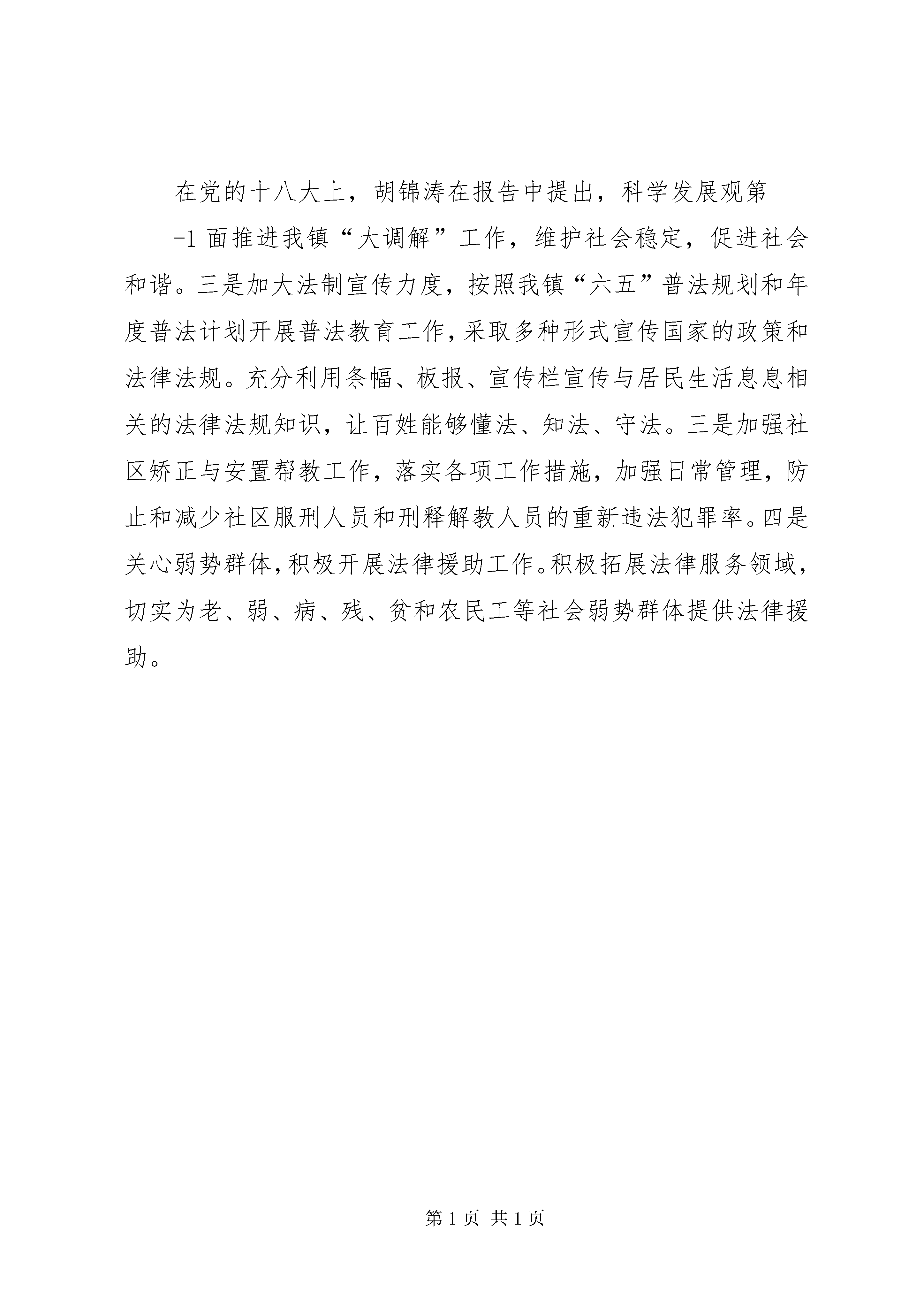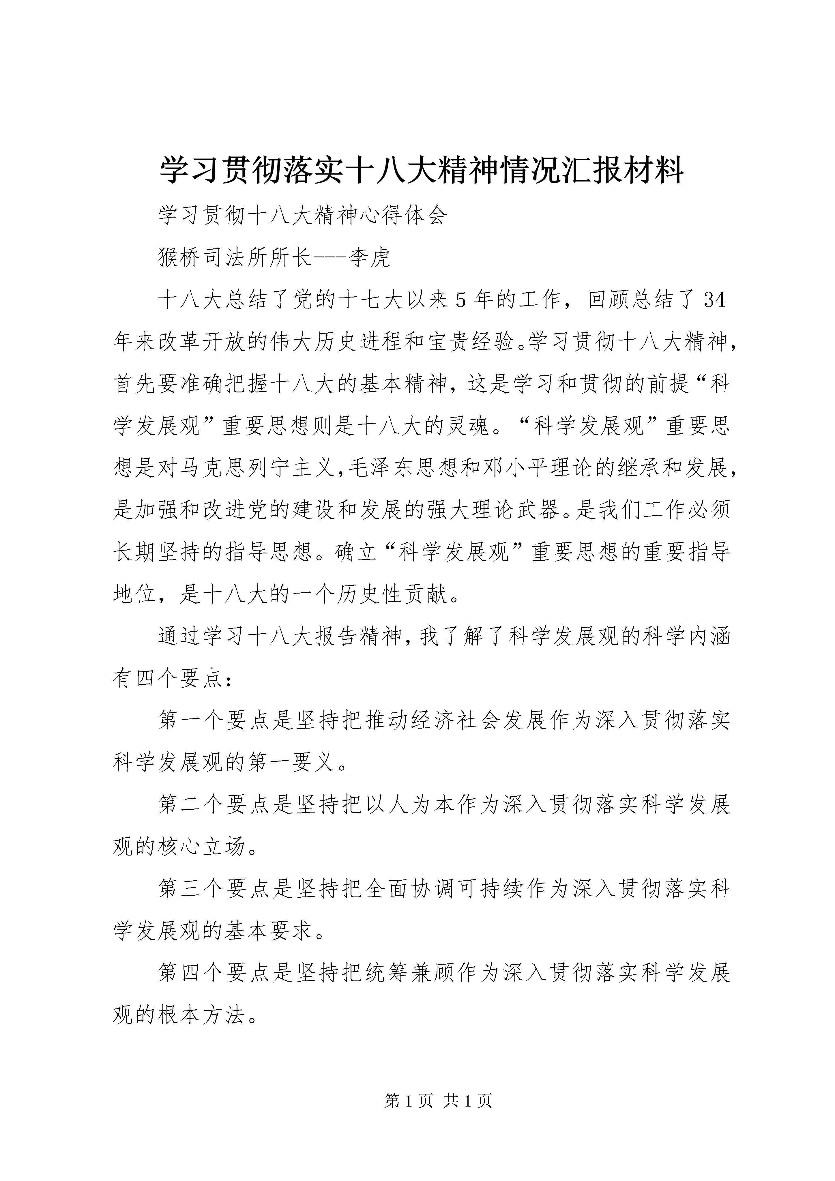 学习贯彻落实十八大精神情况汇报材料学习贯彻十八大精神心得体会猴桥司法所所长---李虎十八大总结了党的十七大以来5年的工作,回顾总结了34年来改革开放的伟大历史进程和宝贵经验。学习贯彻十八大精神,首先要准确把握十八大的基本精神,这是学习和贯彻的前提“科学发展观”重要思想则是十八大的灵魂。“科学发展观”重要思想是对马克思列宁主义,毛泽东思想和邓小平理论的继承和发展,是加强和改进党的建设和发展的强大理论武器。是我们工作必须长期坚持的指导思想。确立“科学发展观”重要思想的重要指导地位,是十八大的一个历史性贡献。通过学习十八大报告精神,我了解了科学发展观的科学内涵有四个要点:第一个要点是坚持把推动经济社会发展作为深入贯彻落实科学发展观的第一要义。第二个要点是坚持把以人为本作为深入贯彻落实科学发展观的核心立场。第三个要点是坚持把全面协调可持续作为深入贯彻落实科学发展观的基本要求。第四个要点是坚持把统筹兼顾作为深入贯彻落实科学发展观的根本方法。在党的十八大上,胡锦涛在报告中提出,科学发展观第-1面推进我镇“大调解”工作,维护社会稳定,促进社会和谐。三是加大法制宣传力度,按照我镇“六五”普法规划和年度普法计划开展普法教育工作,采取多种形式宣传国家的政策和法律法规。充分利用条幅、板报、宣传栏宣传与居民生活息息相关的法律法规知识,让百姓能够懂法、知法、守法。三是加强社区矫正与安置帮教工作,落实各项工作措施,加强日常管理,防止和减少社区服刑人员和刑释解教人员的重新违法犯罪率。四是关心弱势群体,积极开展法律援助工作。积极拓展法律服务领域,切实为老、弱、病、残、贫和农民工等社会弱势群体提供法律援助。