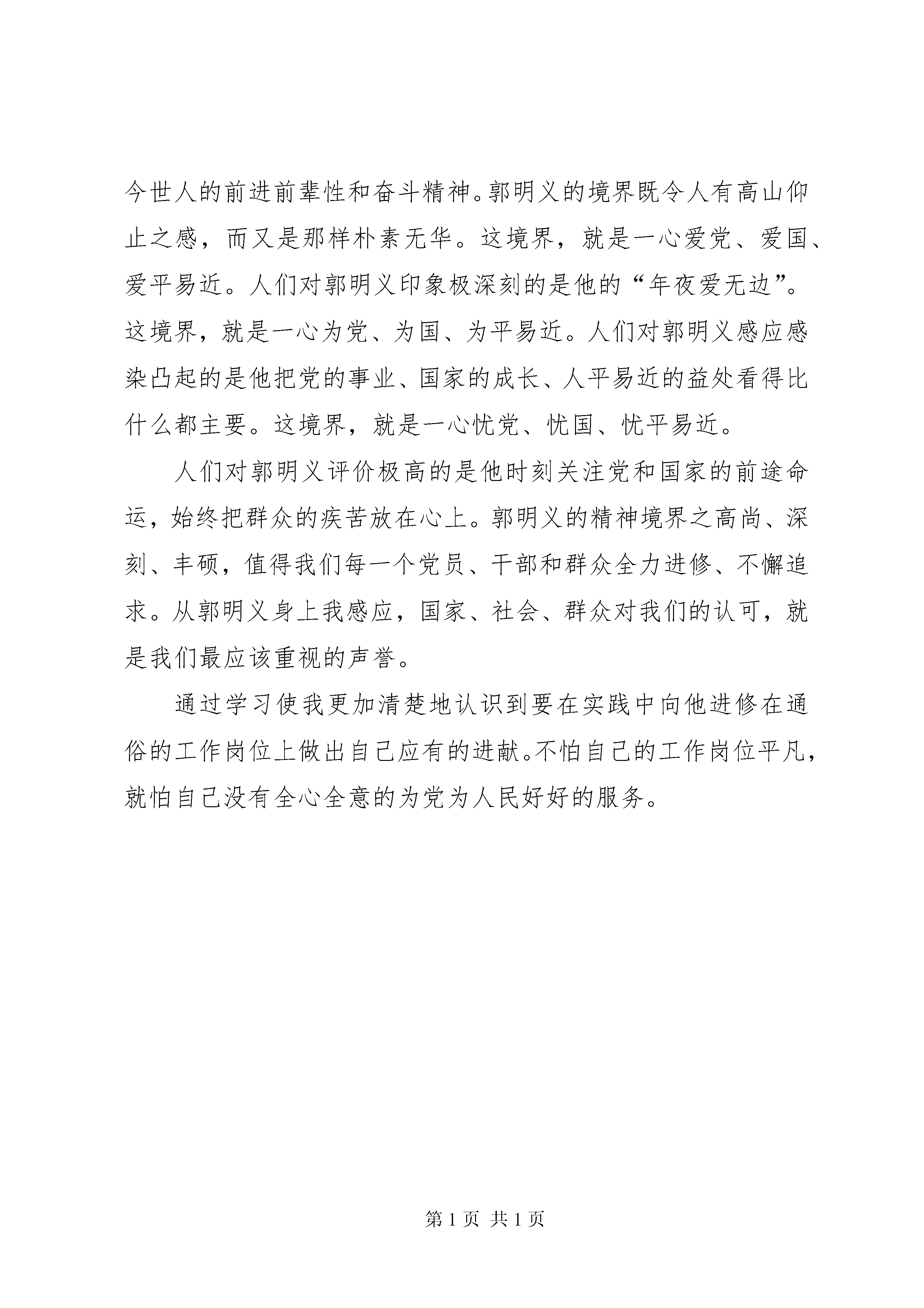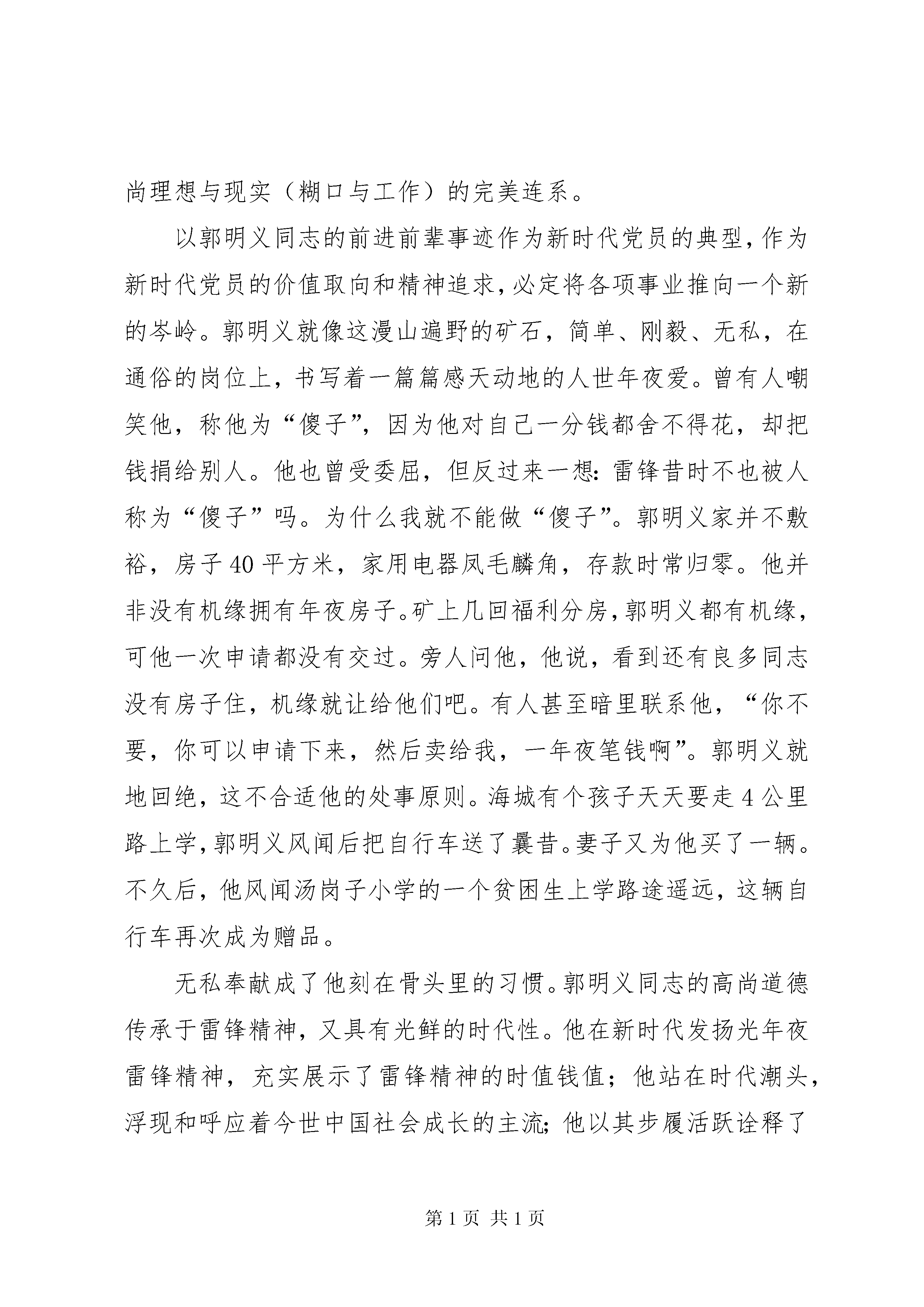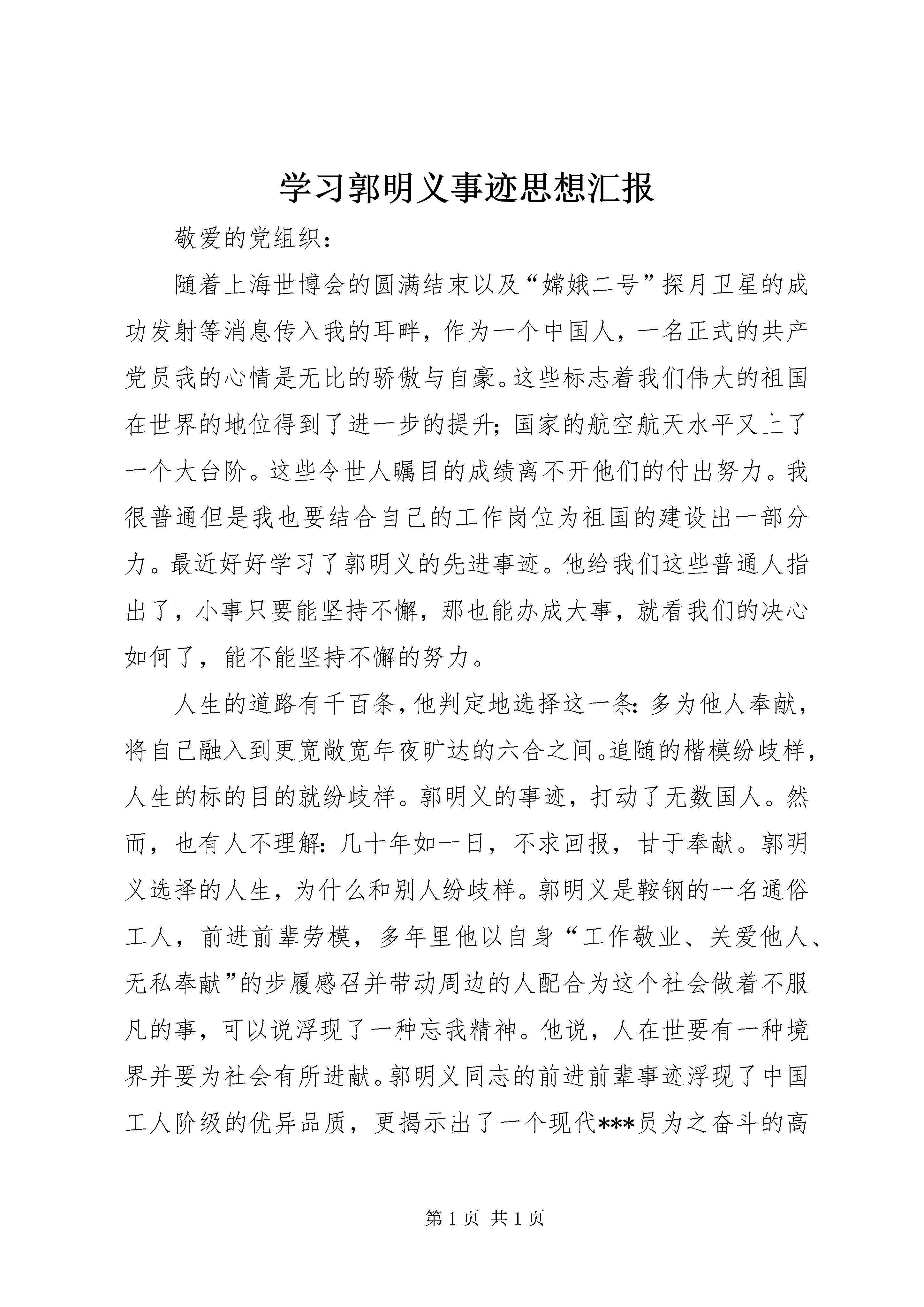 学习郭明义事迹思想汇报敬爱的党组织:随着上海世博会的圆满结束以及“嫦娥二号”探月卫星的成功发射等消息传入我的耳畔,作为一个中国人,一名正式的共产党员我的心情是无比的骄傲与自豪。这些标志着我们伟大的祖国在世界的地位得到了进一步的提升;国家的航空航天水平又上了一个大台阶。这些令世人瞩目的成绩离不开他们的付出努力。我很普通但是我也要结合自己的工作岗位为祖国的建设出一部分力。最近好好学习了郭明义的先进事迹。他给我们这些普通人指出了,小事只要能坚持不懈,那也能办成大事,就看我们的决心如何了,能不能坚持不懈的努力。人生的道路有千百条,他判定地选择这一条:多为他人奉献,将自己融入到更宽敞宽年夜旷达的六合之间。追随的楷模纷歧样,人生的标的目的就纷歧样。郭明义的事迹,打动了无数国人。然而,也有人不理解:几十年如一日,不求回报,甘于奉献。郭明义选择的人生,为什么和别人纷歧样。郭明义是鞍钢的一名通俗工人,前进前辈劳模,多年里他以自身“工作敬业、关爱他人、无私奉献”的步履感召并带动周边的人配合为这个社会做着不服凡的事,可以说浮现了一种忘我精神。他说,人在世要有一种境界并要为社会有所进献。郭明义同志的前进前辈事迹浮现了中国工人阶级的优异品质,更揭示出了一个现代***员为之奋斗的高尚理想与现实(糊口与工作)的完美连系。以郭明义同志的前进前辈事迹作为新时代党员的典型,作为新时代党员的价值取向和精神追求,必定将各项事业推向一个新的岑岭。郭明义就像这漫山遍野的矿石,简单、刚毅、无私,在通俗的岗位上,书写着一篇篇感天动地的人世年夜爱。曾有人嘲笑他,称他为“傻子”,因为他对自己一分钱都舍不得花,却把钱捐给别人。他也曾受委屈,但反过来一想:雷锋昔时不也被人称为“傻子”吗。为什么我就不能做“傻子”。郭明义家并不敷裕,房子40平方米,家用电器凤毛麟角,存款时常归零。他并非没有机缘拥有年夜房子。矿上几回福利分房,郭明义都有机缘,可他一次申请都没有交过。旁人问他,他说,看到还有良多同志没有房子住,机缘就让给他们吧。有人甚至暗里联系他,“你不要,你可以申请下来,然后卖给我,一年夜笔钱啊”。郭明义就地回绝,这不合适他的处事原则。海城有个孩子天天要走4公里路上学,郭明义风闻后把自行车送了曩昔。妻子又为他买了一辆。不久后,他风闻汤岗子小学的一个贫困生上学路途遥远,这辆自行车再次成为赠品。无私奉献成了他刻在骨头里的习惯。郭明义同志的高尚道德传承于雷锋精神,又具有光鲜的时代性。他在新时代发扬光年夜雷锋精神,充实展示了雷锋精神的时值钱值;他站在时代潮头,浮现和呼应着今世中国社会成长的主流;他以其步履活跃诠释了今世人的前进前辈性和奋斗精神。郭明义的境界既令人有高山仰止之感,而又是那样朴素无华。这境界,就是一心爱党、爱国、爱平易近。人们对郭明义印象极深刻的是他的“年夜爱无边”。这境界,就是一心为党、为国、为平易近。人们对郭明义感应感染凸起的是他把党的事业、国家的成长、人平易近的益处看得比什么都主要。这境界,就是一心忧党、忧国、忧平易近。人们对郭明义评价极高的是他时刻关注党和国家的前途命运,始终把群众的疾苦放在心上。郭明义的精神境界之高尚、深刻、丰硕,值得我们每一个党员、干部和群众全力进修、不懈追求。从郭明义身上我感应,国家、社会、群众对我们的认可,就是我们最应该重视的声誉。通过学习使我更加清楚地认识到要在实践中向他进修在通俗的工作岗位上做出自己应有的进献。不怕自己的工作岗位平凡,就怕自己没有全心全意的为党为人民好好的服务。