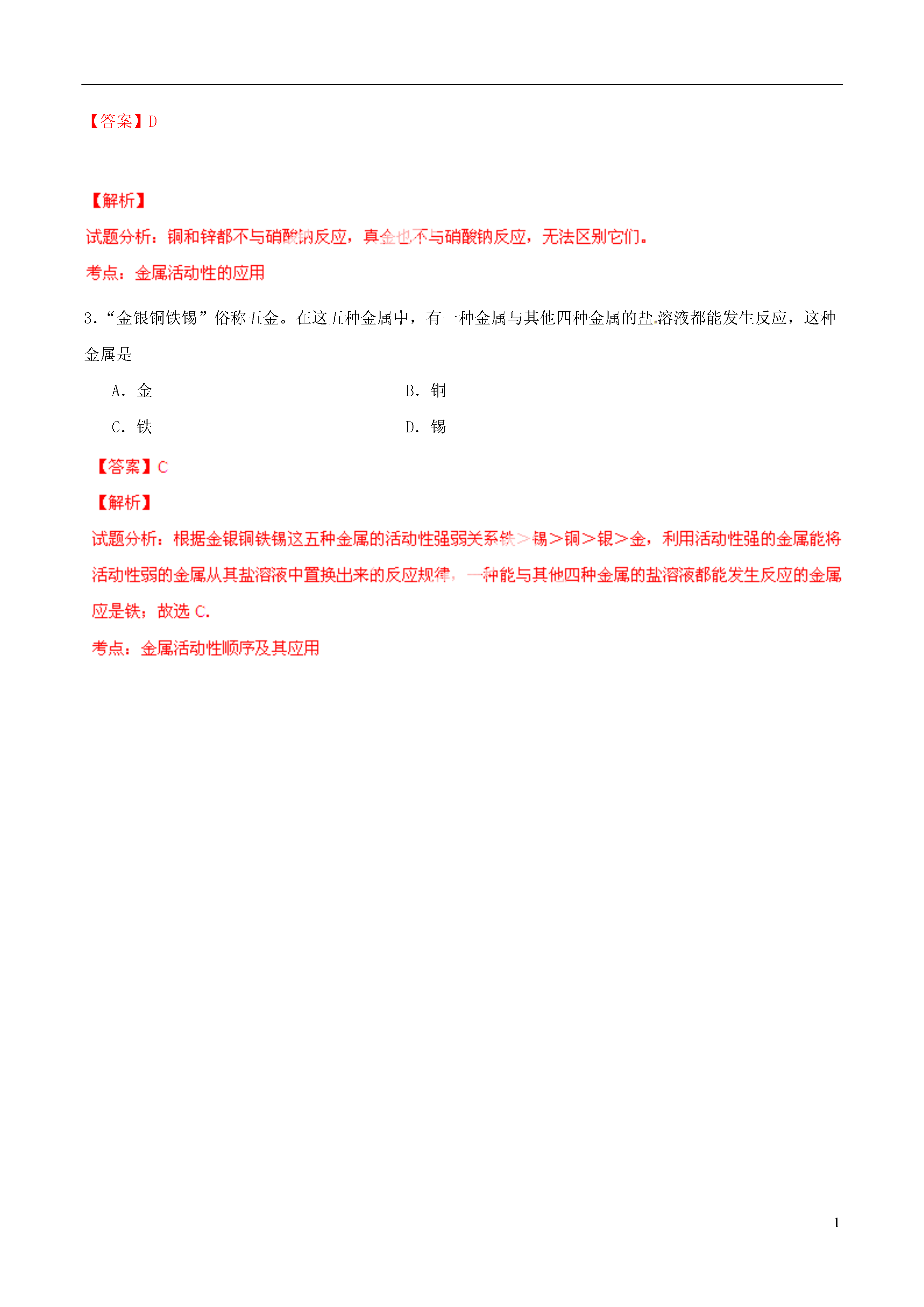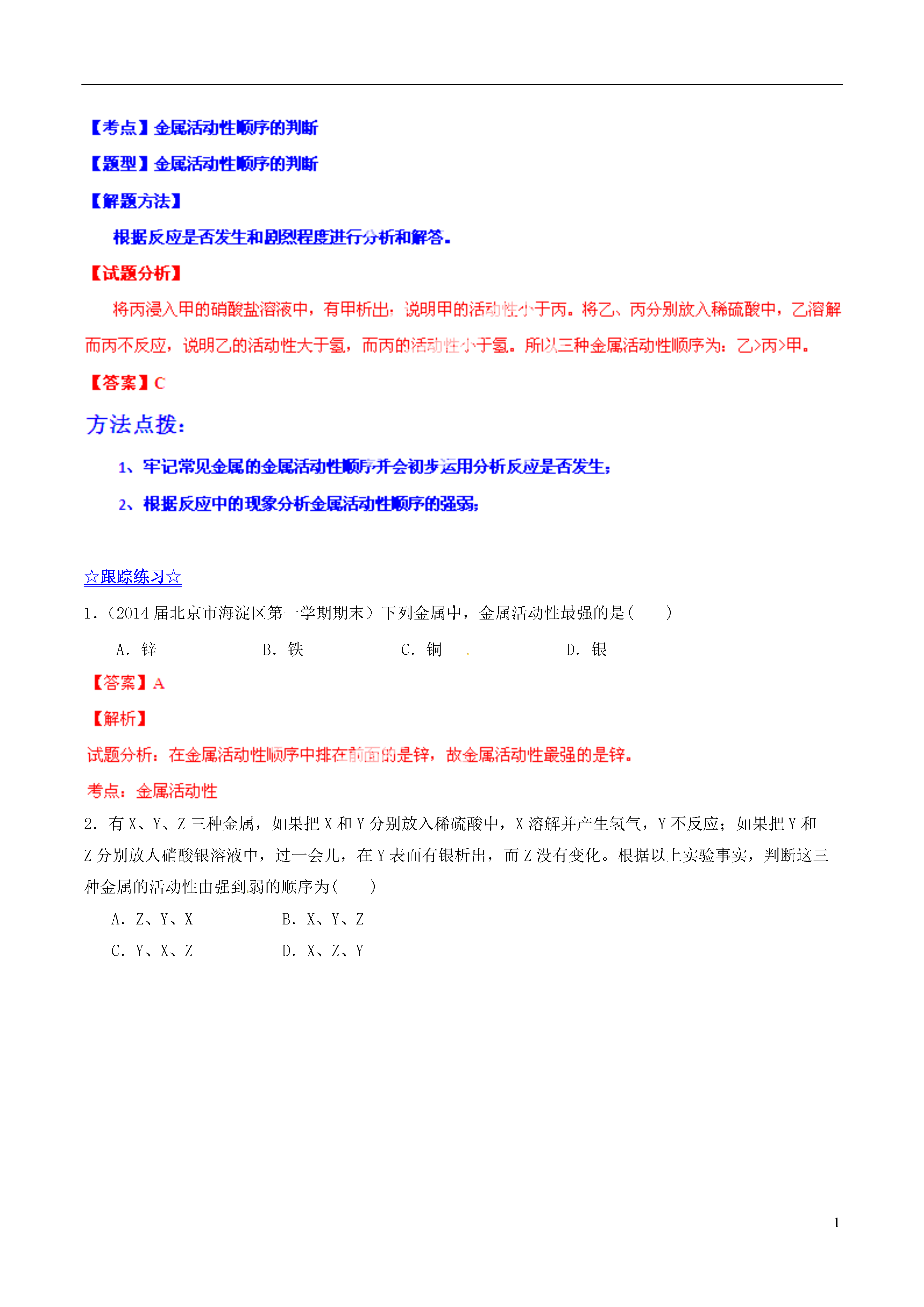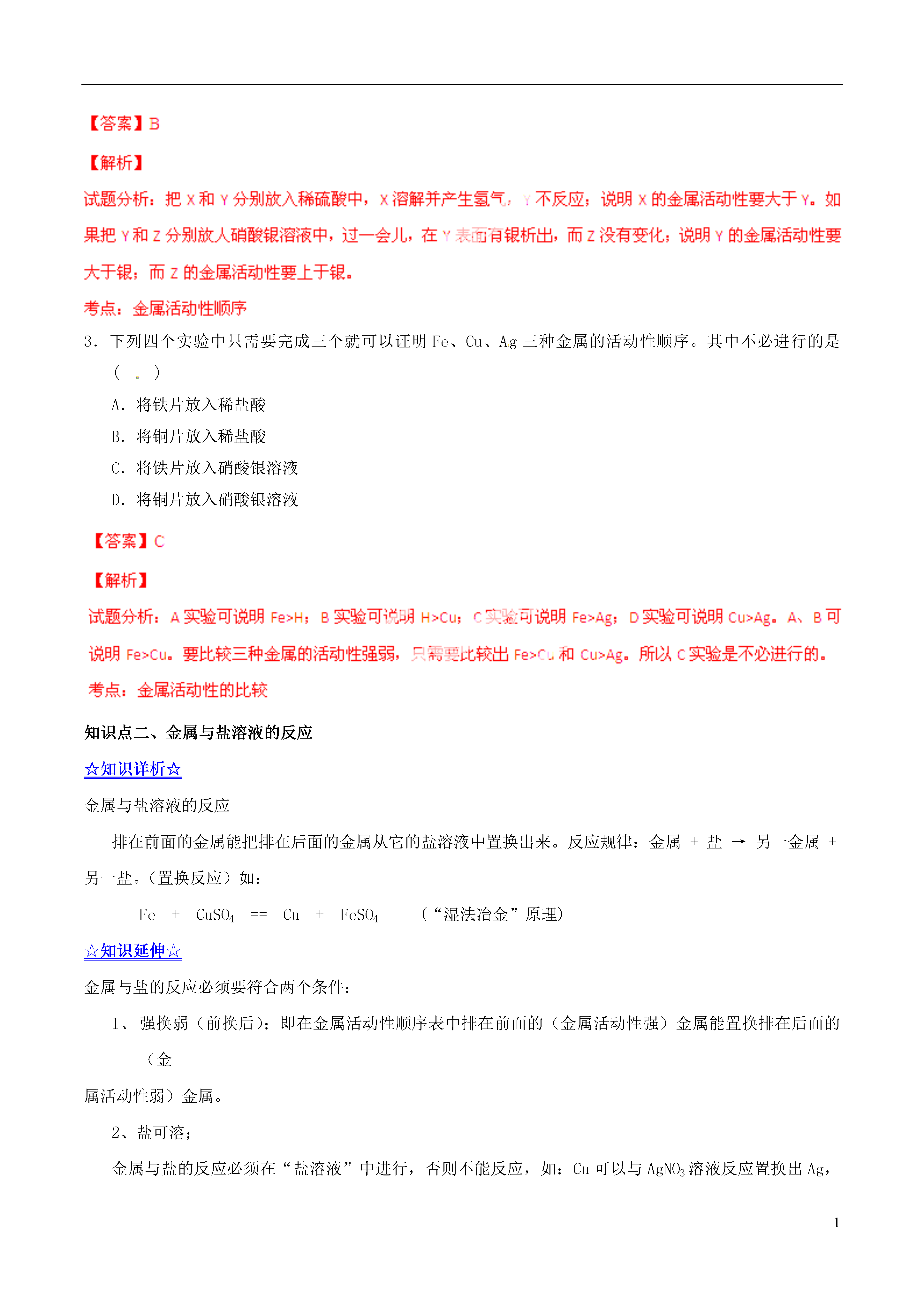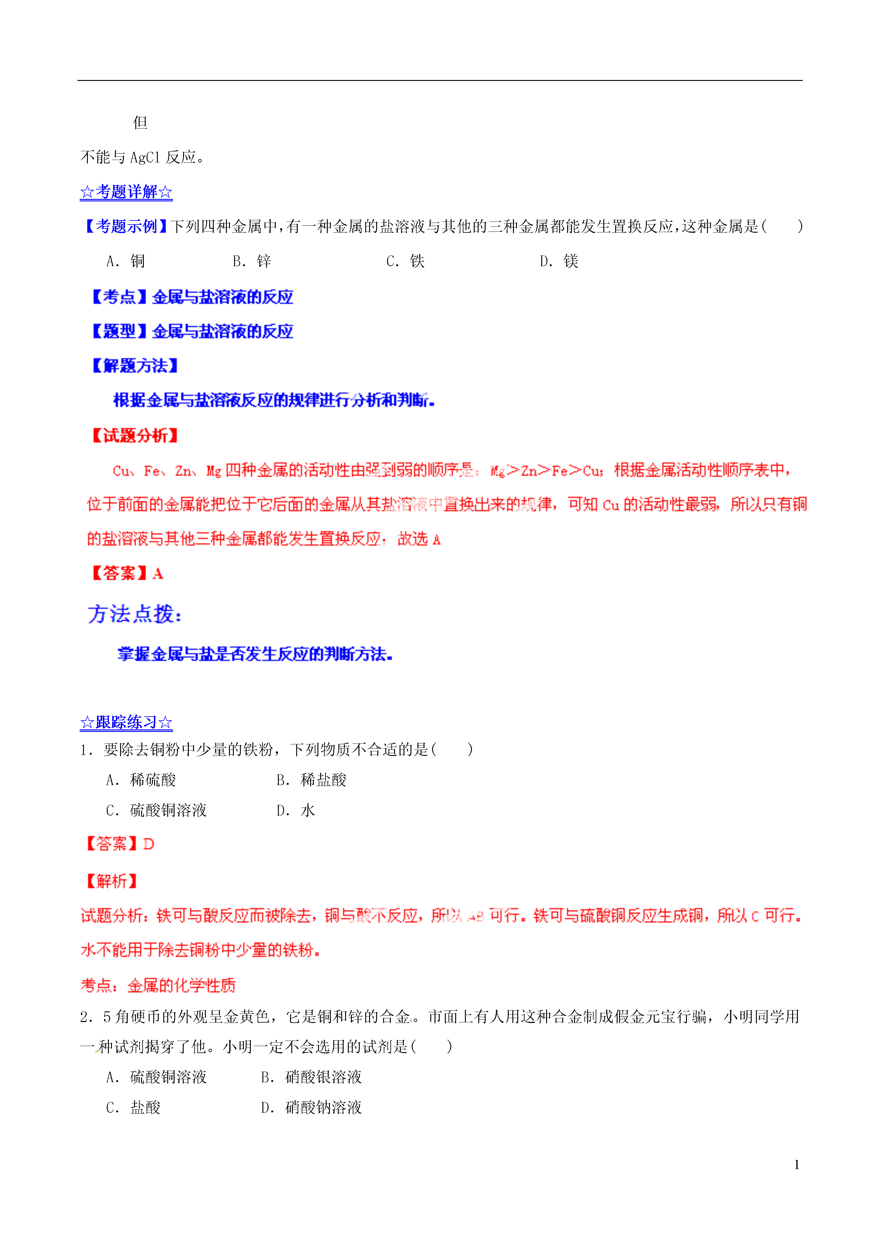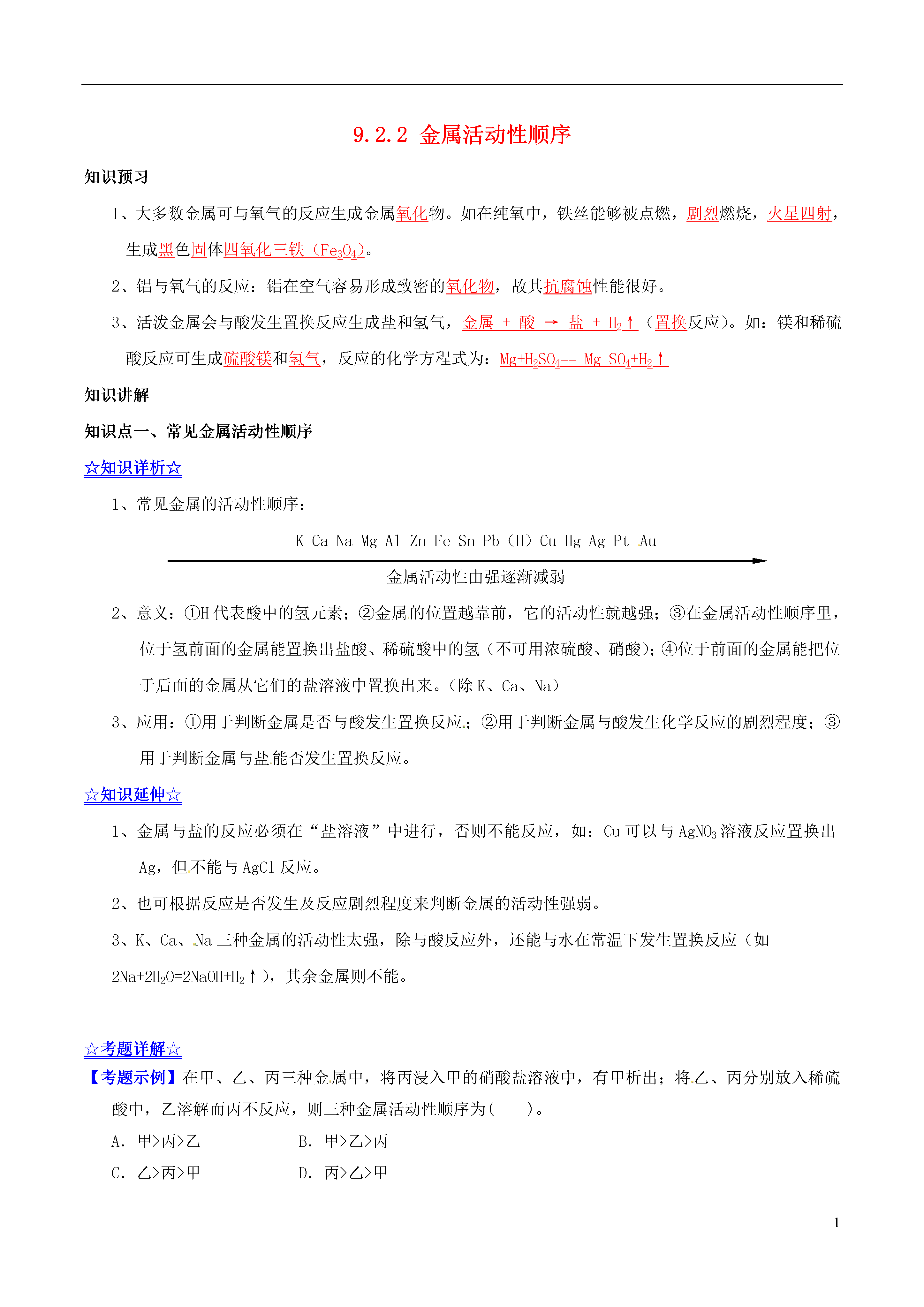 19.2.2金属活动性顺序知识预习1、大多数金属可与氧气的反应生成金属氧化物。如在纯氧中,铁丝能够被点燃,剧烈燃烧,火星四射,生成黑色固体四氧化三铁(Fe3O4)。2、铝与氧气的反应:铝在空气容易形成致密的氧化物,故其抗腐蚀性能很好。3、活泼金属会与酸发生置换反应生成盐和氢气,金属+酸→盐+H2↑(置换反应)。如:镁和稀硫酸反应可生成硫酸镁和氢气,反应的化学方程式为:Mg+H2SO4==MgSO4+H2↑知识讲解知识点一、常见金属活动性顺序☆知识详析☆1、常见金属的活动性顺序:KCaNaMgAlZnFeSnPb(H)CuHgAgPtAu金属活动性由强逐渐减弱2、意义:①H代表酸中的氢元素;②金属的位置越靠前,它的活动性就越强;③在金属活动性顺序里,位于氢前面的金属能置换出盐酸、稀硫酸中的氢(不可用浓硫酸、硝酸);④位于前面的金属能把位于后面的金属从它们的盐溶液中置换出来。(除K、Ca、Na)3、应用:①用于判断金属是否与酸发生置换反应;②用于判断金属与酸发生化学反应的剧烈程度;③用于判断金属与盐能否发生置换反应。☆知识延伸☆1、金属与盐的反应必须在“盐溶液”中进行,否则不能反应,如:Cu可以与AgNO3溶液反应置换出Ag,但不能与AgCl反应。2、也可根据反应是否发生及反应剧烈程度来判断金属的活动性强弱。3、K、Ca、Na三种金属的活动性太强,除与酸反应外,还能与水在常温下发生置换反应(如2Na+2H2O=2NaOH+H2↑),其余金属则不能。☆考题详解☆【考题示例】在甲、乙、丙三种金属中,将丙浸入甲的硝酸盐溶液中,有甲析出;将乙、丙分别放入稀硫酸中,乙溶解而丙不反应,则三种金属活动性顺序为()。A.甲>丙>乙B.甲>乙>丙C.乙>丙>甲D.丙>乙>甲☆跟踪练习☆1.(2014届北京市海淀区第一学期期末)下列金属中,金属活动性最强的是()A.锌B.铁C.铜D.银2.有X、Y、Z三种金属,如果把X和Y分别放入稀硫酸中,X溶解并产生氢气,Y不反应;如果把Y和Z分别放人硝酸银溶液中,过一会儿,在Y表面有银析出,而Z没有变化。根据以上实验事实,判断这三种金属的活动性由强到弱的顺序为()A.Z、Y、XB.X、Y、ZC.Y、X、ZD.X、Z、Y3.下列四个实验中只需要完成三个就可以证明Fe、Cu、Ag三种金属的活动性顺序。其中不必进行的是()A.将铁片放入稀盐酸B.将铜片放入稀盐酸C.将铁片放入硝酸银溶液D.将铜片放入硝酸银溶液知识点二、金属与盐溶液的反应☆知识详析☆金属与盐溶液的反应排在前面的金属能把排在后面的金属从它的盐溶液中置换出来。反应规律:金属+盐→另一金属+另一盐。(置换反应)如:Fe+CuSO4==Cu+FeSO4(“湿法冶金”原理)☆知识延伸☆金属与盐的反应必须要符合两个条件:强换弱(前换后);即在金属活动性顺序表中排在前面的(金属活动性强)金属能置换排在后面的(金属活动性弱)金属。2、盐可溶;金属与盐的反应必须在“盐溶液”中进行,否则不能反应,如:Cu可以与AgNO3溶液反应置换出Ag,但不能与AgCl反应。☆考题详解☆【考题示例】下列四种金属中,有一种金属的盐溶液与其他的三种金属都能发生置换反应,这种金属是()A.铜B.锌C.铁D.镁☆跟踪练习☆1.要除去铜粉中少量的铁粉,下列物质不合适的是()A.稀硫酸B.稀盐酸C.硫酸铜溶液D.水2.5角硬币的外观呈金黄色,它是铜和锌的合金。市面上有人用这种合金制成假金元宝行骗,小明同学用一种试剂揭穿了他。小明一定不会选用的试剂是()A.硫酸铜溶液B.硝酸银溶液C.盐酸D.硝酸钠溶液【答案】D3.“金银铜铁锡”俗称五金。在这五种金属中,有一种金属与其他四种金属的盐溶液都能发生反应,这种金属是A.金B.铜C.铁D.锡
