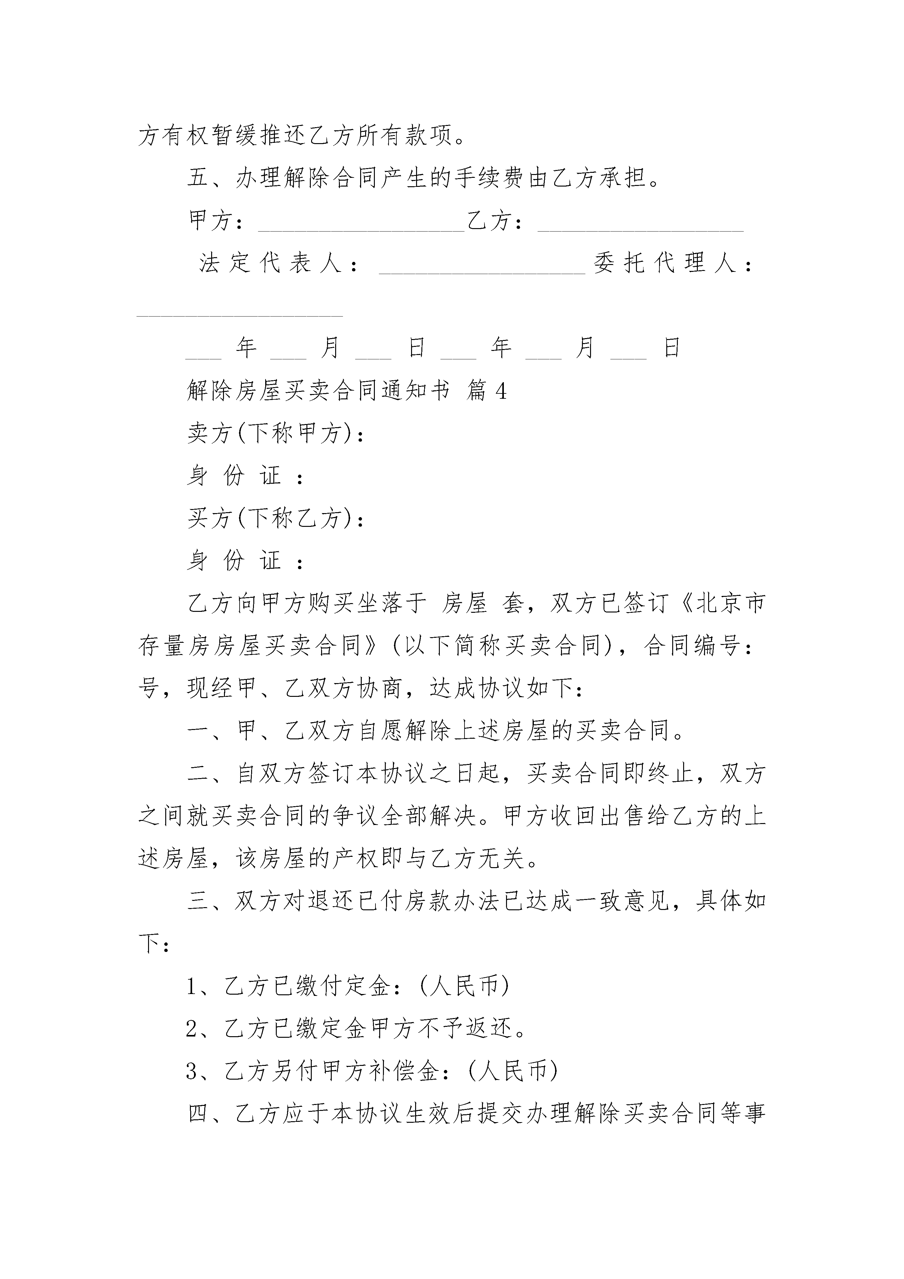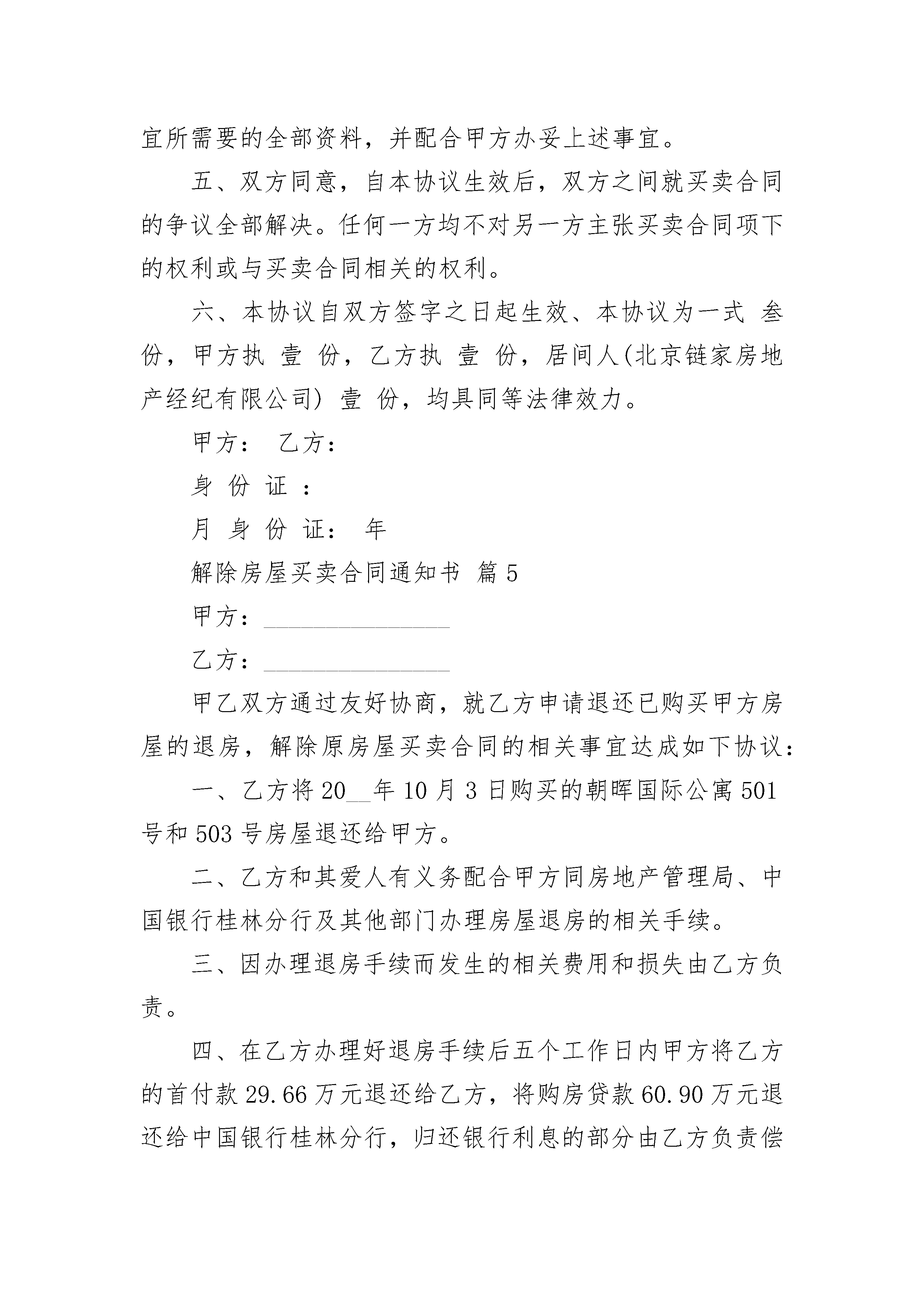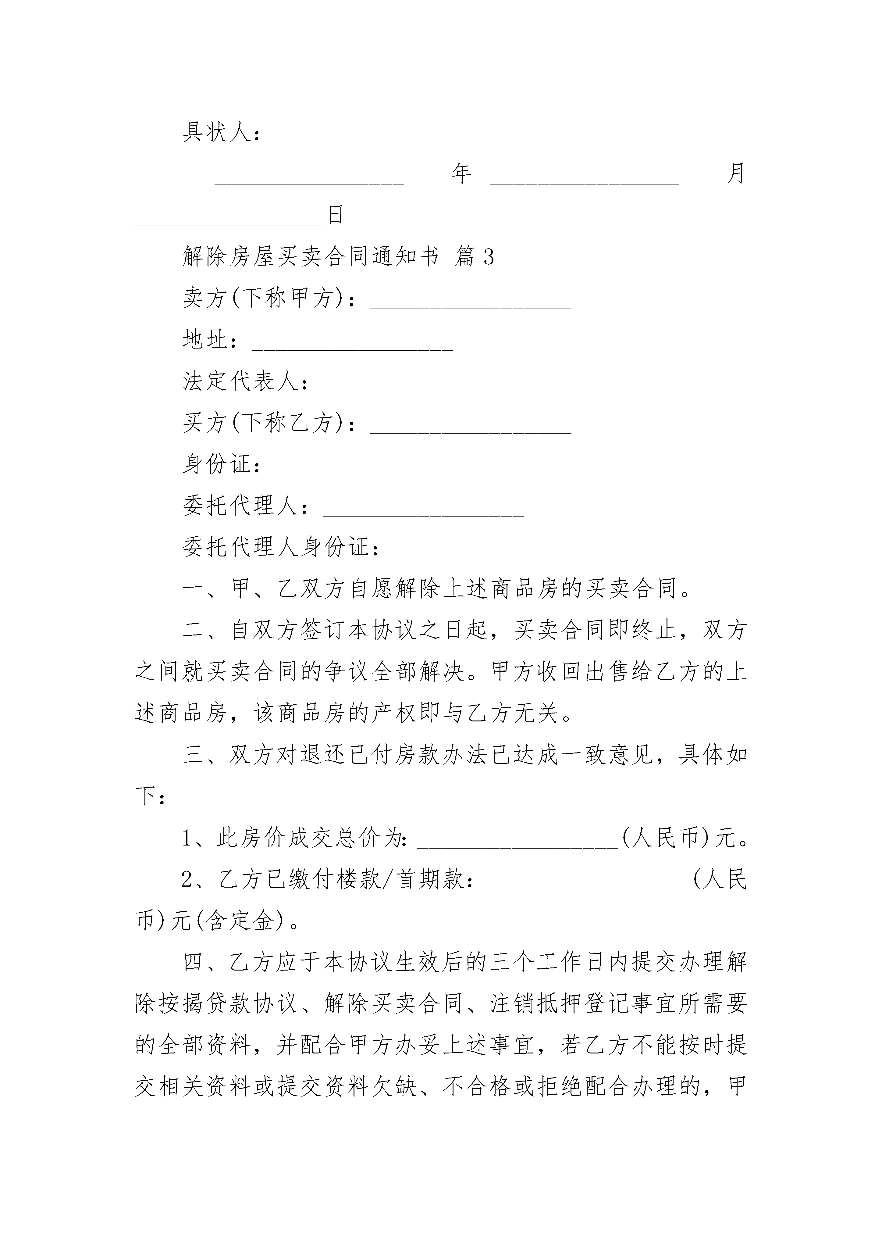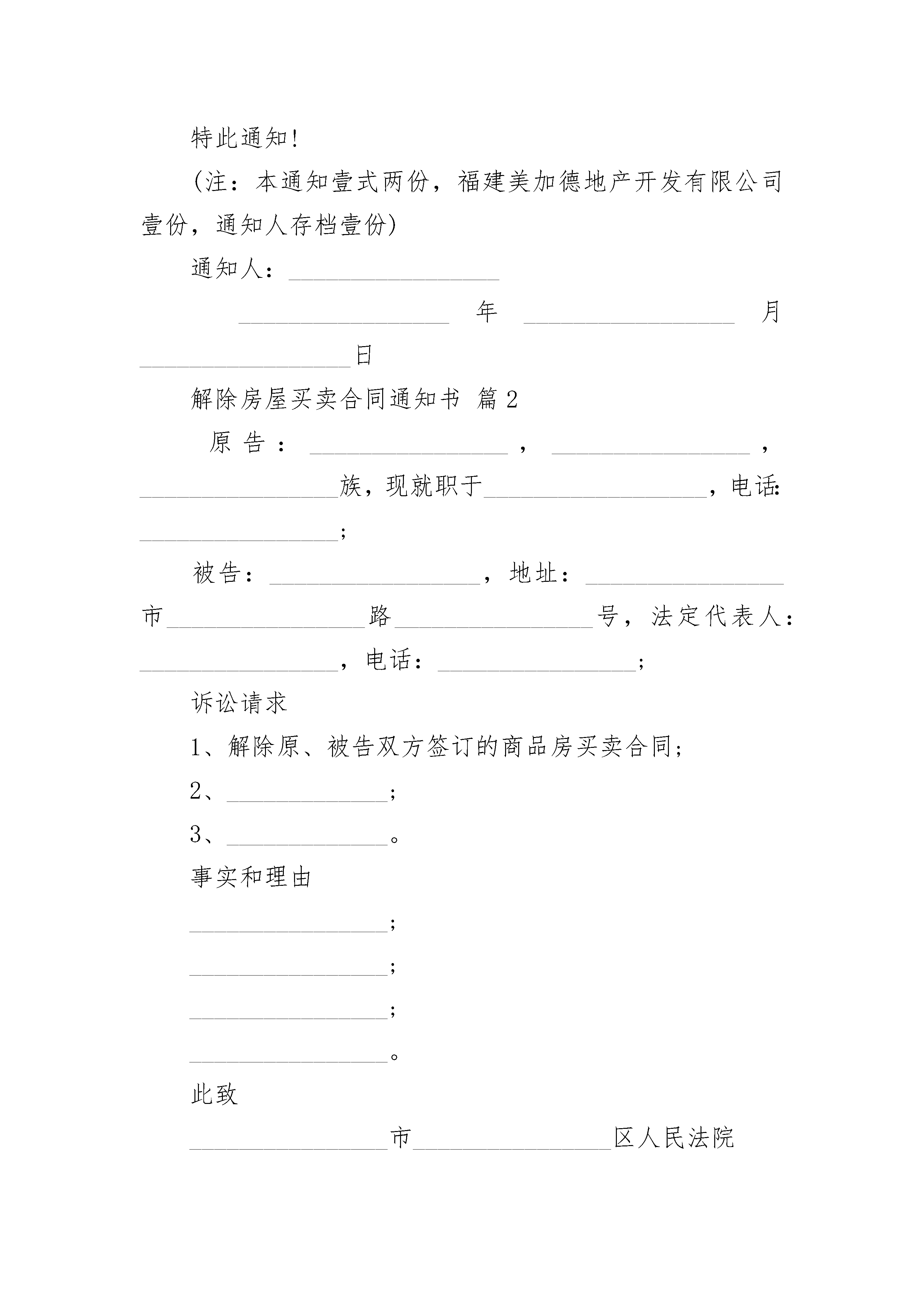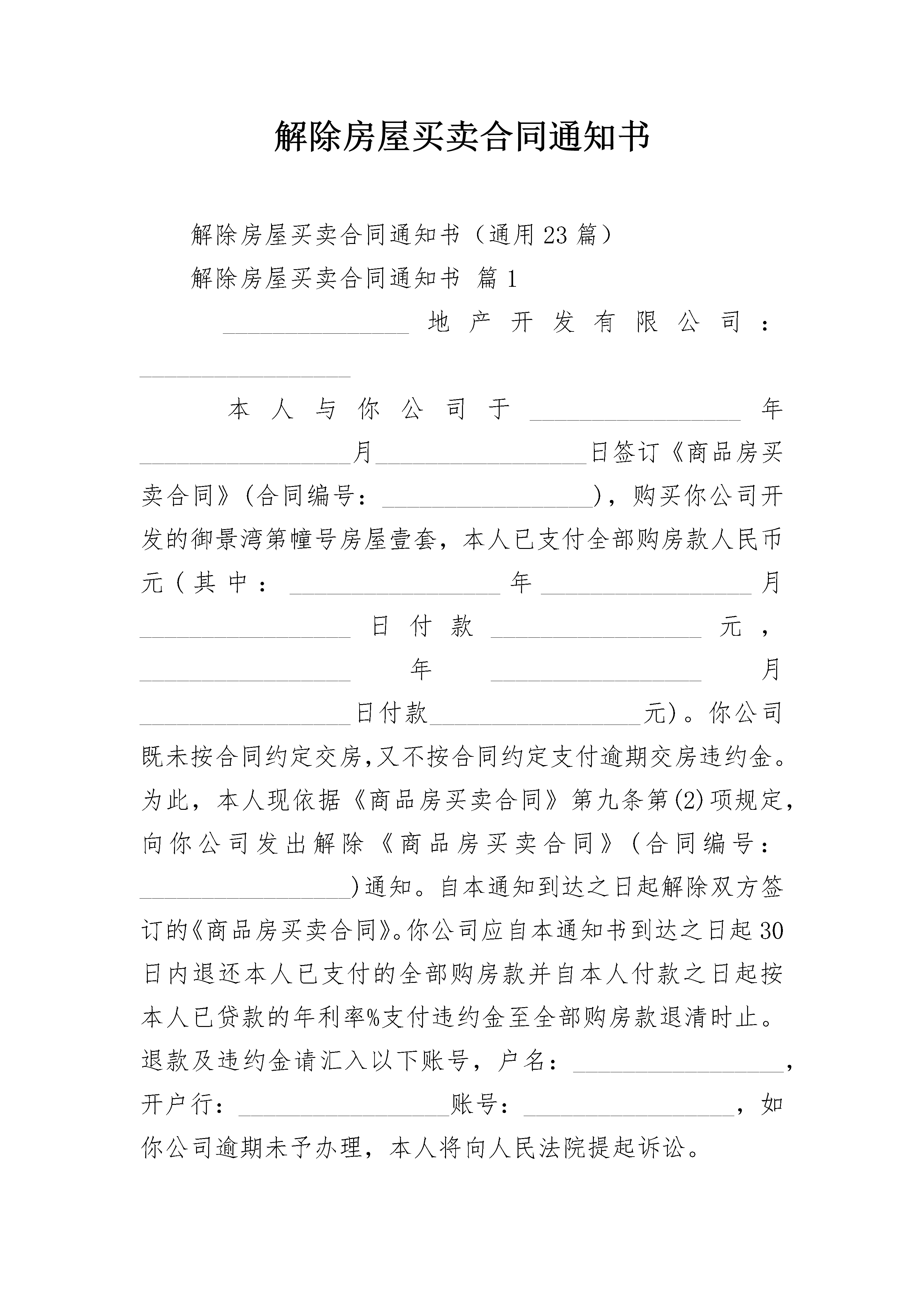 解除房屋买卖合同通知书解除房屋买卖合同通知书(通用23篇)解除房屋买卖合同通知书篇1_______________地产开发有限公司:_________________本人与你公司于_________________年_________________月_________________日签订《商品房买卖合同》(合同编号:_________________),购买你公司开发的御景湾第幢号房屋壹套,本人已支付全部购房款人民币元(其中:_________________年_________________月_________________日付款_________________元,_________________年_________________月_________________日付款_________________元)。你公司既未按合同约定交房,又不按合同约定支付逾期交房违约金。为此,本人现依据《商品房买卖合同》第九条第(2)项规定,向你公司发出解除《商品房买卖合同》(合同编号:_________________)通知。自本通知到达之日起解除双方签订的《商品房买卖合同》。你公司应自本通知书到达之日起30日内退还本人已支付的全部购房款并自本人付款之日起按本人已贷款的年利率%支付违约金至全部购房款退清时止。退款及违约金请汇入以下账号,户名:_________________,开户行:_________________账号:_________________,如你公司逾期未予办理,本人将向人民法院提起诉讼。特此通知!(注:本通知壹式两份,福建美加德地产开发有限公司壹份,通知人存档壹份)通知人:__________________________________年_________________月_________________日解除房屋买卖合同通知书篇2原告:________________,________________,________________族,现就职于__________________,电话:________________;被告:_________________,地址:________________市________________路________________号,法定代表人:________________,电话:________________;诉讼请求1、解除原、被告双方签订的商品房买卖合同;2、_____________;3、_____________。事实和理由________________;________________;________________;________________。此致________________市________________区人民法院具状人:________________________________年________________月________________日解除房屋买卖合同通知书篇3卖方(下称甲方):_________________地址:_________________法定代表人:_________________买方(下称乙方):_________________身份证:_________________委托代理人:_________________委托代理人身份证:_________________一、甲、乙双方自愿解除上述商品房的买卖合同。二、自双方签订本协议之日起,买卖合同即终止,双方之间就买卖合同的争议全部解决。甲方收回出售给乙方的上述商品房,该商品房的产权即与乙方无关。三、双方对退还已付房款办法已达成一致意见,具体如下:_________________1、此房价成交总价为:_________________(人民币)元。2、乙方已缴付楼款/首期款:_________________(人民币)元(含定金)。四、乙方应于本协议生效后的三个工作日内提交办理解除按揭贷款协议、解除买卖合同、注销抵押登记事宜所需要的全部资料,并配合甲方办妥上述事宜,若乙方不能按时提交相关资料或提交资料欠缺、不合格或拒绝配合办理的,甲方有权暂缓推还乙方所有款项。五、办理解除合同产生的手续费由乙方承担。甲方:_________________乙方:_________________法定代表人:_________________委托代理人:____________________年___月___日___年___月___日解除房屋买卖合同通知书篇4卖方(下称甲方):身份证:买方(下称乙方):身份证:乙方向甲方购买坐落于房屋套,双方已签订《北京市存量房房屋买卖合同》(以下简称买卖合同),合同编号:号,现经甲、乙双方协商,达成协议如下:一、甲、乙
