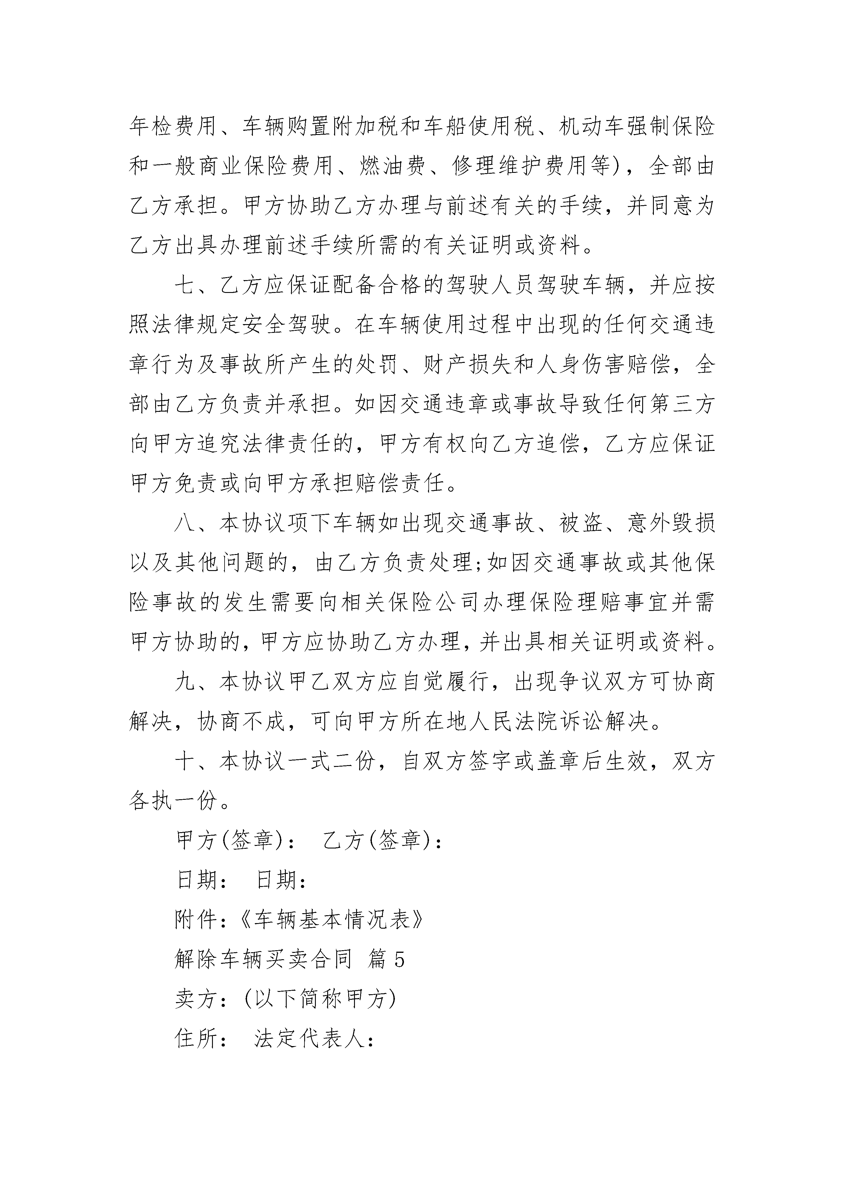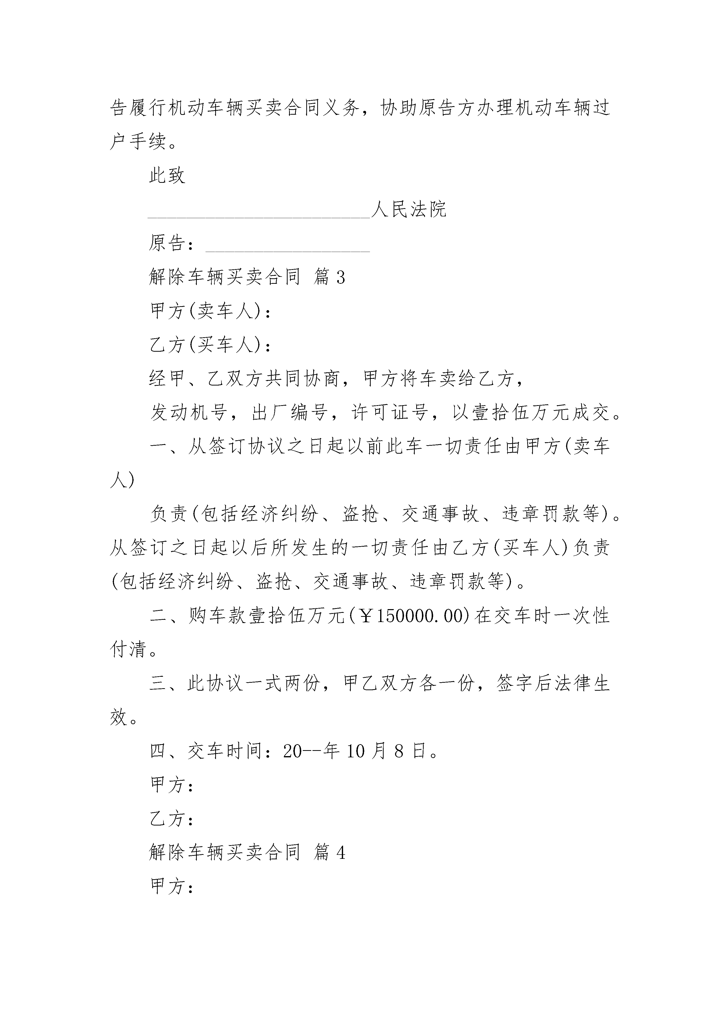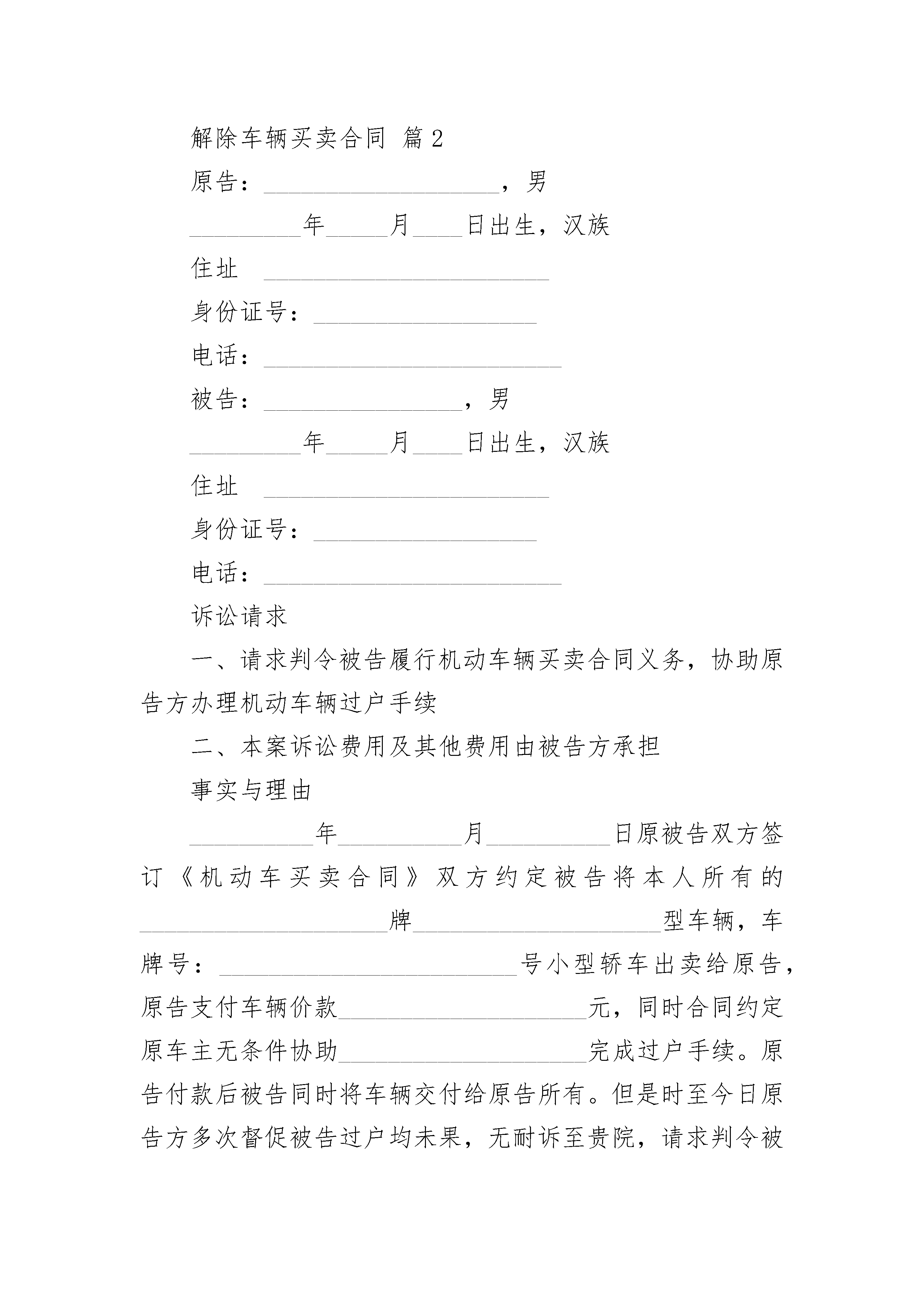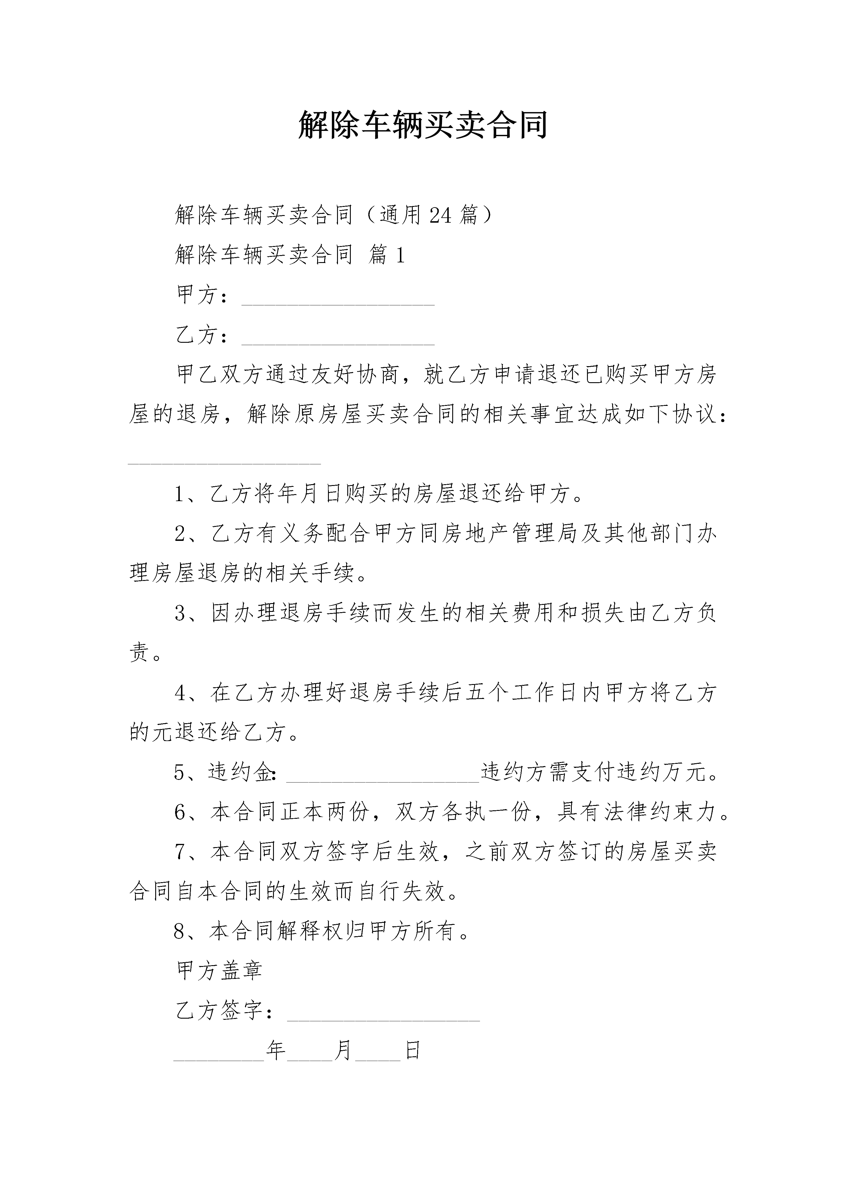 解除车辆买卖合同解除车辆买卖合同(通用24篇)解除车辆买卖合同篇1甲方:_________________乙方:_________________甲乙双方通过友好协商,就乙方申请退还已购买甲方房屋的退房,解除原房屋买卖合同的相关事宜达成如下协议:_________________1、乙方将年月日购买的房屋退还给甲方。2、乙方有义务配合甲方同房地产管理局及其他部门办理房屋退房的相关手续。3、因办理退房手续而发生的相关费用和损失由乙方负责。4、在乙方办理好退房手续后五个工作日内甲方将乙方的元退还给乙方。5、违约金:_________________违约方需支付违约万元。6、本合同正本两份,双方各执一份,具有法律约束力。7、本合同双方签字后生效,之前双方签订的房屋买卖合同自本合同的生效而自行失效。8、本合同解释权归甲方所有。甲方盖章乙方签字:_________________________年____月____日解除车辆买卖合同篇2原告:___________________,男_________年_____月____日出生,汉族住址_______________________身份证号:__________________电话:________________________被告:________________,男_________年_____月____日出生,汉族住址_______________________身份证号:__________________电话:________________________诉讼请求一、请求判令被告履行机动车辆买卖合同义务,协助原告方办理机动车辆过户手续二、本案诉讼费用及其他费用由被告方承担事实与理由__________年__________月__________日原被告双方签订《机动车买卖合同》双方约定被告将本人所有的____________________牌____________________型车辆,车牌号:________________________号小型轿车出卖给原告,原告支付车辆价款____________________元,同时合同约定原车主无条件协助____________________完成过户手续。原告付款后被告同时将车辆交付给原告所有。但是时至今日原告方多次督促被告过户均未果,无耐诉至贵院,请求判令被告履行机动车辆买卖合同义务,协助原告方办理机动车辆过户手续。此致_______________________人民法院原告:_________________解除车辆买卖合同篇3甲方(卖车人):乙方(买车人):经甲、乙双方共同协商,甲方将车卖给乙方,发动机号,出厂编号,许可证号,以壹拾伍万元成交。一、从签订协议之日起以前此车一切责任由甲方(卖车人)负责(包括经济纠纷、盗抢、交通事故、违章罚款等)。从签订之日起以后所发生的一切责任由乙方(买车人)负责(包括经济纠纷、盗抢、交通事故、违章罚款等)。二、购车款壹拾伍万元(¥150000.00)在交车时一次性付清。三、此协议一式两份,甲乙双方各一份,签字后法律生效。四、交车时间:20--年10月8日。甲方:乙方:解除车辆买卖合同篇4甲方:乙方:为促进双方的合作,经双方协商,特签订以下协议。一、甲方同意出资购置单车价值约26万元人民币汽车二辆,并借用给乙方无偿使用。拟购置车辆的的品牌、型号和款式由乙方指定。二、本协议项下车辆的所有权归甲方所有,与该车有关的全部机动车登记手续均办理在甲方名下,但有关车辆登记、税费缴纳、保险等手续费用由乙方承担;双方在办理完毕购车及登记手续后,应将车辆的牌号、发动机号、车辆识别代号等记载于本协议附件《车辆基本情况表》中。三、借用期限为长期,但经双方协商一致,可随时终止本协议,并将车辆返还甲方。四、双方确认,乙方对本协议项下的车辆仅具有使用权,不得将借用车辆转让、赠与、再行出借、改装或设置抵押担保等其他权利负担。五、如由于乙方原因致使本协议项下车辆被有关机关或第三人采取查封、扣押等措施的,乙方应负责解除对该车辆的限制措施。由此导致车辆被强制转让或强行处置的,乙方应赔偿甲方的全部损失。六、本协议项下车辆车辆使用过程中,乙方应依法按时办理车辆的全部保险(保险因包括强制险和车损险、三责险、盗抢险、车上人员责任险等商业保险全险)手续,定期对车辆进行维护和修理,以保证车辆符合正常的使用要求。在登记和使用过程中发生的一切费用(包括但不限于初始登记和年检费用、车辆购置附加税和车船使用税、机动车强制保险和一般商业保险费用、燃油费、修理维护费用等),全部由乙方承担。甲方协助乙方办理与前述有关的手续,并同意为乙方出具办理前述手续所需的有关证明或资料。七、乙方应保证配备合格的驾驶人员驾驶车辆,并应按照法律规定安全驾