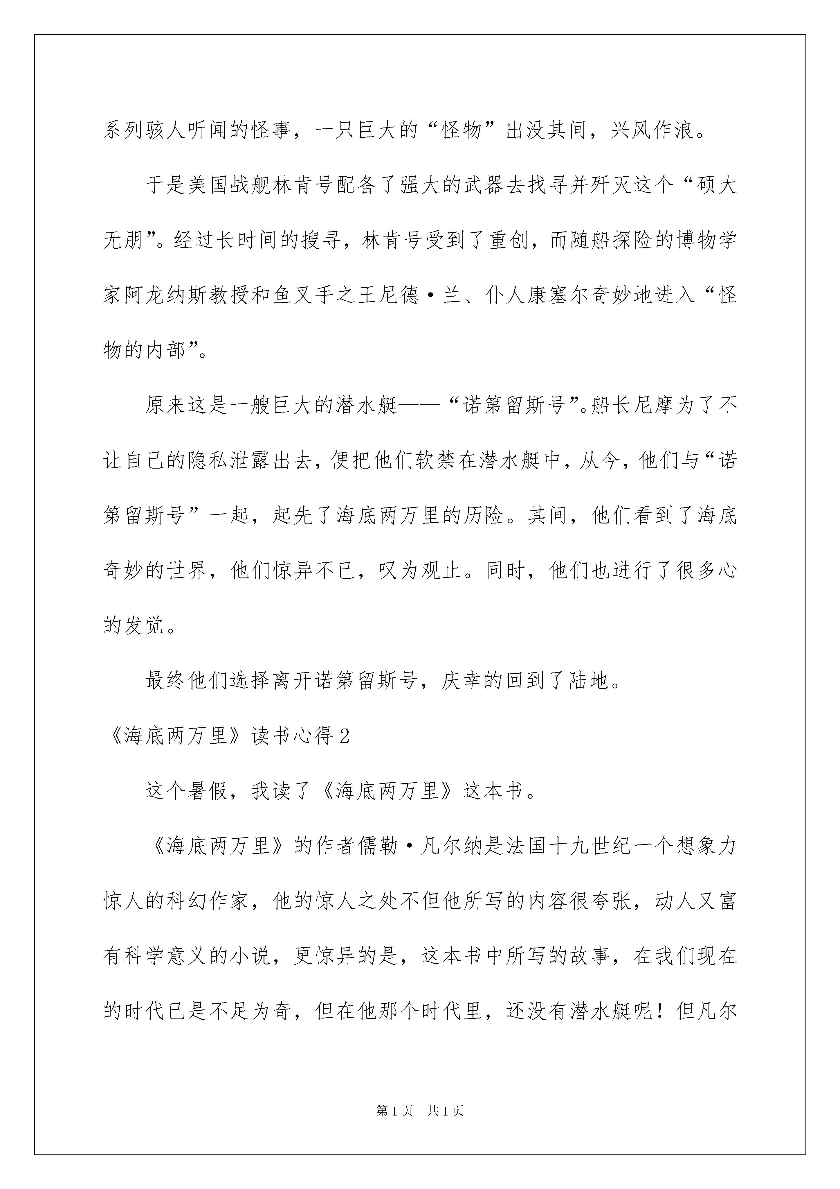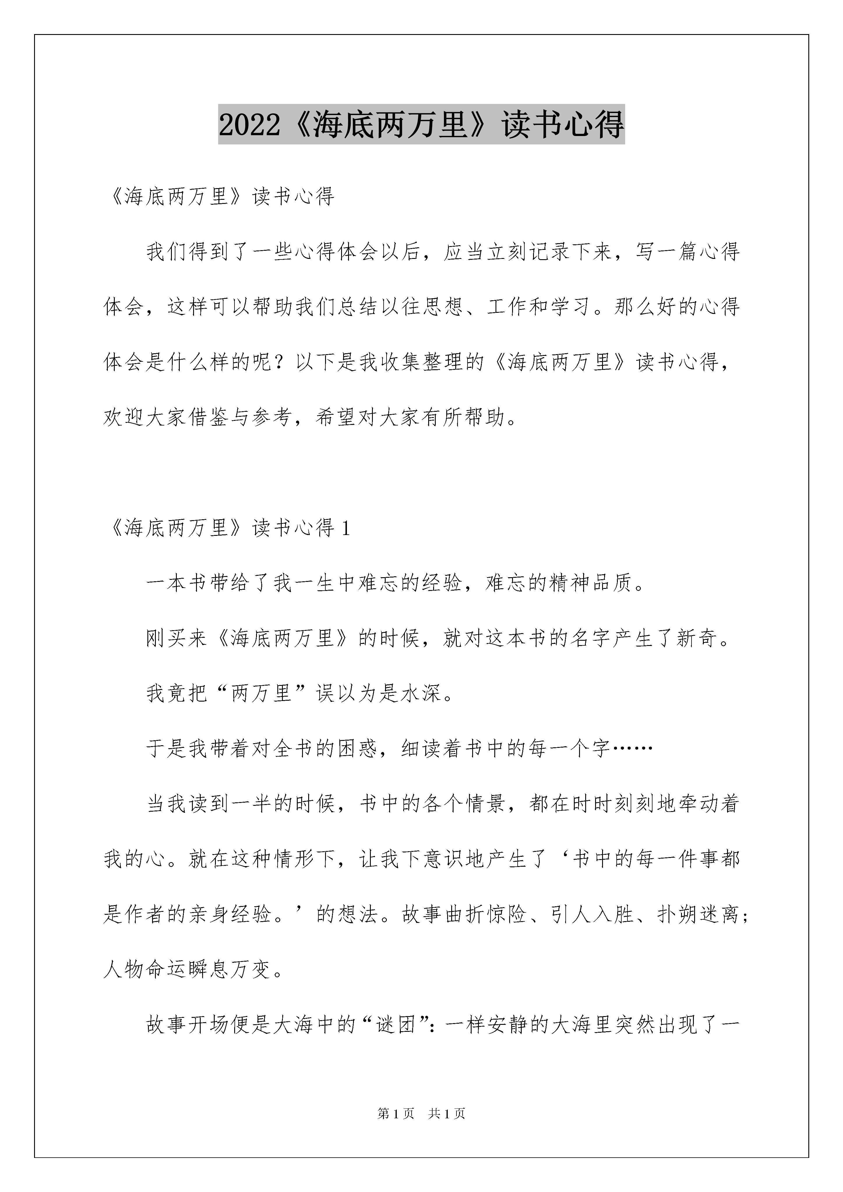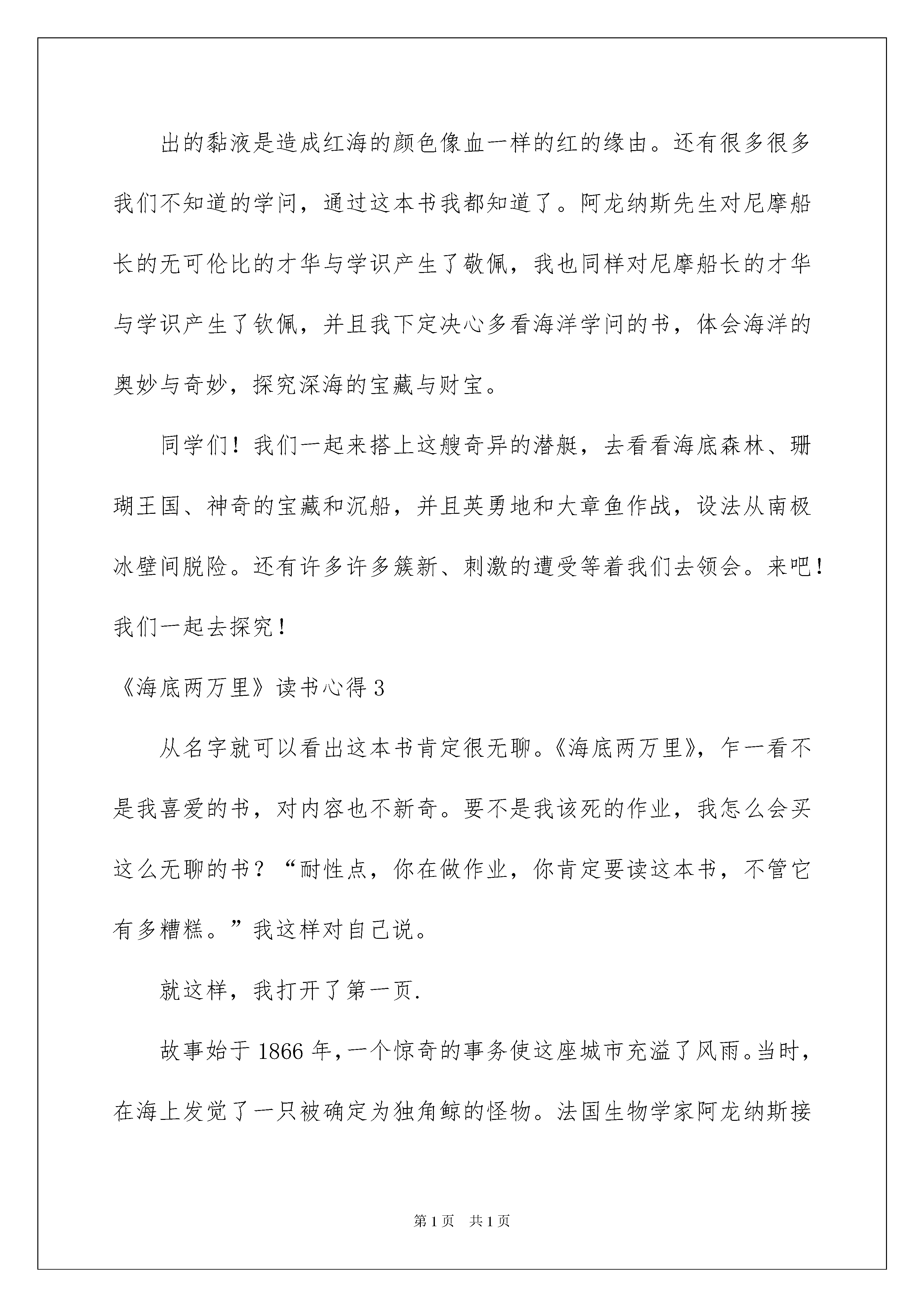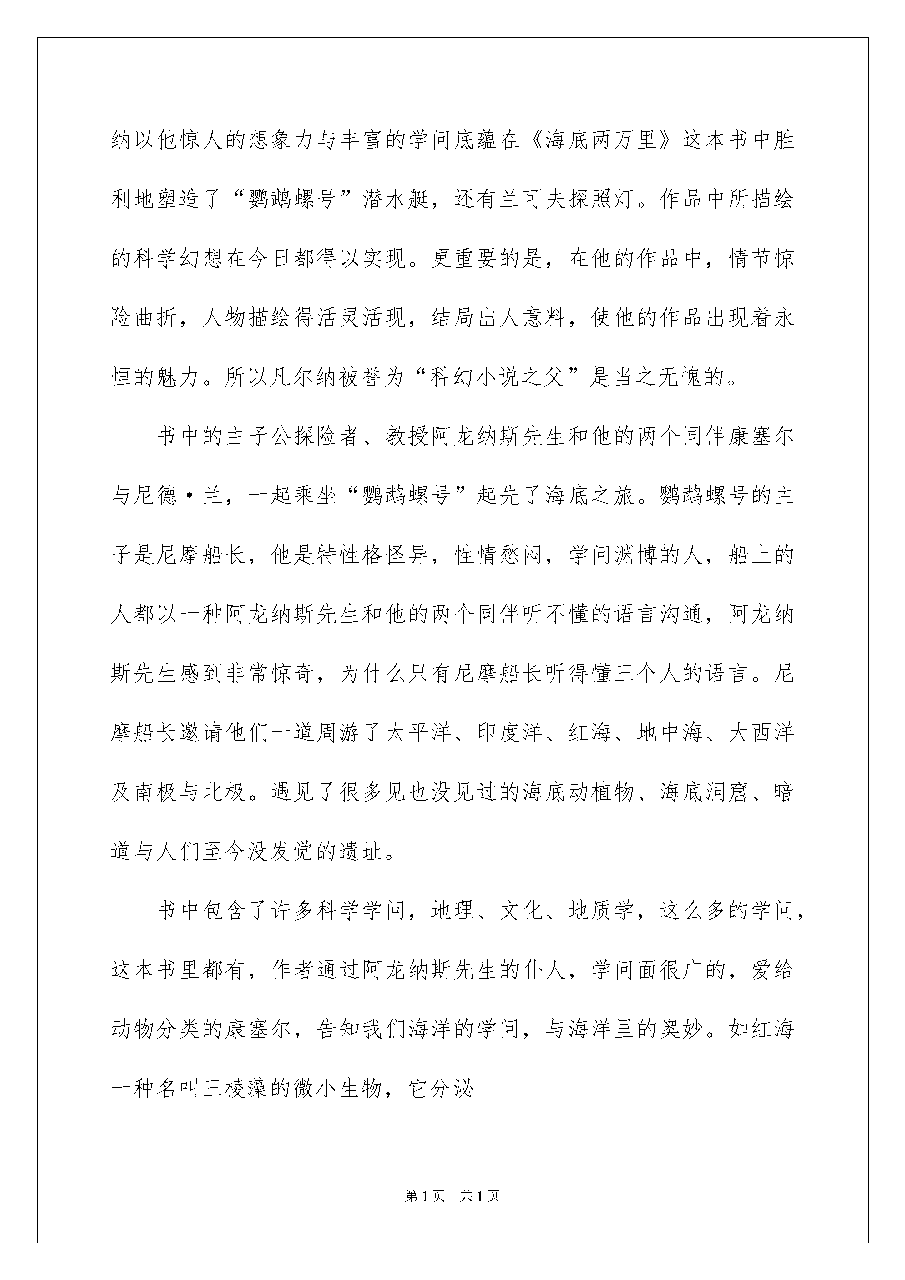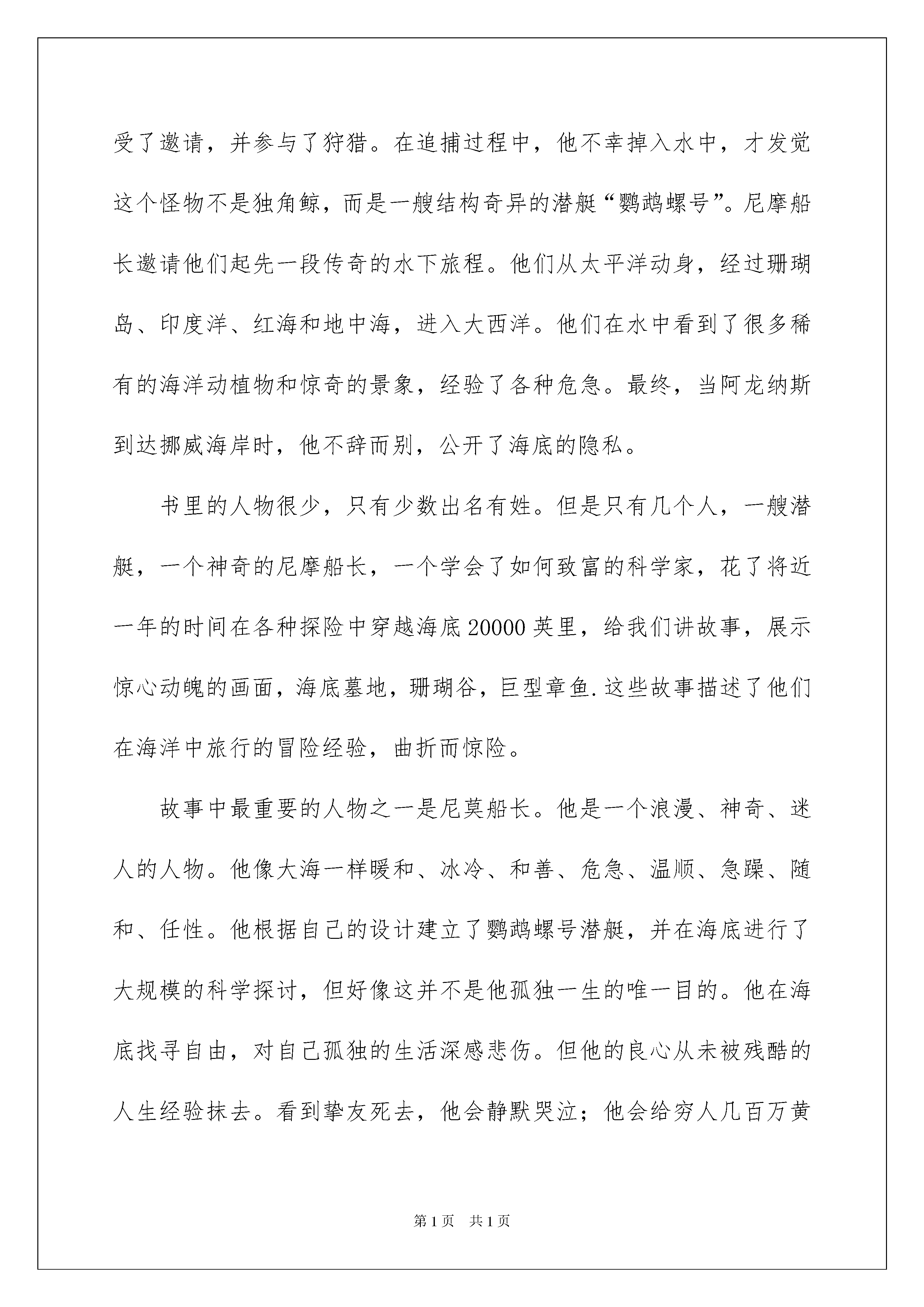 2022《海底两万里》读书心得《海底两万里》读书心得我们得到了一些心得体会以后,应当立刻记录下来,写一篇心得体会,这样可以帮助我们总结以往思想、工作和学习。那么好的心得体会是什么样的呢?以下是我收集整理的《海底两万里》读书心得,欢迎大家借鉴与参考,希望对大家有所帮助。《海底两万里》读书心得1一本书带给了我一生中难忘的经验,难忘的精神品质。刚买来《海底两万里》的时候,就对这本书的名字产生了新奇。我竟把“两万里”误以为是水深。于是我带着对全书的困惑,细读着书中的每一个字……当我读到一半的时候,书中的各个情景,都在时时刻刻地牵动着我的心。就在这种情形下,让我下意识地产生了‘书中的每一件事都是作者的亲身经验。’的想法。故事曲折惊险、引人入胜、扑朔迷离;人物命运瞬息万变。故事开场便是大海中的“谜团”:一样安静的大海里突然出现了一系列骇人听闻的怪事,一只巨大的“怪物”出没其间,兴风作浪。于是美国战舰林肯号配备了强大的武器去找寻并歼灭这个“硕大无朋”。经过长时间的搜寻,林肯号受到了重创,而随船探险的博物学家阿龙纳斯教授和鱼叉手之王尼德·兰、仆人康塞尔奇妙地进入“怪物的内部”。原来这是一艘巨大的潜水艇——“诺第留斯号”。船长尼摩为了不让自己的隐私泄露出去,便把他们软禁在潜水艇中,从今,他们与“诺第留斯号”一起,起先了海底两万里的历险。其间,他们看到了海底奇妙的世界,他们惊异不已,叹为观止。同时,他们也进行了很多心的发觉。最终他们选择离开诺第留斯号,庆幸的回到了陆地。《海底两万里》读书心得2这个暑假,我读了《海底两万里》这本书。《海底两万里》的作者儒勒·凡尔纳是法国十九世纪一个想象力惊人的科幻作家,他的惊人之处不但他所写的内容很夸张,动人又富有科学意义的小说,更惊异的是,这本书中所写的故事,在我们现在的时代已是不足为奇,但在他那个时代里,还没有潜水艇呢!但凡尔纳以他惊人的想象力与丰富的学问底蕴在《海底两万里》这本书中胜利地塑造了“鹦鹉螺号”潜水艇,还有兰可夫探照灯。作品中所描绘的科学幻想在今日都得以实现。更重要的是,在他的作品中,情节惊险曲折,人物描绘得活灵活现,结局出人意料,使他的作品出现着永恒的魅力。所以凡尔纳被誉为“科幻小说之父”是当之无愧的。书中的主子公探险者、教授阿龙纳斯先生和他的两个同伴康塞尔与尼德·兰,一起乘坐“鹦鹉螺号”起先了海底之旅。鹦鹉螺号的主子是尼摩船长,他是特性格怪异,性情愁闷,学问渊博的人,船上的人都以一种阿龙纳斯先生和他的两个同伴听不懂的语言沟通,阿龙纳斯先生感到非常惊奇,为什么只有尼摩船长听得懂三个人的语言。尼摩船长邀请他们一道周游了太平洋、印度洋、红海、地中海、大西洋及南极与北极。遇见了很多见也没见过的海底动植物、海底洞窟、暗道与人们至今没发觉的遗址。书中包含了许多科学学问,地理、文化、地质学,这么多的学问,这本书里都有,作者通过阿龙纳斯先生的仆人,学问面很广的,爱给动物分类的康塞尔,告知我们海洋的学问,与海洋里的奥妙。如红海一种名叫三棱藻的微小生物,它分泌出的黏液是造成红海的颜色像血一样的红的缘由。还有很多很多我们不知道的学问,通过这本书我都知道了。阿龙纳斯先生对尼摩船长的无可伦比的才华与学识产生了敬佩,我也同样对尼摩船长的才华与学识产生了钦佩,并且我下定决心多看海洋学问的书,体会海洋的奥妙与奇妙,探究深海的宝藏与财宝。同学们!我们一起来搭上这艘奇异的潜艇,去看看海底森林、珊瑚王国、神奇的宝藏和沉船,并且英勇地和大章鱼作战,设法从南极冰壁间脱险。还有许多许多簇新、刺激的遭受等着我们去领会。来吧!我们一起去探究!《海底两万里》读书心得3从名字就可以看出这本书肯定很无聊。《海底两万里》,乍一看不是我喜爱的书,对内容也不新奇。要不是我该死的作业,我怎么会买这么无聊的书?“耐性点,你在做作业,你肯定要读这本书,不管它有多糟糕。”我这样对自己说。就这样,我打开了第一页.故事始于1866年,一个惊奇的事务使这座城市充溢了风雨。当时,在海上发觉了一只被确定为独角鲸的怪物。法国生物学家阿龙纳斯接受了邀请,并参与了狩猎。在追捕过程中,他不幸掉入水中,才发觉这个怪物不是独角鲸,而是一艘结构奇异的潜艇“鹦鹉螺号”。尼摩船长邀请他们起先一段传奇的水下旅程。他们从太平洋动身,经过珊瑚岛、印度洋、红海和地中海,进入大西洋。他们在水中看到了很多稀有的海洋动植物和惊奇的景象,经验了各种危急。最终,当阿龙纳斯到达挪威海岸时,他不辞而别,公开了海底的隐私。书里的人物很少,只有少数出名有姓。但是只有几个人,一艘潜艇,一个神奇的尼摩船长,一个学会了如何致富的科学家,花了将近一年的时间在各种探险中