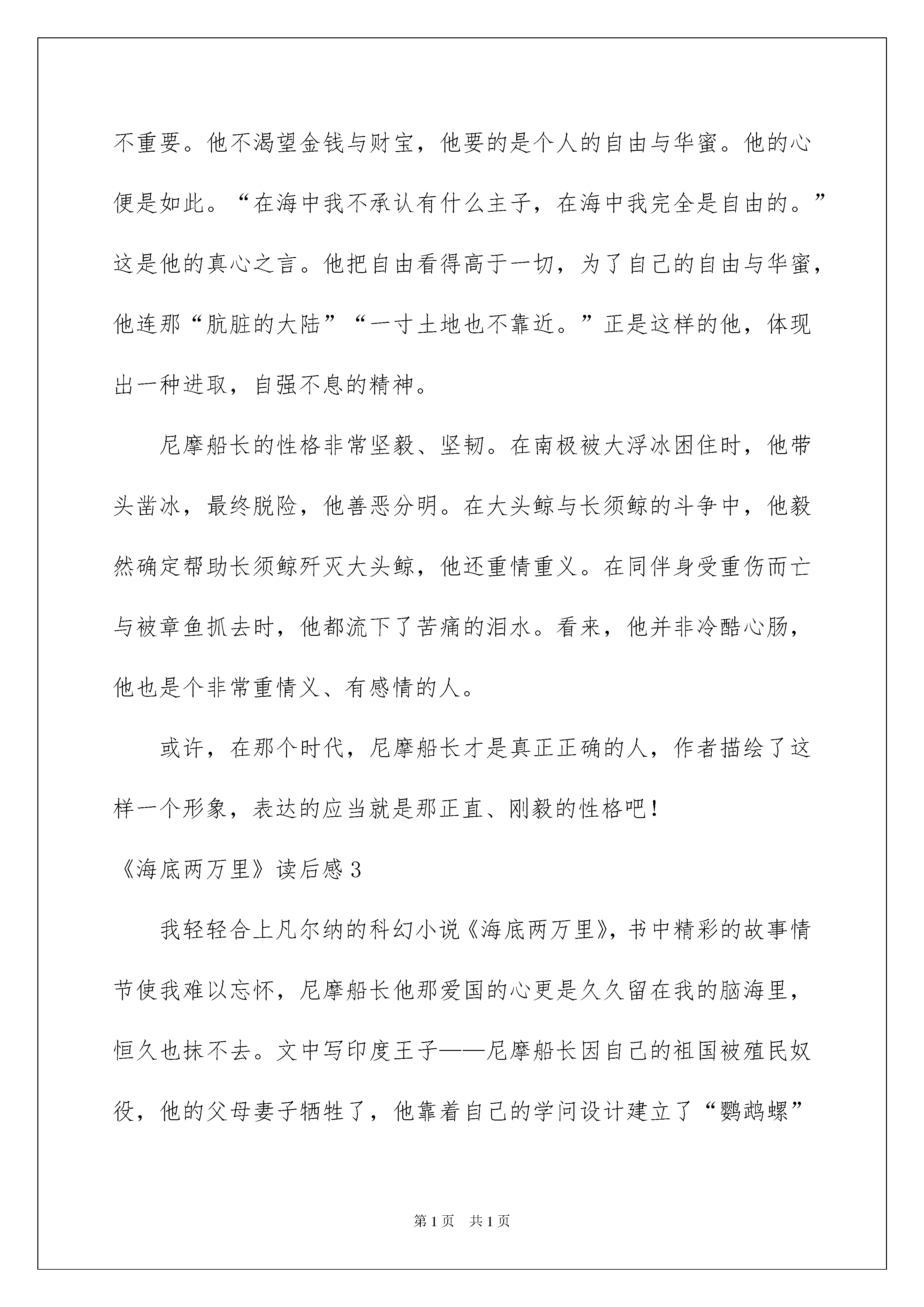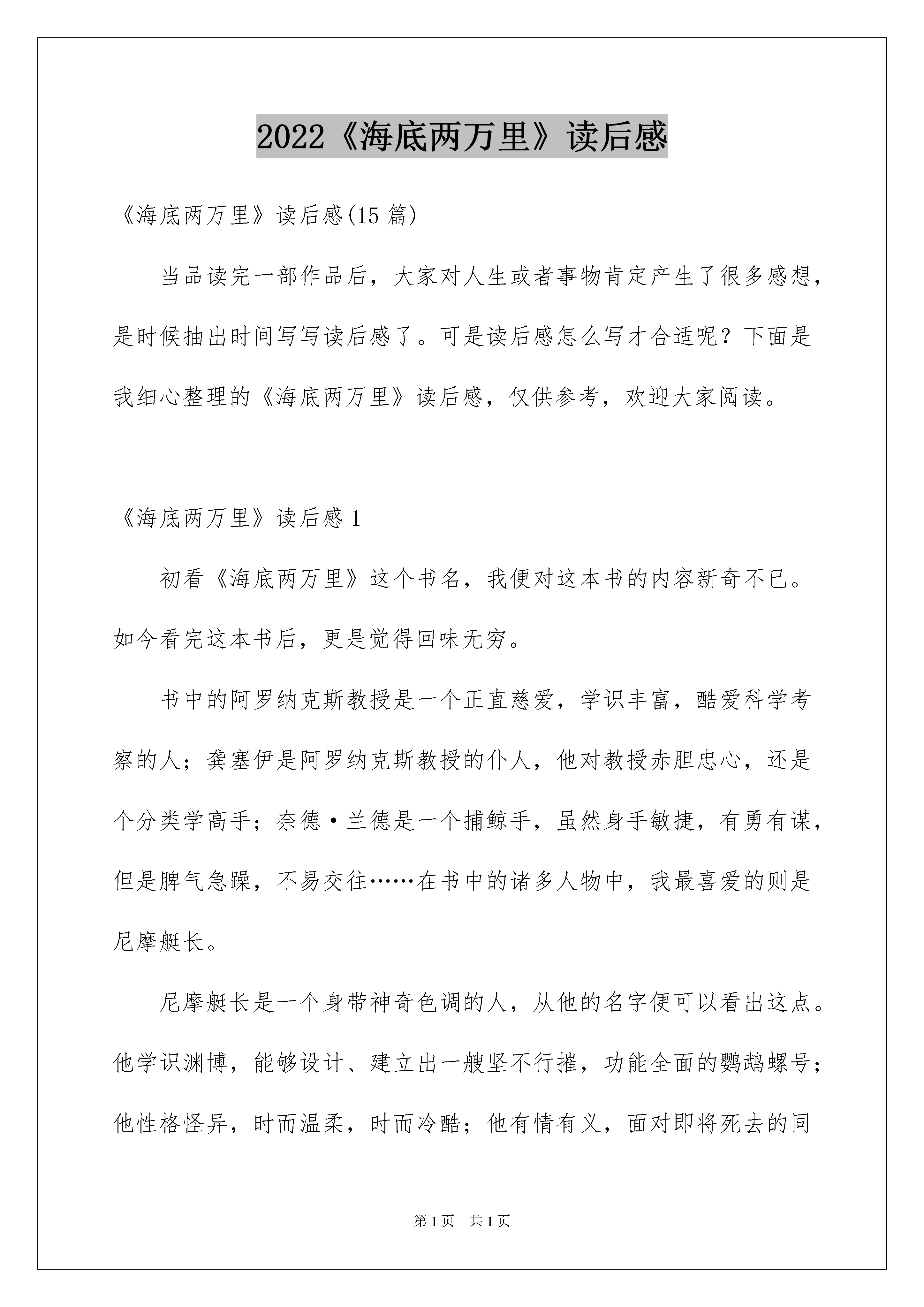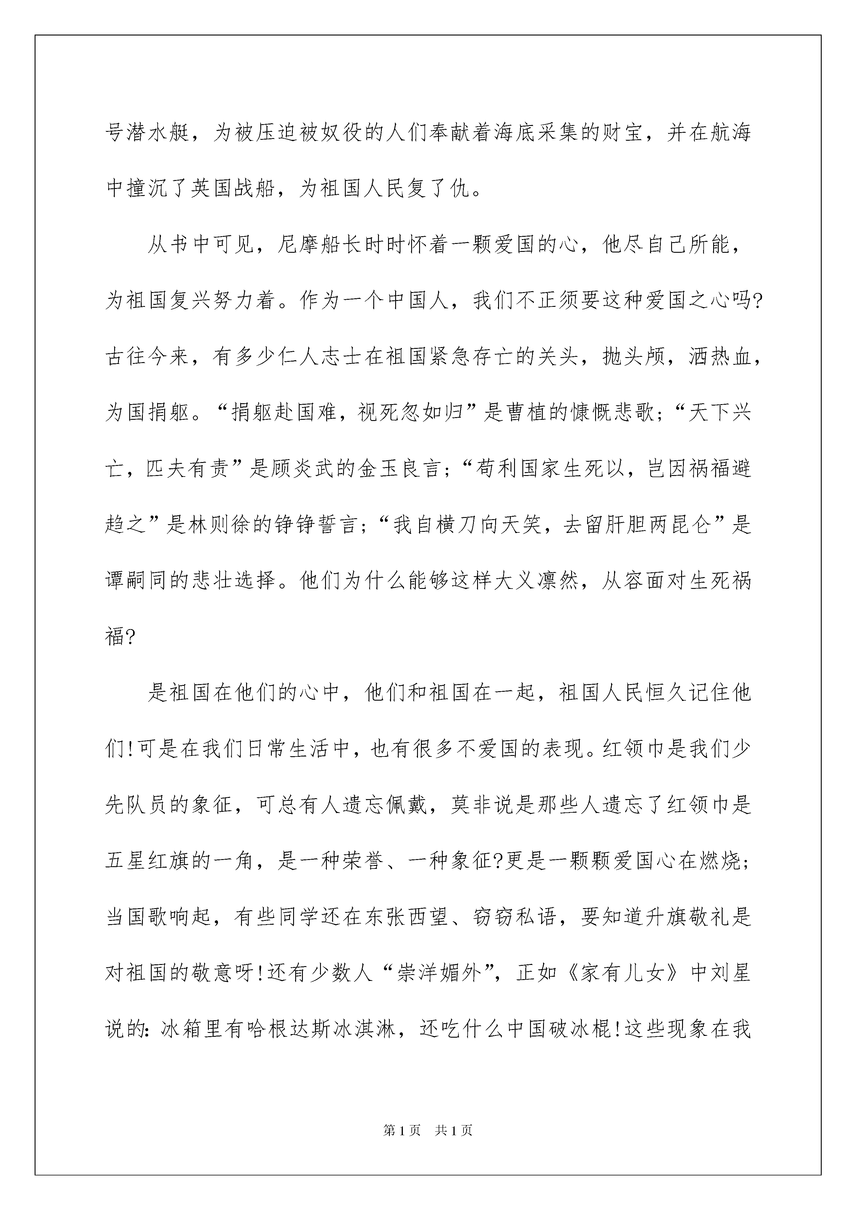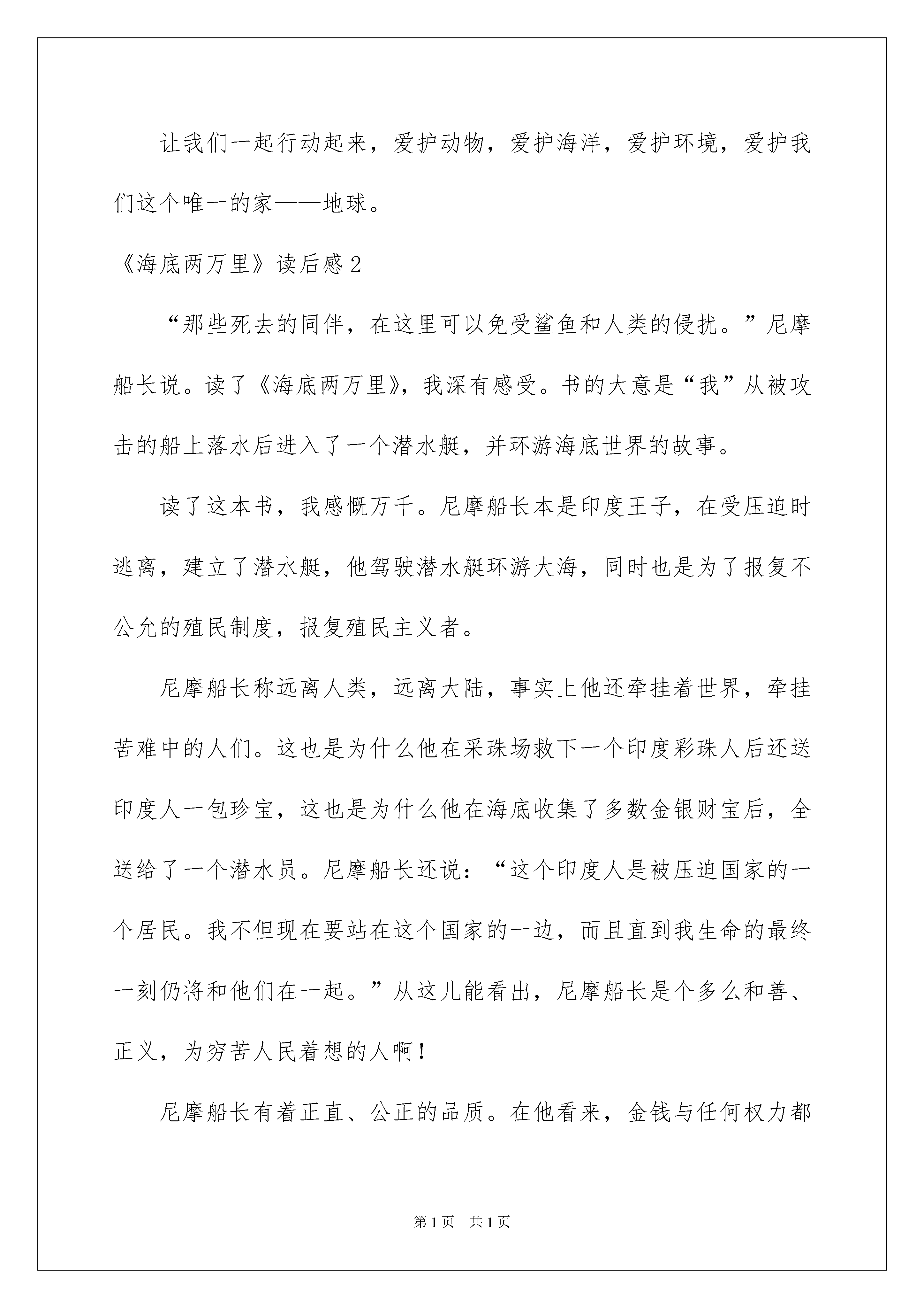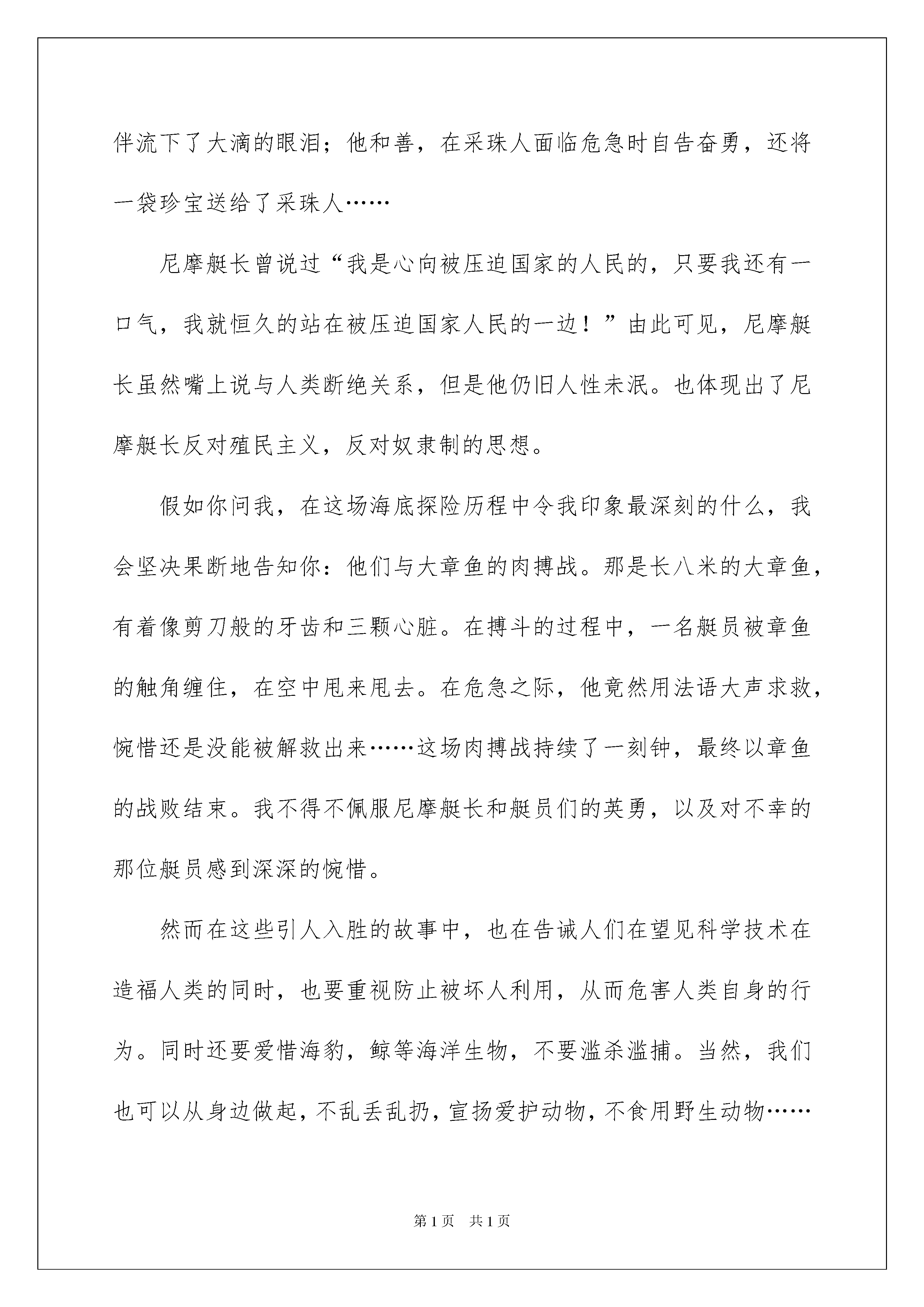 2022《海底两万里》读后感《海底两万里》读后感(15篇)当品读完一部作品后,大家对人生或者事物肯定产生了很多感想,是时候抽出时间写写读后感了。可是读后感怎么写才合适呢?下面是我细心整理的《海底两万里》读后感,仅供参考,欢迎大家阅读。《海底两万里》读后感1初看《海底两万里》这个书名,我便对这本书的内容新奇不已。如今看完这本书后,更是觉得回味无穷。书中的阿罗纳克斯教授是一个正直慈爱,学识丰富,酷爱科学考察的人;龚塞伊是阿罗纳克斯教授的仆人,他对教授赤胆忠心,还是个分类学高手;奈德·兰德是一个捕鲸手,虽然身手敏捷,有勇有谋,但是脾气急躁,不易交往……在书中的诸多人物中,我最喜爱的则是尼摩艇长。尼摩艇长是一个身带神奇色调的人,从他的名字便可以看出这点。他学识渊博,能够设计、建立出一艘坚不行摧,功能全面的鹦鹉螺号;他性格怪异,时而温柔,时而冷酷;他有情有义,面对即将死去的同伴流下了大滴的眼泪;他和善,在采珠人面临危急时自告奋勇,还将一袋珍宝送给了采珠人……尼摩艇长曾说过“我是心向被压迫国家的人民的,只要我还有一口气,我就恒久的站在被压迫国家人民的一边!”由此可见,尼摩艇长虽然嘴上说与人类断绝关系,但是他仍旧人性未泯。也体现出了尼摩艇长反对殖民主义,反对奴隶制的思想。假如你问我,在这场海底探险历程中令我印象最深刻的什么,我会坚决果断地告知你:他们与大章鱼的肉搏战。那是长八米的大章鱼,有着像剪刀般的牙齿和三颗心脏。在搏斗的过程中,一名艇员被章鱼的触角缠住,在空中甩来甩去。在危急之际,他竟然用法语大声求救,惋惜还是没能被解救出来……这场肉搏战持续了一刻钟,最终以章鱼的战败结束。我不得不佩服尼摩艇长和艇员们的英勇,以及对不幸的那位艇员感到深深的惋惜。然而在这些引人入胜的故事中,也在告诫人们在望见科学技术在造福人类的同时,也要重视防止被坏人利用,从而危害人类自身的行为。同时还要爱惜海豹,鲸等海洋生物,不要滥杀滥捕。当然,我们也可以从身边做起,不乱丢乱扔,宣扬爱护动物,不食用野生动物……让我们一起行动起来,爱护动物,爱护海洋,爱护环境,爱护我们这个唯一的家——地球。《海底两万里》读后感2“那些死去的同伴,在这里可以免受鲨鱼和人类的侵扰。”尼摩船长说。读了《海底两万里》,我深有感受。书的大意是“我”从被攻击的船上落水后进入了一个潜水艇,并环游海底世界的故事。读了这本书,我感慨万千。尼摩船长本是印度王子,在受压迫时逃离,建立了潜水艇,他驾驶潜水艇环游大海,同时也是为了报复不公允的殖民制度,报复殖民主义者。尼摩船长称远离人类,远离大陆,事实上他还牵挂着世界,牵挂苦难中的人们。这也是为什么他在采珠场救下一个印度彩珠人后还送印度人一包珍宝,这也是为什么他在海底收集了多数金银财宝后,全送给了一个潜水员。尼摩船长还说:“这个印度人是被压迫国家的一个居民。我不但现在要站在这个国家的一边,而且直到我生命的最终一刻仍将和他们在一起。”从这儿能看出,尼摩船长是个多么和善、正义,为穷苦人民着想的人啊!尼摩船长有着正直、公正的品质。在他看来,金钱与任何权力都不重要。他不渴望金钱与财宝,他要的是个人的自由与华蜜。他的心便是如此。“在海中我不承认有什么主子,在海中我完全是自由的。”这是他的真心之言。他把自由看得高于一切,为了自己的自由与华蜜,他连那“肮脏的大陆”“一寸土地也不靠近。”正是这样的他,体现出一种进取,自强不息的精神。尼摩船长的性格非常坚毅、坚韧。在南极被大浮冰困住时,他带头凿冰,最终脱险,他善恶分明。在大头鲸与长须鲸的斗争中,他毅然确定帮助长须鲸歼灭大头鲸,他还重情重义。在同伴身受重伤而亡与被章鱼抓去时,他都流下了苦痛的泪水。看来,他并非冷酷心肠,他也是个非常重情义、有感情的人。或许,在那个时代,尼摩船长才是真正正确的人,作者描绘了这样一个形象,表达的应当就是那正直、刚毅的性格吧!《海底两万里》读后感3我轻轻合上凡尔纳的科幻小说《海底两万里》,书中精彩的故事情节使我难以忘怀,尼摩船长他那爱国的心更是久久留在我的脑海里,恒久也抹不去。文中写印度王子——尼摩船长因自己的祖国被殖民奴役,他的父母妻子牺牲了,他靠着自己的学问设计建立了“鹦鹉螺”号潜水艇,为被压迫被奴役的人们奉献着海底采集的财宝,并在航海中撞沉了英国战船,为祖国人民复了仇。从书中可见,尼摩船长时时怀着一颗爱国的心,他尽自己所能,为祖国复兴努力着。作为一个中国人,我们不正须要这种爱国之心吗?古往今来,有多少仁人志士在祖国紧急存亡的关头,抛头颅,洒热血,为国捐躯。“捐躯赴国难,视死忽如归”是曹植的慷慨悲歌;“天下兴亡,匹夫有责”是顾炎武的金玉良言;“苟利国