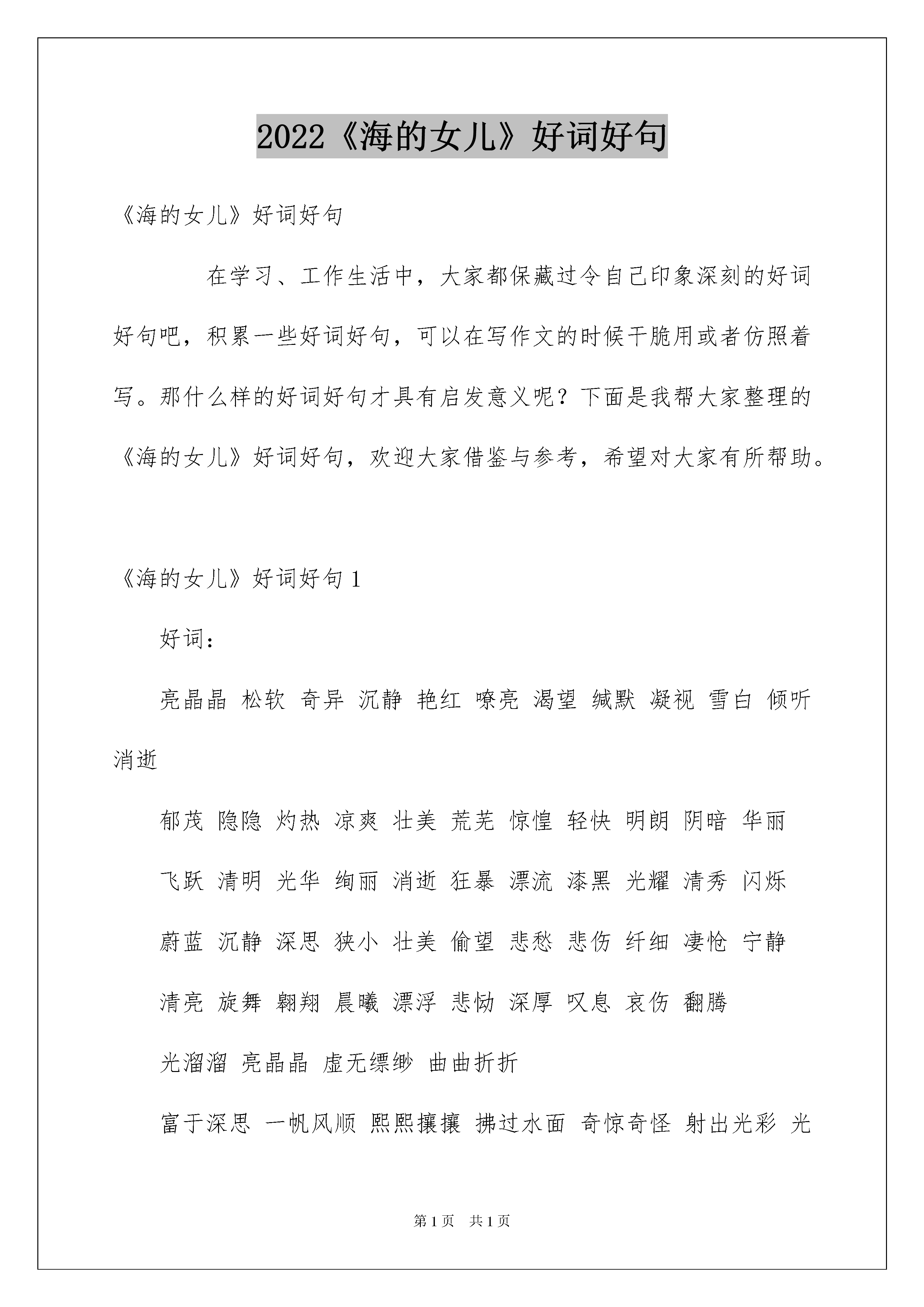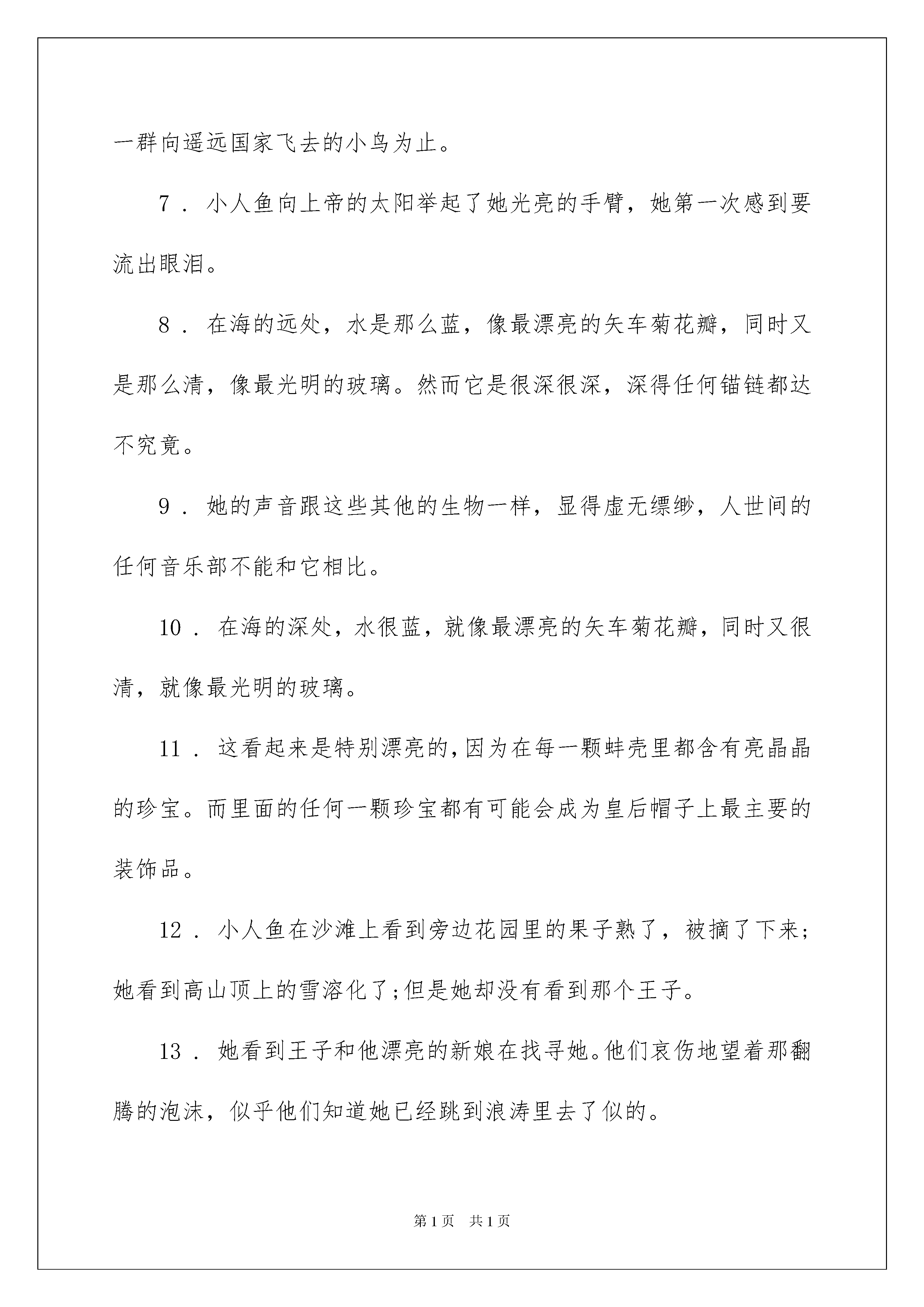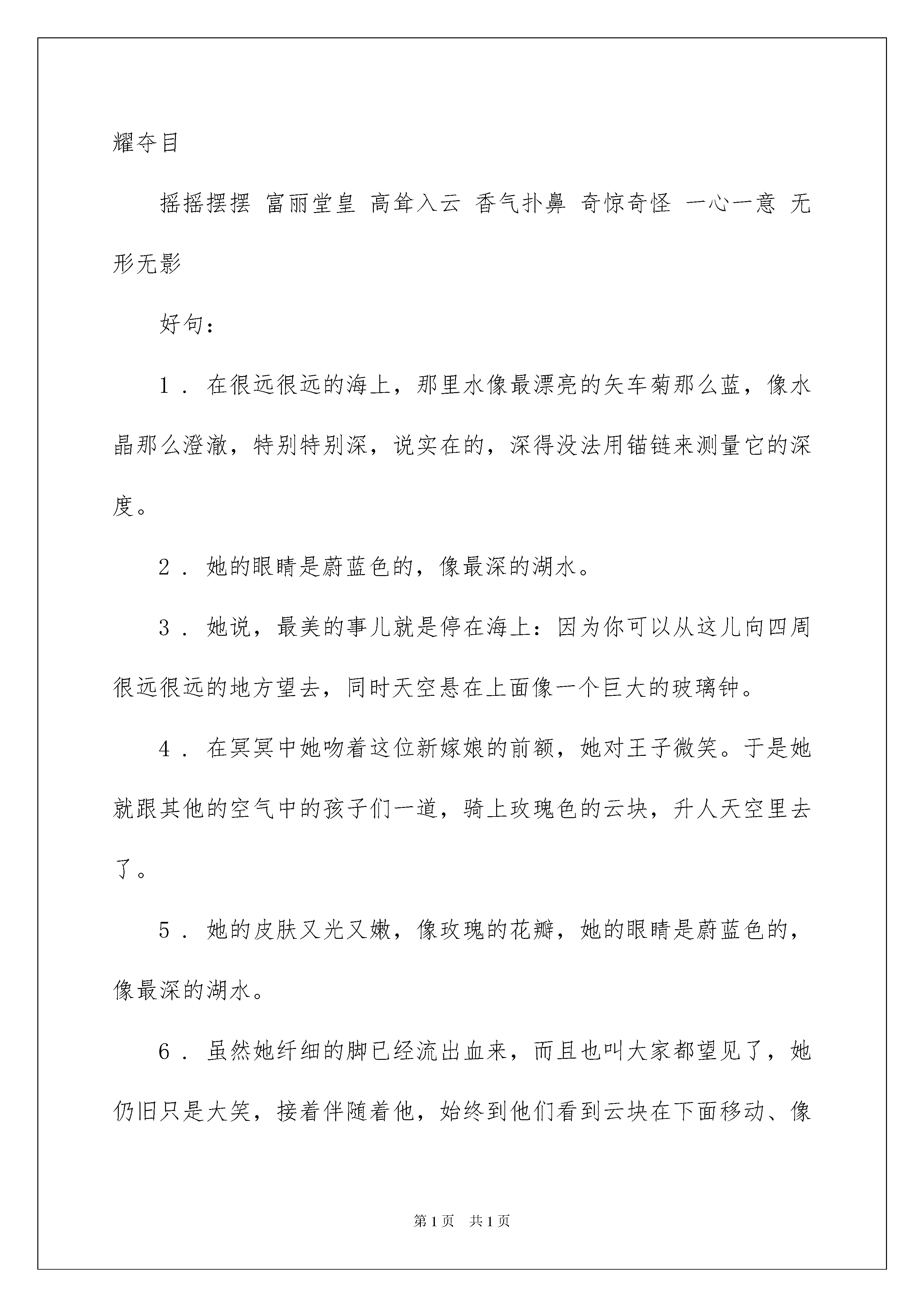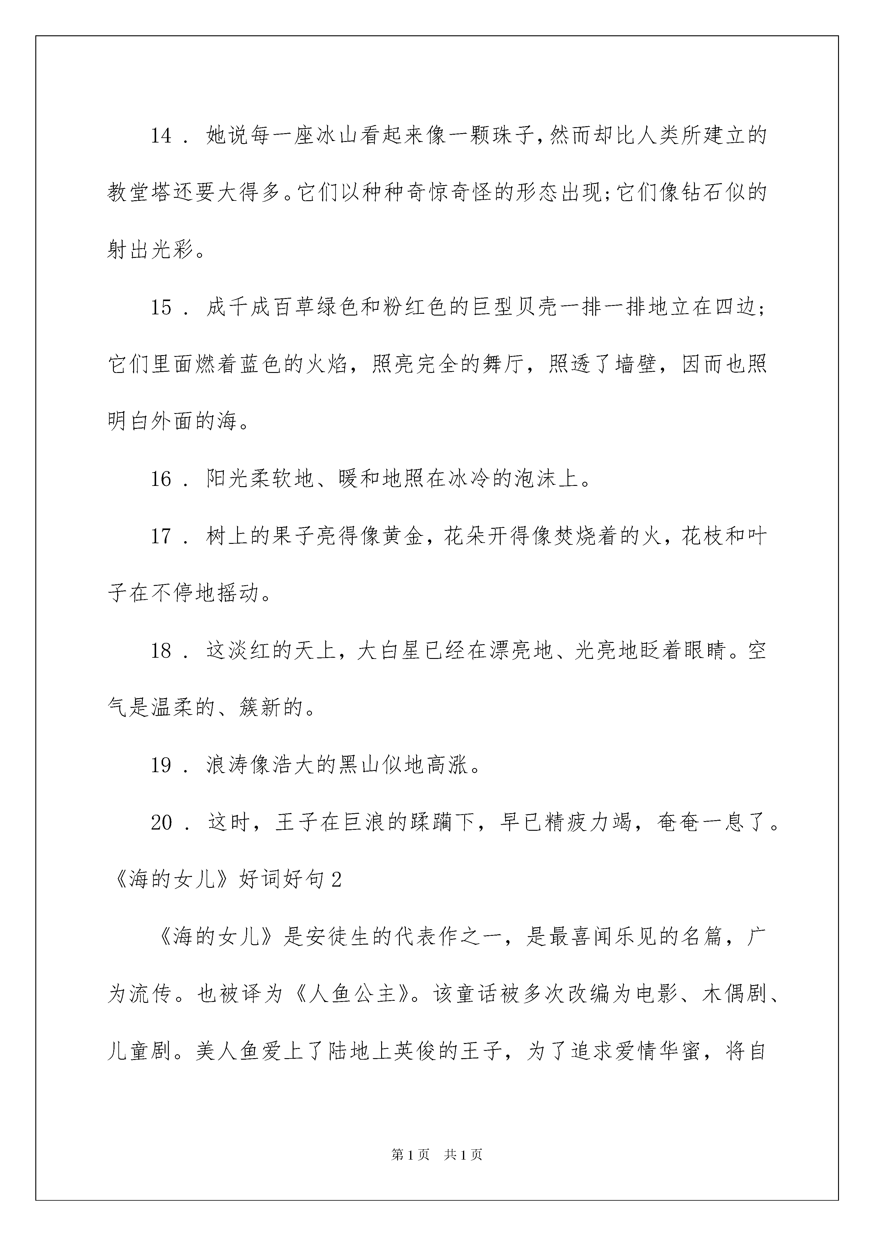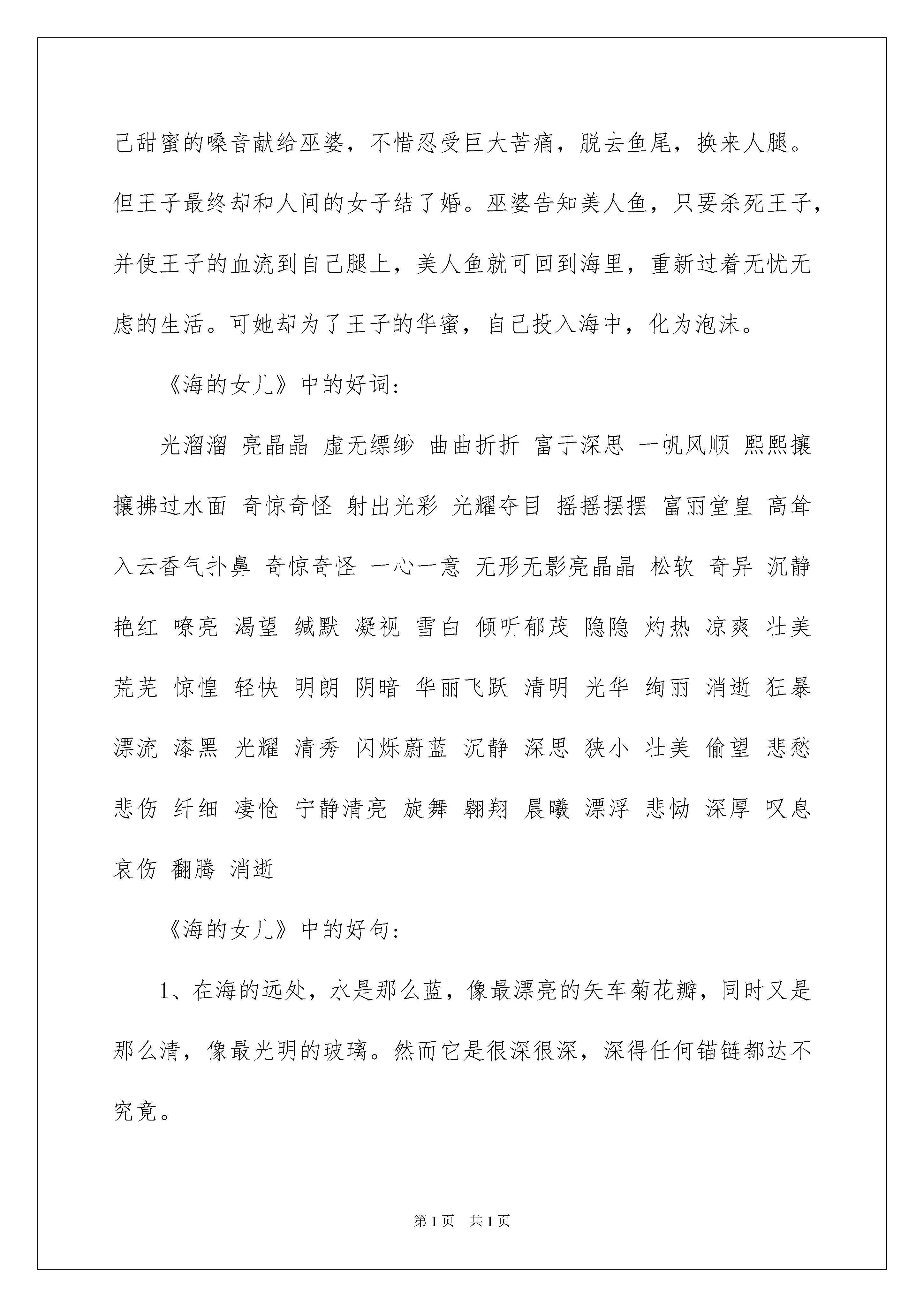 2022《海的女儿》好词好句《海的女儿》好词好句在学习、工作生活中,大家都保藏过令自己印象深刻的好词好句吧,积累一些好词好句,可以在写作文的时候干脆用或者仿照着写。那什么样的好词好句才具有启发意义呢?下面是我帮大家整理的《海的女儿》好词好句,欢迎大家借鉴与参考,希望对大家有所帮助。《海的女儿》好词好句1好词:亮晶晶松软奇异沉静艳红嘹亮渴望缄默凝视雪白倾听消逝郁茂隐隐灼热凉爽壮美荒芜惊惶轻快明朗阴暗华丽飞跃清明光华绚丽消逝狂暴漂流漆黑光耀清秀闪烁蔚蓝沉静深思狭小壮美偷望悲愁悲伤纤细凄怆宁静清亮旋舞翱翔晨曦漂浮悲恸深厚叹息哀伤翻腾光溜溜亮晶晶虚无缥缈曲曲折折富于深思一帆风顺熙熙攘攘拂过水面奇惊奇怪射出光彩光耀夺目摇摇摆摆富丽堂皇高耸入云香气扑鼻奇惊奇怪一心一意无形无影好句:1.在很远很远的海上,那里水像最漂亮的矢车菊那么蓝,像水晶那么澄澈,特别特别深,说实在的,深得没法用锚链来测量它的深度。2.她的眼睛是蔚蓝色的,像最深的湖水。3.她说,最美的事儿就是停在海上:因为你可以从这儿向四周很远很远的地方望去,同时天空悬在上面像一个巨大的玻璃钟。4.在冥冥中她吻着这位新嫁娘的前额,她对王子微笑。于是她就跟其他的空气中的孩子们一道,骑上玫瑰色的云块,升人天空里去了。5.她的皮肤又光又嫩,像玫瑰的花瓣,她的眼睛是蔚蓝色的,像最深的湖水。6.虽然她纤细的脚已经流出血来,而且也叫大家都望见了,她仍旧只是大笑,接着伴随着他,始终到他们看到云块在下面移动、像一群向遥远国家飞去的小鸟为止。7.小人鱼向上帝的太阳举起了她光亮的手臂,她第一次感到要流出眼泪。8.在海的远处,水是那么蓝,像最漂亮的矢车菊花瓣,同时又是那么清,像最光明的玻璃。然而它是很深很深,深得任何锚链都达不究竟。9.她的声音跟这些其他的生物一样,显得虚无缥缈,人世间的任何音乐部不能和它相比。10.在海的深处,水很蓝,就像最漂亮的矢车菊花瓣,同时又很清,就像最光明的玻璃。11.这看起来是特别漂亮的,因为在每一颗蚌壳里都含有亮晶晶的珍宝。而里面的任何一颗珍宝都有可能会成为皇后帽子上最主要的装饰品。12.小人鱼在沙滩上看到旁边花园里的果子熟了,被摘了下来;她看到高山顶上的雪溶化了;但是她却没有看到那个王子。13.她看到王子和他漂亮的新娘在找寻她。他们哀伤地望着那翻腾的泡沫,似乎他们知道她已经跳到浪涛里去了似的。14.她说每一座冰山看起来像一颗珠子,然而却比人类所建立的教堂塔还要大得多。它们以种种奇惊奇怪的形态出现;它们像钻石似的射出光彩。15.成千成百草绿色和粉红色的巨型贝壳一排一排地立在四边;它们里面燃着蓝色的火焰,照亮完全的舞厅,照透了墙壁,因而也照明白外面的海。16.阳光柔软地、暖和地照在冰冷的泡沫上。17.树上的果子亮得像黄金,花朵开得像焚烧着的火,花枝和叶子在不停地摇动。18.这淡红的天上,大白星已经在漂亮地、光亮地眨着眼睛。空气是温柔的、簇新的。19.浪涛像浩大的黑山似地高涨。20.这时,王子在巨浪的蹂躏下,早已精疲力竭,奄奄一息了。《海的女儿》好词好句2《海的女儿》是安徒生的代表作之一,是最喜闻乐见的名篇,广为流传。也被译为《人鱼公主》。该童话被多次改编为电影、木偶剧、儿童剧。美人鱼爱上了陆地上英俊的王子,为了追求爱情华蜜,将自己甜蜜的嗓音献给巫婆,不惜忍受巨大苦痛,脱去鱼尾,换来人腿。但王子最终却和人间的女子结了婚。巫婆告知美人鱼,只要杀死王子,并使王子的血流到自己腿上,美人鱼就可回到海里,重新过着无忧无虑的生活。可她却为了王子的华蜜,自己投入海中,化为泡沫。《海的女儿》中的好词:光溜溜亮晶晶虚无缥缈曲曲折折富于深思一帆风顺熙熙攘攘拂过水面奇惊奇怪射出光彩光耀夺目摇摇摆摆富丽堂皇高耸入云香气扑鼻奇惊奇怪一心一意无形无影亮晶晶松软奇异沉静艳红嘹亮渴望缄默凝视雪白倾听郁茂隐隐灼热凉爽壮美荒芜惊惶轻快明朗阴暗华丽飞跃清明光华绚丽消逝狂暴漂流漆黑光耀清秀闪烁蔚蓝沉静深思狭小壮美偷望悲愁悲伤纤细凄怆宁静清亮旋舞翱翔晨曦漂浮悲恸深厚叹息哀伤翻腾消逝《海的女儿》中的好句:1、在海的远处,水是那么蓝,像最漂亮的矢车菊花瓣,同时又是那么清,像最光明的玻璃。然而它是很深很深,深得任何锚链都达不究竟。2、那儿生长着最奇异的树木和植物。它们的枝干和叶子是那么松软,只要水稍微地流淌一下,它们就摇动起来,似乎它们是活着的东西。全部的大小鱼儿在这些枝子中间游来游去,像是天空的飞鸟。3、她的皮肤又光又嫩,像玫瑰的花瓣,她的眼睛是蔚蓝色的,像最深的湖水。4、当海是特别沉静的时候,你可瞥见太阳:它像一朵紫色的花,从它的花萼里射出各种色调的光。5、一片玫瑰色的晚