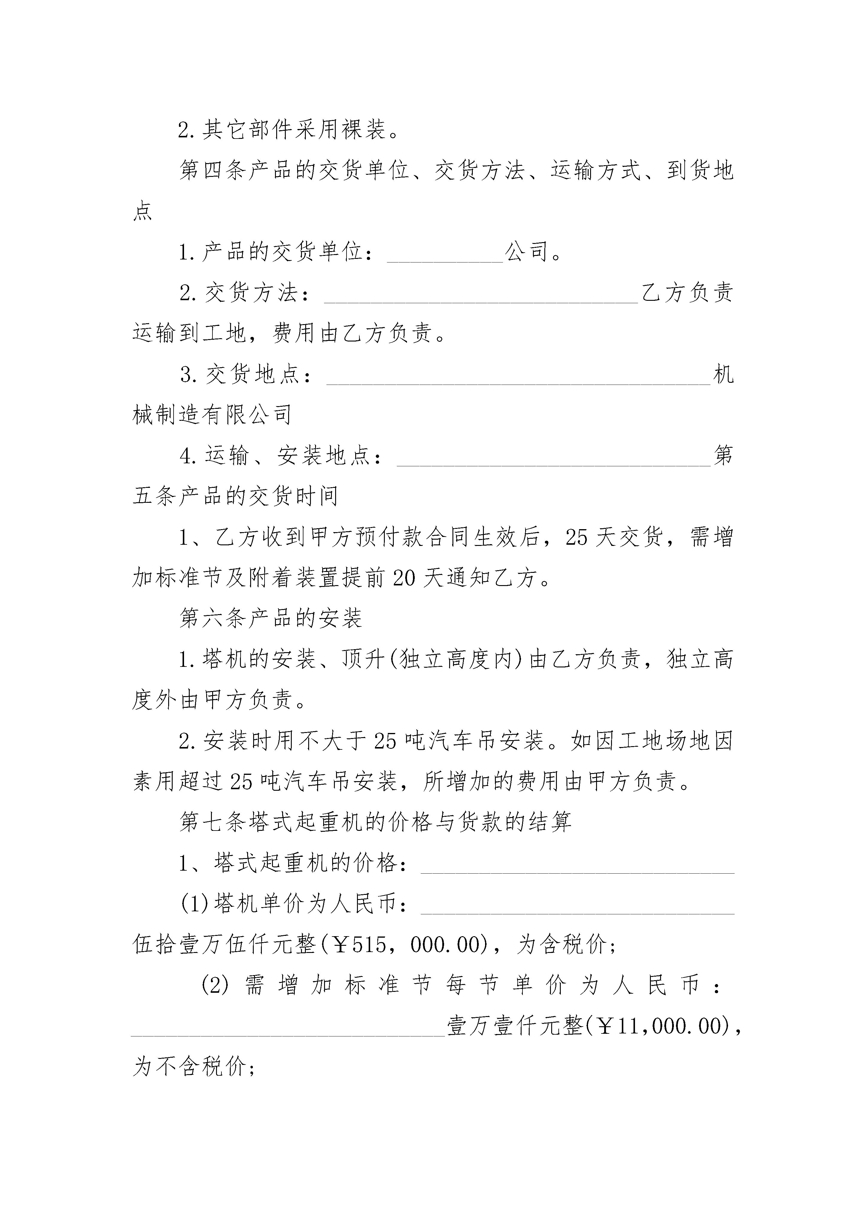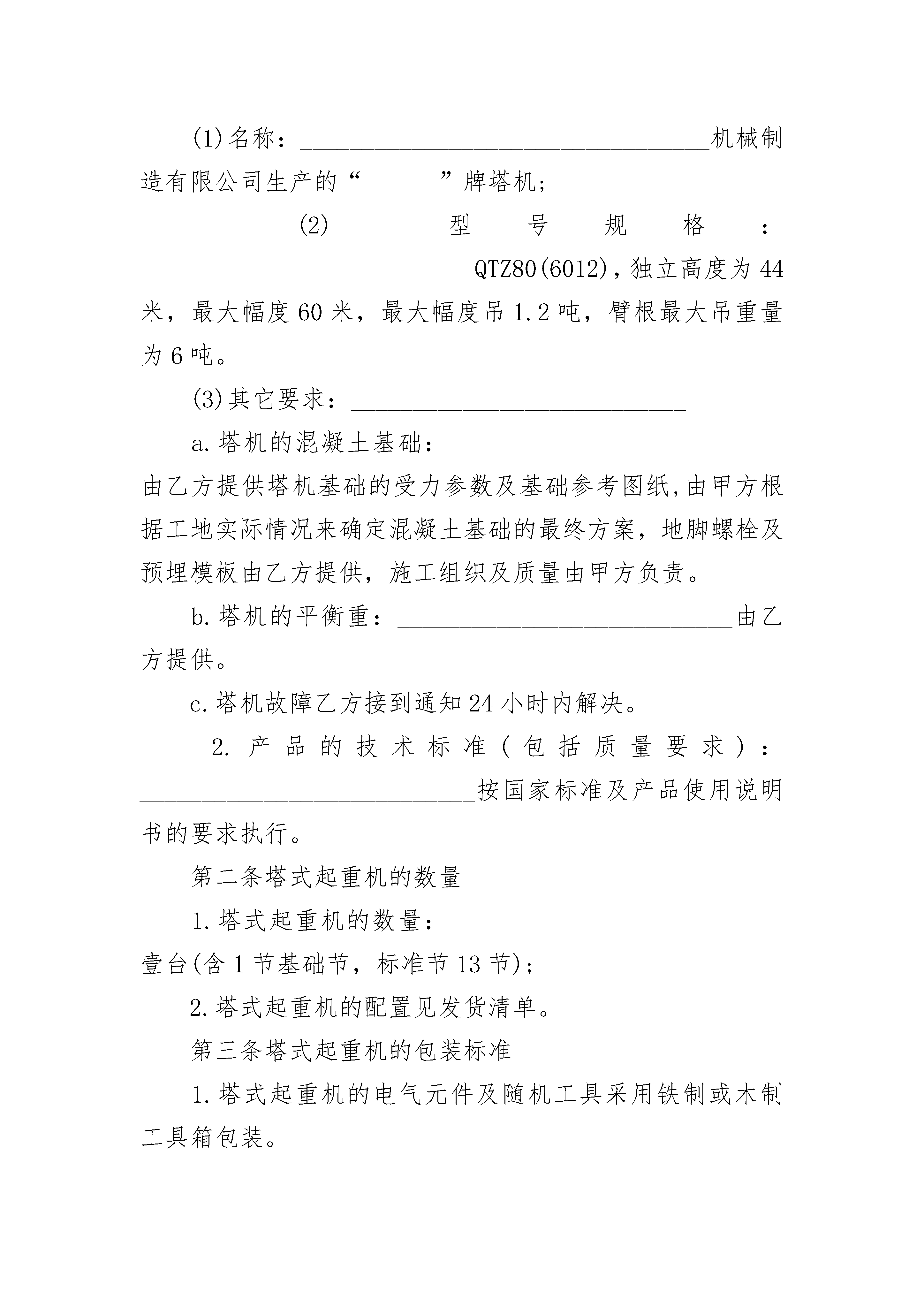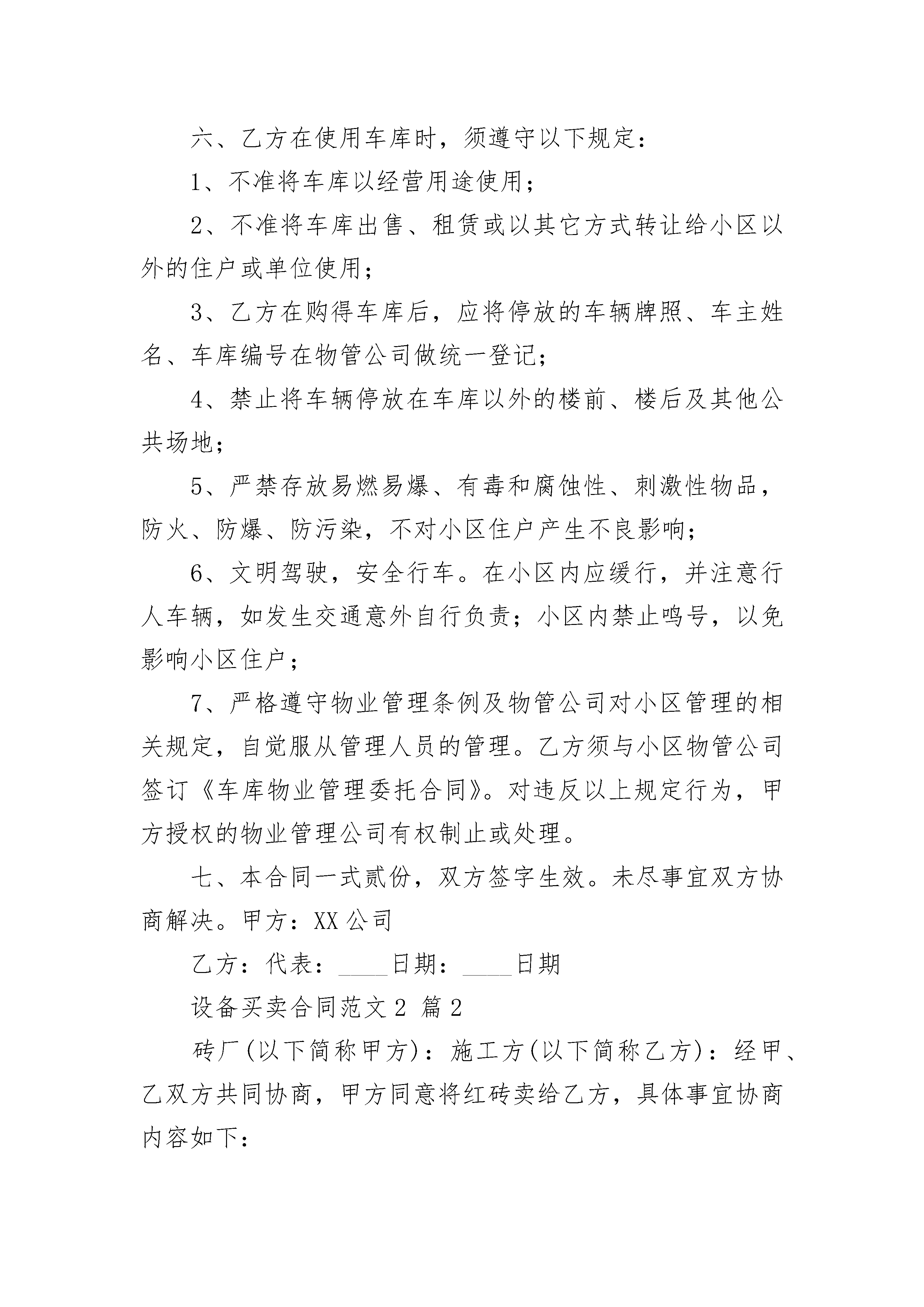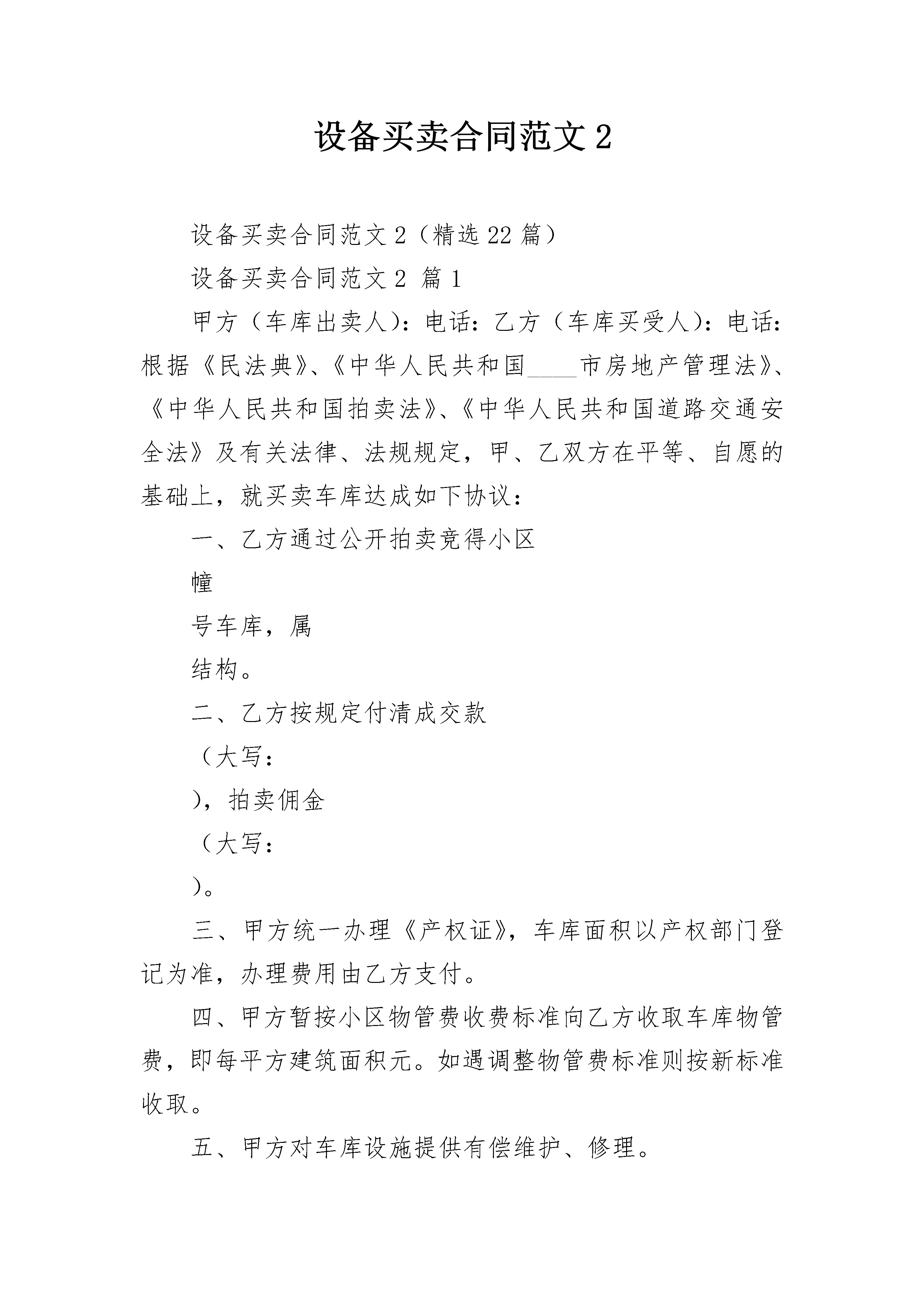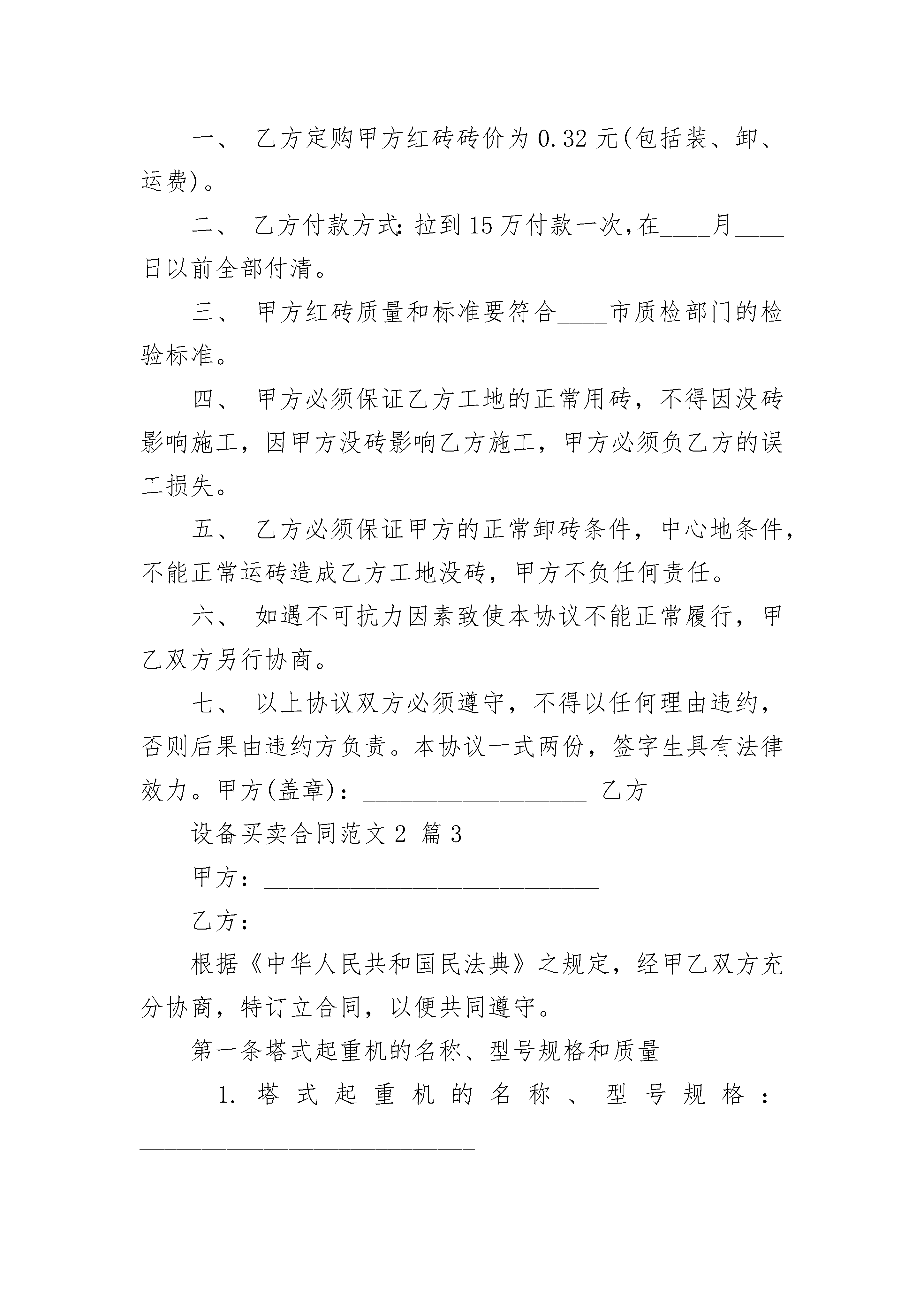 设备买卖合同范文2设备买卖合同范文2(精选22篇)设备买卖合同范文2篇1甲方(车库出卖人):电话:乙方(车库买受人):电话:根据《民法典》、《中华人民共和国____市房地产管理法》、《中华人民共和国拍卖法》、《中华人民共和国道路交通安全法》及有关法律、法规规定,甲、乙双方在平等、自愿的基础上,就买卖车库达成如下协议:一、乙方通过公开拍卖竞得小区幢号车库,属结构。二、乙方按规定付清成交款(大写:),拍卖佣金(大写:)。三、甲方统一办理《产权证》,车库面积以产权部门登记为准,办理费用由乙方支付。四、甲方暂按小区物管费收费标准向乙方收取车库物管费,即每平方建筑面积元。如遇调整物管费标准则按新标准收取。五、甲方对车库设施提供有偿维护、修理。六、乙方在使用车库时,须遵守以下规定:1、不准将车库以经营用途使用;2、不准将车库出售、租赁或以其它方式转让给小区以外的住户或单位使用;3、乙方在购得车库后,应将停放的车辆牌照、车主姓名、车库编号在物管公司做统一登记;4、禁止将车辆停放在车库以外的楼前、楼后及其他公共场地;5、严禁存放易燃易爆、有毒和腐蚀性、刺激性物品,防火、防爆、防污染,不对小区住户产生不良影响;6、文明驾驶,安全行车。在小区内应缓行,并注意行人车辆,如发生交通意外自行负责;小区内禁止鸣号,以免影响小区住户;7、严格遵守物业管理条例及物管公司对小区管理的相关规定,自觉服从管理人员的管理。乙方须与小区物管公司签订《车库物业管理委托合同》。对违反以上规定行为,甲方授权的物业管理公司有权制止或处理。七、本合同一式贰份,双方签字生效。未尽事宜双方协商解决。甲方:XX公司乙方:代表:____日期:____日期设备买卖合同范文2篇2砖厂(以下简称甲方):施工方(以下简称乙方):经甲、乙双方共同协商,甲方同意将红砖卖给乙方,具体事宜协商内容如下:一、乙方定购甲方红砖砖价为0.32元(包括装、卸、运费)。二、乙方付款方式:拉到15万付款一次,在____月____日以前全部付清。三、甲方红砖质量和标准要符合____市质检部门的检验标准。四、甲方必须保证乙方工地的正常用砖,不得因没砖影响施工,因甲方没砖影响乙方施工,甲方必须负乙方的误工损失。五、乙方必须保证甲方的正常卸砖条件,中心地条件,不能正常运砖造成乙方工地没砖,甲方不负任何责任。六、如遇不可抗力因素致使本协议不能正常履行,甲乙双方另行协商。七、以上协议双方必须遵守,不得以任何理由违约,否则后果由违约方负责。本协议一式两份,签字生具有法律效力。甲方(盖章):__________________乙方设备买卖合同范文2篇3甲方:___________________________乙方:___________________________根据《中华人民共和国民法典》之规定,经甲乙双方充分协商,特订立合同,以便共同遵守。第一条塔式起重机的名称、型号规格和质量1.塔式起重机的名称、型号规格:___________________________(1)名称:_________________________________机械制造有限公司生产的“______”牌塔机;(2)型号规格:___________________________QTZ80(6012),独立高度为44米,最大幅度60米,最大幅度吊1.2吨,臂根最大吊重量为6吨。(3)其它要求:___________________________a.塔机的混凝土基础:___________________________由乙方提供塔机基础的受力参数及基础参考图纸,由甲方根据工地实际情况来确定混凝土基础的最终方案,地脚螺栓及预埋模板由乙方提供,施工组织及质量由甲方负责。b.塔机的平衡重:___________________________由乙方提供。c.塔机故障乙方接到通知24小时内解决。2.产品的技术标准(包括质量要求):___________________________按国家标准及产品使用说明书的要求执行。第二条塔式起重机的数量1.塔式起重机的数量:___________________________壹台(含1节基础节,标准节13节);2.塔式起重机的配置见发货清单。第三条塔式起重机的包装标准1.塔式起重机的电气元件及随机工具采用铁制或木制工具箱包装。2.其它部件采用裸装。第四条产品的交货单位、交货方法、运输方式、到货地点1.产品的交货单位:__________公司。2.交货方法:___________________________乙方负责运输到工地,费用由乙方负责。3.交货地点:_________________________________机械制造有限公司4.运输、安装地点:_________________________