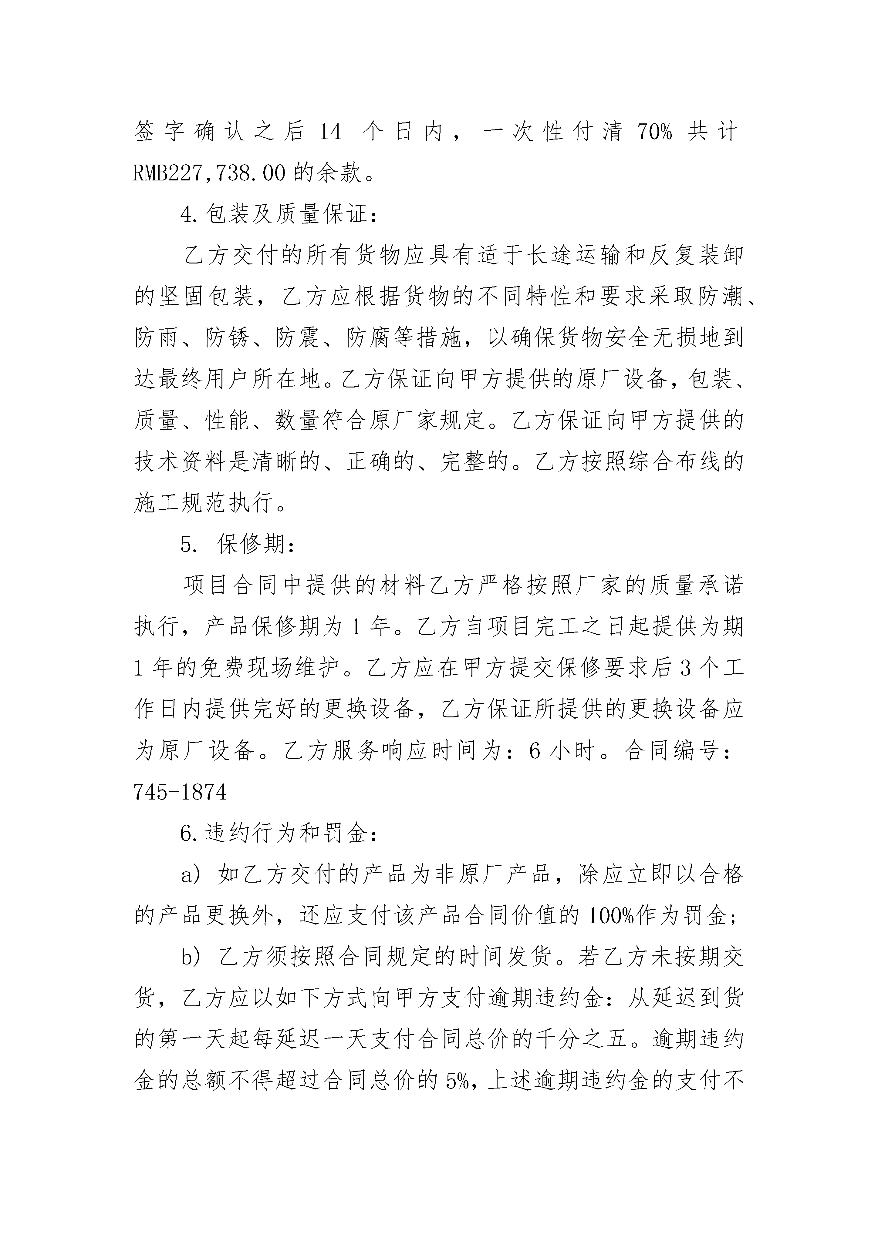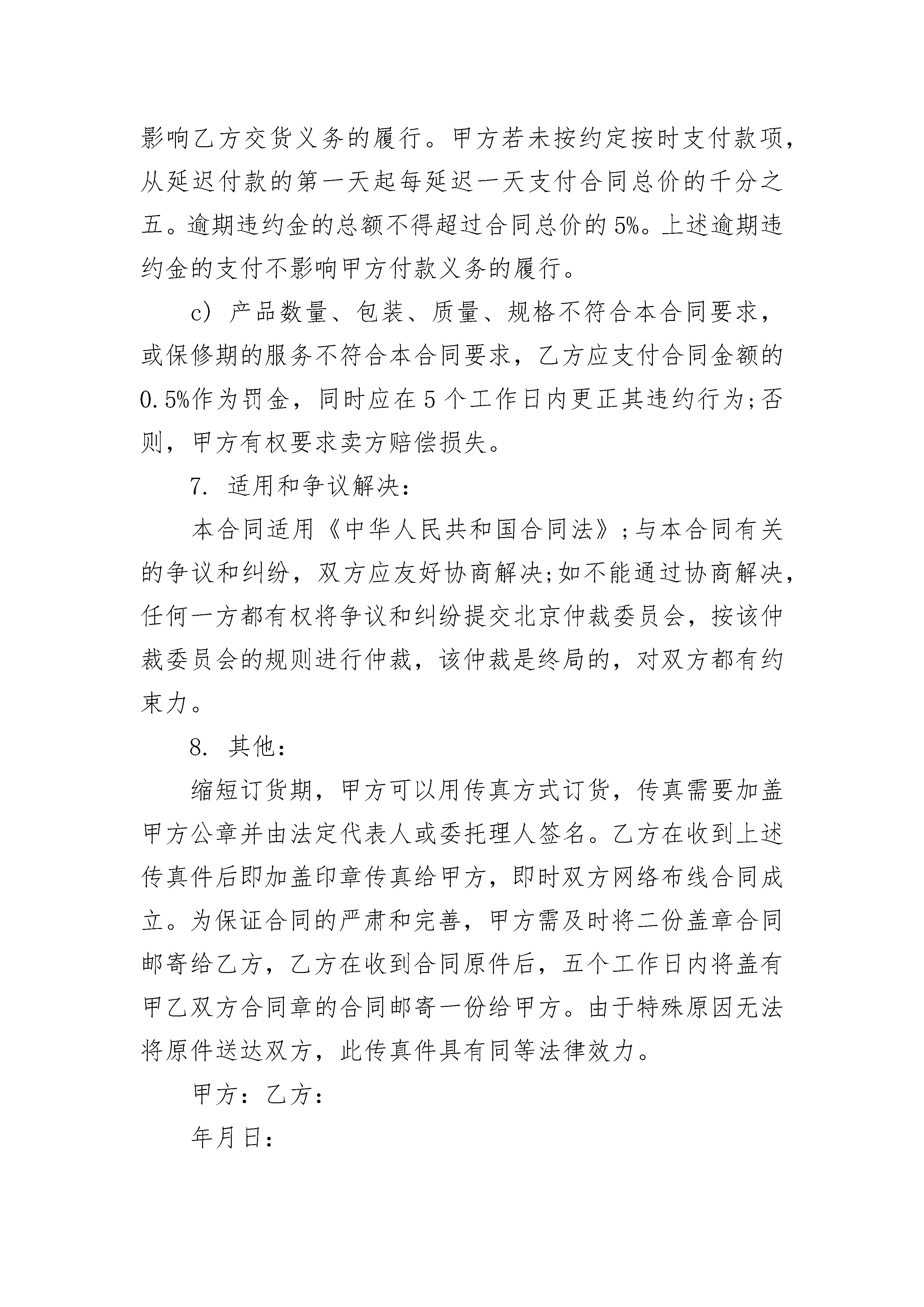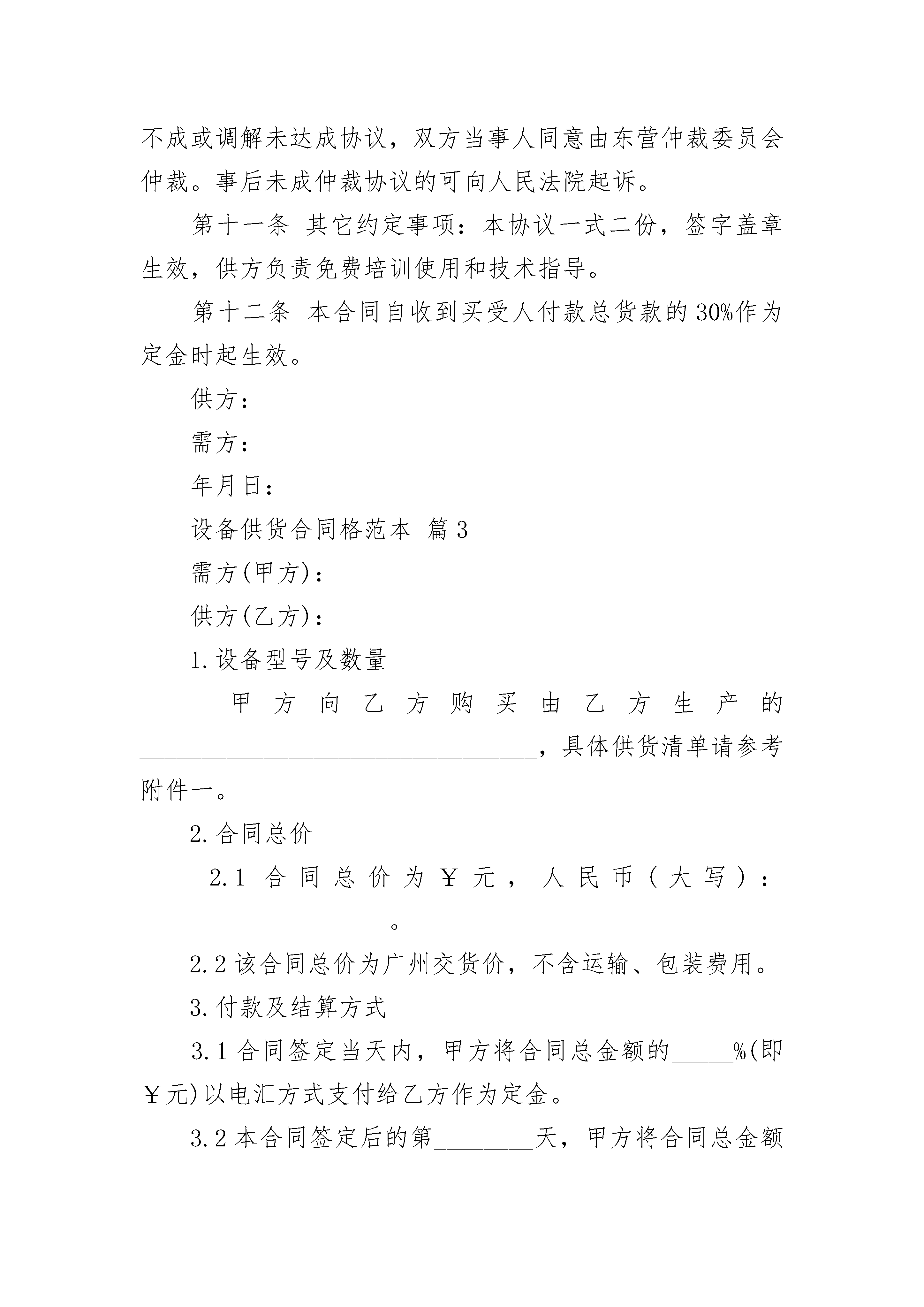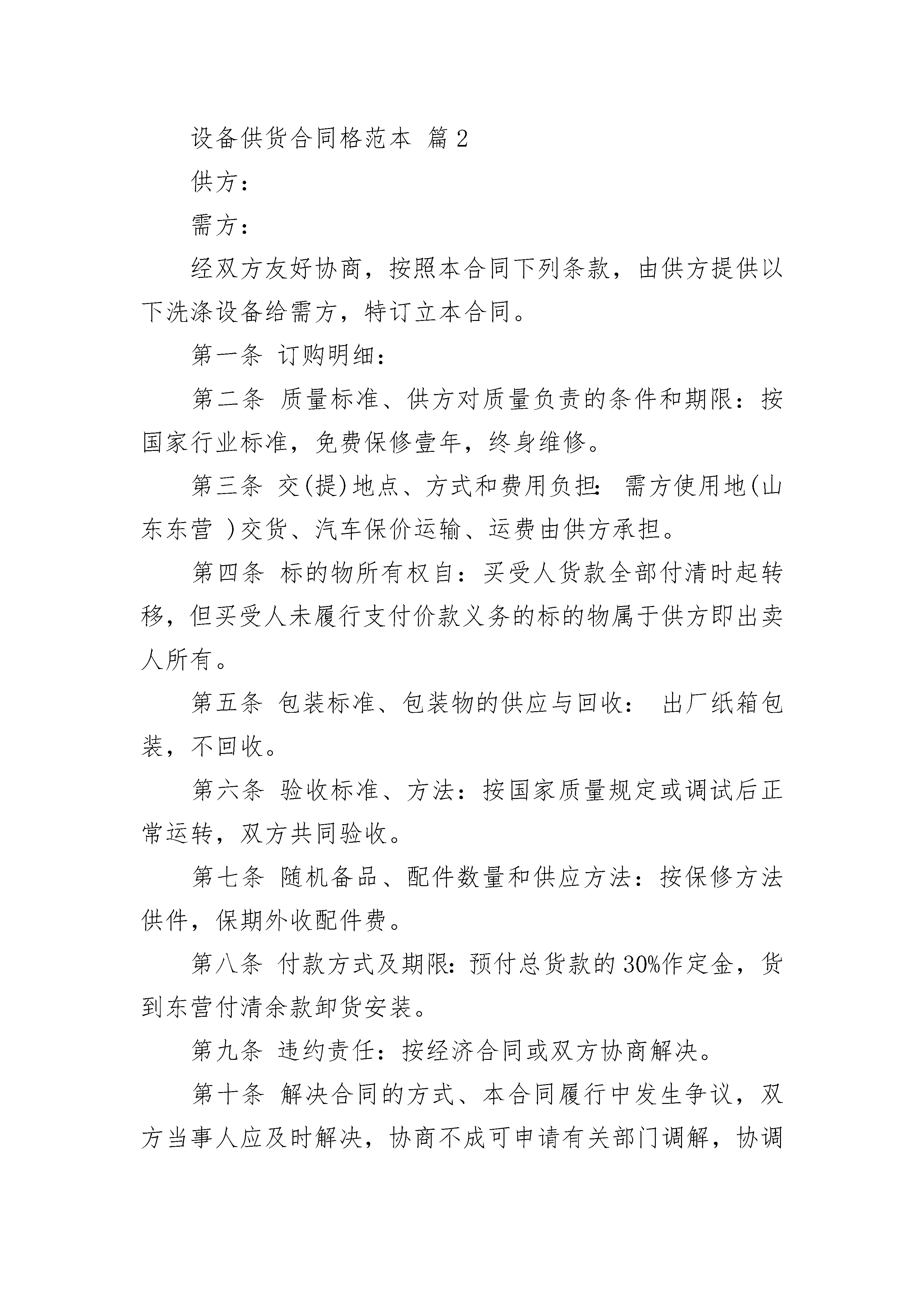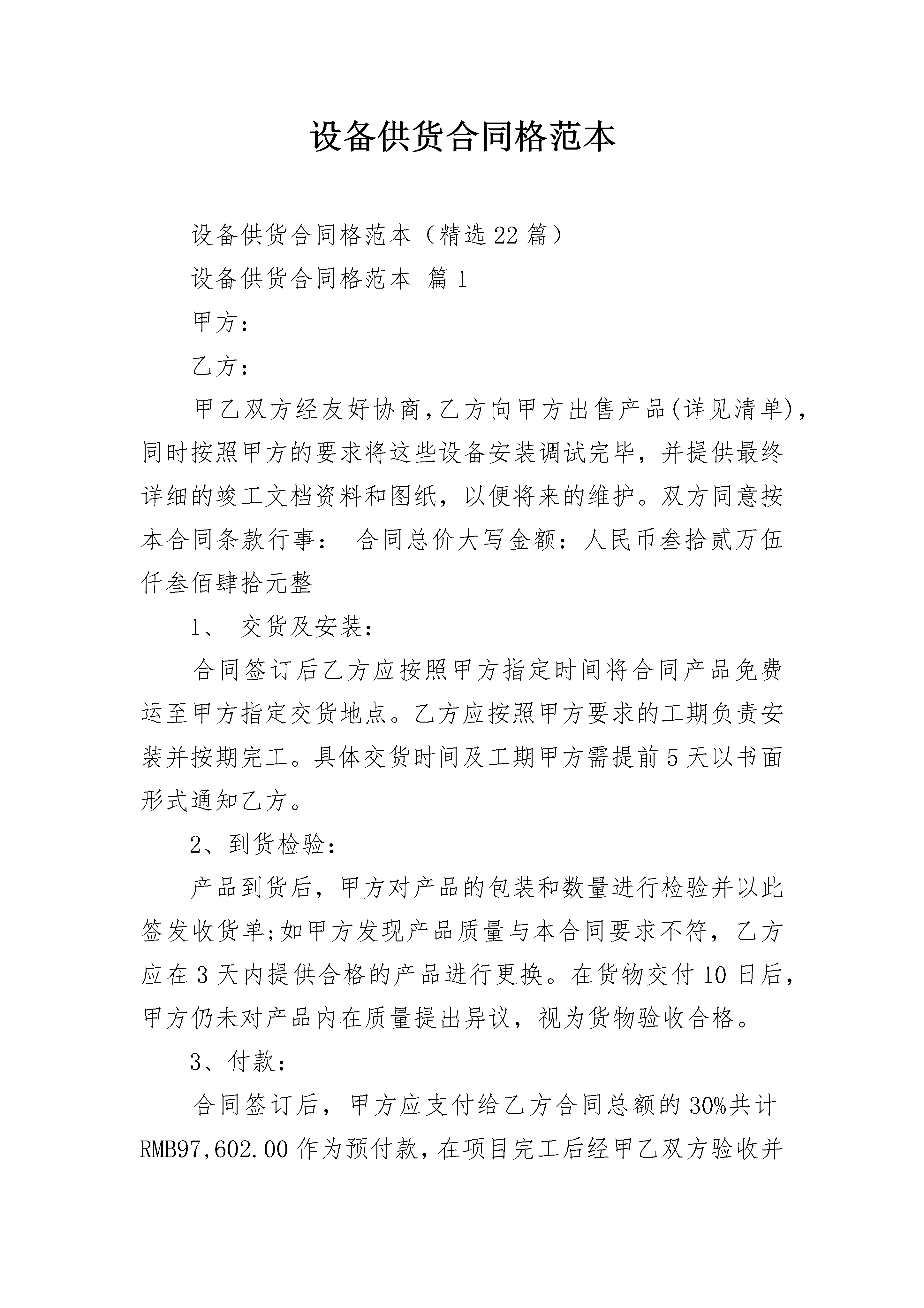 设备供货合同格范本设备供货合同格范本(精选22篇)设备供货合同格范本篇1甲方:乙方:甲乙双方经友好协商,乙方向甲方出售产品(详见清单),同时按照甲方的要求将这些设备安装调试完毕,并提供最终详细的竣工文档资料和图纸,以便将来的维护。双方同意按本合同条款行事:合同总价大写金额:人民币叁拾贰万伍仟叁佰肆拾元整1、交货及安装:合同签订后乙方应按照甲方指定时间将合同产品免费运至甲方指定交货地点。乙方应按照甲方要求的工期负责安装并按期完工。具体交货时间及工期甲方需提前5天以书面形式通知乙方。2、到货检验:产品到货后,甲方对产品的包装和数量进行检验并以此签发收货单;如甲方发现产品质量与本合同要求不符,乙方应在3天内提供合格的产品进行更换。在货物交付10日后,甲方仍未对产品内在质量提出异议,视为货物验收合格。3、付款:合同签订后,甲方应支付给乙方合同总额的30%共计RMB97,602.00作为预付款,在项目完工后经甲乙双方验收并签字确认之后14个日内,一次性付清70%共计RMB227,738.00的余款。4.包装及质量保证:乙方交付的所有货物应具有适于长途运输和反复装卸的坚固包装,乙方应根据货物的不同特性和要求采取防潮、防雨、防锈、防震、防腐等措施,以确保货物安全无损地到达最终用户所在地。乙方保证向甲方提供的原厂设备,包装、质量、性能、数量符合原厂家规定。乙方保证向甲方提供的技术资料是清晰的、正确的、完整的。乙方按照综合布线的施工规范执行。5.保修期:项目合同中提供的材料乙方严格按照厂家的质量承诺执行,产品保修期为1年。乙方自项目完工之日起提供为期1年的免费现场维护。乙方应在甲方提交保修要求后3个工作日内提供完好的更换设备,乙方保证所提供的更换设备应为原厂设备。乙方服务响应时间为:6小时。合同编号:745-18746.违约行为和罚金:a)如乙方交付的产品为非原厂产品,除应立即以合格的产品更换外,还应支付该产品合同价值的100%作为罚金;b)乙方须按照合同规定的时间发货。若乙方未按期交货,乙方应以如下方式向甲方支付逾期违约金:从延迟到货的第一天起每延迟一天支付合同总价的千分之五。逾期违约金的总额不得超过合同总价的5%,上述逾期违约金的支付不影响乙方交货义务的履行。甲方若未按约定按时支付款项,从延迟付款的第一天起每延迟一天支付合同总价的千分之五。逾期违约金的总额不得超过合同总价的5%。上述逾期违约金的支付不影响甲方付款义务的履行。c)产品数量、包装、质量、规格不符合本合同要求,或保修期的服务不符合本合同要求,乙方应支付合同金额的0.5%作为罚金,同时应在5个工作日内更正其违约行为;否则,甲方有权要求卖方赔偿损失。7.适用和争议解决:本合同适用《中华人民共和国合同法》;与本合同有关的争议和纠纷,双方应友好协商解决;如不能通过协商解决,任何一方都有权将争议和纠纷提交北京仲裁委员会,按该仲裁委员会的规则进行仲裁,该仲裁是终局的,对双方都有约束力。8.其他:缩短订货期,甲方可以用传真方式订货,传真需要加盖甲方公章并由法定代表人或委托理人签名。乙方在收到上述传真件后即加盖印章传真给甲方,即时双方网络布线合同成立。为保证合同的严肃和完善,甲方需及时将二份盖章合同邮寄给乙方,乙方在收到合同原件后,五个工作日内将盖有甲乙双方合同章的合同邮寄一份给甲方。由于特殊原因无法将原件送达双方,此传真件具有同等法律效力。甲方:乙方:年月日:设备供货合同格范本篇2供方:需方:经双方友好协商,按照本合同下列条款,由供方提供以下洗涤设备给需方,特订立本合同。第一条订购明细:第二条质量标准、供方对质量负责的条件和期限:按国家行业标准,免费保修壹年,终身维修。第三条交(提)地点、方式和费用负担:需方使用地(山东东营)交货、汽车保价运输、运费由供方承担。第四条标的物所有权自:买受人货款全部付清时起转移,但买受人未履行支付价款义务的标的物属于供方即出卖人所有。第五条包装标准、包装物的供应与回收:出厂纸箱包装,不回收。第六条验收标准、方法:按国家质量规定或调试后正常运转,双方共同验收。第七条随机备品、配件数量和供应方法:按保修方法供件,保期外收配件费。第八条付款方式及期限:预付总货款的30%作定金,货到东营付清余款卸货安装。第九条违约责任:按经济合同或双方协商解决。第十条解决合同的方式、本合同履行中发生争议,双方当事人应及时解决,协商不成可申请有关部门调解,协调不成或调解未达成协议,双方当事人同意由东营仲裁委员会仲裁。事后未成仲裁协议的可向人民法院起诉。第十一条其它约定事项:本协议一式二份,签字盖章生效,供方负责免费培训使用和技术指导。第十二条本合同自收到买受人付款总货款的30%作为定金时起生效。供方:需方:年月日:设备供货合同格范本篇3需方(甲方):供方(乙方):1.设备型号及数量甲