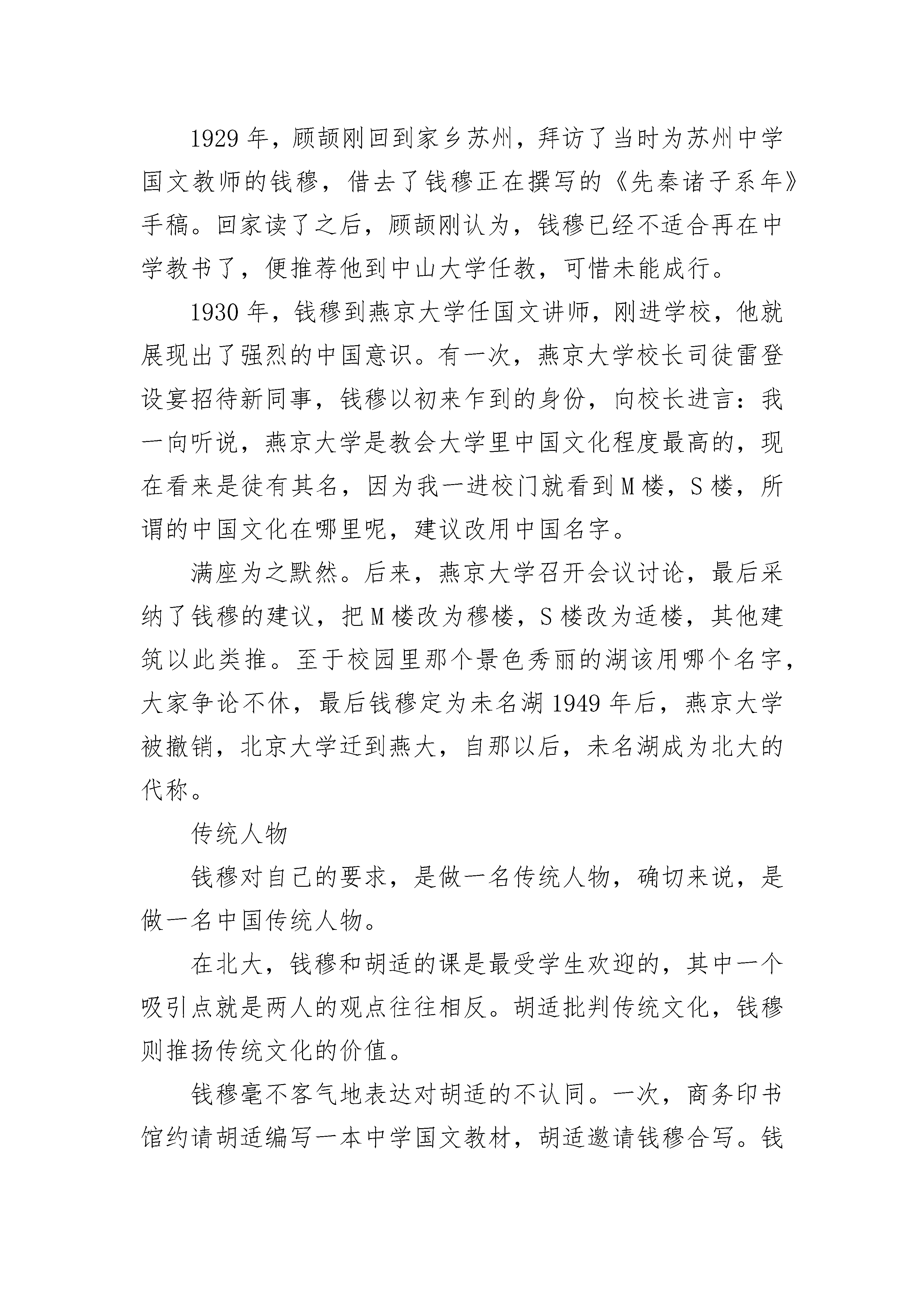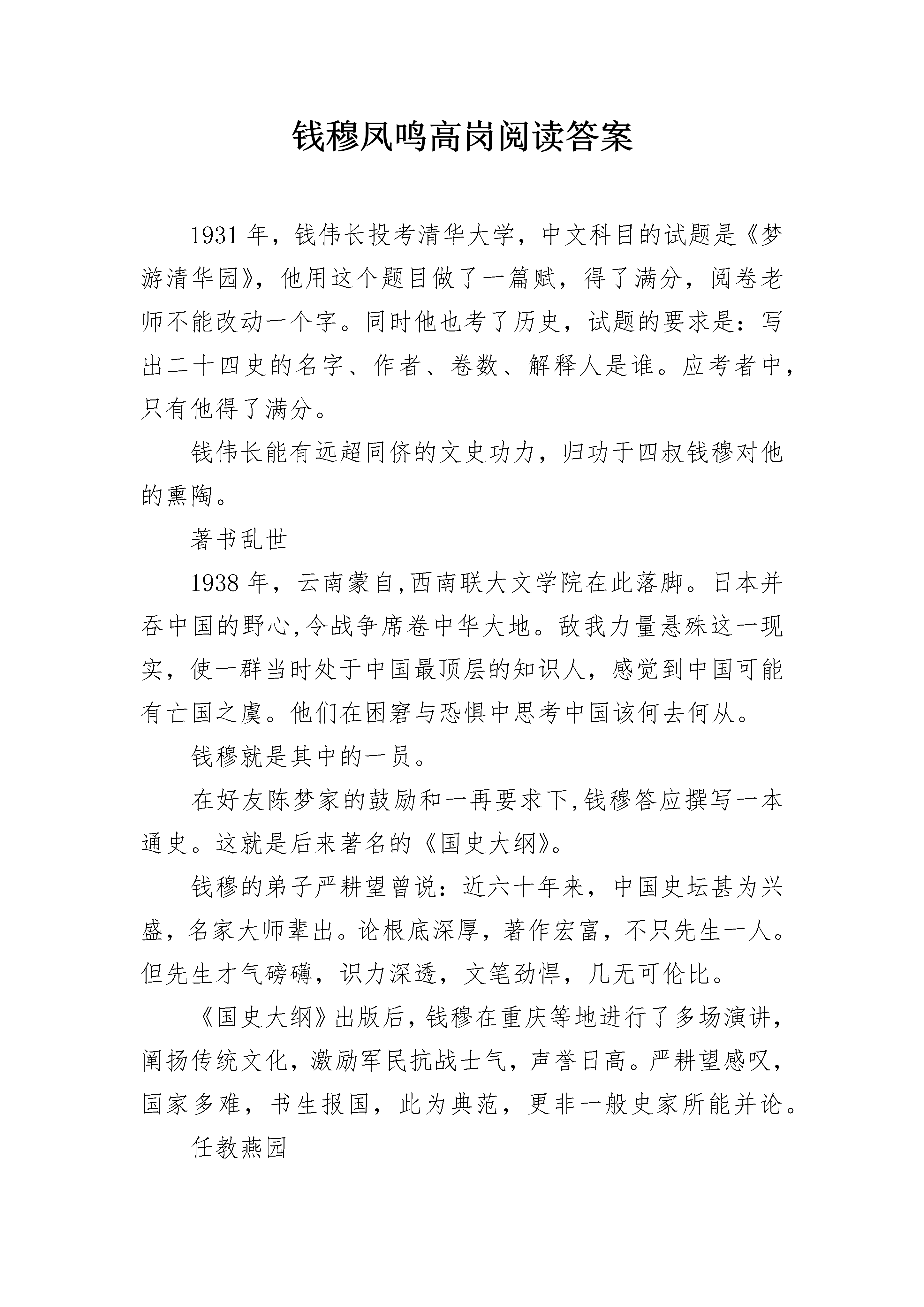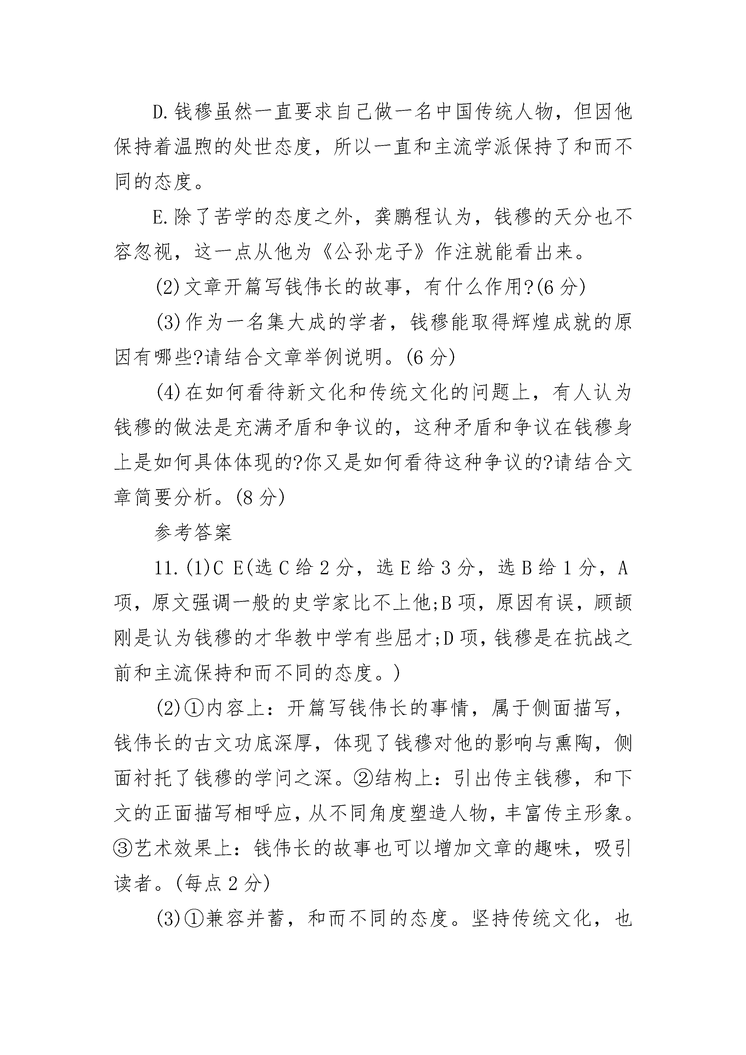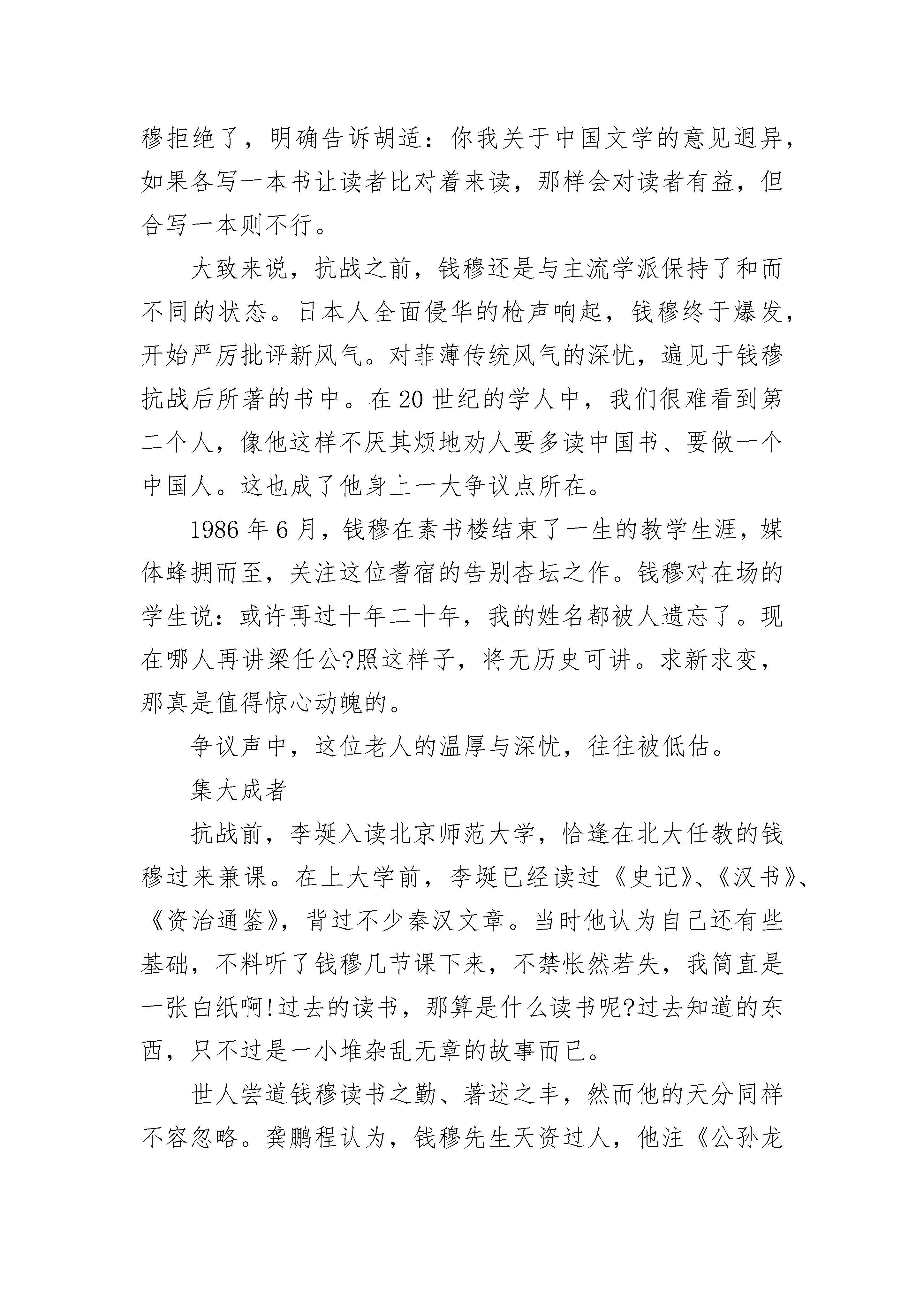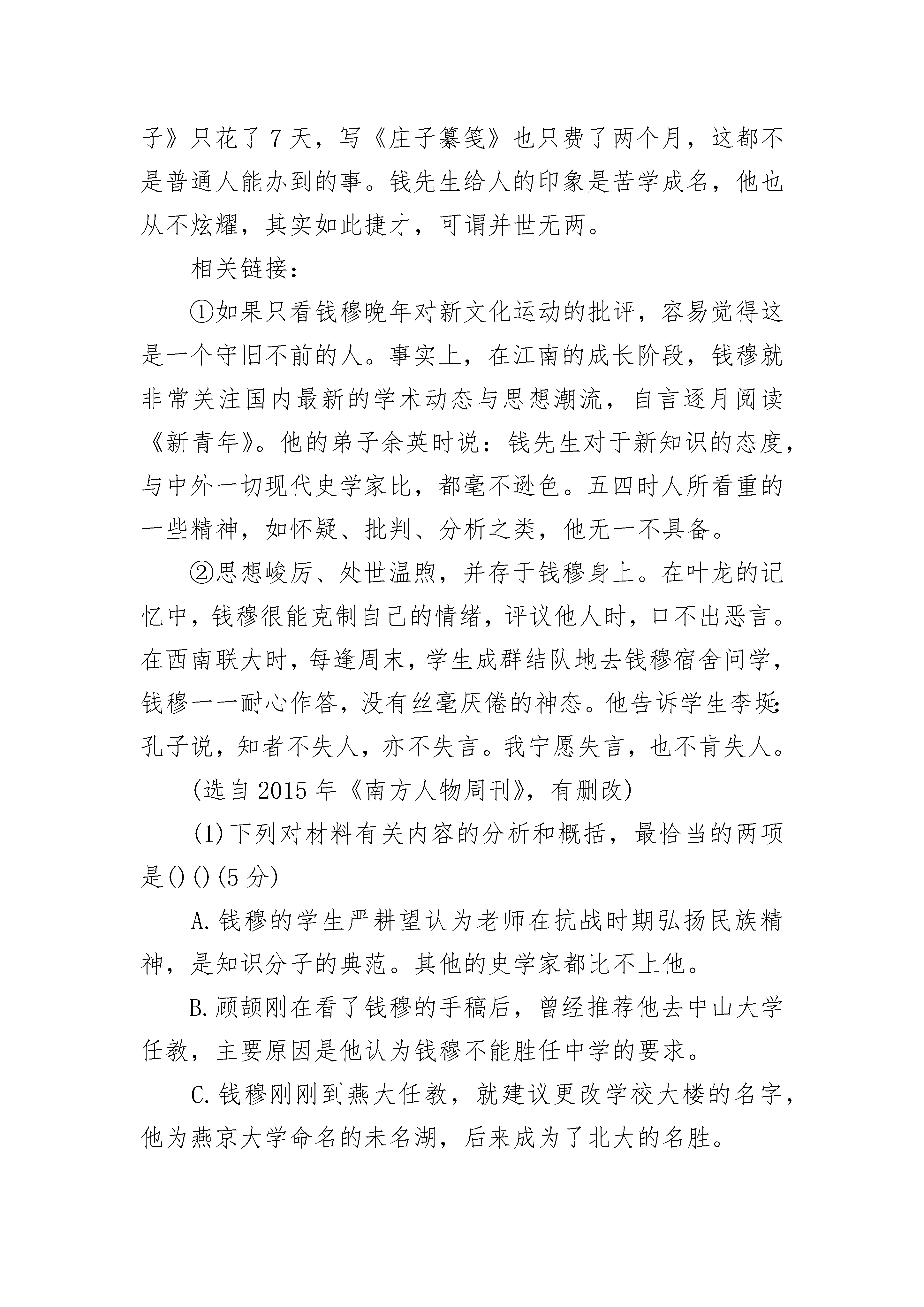 钱穆凤鸣高岗阅读答案1931年,钱伟长投考清华大学,中文科目的试题是《梦游清华园》,他用这个题目做了一篇赋,得了满分,阅卷老师不能改动一个字。同时他也考了历史,试题的要求是:写出二十四史的名字、作者、卷数、解释人是谁。应考者中,只有他得了满分。钱伟长能有远超同侪的文史功力,归功于四叔钱穆对他的熏陶。著书乱世1938年,云南蒙自,西南联大文学院在此落脚。日本并吞中国的野心,令战争席卷中华大地。敌我力量悬殊这一现实,使一群当时处于中国最顶层的知识人,感觉到中国可能有亡国之虞。他们在困窘与恐惧中思考中国该何去何从。钱穆就是其中的一员。在好友陈梦家的鼓励和一再要求下,钱穆答应撰写一本通史。这就是后来著名的《国史大纲》。钱穆的弟子严耕望曾说:近六十年来,中国史坛甚为兴盛,名家大师辈出。论根底深厚,著作宏富,不只先生一人。但先生才气磅礴,识力深透,文笔劲悍,几无可伦比。《国史大纲》出版后,钱穆在重庆等地进行了多场演讲,阐扬传统文化,激励军民抗战士气,声誉日高。严耕望感叹,国家多难,书生报国,此为典范,更非一般史家所能并论。任教燕园1929年,顾颉刚回到家乡苏州,拜访了当时为苏州中学国文教师的钱穆,借去了钱穆正在撰写的《先秦诸子系年》手稿。回家读了之后,顾颉刚认为,钱穆已经不适合再在中学教书了,便推荐他到中山大学任教,可惜未能成行。1930年,钱穆到燕京大学任国文讲师,刚进学校,他就展现出了强烈的中国意识。有一次,燕京大学校长司徒雷登设宴招待新同事,钱穆以初来乍到的身份,向校长进言:我一向听说,燕京大学是教会大学里中国文化程度最高的,现在看来是徒有其名,因为我一进校门就看到M楼,S楼,所谓的中国文化在哪里呢,建议改用中国名字。满座为之默然。后来,燕京大学召开会议讨论,最后采纳了钱穆的建议,把M楼改为穆楼,S楼改为适楼,其他建筑以此类推。至于校园里那个景色秀丽的湖该用哪个名字,大家争论不休,最后钱穆定为未名湖1949年后,燕京大学被撤销,北京大学迁到燕大,自那以后,未名湖成为北大的代称。传统人物钱穆对自己的要求,是做一名传统人物,确切来说,是做一名中国传统人物。在北大,钱穆和胡适的课是最受学生欢迎的,其中一个吸引点就是两人的观点往往相反。胡适批判传统文化,钱穆则推扬传统文化的价值。钱穆毫不客气地表达对胡适的不认同。一次,商务印书馆约请胡适编写一本中学国文教材,胡适邀请钱穆合写。钱穆拒绝了,明确告诉胡适:你我关于中国文学的意见迥异,如果各写一本书让读者比对着来读,那样会对读者有益,但合写一本则不行。大致来说,抗战之前,钱穆还是与主流学派保持了和而不同的状态。日本人全面侵华的枪声响起,钱穆终于爆发,开始严厉批评新风气。对菲薄传统风气的深忧,遍见于钱穆抗战后所著的书中。在20世纪的学人中,我们很难看到第二个人,像他这样不厌其烦地劝人要多读中国书、要做一个中国人。这也成了他身上一大争议点所在。1986年6月,钱穆在素书楼结束了一生的教学生涯,媒体蜂拥而至,关注这位耆宿的告别杏坛之作。钱穆对在场的学生说:或许再过十年二十年,我的姓名都被人遗忘了。现在哪人再讲梁任公?照这样子,将无历史可讲。求新求变,那真是值得惊心动魄的。争议声中,这位老人的温厚与深忧,往往被低估。集大成者抗战前,李埏入读北京师范大学,恰逢在北大任教的钱穆过来兼课。在上大学前,李埏已经读过《史记》、《汉书》、《资治通鉴》,背过不少秦汉文章。当时他认为自己还有些基础,不料听了钱穆几节课下来,不禁怅然若失,我简直是一张白纸啊!过去的读书,那算是什么读书呢?过去知道的东西,只不过是一小堆杂乱无章的故事而已。世人尝道钱穆读书之勤、著述之丰,然而他的天分同样不容忽略。龚鹏程认为,钱穆先生天资过人,他注《公孙龙子》只花了7天,写《庄子纂笺》也只费了两个月,这都不是普通人能办到的事。钱先生给人的印象是苦学成名,他也从不炫耀,其实如此捷才,可谓并世无两。相关链接:①如果只看钱穆晚年对新文化运动的批评,容易觉得这是一个守旧不前的人。事实上,在江南的成长阶段,钱穆就非常关注国内最新的学术动态与思想潮流,自言逐月阅读《新青年》。他的弟子余英时说:钱先生对于新知识的态度,与中外一切现代史学家比,都毫不逊色。五四时人所看重的一些精神,如怀疑、批判、分析之类,他无一不具备。②思想峻厉、处世温煦,并存于钱穆身上。在叶龙的记忆中,钱穆很能克制自己的情绪,评议他人时,口不出恶言。在西南联大时,每逢周末,学生成群结队地去钱穆宿舍问学,钱穆一一耐心作答,没有丝毫厌倦的神态。他告诉学生李埏:孔子说,知者不失人,亦不失言。我宁愿失言,也不肯失人。(选自2015年《南方人物周刊》,有删改)(1)下列对材料有关内容的分析和概括,最恰当的两项是()()(5分)A.钱穆的学生严耕望认为老师在抗战时期弘扬民族精神,是知识分子的典范。其